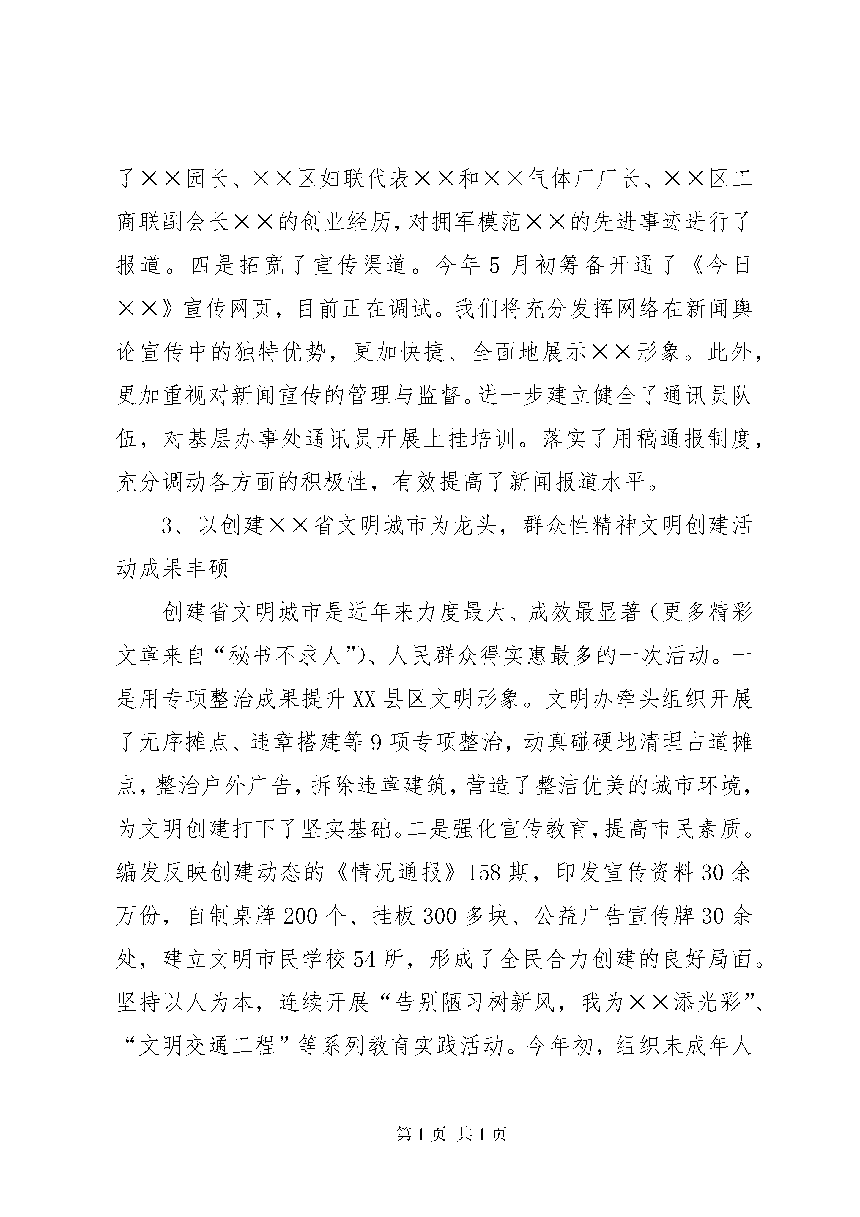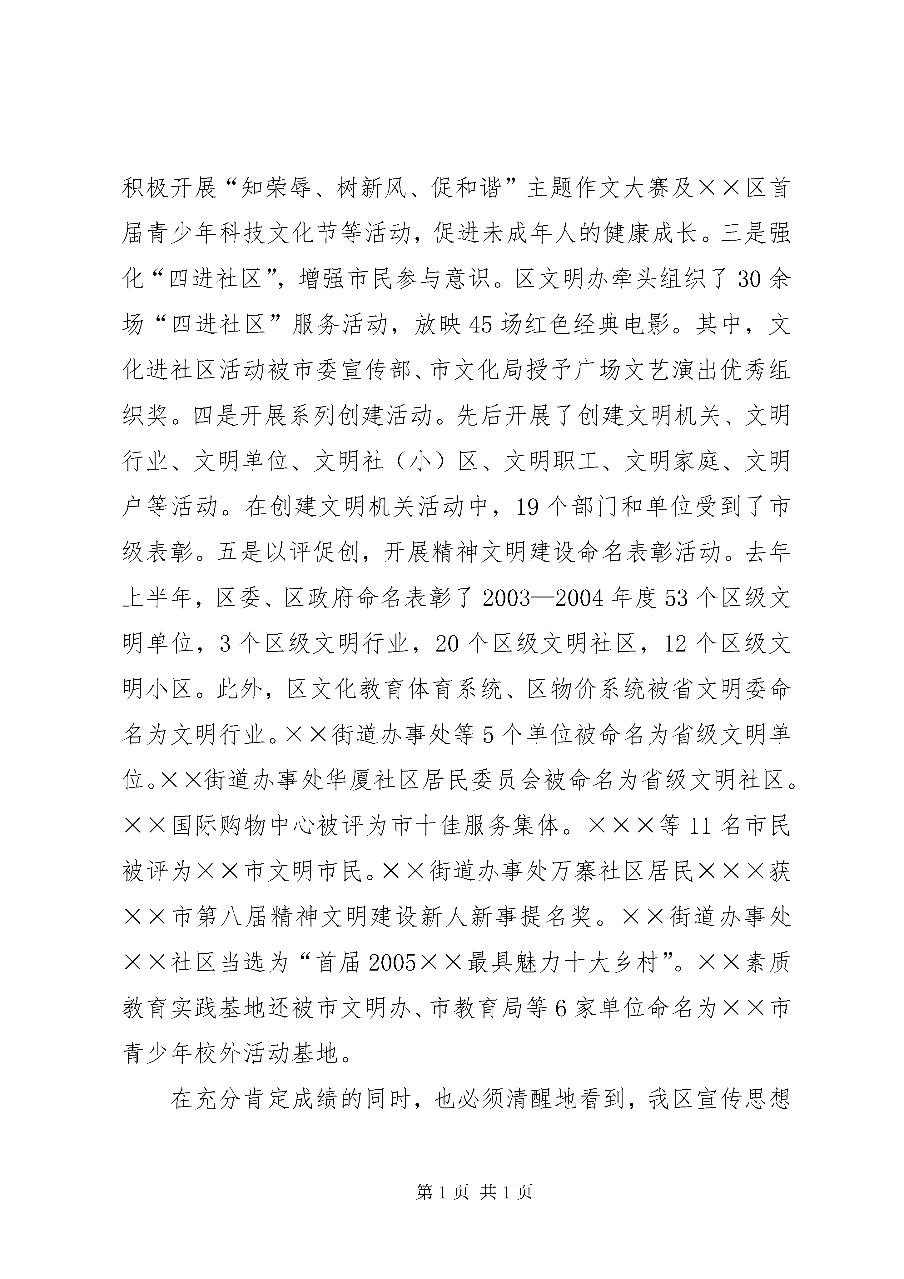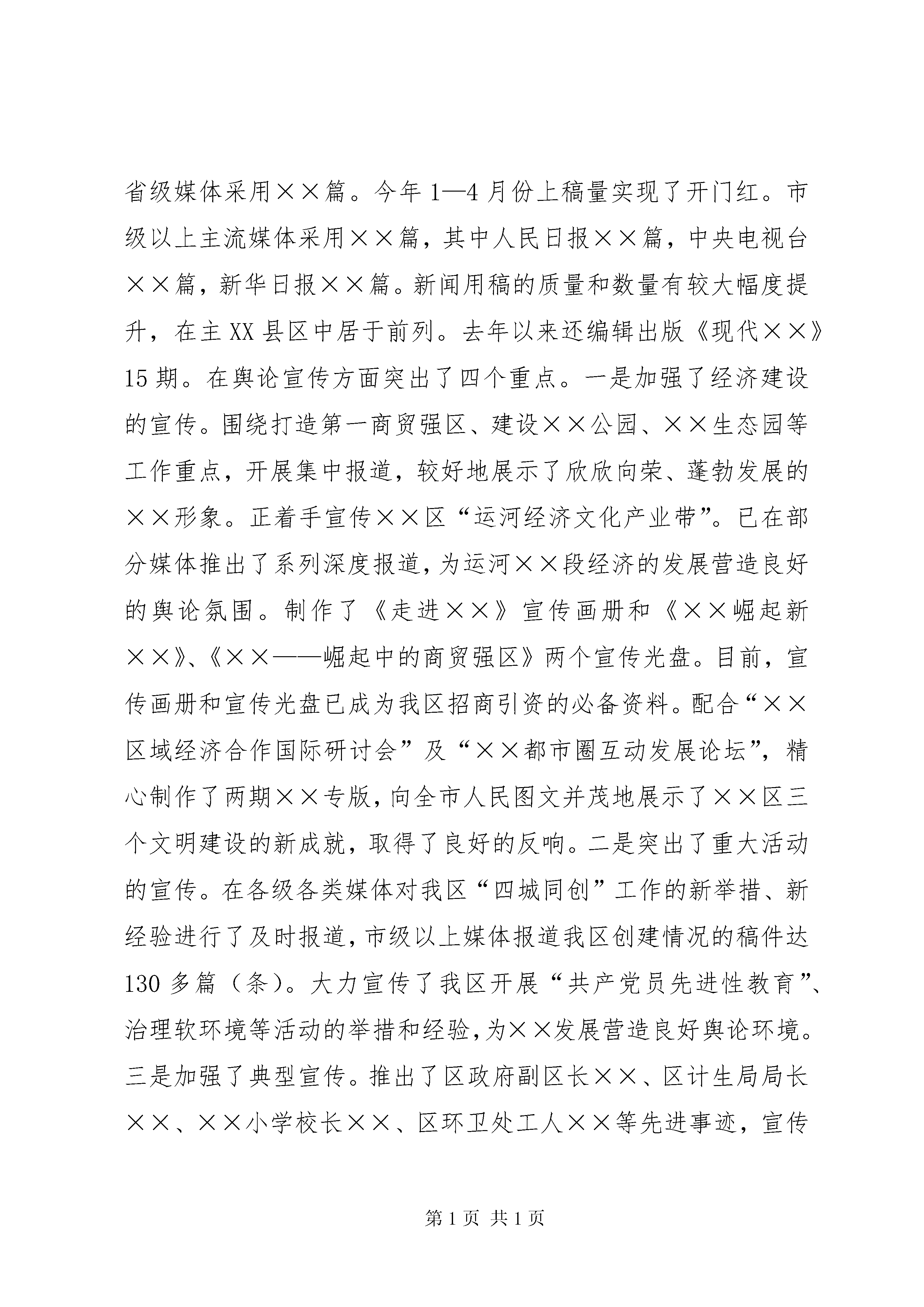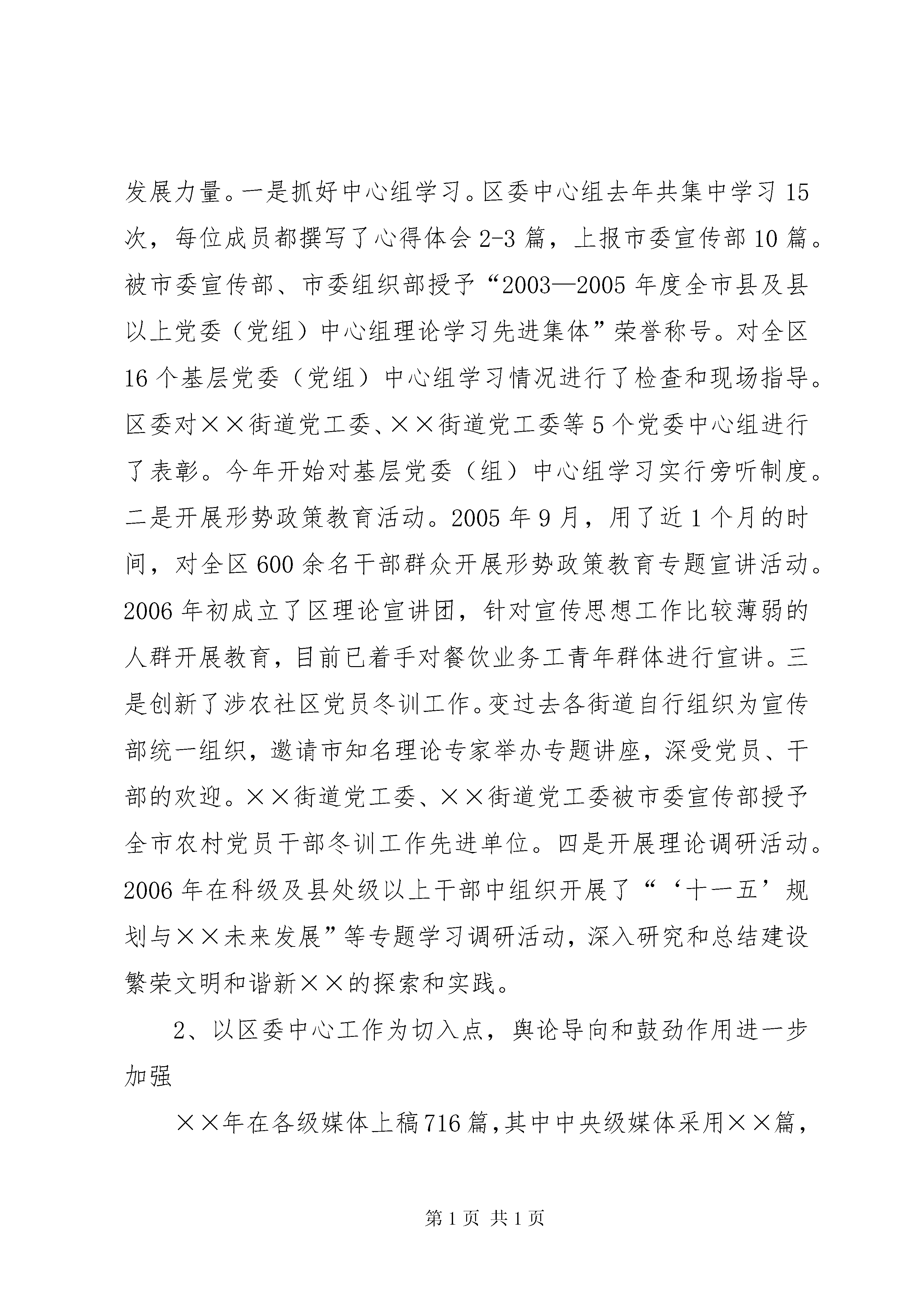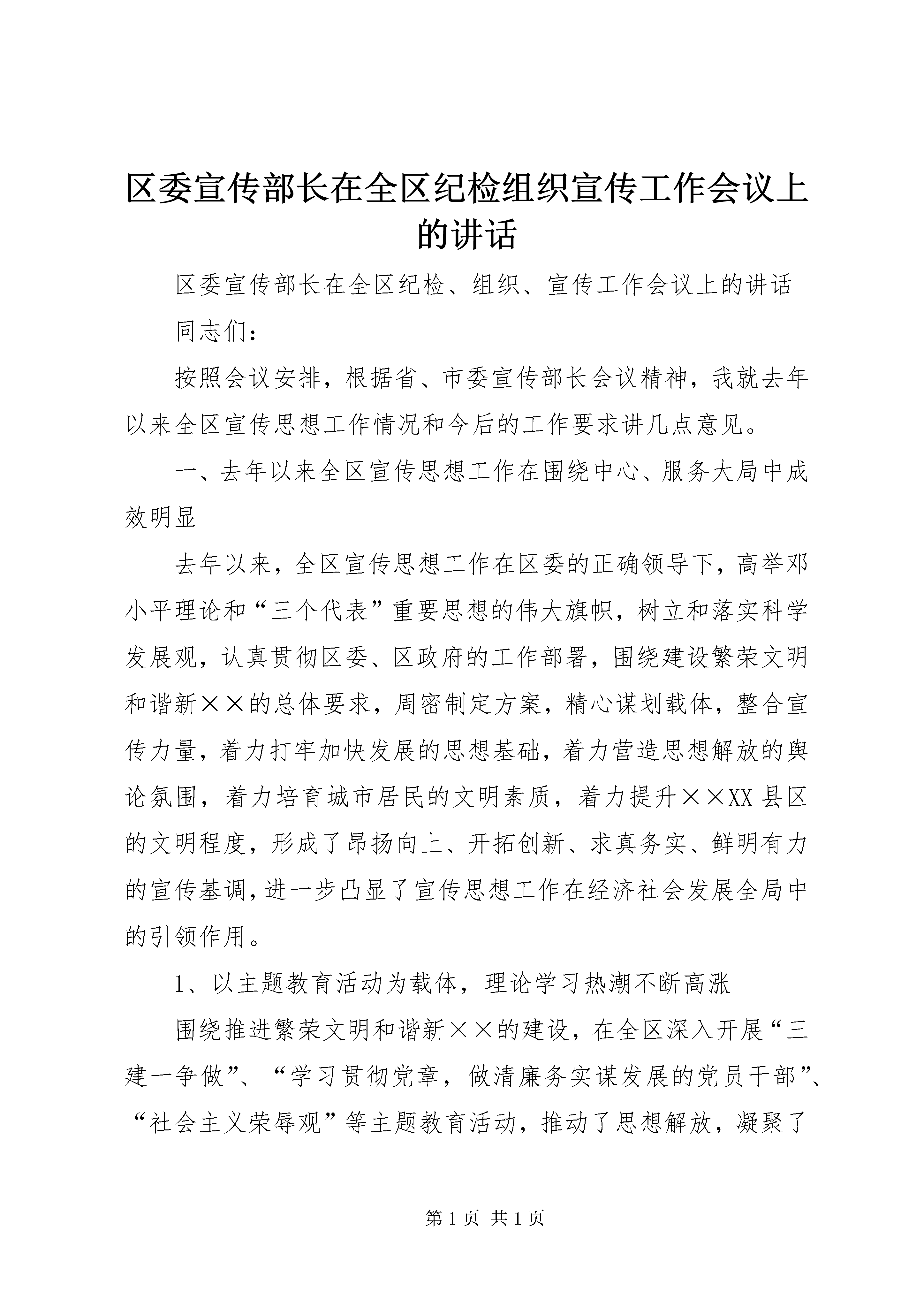 区委宣传部长在全区纪检组织宣传工作会议上的讲话区委宣传部长在全区纪检、组织、宣传工作会议上的讲话同志们:按照会议安排,根据省、市委宣传部长会议精神,我就去年以来全区宣传思想工作情况和今后的工作要求讲几点意见。一、去年以来全区宣传思想工作在围绕中心、服务大局中成效明显去年以来,全区宣传思想工作在区委的正确领导下,高举邓小平理论和“三个代表”重要思想的伟大旗帜,树立和落实科学发展观,认真贯彻区委、区政府的工作部署,围绕建设繁荣文明和谐新××的总体要求,周密制定方案,精心谋划载体,整合宣传力量,着力打牢加快发展的思想基础,着力营造思想解放的舆论氛围,着力培育城市居民的文明素质,着力提升××XX县区的文明程度,形成了昂扬向上、开拓创新、求真务实、鲜明有力的宣传基调,进一步凸显了宣传思想工作在经济社会发展全局中的引领作用。1、以主题教育活动为载体,理论学习热潮不断高涨围绕推进繁荣文明和谐新××的建设,在全区深入开展“三建一争做”、“学习贯彻党章,做清廉务实谋发展的党员干部”、“社会主义荣辱观”等主题教育活动,推动了思想解放,凝聚了发展力量。一是抓好中心组学习。区委中心组去年共集中学习15次,每位成员都撰写了心得体会2-3篇,上报市委宣传部10篇。被市委宣传部、市委组织部授予“2003—2005年度全市县及县以上党委(党组)中心组理论学习先进集体”荣誉称号。对全区16个基层党委(党组)中心组学习情况进行了检查和现场指导。区委对××街道党工委、××街道党工委等5个党委中心组进行了表彰。今年开始对基层党委(组)中心组学习实行旁听制度。二是开展形势政策教育活动。2005年9月,用了近1个月的时间,对全区600余名干部群众开展形势政策教育专题宣讲活动。2006年初成立了区理论宣讲团,针对宣传思想工作比较薄弱的人群开展教育,目前已着手对餐饮业务工青年群体进行宣讲。三是创新了涉农社区党员冬训工作。变过去各街道自行组织为宣传部统一组织,邀请市知名理论专家举办专题讲座,深受党员、干部的欢迎。××街道党工委、××街道党工委被市委宣传部授予全市农村党员干部冬训工作先进单位。四是开展理论调研活动。2006年在科级及县处级以上干部中组织开展了“‘十一五’规划与××未来发展”等专题学习调研活动,深入研究和总结建设繁荣文明和谐新××的探索和实践。2、以区委中心工作为切入点,舆论导向和鼓劲作用进一步加强××年在各级媒体上稿716篇,其中中央级媒体采用××篇,省级媒体采用××篇。今年1—4月份上稿量实现了开门红。市级以上主流媒体采用××篇,其中人民日报××篇,中央电视台××篇,新华日报××篇。新闻用稿的质量和数量有较大幅度提升,在主XX县区中居于前列。去年以来还编辑出版《现代××》15期。在舆论宣传方面突出了四个重点。一是加强了经济建设的宣传。围绕打造第一商贸强区、建设××公园、××生态园等工作重点,开展集中报道,较好地展示了欣欣向荣、蓬勃发展的××形象。正着手宣传××区“运河经济文化产业带”。已在部分媒体推出了系列深度报道,为运河××段经济的发展营造良好的舆论氛围。制作了《走进××》宣传画册和《××崛起新××》、《××——崛起中的商贸强区》两个宣传光盘。目前,宣传画册和宣传光盘已成为我区招商引资的必备资料。配合“××区域经济合作国际研讨会”及“××都市圈互动发展论坛”,精心制作了两期××专版,向全市人民图文并茂地展示了××区三个文明建设的新成就,取得了良好的反响。二是突出了重大活动的宣传。在各级各类媒体对我区“四城同创”工作的新举措、新经验进行了及时报道,市级以上媒体报道我区创建情况的稿件达130多篇(条)。大力宣传了我区开展“共产党员先进性教育”、治理软环境等活动的举措和经验,为××发展营造良好舆论环境。三是加强了典型宣传。推出了区政府副区长××、区计生局局长××、××小学校长××、区环卫处工人××等先进事迹,宣传了××园长、××区妇联代表××和××气体厂厂长、××区工商联副会长××的创业经历,对拥军模范××的先进事迹进行了报道。四是拓宽了宣传渠道。今年5月初筹备开通了《今日××》宣传网页,目前正在调试。我们将充分发挥网络在新闻舆论宣传中的独特优势,更加快捷、全面地展示××形象。此外,更加重视对新闻宣传的管理与监督。进一步建立健全了通讯员队伍,对基层办事处通讯员开展上挂培训。落实了用稿通报制度,充分调动各方面的积极性,有效提高了新闻报道水平。3、以创建××省文明城市为龙头,群众性精神文明创建活动成果丰硕创建省文明城市是近年来力度最大、成效最显著(更多精彩文章来自“秘书不求人”)、人民群众得实惠最多的一次活动。一是用专项整治成果提升XX县区文明形象。文明办牵头组织开展了无序摊点、违章搭建等9项专项整治,动真碰硬地清理占道摊点,整治户外广告,拆