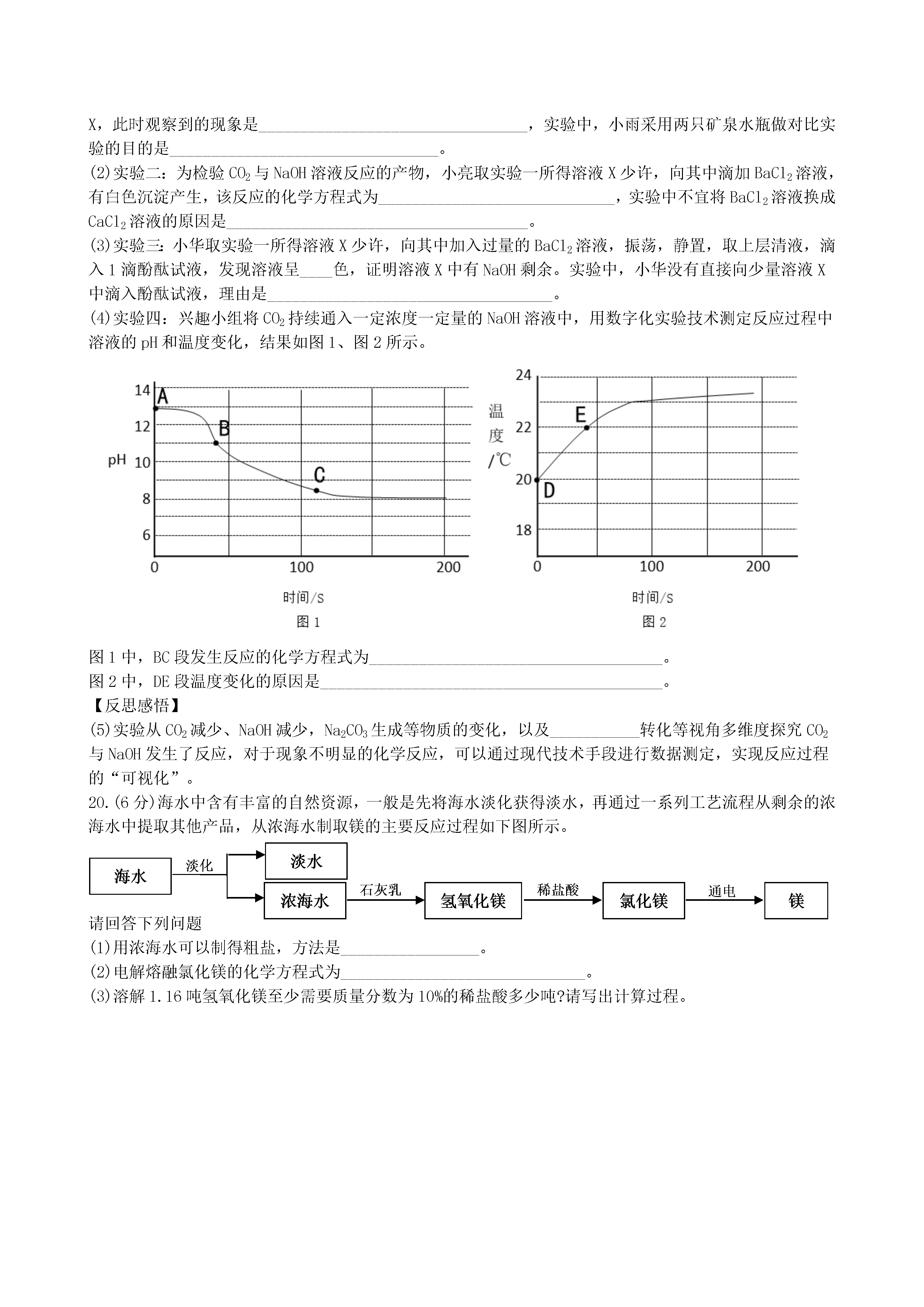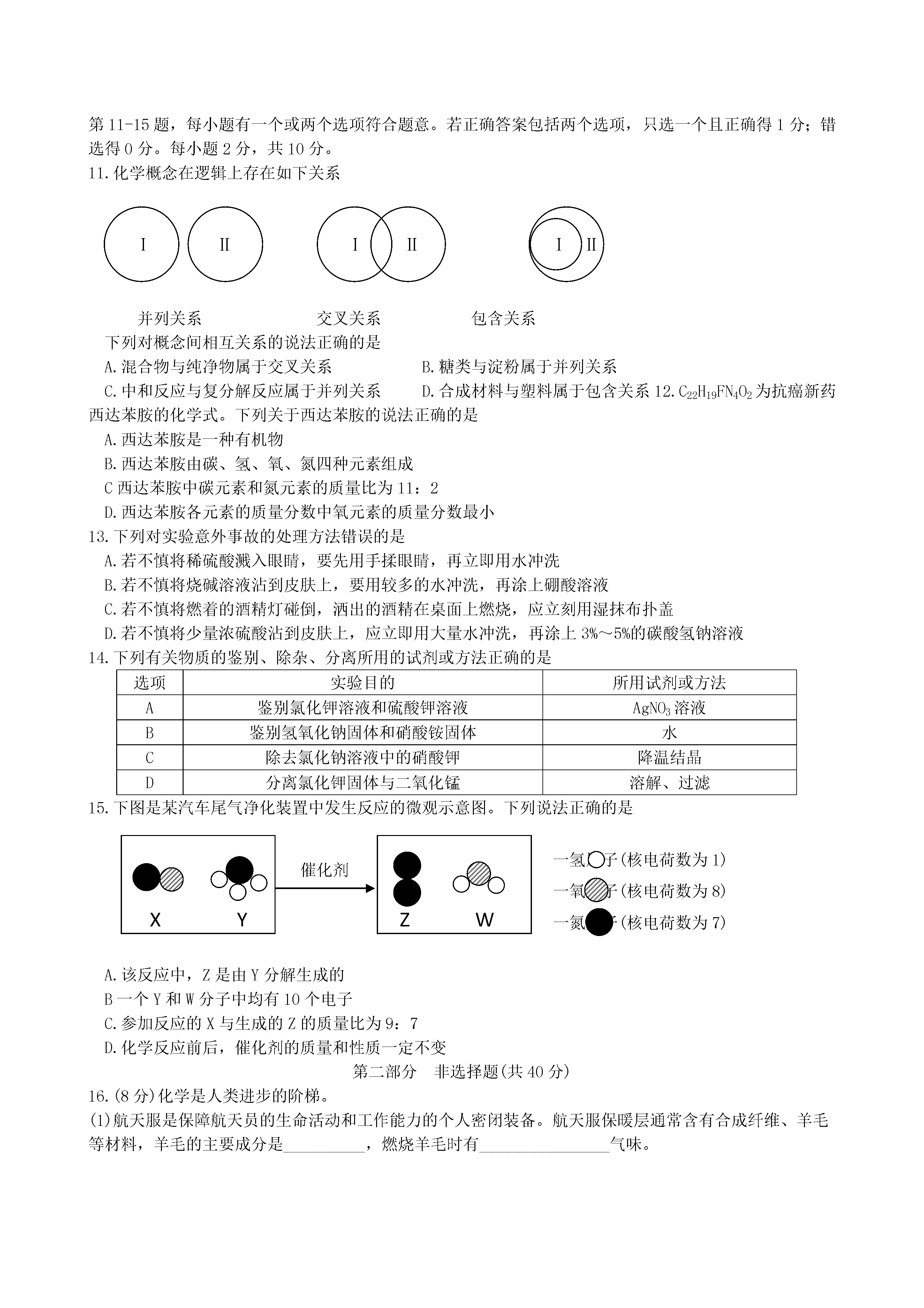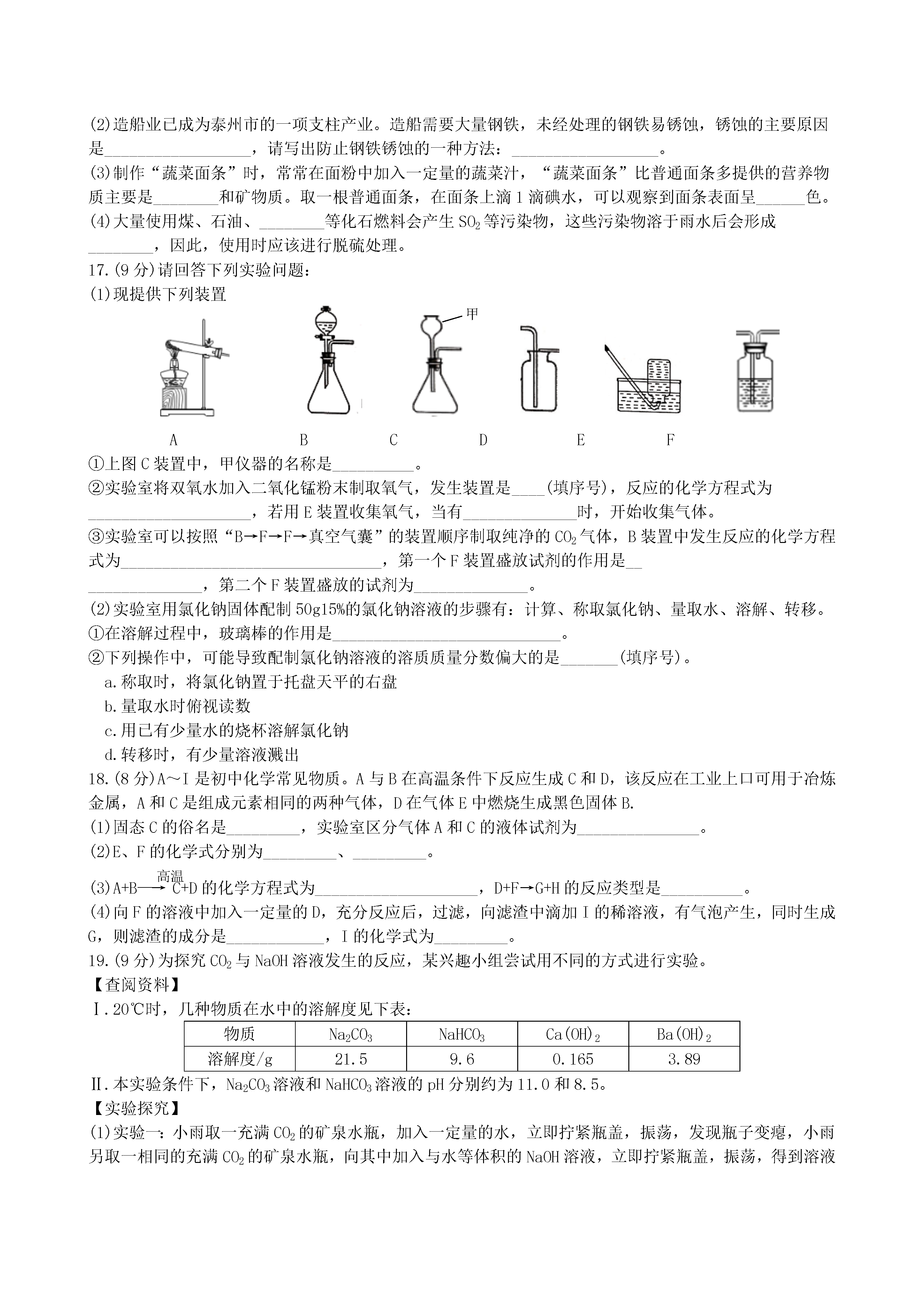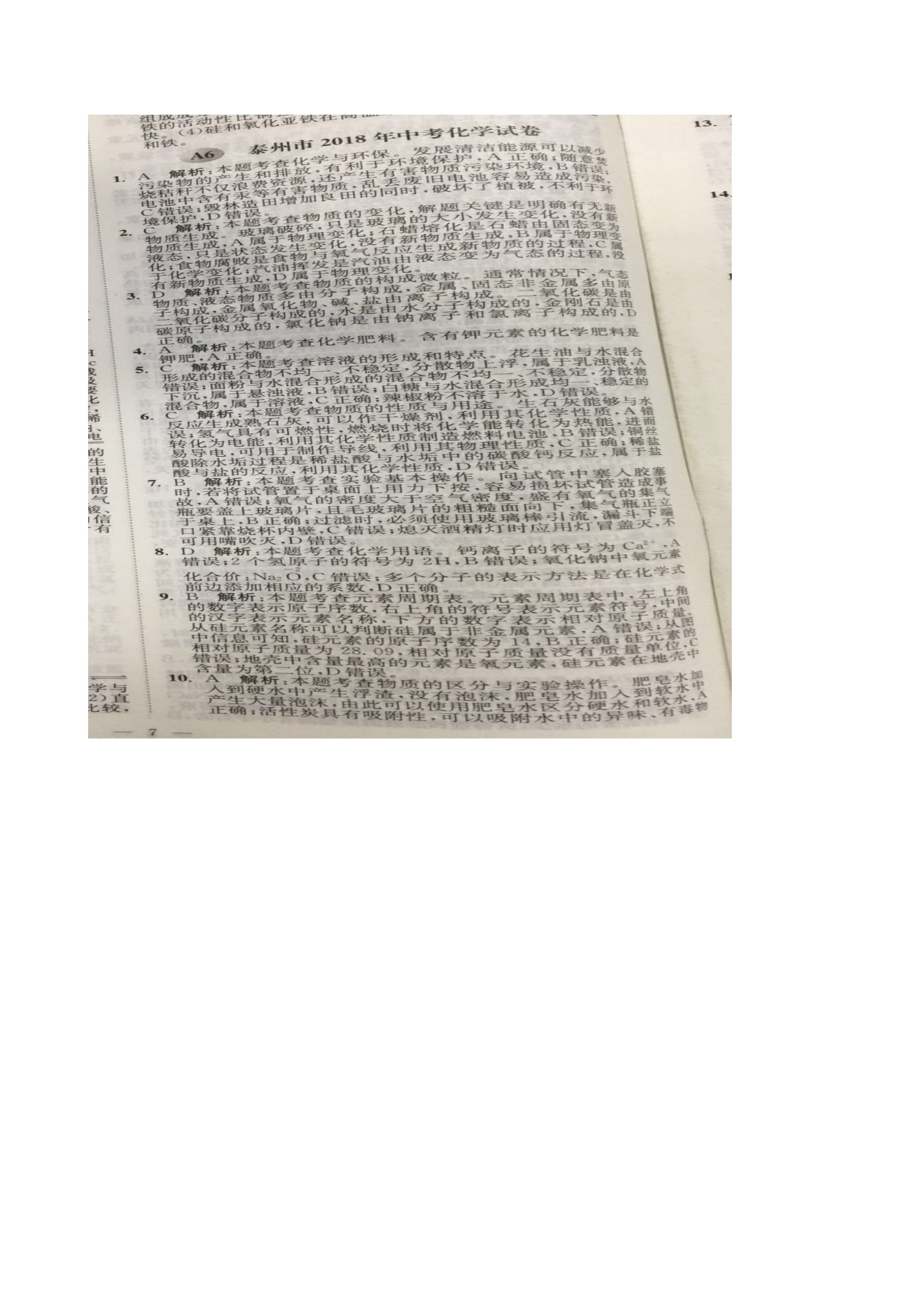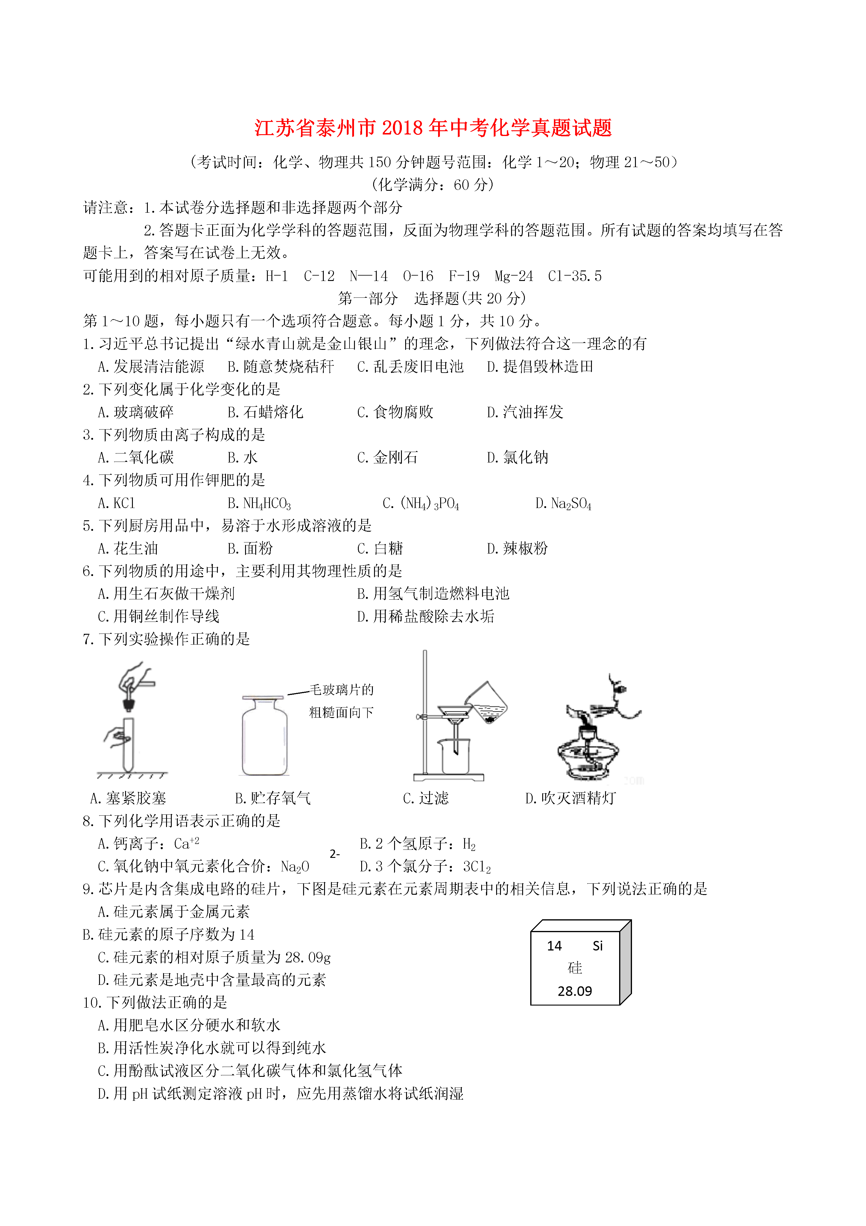 江苏省泰州市2018年中考化学真题试题(考试时间:化学、物理共150分钟题号范围:化学1~20;物理21~50)(化学满分:60分)请注意:1.本试卷分选择题和非选择题两个部分2.答题卡正面为化学学科的答题范围,反面为物理学科的答题范围。所有试题的答案均填写在答题卡上,答案写在试卷上无效。可能用到的相对原子质量:H-1C-12N—14O-16F-19Mg-24Cl-35.5第一部分选择题(共20分)第1~10题,每小题只有一个选项符合题意。每小题1分,共10分。1.习近平总书记提出“绿水青山就是金山银山”的理念,下列做法符合这一理念的有A.发展清洁能源B.随意焚烧秸秆C.乱丢废旧电池D.提倡毁林造田2.下列变化属于化学变化的是A.玻璃破碎B.石蜡熔化C.食物腐败D.汽油挥发3.下列物质由离子构成的是A.二氧化碳B.水C.金刚石D.氯化钠4.下列物质可用作钾肥的是A.KClB.NH4HCO3C.(NH4)3PO4D.Na2SO45.下列厨房用品中,易溶于水形成溶液的是A.花生油B.面粉C.白糖D.辣椒粉6.下列物质的用途中,主要利用其物理性质的是A.用生石灰做干燥剂B.用氢气制造燃料电池C.用铜丝制作导线D.用稀盐酸除去水垢14Si硅28.09毛玻璃片的粗糙面向下2-7.下列实验操作正确的是A.塞紧胶塞B.贮存氧气C.过滤D.吹灭酒精灯8.下列化学用语表示正确的是A.钙离子:Ca+2B.2个氢原子:H2C.氧化钠中氧元素化合价:Na2OD.3个氯分子:3Cl29.芯片是内含集成电路的硅片,下图是硅元素在元素周期表中的相关信息,下列说法正确的是A.硅元素属于金属元素B.硅元素的原子序数为14C.硅元素的相对原子质量为28.09gD.硅元素是地壳中含量最高的元素10.下列做法正确的是A.用肥皂水区分硬水和软水B.用活性炭净化水就可以得到纯水C.用酚酞试液区分二氧化碳气体和氯化氢气体D.用pH试纸测定溶液pH时,应先用蒸馏水将试纸润湿第11-15题,每小题有一个或两个选项符合题意。若正确答案包括两个选项,只选一个且正确得1分;错选得0分。每小题2分,共10分。11.化学概念在逻辑上存在如下关系ⅠⅡⅠⅡⅠⅡ并列关系交叉关系包含关系下列对概念间相互关系的说法正确的是A.混合物与纯净物属于交叉关系B.糖类与淀粉属于并列关系C.中和反应与复分解反应属于并列关系D.合成材料与塑料属于包含关系12.C22H19FN4O2为抗癌新药西达苯胺的化学式。下列关于西达苯胺的说法正确的是A.西达苯胺是一种有机物B.西达苯胺由碳、氢、氧、氮四种元素组成C西达苯胺中碳元素和氮元素的质量比为11:2D.西达苯胺各元素的质量分数中氧元素的质量分数最小13.下列对实验意外事故的处理方法错误的是A.若不慎将稀硫酸溅入眼睛,要先用手揉眼睛,再立即用水冲洗B.若不慎将烧碱溶液沾到皮肤上,要用较多的水冲洗,再涂上硼酸溶液C.若不慎将燃着的酒精灯碰倒,洒出的酒精在桌面上燃烧,应立刻用湿抹布扑盖D.若不慎将少量浓硫酸沾到皮肤上,应立即用大量水冲洗,再涂上3%~5%的碳酸氢钠溶液14.下列有关物质的鉴别、除杂、分离所用的试剂或方法正确的是选项实验目的所用试剂或方法A鉴别氯化钾溶液和硫酸钾溶液AgNO3溶液B鉴别氢氧化钠固体和硝酸铵固体水C除去氯化钠溶液中的硝酸钾降温结晶D分离氯化钾固体与二氧化锰溶解、过滤15.下图是某汽车尾气净化装置中发生反应的微观示意图。下列说法正确的是催化剂XYZW一氢原子(核电荷数为1)一氧原子(核电荷数为8)一氮原子(核电荷数为7)A.该反应中,Z是由Y分解生成的B一个Y和W分子中均有10个电子C.参加反应的X与生成的Z的质量比为9:7D.化学反应前后,催化剂的质量和性质一定不变第二部分非选择题(共40分)16.(8分)化学是人类进步的阶梯。(1)航天服是保障航天员的生命活动和工作能力的个人密闭装备。航天服保暖层通常含有合成纤维、羊毛等材料,羊毛的主要成分是__________,燃烧羊毛时有________________气味。(2)造船业已成为泰州市的一项支柱产业。造船需要大量钢铁,未经处理的钢铁易锈蚀,锈蚀的主要原因是__________________,请写出防止钢铁锈蚀的一种方法:__________________。(3)制作“蔬菜面条”时,常常在面粉中加入一定量的蔬菜汁,“蔬菜面条”比普通面条多提供的营养物质主要是________和矿物质。取一根普通面条,在面条上滴1滴碘水,可以观察到面
