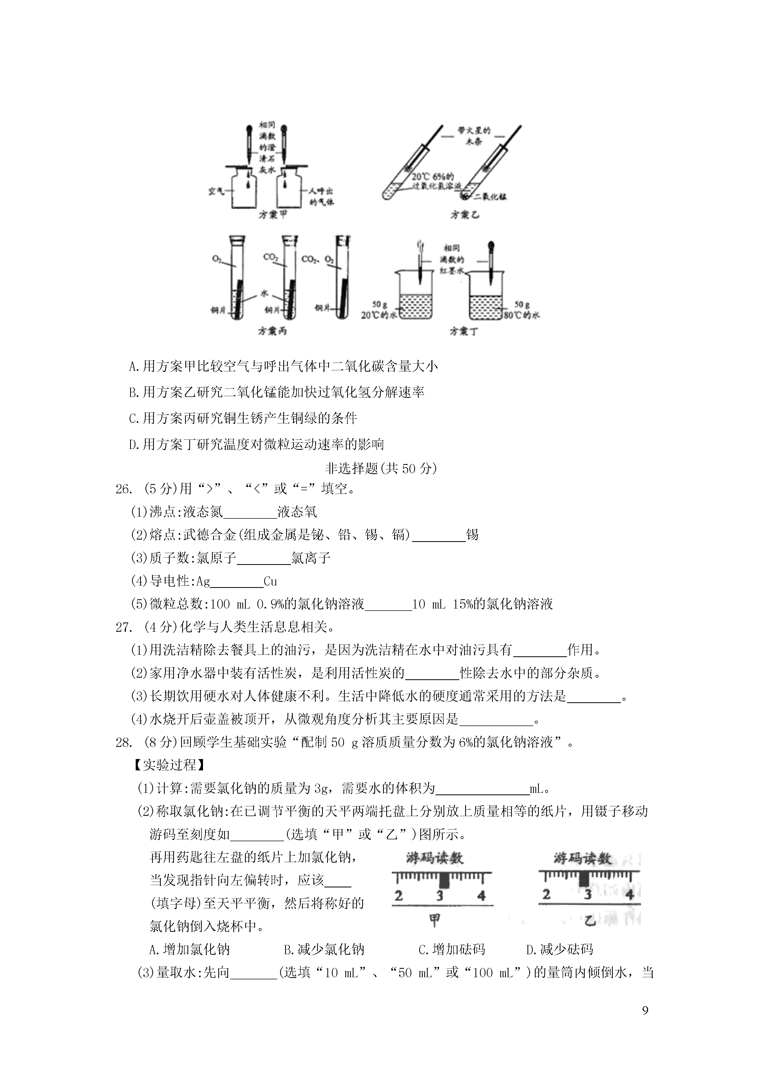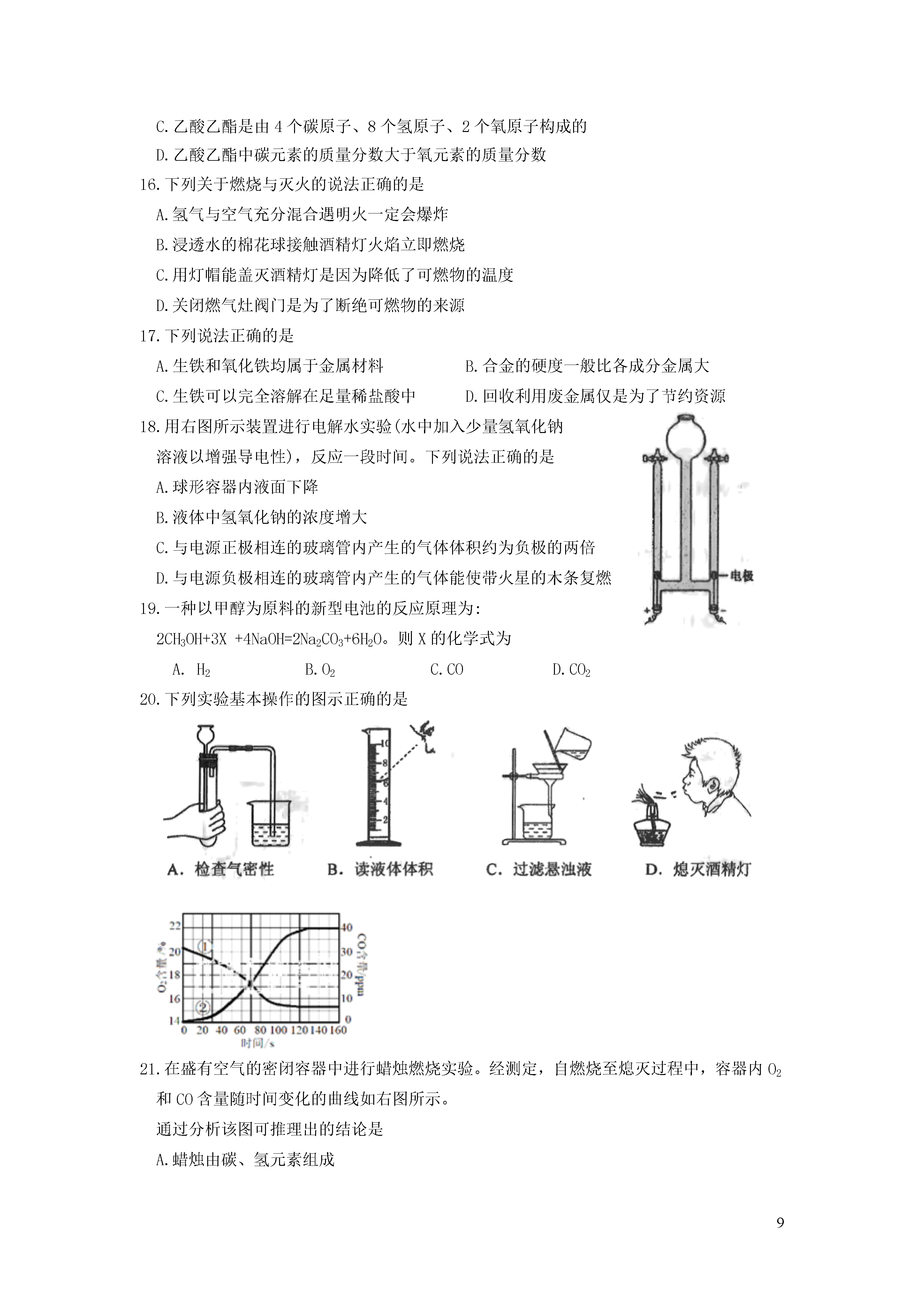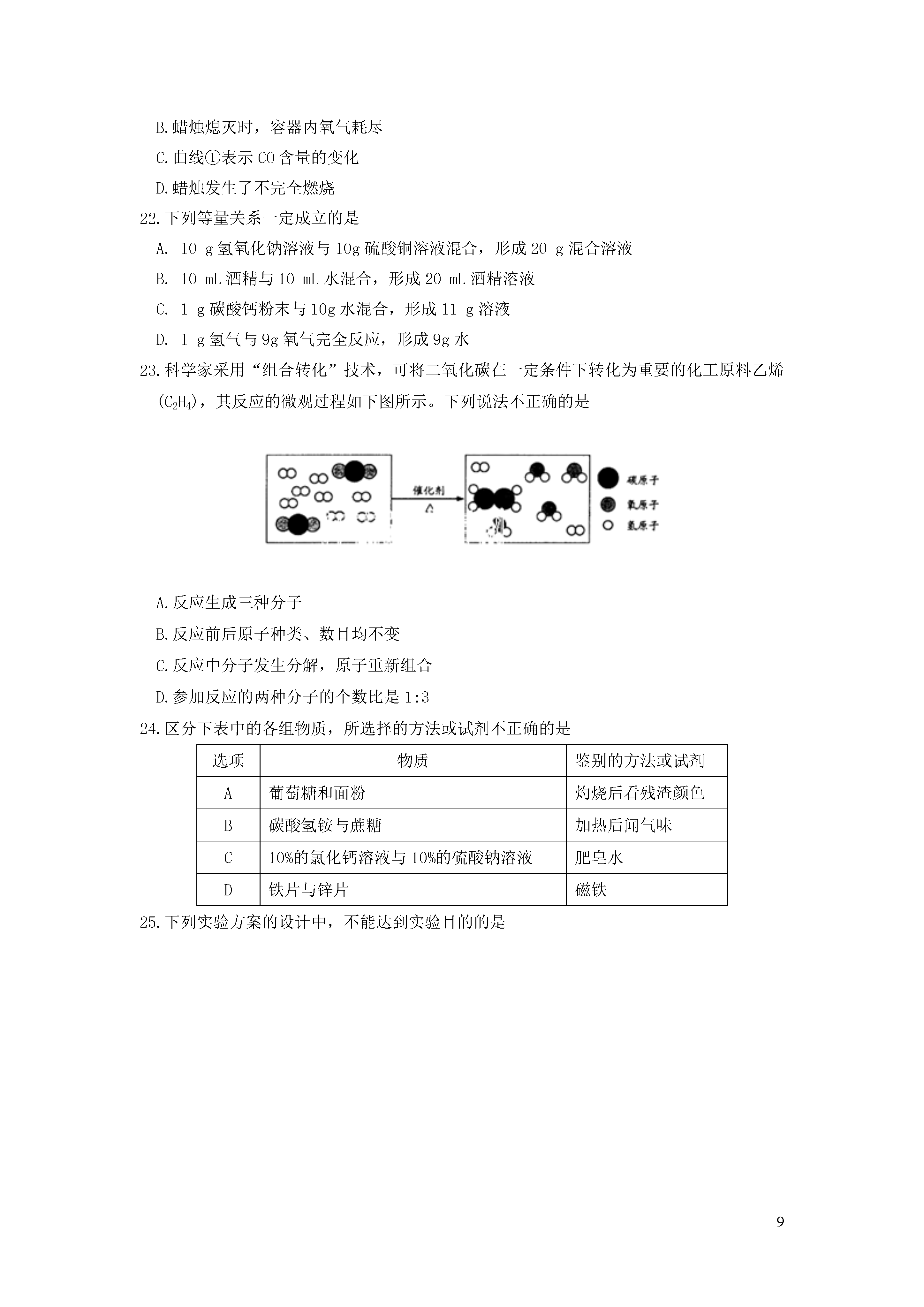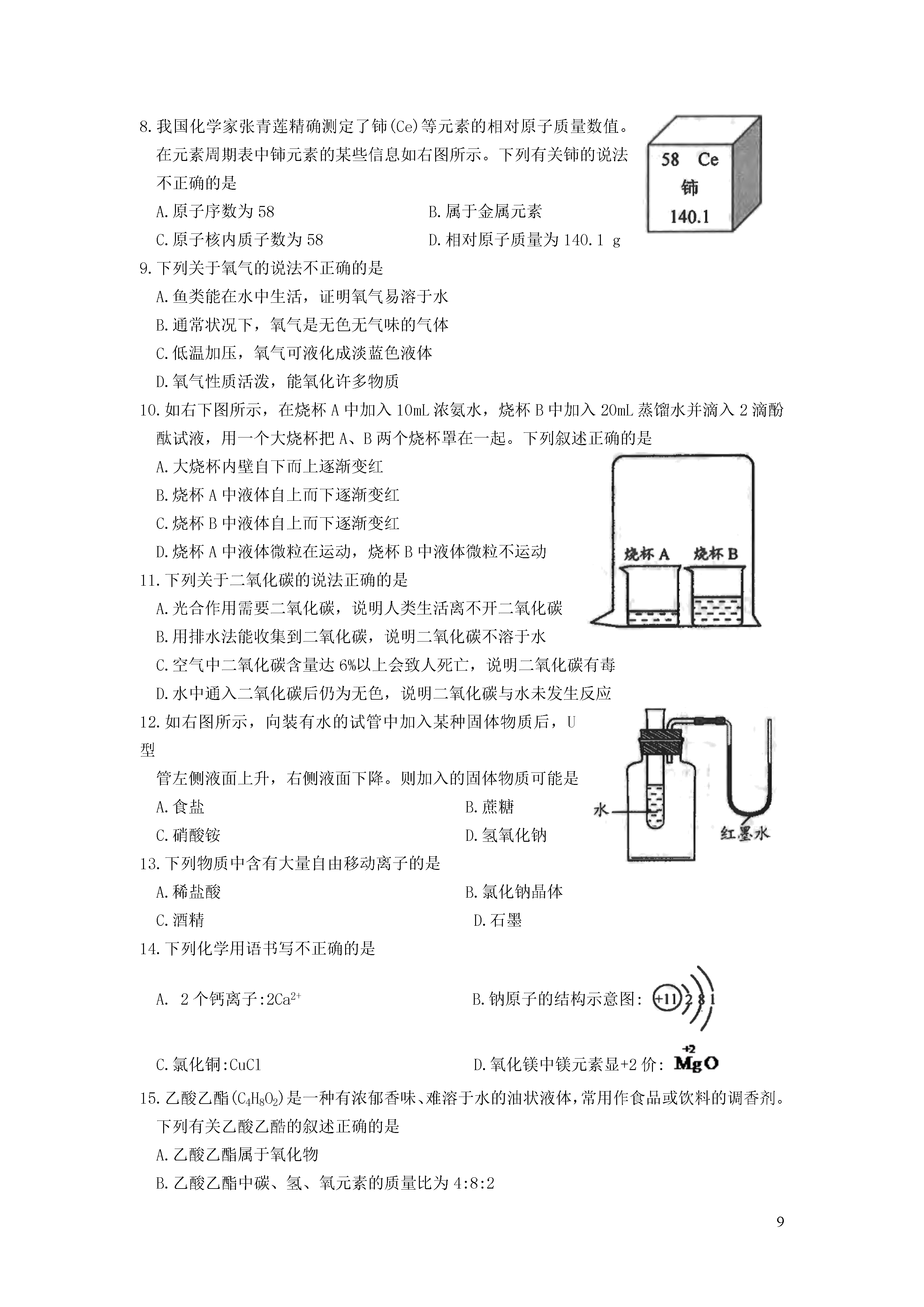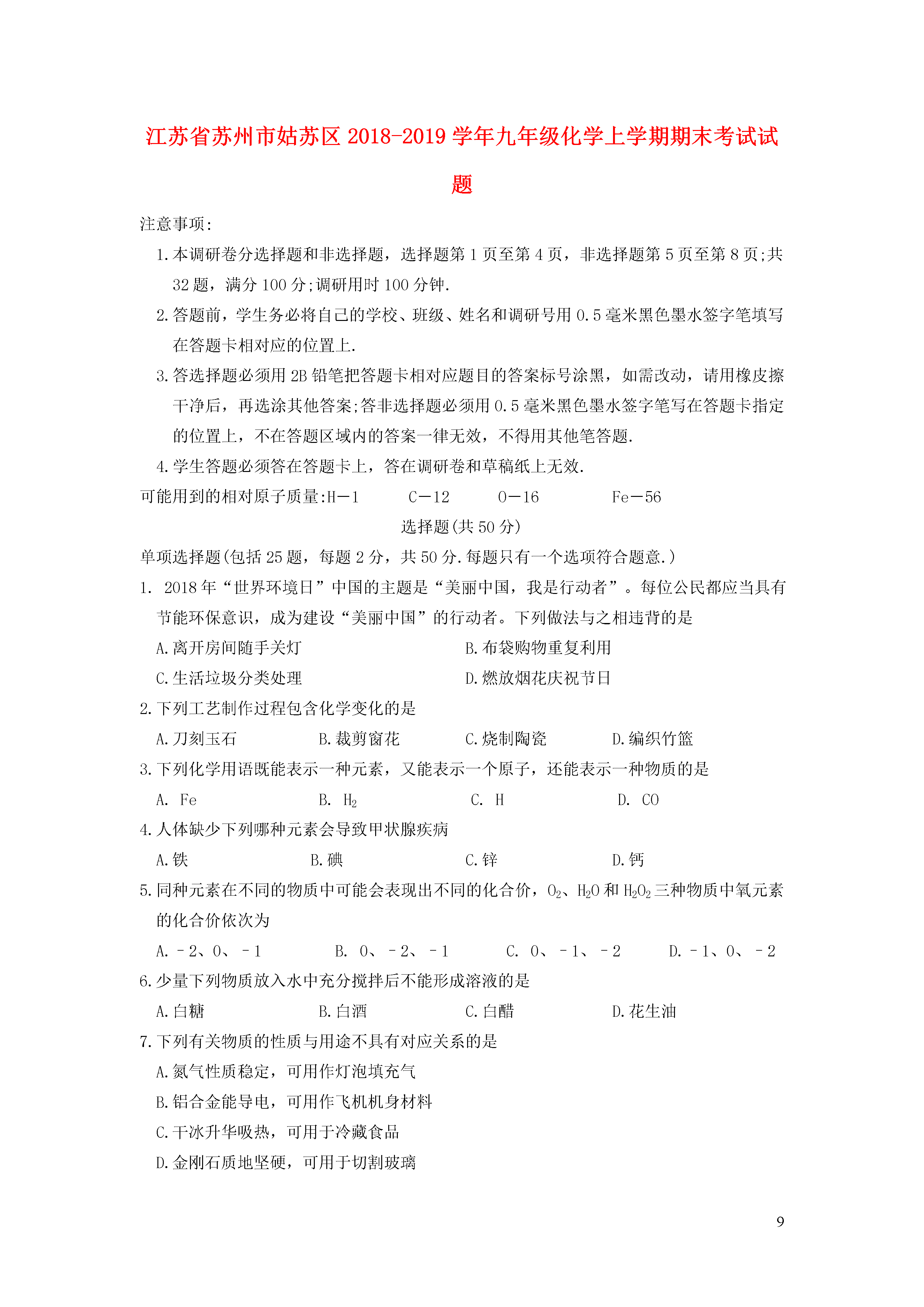9江苏省苏州市姑苏区2018-2019学年九年级化学上学期期末考试试题注意事项:1.本调研卷分选择题和非选择题,选择题至,非选择题至;共32题,满分100分;调研用时100分钟.2.答题前,学生务必将自己的学校、班级、姓名和调研号用0.5毫米黑色墨水签字笔填写在答题卡相对应的位置上.3.答选择题必须用2B铅笔把答题卡相对应题目的答案标号涂黑,如需改动,请用橡皮擦干净后,再选涂其他答案;答非选择题必须用0.5毫米黑色墨水签字笔写在答题卡指定的位置上,不在答题区域内的答案一律无效,不得用其他笔答题.4.学生答题必须答在答题卡上,答在调研卷和草稿纸上无效.可能用到的相对原子质量:H―1C―12O―16Fe―56选择题(共50分)单项选择题(包括25题,每题2分,共50分.每题只有一个选项符合题意.)1.2018年“世界环境日”中国的主题是“美丽中国,我是行动者”。每位公民都应当具有节能环保意识,成为建设“美丽中国”的行动者。下列做法与之相违背的是A.离开房间随手关灯B.布袋购物重复利用C.生活垃圾分类处理D.燃放烟花庆祝节日2.下列工艺制作过程包含化学变化的是A.刀刻玉石B.裁剪窗花C.烧制陶瓷D.编织竹篮3.下列化学用语既能表示一种元素,又能表示一个原子,还能表示一种物质的是A.FeB.H2C.HD.CO4.人体缺少下列哪种元素会导致甲状腺疾病A.铁B.碘C.锌D.钙5.同种元素在不同的物质中可能会表现出不同的化合价,O2、H2O和H2O2三种物质中氧元素的化合价依次为A.–2、0、–1B.0、–2、–1C.0、–1、–2D.–1、0、–26.少量下列物质放入水中充分搅拌后不能形成溶液的是A.白糖B.白酒C.白醋D.花生油7.下列有关物质的性质与用途不具有对应关系的是A.氮气性质稳定,可用作灯泡填充气B.铝合金能导电,可用作飞机机身材料C.干冰升华吸热,可用于冷藏食品D.金刚石质地坚硬,可用于切割玻璃8.我国化学家张青莲精确测定了铈(Ce)等元素的相对原子质量数值。在元素周期表中铈元素的某些信息如右图所示。下列有关铈的说法不正确的是A.原子序数为58B.属于金属元素C.原子核内质子数为58D.相对原子质量为140.1g9.下列关于氧气的说法不正确的是A.鱼类能在水中生活,证明氧气易溶于水B.通常状况下,氧气是无色无气味的气体C.低温加压,氧气可液化成淡蓝色液体D.氧气性质活泼,能氧化许多物质10.如右下图所示,在烧杯A中加入10mL浓氨水,烧杯B中加入20mL蒸馏水并滴入2滴酚酞试液,用一个大烧杯把A、B两个烧杯罩在一起。下列叙述正确的是A.大烧杯内壁自下而上逐渐变红B.烧杯A中液体自上而下逐渐变红C.烧杯B中液体自上而下逐渐变红D.烧杯A中液体微粒在运动,烧杯B中液体微粒不运动11.下列关于二氧化碳的说法正确的是A.光合作用需要二氧化碳,说明人类生活离不开二氧化碳B.用排水法能收集到二氧化碳,说明二氧化碳不溶于水C.空气中二氧化碳含量达6%以上会致人死亡,说明二氧化碳有毒D.水中通入二氧化碳后仍为无色,说明二氧化碳与水未发生反应12.如右图所示,向装有水的试管中加入某种固体物质后,U型管左侧液面上升,右侧液面下降。则加入的固体物质可能是A.食盐B.蔗糖C.硝酸铵D.氢氧化钠13.下列物质中含有大量自由移动离子的是A.稀盐酸B.氯化钠晶体C.酒精D.石墨14.下列化学用语书写不正确的是A.2个钙离子:2Ca2+B.钠原子的结构示意图:C.氯化铜:CuClD.氧化镁中镁元素显+2价:15.乙酸乙酯(C4H8O2)是一种有浓郁香味、难溶于水的油状液体,常用作食品或饮料的调香剂。下列有关乙酸乙酷的叙述正确的是A.乙酸乙酯属于氧化物B.乙酸乙酯中碳、氢、氧元素的质量比为4:8:2C.乙酸乙酯是由4个碳原子、8个氢原子、2个氧原子构成的D.乙酸乙酯中碳元素的质量分数大于氧元素的质量分数16.下列关于燃烧与灭火的说法正确的是A.氢气与空气充分混合遇明火一定会爆炸B.浸透水的棉花球接触酒精灯火焰立即燃烧C.用灯帽能盖灭酒精灯是因为降低了可燃物的温度D.关闭燃气灶阀门是为了断绝可燃物的来源17.下列说法正确的是A.生铁和氧化铁均属于金属材料B.合金的硬度一般比各成分金属大C.生铁可以完全溶解在足量稀盐酸中D.回收利用废金属仅是为了节约资源18.用右图所示装置进行电解水实验(水中加入少量氢氧化钠溶液以增强导电性),反应一段时间。下列说法正确的是A.球形容器内液面下降B.液体中氢氧化钠的浓度增大C.与电源正极相连的玻璃管内产生的气体体积约为负极的两倍D.与电源负极相连的玻