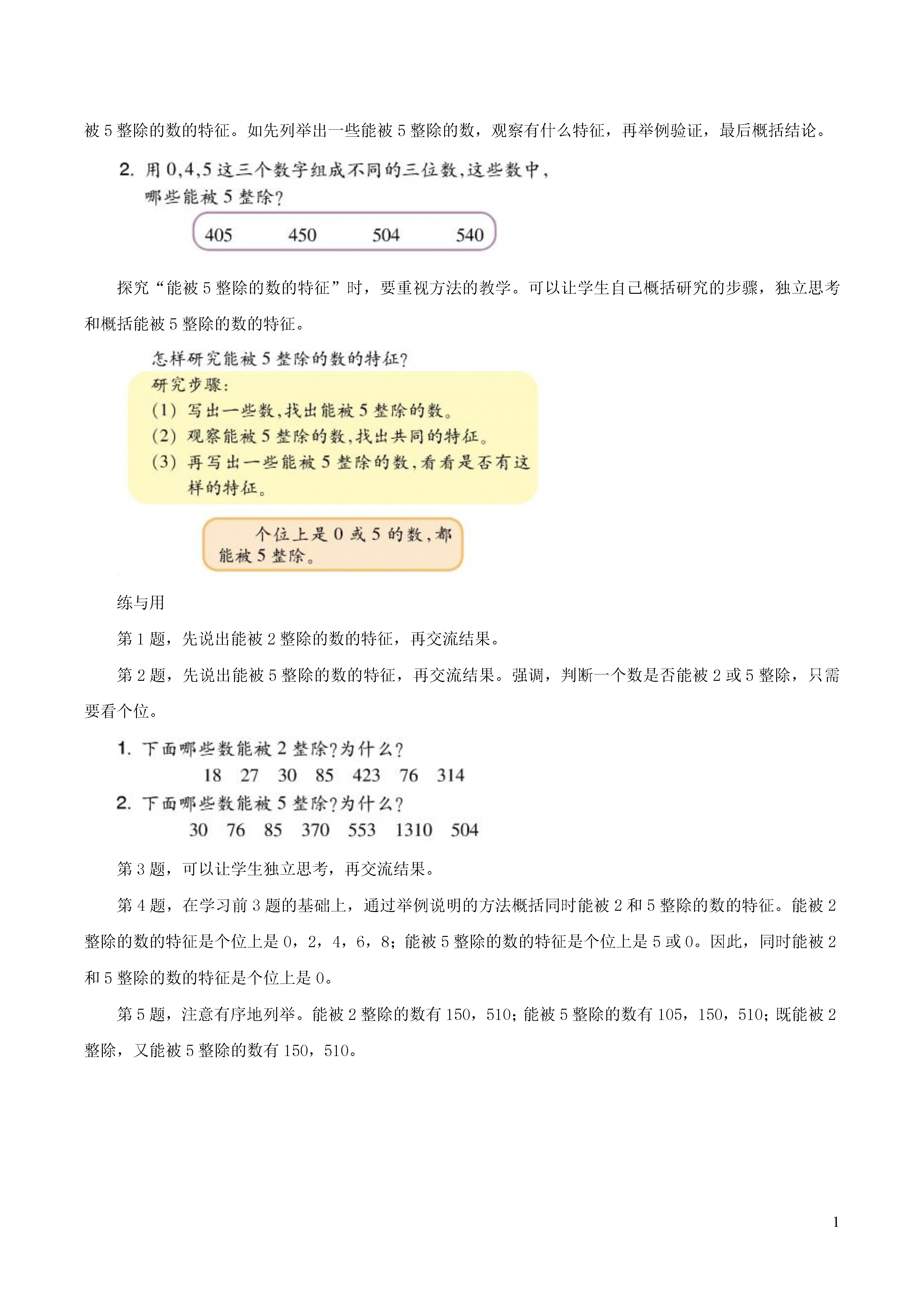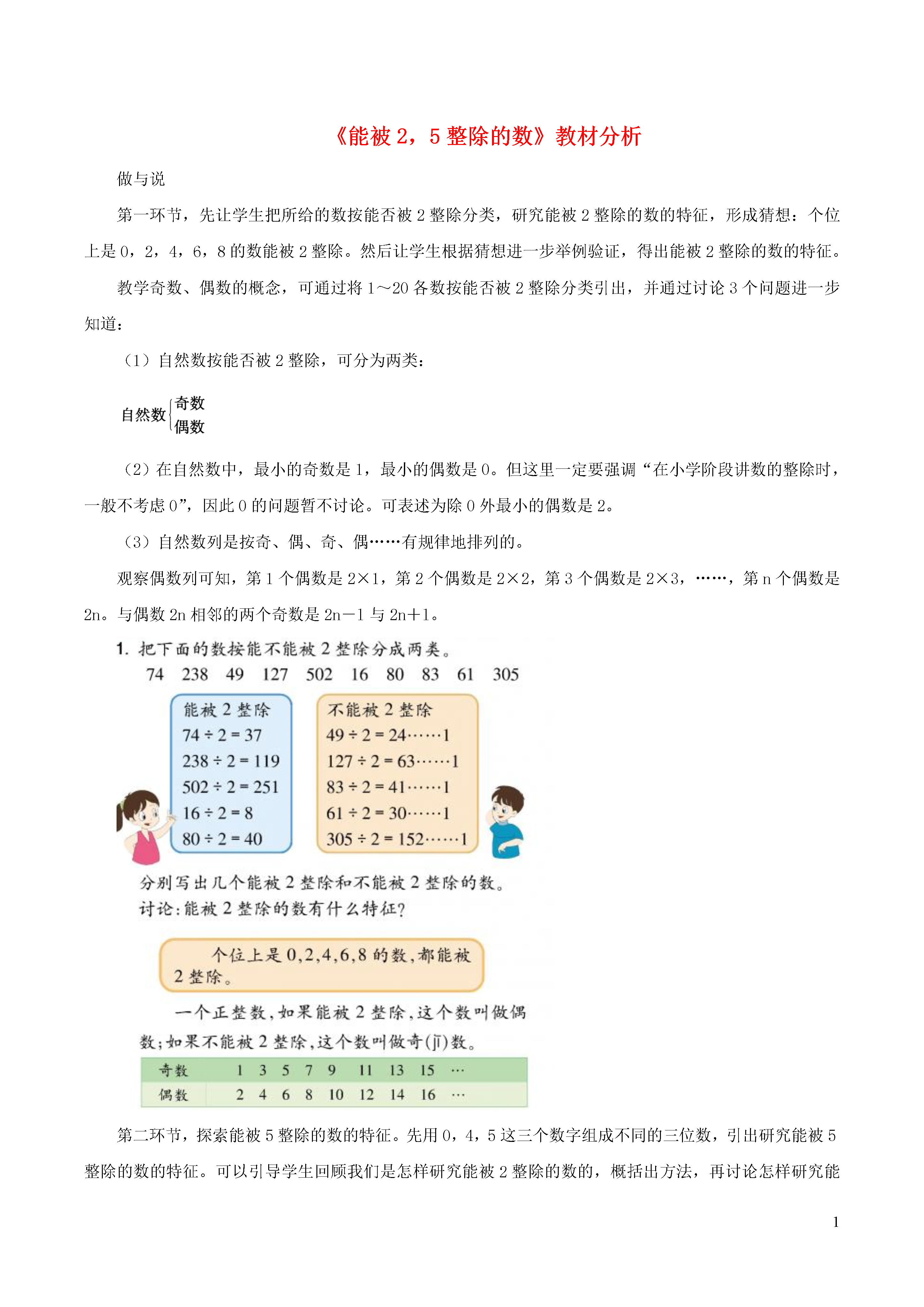 1《能被2,5整除的数》教材分析做与说第一环节,先让学生把所给的数按能否被2整除分类,研究能被2整除的数的特征,形成猜想:个位上是0,2,4,6,8的数能被2整除。然后让学生根据猜想进一步举例验证,得出能被2整除的数的特征。教学奇数、偶数的概念,可通过将1~20各数按能否被2整除分类引出,并通过讨论3个问题进一步知道:(1)自然数按能否被2整除,可分为两类:(2)在自然数中,最小的奇数是1,最小的偶数是0。但这里一定要强调“在小学阶段讲数的整除时,一般不考虑0”,因此0的问题暂不讨论。可表述为除0外最小的偶数是2。(3)自然数列是按奇、偶、奇、偶……有规律地排列的。观察偶数列可知,第1个偶数是2×1,第2个偶数是2×2,第3个偶数是2×3,……,第n个偶数是2n。与偶数2n相邻的两个奇数是2n-l与2n+l。第二环节,探索能被5整除的数的特征。先用0,4,5这三个数字组成不同的三位数,引出研究能被5整除的数的特征。可以引导学生回顾我们是怎样研究能被2整除的数的,概括出方法,再讨论怎样研究能被5整除的数的特征。如先列举出一些能被5整除的数,观察有什么特征,再举例验证,最后概括结论。探究“能被5整除的数的特征”时,要重视方法的教学。可以让学生自己概括研究的步骤,独立思考和概括能被5整除的数的特征。练与用第1题,先说出能被2整除的数的特征,再交流结果。第2题,先说出能被5整除的数的特征,再交流结果。强调,判断一个数是否能被2或5整除,只需要看个位。第3题,可以让学生独立思考,再交流结果。第4题,在学习前3题的基础上,通过举例说明的方法概括同时能被2和5整除的数的特征。能被2整除的数的特征是个位上是0,2,4,6,8;能被5整除的数的特征是个位上是5或0。因此,同时能被2和5整除的数的特征是个位上是0。第5题,注意有序地列举。能被2整除的数有150,510;能被5整除的数有105,150,510;既能被2整除,又能被5整除的数有150,510。