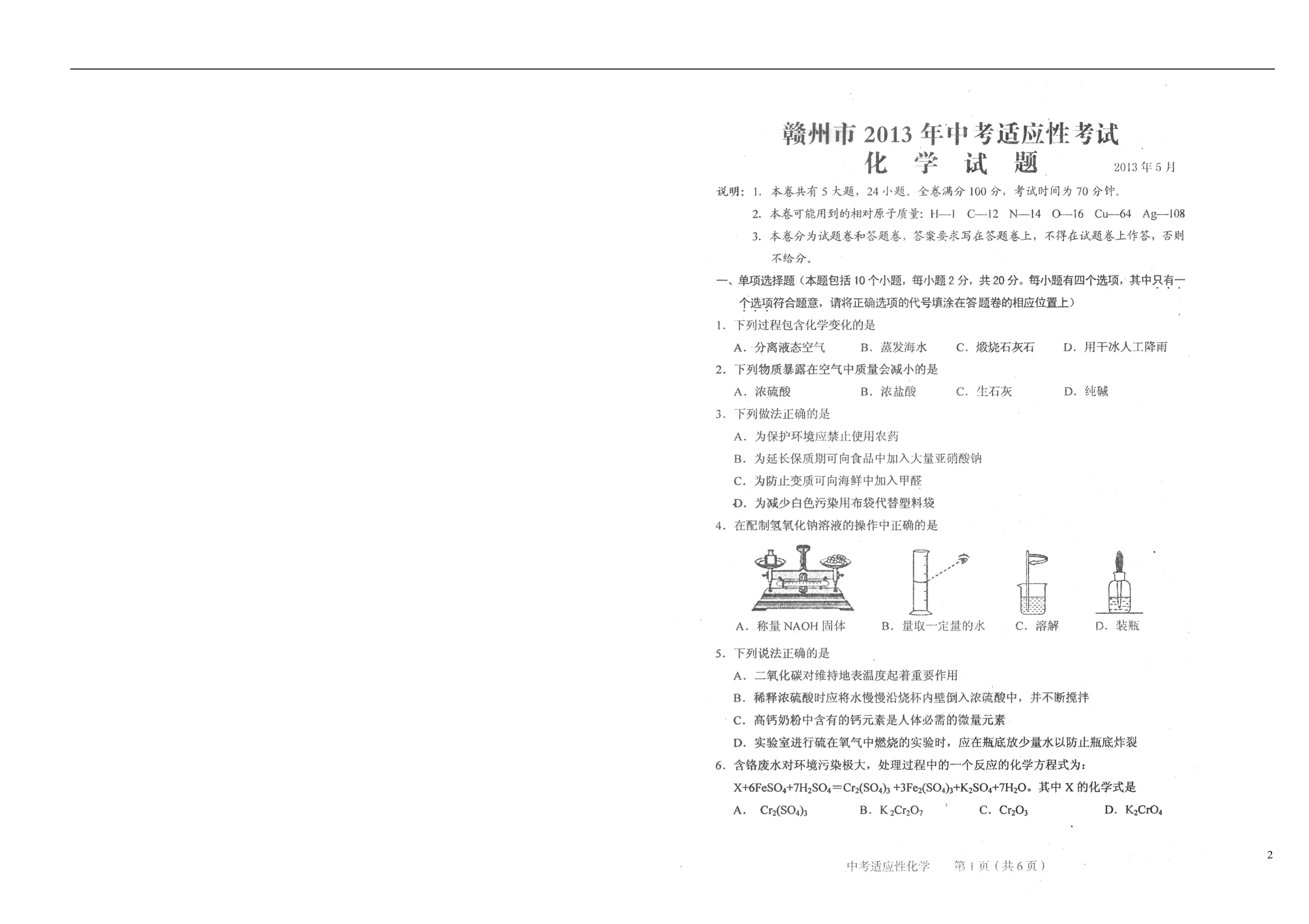 14江西省赣州市2013年中考化学适应性考试试题(扫描版)