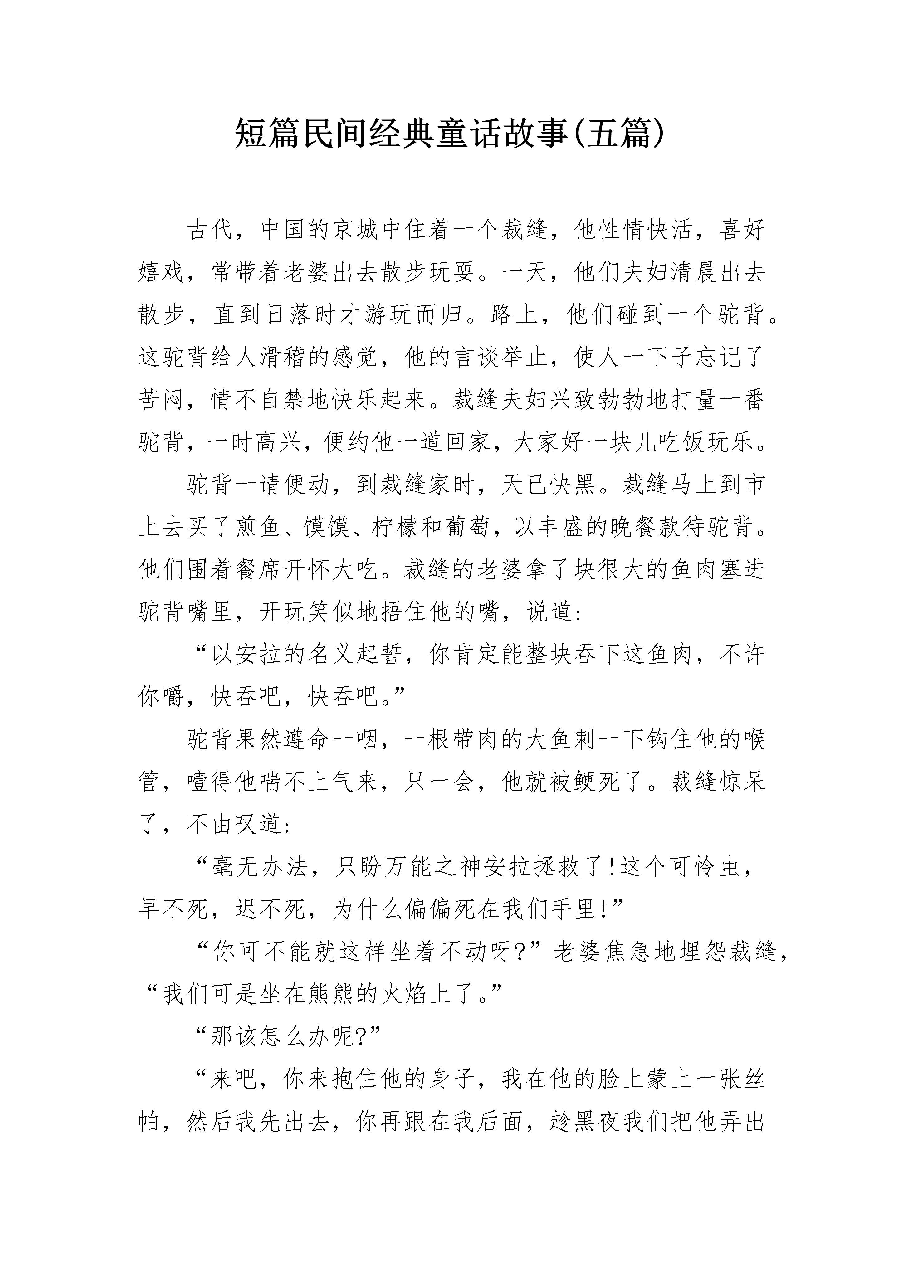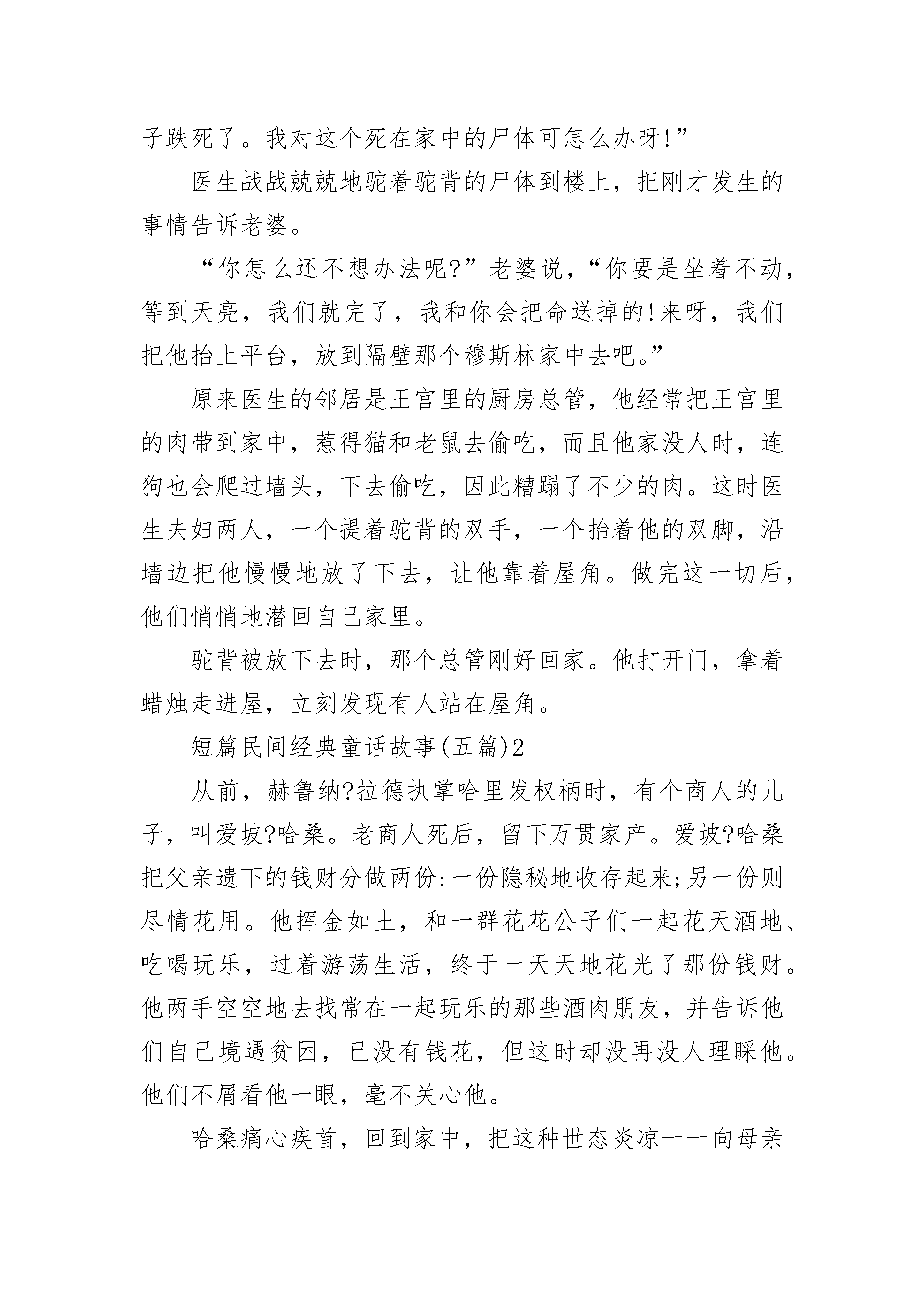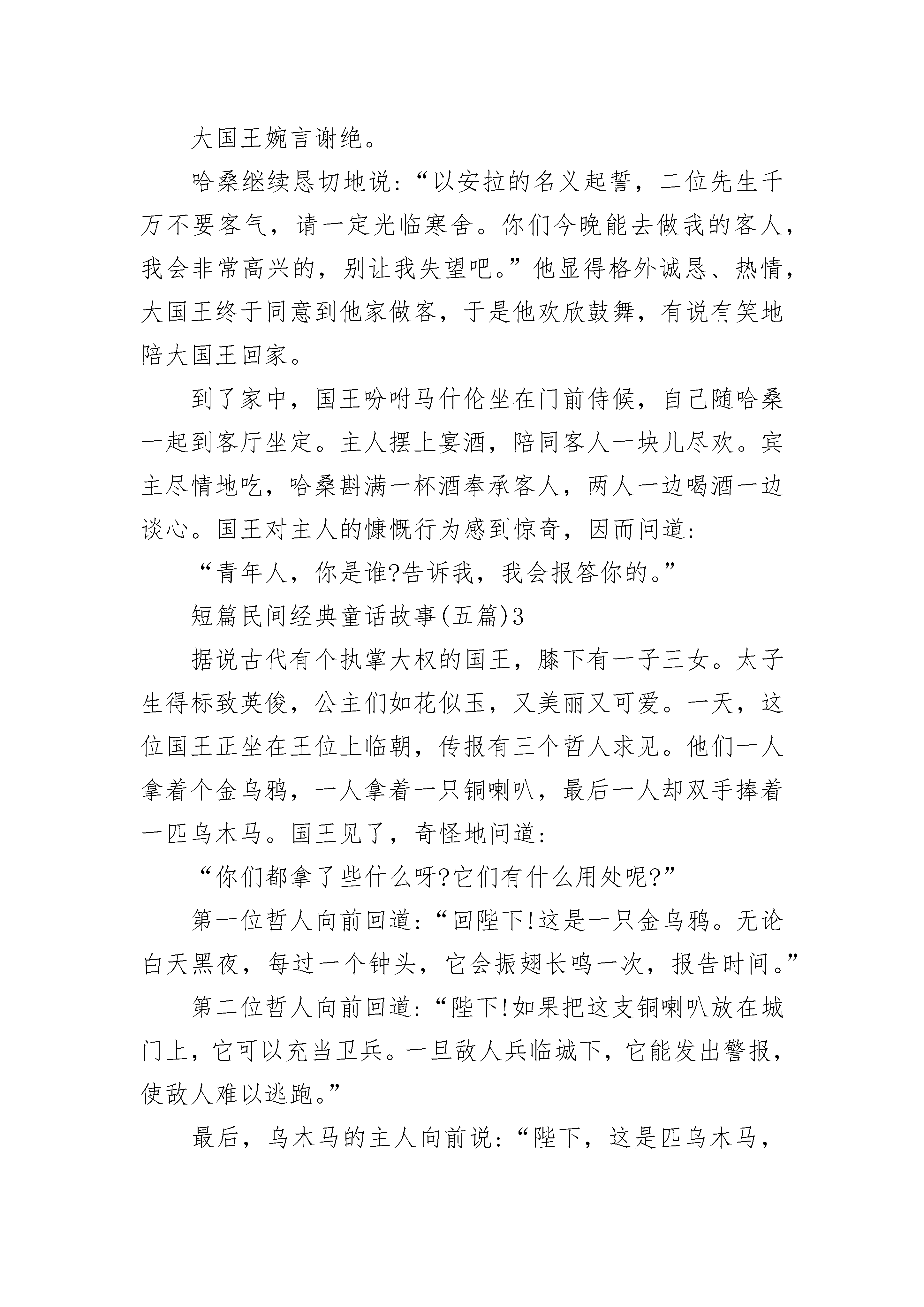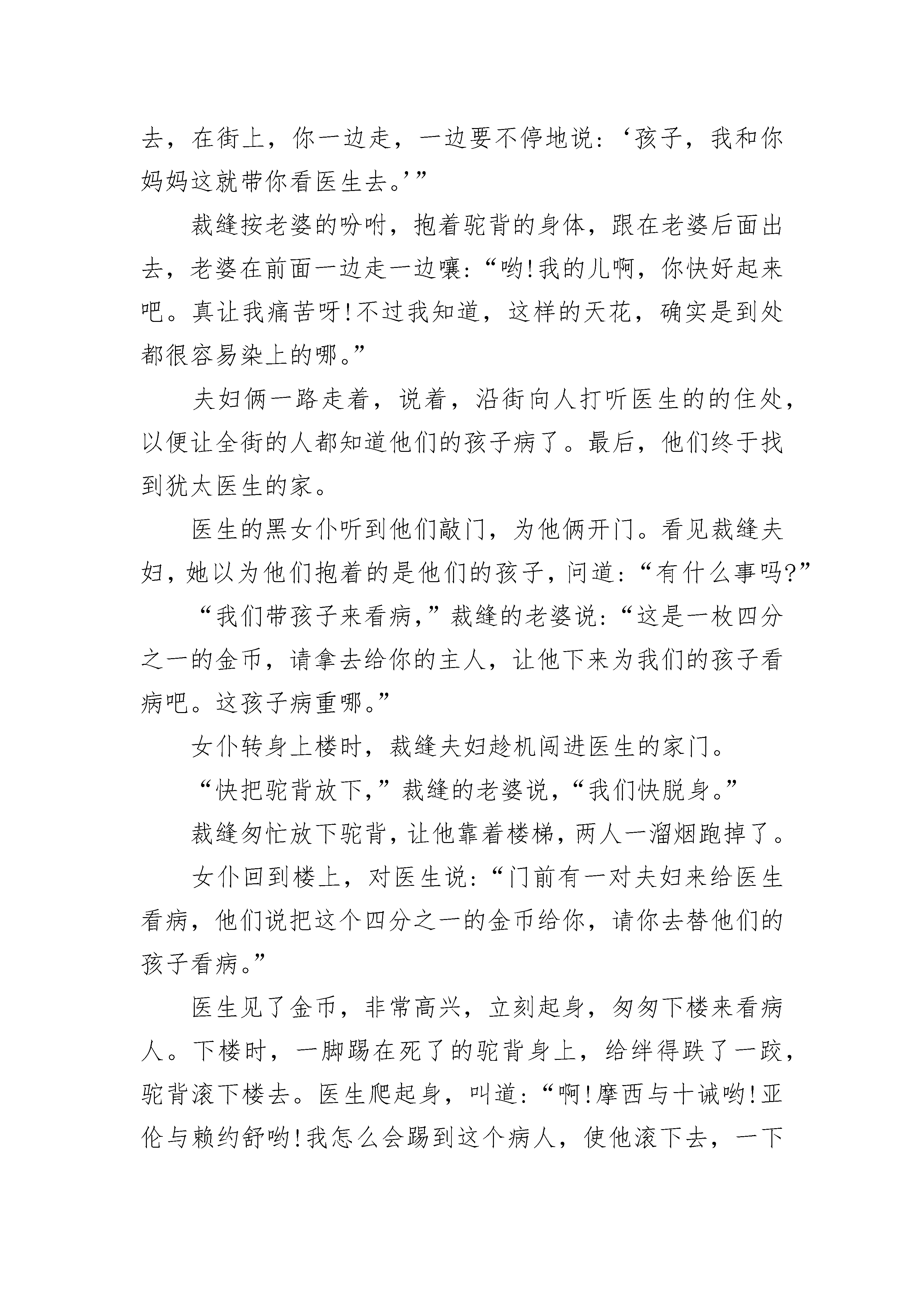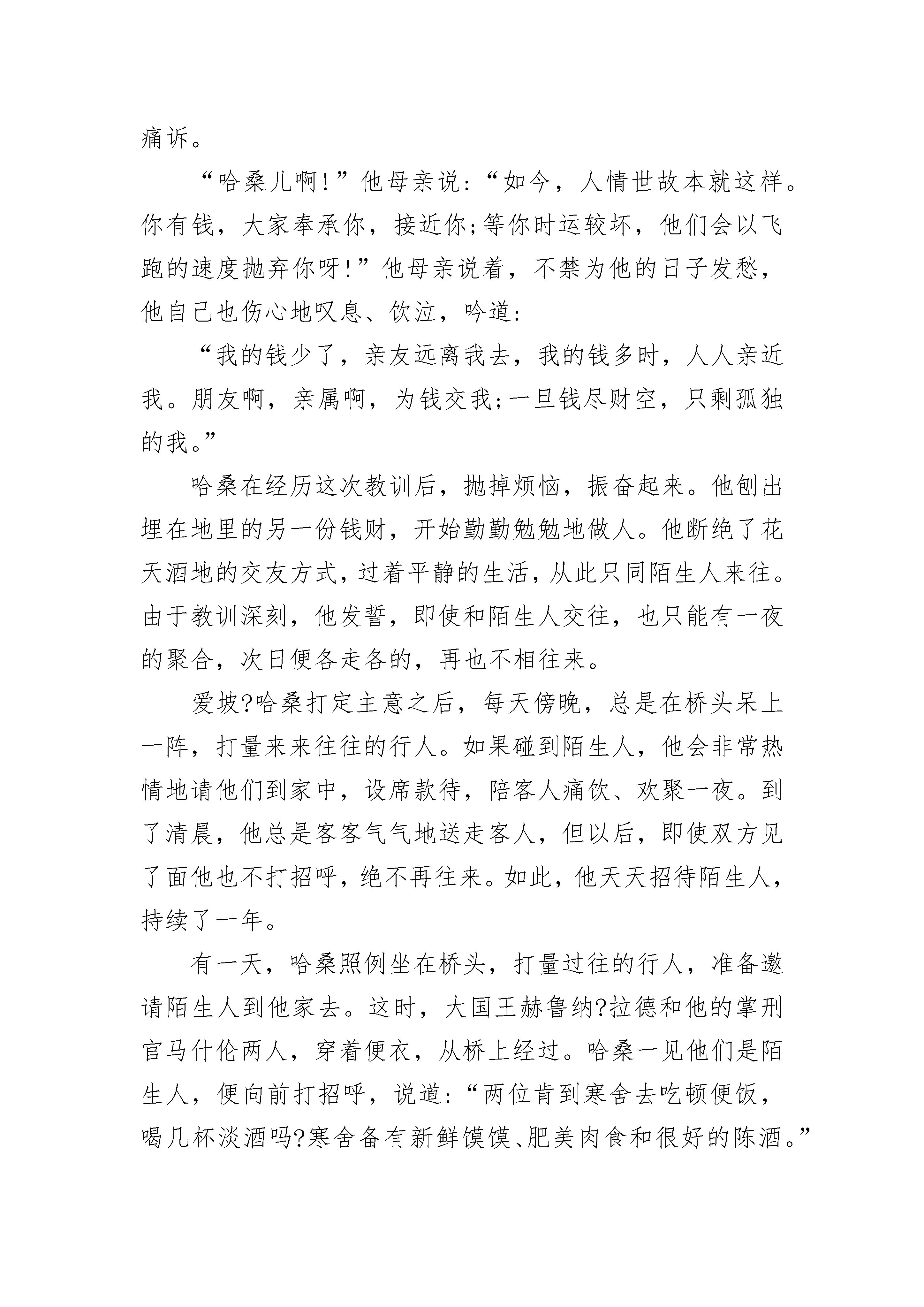 短篇民间经典童话故事(五篇)古代,中国的京城中住着一个裁缝,他性情快活,喜好嬉戏,常带着老婆出去散步玩耍。一天,他们夫妇清晨出去散步,直到日落时才游玩而归。路上,他们碰到一个驼背。这驼背给人滑稽的感觉,他的言谈举止,使人一下子忘记了苦闷,情不自禁地快乐起来。裁缝夫妇兴致勃勃地打量一番驼背,一时高兴,便约他一道回家,大家好一块儿吃饭玩乐。驼背一请便动,到裁缝家时,天已快黑。裁缝马上到市上去买了煎鱼、馍馍、柠檬和葡萄,以丰盛的晚餐款待驼背。他们围着餐席开怀大吃。裁缝的老婆拿了块很大的鱼肉塞进驼背嘴里,开玩笑似地捂住他的嘴,说道:“以安拉的名义起誓,你肯定能整块吞下这鱼肉,不许你嚼,快吞吧,快吞吧。”驼背果然遵命一咽,一根带肉的大鱼刺一下钩住他的喉管,噎得他喘不上气来,只一会,他就被鲠死了。裁缝惊呆了,不由叹道:“毫无办法,只盼万能之神安拉拯救了!这个可怜虫,早不死,迟不死,为什么偏偏死在我们手里!”“你可不能就这样坐着不动呀?”老婆焦急地埋怨裁缝,“我们可是坐在熊熊的火焰上了。”“那该怎么办呢?”“来吧,你来抱住他的身子,我在他的脸上蒙上一张丝帕,然后我先出去,你再跟在我后面,趁黑夜我们把他弄出去,在街上,你一边走,一边要不停地说:‘孩子,我和你妈妈这就带你看医生去。’”裁缝按老婆的吩咐,抱着驼背的身体,跟在老婆后面出去,老婆在前面一边走一边嚷:“哟!我的儿啊,你快好起来吧。真让我痛苦呀!不过我知道,这样的天花,确实是到处都很容易染上的哪。”夫妇俩一路走着,说着,沿街向人打听医生的的住处,以便让全街的人都知道他们的孩子病了。最后,他们终于找到犹太医生的家。医生的黑女仆听到他们敲门,为他俩开门。看见裁缝夫妇,她以为他们抱着的是他们的孩子,问道:“有什么事吗?”“我们带孩子来看病,”裁缝的老婆说:“这是一枚四分之一的金币,请拿去给你的主人,让他下来为我们的孩子看病吧。这孩子病重哪。”女仆转身上楼时,裁缝夫妇趁机闯进医生的家门。“快把驼背放下,”裁缝的老婆说,“我们快脱身。”裁缝匆忙放下驼背,让他靠着楼梯,两人一溜烟跑掉了。女仆回到楼上,对医生说:“门前有一对夫妇来给医生看病,他们说把这个四分之一的金币给你,请你去替他们的孩子看病。”医生见了金币,非常高兴,立刻起身,匆匆下楼来看病人。下楼时,一脚踢在死了的驼背身上,给绊得跌了一跤,驼背滚下楼去。医生爬起身,叫道:“啊!摩西与十诫哟!亚伦与赖约舒哟!我怎么会踢到这个病人,使他滚下去,一下子跌死了。我对这个死在家中的尸体可怎么办呀!”医生战战兢兢地驼着驼背的尸体到楼上,把刚才发生的事情告诉老婆。“你怎么还不想办法呢?”老婆说,“你要是坐着不动,等到天亮,我们就完了,我和你会把命送掉的!来呀,我们把他抬上平台,放到隔壁那个穆斯林家中去吧。”原来医生的邻居是王宫里的厨房总管,他经常把王宫里的肉带到家中,惹得猫和老鼠去偷吃,而且他家没人时,连狗也会爬过墙头,下去偷吃,因此糟蹋了不少的肉。这时医生夫妇两人,一个提着驼背的双手,一个抬着他的双脚,沿墙边把他慢慢地放了下去,让他靠着屋角。做完这一切后,他们悄悄地潜回自己家里。驼背被放下去时,那个总管刚好回家。他打开门,拿着蜡烛走进屋,立刻发现有人站在屋角。短篇民间经典童话故事(五篇)2从前,赫鲁纳?拉德执掌哈里发权柄时,有个商人的儿子,叫爱坡?哈桑。老商人死后,留下万贯家产。爱坡?哈桑把父亲遗下的钱财分做两份:一份隐秘地收存起来;另一份则尽情花用。他挥金如土,和一群花花公子们一起花天酒地、吃喝玩乐,过着游荡生活,终于一天天地花光了那份钱财。他两手空空地去找常在一起玩乐的那些酒肉朋友,并告诉他们自己境遇贫困,已没有钱花,但这时却没再没人理睬他。他们不屑看他一眼,毫不关心他。哈桑痛心疾首,回到家中,把这种世态炎凉一一向母亲痛诉。“哈桑儿啊!”他母亲说:“如今,人情世故本就这样。你有钱,大家奉承你,接近你;等你时运较坏,他们会以飞跑的速度抛弃你呀!”他母亲说着,不禁为他的日子发愁,他自己也伤心地叹息、饮泣,吟道:“我的钱少了,亲友远离我去,我的钱多时,人人亲近我。朋友啊,亲属啊,为钱交我;一旦钱尽财空,只剩孤独的我。”哈桑在经历这次教训后,抛掉烦恼,振奋起来。他刨出埋在地里的另一份钱财,开始勤勤勉勉地做人。他断绝了花天酒地的交友方式,过着平静的生活,从此只同陌生人来往。由于教训深刻,他发誓,即使和陌生人交往,也只能有一夜的聚合,次日便各走各的,再也不相往来。爱坡?哈桑打定主意之后,每天傍晚,总是在桥头呆上一阵,打量来来往往的行人。如果碰到陌生人,他会非常热情地请他们到家中,设席款待,陪客人痛饮、欢聚一夜。到了清晨,他总是客客气气地送走客人,但以后,即使双方见了面他也不打招呼,绝不再往来。如此,他天天招待陌生人,持续了一年。有一天,哈桑照例坐在桥头,打量过