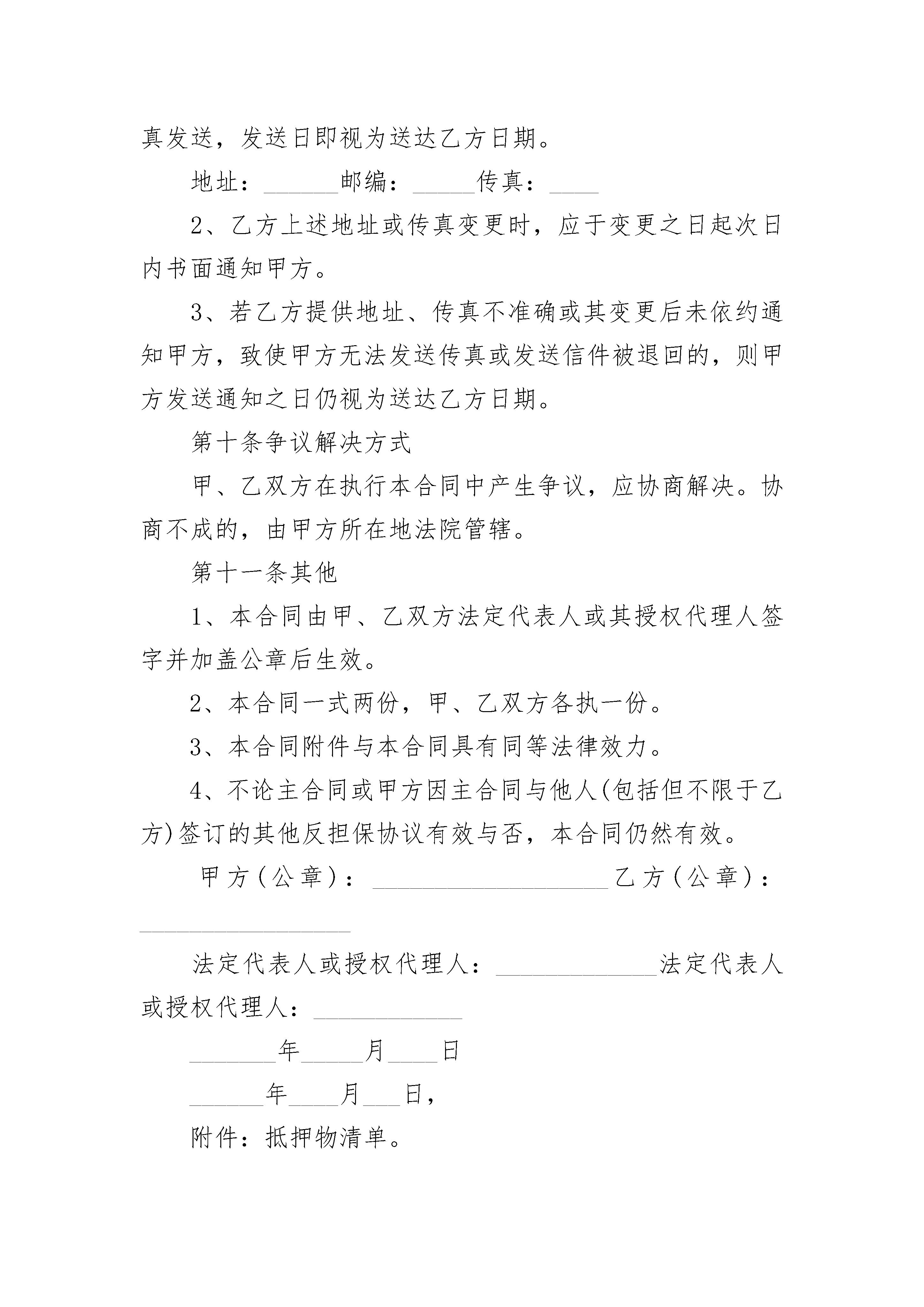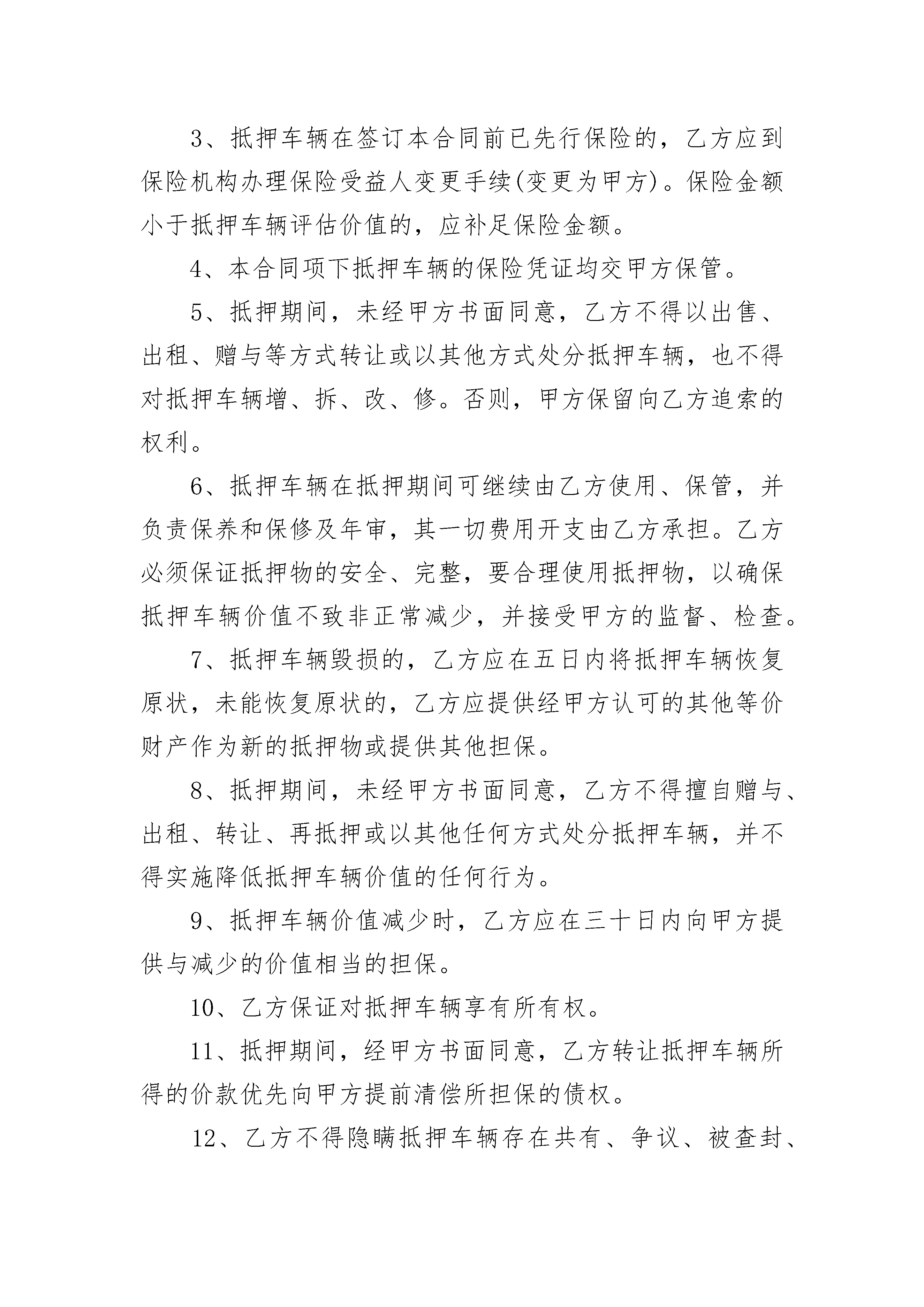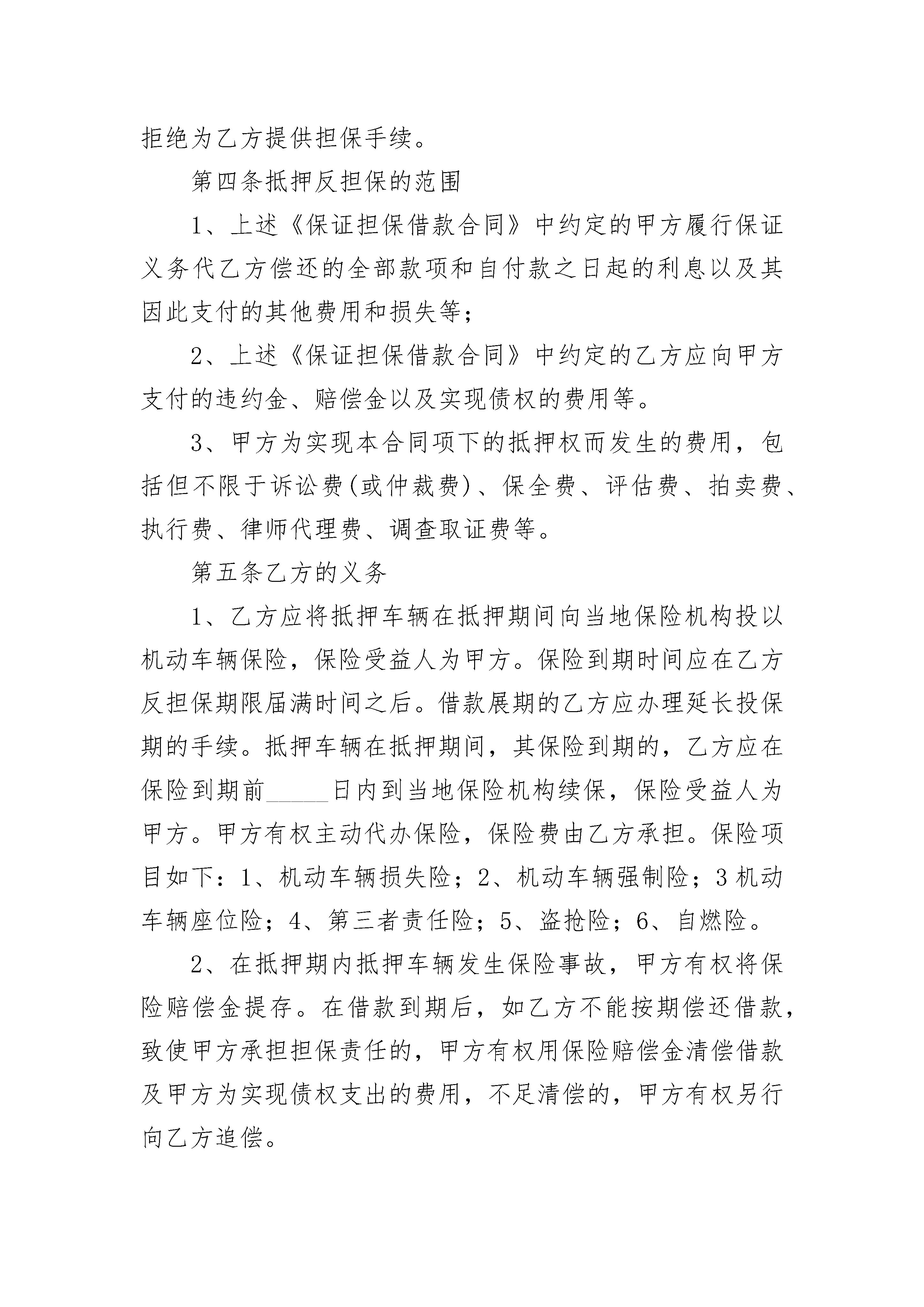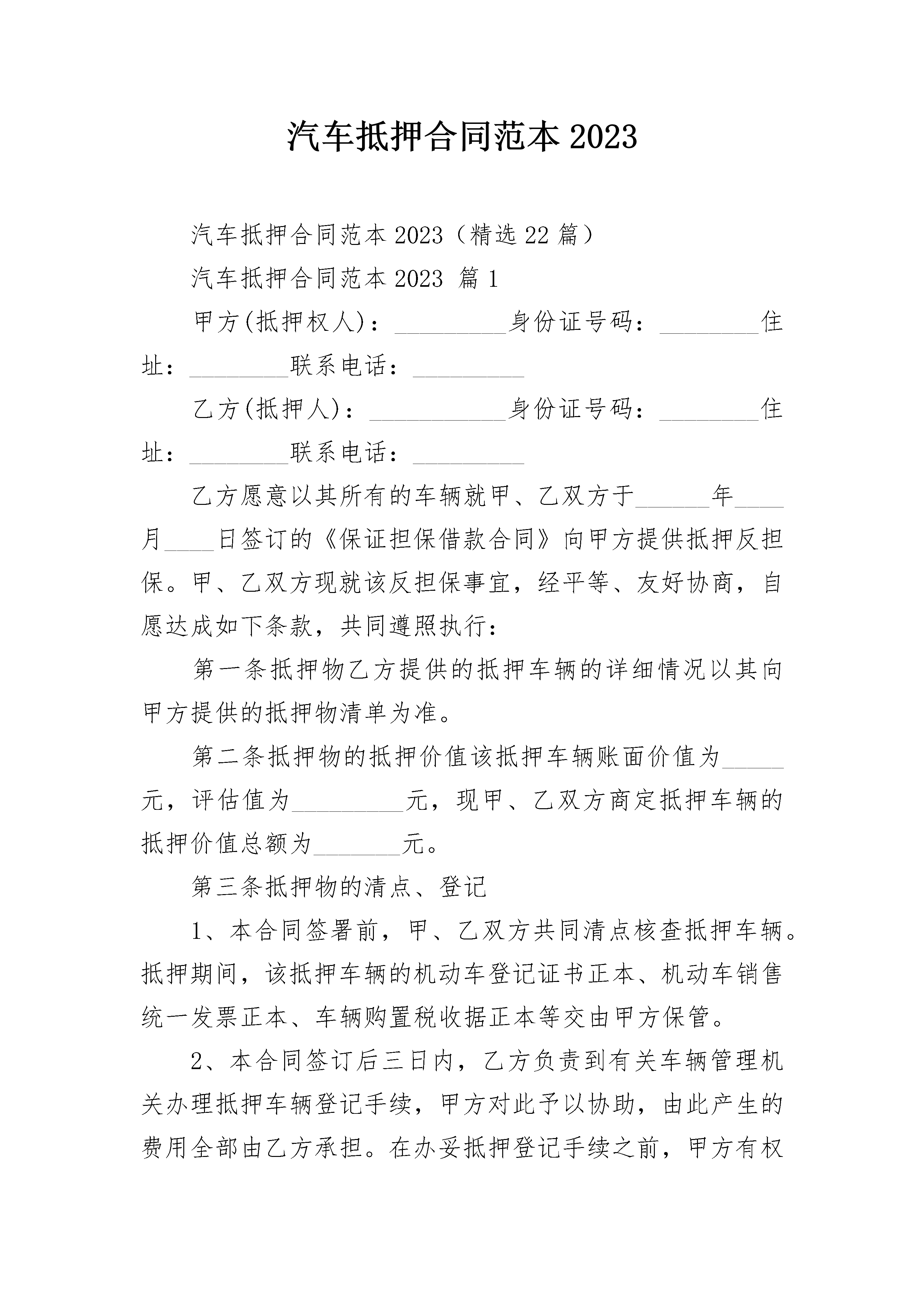 汽车抵押合同范本2023汽车抵押合同范本2023(精选22篇)汽车抵押合同范本2023篇1甲方(抵押权人):_________身份证号码:________住址:________联系电话:_________乙方(抵押人):___________身份证号码:________住址:________联系电话:_________乙方愿意以其所有的车辆就甲、乙双方于______年____月____日签订的《保证担保借款合同》向甲方提供抵押反担保。甲、乙双方现就该反担保事宜,经平等、友好协商,自愿达成如下条款,共同遵照执行:第一条抵押物乙方提供的抵押车辆的详细情况以其向甲方提供的抵押物清单为准。第二条抵押物的抵押价值该抵押车辆账面价值为_____元,评估值为_________元,现甲、乙双方商定抵押车辆的抵押价值总额为_______元。第三条抵押物的清点、登记1、本合同签署前,甲、乙双方共同清点核查抵押车辆。抵押期间,该抵押车辆的机动车登记证书正本、机动车销售统一发票正本、车辆购置税收据正本等交由甲方保管。2、本合同签订后三日内,乙方负责到有关车辆管理机关办理抵押车辆登记手续,甲方对此予以协助,由此产生的费用全部由乙方承担。在办妥抵押登记手续之前,甲方有权拒绝为乙方提供担保手续。第四条抵押反担保的范围1、上述《保证担保借款合同》中约定的甲方履行保证义务代乙方偿还的全部款项和自付款之日起的利息以及其因此支付的其他费用和损失等;2、上述《保证担保借款合同》中约定的乙方应向甲方支付的违约金、赔偿金以及实现债权的费用等。3、甲方为实现本合同项下的抵押权而发生的费用,包括但不限于诉讼费(或仲裁费)、保全费、评估费、拍卖费、执行费、律师代理费、调查取证费等。第五条乙方的义务1、乙方应将抵押车辆在抵押期间向当地保险机构投以机动车辆保险,保险受益人为甲方。保险到期时间应在乙方反担保期限届满时间之后。借款展期的乙方应办理延长投保期的手续。抵押车辆在抵押期间,其保险到期的,乙方应在保险到期前_____日内到当地保险机构续保,保险受益人为甲方。甲方有权主动代办保险,保险费由乙方承担。保险项目如下:1、机动车辆损失险;2、机动车辆强制险;3机动车辆座位险;4、第三者责任险;5、盗抢险;6、自燃险。2、在抵押期内抵押车辆发生保险事故,甲方有权将保险赔偿金提存。在借款到期后,如乙方不能按期偿还借款,致使甲方承担担保责任的,甲方有权用保险赔偿金清偿借款及甲方为实现债权支出的费用,不足清偿的,甲方有权另行向乙方追偿。3、抵押车辆在签订本合同前已先行保险的,乙方应到保险机构办理保险受益人变更手续(变更为甲方)。保险金额小于抵押车辆评估价值的,应补足保险金额。4、本合同项下抵押车辆的保险凭证均交甲方保管。5、抵押期间,未经甲方书面同意,乙方不得以出售、出租、赠与等方式转让或以其他方式处分抵押车辆,也不得对抵押车辆增、拆、改、修。否则,甲方保留向乙方追索的权利。6、抵押车辆在抵押期间可继续由乙方使用、保管,并负责保养和保修及年审,其一切费用开支由乙方承担。乙方必须保证抵押物的安全、完整,要合理使用抵押物,以确保抵押车辆价值不致非正常减少,并接受甲方的监督、检查。7、抵押车辆毁损的,乙方应在五日内将抵押车辆恢复原状,未能恢复原状的,乙方应提供经甲方认可的其他等价财产作为新的抵押物或提供其他担保。8、抵押期间,未经甲方书面同意,乙方不得擅自赠与、出租、转让、再抵押或以其他任何方式处分抵押车辆,并不得实施降低抵押车辆价值的任何行为。9、抵押车辆价值减少时,乙方应在三十日内向甲方提供与减少的价值相当的担保。10、乙方保证对抵押车辆享有所有权。11、抵押期间,经甲方书面同意,乙方转让抵押车辆所得的价款优先向甲方提前清偿所担保的债权。12、乙方不得隐瞒抵押车辆存在共有、争议、被查封、被扣押或已被设定抵押的任何情况。第六条违约责任1、乙方违反本合同第五条第五款约定的,其行为无效,甲方可要求其按抵押车辆之抵押价值总额的10%支付违约金。2、乙方违反本合同第五条第六款约定的,因保管不善致使抵押车辆毁损的,甲方可要求其恢复原状或重新提供甲方认可的新的抵押物,并可要求其按抵押价值总额的10%支付违约金。3、乙方违反本合同约定的其他义务与责任的,其应按抵押价值总额10%向甲方支付违约金,并赔偿由此给甲方造成的一切损失。第七条抵押权的实现在甲方履行了代偿义务后的____天内未受乙方清偿的,甲方可依照法律规定的形式以抵押物折价或以拍卖、变卖该抵押物所得的价款优先受偿。抵押物折价或拍卖、变卖后所得的价款仍不足以清偿的,甲方有权就不足部分向乙方继续追偿。第八条义务和责任的连续性本合同项下乙方所有义务和责任不因其财力、地位等状况的改变,或与其他单位签订的任何协议、文件或合同而免除;也不因乙方发生合并、分立等