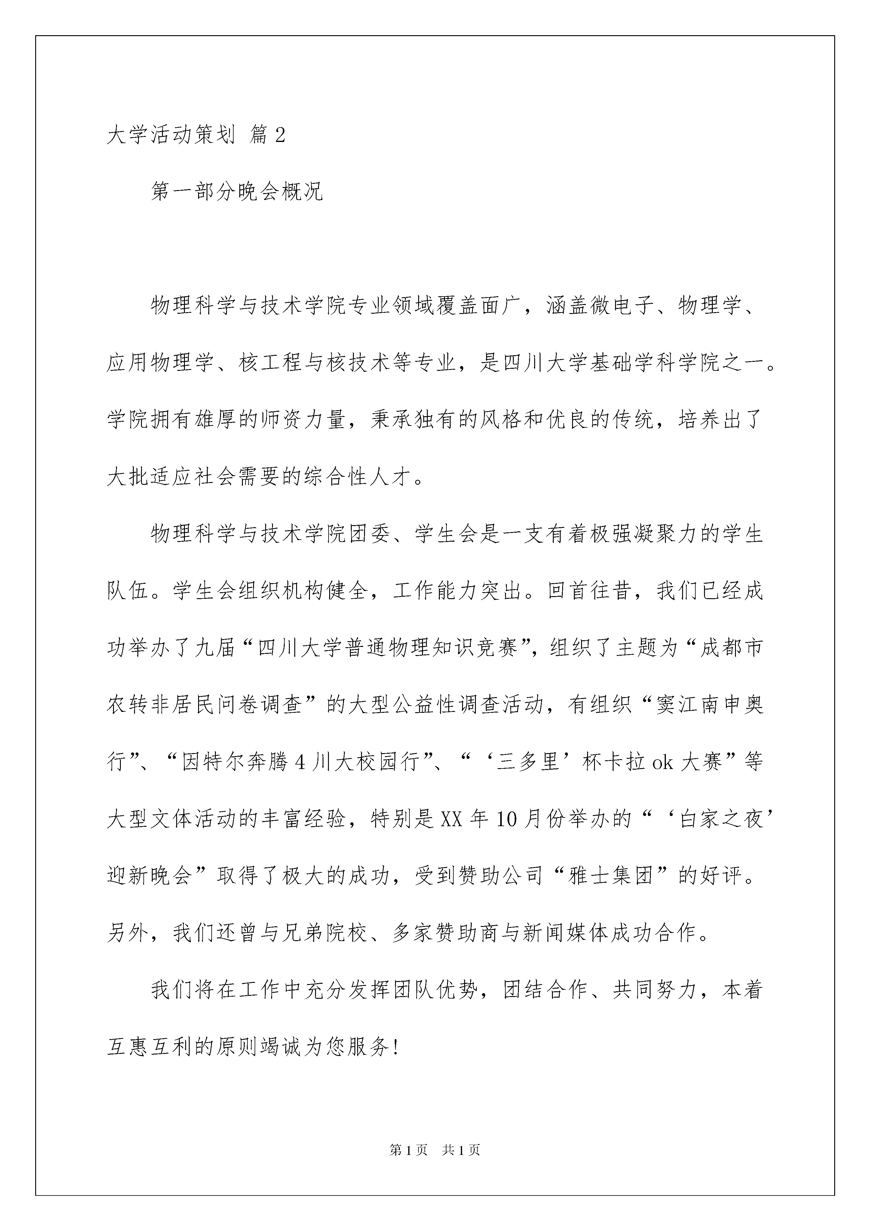 2022有关大学活动策划三篇有关大学活动策划三篇大学活动策划篇1一、晚会地点:教室二、晚会时间:20xx年6月三、晚会目的:1、晚会反映我班半年来所取得的成绩,鼓舞同学们的士气,继往开来,再创辉煌。2、给同学们提供相互认识、相互了解的机会,融洽同学们之间的关系。四、晚会节目征集1、歌曲类:(1)能够反映祖国发展,弘扬主旋律的歌曲(民族,美声类);(2)青春、阳光、健康、向上,能够反映同学们们充满活力,反映教师无私奉献的歌曲;(3)与以上主题相关的原创歌曲。2、舞蹈类:(1)积极向上、寓意深刻的艺术性舞蹈;(2)具有校园时代气息的创意性舞蹈。(3)喜闻乐见的街舞、现代舞、健美操、武术等;(4)相关歌曲的伴舞。3、曲艺(语言)类:(1)喜庆、热闹反映校园生活的的相声、小品;(2)经典的传统曲艺类节目;(3)其它类型的曲艺节目。4、其他节目及游戏环节五、节目来源全体同学必须全部并积极参与表演节目的上报,每个宿舍必须保证有一个节目,如实在没有节目,须参加合唱类节目,合唱要求自己找好合作伙伴,合唱人员不得超过五人。六、节目及要求:时间:即日起至5月31日要求:节目任何人员不得大声喧哗,不得因意见不统一而影响班级纪律。节目报给各班文艺委员。七、晚会主持人要求:1、女生、男生各2名,自愿报名。2、语言流利、普通话标准,现场应变能力强,有晚会主持经验者优先。3、:即日起至5月31日八、晚会采购:鲜花、礼品、荧光纸、贺纸、气球等所需物品。采购由各班生活委员负责。九、晚会期间纪律要求1、以我班学生和任课教师联欢为主,不得到外班进行观看或请外班学生进行观看或请外班学生来我班进行节目表演。2、晚会期间任何同学必须服从指挥,不得起哄、无故喧闹。3、晚会必须在保证有秩序井然的情况下开展活动。4、全体学生必须积极、并全程参与。5、不得把管制刀具、鞭炮等违禁物品带入校园,不准在校园内燃放鞭炮。6、晚会期间一般情况下不允许请假。大学活动策划篇2第一部分晚会概况物理科学与技术学院专业领域覆盖面广,涵盖微电子、物理学、应用物理学、核工程与核技术等专业,是四川大学基础学科学院之一。学院拥有雄厚的师资力量,秉承独有的风格和优良的传统,培养出了大批适应社会需要的综合性人才。物理科学与技术学院团委、学生会是一支有着极强凝聚力的学生队伍。学生会组织机构健全,工作能力突出。回首往昔,我们已经成功举办了九届“四川大学普通物理知识竞赛”,组织了主题为“成都市农转非居民问卷调查”的大型公益性调查活动,有组织“窦江南申奥行”、“因特尔奔腾4川大校园行”、“‘三多里’杯卡拉ok大赛”等大型文体活动的丰富经验,特别是XX年10月份举办的“‘白家之夜’迎新晚会”取得了极大的成功,受到赞助公司“雅士集团”的好评。另外,我们还曾与兄弟院校、多家赞助商与新闻媒体成功合作。我们将在工作中充分发挥团队优势,团结合作、共同努力,本着互惠互利的原则竭诚为您服务!一年过去了,我们物理学院迎来了新一届的同学,他们带着青春蓬勃的朝气和远大的志向加入到物理学院这个团结友爱的大家庭。我们院团委、学生会打算通过举办迎新文艺晚会,师生共聚一堂,欢迎他们的到来,表达对新同学的关心与期望,让他们能更多地了解物理学院的传统和四川大学百年多的优秀文化,使他们能尽快地在大学生活当中找到自己的位置以进入角色。同时,我们通过这个文艺晚会发掘我们学院的文艺人才,使他们的特长能得到更好的培养,还借它丰富大家的课余生活,提供一个展现个人魅力的舞台。这台文艺晚会的主题是“”。大一新生目前非常需要了解大学生活和校园文化。也需要得到各方面的关心和指导。有学长对学弟的,有老师对学生的。所以这次晚会突出一个“爱”字,借文艺晚会把大家对新同学的感情和祝愿表达出来,让他们能愉快的开始大学四年的学习和生活。物理学院大一每班编排两个节目,大二和大三每个班至少出一个个节目,形式不限,内容尽量贴近大学生活贴近主题。具体的节目编排由各班文艺委员负责和组织,女生部协助各班节目的排练。所有节目需提前彩排,经过节目策划组审查之后,合格的节目方可在这台文艺晚会上表演。节目演出次序由晚会主持人和晚会策划组决定。大学活动策划篇3一、晚会目的及意义大一的新同学们刚刚结束了近20天的军训生活,又经过了十一长假的休整,才投入到正常的大学学习生活中,大学的授课和学习方式或许都会让同学们觉得陌生不适应。为了表示学院对新同学的欢迎和关心,特为新生举办一台着重体现现代大学生生活的文艺晚会。晚会内容丰富,精彩纷呈。学院文艺部将携手学生会其他各部门,为大一新生献上完美的演出。并希望通过此次晚会,让新生感受学院的风采,更快的融入大学生活