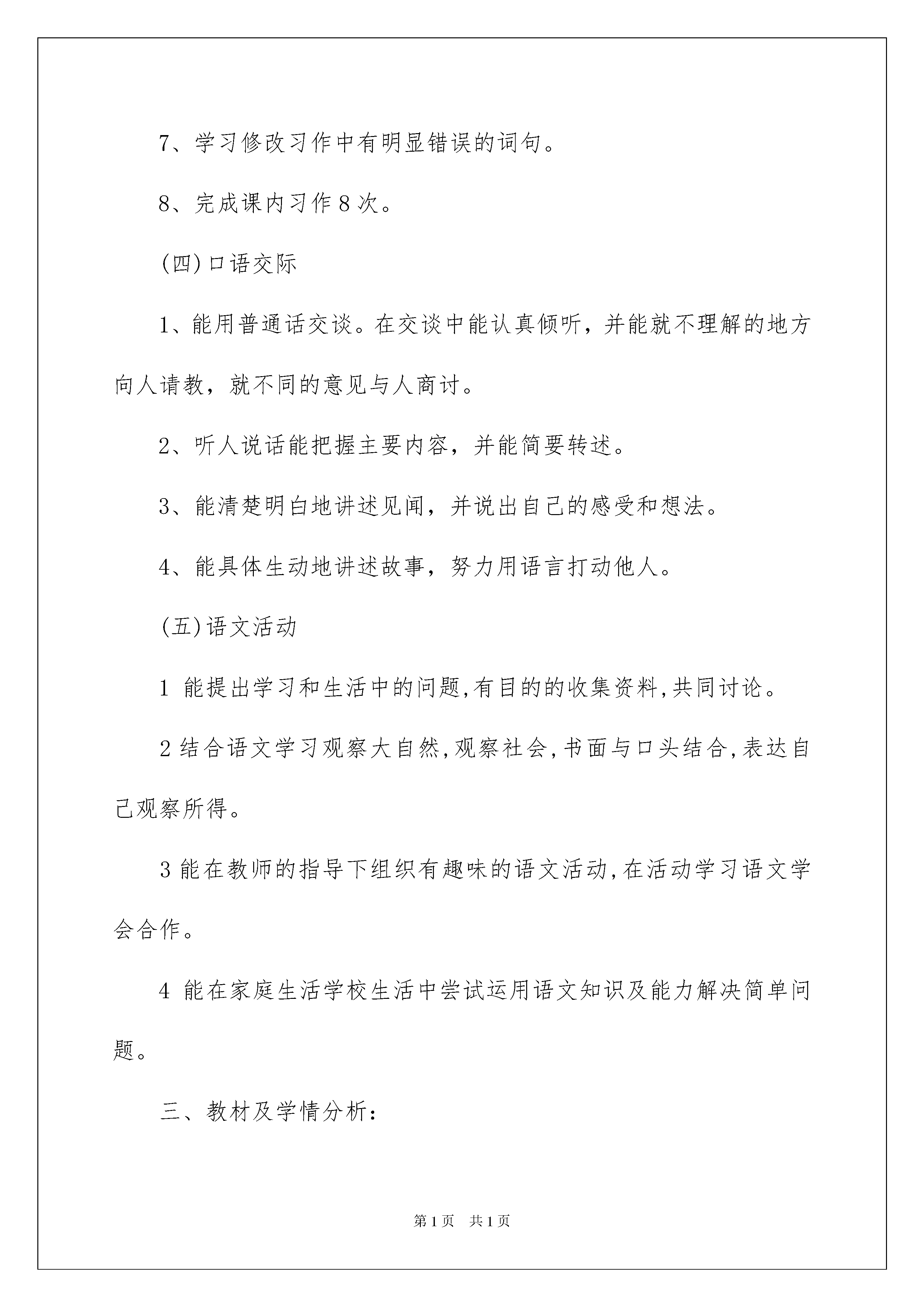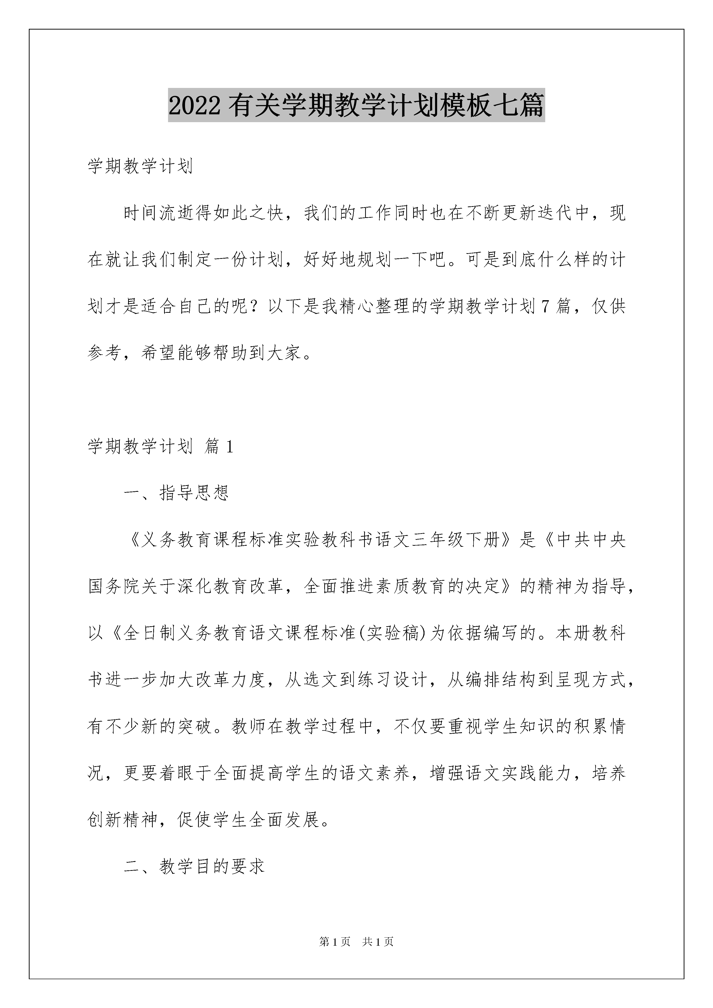 2022有关学期教学计划模板七篇学期教学计划时间流逝得如此之快,我们的工作同时也在不断更新迭代中,现在就让我们制定一份计划,好好地规划一下吧。可是到底什么样的计划才是适合自己的呢?以下是我精心整理的学期教学计划7篇,仅供参考,希望能够帮助到大家。学期教学计划篇1一、指导思想《义务教育课程标准实验教科书语文三年级下册》是《中共中央国务院关于深化教育改革,全面推进素质教育的决定》的精神为指导,以《全日制义务教育语文课程标准(实验稿)为依据编写的。本册教科书进一步加大改革力度,从选文到练习设计,从编排结构到呈现方式,有不少新的突破。教师在教学过程中,不仅要重视学生知识的积累情况,更要着眼于全面提高学生的语文素养,增强语文实践能力,培养创新精神,促使学生全面发展。二、教学目的要求(一)识字、写字1、能利用汉语拼音识字、学习普通话。2、激发学生对学习汉字的兴趣,养成主动识字的好习惯。3、学会315个生字,会写238个生字。4、会使用字典、词典,有初步的独立识字能力。5、能使用硬笔熟练的书写正楷字,做到规范、端正、整洁。用毛笔临正楷字帖。6、学习使用键盘输入汉字。(二)阅读1、普通话正确、流利、有感情地朗读课文。2、学会默读。能对课文中不理解的地方提出疑问。3、能联系上下文,理解词句的意思,体会课文中关键词句在表达情意方面的作用。能借助字典、词典和生活积累,理解生词的意义。4、初步把握文章的主要内容,体会文章表达的思想感情。5、复述叙事性作品的大意,初步感受作品中生动的形象和优美的语言,与他人交流自己的阅读感受。6、在理解语句的过程中,体会句号与逗号的不同用法,了解冒号、引号的一般用法。7、学习略读,粗知文章大意。8、积累课文中的优美词语、精彩句段,以及在课外阅读和生活中获得的语言材料。9、诵读优秀诗文,注意在诵读过程中体验情感,领悟内容。能背诵指定的课文。10、养成读书看报的习惯,收藏并与同学交流图书资料。课外阅读总量不少于15万字。(三)习作1、留心周围事物,乐于书面表达,对习作有兴趣。2、能不拘形式地写下见闻、感受和想象,注意表现自己觉得新奇有趣的或印象最深、最受感动的内容。3、愿意将自己的习作读给别人听,与他人分享习作的快乐。4、能用简短的书信便条进行书面交际。5、尝试在习作中运用自己平时积累的语言材料,特别是有新鲜感的词句。6、根据表达的需要,使用冒号、引号。7、学习修改习作中有明显错误的词句。8、完成课内习作8次。(四)口语交际1、能用普通话交谈。在交谈中能认真倾听,并能就不理解的地方向人请教,就不同的意见与人商讨。2、听人说话能把握主要内容,并能简要转述。3、能清楚明白地讲述见闻,并说出自己的感受和想法。4、能具体生动地讲述故事,努力用语言打动他人。(五)语文活动1能提出学习和生活中的问题,有目的的收集资料,共同讨论。2结合语文学习观察大自然,观察社会,书面与口头结合,表达自己观察所得。3能在教师的指导下组织有趣味的语文活动,在活动学习语文学会合作。4能在家庭生活学校生活中尝试运用语文知识及能力解决简单问题。三、教材及学情分析:本册共有课文30篇,其中讲读课文22篇,略读课文8篇。感受大自然的美好;爱护周围环境,怎样看待总是、怎样想问题;丰富多采的儿童生活;可贵的亲情、友情;神奇的科技世界;国际理解和友好;神话故事、传说。每个专题人文内涵丰富,贴近儿童生活,体现时代特点,蕴涵教育价值。本册教材有以下几个特点:1、围绕专题整合教材内容。2、结合专题继续安排综合性学习,体现课程标准倡导的理念和目标。3、大量更新课文,使教材更加贴近儿童生活。4、着力改进课文和课后练习的编排,促进学生学习方式的转变。5、完善图像系统,注重图文并茂。本班学生多,学生学习基础参差不齐,大部分学生养成良好的学习习惯,学习认真用功,少数学生学习基础差,学习不自觉,学习懒散。四、教学措施1、严格要求学生,持之以恒地坚持下来,使学生逐步养成良好的学习习惯。2、注意把握教材之间的联系,把教材与学生生活实际联系起来。3、充分利用一切教育资源。4、注重口语交际能力的培养及写话能力的培养。5、注重培养学生的学习兴趣和学习语文的方法。学期教学计划篇2本学期教学主要围绕《中国古代诗歌散文欣赏》、《中国小说作品选读》、《外国小说作品选读》三本教材展开。具体安排如下:开学第一周进行假期作业的交流展示专题活动。交流内容包括上学期学习生活回顾,中国古代诗歌学习收获,以及中国节日文化的相关内容。花一周的时间进行这样的交流,其目的不仅在于检查学生的假期作业完成情况,以加强学生的重视程度,以利于促进未来节假日作业的有效完成;同时,