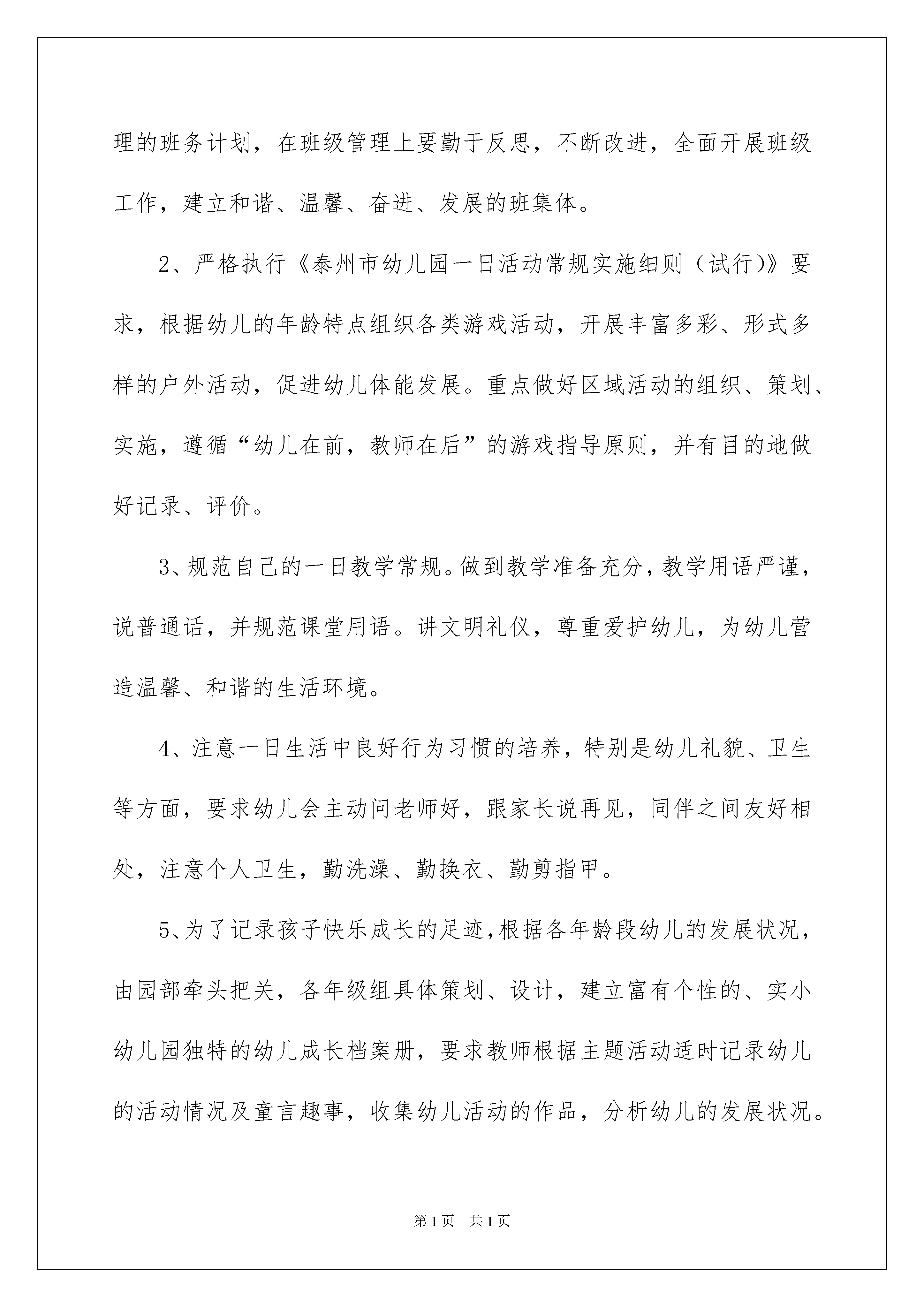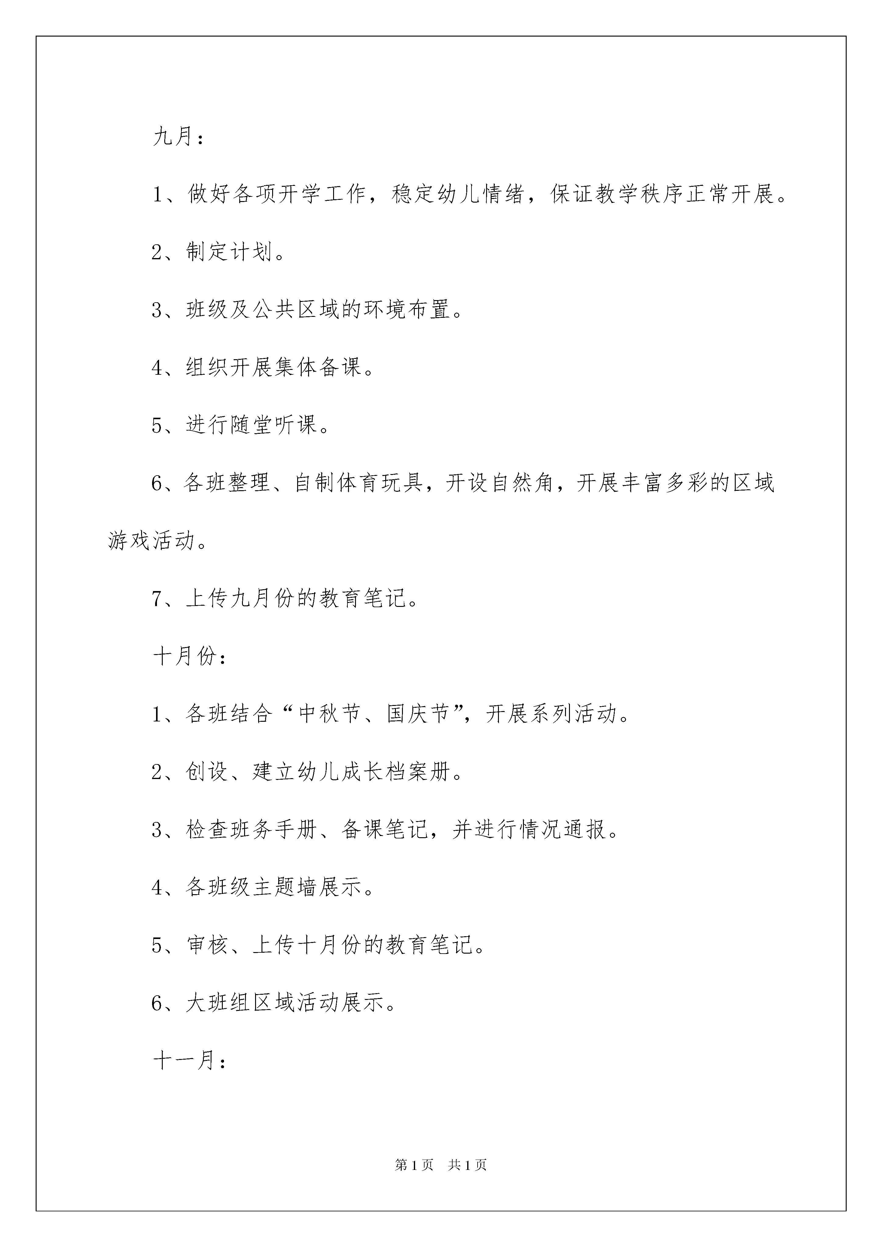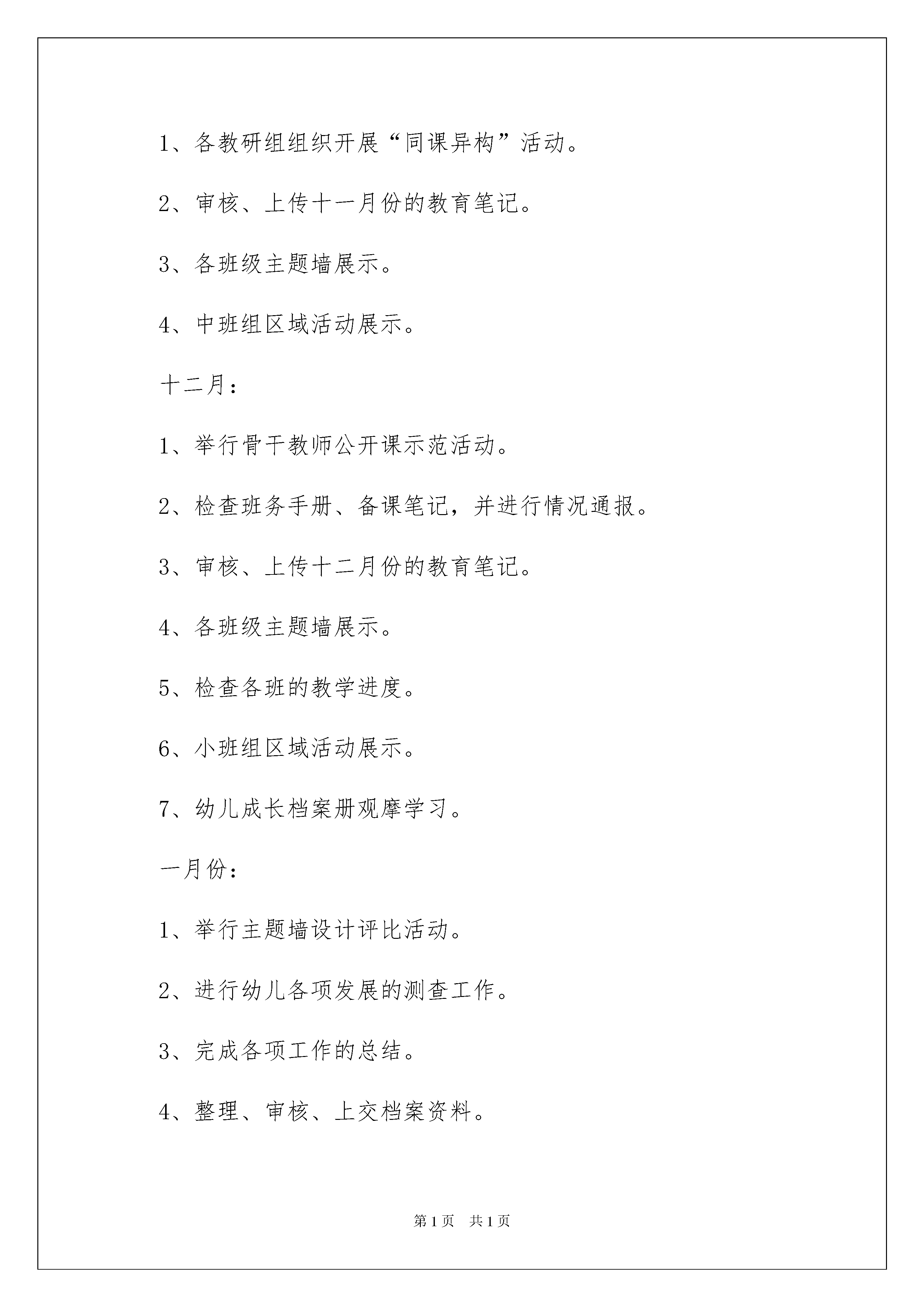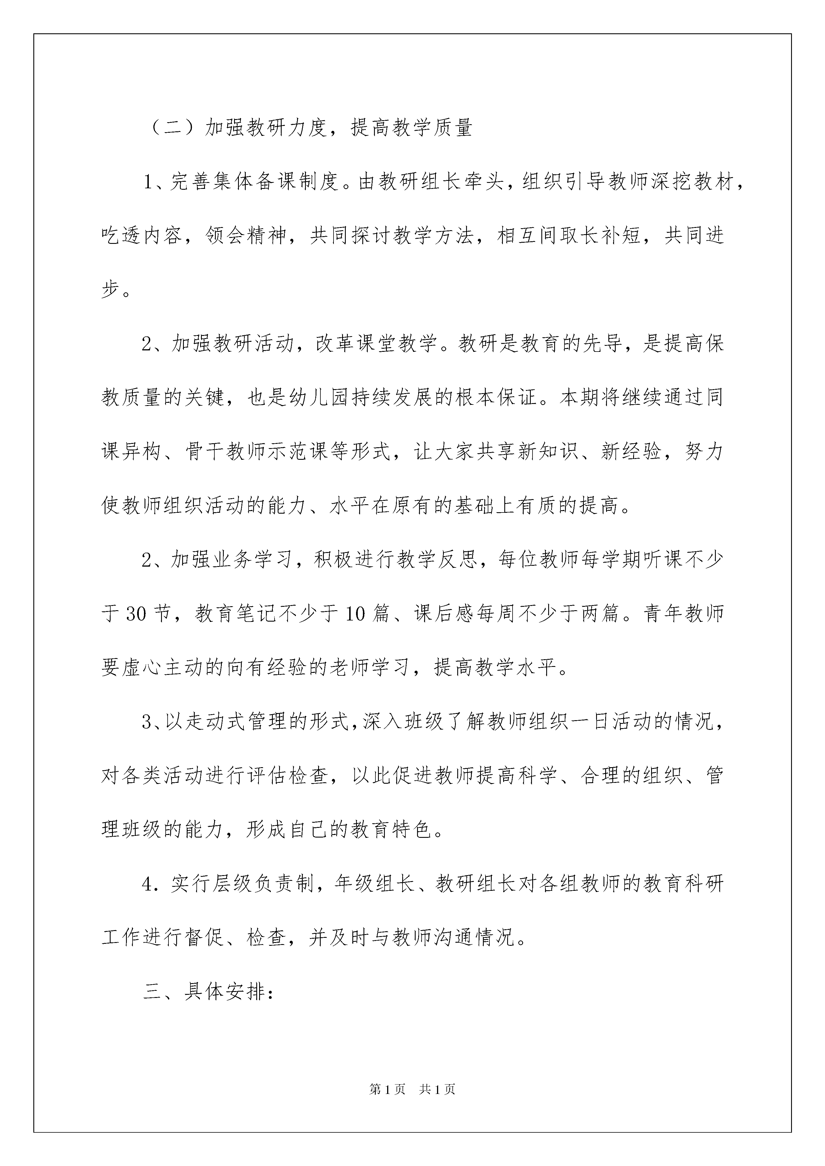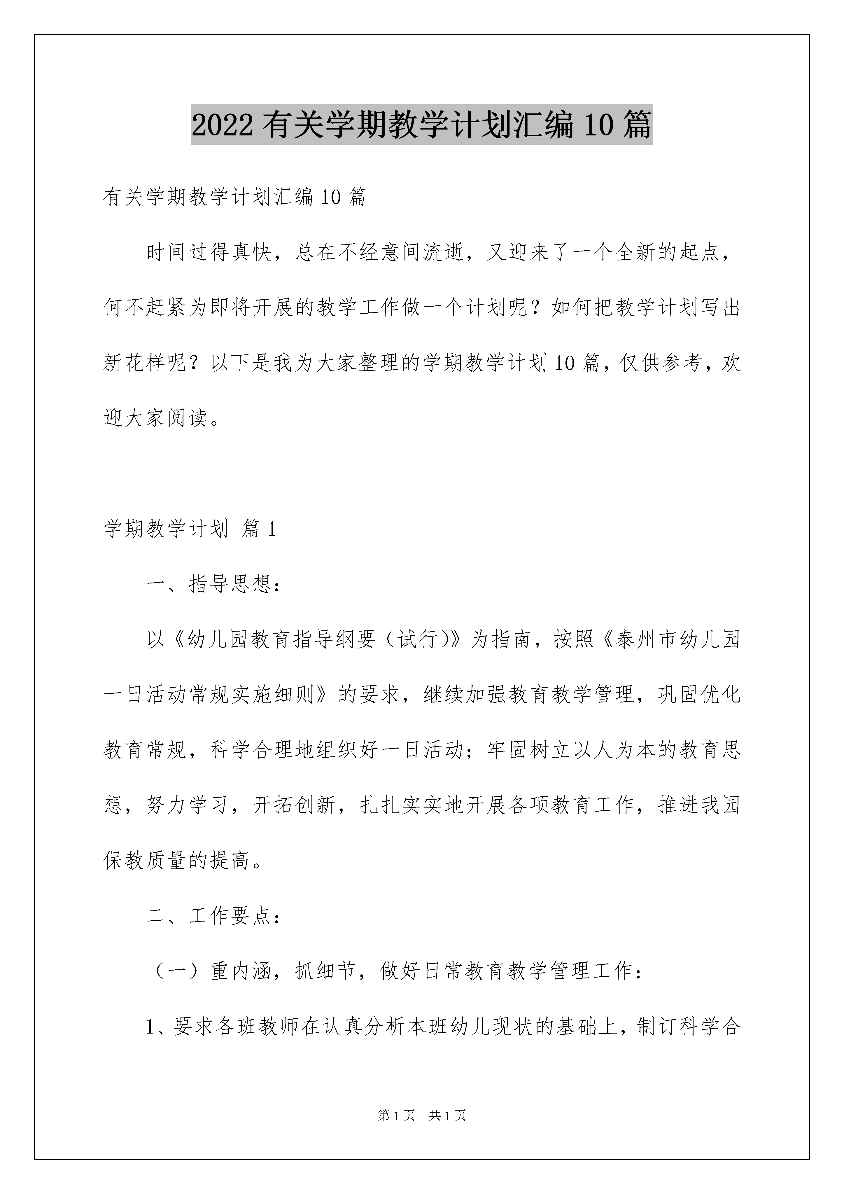 2022有关学期教学计划汇编10篇有关学期教学计划汇编10篇时间过得真快,总在不经意间流逝,又迎来了一个全新的起点,何不赶紧为即将开展的教学工作做一个计划呢?如何把教学计划写出新花样呢?以下是我为大家整理的学期教学计划10篇,仅供参考,欢迎大家阅读。学期教学计划篇1一、指导思想:以《幼儿园教育指导纲要(试行)》为指南,按照《泰州市幼儿园一日活动常规实施细则》的要求,继续加强教育教学管理,巩固优化教育常规,科学合理地组织好一日活动;牢固树立以人为本的教育思想,努力学习,开拓创新,扎扎实实地开展各项教育工作,推进我园保教质量的提高。二、工作要点:(一)重内涵,抓细节,做好日常教育教学管理工作:1、要求各班教师在认真分析本班幼儿现状的基础上,制订科学合理的班务计划,在班级管理上要勤于反思,不断改进,全面开展班级工作,建立和谐、温馨、奋进、发展的班集体。2、严格执行《泰州市幼儿园一日活动常规实施细则(试行)》要求,根据幼儿的年龄特点组织各类游戏活动,开展丰富多彩、形式多样的户外活动,促进幼儿体能发展。重点做好区域活动的组织、策划、实施,遵循“幼儿在前,教师在后”的游戏指导原则,并有目的地做好记录、评价。3、规范自己的一日教学常规。做到教学准备充分,教学用语严谨,说普通话,并规范课堂用语。讲文明礼仪,尊重爱护幼儿,为幼儿营造温馨、和谐的生活环境。4、注意一日生活中良好行为习惯的培养,特别是幼儿礼貌、卫生等方面,要求幼儿会主动问老师好,跟家长说再见,同伴之间友好相处,注意个人卫生,勤洗澡、勤换衣、勤剪指甲。5、为了记录孩子快乐成长的足迹,根据各年龄段幼儿的发展状况,由园部牵头把关,各年级组具体策划、设计,建立富有个性的、实小幼儿园独特的幼儿成长档案册,要求教师根据主题活动适时记录幼儿的活动情况及童言趣事,收集幼儿活动的作品,分析幼儿的发展状况。(二)加强教研力度,提高教学质量1、完善集体备课制度。由教研组长牵头,组织引导教师深挖教材,吃透内容,领会精神,共同探讨教学方法,相互间取长补短,共同进步。2、加强教研活动,改革课堂教学。教研是教育的先导,是提高保教质量的关键,也是幼儿园持续发展的根本保证。本期将继续通过同课异构、骨干教师示范课等形式,让大家共享新知识、新经验,努力使教师组织活动的能力、水平在原有的基础上有质的提高。2、加强业务学习,积极进行教学反思,每位教师每学期听课不少于30节,教育笔记不少于10篇、课后感每周不少于两篇。青年教师要虚心主动的向有经验的老师学习,提高教学水平。3、以走动式管理的形式,深入班级了解教师组织一日活动的情况,对各类活动进行评估检查,以此促进教师提高科学、合理的组织、管理班级的能力,形成自己的教育特色。4.实行层级负责制,年级组长、教研组长对各组教师的教育科研工作进行督促、检查,并及时与教师沟通情况。三、具体安排:九月:1、做好各项开学工作,稳定幼儿情绪,保证教学秩序正常开展。2、制定计划。3、班级及公共区域的环境布置。4、组织开展集体备课。5、进行随堂听课。6、各班整理、自制体育玩具,开设自然角,开展丰富多彩的区域游戏活动。7、上传九月份的教育笔记。十月份:1、各班结合“中秋节、国庆节”,开展系列活动。2、创设、建立幼儿成长档案册。3、检查班务手册、备课笔记,并进行情况通报。4、各班级主题墙展示。5、审核、上传十月份的教育笔记。6、大班组区域活动展示。十一月:1、各教研组组织开展“同课异构”活动。2、审核、上传十一月份的教育笔记。3、各班级主题墙展示。4、中班组区域活动展示。十二月:1、举行骨干教师公开课示范活动。2、检查班务手册、备课笔记,并进行情况通报。3、审核、上传十二月份的教育笔记。4、各班级主题墙展示。5、检查各班的教学进度。6、小班组区域活动展示。7、幼儿成长档案册观摩学习。一月份:1、举行主题墙设计评比活动。2、进行幼儿各项发展的测查工作。3、完成各项工作的总结。4、整理、审核、上交档案资料。学期教学计划篇2一、组织自查第八周—第九周(4月15日至4月26日)进行自查,自查内容包括:1、课堂教学情况。学院督导组成员、任课教师等深入课堂听课,召开师生座谈会了解教风、学风情况,收集师生对教学工作的意见和建议。2、毕业论文工作开展情况。重点检查毕业论文的题目申报表、开题报告、指导记录等资料,了解毕业论文工作规定落实情况及质量状况。4月30日前,录入毕业实习成绩,由各教研室负责。3、作业布置与批改情况。对任课教师作业的布置与批改情况进行检查。4、教研室活动情况。重点检查教研室活动的内容、教师参与程度及活动效果情况。4月15日—4月19日,由各