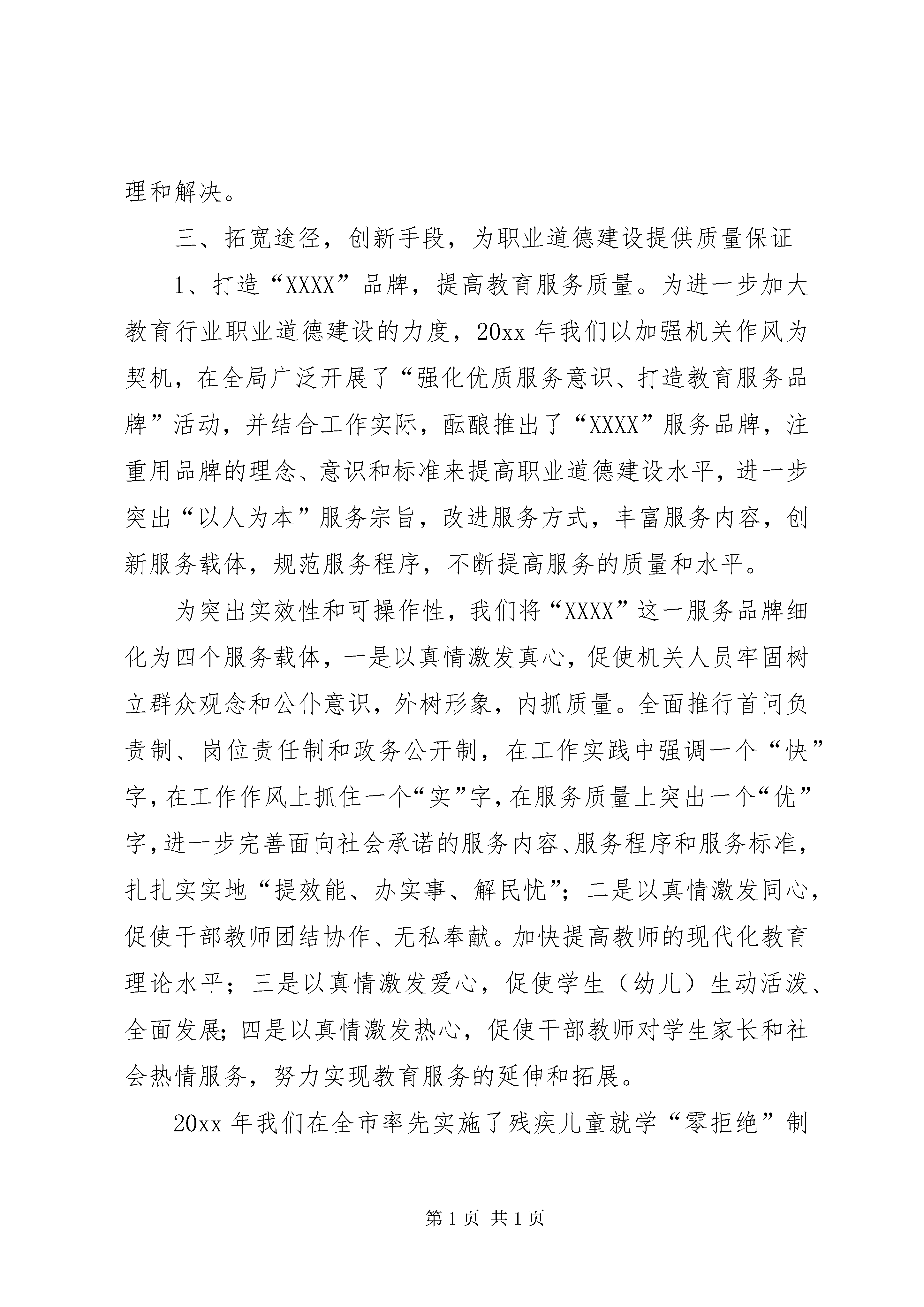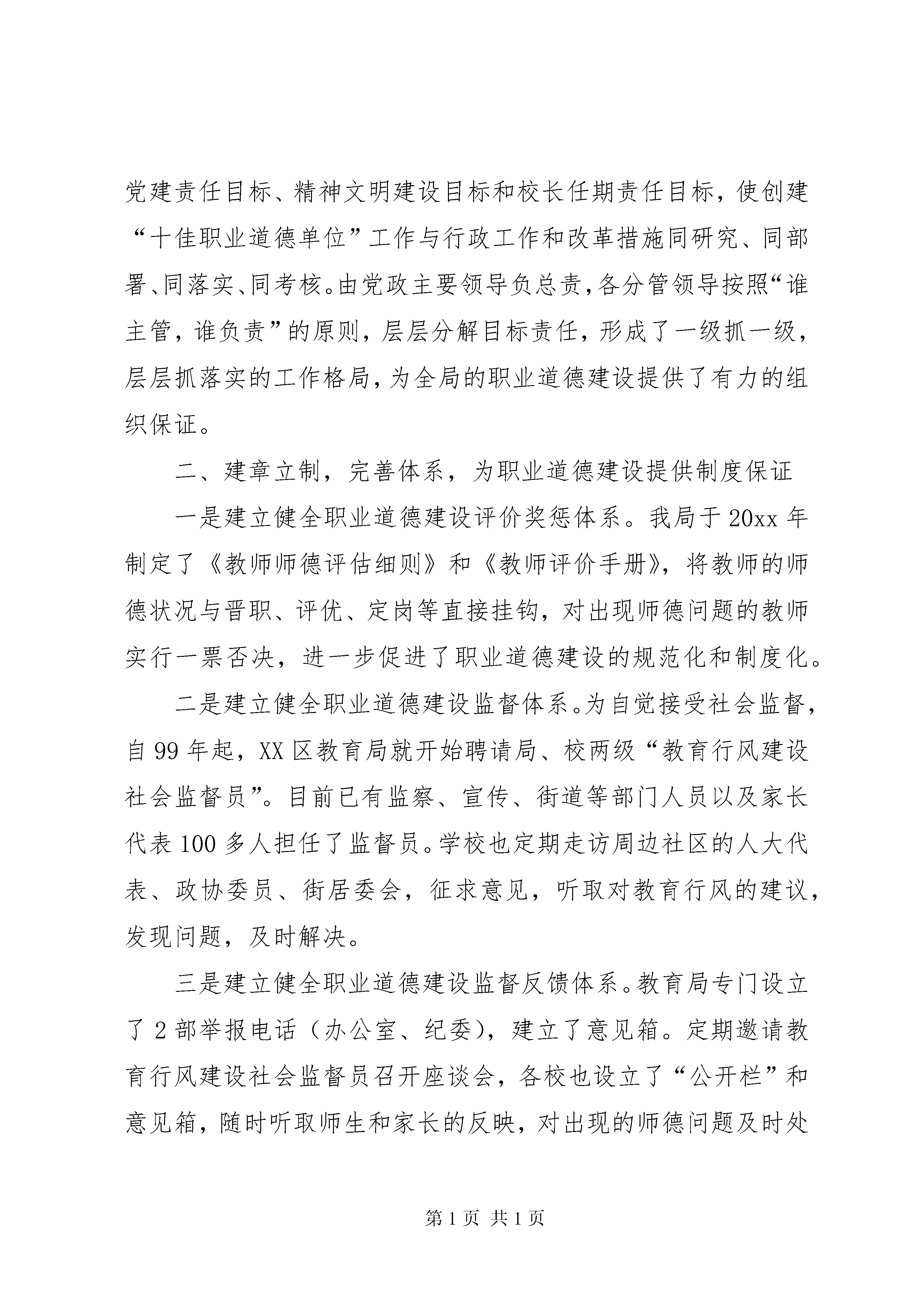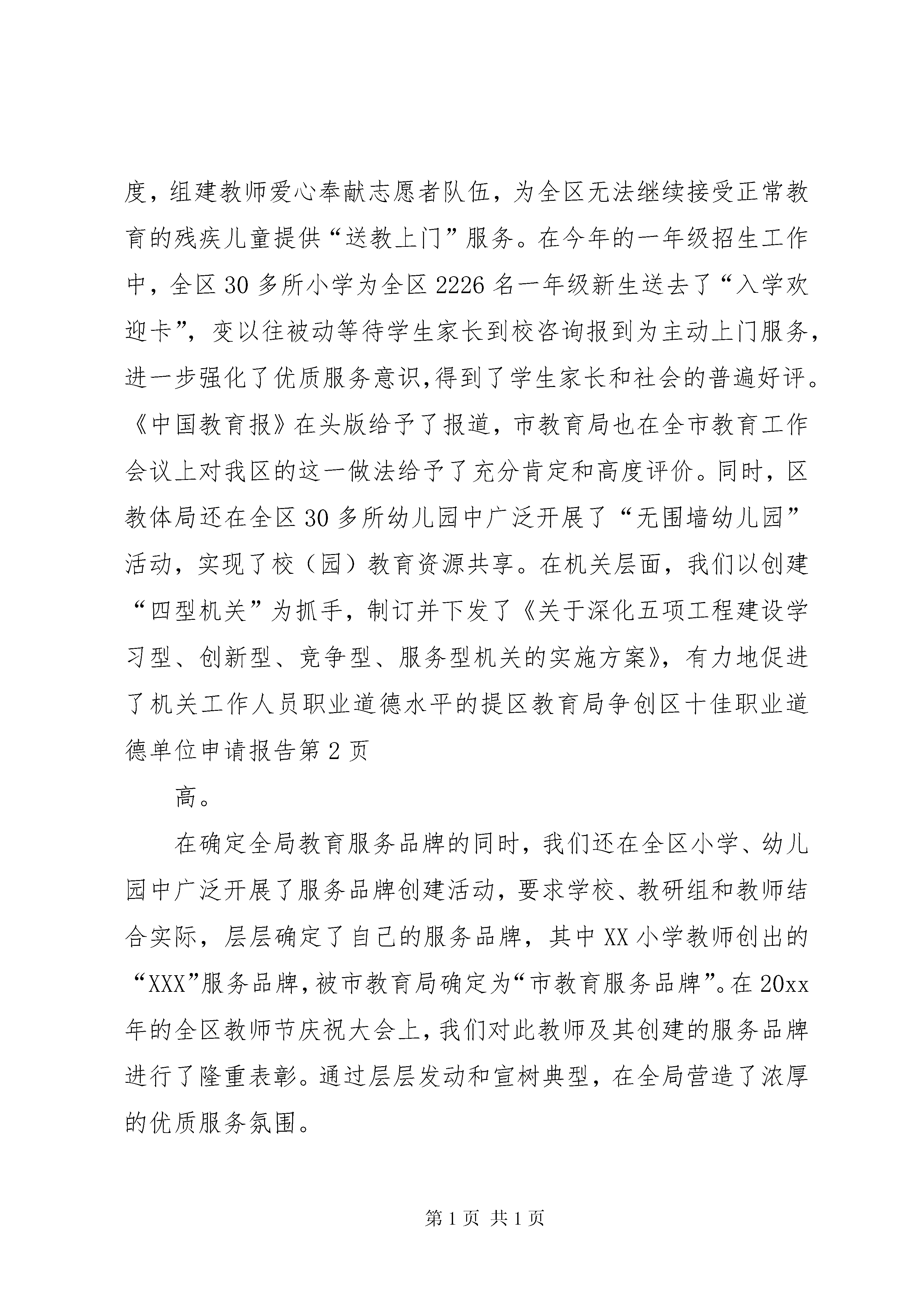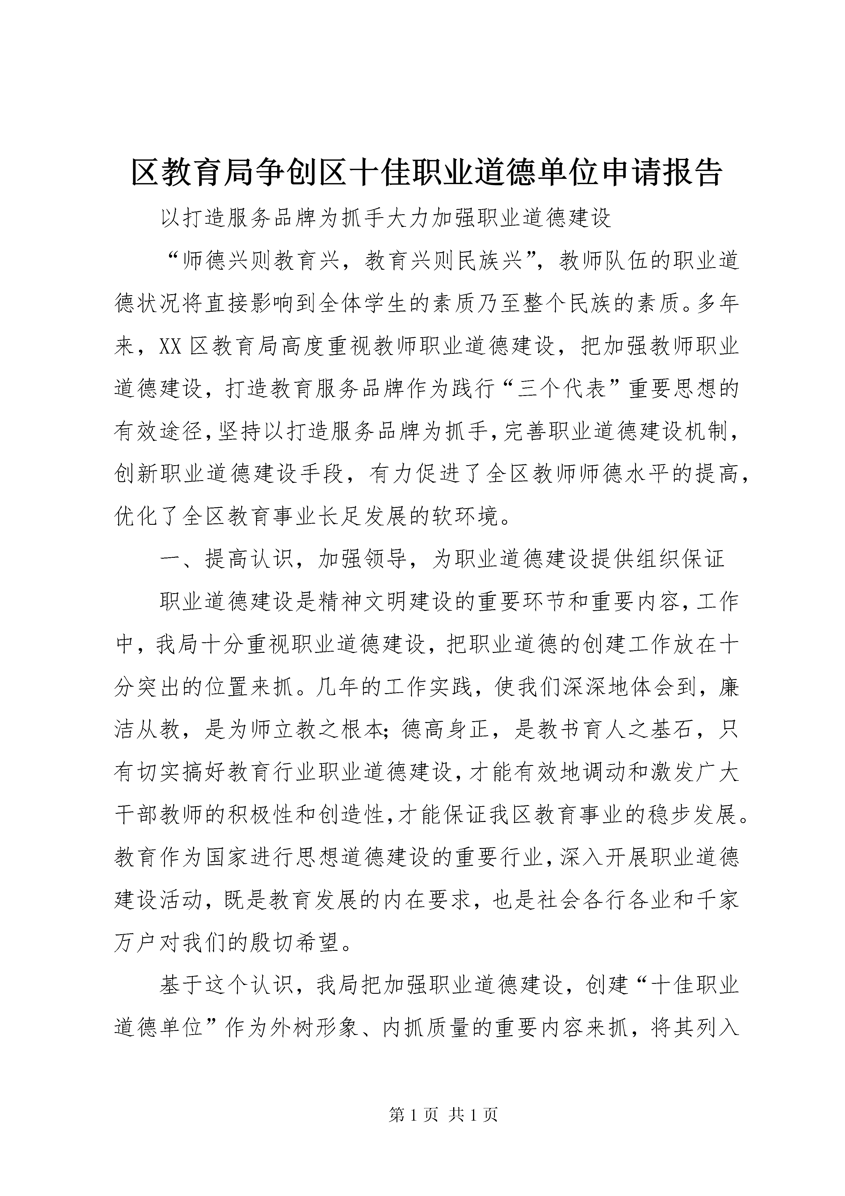 区教育局争创区十佳职业道德单位申请报告以打造服务品牌为抓手大力加强职业道德建设“师德兴则教育兴,教育兴则民族兴”,教师队伍的职业道德状况将直接影响到全体学生的素质乃至整个民族的素质。多年来,XX区教育局高度重视教师职业道德建设,把加强教师职业道德建设,打造教育服务品牌作为践行“三个代表”重要思想的有效途径,坚持以打造服务品牌为抓手,完善职业道德建设机制,创新职业道德建设手段,有力促进了全区教师师德水平的提高,优化了全区教育事业长足发展的软环境。一、提高认识,加强领导,为职业道德建设提供组织保证职业道德建设是精神文明建设的重要环节和重要内容,工作中,我局十分重视职业道德建设,把职业道德的创建工作放在十分突出的位置来抓。几年的工作实践,使我们深深地体会到,廉洁从教,是为师立教之根本;德高身正,是教书育人之基石,只有切实搞好教育行业职业道德建设,才能有效地调动和激发广大干部教师的积极性和创造性,才能保证我区教育事业的稳步发展。教育作为国家进行思想道德建设的重要行业,深入开展职业道德建设活动,既是教育发展的内在要求,也是社会各行各业和千家万户对我们的殷切希望。基于这个认识,我局把加强职业道德建设,创建“十佳职业道德单位”作为外树形象、内抓质量的重要内容来抓,将其列入党建责任目标、精神文明建设目标和校长任期责任目标,使创建“十佳职业道德单位”工作与行政工作和改革措施同研究、同部署、同落实、同考核。由党政主要领导负总责,各分管领导按照“谁主管,谁负责”的原则,层层分解目标责任,形成了一级抓一级,层层抓落实的工作格局,为全局的职业道德建设提供了有力的组织保证。二、建章立制,完善体系,为职业道德建设提供制度保证一是建立健全职业道德建设评价奖惩体系。我局于20xx年制定了《教师师德评估细则》和《教师评价手册》,将教师的师德状况与晋职、评优、定岗等直接挂钩,对出现师德问题的教师实行一票否决,进一步促进了职业道德建设的规范化和制度化。二是建立健全职业道德建设监督体系。为自觉接受社会监督,自99年起,XX区教育局就开始聘请局、校两级“教育行风建设社会监督员”。目前已有监察、宣传、街道等部门人员以及家长代表100多人担任了监督员。学校也定期走访周边社区的人大代表、政协委员、街居委会,征求意见,听取对教育行风的建议,发现问题,及时解决。三是建立健全职业道德建设监督反馈体系。教育局专门设立了2部举报电话(办公室、纪委),建立了意见箱。定期邀请教育行风建设社会监督员召开座谈会,各校也设立了“公开栏”和意见箱,随时听取师生和家长的反映,对出现的师德问题及时处理和解决。三、拓宽途径,创新手段,为职业道德建设提供质量保证1、打造“XXXX”品牌,提高教育服务质量。为进一步加大教育行业职业道德建设的力度,20xx年我们以加强机关作风为契机,在全局广泛开展了“强化优质服务意识、打造教育服务品牌”活动,并结合工作实际,酝酿推出了“XXXX”服务品牌,注重用品牌的理念、意识和标准来提高职业道德建设水平,进一步突出“以人为本”服务宗旨,改进服务方式,丰富服务内容,创新服务载体,规范服务程序,不断提高服务的质量和水平。为突出实效性和可操作性,我们将“XXXX”这一服务品牌细化为四个服务载体,一是以真情激发真心,促使机关人员牢固树立群众观念和公仆意识,外树形象,内抓质量。全面推行首问负责制、岗位责任制和政务公开制,在工作实践中强调一个“快”字,在工作作风上抓住一个“实”字,在服务质量上突出一个“优”字,进一步完善面向社会承诺的服务内容、服务程序和服务标准,扎扎实实地“提效能、办实事、解民忧”;二是以真情激发同心,促使干部教师团结协作、无私奉献。加快提高教师的现代化教育理论水平;三是以真情激发爱心,促使学生(幼儿)生动活泼、全面发展;四是以真情激发热心,促使干部教师对学生家长和社会热情服务,努力实现教育服务的延伸和拓展。20xx年我们在全市率先实施了残疾儿童就学“零拒绝”制度,组建教师爱心奉献志愿者队伍,为全区无法继续接受正常教育的残疾儿童提供“送教上门”服务。在今年的一年级招生工作中,全区30多所小学为全区2226名一年级新生送去了“入学欢迎卡”,变以往被动等待学生家长到校咨询报到为主动上门服务,进一步强化了优质服务意识,得到了学生家长和社会的普遍好评。《中国教育报》在头版给予了报道,市教育局也在全市教育工作会议上对我区的这一做法给予了充分肯定和高度评价。同时,区教体局还在全区30多所幼儿园中广泛开展了“无围墙幼儿园”活动,实现了校(园)教育资源共享。在机关层面,我们以创建“四型机关”为抓手,制订并下发了《关于深化五项工程建设学习型、创新型、竞争型、服务型机关的实施方案》,有力地促进了机关工作人员职业道德水平的提区教育局争创区十佳职业道德单位申请报告第
