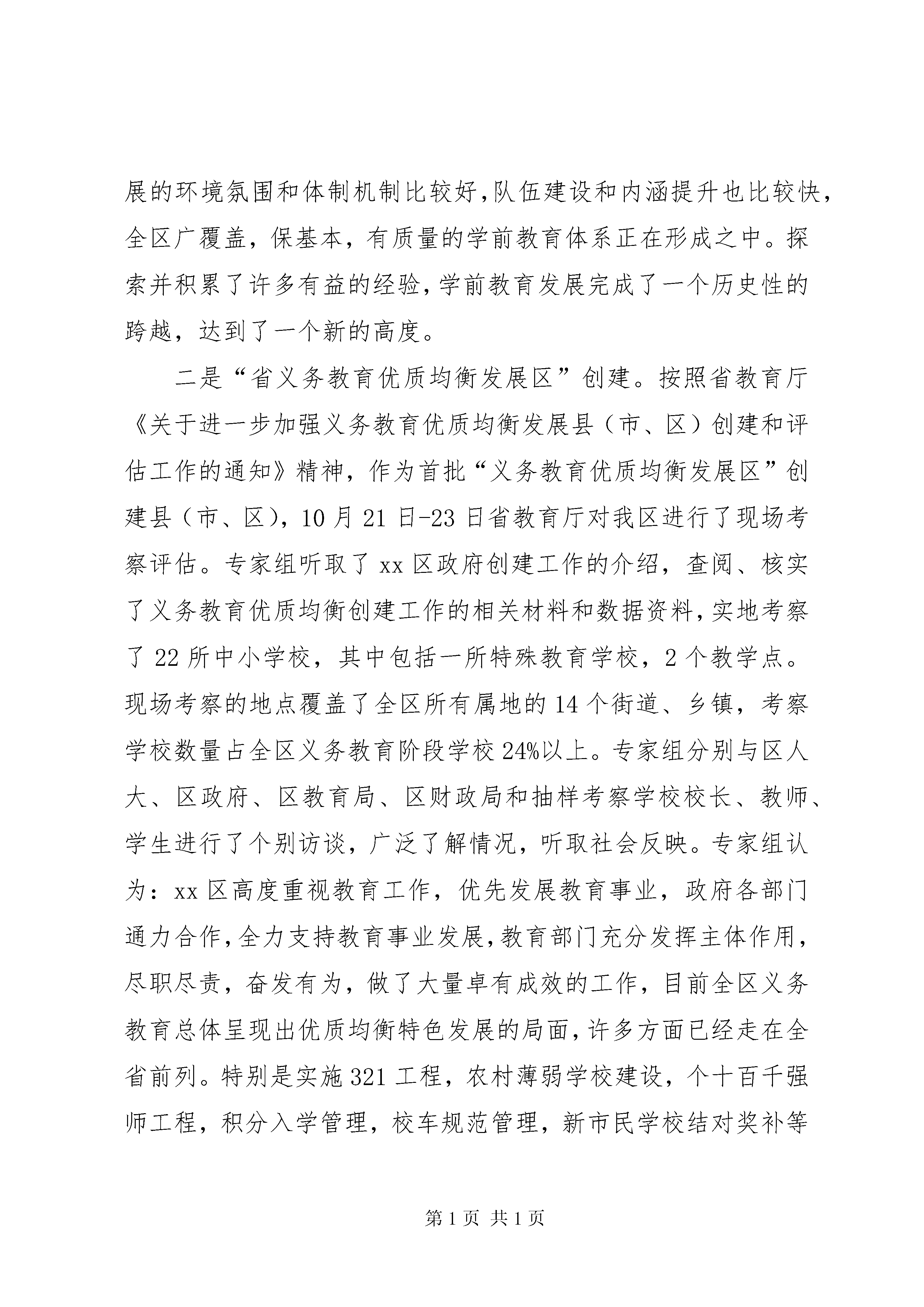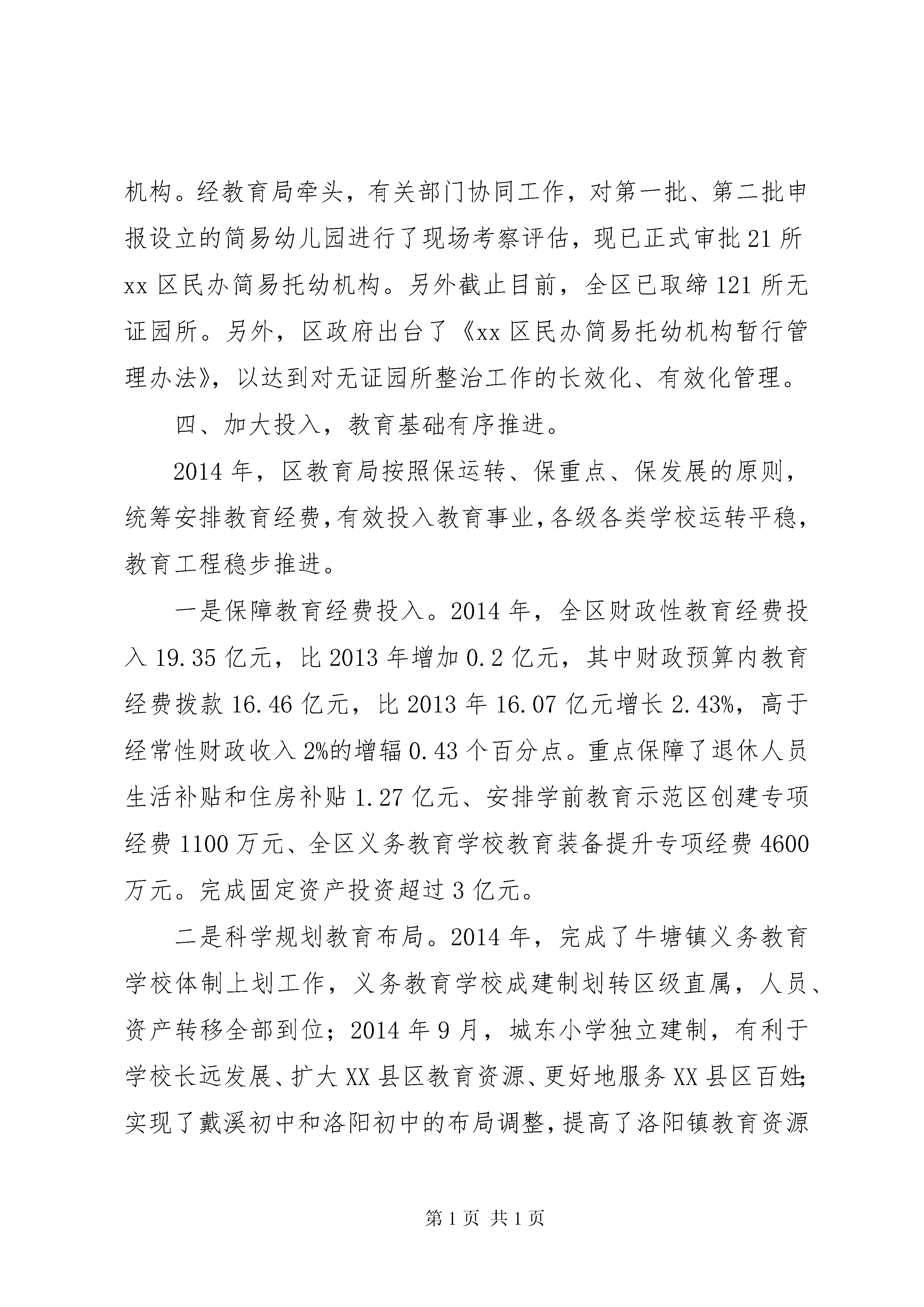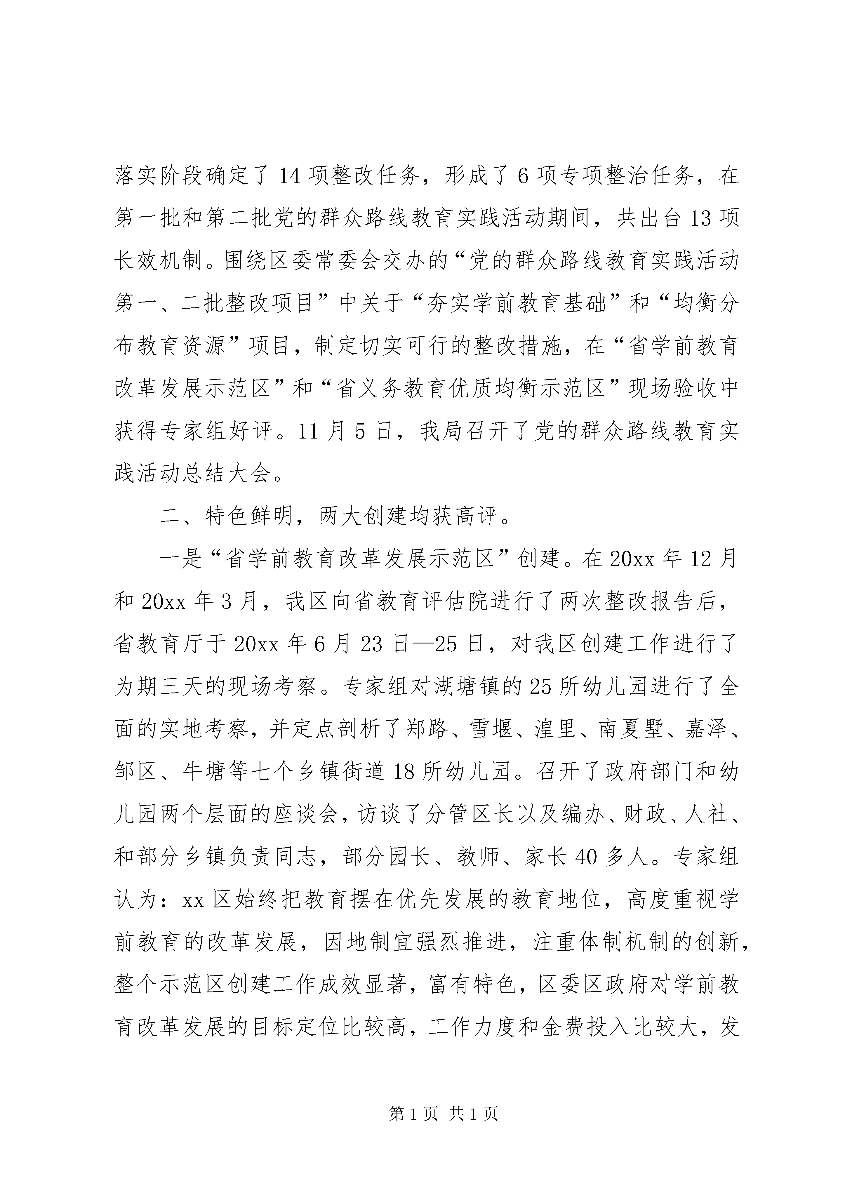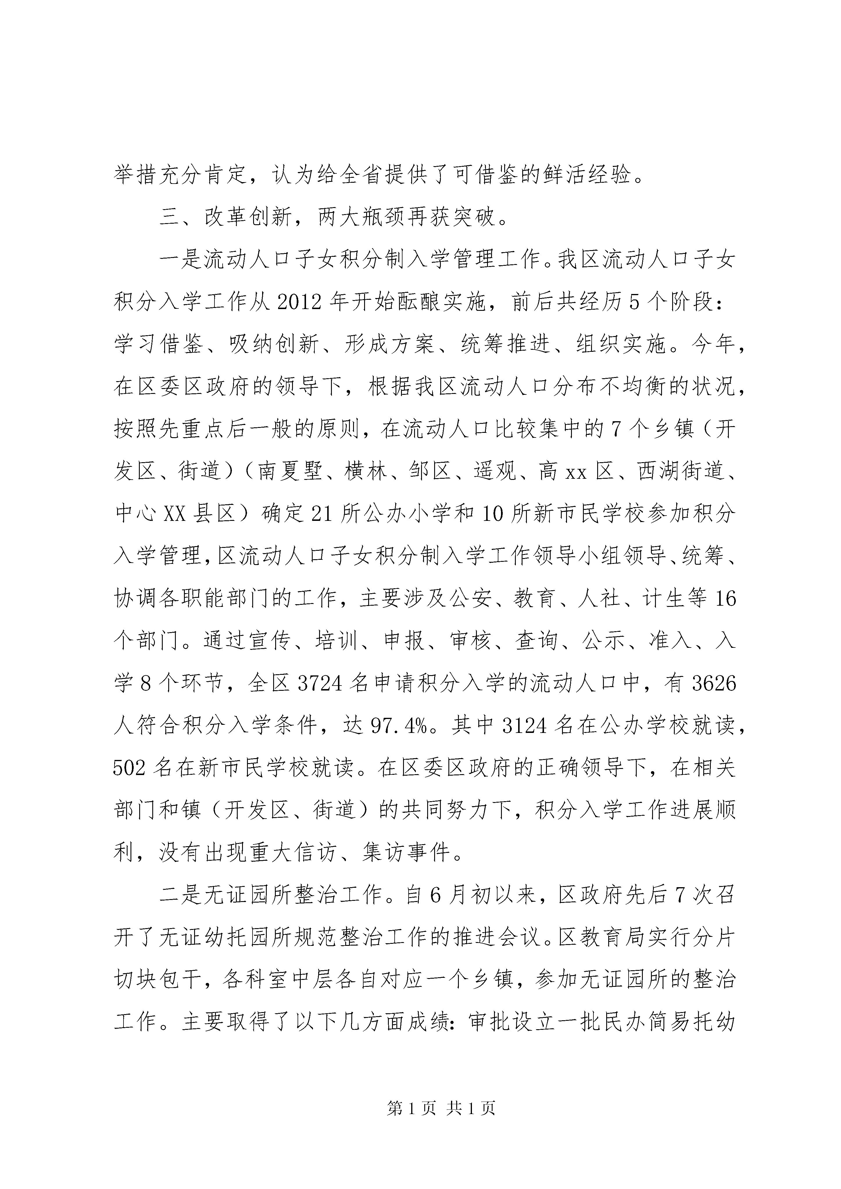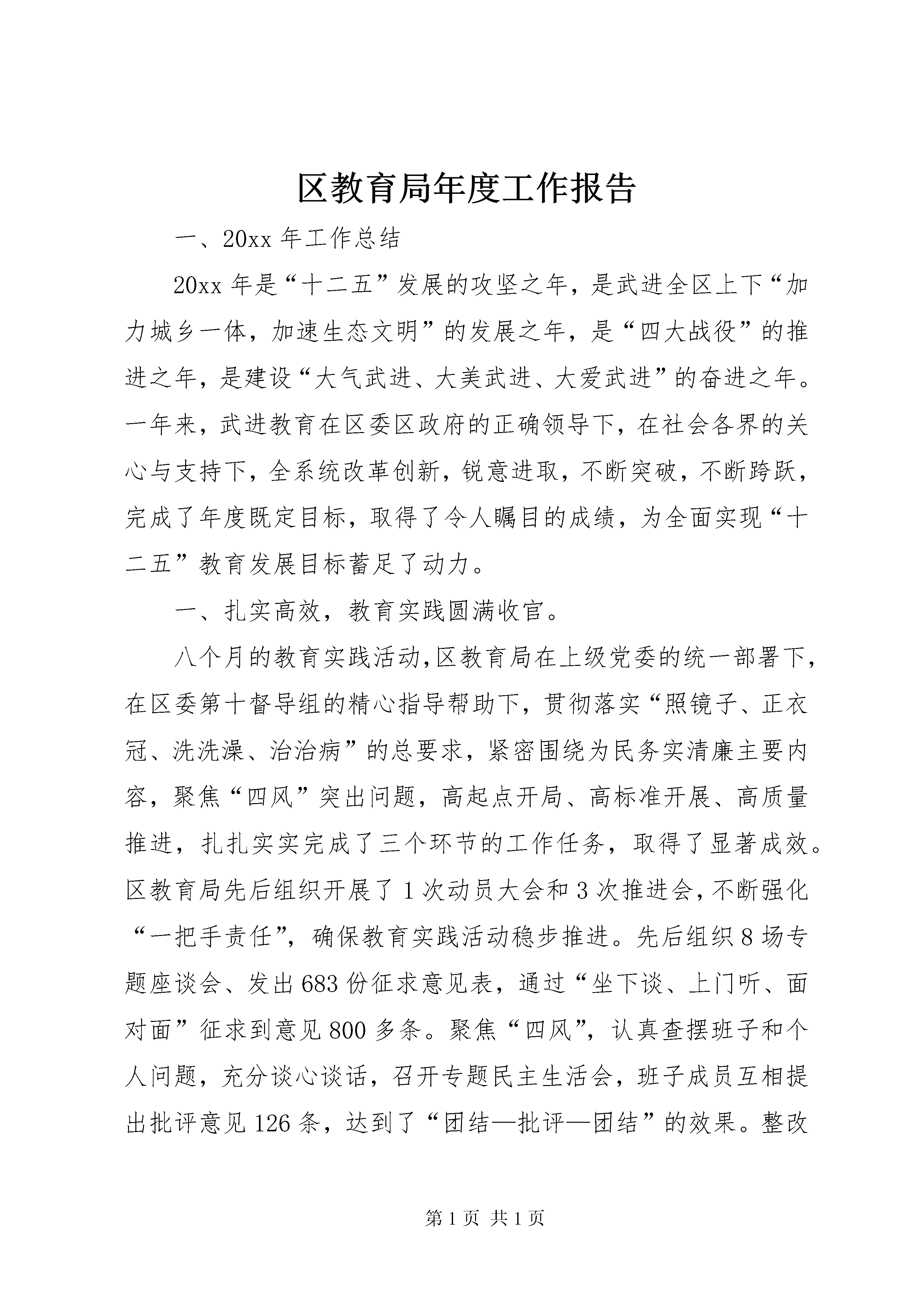 区教育局年度工作报告一、20xx年工作总结20xx年是“十二五”发展的攻坚之年,是武进全区上下“加力城乡一体,加速生态文明”的发展之年,是“四大战役”的推进之年,是建设“大气武进、大美武进、大爱武进”的奋进之年。一年来,武进教育在区委区政府的正确领导下,在社会各界的关心与支持下,全系统改革创新,锐意进取,不断突破,不断跨跃,完成了年度既定目标,取得了令人瞩目的成绩,为全面实现“十二五”教育发展目标蓄足了动力。一、扎实高效,教育实践圆满收官。八个月的教育实践活动,区教育局在上级党委的统一部署下,在区委第十督导组的精心指导帮助下,贯彻落实“照镜子、正衣冠、洗洗澡、治治病”的总要求,紧密围绕为民务实清廉主要内容,聚焦“四风”突出问题,高起点开局、高标准开展、高质量推进,扎扎实实完成了三个环节的工作任务,取得了显著成效。区教育局先后组织开展了1次动员大会和3次推进会,不断强化“一把手责任”,确保教育实践活动稳步推进。先后组织8场专题座谈会、发出683份征求意见表,通过“坐下谈、上门听、面对面”征求到意见800多条。聚焦“四风”,认真查摆班子和个人问题,充分谈心谈话,召开专题民主生活会,班子成员互相提出批评意见126条,达到了“团结—批评—团结”的效果。整改落实阶段确定了14项整改任务,形成了6项专项整治任务,在第一批和第二批党的群众路线教育实践活动期间,共出台13项长效机制。围绕区委常委会交办的“党的群众路线教育实践活动第一、二批整改项目”中关于“夯实学前教育基础”和“均衡分布教育资源”项目,制定切实可行的整改措施,在“省学前教育改革发展示范区”和“省义务教育优质均衡示范区”现场验收中获得专家组好评。11月5日,我局召开了党的群众路线教育实践活动总结大会。二、特色鲜明,两大创建均获高评。一是“省学前教育改革发展示范区”创建。在20xx年12月和20xx年3月,我区向省教育评估院进行了两次整改报告后,省教育厅于20xx年6月23日—25日,对我区创建工作进行了为期三天的现场考察。专家组对湖塘镇的25所幼儿园进行了全面的实地考察,并定点剖析了郑路、雪堰、湟里、南夏墅、嘉泽、邹区、牛塘等七个乡镇街道18所幼儿园。召开了政府部门和幼儿园两个层面的座谈会,访谈了分管区长以及编办、财政、人社、和部分乡镇负责同志,部分园长、教师、家长40多人。专家组认为:xx区始终把教育摆在优先发展的教育地位,高度重视学前教育的改革发展,因地制宜强烈推进,注重体制机制的创新,整个示范区创建工作成效显著,富有特色,区委区政府对学前教育改革发展的目标定位比较高,工作力度和金费投入比较大,发展的环境氛围和体制机制比较好,队伍建设和内涵提升也比较快,全区广覆盖,保基本,有质量的学前教育体系正在形成之中。探索并积累了许多有益的经验,学前教育发展完成了一个历史性的跨越,达到了一个新的高度。二是“省义务教育优质均衡发展区”创建。按照省教育厅《关于进一步加强义务教育优质均衡发展县(市、区)创建和评估工作的通知》精神,作为首批“义务教育优质均衡发展区”创建县(市、区),10月21日-23日省教育厅对我区进行了现场考察评估。专家组听取了xx区政府创建工作的介绍,查阅、核实了义务教育优质均衡创建工作的相关材料和数据资料,实地考察了22所中小学校,其中包括一所特殊教育学校,2个教学点。现场考察的地点覆盖了全区所有属地的14个街道、乡镇,考察学校数量占全区义务教育阶段学校24%以上。专家组分别与区人大、区政府、区教育局、区财政局和抽样考察学校校长、教师、学生进行了个别访谈,广泛了解情况,听取社会反映。专家组认为:xx区高度重视教育工作,优先发展教育事业,政府各部门通力合作,全力支持教育事业发展,教育部门充分发挥主体作用,尽职尽责,奋发有为,做了大量卓有成效的工作,目前全区义务教育总体呈现出优质均衡特色发展的局面,许多方面已经走在全省前列。特别是实施321工程,农村薄弱学校建设,个十百千强师工程,积分入学管理,校车规范管理,新市民学校结对奖补等举措充分肯定,认为给全省提供了可借鉴的鲜活经验。三、改革创新,两大瓶颈再获突破。一是流动人口子女积分制入学管理工作。我区流动人口子女积分入学工作从2012年开始酝酿实施,前后共经历5个阶段:学习借鉴、吸纳创新、形成方案、统筹推进、组织实施。今年,在区委区政府的领导下,根据我区流动人口分布不均衡的状况,按照先重点后一般的原则,在流动人口比较集中的7个乡镇(开发区、街道)(南夏墅、横林、邹区、遥观、高xx区、西湖街道、中心XX县区)确定21所公办小学和10所新市民学校参加积分入学管理,区流动人口子女积分制入学工作领导小组领导、统筹、协调各职能部门的工作,主要涉及公安、教育、人社、计生等16个部门。通过宣传、培训、申报、审核、查询、