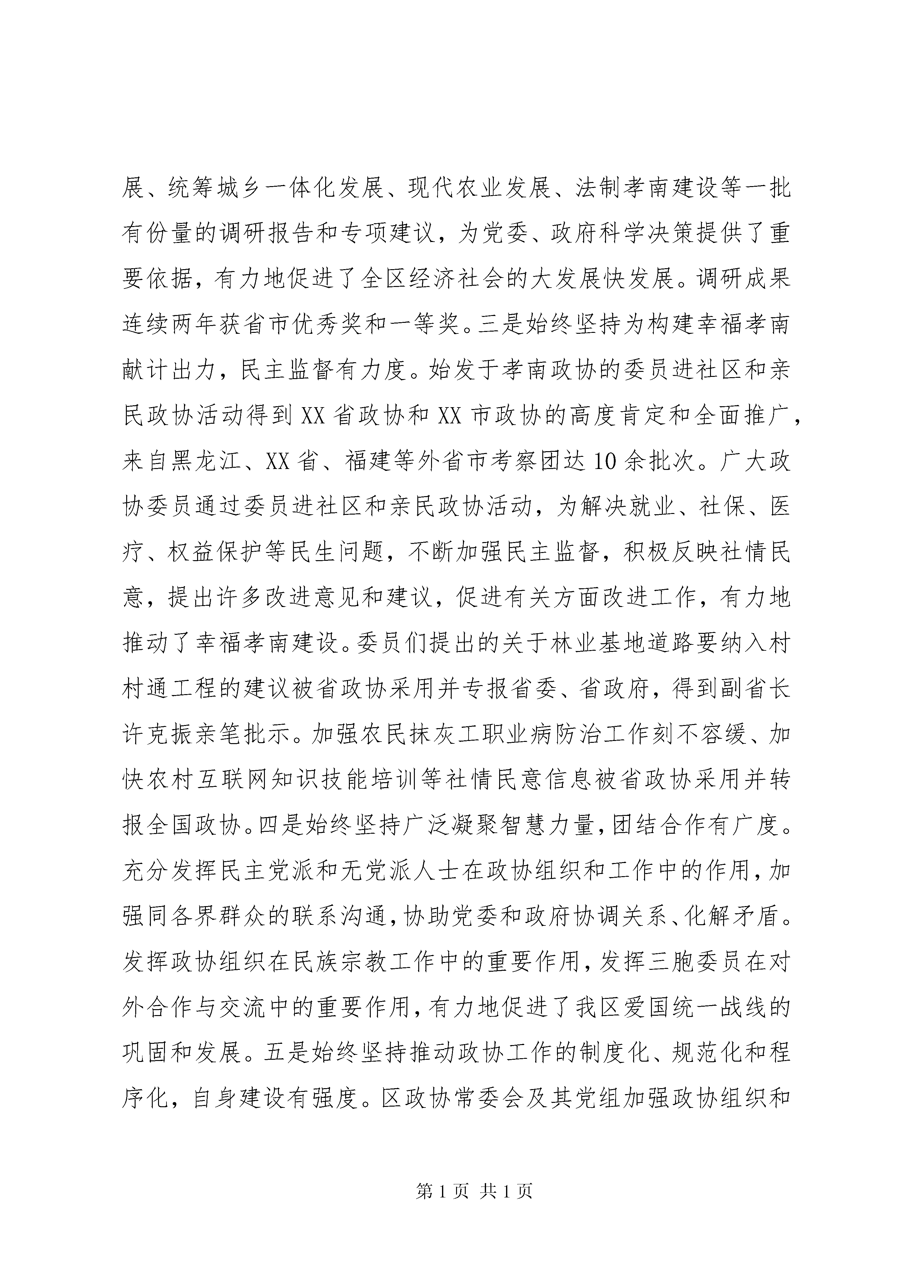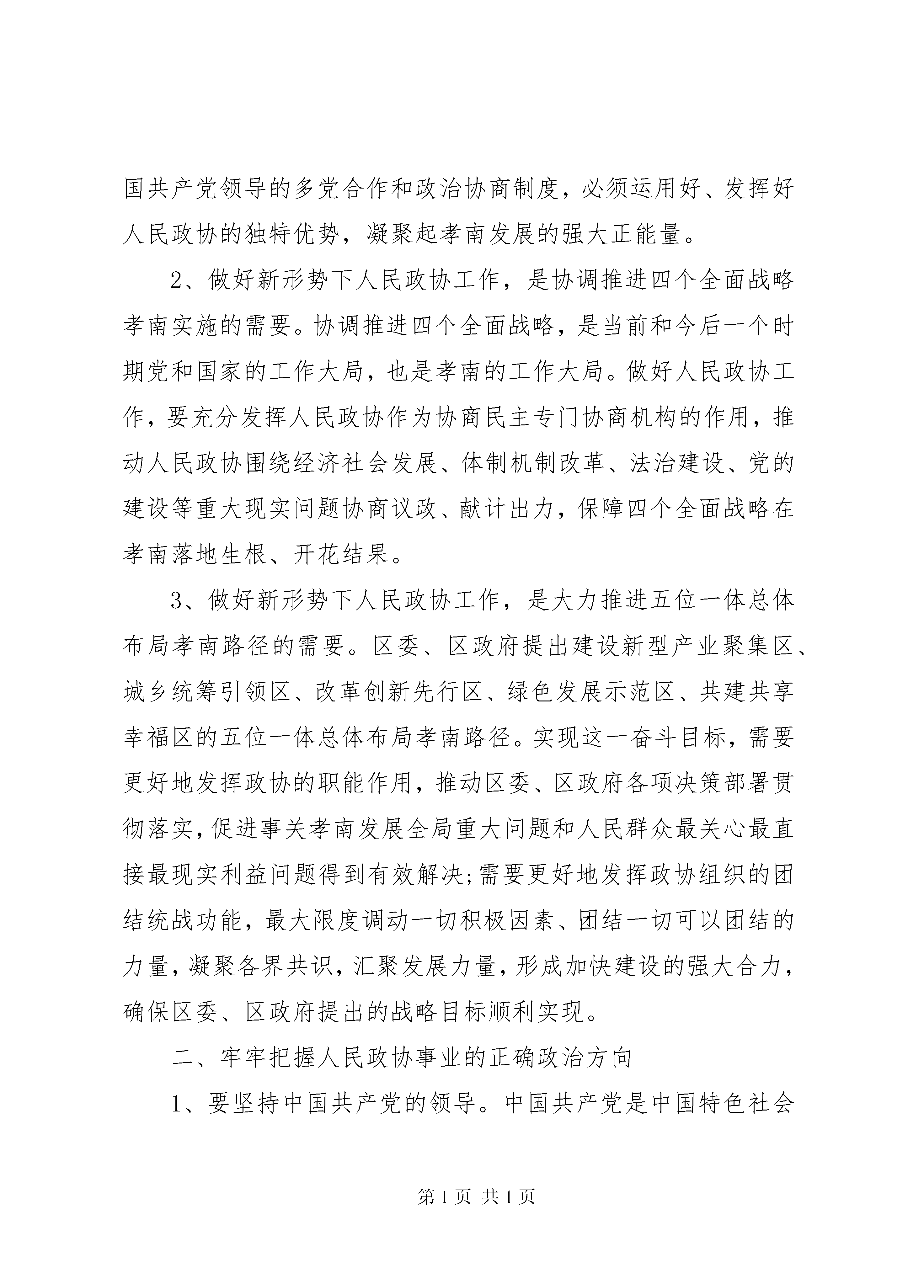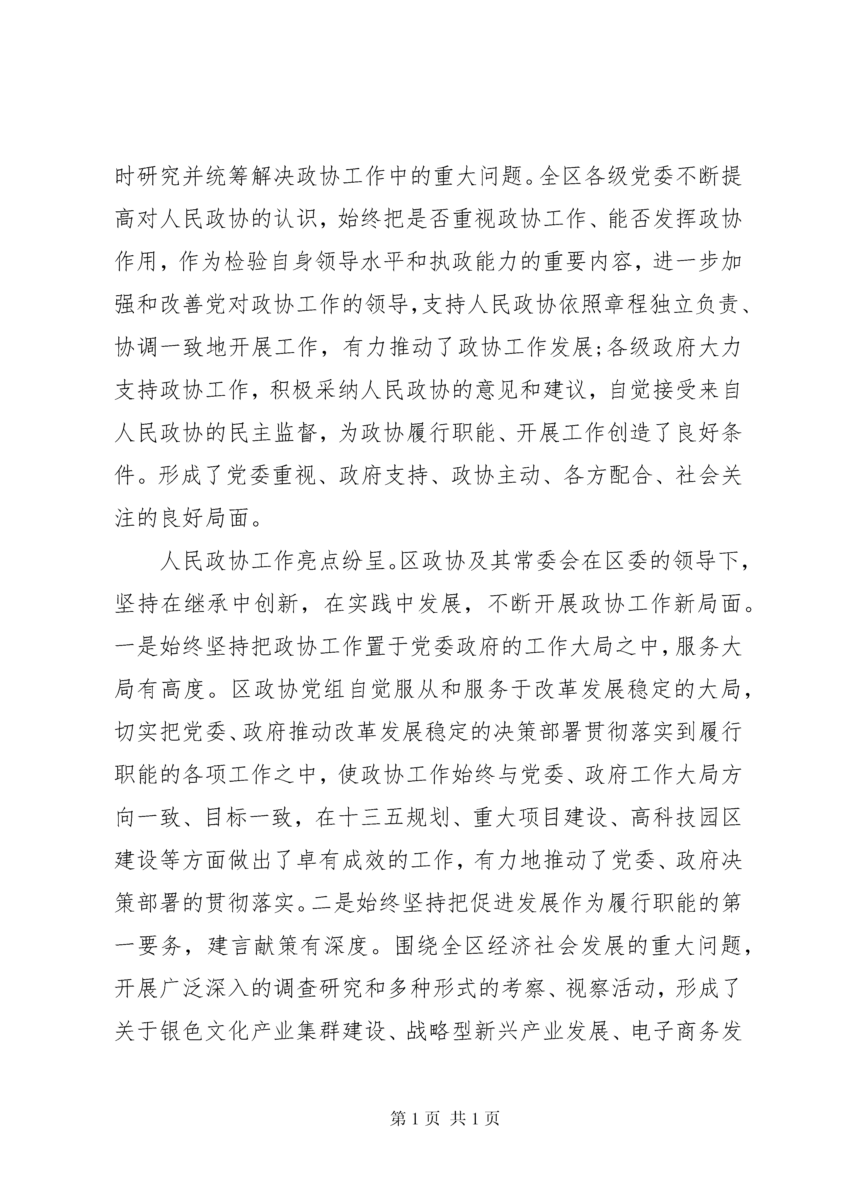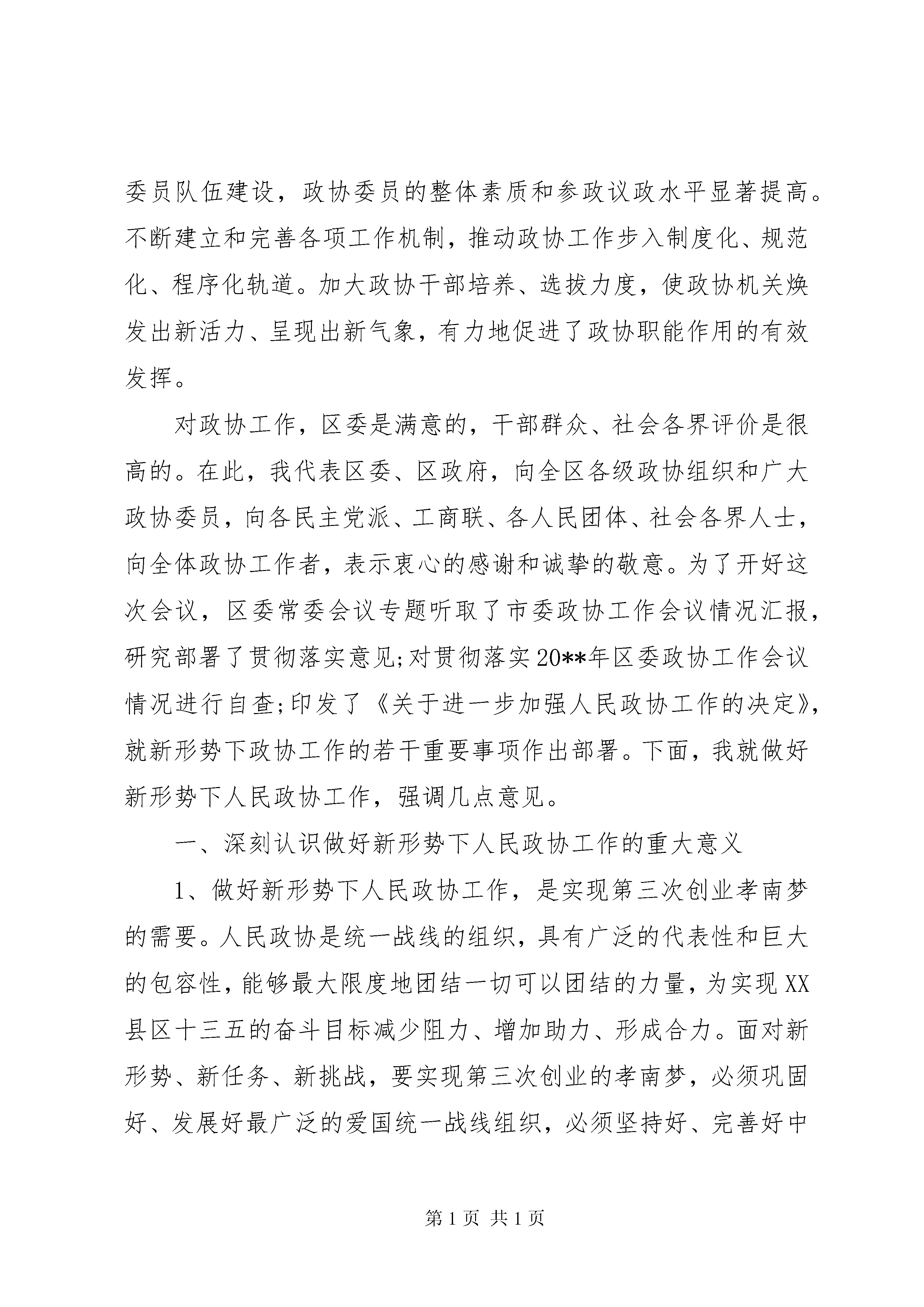 区委政协工作会议上的讲话坚持和完善人民政协政治协商制度,加强人民政协工作,是全社会的共同任务。下面是我给大家整理的区委政协工作会议上的讲话,仅供参考。区委政协工作会议上的讲话【篇一】同志们:在全国两会胜利闭幕之际,经区委研究,今天召开区委政协工作会议。主要任务是,深入贯彻党的十八大,十八届三中、四中、五中全会和习近平总书记系列重要讲话精神,认真落实省委、市委政协工作会议精神,研究部署新形势下的政协工作,充分发挥人民政协作为社会主义协商民主重要渠道和专门协商机构作用,广泛凝聚全区各党派团体、社会各界人士的智慧和力量,为十三五顺利开局共同努力。区委历来高度重视人民政协工作。20**年区委政协工作会议以来,特别是近年来,区委认真学习贯彻习近平总书记系列重要讲话精神,按照中央和省委、市委的部署要求,出台了《中共XX县区委关于加强和改进新形势下人民政协工作的实施意见》(孝南发【20**】5号,党政主要负责同志身体力行参与政协重要会议和重要活动,坚持把政协工作纳入总体工作部署和重要议事日程,重视发挥政协参政议政职能作用,每年转发区政协党组工作要点,及时研究并统筹解决政协工作中的重大问题。全区各级党委不断提高对人民政协的认识,始终把是否重视政协工作、能否发挥政协作用,作为检验自身领导水平和执政能力的重要内容,进一步加强和改善党对政协工作的领导,支持人民政协依照章程独立负责、协调一致地开展工作,有力推动了政协工作发展;各级政府大力支持政协工作,积极采纳人民政协的意见和建议,自觉接受来自人民政协的民主监督,为政协履行职能、开展工作创造了良好条件。形成了党委重视、政府支持、政协主动、各方配合、社会关注的良好局面。人民政协工作亮点纷呈。区政协及其常委会在区委的领导下,坚持在继承中创新,在实践中发展,不断开展政协工作新局面。一是始终坚持把政协工作置于党委政府的工作大局之中,服务大局有高度。区政协党组自觉服从和服务于改革发展稳定的大局,切实把党委、政府推动改革发展稳定的决策部署贯彻落实到履行职能的各项工作之中,使政协工作始终与党委、政府工作大局方向一致、目标一致,在十三五规划、重大项目建设、高科技园区建设等方面做出了卓有成效的工作,有力地推动了党委、政府决策部署的贯彻落实。二是始终坚持把促进发展作为履行职能的第一要务,建言献策有深度。围绕全区经济社会发展的重大问题,开展广泛深入的调查研究和多种形式的考察、视察活动,形成了关于银色文化产业集群建设、战略型新兴产业发展、电子商务发展、统筹城乡一体化发展、现代农业发展、法制孝南建设等一批有份量的调研报告和专项建议,为党委、政府科学决策提供了重要依据,有力地促进了全区经济社会的大发展快发展。调研成果连续两年获省市优秀奖和一等奖。三是始终坚持为构建幸福孝南献计出力,民主监督有力度。始发于孝南政协的委员进社区和亲民政协活动得到XX省政协和XX市政协的高度肯定和全面推广,来自黑龙江、XX省、福建等外省市考察团达10余批次。广大政协委员通过委员进社区和亲民政协活动,为解决就业、社保、医疗、权益保护等民生问题,不断加强民主监督,积极反映社情民意,提出许多改进意见和建议,促进有关方面改进工作,有力地推动了幸福孝南建设。委员们提出的关于林业基地道路要纳入村村通工程的建议被省政协采用并专报省委、省政府,得到副省长许克振亲笔批示。加强农民抹灰工职业病防治工作刻不容缓、加快农村互联网知识技能培训等社情民意信息被省政协采用并转报全国政协。四是始终坚持广泛凝聚智慧力量,团结合作有广度。充分发挥民主党派和无党派人士在政协组织和工作中的作用,加强同各界群众的联系沟通,协助党委和政府协调关系、化解矛盾。发挥政协组织在民族宗教工作中的重要作用,发挥三胞委员在对外合作与交流中的重要作用,有力地促进了我区爱国统一战线的巩固和发展。五是始终坚持推动政协工作的制度化、规范化和程序化,自身建设有强度。区政协常委会及其党组加强政协组织和委员队伍建设,政协委员的整体素质和参政议政水平显著提高。不断建立和完善各项工作机制,推动政协工作步入制度化、规范化、程序化轨道。加大政协干部培养、选拔力度,使政协机关焕发出新活力、呈现出新气象,有力地促进了政协职能作用的有效发挥。对政协工作,区委是满意的,干部群众、社会各界评价是很高的。在此,我代表区委、区政府,向全区各级政协组织和广大政协委员,向各民主党派、工商联、各人民团体、社会各界人士,向全体政协工作者,表示衷心的感谢和诚挚的敬意。为了开好这次会议,区委常委会议专题听取了市委政协工作会议情况汇报,研究部署了贯彻落实意见;对贯彻落实20**年区委政协工作会议情况进行自查;印发了《关于进一步加强人民政协工作的决定》,就新形势下政协工作的若干重要事项作出部署。下面,我就做好新形势下人民政协工作,强