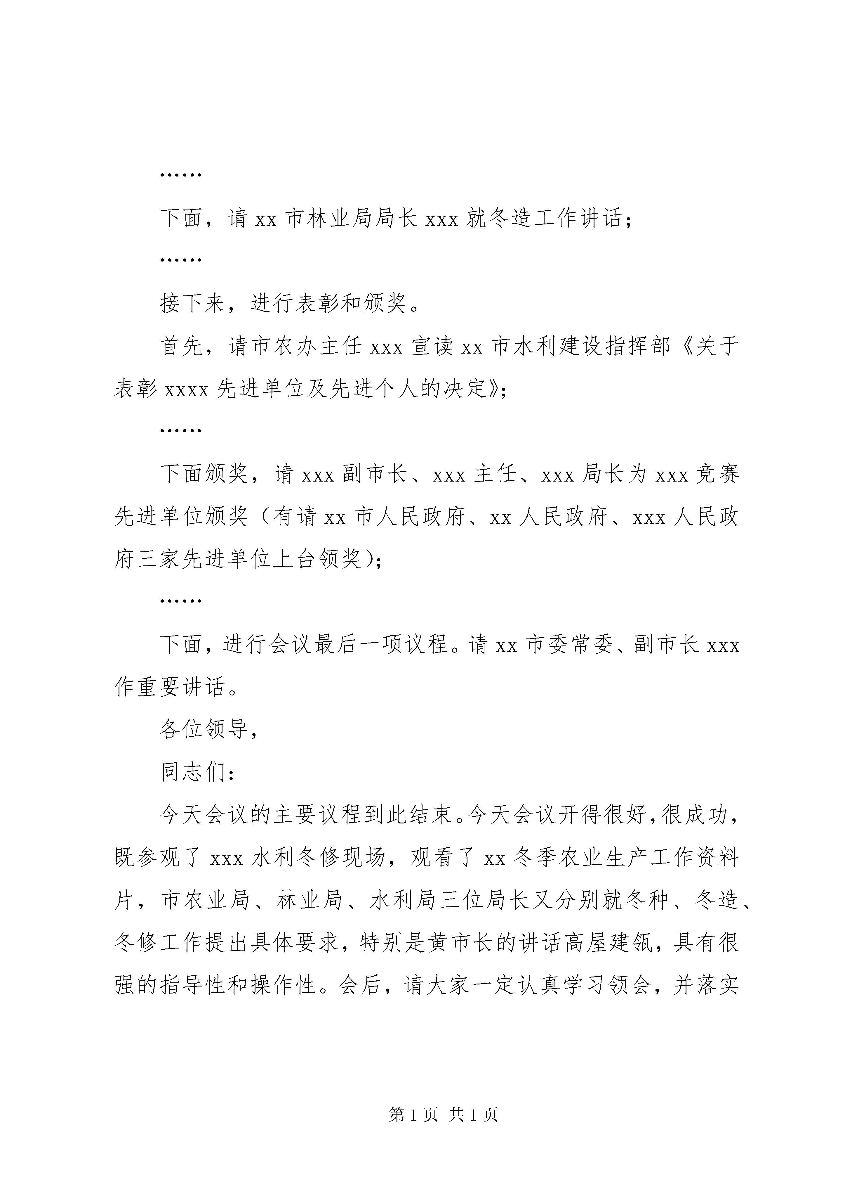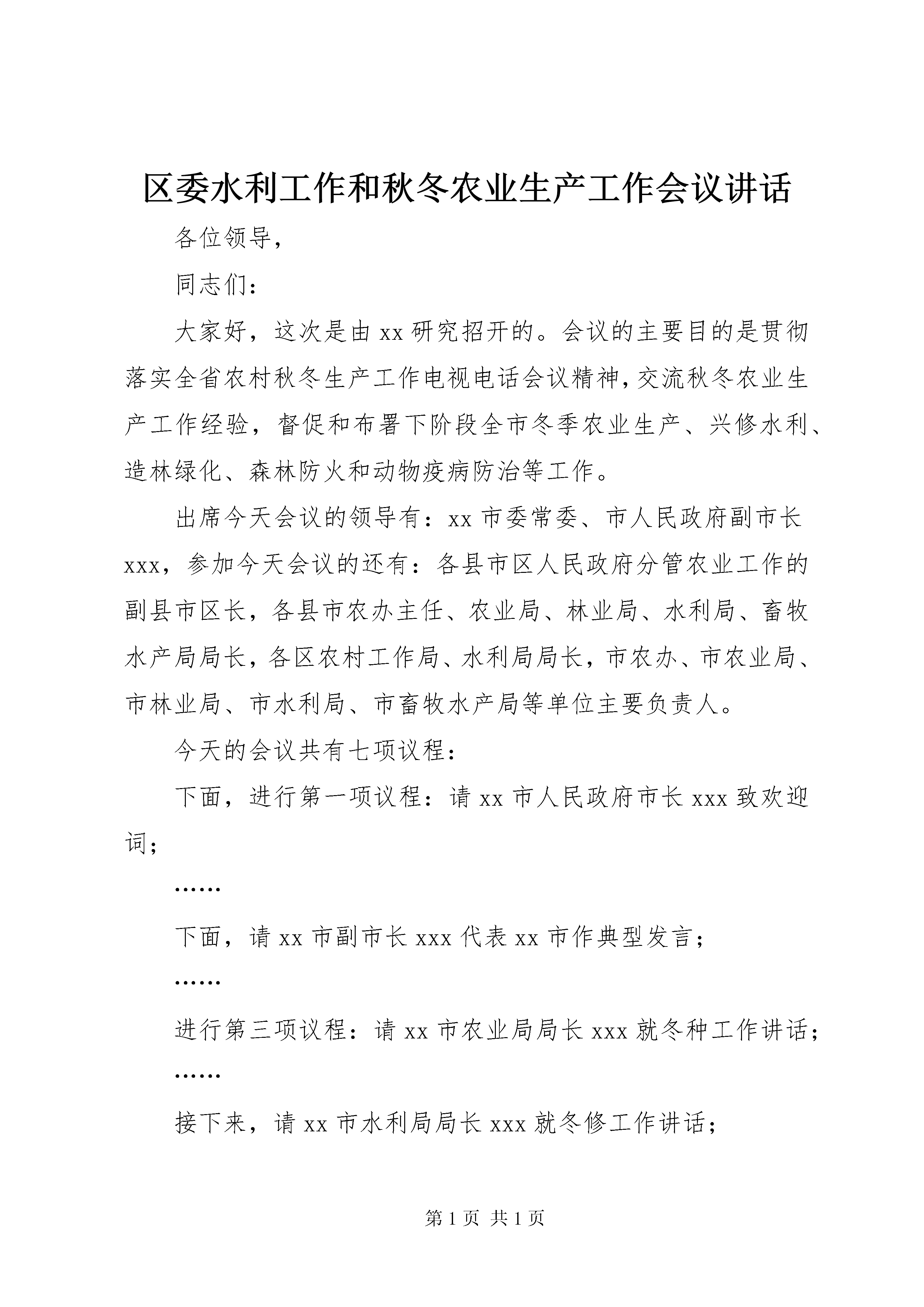 区委水利工作和秋冬农业生产工作会议讲话各位领导,同志们:大家好,这次是由xx研究招开的。会议的主要目的是贯彻落实全省农村秋冬生产工作电视电话会议精神,交流秋冬农业生产工作经验,督促和布署下阶段全市冬季农业生产、兴修水利、造林绿化、森林防火和动物疫病防治等工作。出席今天会议的领导有:xx市委常委、市人民政府副市长xxx,参加今天会议的还有:各县市区人民政府分管农业工作的副县市区长,各县市农办主任、农业局、林业局、水利局、畜牧水产局局长,各区农村工作局、水利局局长,市农办、市农业局、市林业局、市水利局、市畜牧水产局等单位主要负责人。今天的会议共有七项议程:下面,进行第一项议程:请xx市人民政府市长xxx致欢迎词;……下面,请xx市副市长xxx代表xx市作典型发言;……进行第三项议程:请xx市农业局局长xxx就冬种工作讲话;……接下来,请xx市水利局局长xxx就冬修工作讲话;……下面,请xx市林业局局长xxx就冬造工作讲话;……接下来,进行表彰和颁奖。首先,请市农办主任xxx宣读xx市水利建设指挥部《关于表彰xxxx先进单位及先进个人的决定》;……下面颁奖,请xxx副市长、xxx主任、xxx局长为xxx竞赛先进单位颁奖(有请xx市人民政府、xx人民政府、xxx人民政府三家先进单位上台领奖);……下面,进行会议最后一项议程。请xx市委常委、副市长xxx作重要讲话。各位领导,同志们:今天会议的主要议程到此结束。今天会议开得很好,很成功,既参观了xxx水利冬修现场,观看了xx冬季农业生产工作资料片,市农业局、林业局、水利局三位局长又分别就冬种、冬造、冬修工作提出具体要求,特别是黄市长的讲话高屋建瓴,具有很强的指导性和操作性。会后,请大家一定认真学习领会,并落实到具体的工作中去。