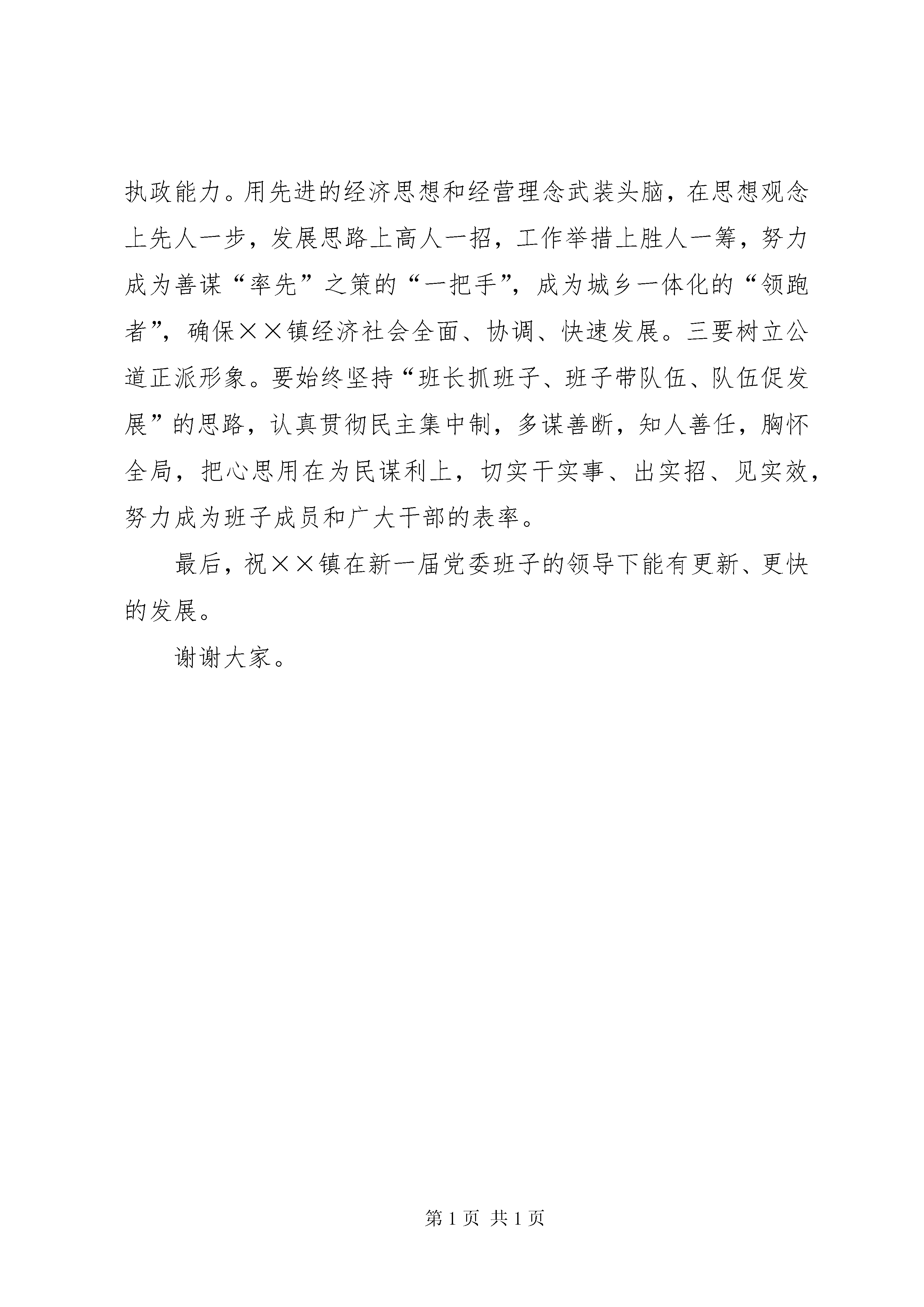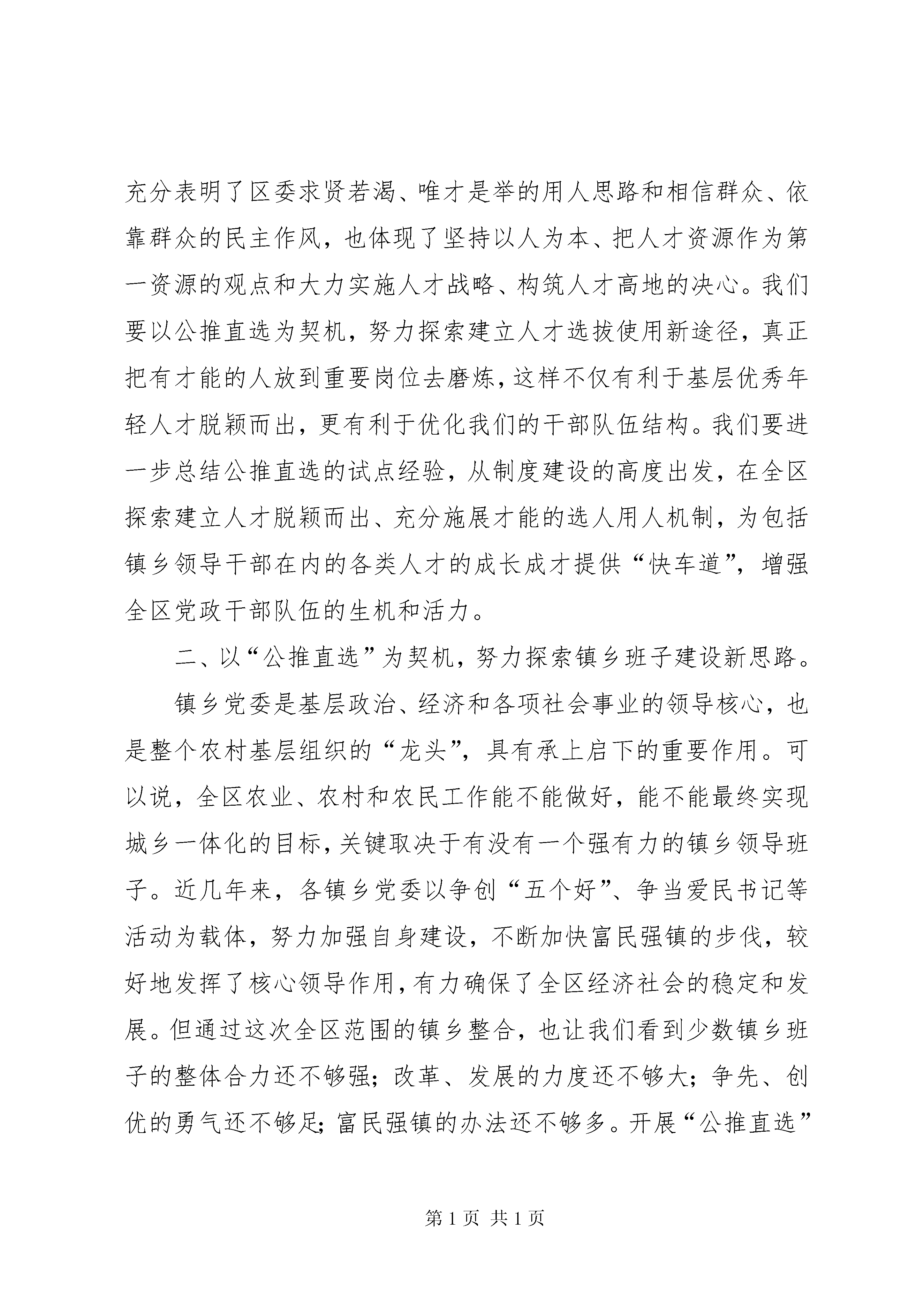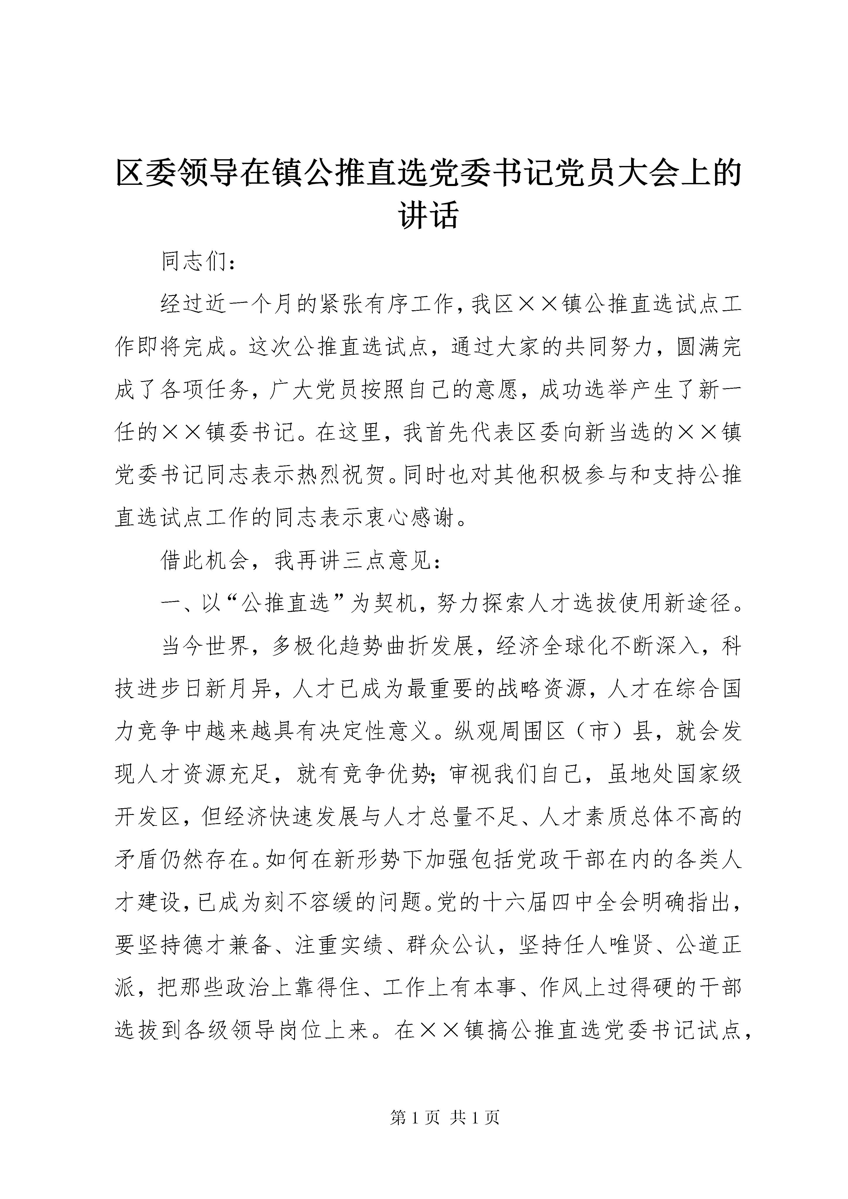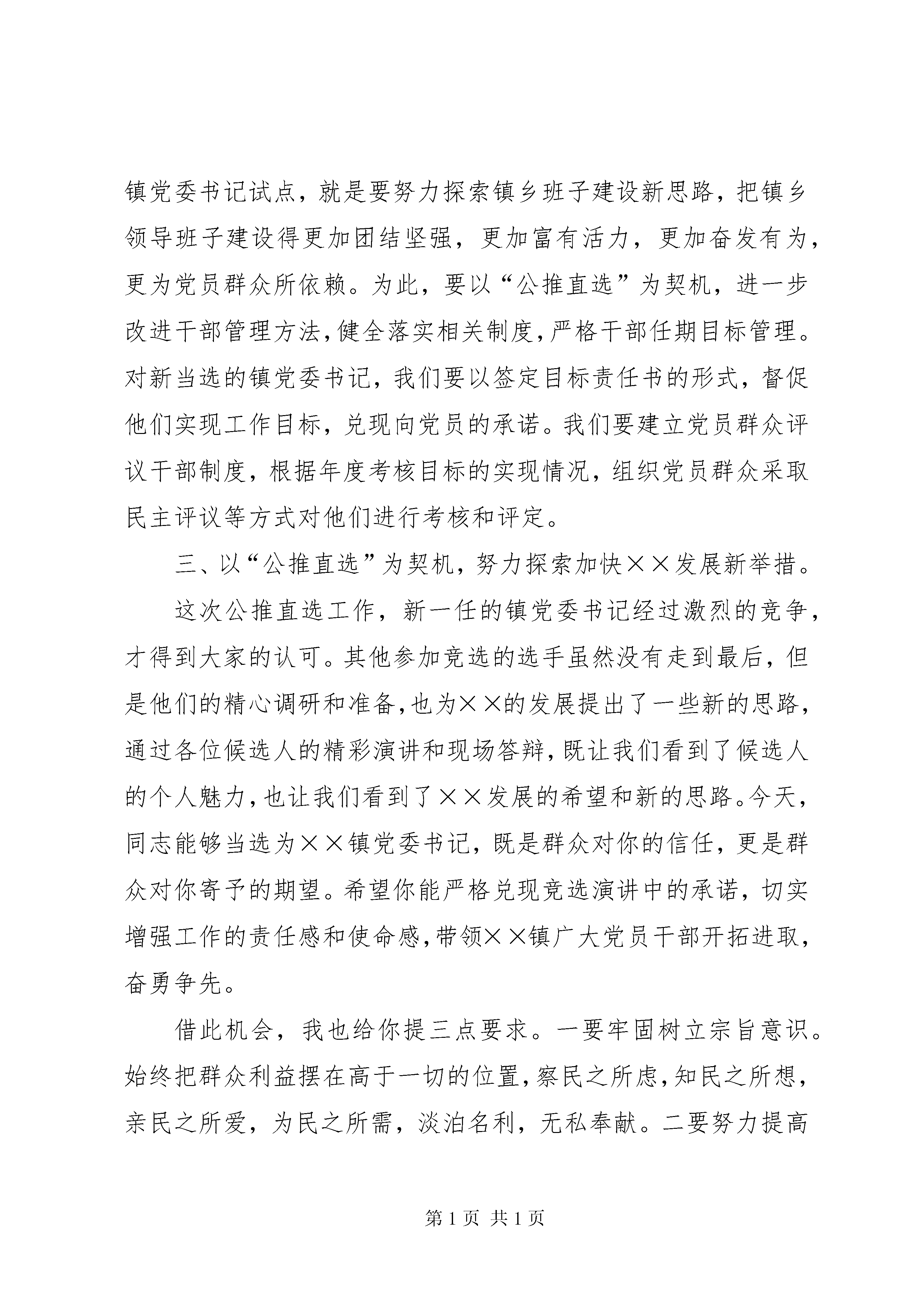 区委领导在镇公推直选党委书记党员大会上的讲话同志们:经过近一个月的紧张有序工作,我区××镇公推直选试点工作即将完成。这次公推直选试点,通过大家的共同努力,圆满完成了各项任务,广大党员按照自己的意愿,成功选举产生了新一任的××镇委书记。在这里,我首先代表区委向新当选的××镇党委书记同志表示热烈祝贺。同时也对其他积极参与和支持公推直选试点工作的同志表示衷心感谢。借此机会,我再讲三点意见:一、以“公推直选”为契机,努力探索人才选拔使用新途径。当今世界,多极化趋势曲折发展,经济全球化不断深入,科技进步日新月异,人才已成为最重要的战略资源,人才在综合国力竞争中越来越具有决定性意义。纵观周围区(市)县,就会发现人才资源充足,就有竞争优势;审视我们自己,虽地处国家级开发区,但经济快速发展与人才总量不足、人才素质总体不高的矛盾仍然存在。如何在新形势下加强包括党政干部在内的各类人才建设,已成为刻不容缓的问题。党的十六届四中全会明确指出,要坚持德才兼备、注重实绩、群众公认,坚持任人唯贤、公道正派,把那些政治上靠得住、工作上有本事、作风上过得硬的干部选拔到各级领导岗位上来。在××镇搞公推直选党委书记试点,充分表明了区委求贤若渴、唯才是举的用人思路和相信群众、依靠群众的民主作风,也体现了坚持以人为本、把人才资源作为第一资源的观点和大力实施人才战略、构筑人才高地的决心。我们要以公推直选为契机,努力探索建立人才选拔使用新途径,真正把有才能的人放到重要岗位去磨炼,这样不仅有利于基层优秀年轻人才脱颖而出,更有利于优化我们的干部队伍结构。我们要进一步总结公推直选的试点经验,从制度建设的高度出发,在全区探索建立人才脱颖而出、充分施展才能的选人用人机制,为包括镇乡领导干部在内的各类人才的成长成才提供“快车道”,增强全区党政干部队伍的生机和活力。二、以“公推直选”为契机,努力探索镇乡班子建设新思路。镇乡党委是基层政治、经济和各项社会事业的领导核心,也是整个农村基层组织的“龙头”,具有承上启下的重要作用。可以说,全区农业、农村和农民工作能不能做好,能不能最终实现城乡一体化的目标,关键取决于有没有一个强有力的镇乡领导班子。近几年来,各镇乡党委以争创“五个好”、争当爱民书记等活动为载体,努力加强自身建设,不断加快富民强镇的步伐,较好地发挥了核心领导作用,有力确保了全区经济社会的稳定和发展。但通过这次全区范围的镇乡整合,也让我们看到少数镇乡班子的整体合力还不够强;改革、发展的力度还不够大;争先、创优的勇气还不够足;富民强镇的办法还不够多。开展“公推直选”镇党委书记试点,就是要努力探索镇乡班子建设新思路,把镇乡领导班子建设得更加团结坚强,更加富有活力,更加奋发有为,更为党员群众所依赖。为此,要以“公推直选”为契机,进一步改进干部管理方法,健全落实相关制度,严格干部任期目标管理。对新当选的镇党委书记,我们要以签定目标责任书的形式,督促他们实现工作目标,兑现向党员的承诺。我们要建立党员群众评议干部制度,根据年度考核目标的实现情况,组织党员群众采取民主评议等方式对他们进行考核和评定。三、以“公推直选”为契机,努力探索加快××发展新举措。这次公推直选工作,新一任的镇党委书记经过激烈的竞争,才得到大家的认可。其他参加竞选的选手虽然没有走到最后,但是他们的精心调研和准备,也为××的发展提出了一些新的思路,通过各位候选人的精彩演讲和现场答辩,既让我们看到了候选人的个人魅力,也让我们看到了××发展的希望和新的思路。今天,同志能够当选为××镇党委书记,既是群众对你的信任,更是群众对你寄予的期望。希望你能严格兑现竞选演讲中的承诺,切实增强工作的责任感和使命感,带领××镇广大党员干部开拓进取,奋勇争先。借此机会,我也给你提三点要求。一要牢固树立宗旨意识。始终把群众利益摆在高于一切的位置,察民之所虑,知民之所想,亲民之所爱,为民之所需,淡泊名利,无私奉献。二要努力提高执政能力。用先进的经济思想和经营理念武装头脑,在思想观念上先人一步,发展思路上高人一招,工作举措上胜人一筹,努力成为善谋“率先”之策的“一把手”,成为城乡一体化的“领跑者”,确保××镇经济社会全面、协调、快速发展。三要树立公道正派形象。要始终坚持“班长抓班子、班子带队伍、队伍促发展”的思路,认真贯彻民主集中制,多谋善断,知人善任,胸怀全局,把心思用在为民谋利上,切实干实事、出实招、见实效,努力成为班子成员和广大干部的表率。最后,祝××镇在新一届党委班子的领导下能有更新、更快的发展。谢谢大家。