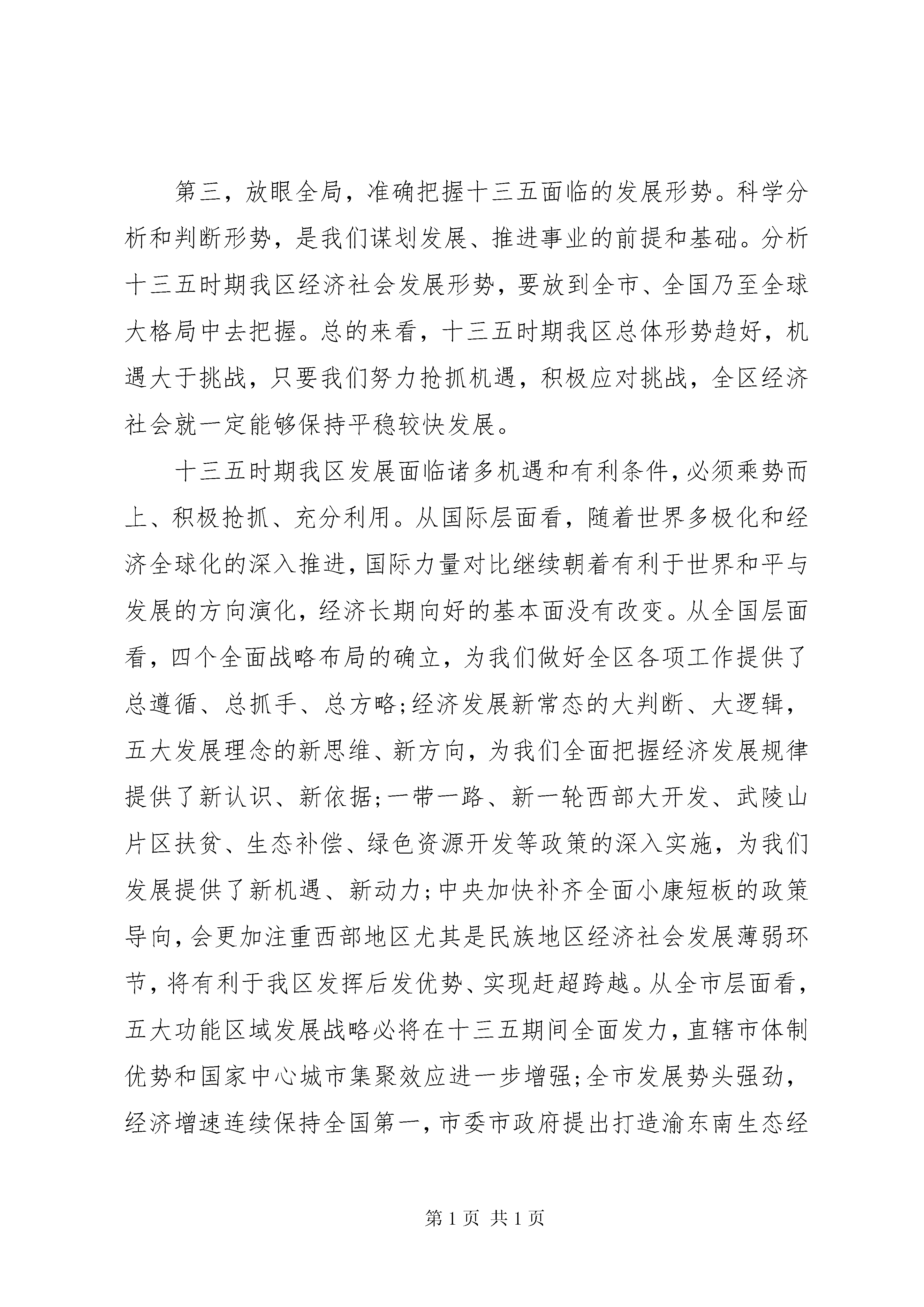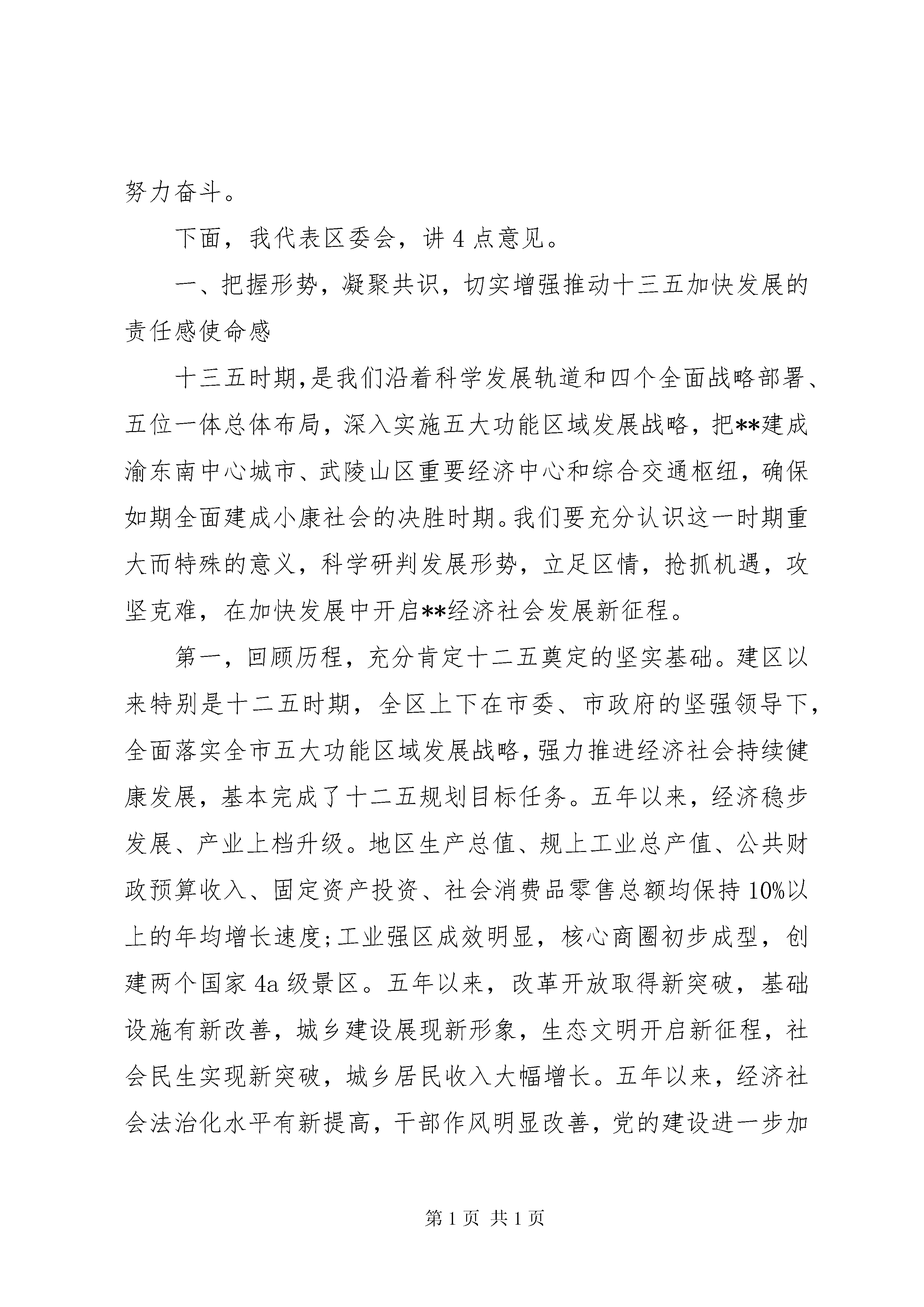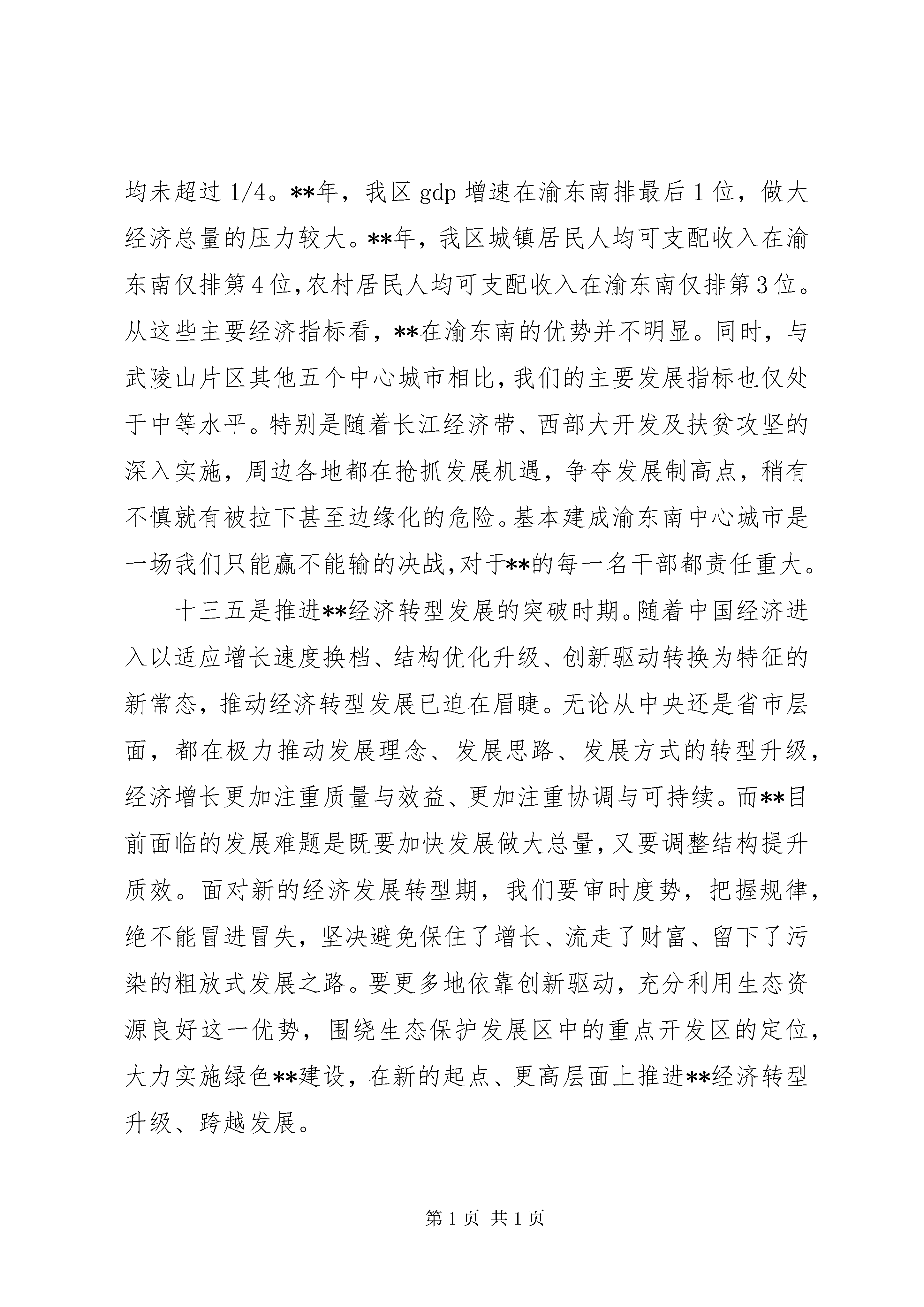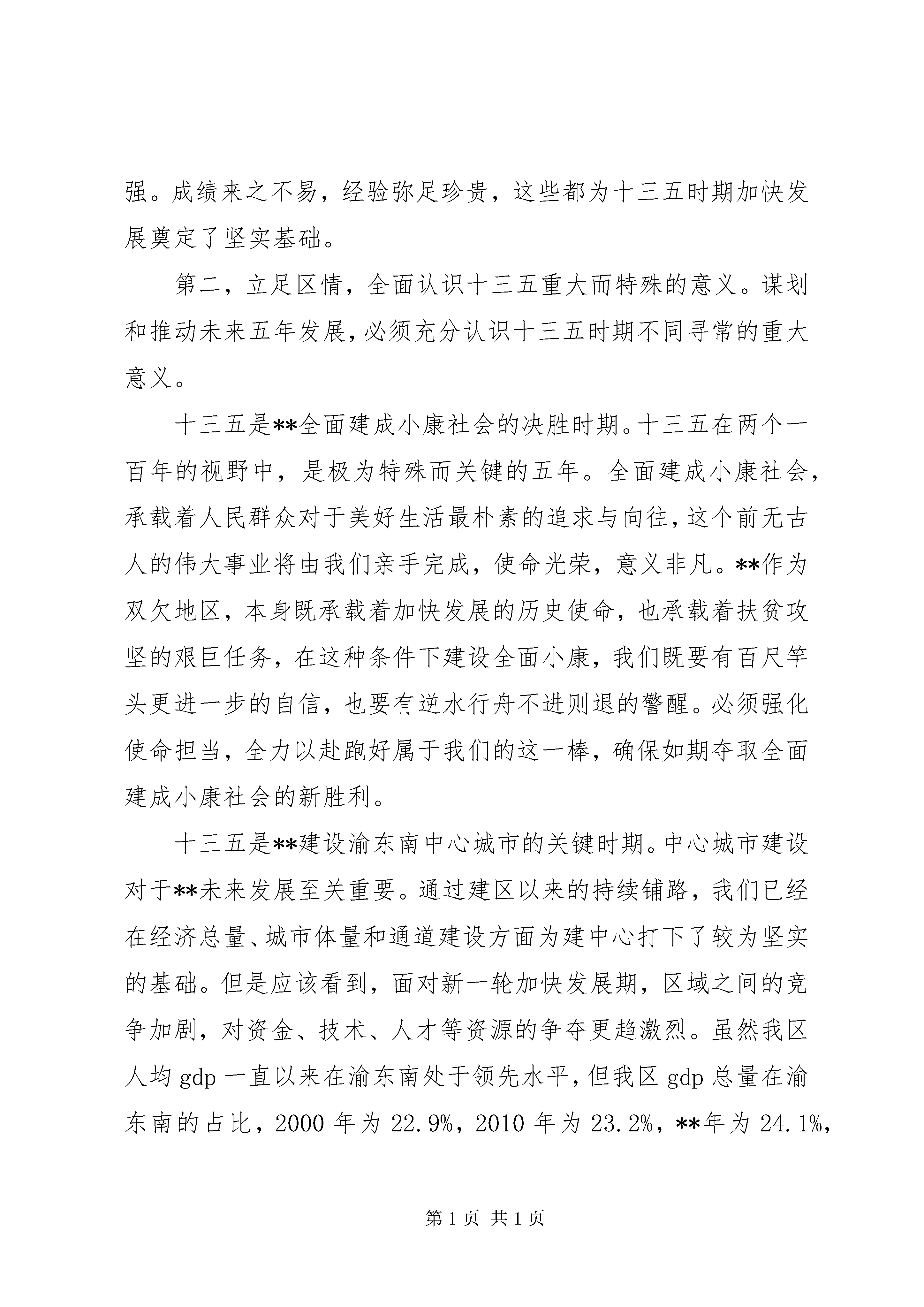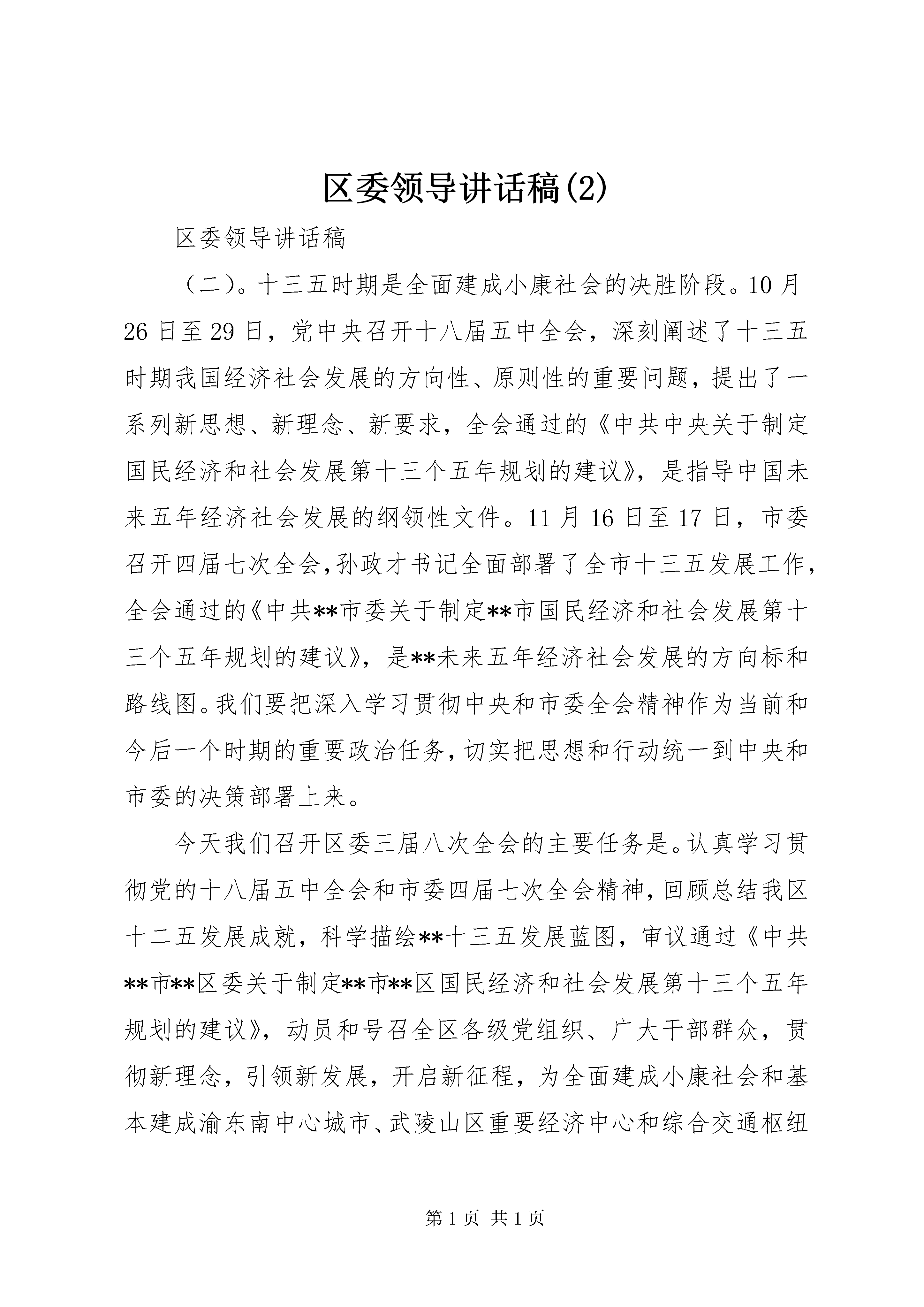 区委领导讲话稿(2)区委领导讲话稿(二)。十三五时期是全面建成小康社会的决胜阶段。10月26日至29日,党中央召开十八届五中全会,深刻阐述了十三五时期我国经济社会发展的方向性、原则性的重要问题,提出了一系列新思想、新理念、新要求,全会通过的《中共中央关于制定国民经济和社会发展第十三个五年规划的建议》,是指导中国未来五年经济社会发展的纲领性文件。11月16日至17日,市委召开四届七次全会,孙政才书记全面部署了全市十三五发展工作,全会通过的《中共**市委关于制定**市国民经济和社会发展第十三个五年规划的建议》,是**未来五年经济社会发展的方向标和路线图。我们要把深入学习贯彻中央和市委全会精神作为当前和今后一个时期的重要政治任务,切实把思想和行动统一到中央和市委的决策部署上来。今天我们召开区委三届八次全会的主要任务是。认真学习贯彻党的十八届五中全会和市委四届七次全会精神,回顾总结我区十二五发展成就,科学描绘**十三五发展蓝图,审议通过《中共**市**区委关于制定**市**区国民经济和社会发展第十三个五年规划的建议》,动员和号召全区各级党组织、广大干部群众,贯彻新理念,引领新发展,开启新征程,为全面建成小康社会和基本建成渝东南中心城市、武陵山区重要经济中心和综合交通枢纽努力奋斗。下面,我代表区委会,讲4点意见。一、把握形势,凝聚共识,切实增强推动十三五加快发展的责任感使命感十三五时期,是我们沿着科学发展轨道和四个全面战略部署、五位一体总体布局,深入实施五大功能区域发展战略,把**建成渝东南中心城市、武陵山区重要经济中心和综合交通枢纽,确保如期全面建成小康社会的决胜时期。我们要充分认识这一时期重大而特殊的意义,科学研判发展形势,立足区情,抢抓机遇,攻坚克难,在加快发展中开启**经济社会发展新征程。第一,回顾历程,充分肯定十二五奠定的坚实基础。建区以来特别是十二五时期,全区上下在市委、市政府的坚强领导下,全面落实全市五大功能区域发展战略,强力推进经济社会持续健康发展,基本完成了十二五规划目标任务。五年以来,经济稳步发展、产业上档升级。地区生产总值、规上工业总产值、公共财政预算收入、固定资产投资、社会消费品零售总额均保持10%以上的年均增长速度;工业强区成效明显,核心商圈初步成型,创建两个国家4a级景区。五年以来,改革开放取得新突破,基础设施有新改善,城乡建设展现新形象,生态文明开启新征程,社会民生实现新突破,城乡居民收入大幅增长。五年以来,经济社会法治化水平有新提高,干部作风明显改善,党的建设进一步加强。成绩来之不易,经验弥足珍贵,这些都为十三五时期加快发展奠定了坚实基础。第二,立足区情,全面认识十三五重大而特殊的意义。谋划和推动未来五年发展,必须充分认识十三五时期不同寻常的重大意义。十三五是**全面建成小康社会的决胜时期。十三五在两个一百年的视野中,是极为特殊而关键的五年。全面建成小康社会,承载着人民群众对于美好生活最朴素的追求与向往,这个前无古人的伟大事业将由我们亲手完成,使命光荣,意义非凡。**作为双欠地区,本身既承载着加快发展的历史使命,也承载着扶贫攻坚的艰巨任务,在这种条件下建设全面小康,我们既要有百尺竿头更进一步的自信,也要有逆水行舟不进则退的警醒。必须强化使命担当,全力以赴跑好属于我们的这一棒,确保如期夺取全面建成小康社会的新胜利。十三五是**建设渝东南中心城市的关键时期。中心城市建设对于**未来发展至关重要。通过建区以来的持续铺路,我们已经在经济总量、城市体量和通道建设方面为建中心打下了较为坚实的基础。但是应该看到,面对新一轮加快发展期,区域之间的竞争加剧,对资金、技术、人才等资源的争夺更趋激烈。虽然我区人均gdp一直以来在渝东南处于领先水平,但我区gdp总量在渝东南的占比,2000年为22.9%,2010年为23.2%,**年为24.1%,均未超过1/4。**年,我区gdp增速在渝东南排最后1位,做大经济总量的压力较大。**年,我区城镇居民人均可支配收入在渝东南仅排第4位,农村居民人均可支配收入在渝东南仅排第3位。从这些主要经济指标看,**在渝东南的优势并不明显。同时,与武陵山片区其他五个中心城市相比,我们的主要发展指标也仅处于中等水平。特别是随着长江经济带、西部大开发及扶贫攻坚的深入实施,周边各地都在抢抓发展机遇,争夺发展制高点,稍有不慎就有被拉下甚至边缘化的危险。基本建成渝东南中心城市是一场我们只能赢不能输的决战,对于**的每一名干部都责任重大。十三五是推进**经济转型发展的突破时期。随着中国经济进入以适应增长速度换档、结构优化升级、创新驱动转换为特征的新常态,推动经济转型发展已迫在眉睫。无论从中央还是省市层面,都在极力推动发展理念、发展思路、发展方式的转型升级,经济增长更加注重质量与效益、