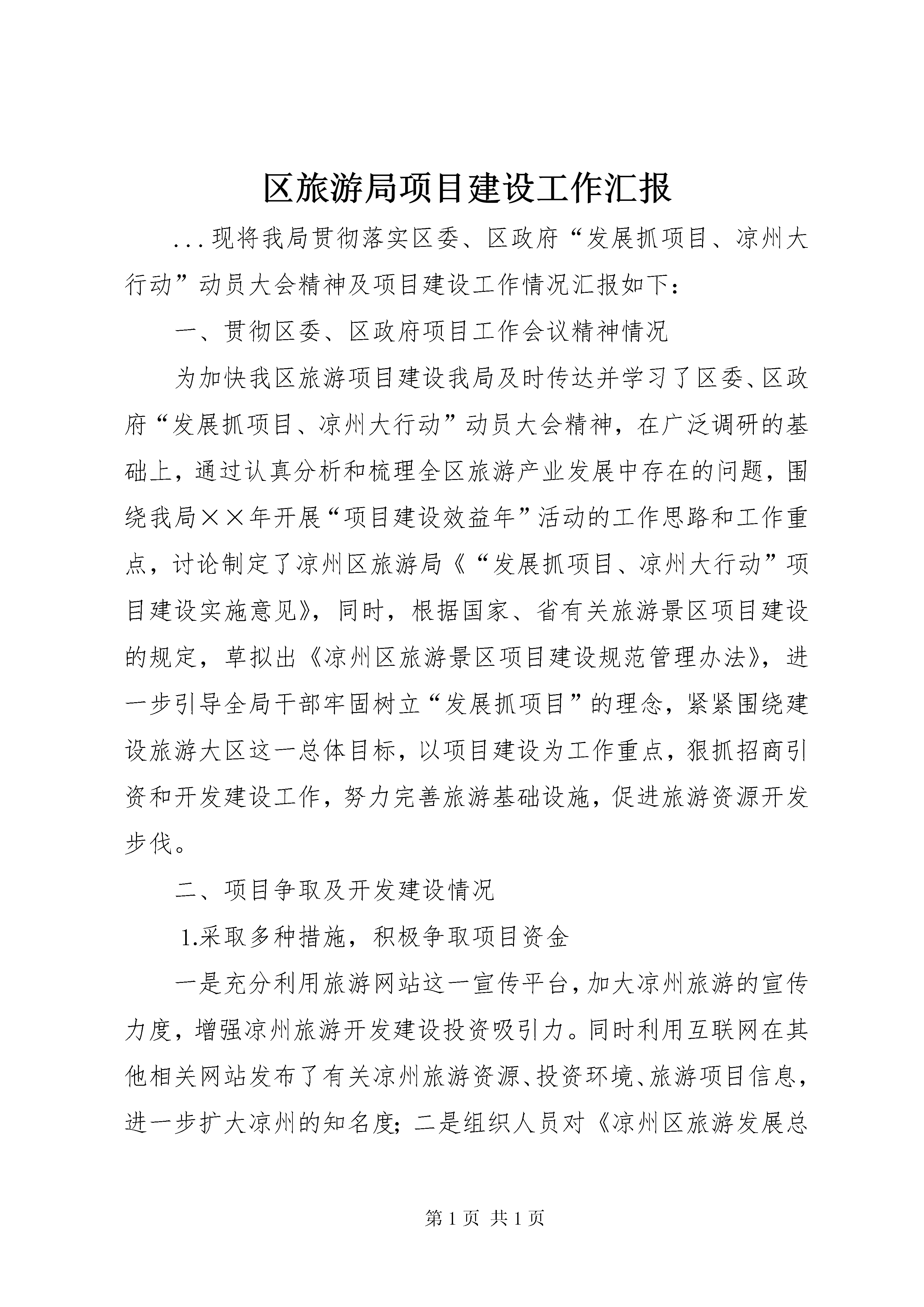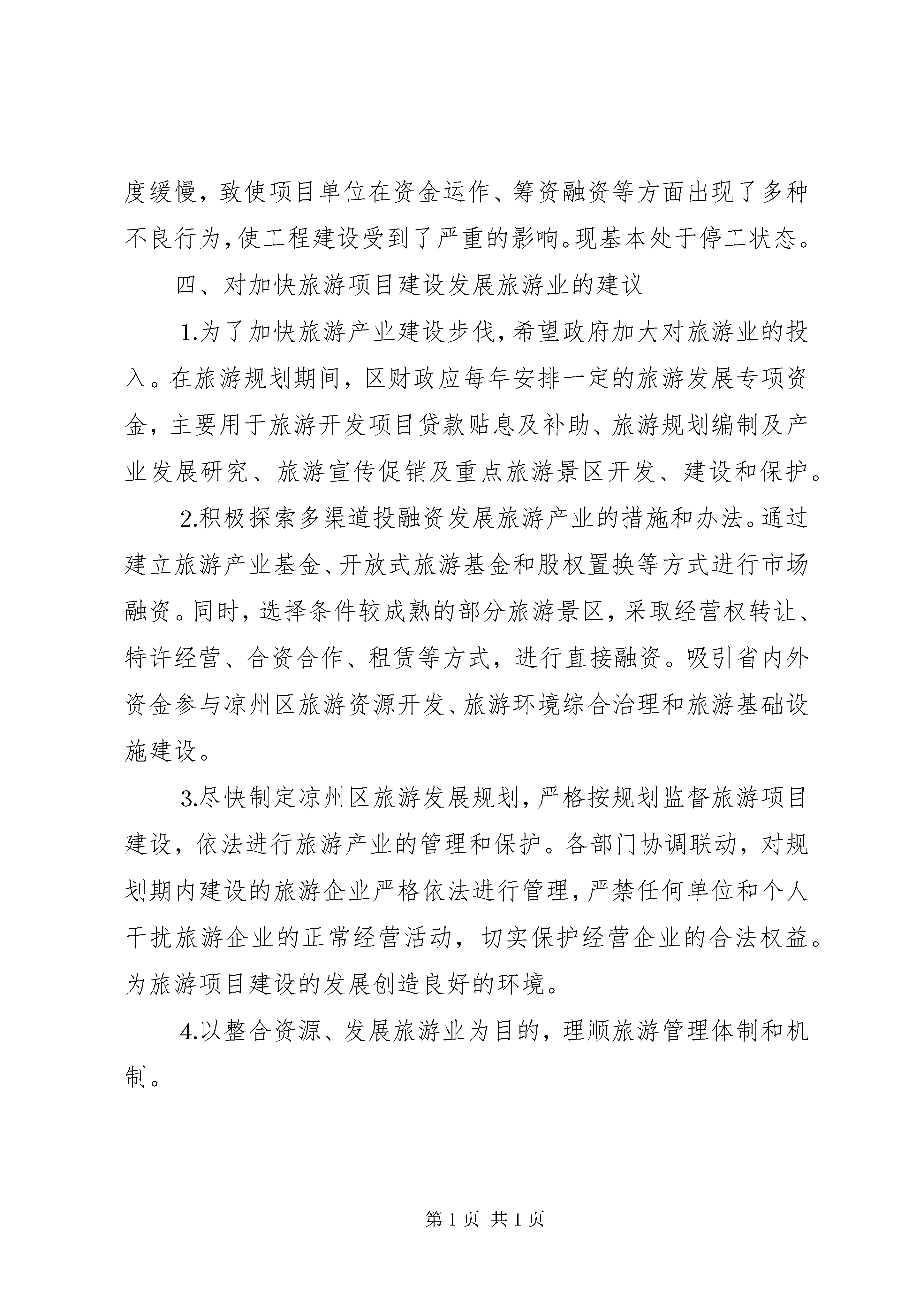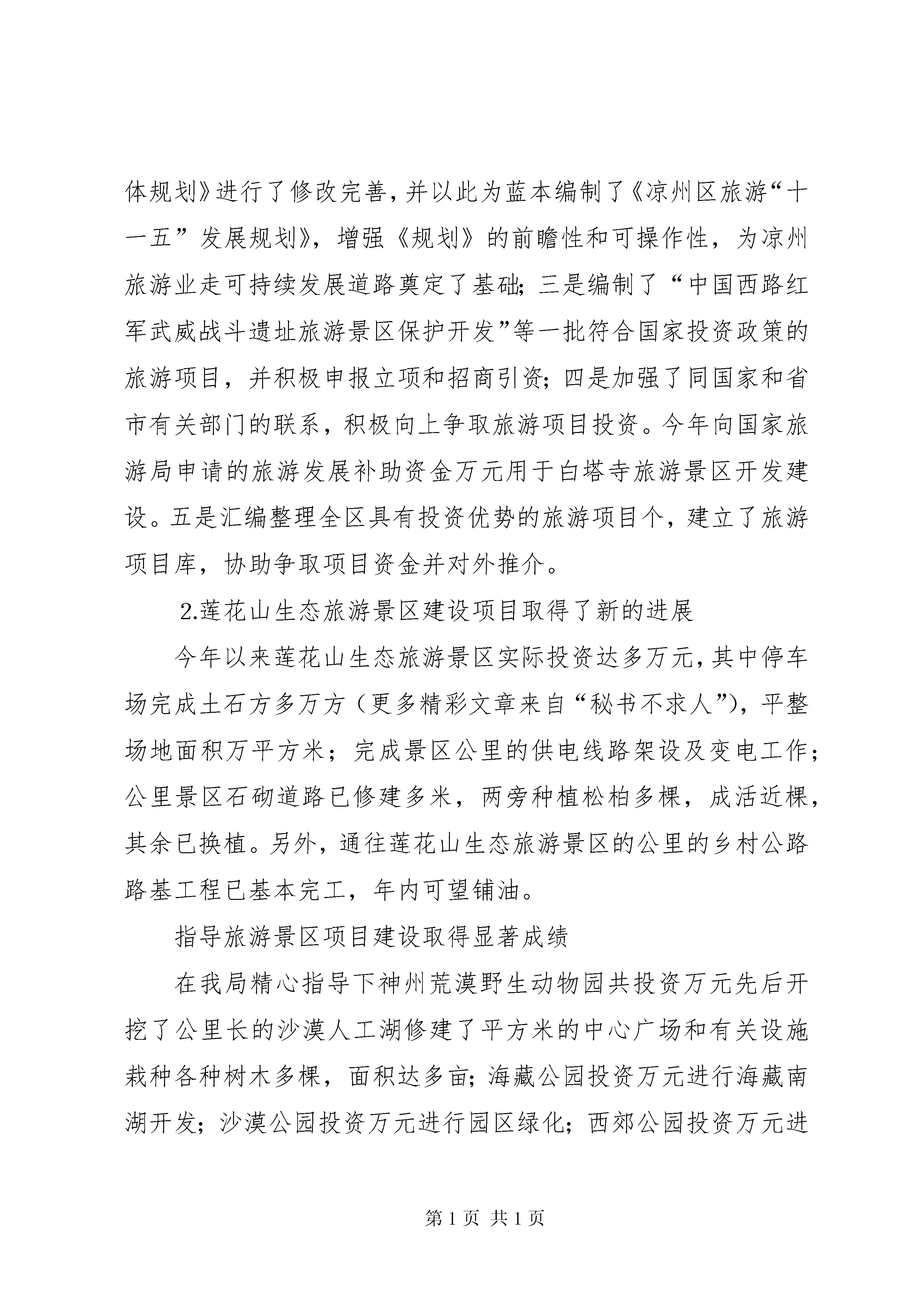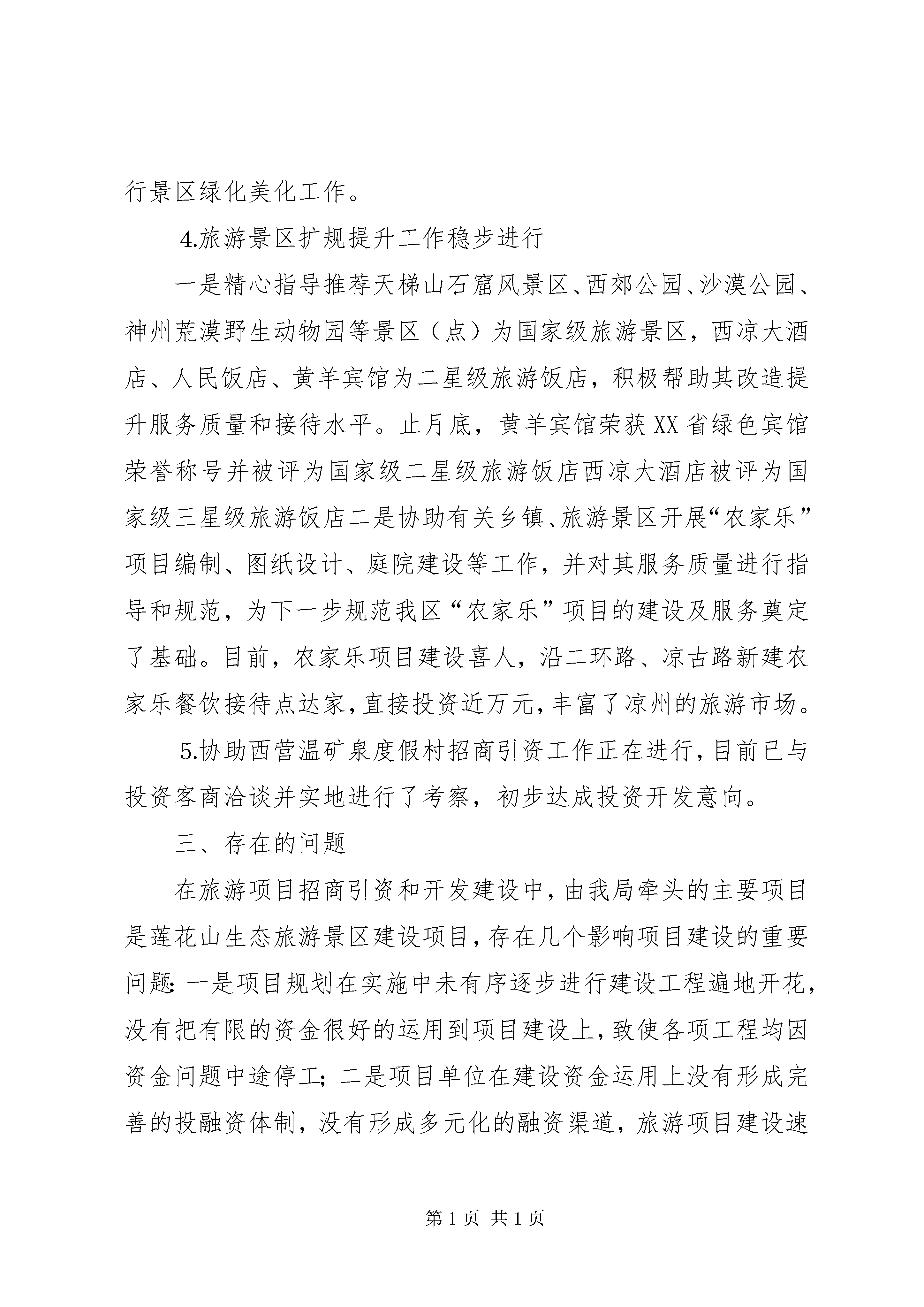 区旅游局项目建设工作汇报...现将我局贯彻落实区委、区政府“发展抓项目、凉州大行动”动员大会精神及项目建设工作情况汇报如下:一、贯彻区委、区政府项目工作会议精神情况为加快我区旅游项目建设我局及时传达并学习了区委、区政府“发展抓项目、凉州大行动”动员大会精神,在广泛调研的基础上,通过认真分析和梳理全区旅游产业发展中存在的问题,围绕我局××年开展“项目建设效益年”活动的工作思路和工作重点,讨论制定了凉州区旅游局《“发展抓项目、凉州大行动”项目建设实施意见》,同时,根据国家、省有关旅游景区项目建设的规定,草拟出《凉州区旅游景区项目建设规范管理办法》,进一步引导全局干部牢固树立“发展抓项目”的理念,紧紧围绕建设旅游大区这一总体目标,以项目建设为工作重点,狠抓招商引资和开发建设工作,努力完善旅游基础设施,促进旅游资源开发步伐。二、项目争取及开发建设情况⒈采取多种措施,积极争取项目资金一是充分利用旅游网站这一宣传平台,加大凉州旅游的宣传力度,增强凉州旅游开发建设投资吸引力。同时利用互联网在其他相关网站发布了有关凉州旅游资源、投资环境、旅游项目信息,进一步扩大凉州的知名度;二是组织人员对《凉州区旅游发展总体规划》进行了修改完善,并以此为蓝本编制了《凉州区旅游“十一五”发展规划》,增强《规划》的前瞻性和可操作性,为凉州旅游业走可持续发展道路奠定了基础;三是编制了“中国西路红军武威战斗遗址旅游景区保护开发”等一批符合国家投资政策的旅游项目,并积极申报立项和招商引资;四是加强了同国家和省市有关部门的联系,积极向上争取旅游项目投资。今年向国家旅游局申请的旅游发展补助资金万元用于白塔寺旅游景区开发建设。五是汇编整理全区具有投资优势的旅游项目个,建立了旅游项目库,协助争取项目资金并对外推介。⒉莲花山生态旅游景区建设项目取得了新的进展今年以来莲花山生态旅游景区实际投资达多万元,其中停车场完成土石方多万方(更多精彩文章来自“秘书不求人”),平整场地面积万平方米;完成景区公里的供电线路架设及变电工作;公里景区石砌道路已修建多米,两旁种植松柏多棵,成活近棵,其余已换植。另外,通往莲花山生态旅游景区的公里的乡村公路路基工程已基本完工,年内可望铺油。指导旅游景区项目建设取得显著成绩在我局精心指导下神州荒漠野生动物园共投资万元先后开挖了公里长的沙漠人工湖修建了平方米的中心广场和有关设施栽种各种树木多棵,面积达多亩;海藏公园投资万元进行海藏南湖开发;沙漠公园投资万元进行园区绿化;西郊公园投资万元进行景区绿化美化工作。⒋旅游景区扩规提升工作稳步进行一是精心指导推荐天梯山石窟风景区、西郊公园、沙漠公园、神州荒漠野生动物园等景区(点)为国家级旅游景区,西凉大酒店、人民饭店、黄羊宾馆为二星级旅游饭店,积极帮助其改造提升服务质量和接待水平。止月底,黄羊宾馆荣获XX省绿色宾馆荣誉称号并被评为国家级二星级旅游饭店西凉大酒店被评为国家级三星级旅游饭店二是协助有关乡镇、旅游景区开展“农家乐”项目编制、图纸设计、庭院建设等工作,并对其服务质量进行指导和规范,为下一步规范我区“农家乐”项目的建设及服务奠定了基础。目前,农家乐项目建设喜人,沿二环路、凉古路新建农家乐餐饮接待点达家,直接投资近万元,丰富了凉州的旅游市场。⒌协助西营温矿泉度假村招商引资工作正在进行,目前已与投资客商洽谈并实地进行了考察,初步达成投资开发意向。三、存在的问题在旅游项目招商引资和开发建设中,由我局牵头的主要项目是莲花山生态旅游景区建设项目,存在几个影响项目建设的重要问题:一是项目规划在实施中未有序逐步进行建设工程遍地开花,没有把有限的资金很好的运用到项目建设上,致使各项工程均因资金问题中途停工;二是项目单位在建设资金运用上没有形成完善的投融资体制,没有形成多元化的融资渠道,旅游项目建设速度缓慢,致使项目单位在资金运作、筹资融资等方面出现了多种不良行为,使工程建设受到了严重的影响。现基本处于停工状态。四、对加快旅游项目建设发展旅游业的建议⒈为了加快旅游产业建设步伐,希望政府加大对旅游业的投入。在旅游规划期间,区财政应每年安排一定的旅游发展专项资金,主要用于旅游开发项目贷款贴息及补助、旅游规划编制及产业发展研究、旅游宣传促销及重点旅游景区开发、建设和保护。⒉积极探索多渠道投融资发展旅游产业的措施和办法。通过建立旅游产业基金、开放式旅游基金和股权置换等方式进行市场融资。同时,选择条件较成熟的部分旅游景区,采取经营权转让、特许经营、合资合作、租赁等方式,进行直接融资。吸引省内外资金参与凉州区旅游资源开发、旅游环境综合治理和旅游基础设施建设。⒊尽快制定凉州区旅游发展规划,严格按规划监督旅游项目建设,依法进行旅游产业的管理和保护。各部门协调联动,对规划期内建设的旅游企业严格依法进行管理,严禁任何单位和个