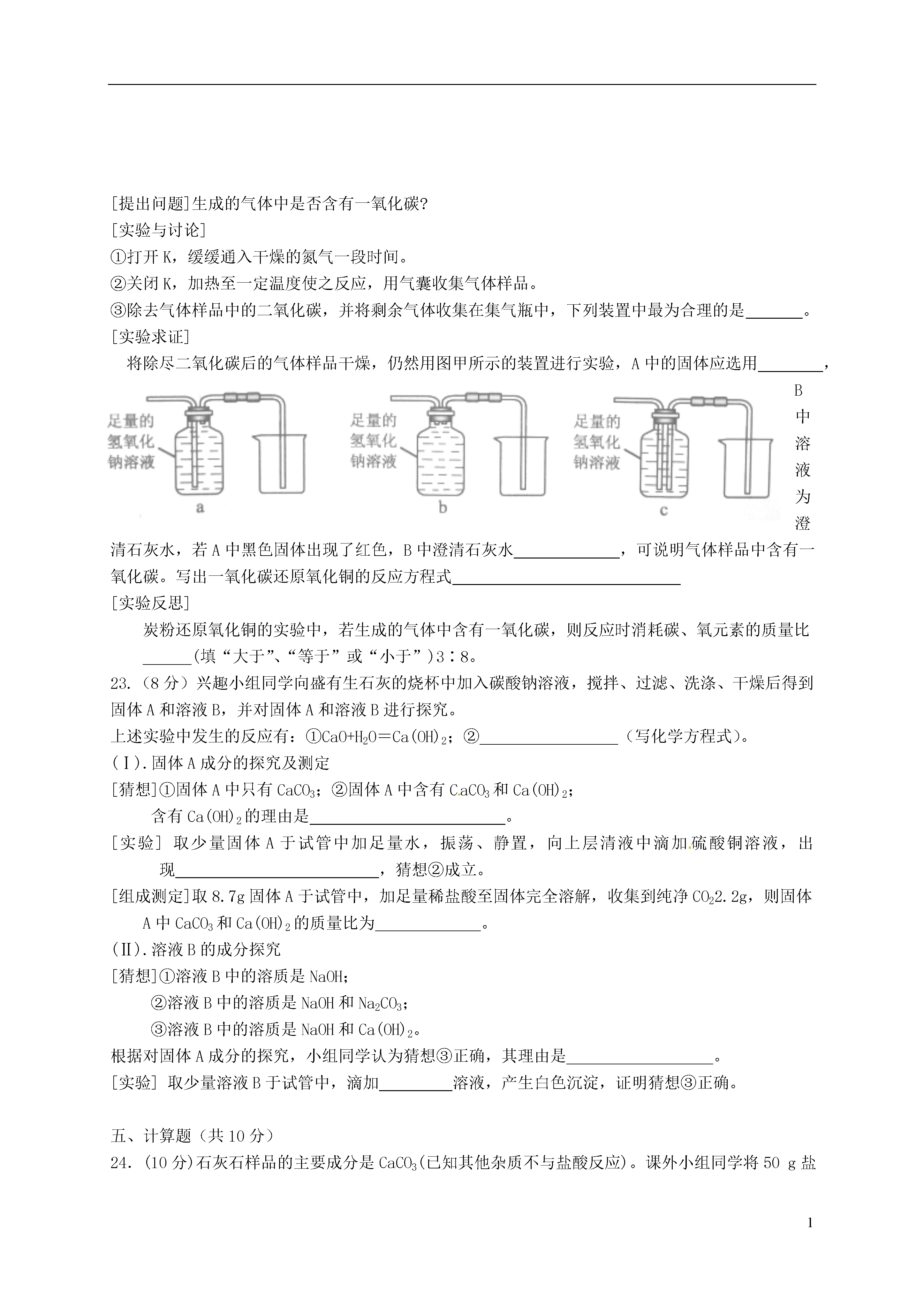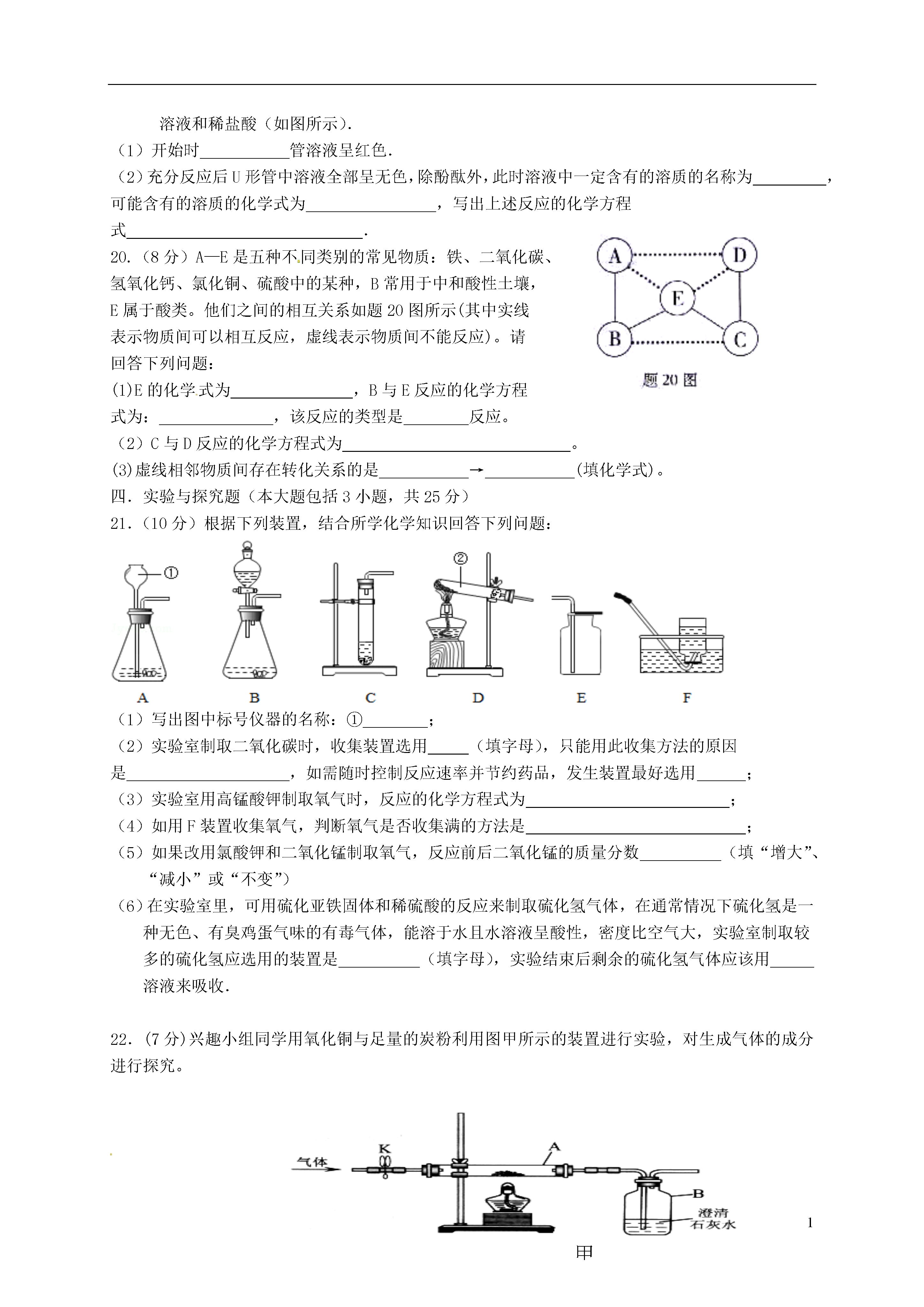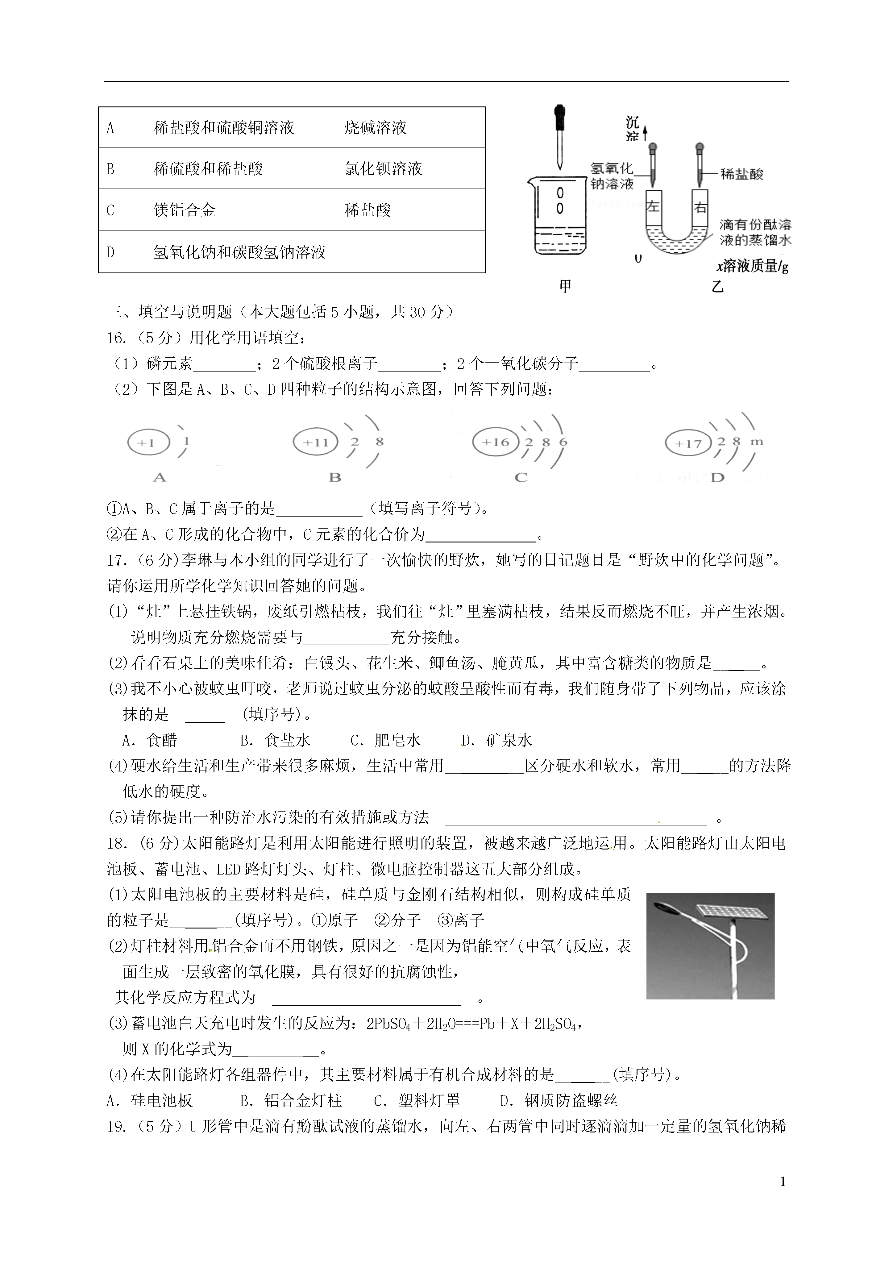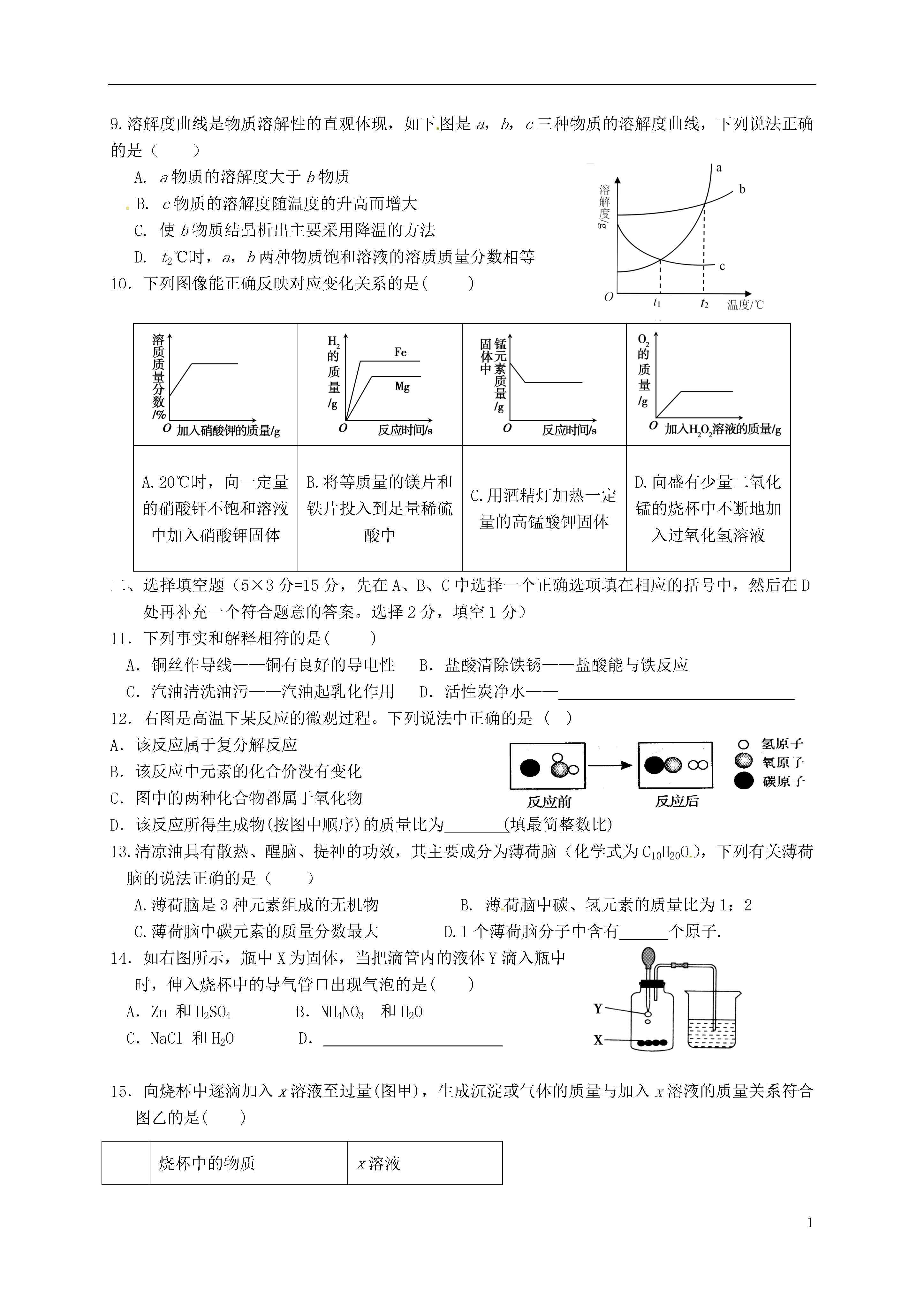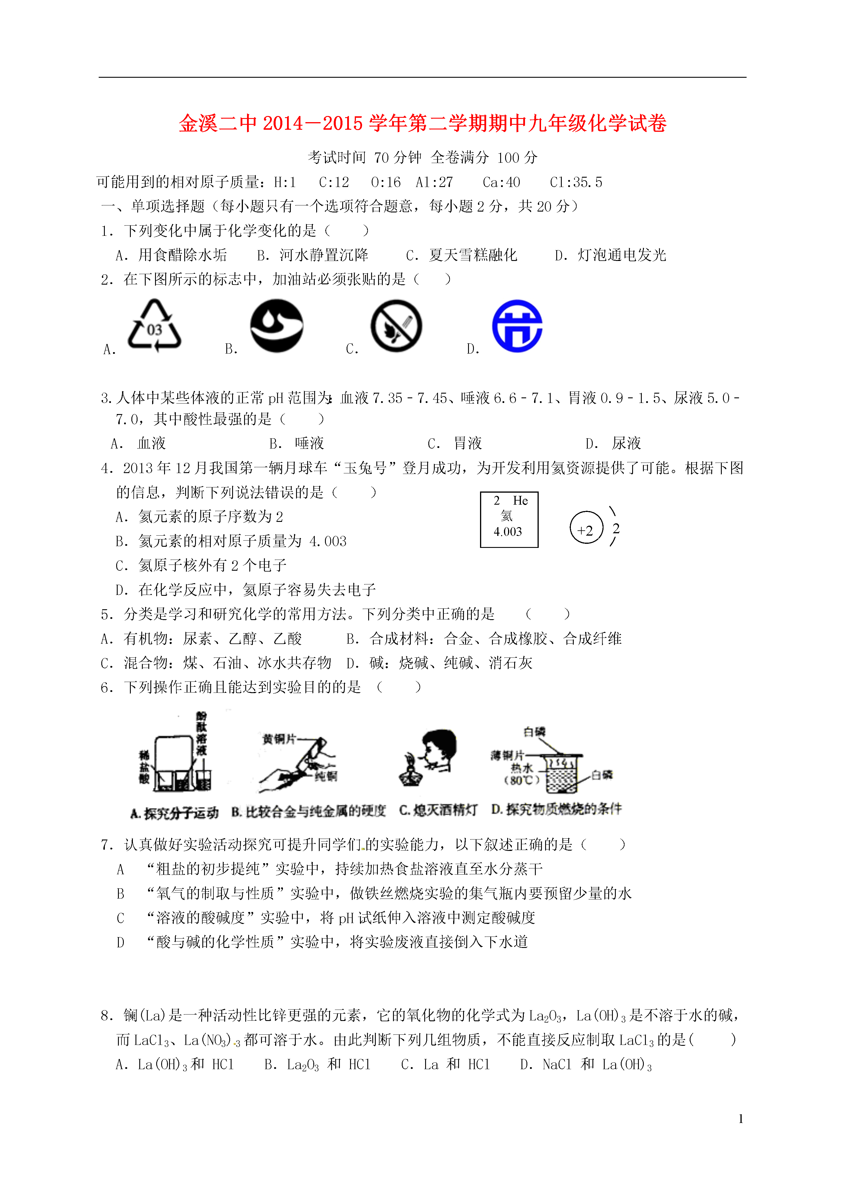 1金溪二中2014-2015学年第二学期期中九年级化学试卷考试时间70分钟全卷满分100分可能用到的相对原子质量:H:1C:12O:16Al:27Ca:40Cl:35.5一、单项选择题(每小题只有一个选项符合题意,每小题2分,共20分)1.下列变化中属于化学变化的是()A.用食醋除水垢B.河水静置沉降C.夏天雪糕融化D.灯泡通电发光2.在下图所示的标志中,加油站必须张贴的是()A.B.C.D.3.人体中某些体液的正常pH范围为:血液7.35﹣7.45、唾液6.6﹣7.1、胃液0.9﹣1.5、尿液5.0﹣7.0,其中酸性最强的是()A.血液B.唾液C.胃液D.尿液2He氦镉4.0034.2013年12月我国第一辆月球车“玉兔号”登月成功,为开发利用氦资源提供了可能。根据下图的信息,判断下列说法错误的是()+22A.氦元素的原子序数为2B.氦元素的相对原子质量为4.003C.氦原子核外有2个电子D.在化学反应中,氦原子容易失去电子5.分类是学习和研究化学的常用方法。下列分类中正确的是()A.有机物:尿素、乙醇、乙酸B.合成材料:合金、合成橡胶、合成纤维C.混合物:煤、石油、冰水共存物D.碱:烧碱、纯碱、消石灰6.下列操作正确且能达到实验目的的是()7.认真做好实验活动探究可提升同学们的实验能力,以下叙述正确的是()A“粗盐的初步提纯”实验中,持续加热食盐溶液直至水分蒸干B“氧气的制取与性质”实验中,做铁丝燃烧实验的集气瓶内要预留少量的水C“溶液的酸碱度”实验中,将pH试纸伸入溶液中测定酸碱度D“酸与碱的化学性质”实验中,将实验废液直接倒入下水道8.镧(La)是一种活动性比锌更强的元素,它的氧化物的化学式为La2O3,La(OH)3是不溶于水的碱,而LaCl3、La(NO3)3都可溶于水。由此判断下列几组物质,不能直接反应制取LaCl3的是()A.La(OH)3和HClB.La2O3和HClC.La和HClD.NaCl和La(OH)39.溶解度曲线是物质溶解性的直观体现,如下图是a,b,c三种物质的溶解度曲线,下列说法正确的是()A.a物质的溶解度大于b物质B.c物质的溶解度随温度的升高而增大C.使b物质结晶析出主要采用降温的方法D.t2℃时,a,b两种物质饱和溶液的溶质质量分数相等10.下列图像能正确反映对应变化关系的是()A.20℃时,向一定量的硝酸钾不饱和溶液中加入硝酸钾固体B.将等质量的镁片和铁片投入到足量稀硫酸中C.用酒精灯加热一定量的高锰酸钾固体D.向盛有少量二氧化锰的烧杯中不断地加入过氧化氢溶液二、选择填空题(5×3分=15分,先在A、B、C中选择一个正确选项填在相应的括号中,然后在D处再补充一个符合题意的答案。选择2分,填空1分)11.下列事实和解释相符的是()A.铜丝作导线——铜有良好的导电性B.盐酸清除铁锈——盐酸能与铁反应C.汽油清洗油污——汽油起乳化作用D.活性炭净水——12.右图是高温下某反应的微观过程。下列说法中正确的是()A.该反应属于复分解反应B.该反应中元素的化合价没有变化C.图中的两种化合物都属于氧化物D.该反应所得生成物(按图中顺序)的质量比为(填最简整数比)13.清凉油具有散热、醒脑、提神的功效,其主要成分为薄荷脑(化学式为C10H20O),下列有关薄荷脑的说法正确的是()A.薄荷脑是3种元素组成的无机物B.薄荷脑中碳、氢元素的质量比为1:2C.薄荷脑中碳元素的质量分数最大D.1个薄荷脑分子中含有个原子.14.如右图所示,瓶中X为固体,当把滴管内的液体Y滴入瓶中时,伸入烧杯中的导气管口出现气泡的是()A.Zn和H2SO4B.NH4NO3和H2OC.NaCl和H2OD.15.向烧杯中逐滴加入x溶液至过量(图甲),生成沉淀或气体的质量与加入x溶液的质量关系符合图乙的是()烧杯中的物质x溶液A稀盐酸和硫酸铜溶液烧碱溶液B稀硫酸和稀盐酸氯化钡溶液C镁铝合金稀盐酸D氢氧化钠和碳酸氢钠溶液三、填空与说明题(本大题包括5小题,共30分)16.(5分)用化学用语填空:(1)磷元素;2个硫酸根离子;2个一氧化碳分子。(2)下图是A、B、C、D四种粒子的结构示意图,回答下列问题:①A、B、C属于离子的是(填写离子符号)。②在A、C形成的化合物中,C元素的化合价为。17.(6分)李琳与本小组的同学进行了一次愉快的野炊,她写的日记题目是“野炊中的化学问题”。请你运用所学化学知识回答她的问题。(1)“灶”上悬挂铁锅,废纸引燃枯枝,我们往“灶”里塞满枯枝,结果反而燃烧不旺,并产生浓烟。说明物质充分燃烧需要与__充分接触。(2)看看石桌上的美味佳肴:白馒头、花生米、鲫鱼汤、腌黄瓜,