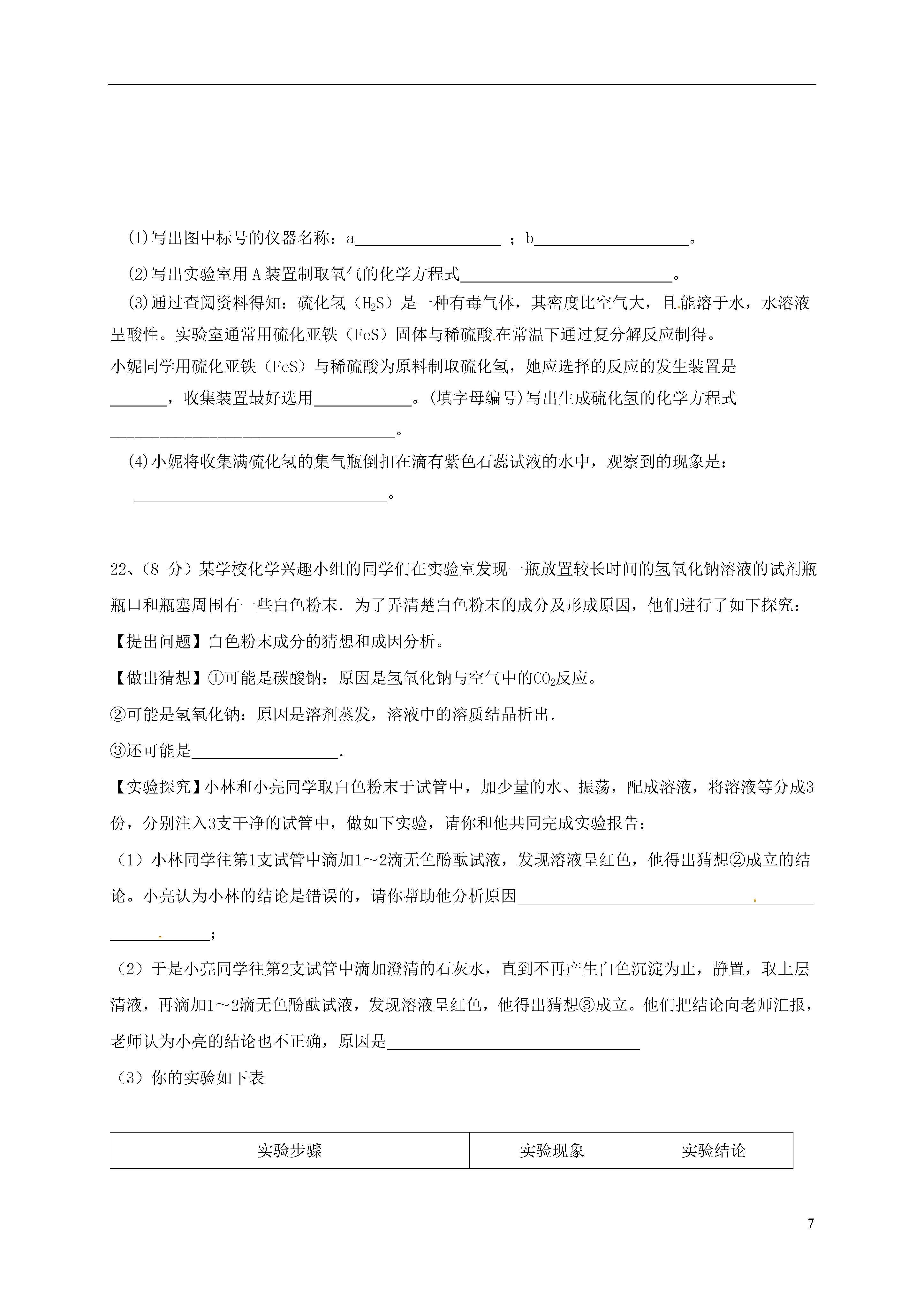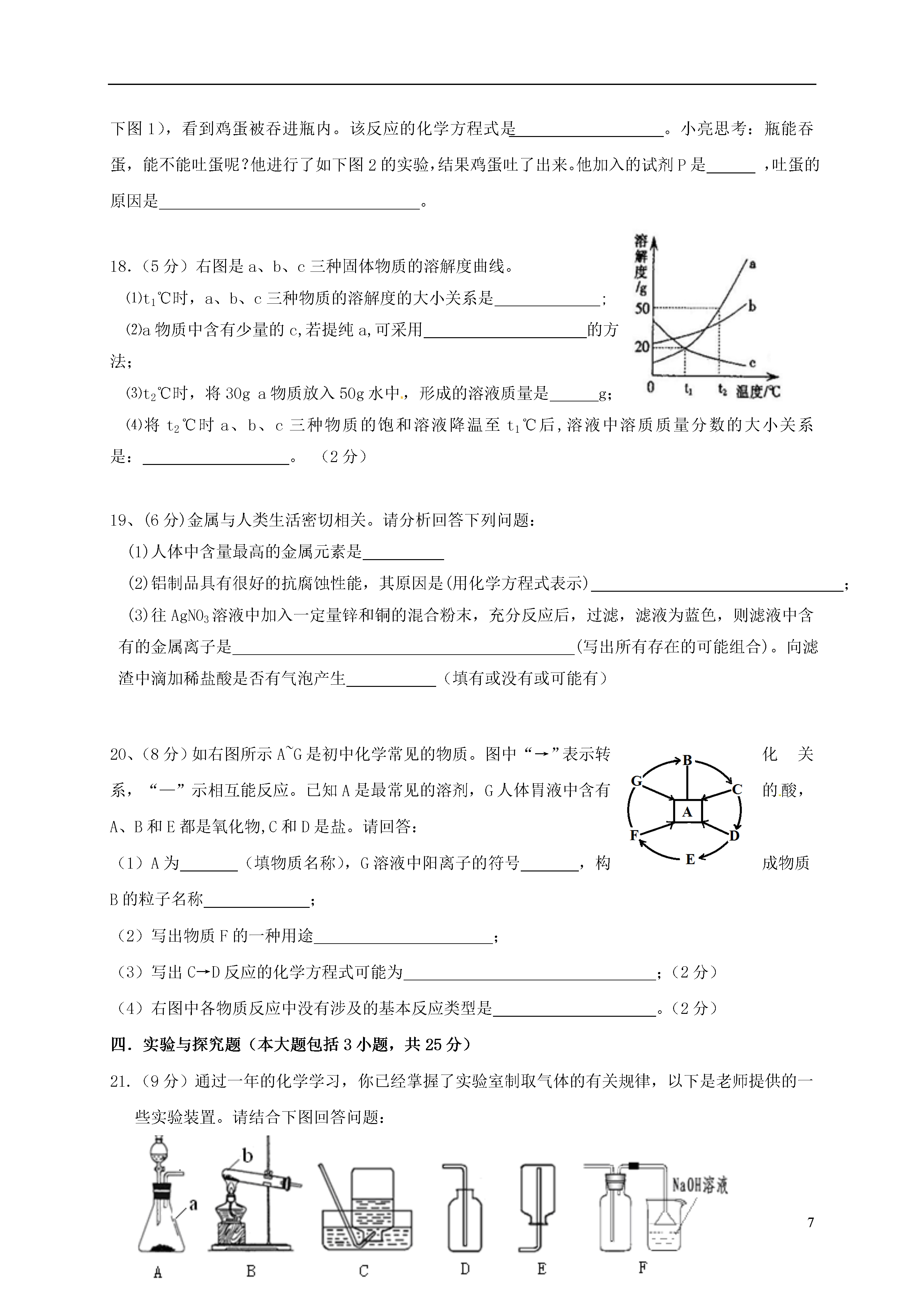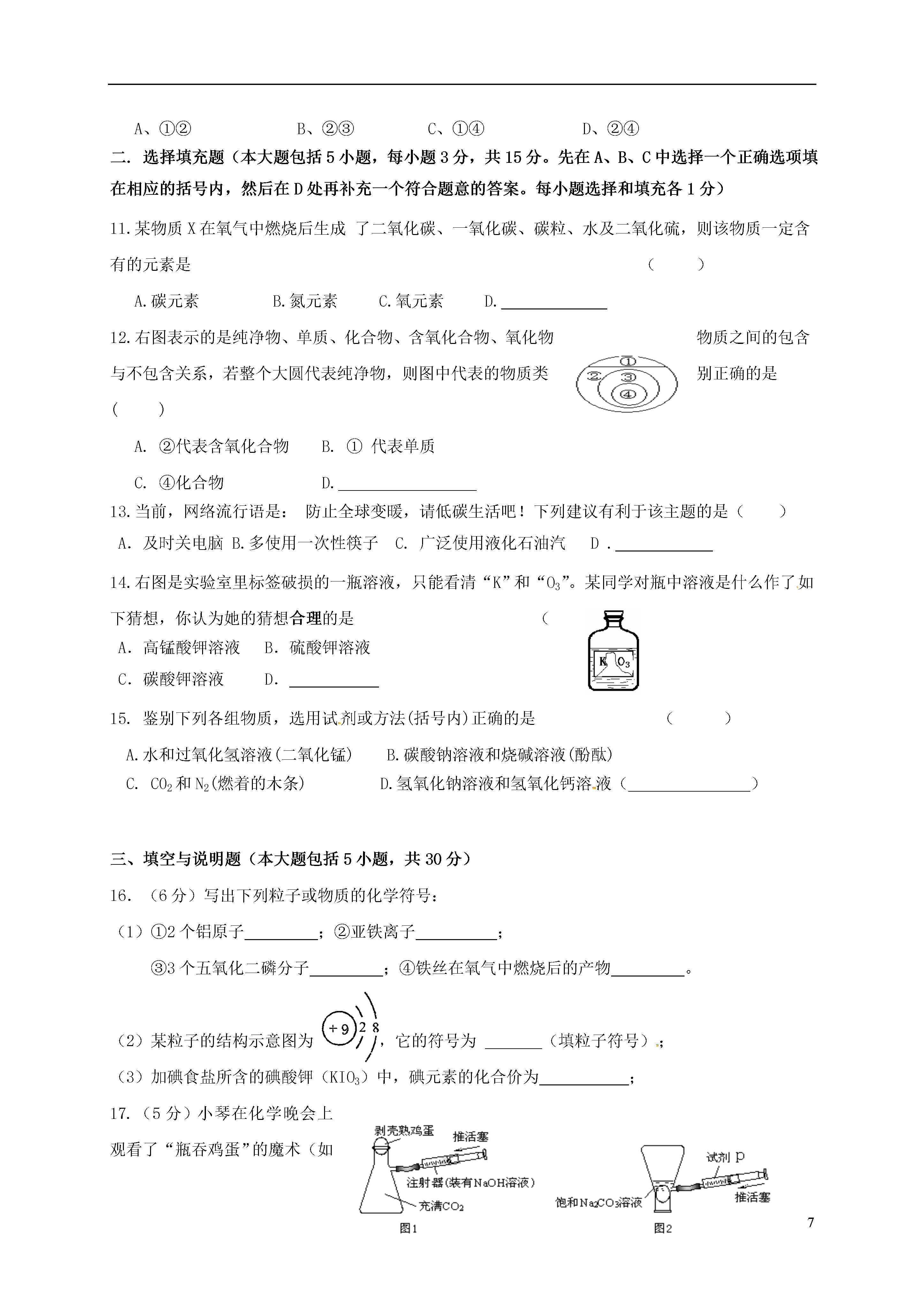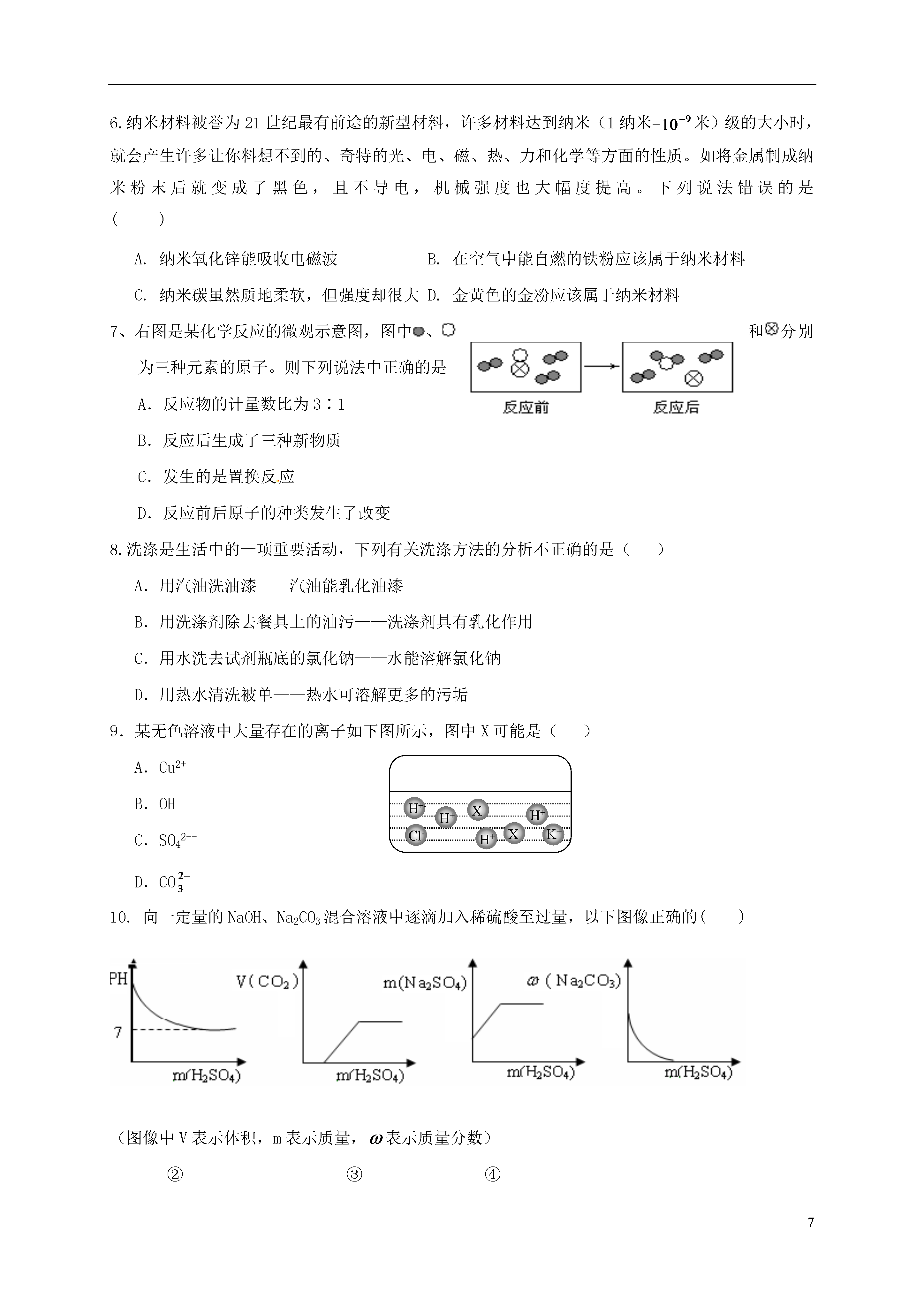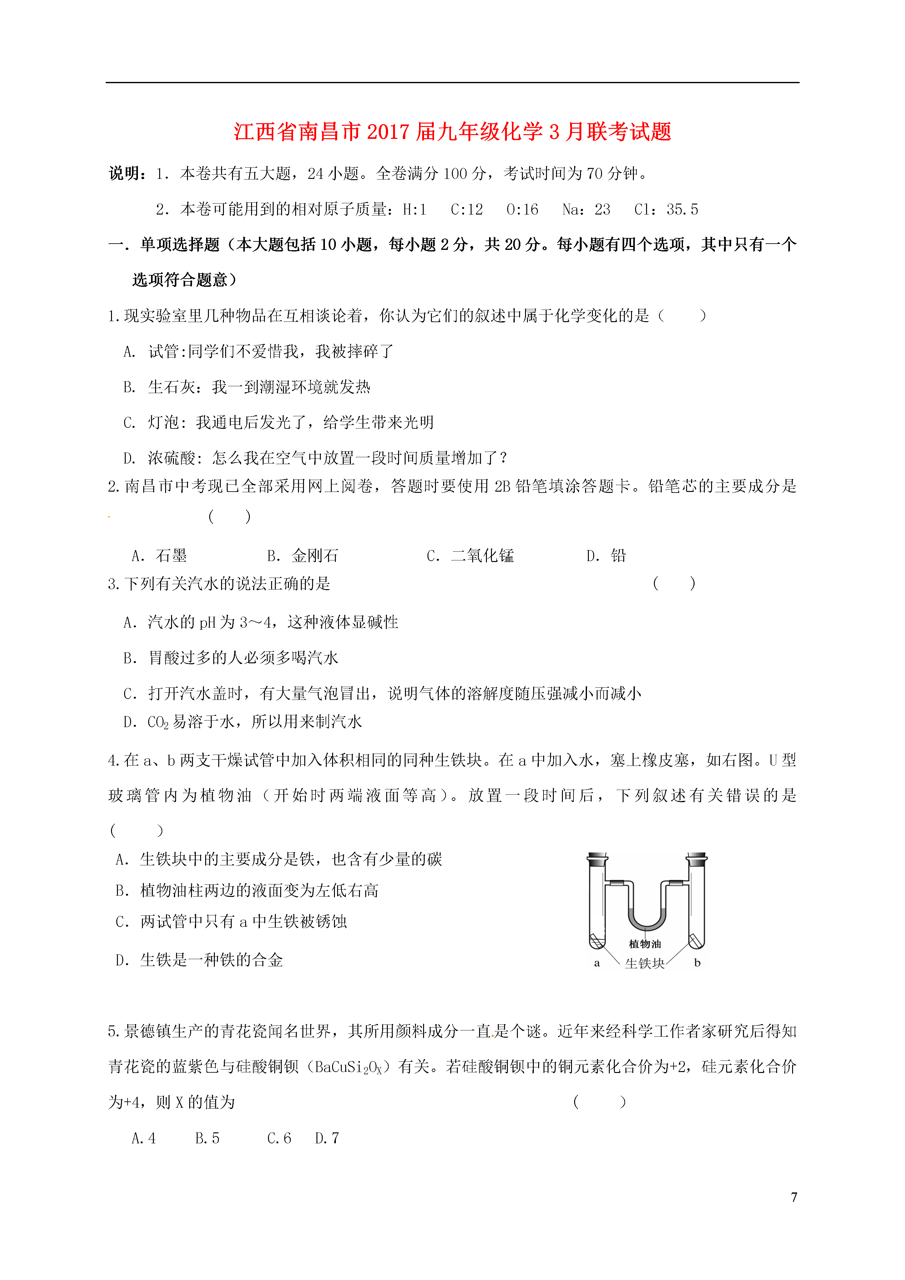 7江西省南昌市2017届九年级化学3月联考试题说明:1.本卷共有五大题,24小题。全卷满分100分,考试时间为70分钟。2.本卷可能用到的相对原子质量:H:1C:12O:16Na:23Cl:35.5一.单项选择题(本大题包括10小题,每小题2分,共20分。每小题有四个选项,其中只有一个选项符合题意)1.现实验室里几种物品在互相谈论着,你认为它们的叙述中属于化学变化的是()A.试管:同学们不爱惜我,我被摔碎了B.生石灰:我一到潮湿环境就发热C.灯泡:我通电后发光了,给学生带来光明D.浓硫酸:怎么我在空气中放置一段时间质量增加了?2.南昌市中考现已全部采用网上阅卷,答题时要使用2B铅笔填涂答题卡。铅笔芯的主要成分是()A.石墨B.金刚石C.二氧化锰D.铅3.下列有关汽水的说法正确的是()A.汽水的pH为3~4,这种液体显碱性B.胃酸过多的人必须多喝汽水C.打开汽水盖时,有大量气泡冒出,说明气体的溶解度随压强减小而减小D.CO2易溶于水,所以用来制汽水4.在a、b两支干燥试管中加入体积相同的同种生铁块。在a中加入水,塞上橡皮塞,如右图。U型玻璃管内为植物油(开始时两端液面等高)。放置一段时间后,下列叙述有关错误的是()A.生铁块中的主要成分是铁,也含有少量的碳B.植物油柱两边的液面变为左低右高C.两试管中只有a中生铁被锈蚀D.生铁是一种铁的合金5.景德镇生产的青花瓷闻名世界,其所用颜料成分一直是个谜。近年来经科学工作者家研究后得知青花瓷的蓝紫色与硅酸铜钡(BaCuSi2OX)有关。若硅酸铜钡中的铜元素化合价为+2,硅元素化合价为+4,则X的值为()A.4B.5C.6D.76.纳米材料被誉为21世纪最有前途的新型材料,许多材料达到纳米(1纳米=米)级的大小时,就会产生许多让你料想不到的、奇特的光、电、磁、热、力和化学等方面的性质。如将金属制成纳米粉末后就变成了黑色,且不导电,机械强度也大幅度提高。下列说法错误的是()A.纳米氧化锌能吸收电磁波B.在空气中能自燃的铁粉应该属于纳米材料C.纳米碳虽然质地柔软,但强度却很大D.金黄色的金粉应该属于纳米材料7、右图是某化学反应的微观示意图,图中、和分别为三种元素的原子。则下列说法中正确的是A.反应物的计量数比为3∶1B.反应后生成了三种新物质C.发生的是置换反应D.反应前后原子的种类发生了改变8.洗涤是生活中的一项重要活动,下列有关洗涤方法的分析不正确的是()A.用汽油洗油漆——汽油能乳化油漆B.用洗涤剂除去餐具上的油污——洗涤剂具有乳化作用C.用水洗去试剂瓶底的氯化钠——水能溶解氯化钠D.用热水清洗被单——热水可溶解更多的污垢9.某无色溶液中大量存在的离子如下图所示,图中X可能是()H+-H+H+Cl-——————H+K+XXA.Cu2+B.OH-C.SO42--D.CO10.向一定量的NaOH、Na2CO3混合溶液中逐滴加入稀硫酸至过量,以下图像正确的()(图像中V表示体积,m表示质量,表示质量分数)①②③④A、①②B、②③C、①④D、②④二.选择填充题(本大题包括5小题,每小题3分,共15分。先在A、B、C中选择一个正确选项填在相应的括号内,然后在D处再补充一个符合题意的答案。每小题选择和填充各1分)11.某物质X在氧气中燃烧后生成了二氧化碳、一氧化碳、碳粒、水及二氧化硫,则该物质一定含有的元素是()A.碳元素B.氮元素C.氧元素D.____________12.右图表示的是纯净物、单质、化合物、含氧化合物、氧化物物质之间的包含与不包含关系,若整个大圆代表纯净物,则图中代表的物质类别正确的是()A.②代表含氧化合物B.①代表单质C.④化合物D.________________13.当前,网络流行语是:防止全球变暖,请低碳生活吧!下列建议有利于该主题的是()A.及时关电脑B.多使用一次性筷子C.广泛使用液化石油汽D.____________14.右图是实验室里标签破损的一瓶溶液,只能看清“K”和“O3”。某同学对瓶中溶液是什么作了如下猜想,你认为她的猜想合理的是()A.高锰酸钾溶液B.硫酸钾溶液C.碳酸钾溶液D.___________15.鉴别下列各组物质,选用试剂或方法(括号内)正确的是()A.水和过氧化氢溶液(二氧化锰)B.碳酸钠溶液和烧碱溶液(酚酞)C.C02和N2(燃着的木条)D.氢氧化钠溶液和氢氧化钙溶液(_______________)三、填空与说明题(本大题包括5小题,共30分)16.(6分)写出下列粒子或物质的化学符号:(1)①2个铝原子;②亚铁离子;③3个五氧化二磷分子;④铁丝在氧气中燃烧后的产物。(2