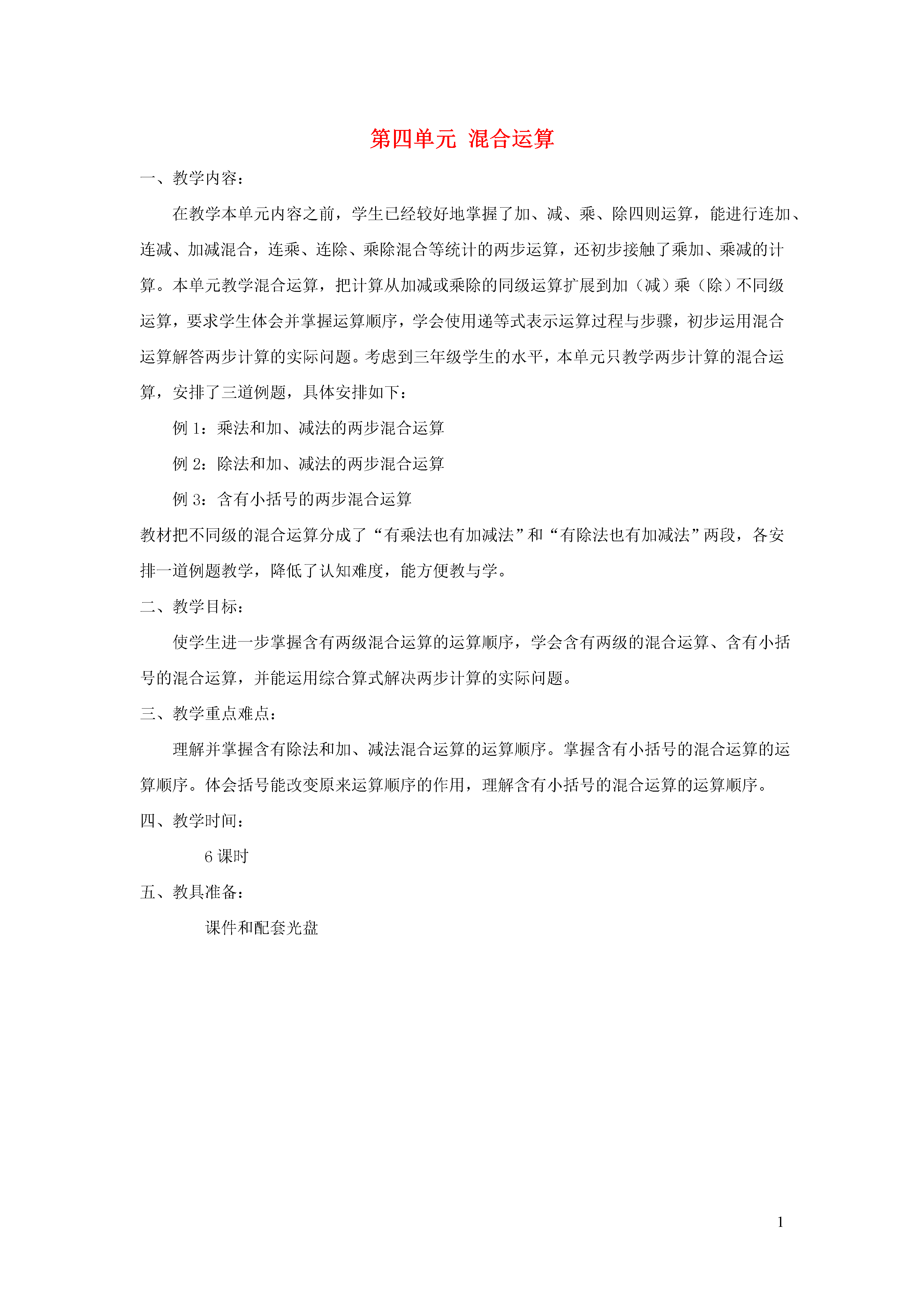 1第四单元混合运算一、教学内容:在教学本单元内容之前,学生已经较好地掌握了加、减、乘、除四则运算,能进行连加、连减、加减混合,连乘、连除、乘除混合等统计的两步运算,还初步接触了乘加、乘减的计算。本单元教学混合运算,把计算从加减或乘除的同级运算扩展到加(减)乘(除)不同级运算,要求学生体会并掌握运算顺序,学会使用递等式表示运算过程与步骤,初步运用混合运算解答两步计算的实际问题。考虑到三年级学生的水平,本单元只教学两步计算的混合运算,安排了三道例题,具体安排如下:例1:乘法和加、减法的两步混合运算例2:除法和加、减法的两步混合运算例3:含有小括号的两步混合运算教材把不同级的混合运算分成了“有乘法也有加减法”和“有除法也有加减法”两段,各安排一道例题教学,降低了认知难度,能方便教与学。二、教学目标:使学生进一步掌握含有两级混合运算的运算顺序,学会含有两级的混合运算、含有小括号的混合运算,并能运用综合算式解决两步计算的实际问题。三、教学重点难点:理解并掌握含有除法和加、减法混合运算的运算顺序。掌握含有小括号的混合运算的运算顺序。体会括号能改变原来运算顺序的作用,理解含有小括号的混合运算的运算顺序。四、教学时间:6课时教具准备:课件和配套光盘