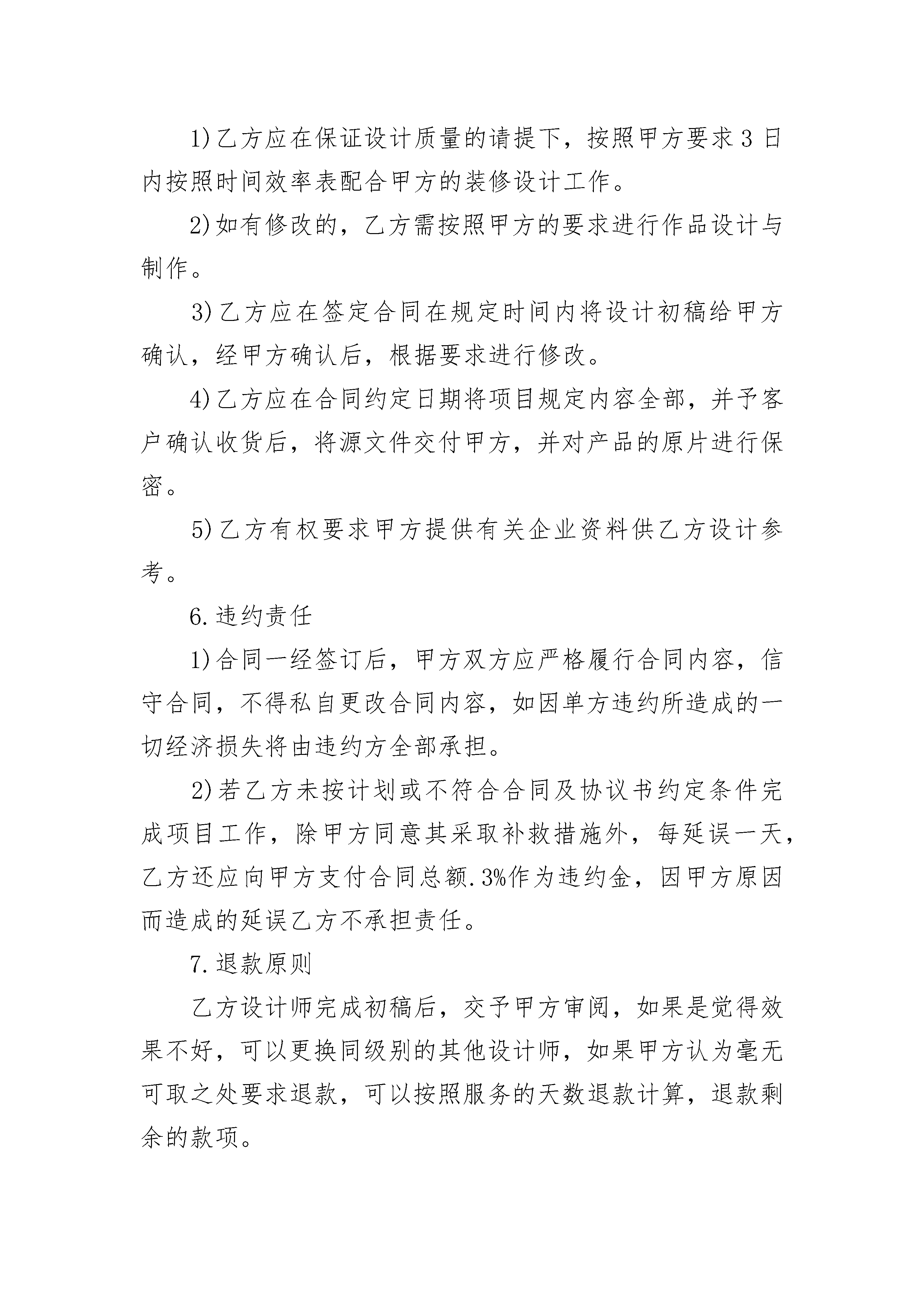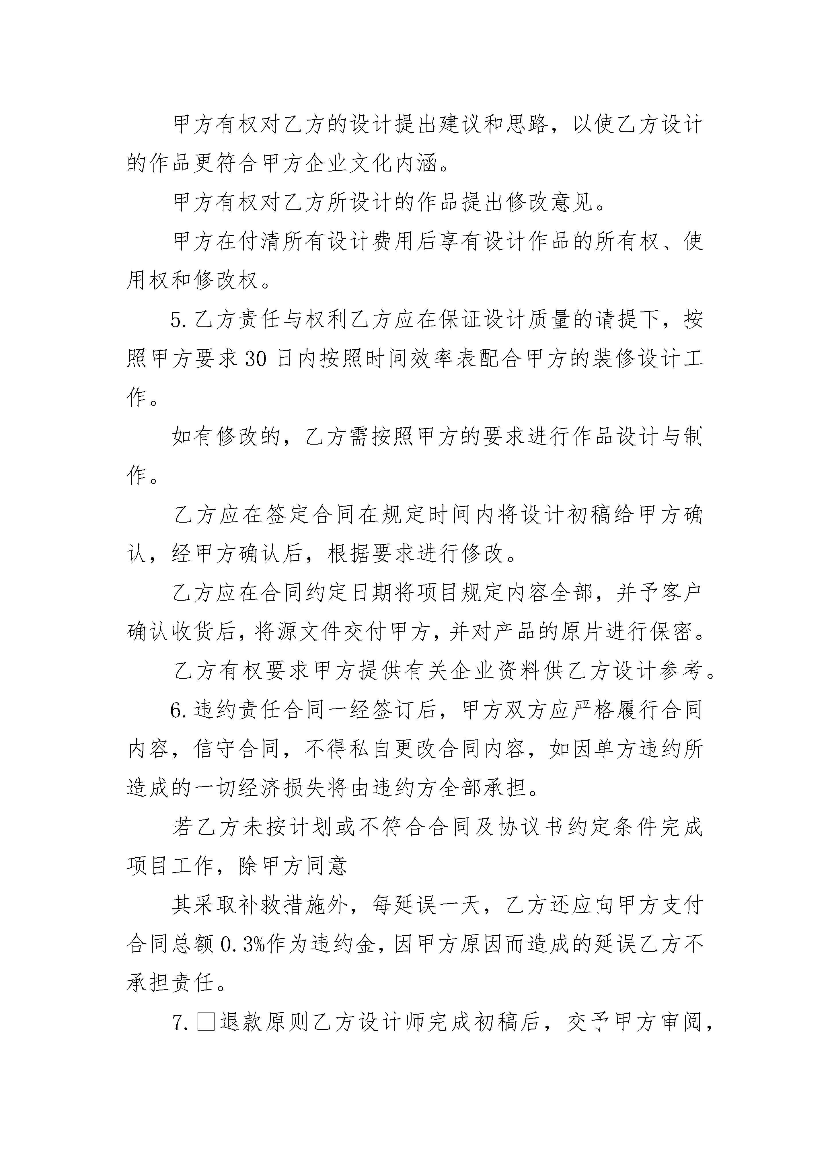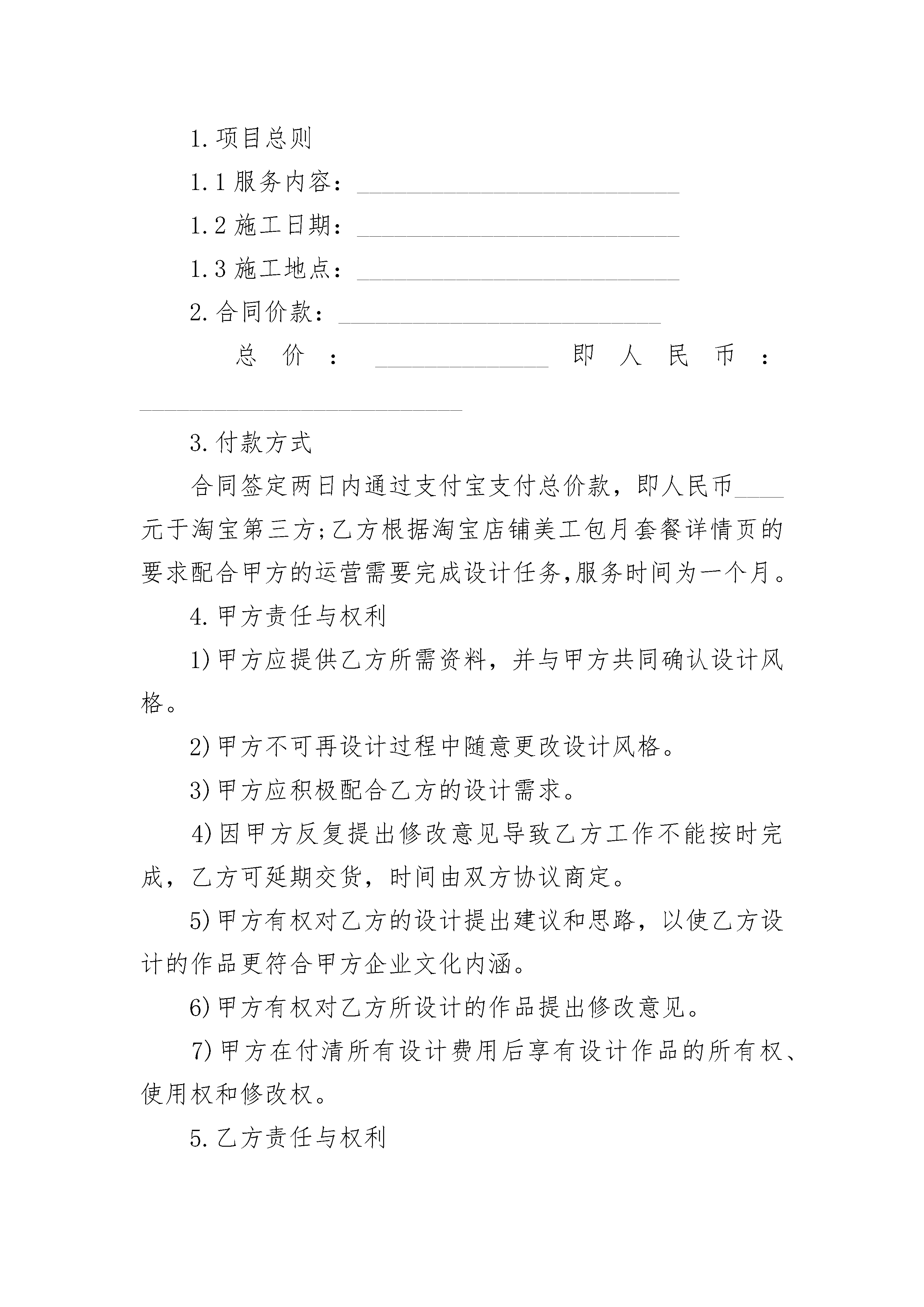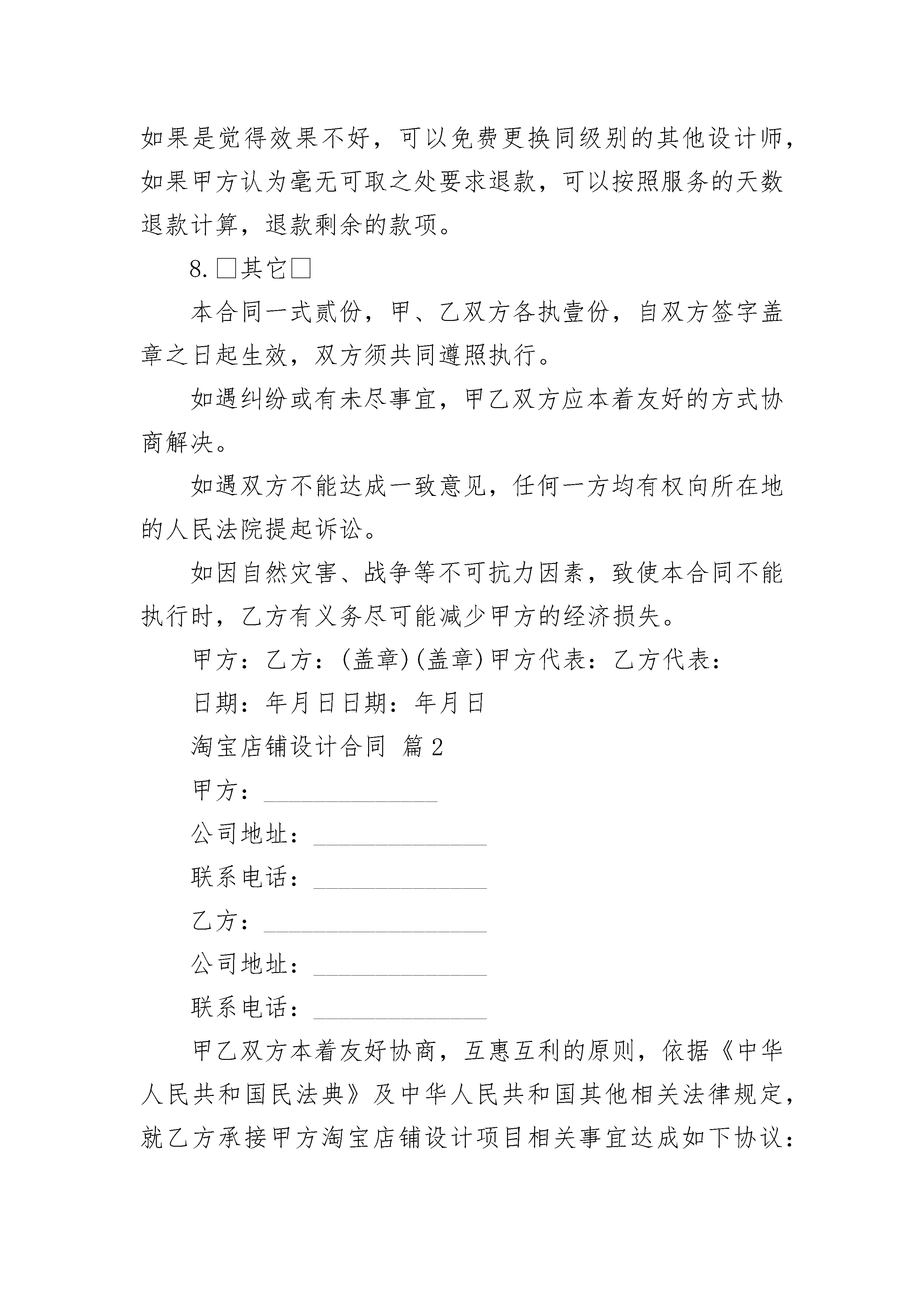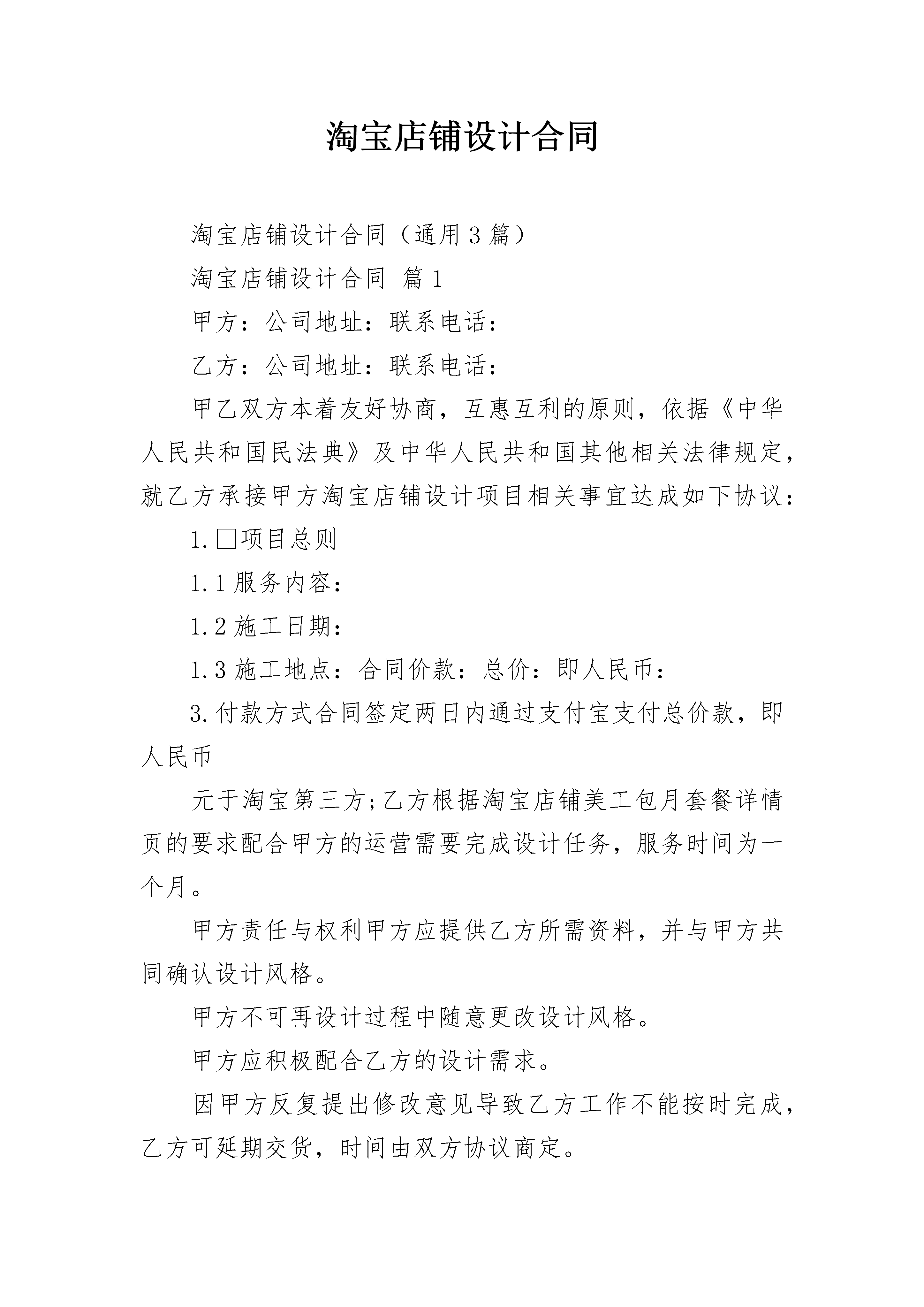 淘宝店铺设计合同淘宝店铺设计合同(通用3篇)淘宝店铺设计合同篇1甲方:公司地址:联系电话:乙方:公司地址:联系电话:甲乙双方本着友好协商,互惠互利的原则,依据《中华人民共和国民法典》及中华人民共和国其他相关法律规定,就乙方承接甲方淘宝店铺设计项目相关事宜达成如下协议:1.项目总则1.1服务内容:1.2施工日期:1.3施工地点:合同价款:总价:即人民币:3.付款方式合同签定两日内通过支付宝支付总价款,即人民币元于淘宝第三方;乙方根据淘宝店铺美工包月套餐详情页的要求配合甲方的运营需要完成设计任务,服务时间为一个月。甲方责任与权利甲方应提供乙方所需资料,并与甲方共同确认设计风格。甲方不可再设计过程中随意更改设计风格。甲方应积极配合乙方的设计需求。因甲方反复提出修改意见导致乙方工作不能按时完成,乙方可延期交货,时间由双方协议商定。甲方有权对乙方的设计提出建议和思路,以使乙方设计的作品更符合甲方企业文化内涵。甲方有权对乙方所设计的作品提出修改意见。甲方在付清所有设计费用后享有设计作品的所有权、使用权和修改权。5.乙方责任与权利乙方应在保证设计质量的请提下,按照甲方要求30日内按照时间效率表配合甲方的装修设计工作。如有修改的,乙方需按照甲方的要求进行作品设计与制作。乙方应在签定合同在规定时间内将设计初稿给甲方确认,经甲方确认后,根据要求进行修改。乙方应在合同约定日期将项目规定内容全部,并予客户确认收货后,将源文件交付甲方,并对产品的原片进行保密。乙方有权要求甲方提供有关企业资料供乙方设计参考。6.违约责任合同一经签订后,甲方双方应严格履行合同内容,信守合同,不得私自更改合同内容,如因单方违约所造成的一切经济损失将由违约方全部承担。若乙方未按计划或不符合合同及协议书约定条件完成项目工作,除甲方同意其采取补救措施外,每延误一天,乙方还应向甲方支付合同总额0.3%作为违约金,因甲方原因而造成的延误乙方不承担责任。7.退款原则乙方设计师完成初稿后,交予甲方审阅,如果是觉得效果不好,可以免费更换同级别的其他设计师,如果甲方认为毫无可取之处要求退款,可以按照服务的天数退款计算,退款剩余的款项。8.其它本合同一式贰份,甲、乙双方各执壹份,自双方签字盖章之日起生效,双方须共同遵照执行。如遇纠纷或有未尽事宜,甲乙双方应本着友好的方式协商解决。如遇双方不能达成一致意见,任何一方均有权向所在地的人民法院提起诉讼。如因自然灾害、战争等不可抗力因素,致使本合同不能执行时,乙方有义务尽可能减少甲方的经济损失。甲方:乙方:(盖章)(盖章)甲方代表:乙方代表:日期:年月日日期:年月日淘宝店铺设计合同篇2甲方:______________公司地址:______________联系电话:______________乙方:__________________公司地址:______________联系电话:______________甲乙双方本着友好协商,互惠互利的原则,依据《中华人民共和国民法典》及中华人民共和国其他相关法律规定,就乙方承接甲方淘宝店铺设计项目相关事宜达成如下协议:1.项目总则1.1服务内容:__________________________1.2施工日期:__________________________1.3施工地点:__________________________2.合同价款:__________________________总价:______________即人民币:__________________________3.付款方式合同签定两日内通过支付宝支付总价款,即人民币____元于淘宝第三方;乙方根据淘宝店铺美工包月套餐详情页的要求配合甲方的运营需要完成设计任务,服务时间为一个月。4.甲方责任与权利1)甲方应提供乙方所需资料,并与甲方共同确认设计风格。2)甲方不可再设计过程中随意更改设计风格。3)甲方应积极配合乙方的设计需求。4)因甲方反复提出修改意见导致乙方工作不能按时完成,乙方可延期交货,时间由双方协议商定。5)甲方有权对乙方的设计提出建议和思路,以使乙方设计的作品更符合甲方企业文化内涵。6)甲方有权对乙方所设计的作品提出修改意见。7)甲方在付清所有设计费用后享有设计作品的所有权、使用权和修改权。5.乙方责任与权利1)乙方应在保证设计质量的请提下,按照甲方要求3日内按照时间效率表配合甲方的装修设计工作。2)如有修改的,乙方需按照甲方的要求进行作品设计与制作。3)乙方应在签定合同在规定时间内将设计初稿给甲方确认,经甲方确认后,根据要求进行修改。4)乙方应在合同约定日期将项目规定内容全部,并予客户确认收货后,将源文件交付甲方,并对产品的原片进行保密。5)乙方有权要求甲方提供有关企业资料供乙方设计参考。6.违约责任1)合同一经签
