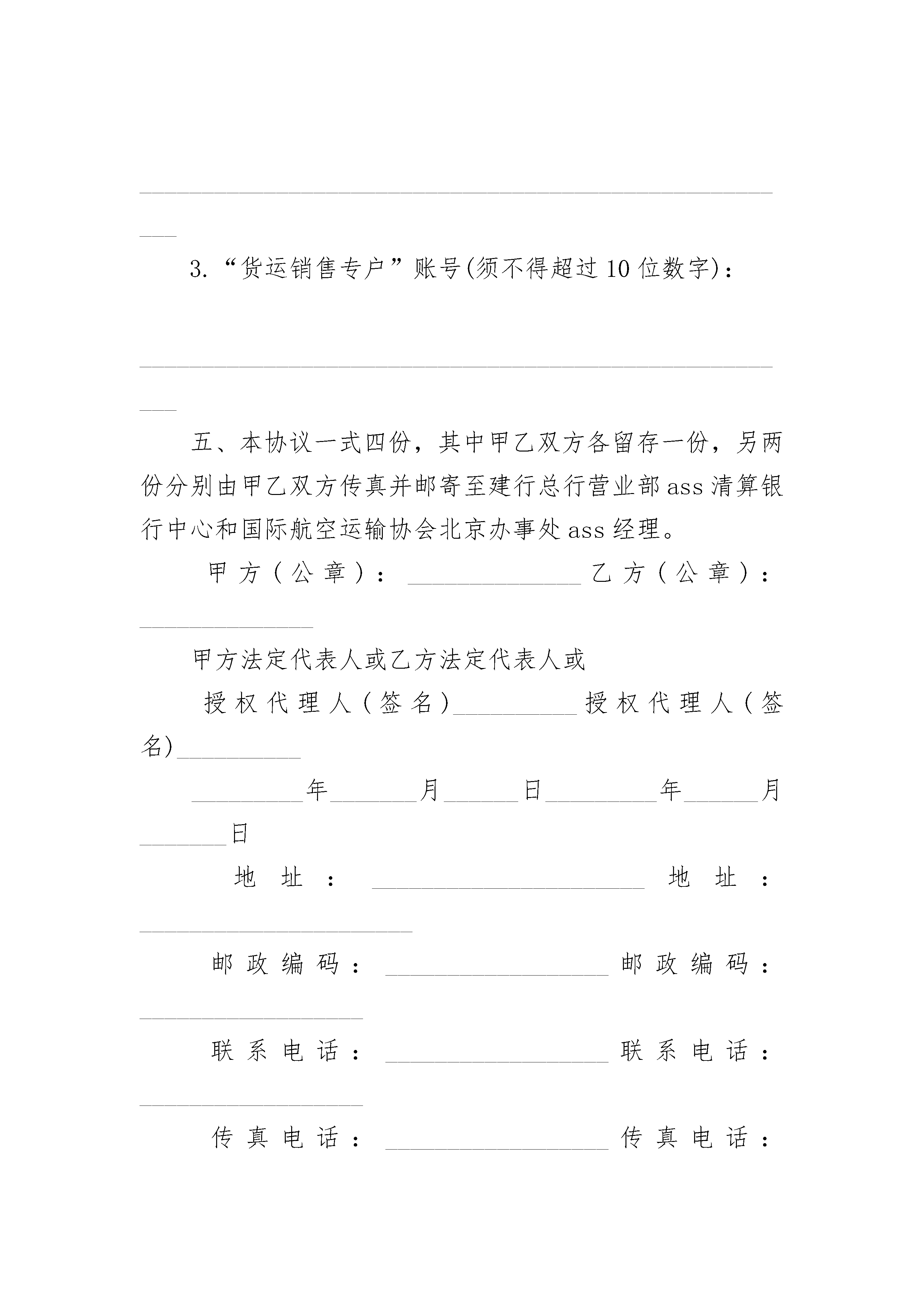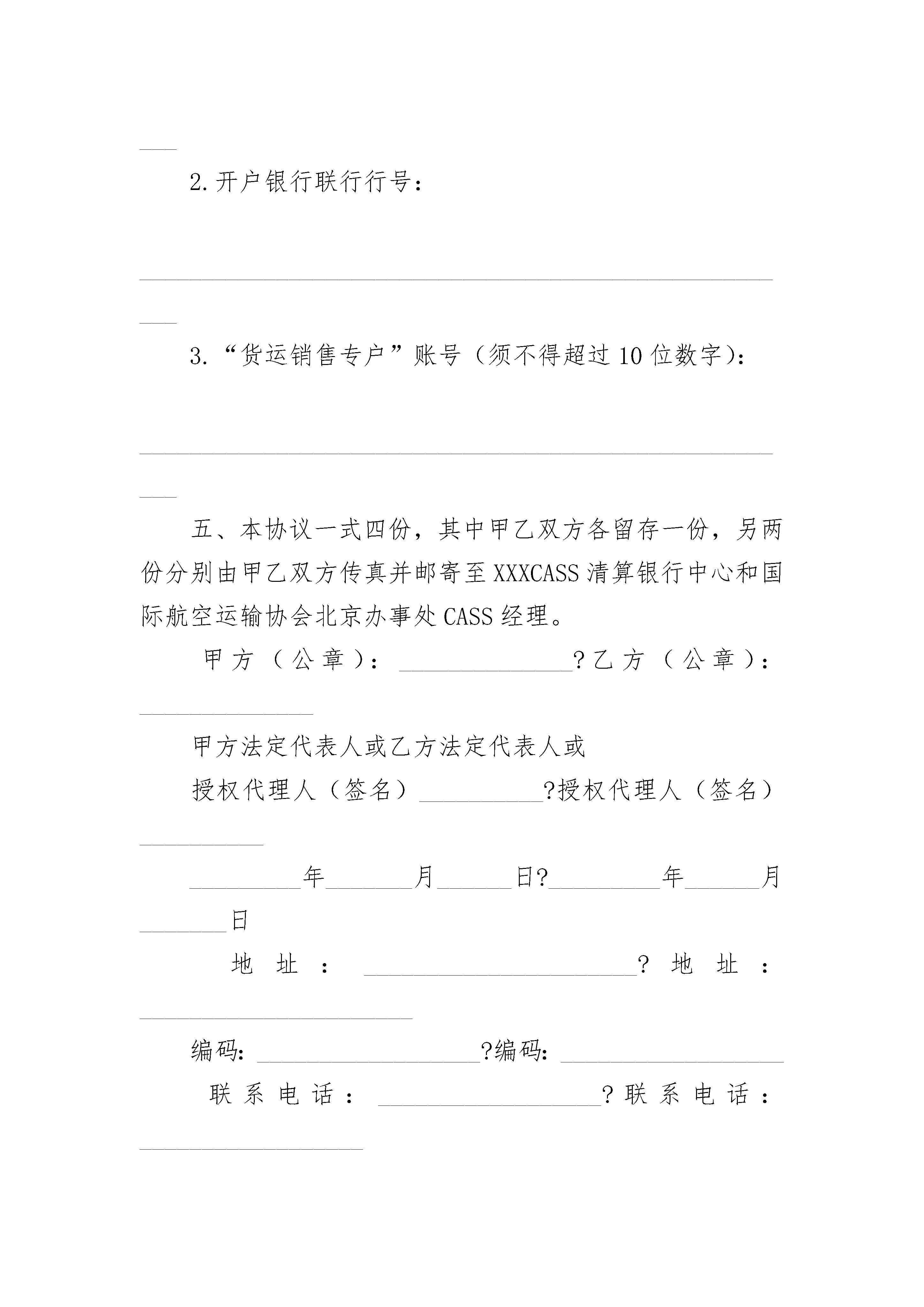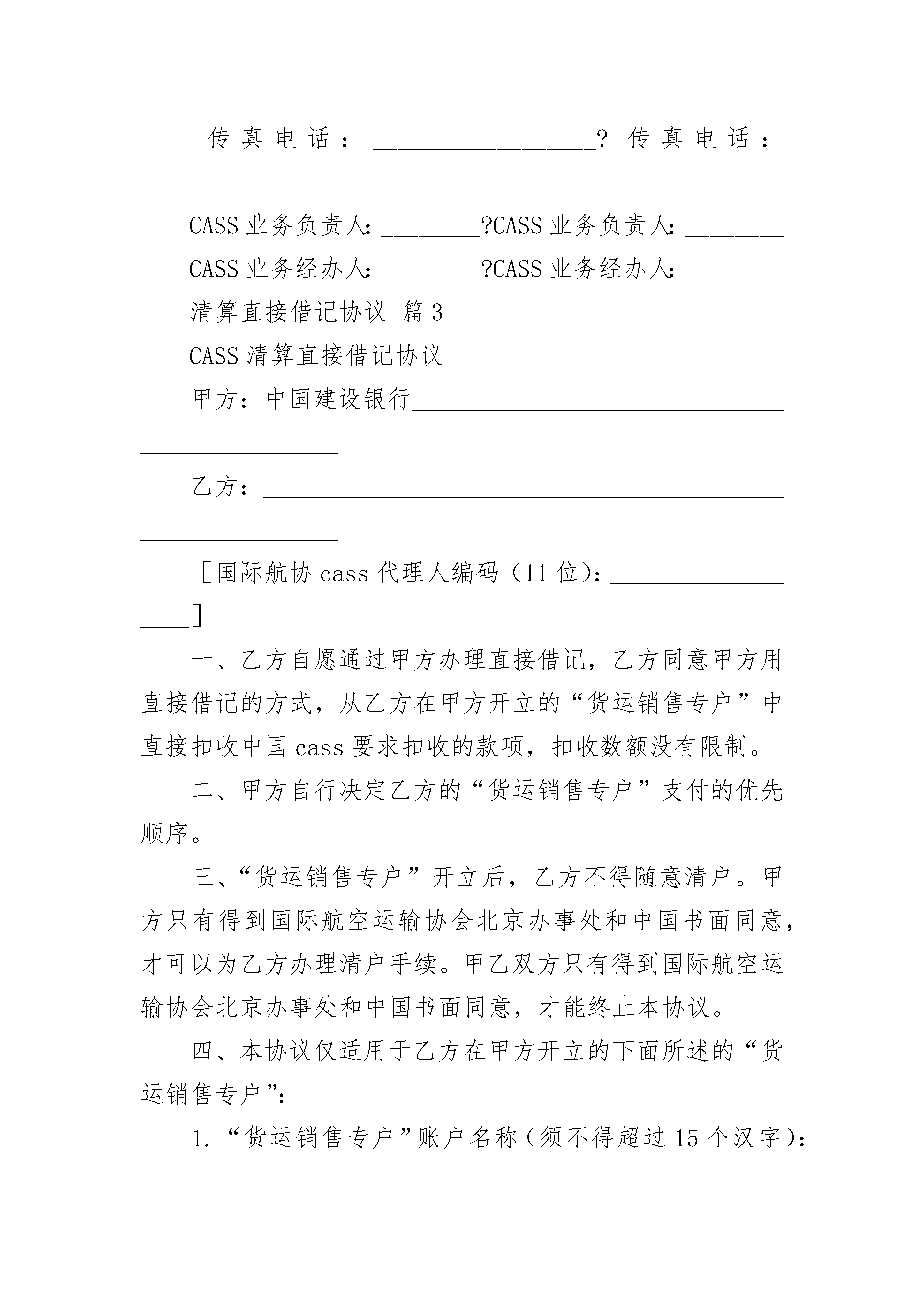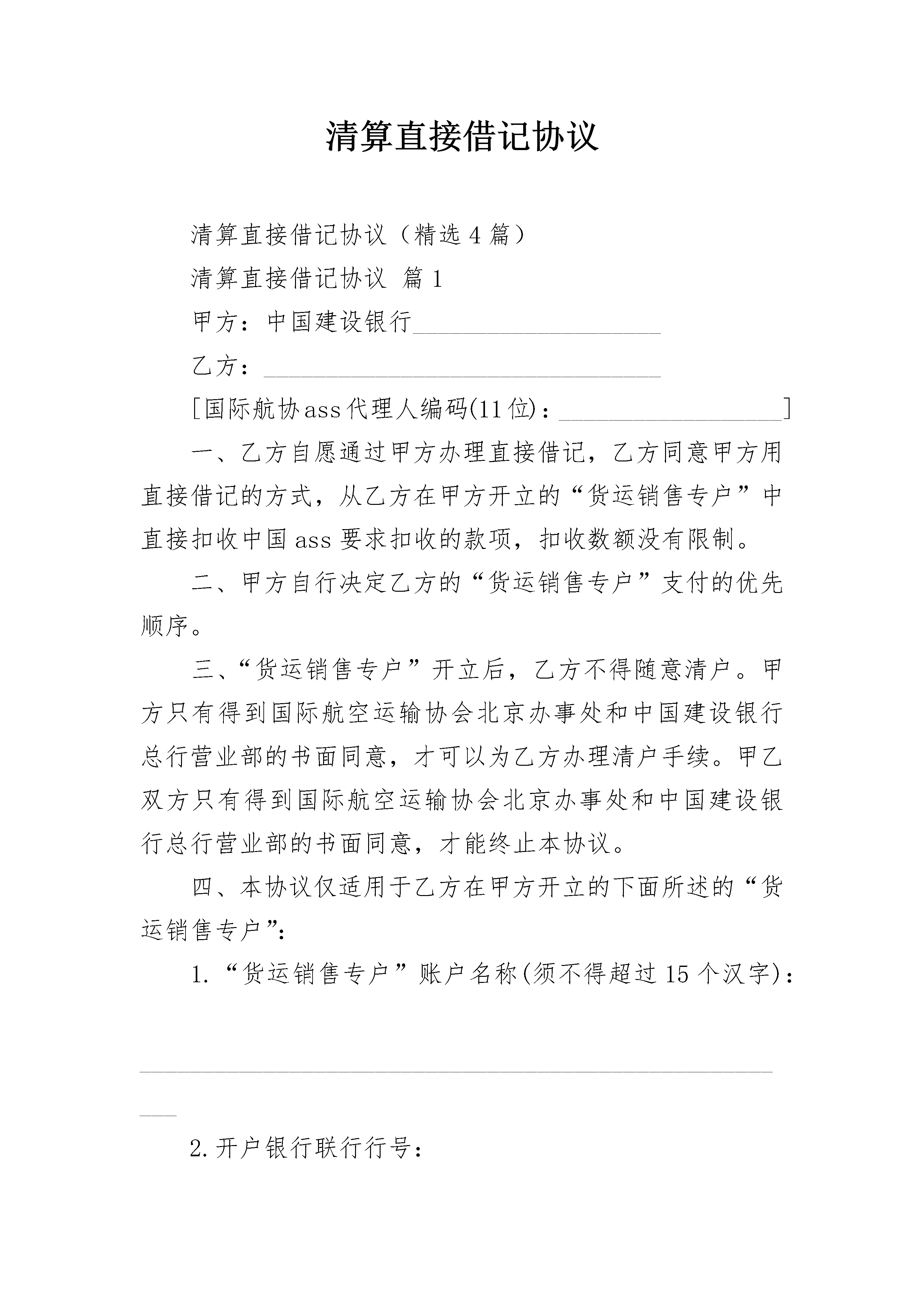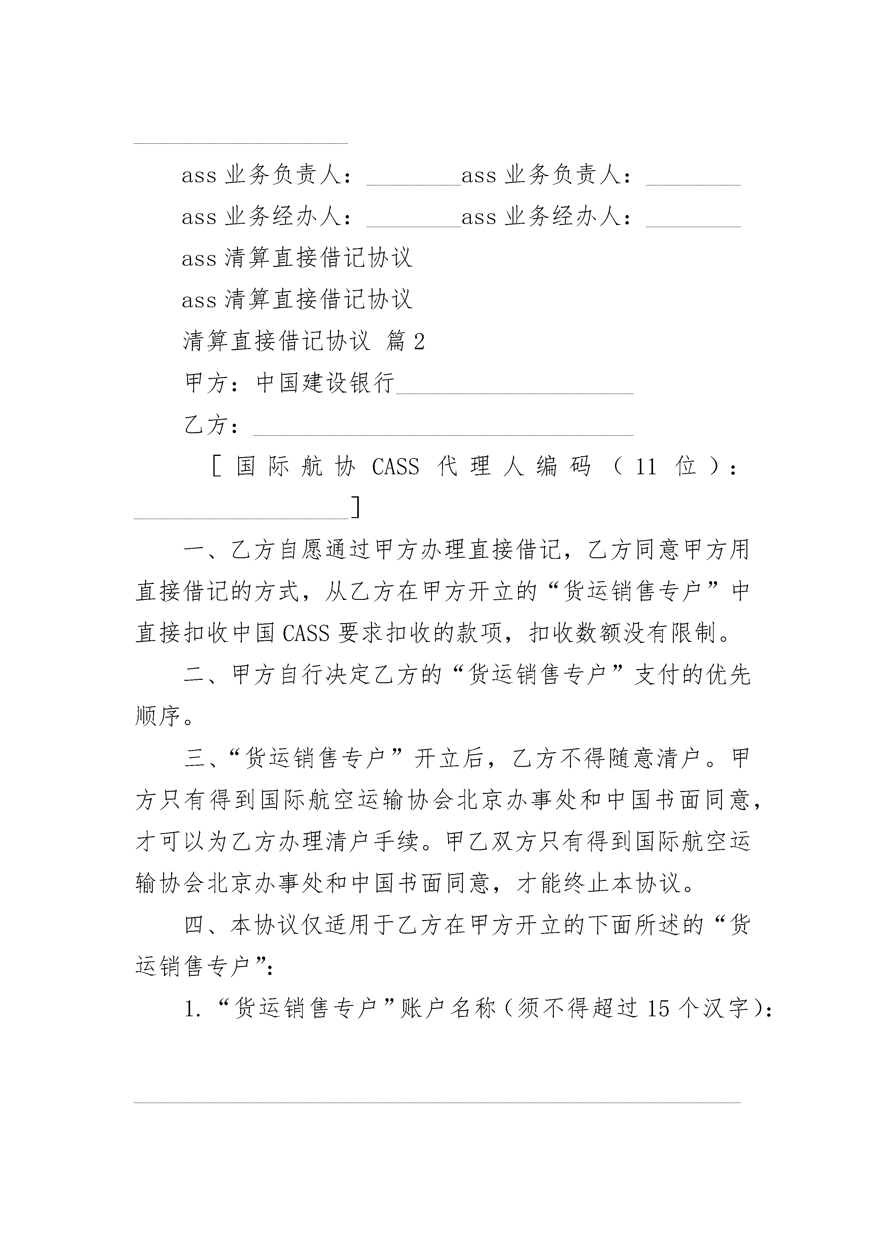 清算直接借记协议清算直接借记协议(精选4篇)清算直接借记协议篇1甲方:中国建设银行____________________乙方:________________________________[国际航协ass代理人编码(11位):__________________]一、乙方自愿通过甲方办理直接借记,乙方同意甲方用直接借记的方式,从乙方在甲方开立的“货运销售专户”中直接扣收中国ass要求扣收的款项,扣收数额没有限制。二、甲方自行决定乙方的“货运销售专户”支付的优先顺序。三、“货运销售专户”开立后,乙方不得随意清户。甲方只有得到国际航空运输协会北京办事处和中国建设银行总行营业部的书面同意,才可以为乙方办理清户手续。甲乙双方只有得到国际航空运输协会北京办事处和中国建设银行总行营业部的书面同意,才能终止本协议。四、本协议仅适用于乙方在甲方开立的下面所述的“货运销售专户”:1.“货运销售专户”账户名称(须不得超过15个汉字):______________________________________________________2.开户银行联行行号:______________________________________________________3.“货运销售专户”账号(须不得超过10位数字):______________________________________________________五、本协议一式四份,其中甲乙双方各留存一份,另两份分别由甲乙双方传真并邮寄至建行总行营业部ass清算银行中心和国际航空运输协会北京办事处ass经理。甲方(公章):______________乙方(公章):______________甲方法定代表人或乙方法定代表人或授权代理人(签名)__________授权代理人(签名)___________________年_______月______日_________年______月_______日地址:______________________地址:______________________邮政编码:__________________邮政编码:__________________联系电话:__________________联系电话:__________________传真电话:__________________传真电话:__________________ass业务负责人:________ass业务负责人:________ass业务经办人:________ass业务经办人:________ass清算直接借记协议ass清算直接借记协议清算直接借记协议篇2甲方:中国建设银行____________________乙方:________________________________[国际航协CASS代理人编码(11位):__________________]一、乙方自愿通过甲方办理直接借记,乙方同意甲方用直接借记的方式,从乙方在甲方开立的“货运销售专户”中直接扣收中国CASS要求扣收的款项,扣收数额没有限制。二、甲方自行决定乙方的“货运销售专户”支付的优先顺序。三、“货运销售专户”开立后,乙方不得随意清户。甲方只有得到国际航空运输协会北京办事处和中国书面同意,才可以为乙方办理清户手续。甲乙双方只有得到国际航空运输协会北京办事处和中国书面同意,才能终止本协议。四、本协议仅适用于乙方在甲方开立的下面所述的“货运销售专户”:1.“货运销售专户”账户名称(须不得超过15个汉字):______________________________________________________2.开户银行联行行号:______________________________________________________3.“货运销售专户”账号(须不得超过10位数字):______________________________________________________五、本协议一式四份,其中甲乙双方各留存一份,另两份分别由甲乙双方传真并邮寄至XXXCASS清算银行中心和国际航空运输协会北京办事处CASS经理。甲方(公章):______________?乙方(公章):______________甲方法定代表人或乙方法定代表人或授权代理人(签名)__________?授权代理人(签名)___________________年_______月______日?_________年______月_______日地址:______________________?地址:______________________编码:__________________?编码:_________________