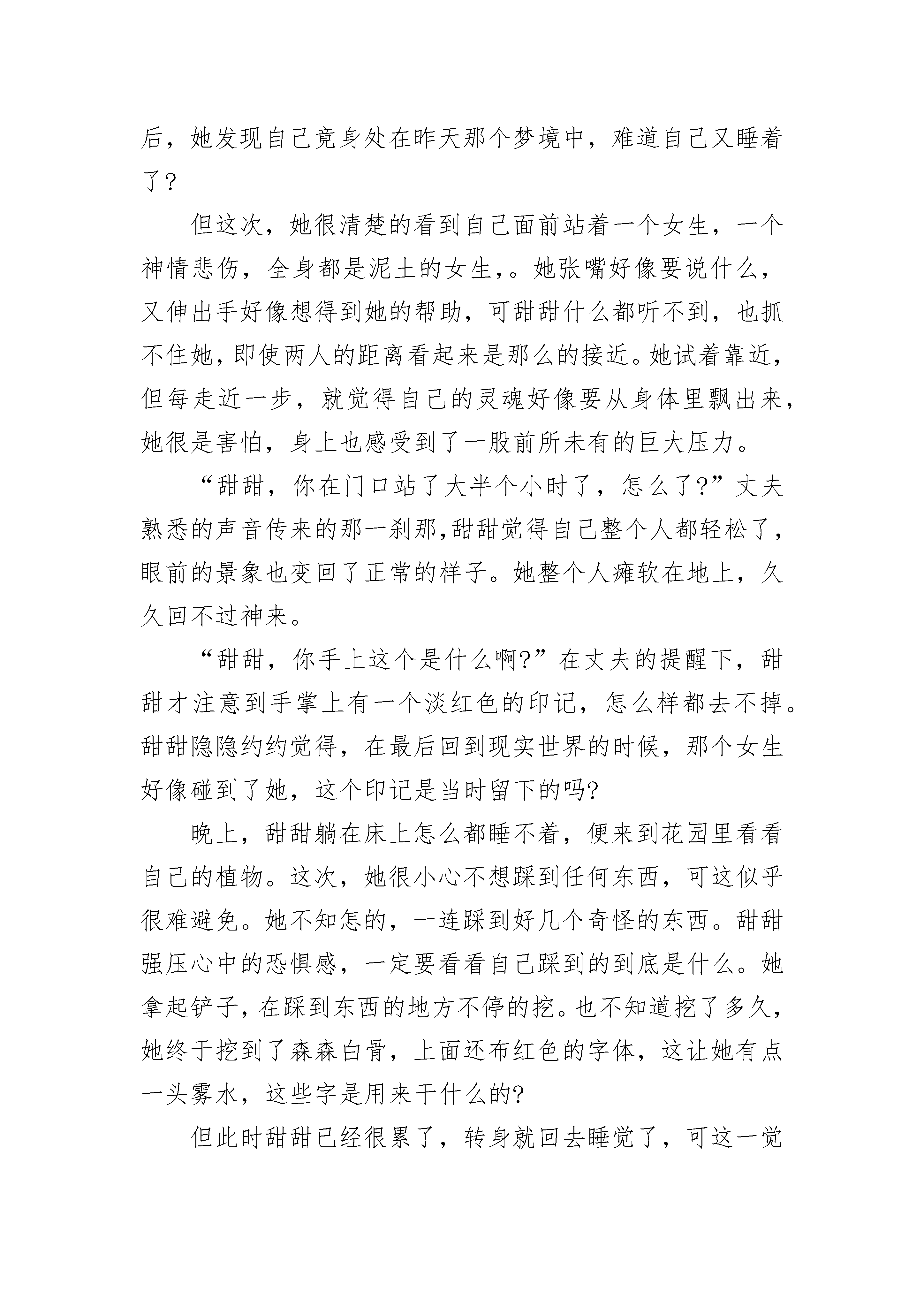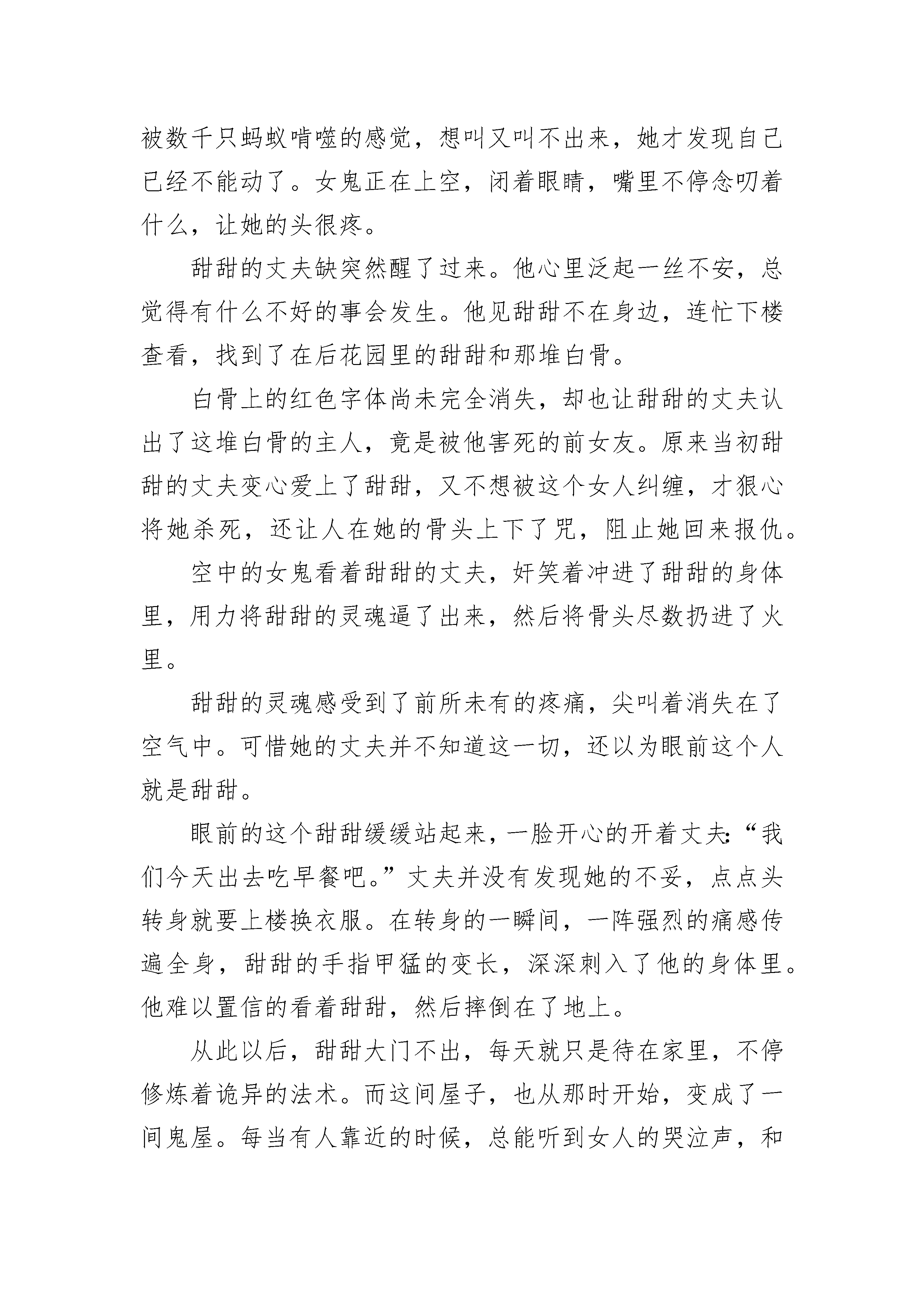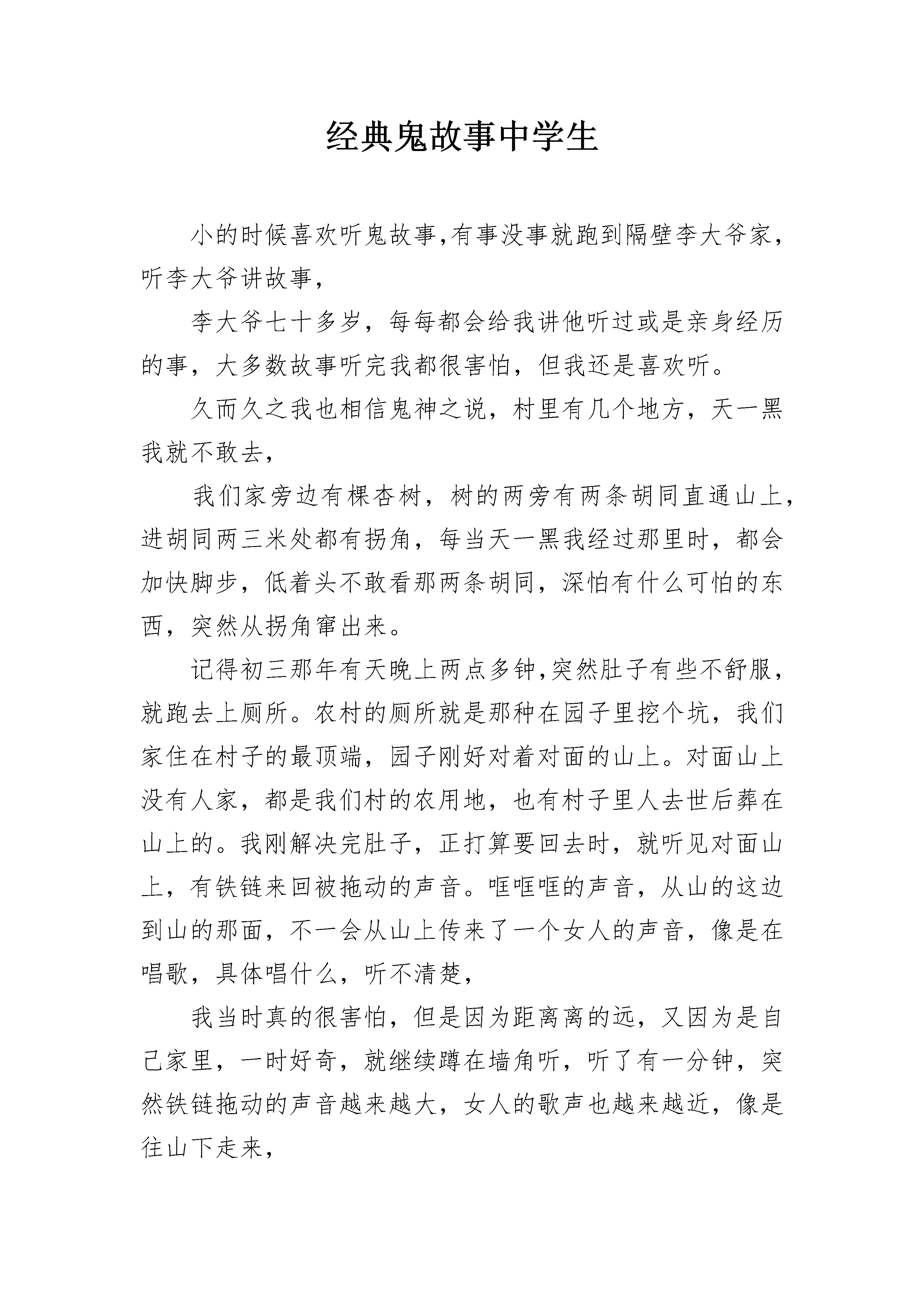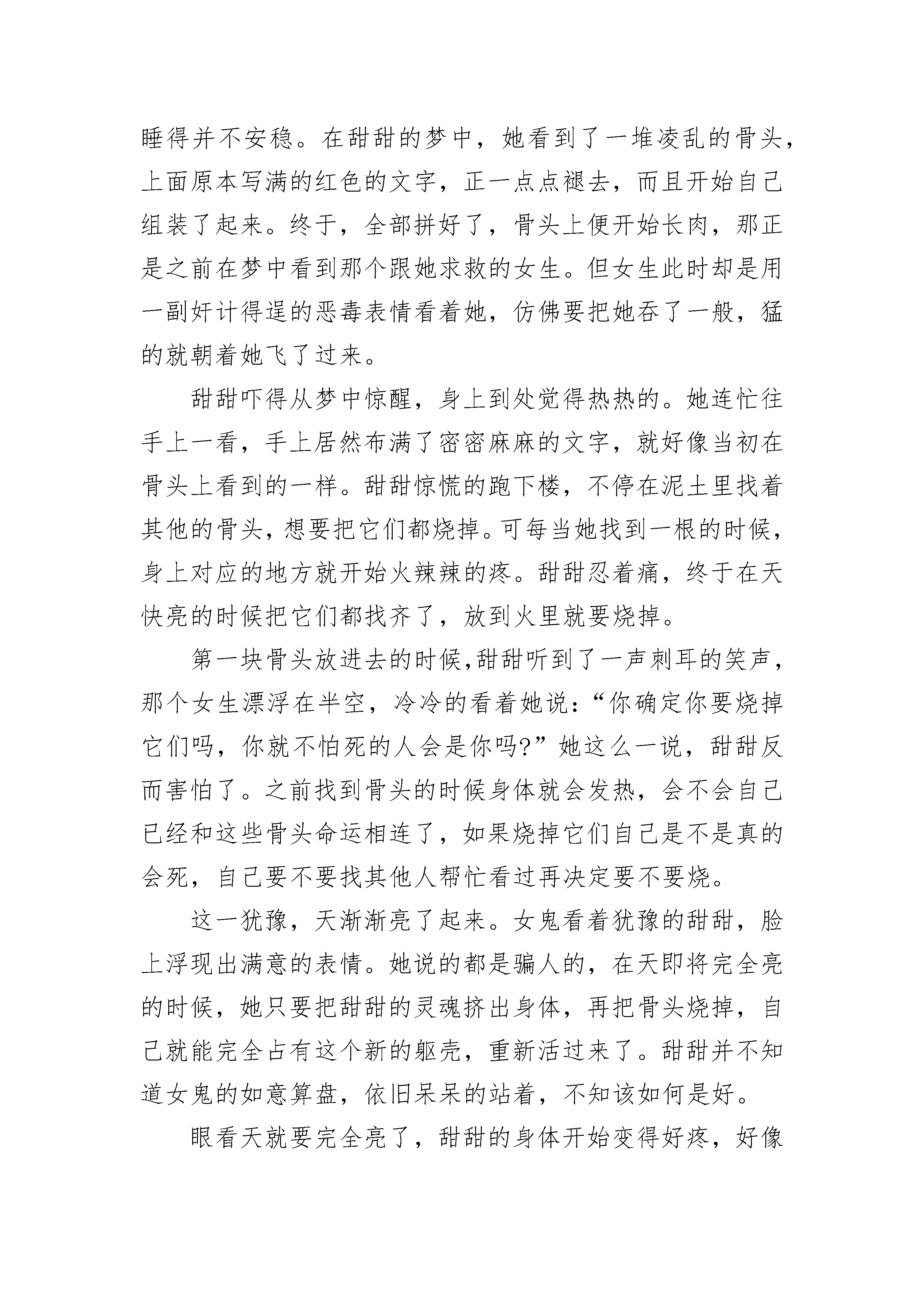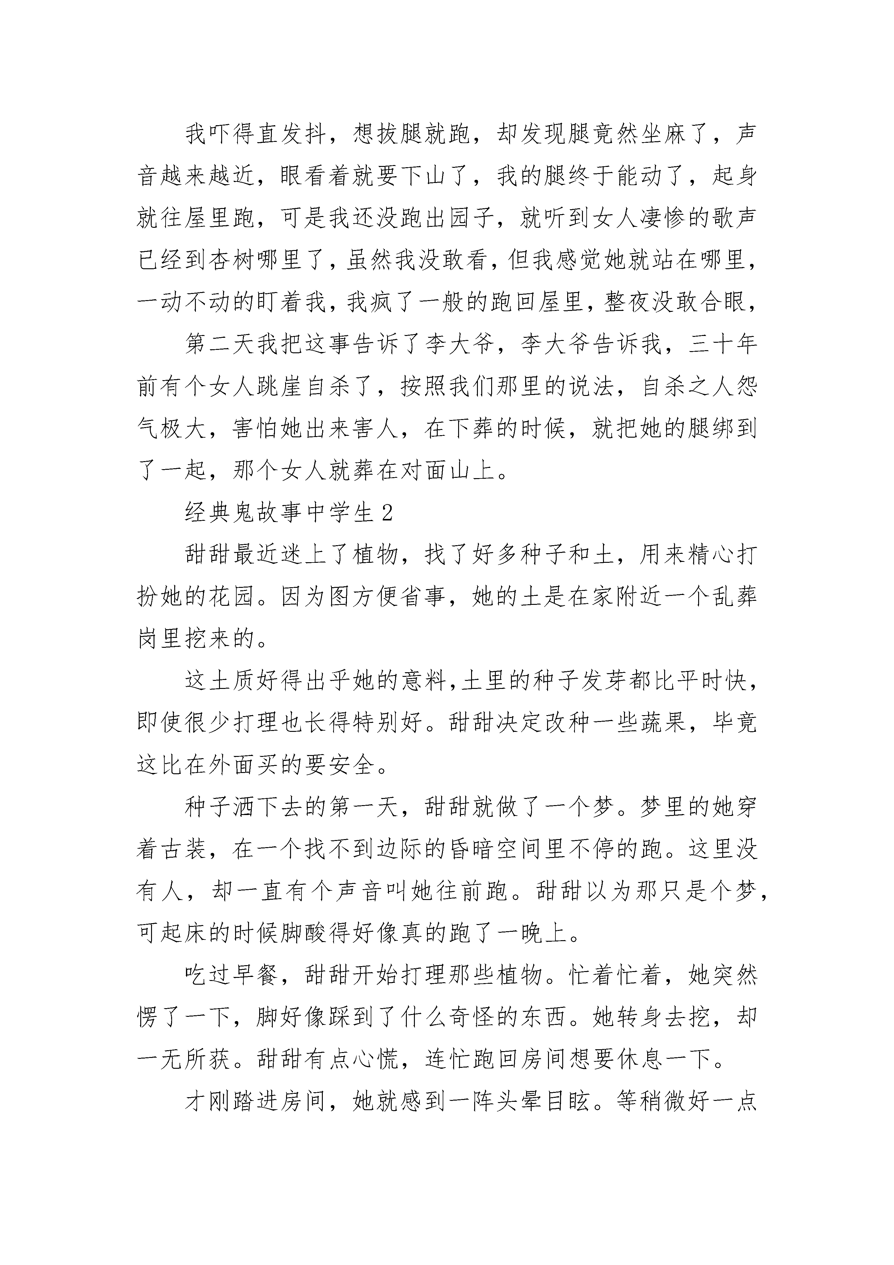 经典鬼故事中学生小的时候喜欢听鬼故事,有事没事就跑到隔壁李大爷家,听李大爷讲故事,李大爷七十多岁,每每都会给我讲他听过或是亲身经历的事,大多数故事听完我都很害怕,但我还是喜欢听。久而久之我也相信鬼神之说,村里有几个地方,天一黑我就不敢去,我们家旁边有棵杏树,树的两旁有两条胡同直通山上,进胡同两三米处都有拐角,每当天一黑我经过那里时,都会加快脚步,低着头不敢看那两条胡同,深怕有什么可怕的东西,突然从拐角窜出来。记得初三那年有天晚上两点多钟,突然肚子有些不舒服,就跑去上厕所。农村的厕所就是那种在园子里挖个坑,我们家住在村子的最顶端,园子刚好对着对面的山上。对面山上没有人家,都是我们村的农用地,也有村子里人去世后葬在山上的。我刚解决完肚子,正打算要回去时,就听见对面山上,有铁链来回被拖动的声音。哐哐哐的声音,从山的这边到山的那面,不一会从山上传来了一个女人的声音,像是在唱歌,具体唱什么,听不清楚,我当时真的很害怕,但是因为距离离的远,又因为是自己家里,一时好奇,就继续蹲在墙角听,听了有一分钟,突然铁链拖动的声音越来越大,女人的歌声也越来越近,像是往山下走来,我吓得直发抖,想拔腿就跑,却发现腿竟然坐麻了,声音越来越近,眼看着就要下山了,我的腿终于能动了,起身就往屋里跑,可是我还没跑出园子,就听到女人凄惨的歌声已经到杏树哪里了,虽然我没敢看,但我感觉她就站在哪里,一动不动的盯着我,我疯了一般的跑回屋里,整夜没敢合眼,第二天我把这事告诉了李大爷,李大爷告诉我,三十年前有个女人跳崖自杀了,按照我们那里的说法,自杀之人怨气极大,害怕她出来害人,在下葬的时候,就把她的腿绑到了一起,那个女人就葬在对面山上。经典鬼故事中学生2甜甜最近迷上了植物,找了好多种子和土,用来精心打扮她的花园。因为图方便省事,她的土是在家附近一个乱葬岗里挖来的。这土质好得出乎她的意料,土里的种子发芽都比平时快,即使很少打理也长得特别好。甜甜决定改种一些蔬果,毕竟这比在外面买的要安全。种子洒下去的第一天,甜甜就做了一个梦。梦里的她穿着古装,在一个找不到边际的昏暗空间里不停的跑。这里没有人,却一直有个声音叫她往前跑。甜甜以为那只是个梦,可起床的时候脚酸得好像真的跑了一晚上。吃过早餐,甜甜开始打理那些植物。忙着忙着,她突然愣了一下,脚好像踩到了什么奇怪的东西。她转身去挖,却一无所获。甜甜有点心慌,连忙跑回房间想要休息一下。才刚踏进房间,她就感到一阵头晕目眩。等稍微好一点后,她发现自己竟身处在昨天那个梦境中,难道自己又睡着了?但这次,她很清楚的看到自己面前站着一个女生,一个神情悲伤,全身都是泥土的女生,。她张嘴好像要说什么,又伸出手好像想得到她的帮助,可甜甜什么都听不到,也抓不住她,即使两人的距离看起来是那么的接近。她试着靠近,但每走近一步,就觉得自己的灵魂好像要从身体里飘出来,她很是害怕,身上也感受到了一股前所未有的巨大压力。“甜甜,你在门口站了大半个小时了,怎么了?”丈夫熟悉的声音传来的那一刹那,甜甜觉得自己整个人都轻松了,眼前的景象也变回了正常的样子。她整个人瘫软在地上,久久回不过神来。“甜甜,你手上这个是什么啊?”在丈夫的提醒下,甜甜才注意到手掌上有一个淡红色的印记,怎么样都去不掉。甜甜隐隐约约觉得,在最后回到现实世界的时候,那个女生好像碰到了她,这个印记是当时留下的吗?晚上,甜甜躺在床上怎么都睡不着,便来到花园里看看自己的植物。这次,她很小心不想踩到任何东西,可这似乎很难避免。她不知怎的,一连踩到好几个奇怪的东西。甜甜强压心中的恐惧感,一定要看看自己踩到的到底是什么。她拿起铲子,在踩到东西的地方不停的挖。也不知道挖了多久,她终于挖到了森森白骨,上面还布红色的字体,这让她有点一头雾水,这些字是用来干什么的?但此时甜甜已经很累了,转身就回去睡觉了,可这一觉睡得并不安稳。在甜甜的梦中,她看到了一堆凌乱的骨头,上面原本写满的红色的文字,正一点点褪去,而且开始自己组装了起来。终于,全部拼好了,骨头上便开始长肉,那正是之前在梦中看到那个跟她求救的女生。但女生此时却是用一副奸计得逞的恶毒表情看着她,仿佛要把她吞了一般,猛的就朝着她飞了过来。甜甜吓得从梦中惊醒,身上到处觉得热热的。她连忙往手上一看,手上居然布满了密密麻麻的文字,就好像当初在骨头上看到的一样。甜甜惊慌的跑下楼,不停在泥土里找着其他的骨头,想要把它们都烧掉。可每当她找到一根的时候,身上对应的地方就开始火辣辣的疼。甜甜忍着痛,终于在天快亮的时候把它们都找齐了,放到火里就要烧掉。第一块骨头放进去的时候,甜甜听到了一声刺耳的笑声,那个女生漂浮在半空,冷冷的看着她说:“你确定你要烧掉它们吗,你就不怕死的人会是你吗?”她这么一说,甜甜反而害怕了。之前找到骨头的时候身体就会发热,会不会自己已经和这些骨头命运相连了,如果烧掉它们自己是