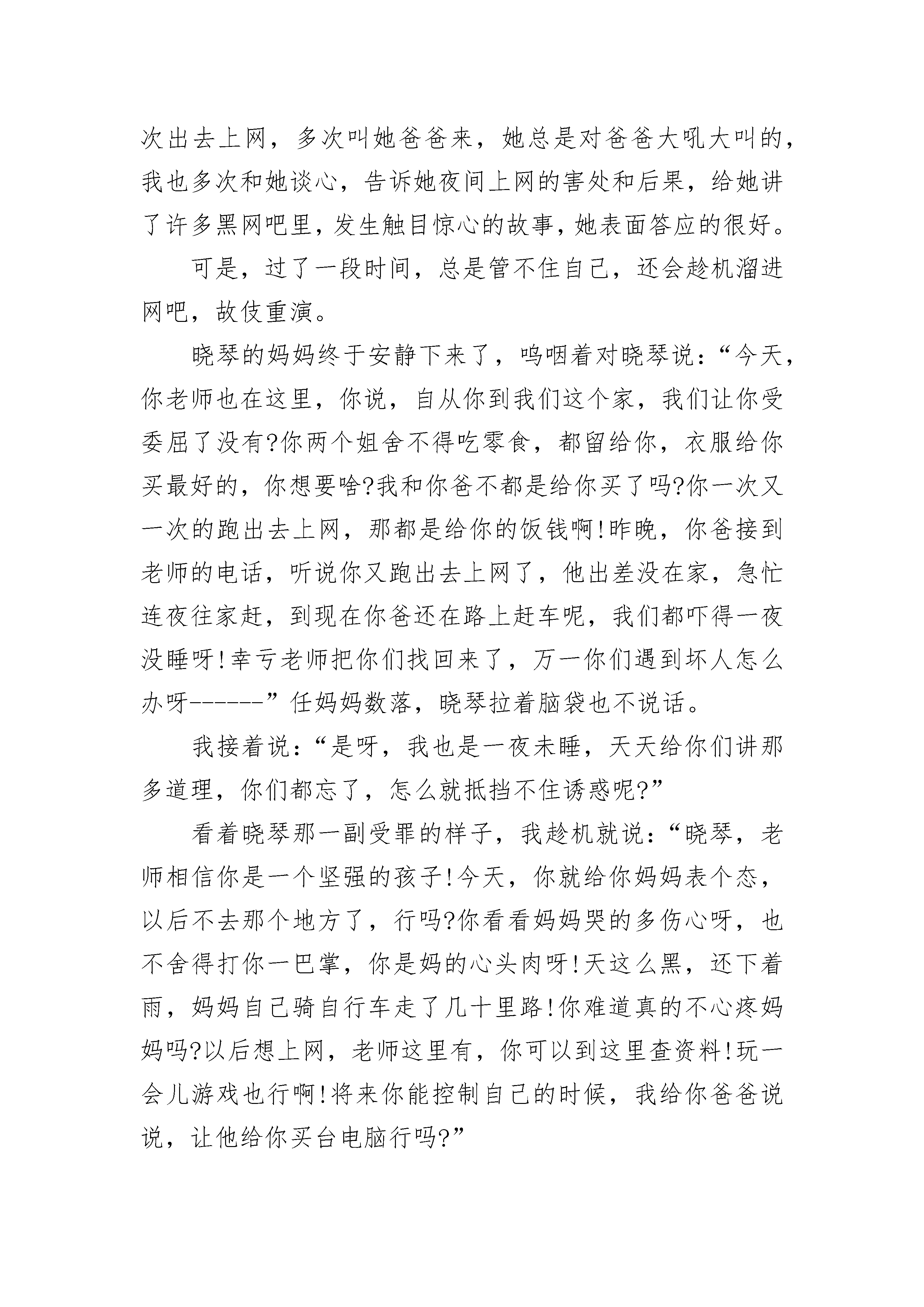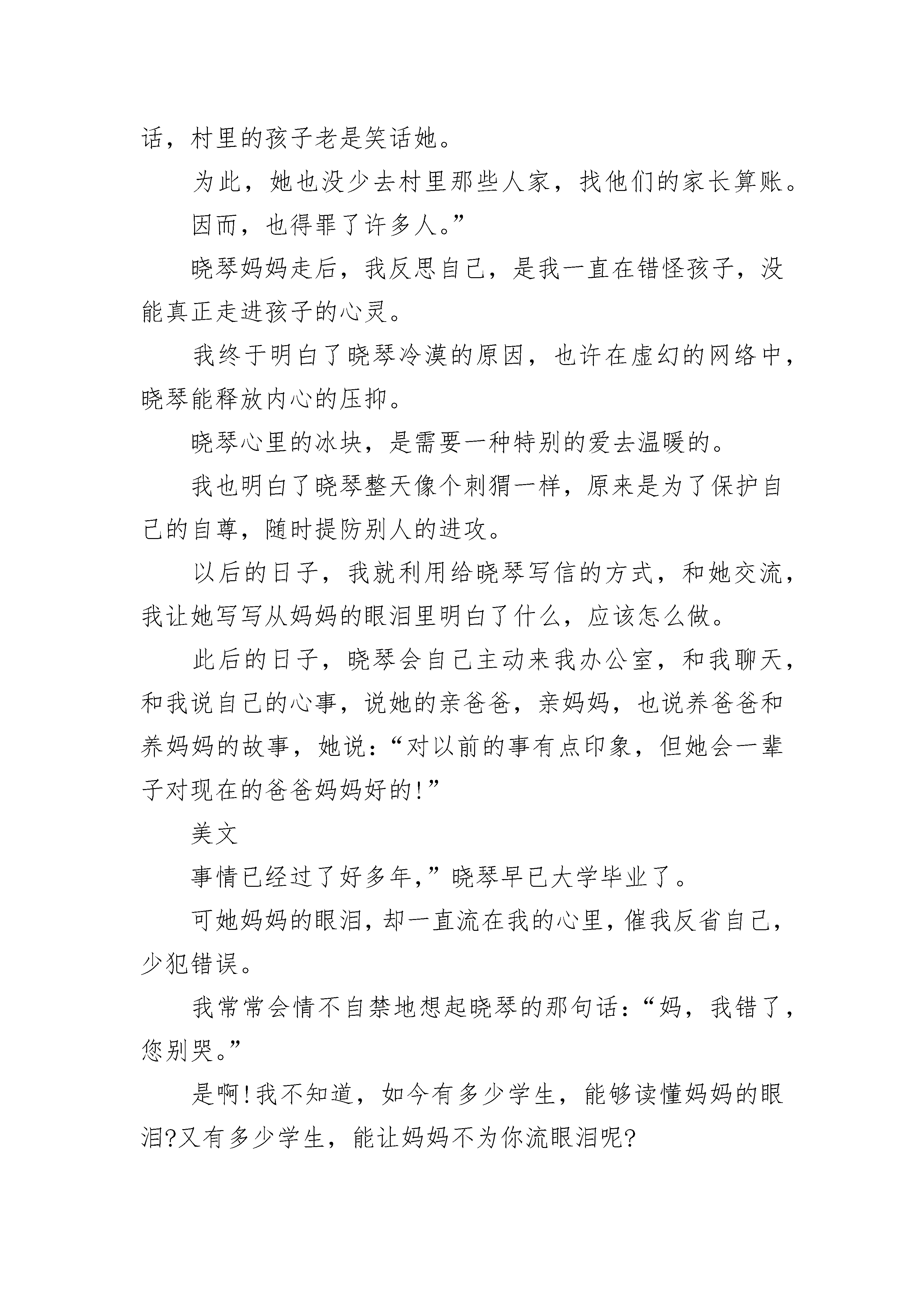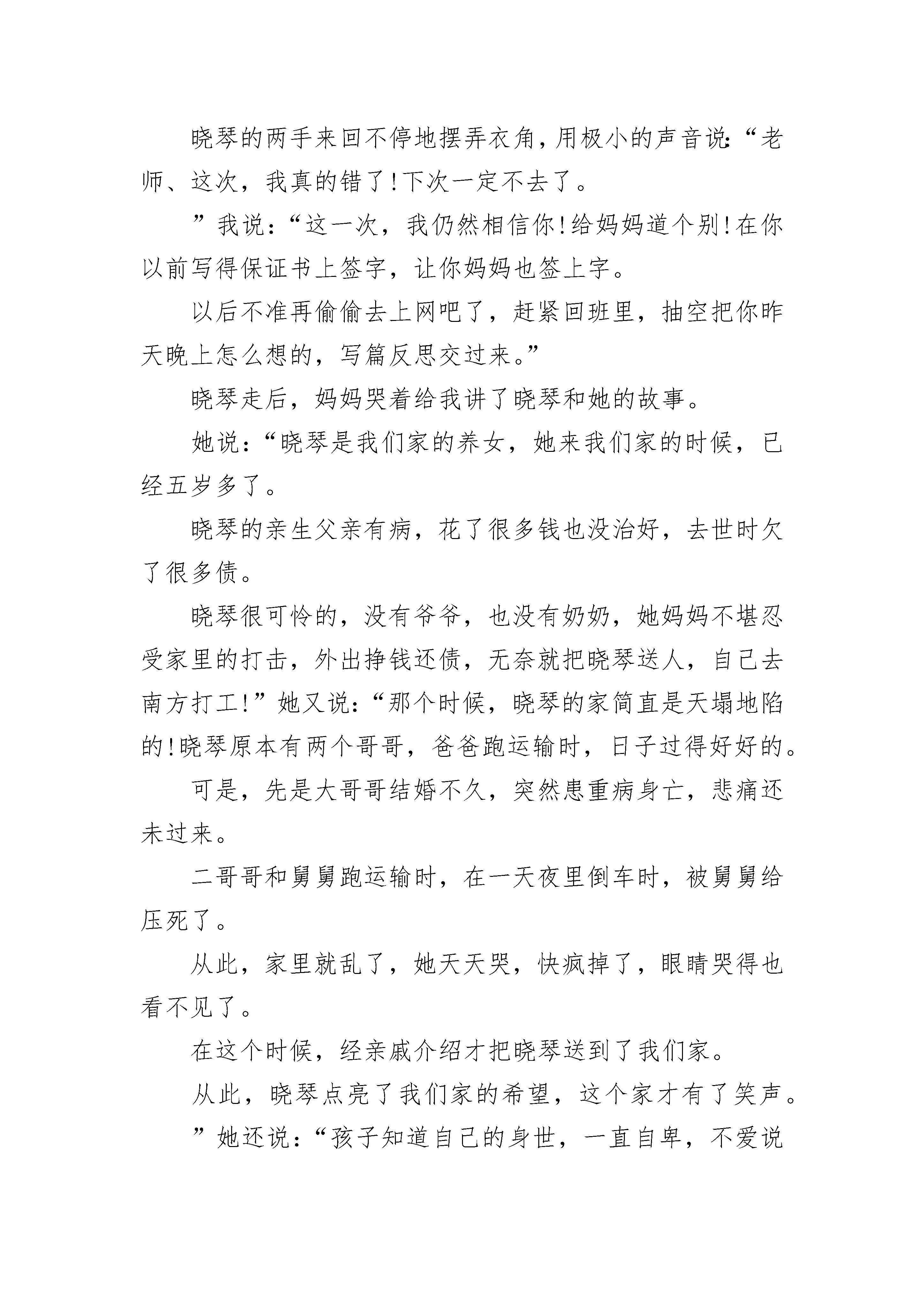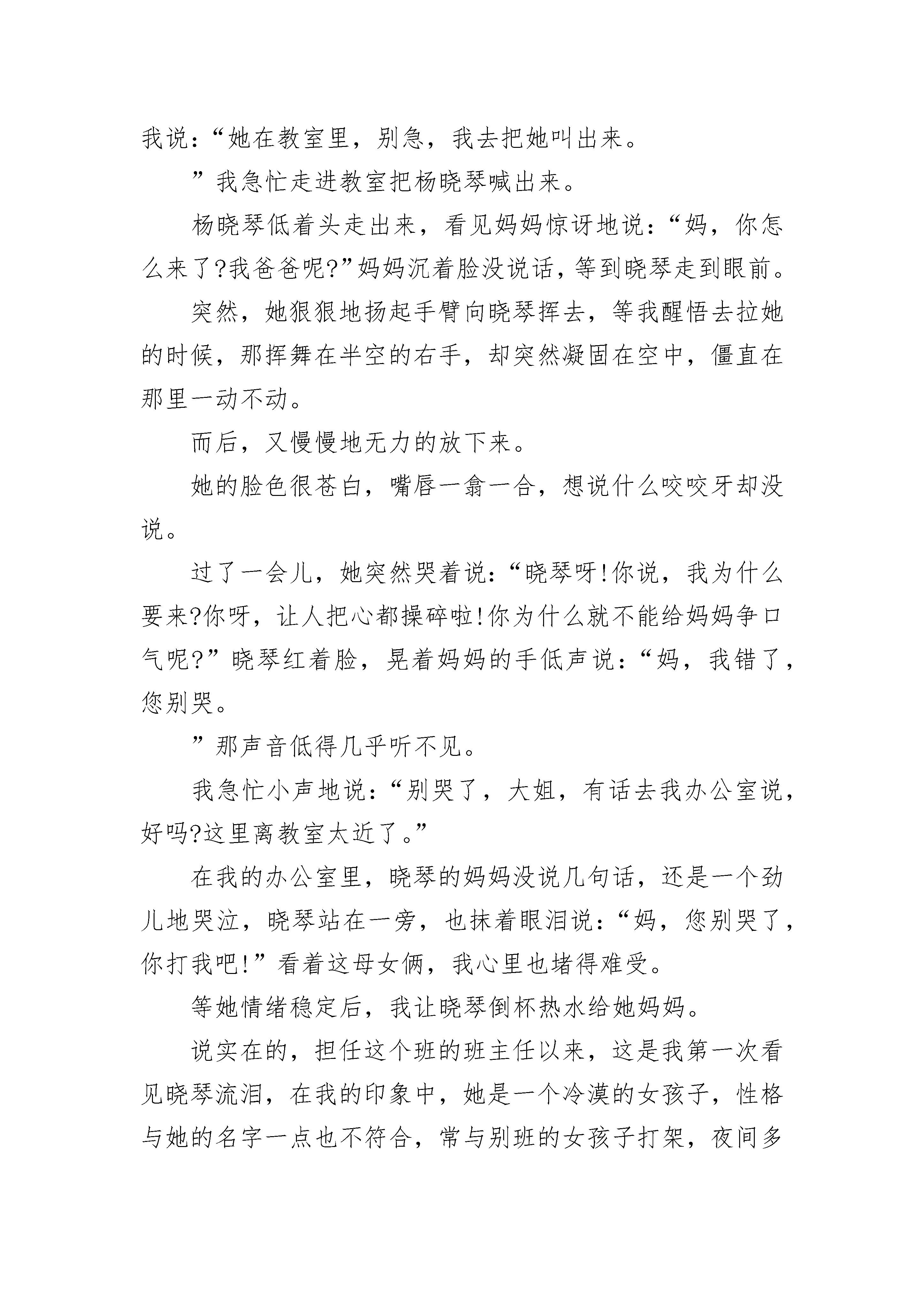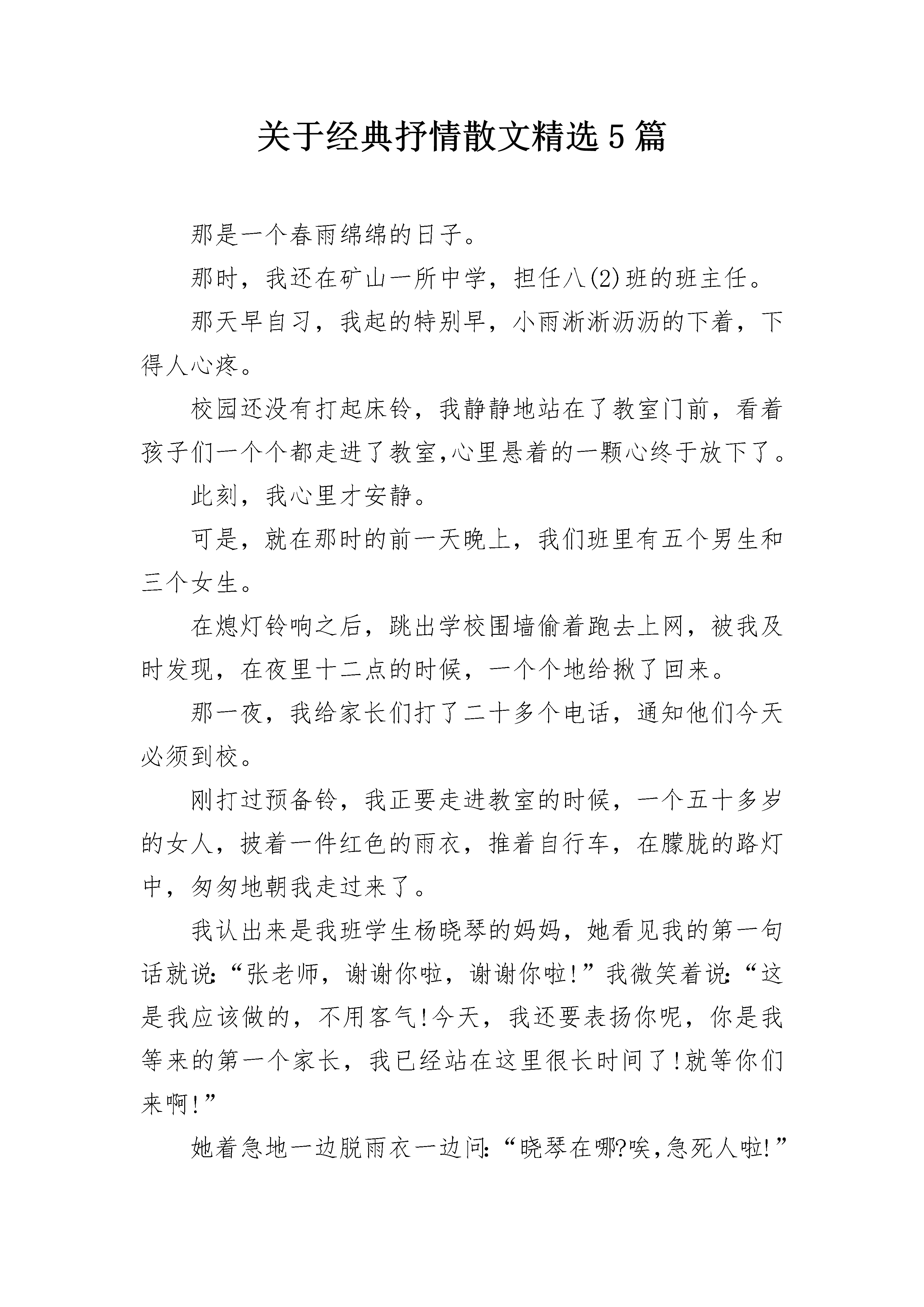 关于经典抒情散文精选5篇那是一个春雨绵绵的日子。那时,我还在矿山一所中学,担任八(2)班的班主任。那天早自习,我起的特别早,小雨淅淅沥沥的下着,下得人心疼。校园还没有打起床铃,我静静地站在了教室门前,看着孩子们一个个都走进了教室,心里悬着的一颗心终于放下了。此刻,我心里才安静。可是,就在那时的前一天晚上,我们班里有五个男生和三个女生。在熄灯铃响之后,跳出学校围墙偷着跑去上网,被我及时发现,在夜里十二点的时候,一个个地给揪了回来。那一夜,我给家长们打了二十多个电话,通知他们今天必须到校。刚打过预备铃,我正要走进教室的时候,一个五十多岁的女人,披着一件红色的雨衣,推着自行车,在朦胧的路灯中,匆匆地朝我走过来了。我认出来是我班学生杨晓琴的妈妈,她看见我的第一句话就说:“张老师,谢谢你啦,谢谢你啦!”我微笑着说:“这是我应该做的,不用客气!今天,我还要表扬你呢,你是我等来的第一个家长,我已经站在这里很长时间了!就等你们来啊!”她着急地一边脱雨衣一边问:“晓琴在哪?唉,急死人啦!”我说:“她在教室里,别急,我去把她叫出来。”我急忙走进教室把杨晓琴喊出来。杨晓琴低着头走出来,看见妈妈惊讶地说:“妈,你怎么来了?我爸爸呢?”妈妈沉着脸没说话,等到晓琴走到眼前。突然,她狠狠地扬起手臂向晓琴挥去,等我醒悟去拉她的时候,那挥舞在半空的右手,却突然凝固在空中,僵直在那里一动不动。而后,又慢慢地无力的放下来。她的脸色很苍白,嘴唇一翕一合,想说什么咬咬牙却没说。过了一会儿,她突然哭着说:“晓琴呀!你说,我为什么要来?你呀,让人把心都操碎啦!你为什么就不能给妈妈争口气呢?”晓琴红着脸,晃着妈妈的手低声说:“妈,我错了,您别哭。”那声音低得几乎听不见。我急忙小声地说:“别哭了,大姐,有话去我办公室说,好吗?这里离教室太近了。”在我的办公室里,晓琴的妈妈没说几句话,还是一个劲儿地哭泣,晓琴站在一旁,也抹着眼泪说:“妈,您别哭了,你打我吧!”看着这母女俩,我心里也堵得难受。等她情绪稳定后,我让晓琴倒杯热水给她妈妈。说实在的,担任这个班的班主任以来,这是我第一次看见晓琴流泪,在我的印象中,她是一个冷漠的女孩子,性格与她的名字一点也不符合,常与别班的女孩子打架,夜间多次出去上网,多次叫她爸爸来,她总是对爸爸大吼大叫的,我也多次和她谈心,告诉她夜间上网的害处和后果,给她讲了许多黑网吧里,发生触目惊心的故事,她表面答应的很好。可是,过了一段时间,总是管不住自己,还会趁机溜进网吧,故伎重演。晓琴的妈妈终于安静下来了,呜咽着对晓琴说:“今天,你老师也在这里,你说,自从你到我们这个家,我们让你受委屈了没有?你两个姐舍不得吃零食,都留给你,衣服给你买最好的,你想要啥?我和你爸不都是给你买了吗?你一次又一次的跑出去上网,那都是给你的饭钱啊!昨晚,你爸接到老师的电话,听说你又跑出去上网了,他出差没在家,急忙连夜往家赶,到现在你爸还在路上赶车呢,我们都吓得一夜没睡呀!幸亏老师把你们找回来了,万一你们遇到坏人怎么办呀------”任妈妈数落,晓琴拉着脑袋也不说话。我接着说:“是呀,我也是一夜未睡,天天给你们讲那多道理,你们都忘了,怎么就抵挡不住诱惑呢?”看着晓琴那一副受罪的样子,我趁机就说:“晓琴,老师相信你是一个坚强的孩子!今天,你就给你妈妈表个态,以后不去那个地方了,行吗?你看看妈妈哭的多伤心呀,也不舍得打你一巴掌,你是妈的心头肉呀!天这么黑,还下着雨,妈妈自己骑自行车走了几十里路!你难道真的不心疼妈妈吗?以后想上网,老师这里有,你可以到这里查资料!玩一会儿游戏也行啊!将来你能控制自己的时候,我给你爸爸说说,让他给你买台电脑行吗?”晓琴的两手来回不停地摆弄衣角,用极小的声音说:“老师、这次,我真的错了!下次一定不去了。”我说:“这一次,我仍然相信你!给妈妈道个别!在你以前写得保证书上签字,让你妈妈也签上字。以后不准再偷偷去上网吧了,赶紧回班里,抽空把你昨天晚上怎么想的,写篇反思交过来。”晓琴走后,妈妈哭着给我讲了晓琴和她的故事。她说:“晓琴是我们家的养女,她来我们家的时候,已经五岁多了。晓琴的亲生父亲有病,花了很多钱也没治好,去世时欠了很多债。晓琴很可怜的,没有爷爷,也没有奶奶,她妈妈不堪忍受家里的打击,外出挣钱还债,无奈就把晓琴送人,自己去南方打工!”她又说:“那个时候,晓琴的家简直是天塌地陷的!晓琴原本有两个哥哥,爸爸跑运输时,日子过得好好的。可是,先是大哥哥结婚不久,突然患重病身亡,悲痛还未过来。二哥哥和舅舅跑运输时,在一天夜里倒车时,被舅舅给压死了。从此,家里就乱了,她天天哭,快疯掉了,眼睛哭得也看不见了。在这个时候,经亲戚介绍才把晓琴送到了我们家。从此,晓琴点亮了我们家的希望,这个家才有了笑声。”她还说:“孩子知道自己的身世,一直自卑,不爱说话,村里的孩子老是笑话她