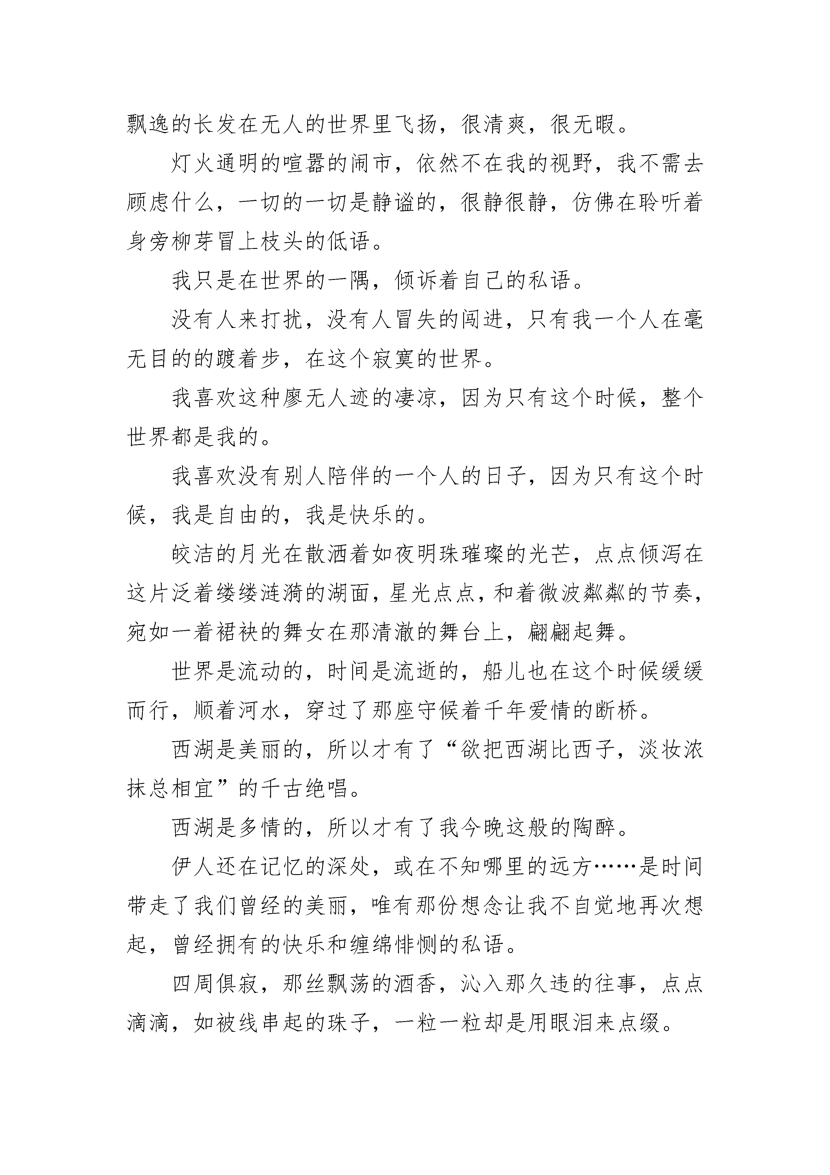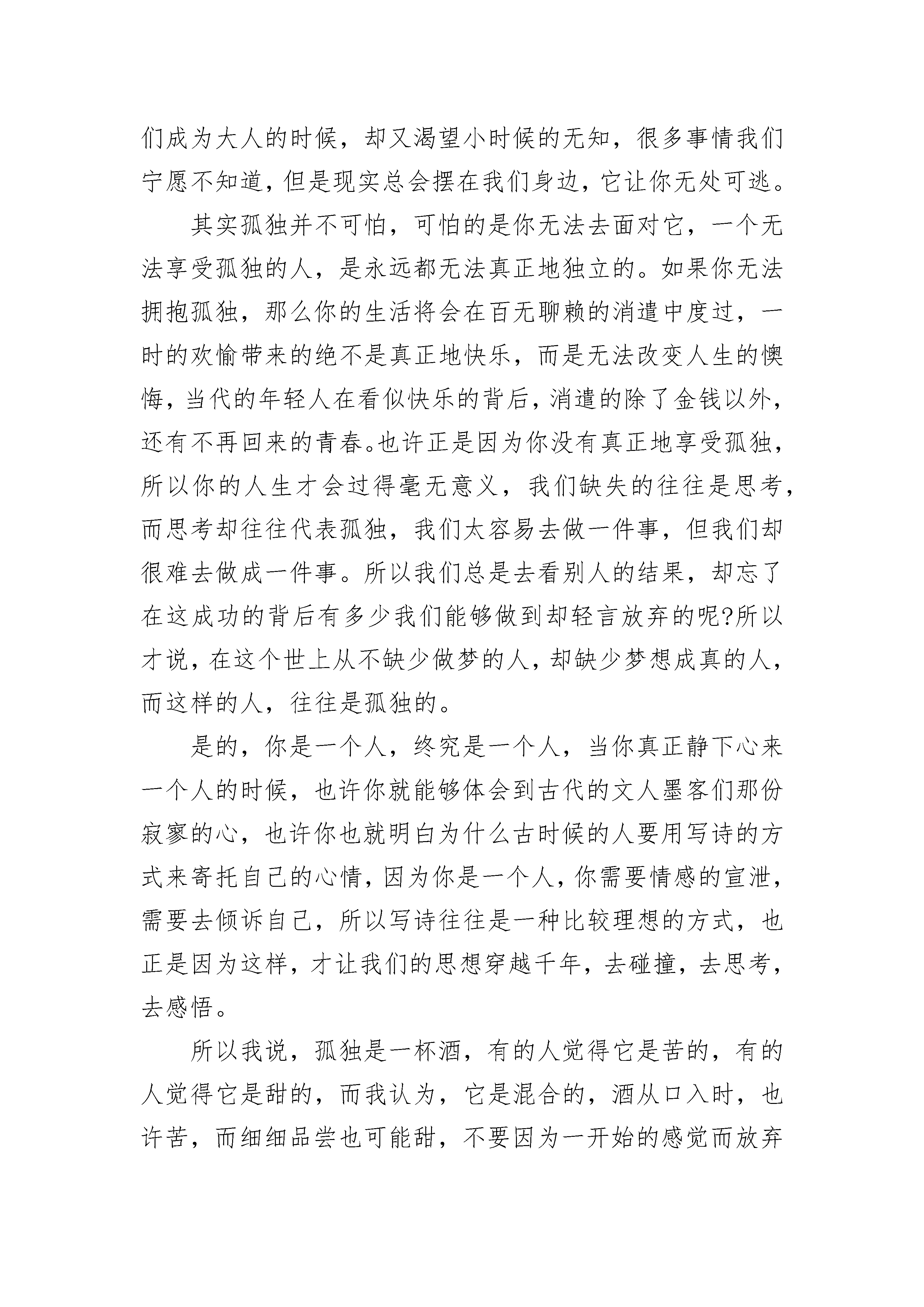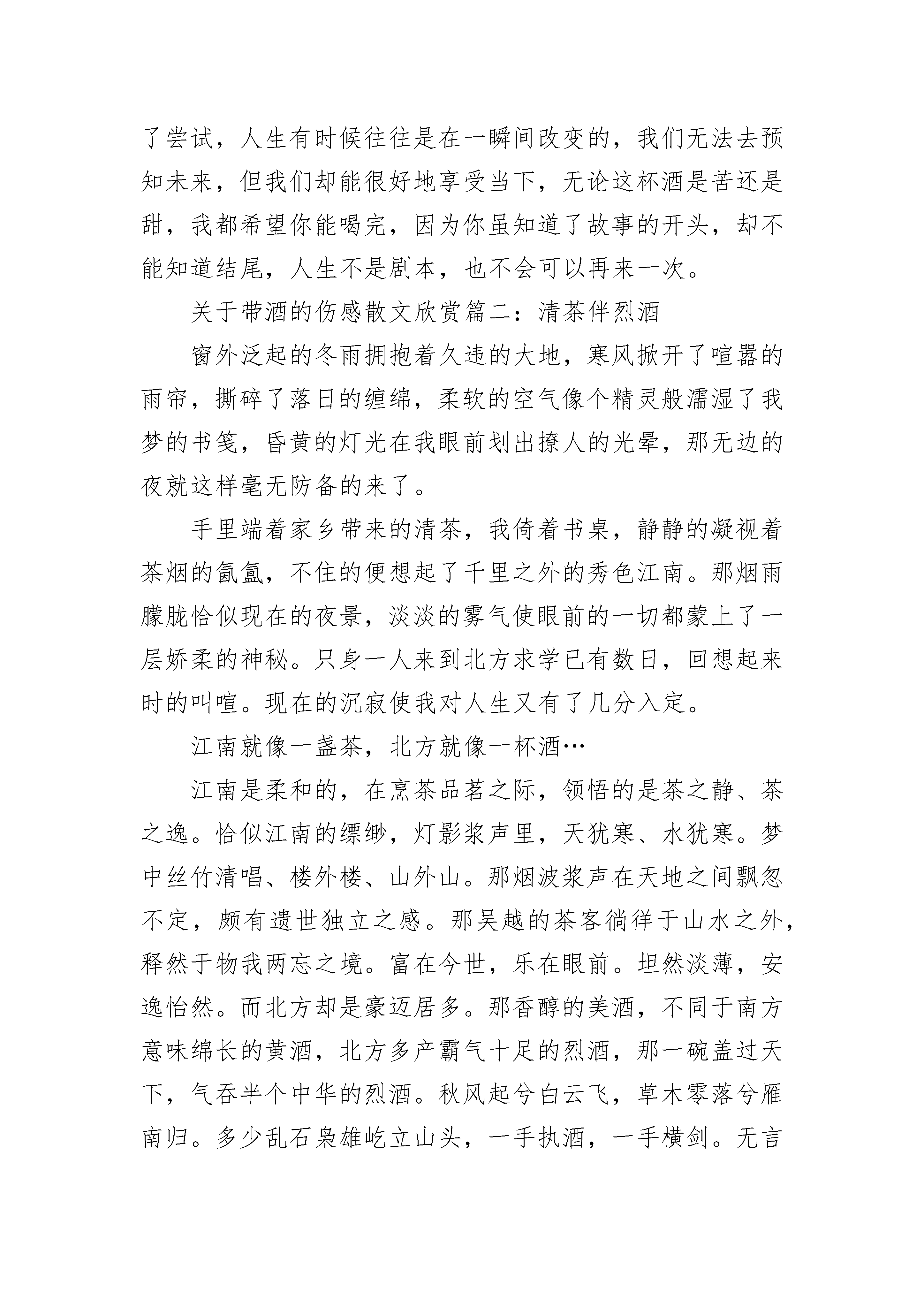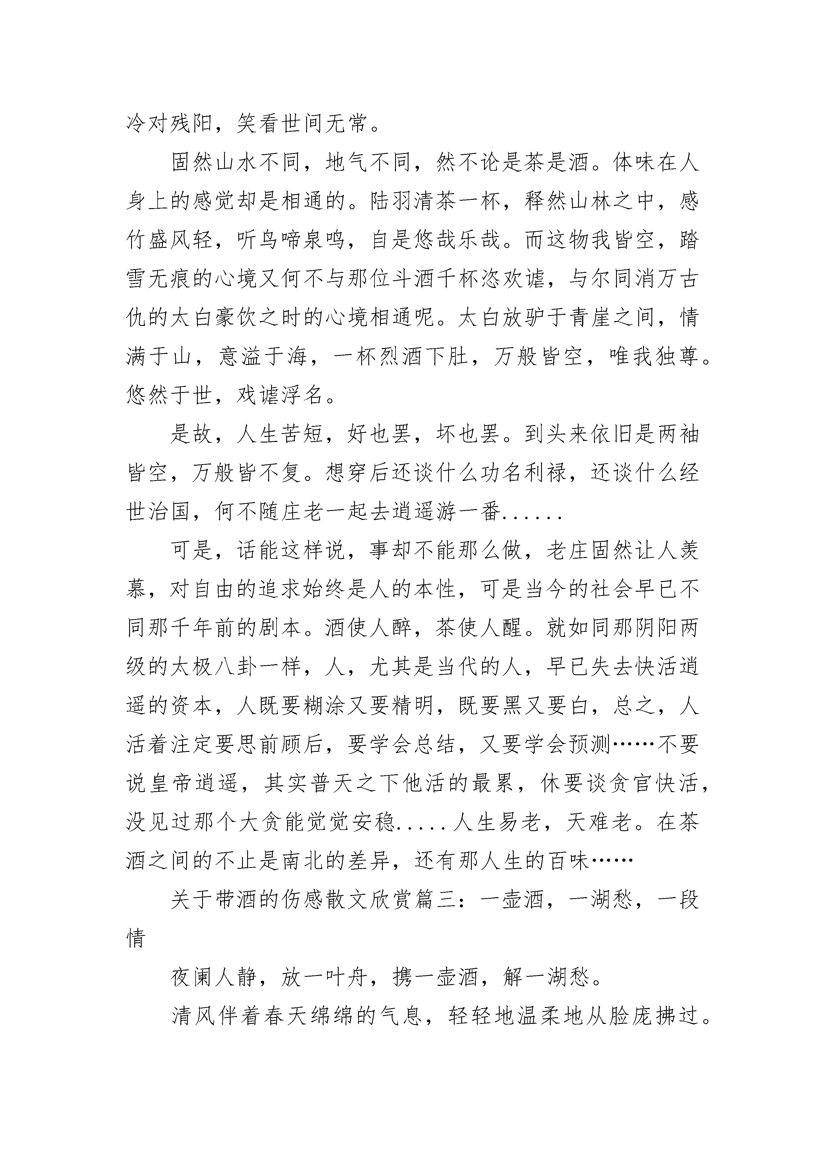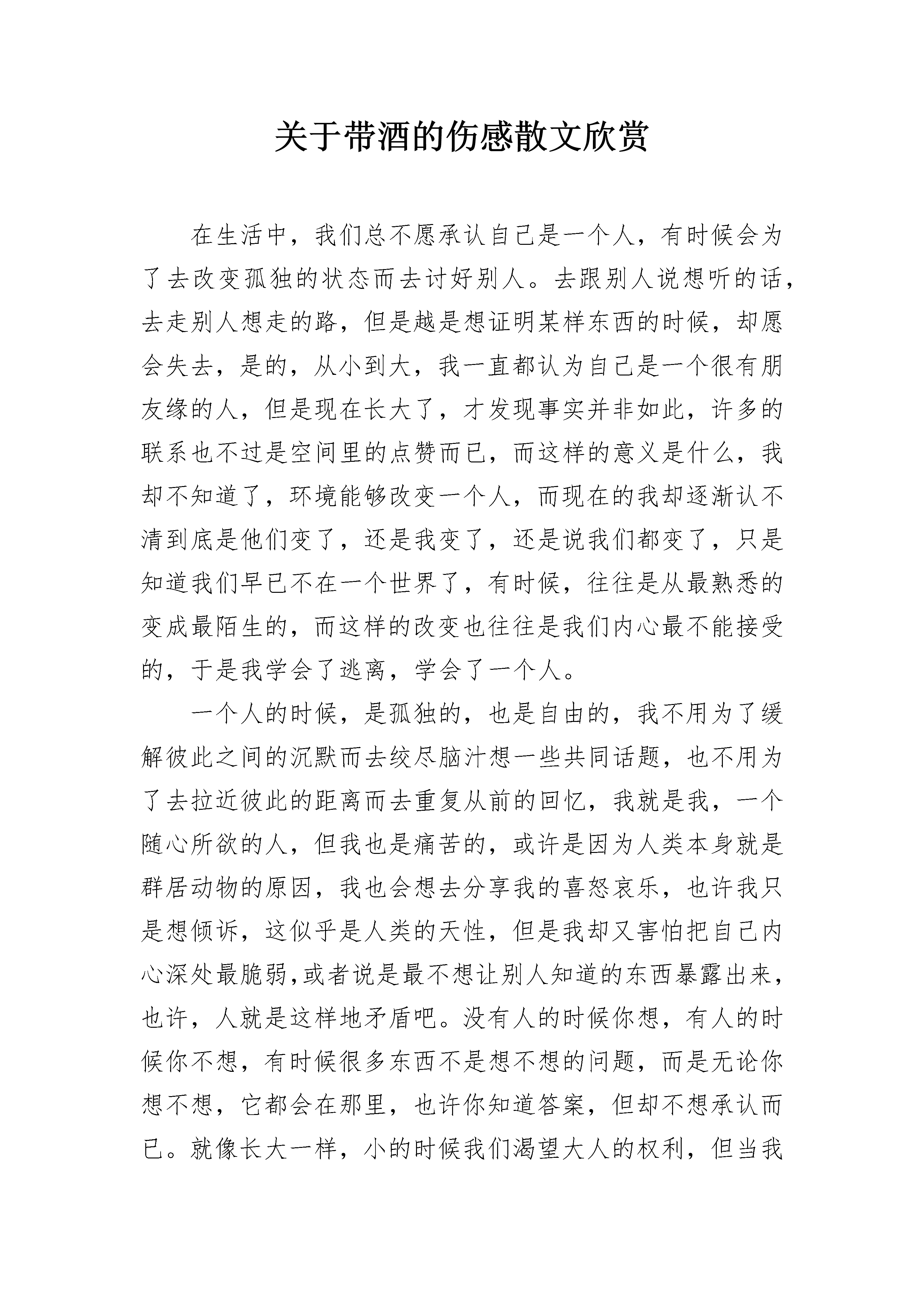 关于带酒的伤感散文欣赏在生活中,我们总不愿承认自己是一个人,有时候会为了去改变孤独的状态而去讨好别人。去跟别人说想听的话,去走别人想走的路,但是越是想证明某样东西的时候,却愿会失去,是的,从小到大,我一直都认为自己是一个很有朋友缘的人,但是现在长大了,才发现事实并非如此,许多的联系也不过是空间里的点赞而已,而这样的意义是什么,我却不知道了,环境能够改变一个人,而现在的我却逐渐认不清到底是他们变了,还是我变了,还是说我们都变了,只是知道我们早已不在一个世界了,有时候,往往是从最熟悉的变成最陌生的,而这样的改变也往往是我们内心最不能接受的,于是我学会了逃离,学会了一个人。一个人的时候,是孤独的,也是自由的,我不用为了缓解彼此之间的沉默而去绞尽脑汁想一些共同话题,也不用为了去拉近彼此的距离而去重复从前的回忆,我就是我,一个随心所欲的人,但我也是痛苦的,或许是因为人类本身就是群居动物的原因,我也会想去分享我的喜怒哀乐,也许我只是想倾诉,这似乎是人类的天性,但是我却又害怕把自己内心深处最脆弱,或者说是最不想让别人知道的东西暴露出来,也许,人就是这样地矛盾吧。没有人的时候你想,有人的时候你不想,有时候很多东西不是想不想的问题,而是无论你想不想,它都会在那里,也许你知道答案,但却不想承认而已。就像长大一样,小的时候我们渴望大人的权利,但当我们成为大人的时候,却又渴望小时候的无知,很多事情我们宁愿不知道,但是现实总会摆在我们身边,它让你无处可逃。其实孤独并不可怕,可怕的是你无法去面对它,一个无法享受孤独的人,是永远都无法真正地独立的。如果你无法拥抱孤独,那么你的生活将会在百无聊赖的消遣中度过,一时的欢愉带来的绝不是真正地快乐,而是无法改变人生的懊悔,当代的年轻人在看似快乐的背后,消遣的除了金钱以外,还有不再回来的青春。也许正是因为你没有真正地享受孤独,所以你的人生才会过得毫无意义,我们缺失的往往是思考,而思考却往往代表孤独,我们太容易去做一件事,但我们却很难去做成一件事。所以我们总是去看别人的结果,却忘了在这成功的背后有多少我们能够做到却轻言放弃的呢?所以才说,在这个世上从不缺少做梦的人,却缺少梦想成真的人,而这样的人,往往是孤独的。是的,你是一个人,终究是一个人,当你真正静下心来一个人的时候,也许你就能够体会到古代的文人墨客们那份寂寥的心,也许你也就明白为什么古时候的人要用写诗的方式来寄托自己的心情,因为你是一个人,你需要情感的宣泄,需要去倾诉自己,所以写诗往往是一种比较理想的方式,也正是因为这样,才让我们的思想穿越千年,去碰撞,去思考,去感悟。所以我说,孤独是一杯酒,有的人觉得它是苦的,有的人觉得它是甜的,而我认为,它是混合的,酒从口入时,也许苦,而细细品尝也可能甜,不要因为一开始的感觉而放弃了尝试,人生有时候往往是在一瞬间改变的,我们无法去预知未来,但我们却能很好地享受当下,无论这杯酒是苦还是甜,我都希望你能喝完,因为你虽知道了故事的开头,却不能知道结尾,人生不是剧本,也不会可以再来一次。关于带酒的伤感散文欣赏篇二:清茶伴烈酒窗外泛起的冬雨拥抱着久违的大地,寒风掀开了喧嚣的雨帘,撕碎了落日的缠绵,柔软的空气像个精灵般濡湿了我梦的书笺,昏黄的灯光在我眼前划出撩人的光晕,那无边的夜就这样毫无防备的来了。手里端着家乡带来的清茶,我倚着书桌,静静的凝视着茶烟的氤氲,不住的便想起了千里之外的秀色江南。那烟雨朦胧恰似现在的夜景,淡淡的雾气使眼前的一切都蒙上了一层娇柔的神秘。只身一人来到北方求学已有数日,回想起来时的叫喧。现在的沉寂使我对人生又有了几分入定。江南就像一盏茶,北方就像一杯酒…江南是柔和的,在烹茶品茗之际,领悟的是茶之静、茶之逸。恰似江南的缥缈,灯影浆声里,天犹寒、水犹寒。梦中丝竹清唱、楼外楼、山外山。那烟波浆声在天地之间飘忽不定,颇有遗世独立之感。那吴越的茶客徜徉于山水之外,释然于物我两忘之境。富在今世,乐在眼前。坦然淡薄,安逸怡然。而北方却是豪迈居多。那香醇的美酒,不同于南方意味绵长的黄酒,北方多产霸气十足的烈酒,那一碗盖过天下,气吞半个中华的烈酒。秋风起兮白云飞,草木零落兮雁南归。多少乱石枭雄屹立山头,一手执酒,一手横剑。无言冷对残阳,笑看世间无常。固然山水不同,地气不同,然不论是茶是酒。体味在人身上的感觉却是相通的。陆羽清茶一杯,释然山林之中,感竹盛风轻,听鸟啼泉鸣,自是悠哉乐哉。而这物我皆空,踏雪无痕的心境又何不与那位斗酒千杯恣欢谑,与尔同消万古仇的太白豪饮之时的心境相通呢。太白放驴于青崖之间,情满于山,意溢于海,一杯烈酒下肚,万般皆空,唯我独尊。悠然于世,戏谑浮名。是故,人生苦短,好也罢,坏也罢。到头来依旧是两袖皆空,万般皆不复。想穿后还谈什么功名利禄,还谈什么经世治国,何不随庄老一起去逍遥游一番......可是,话能这样