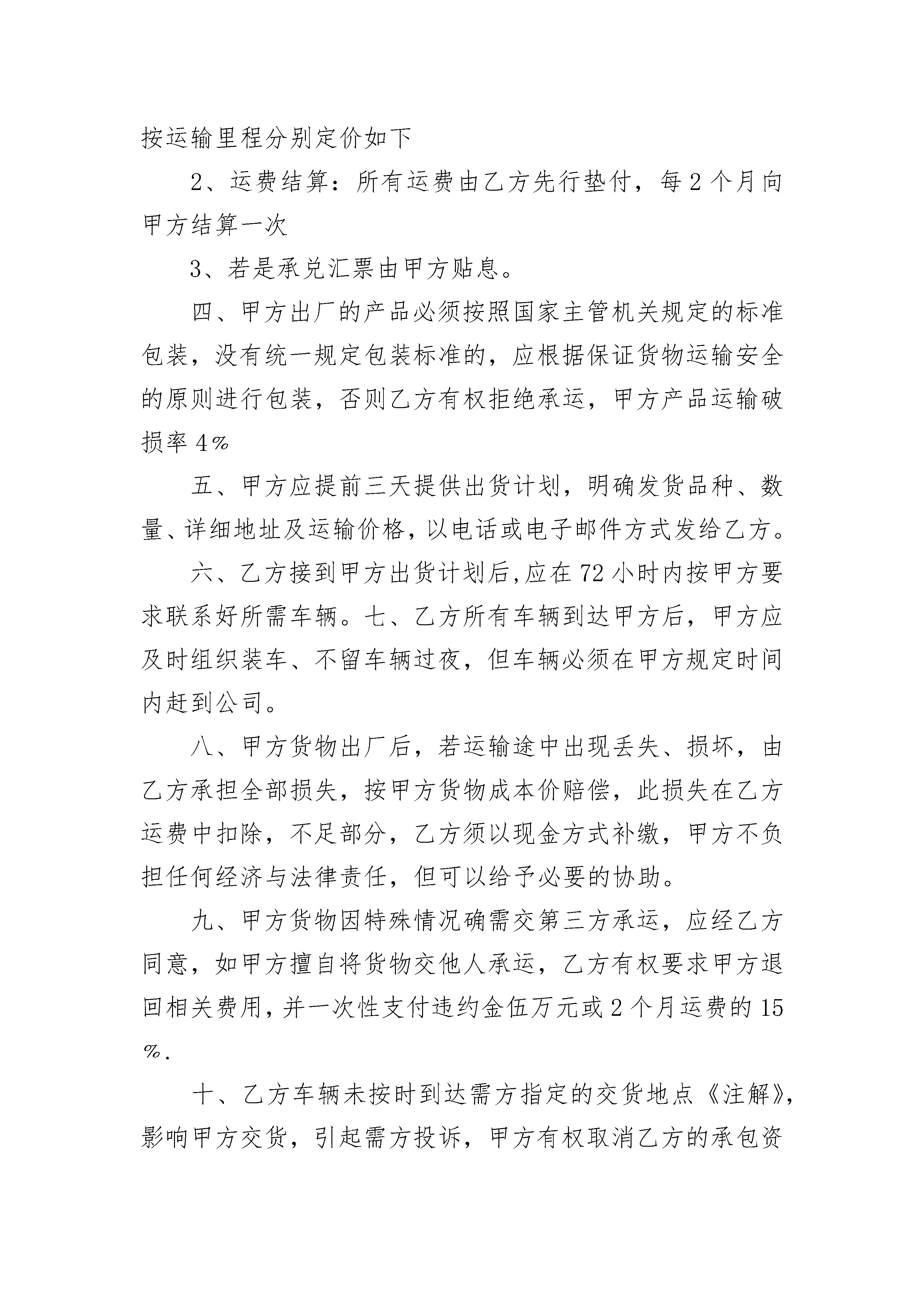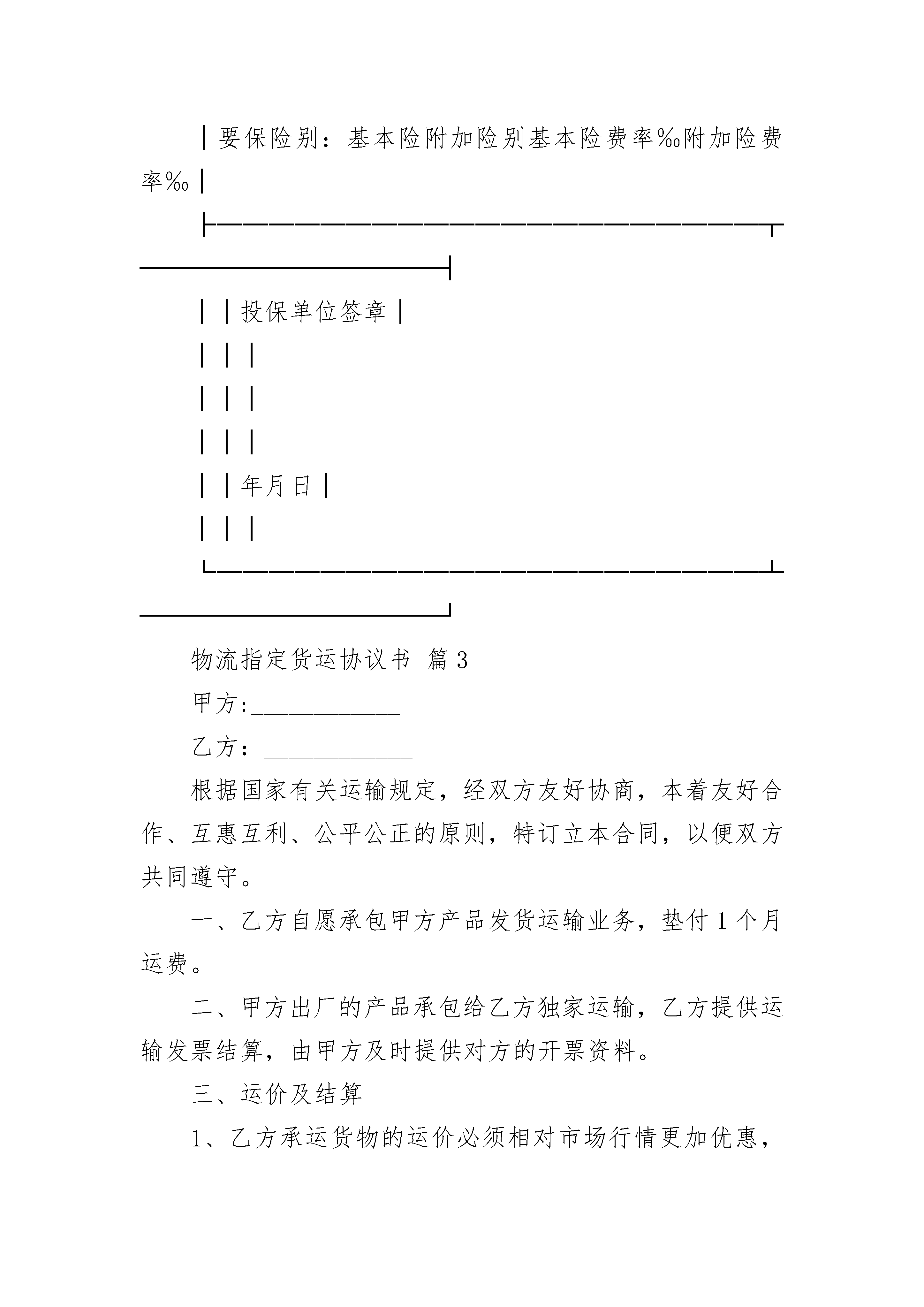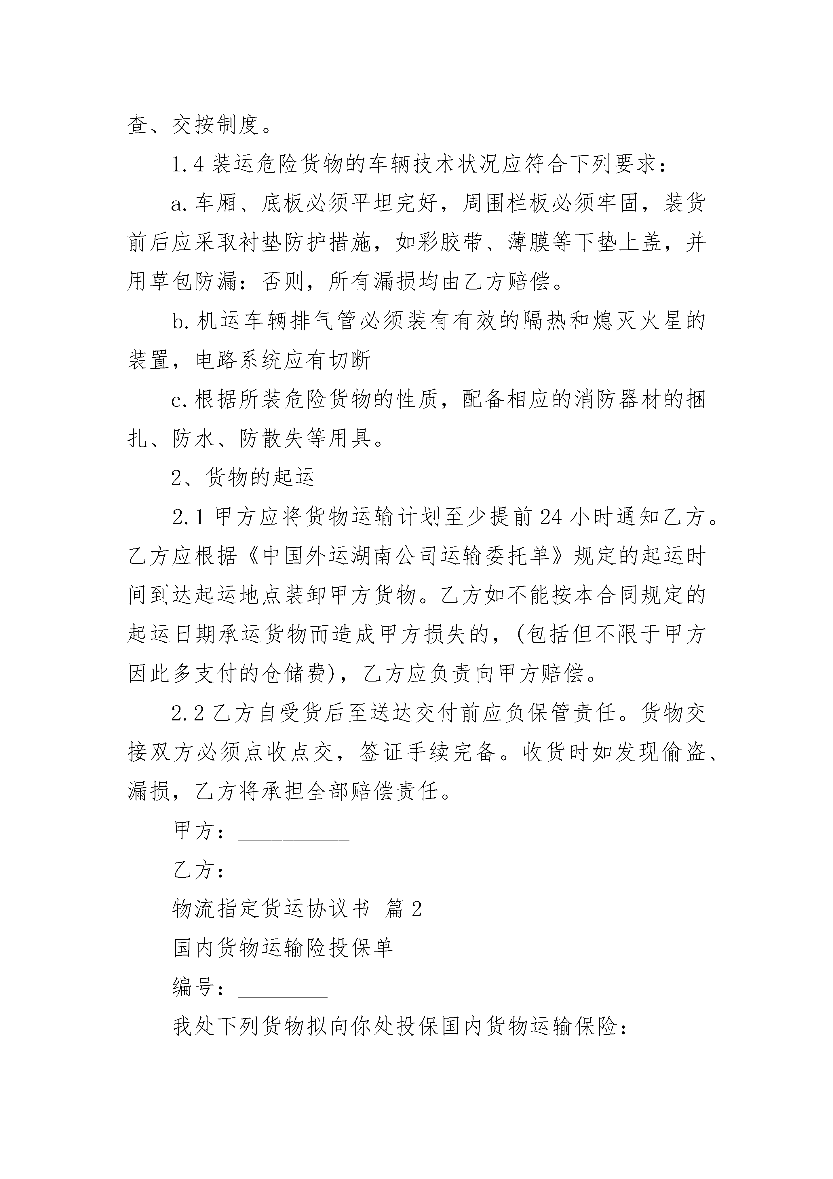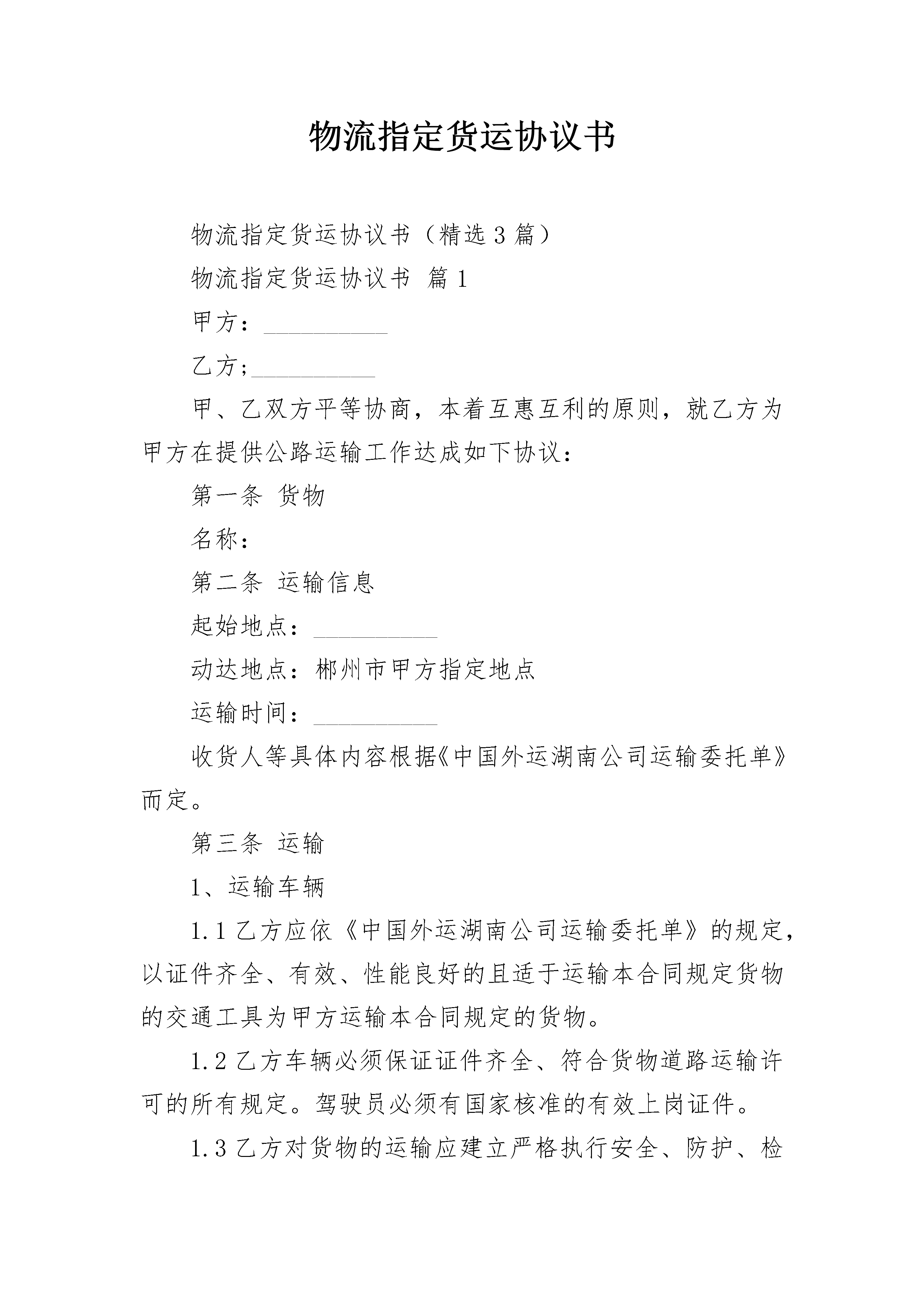 物流指定货运协议书物流指定货运协议书(精选3篇)物流指定货运协议书篇1甲方:__________乙方;__________甲、乙双方平等协商,本着互惠互利的原则,就乙方为甲方在提供公路运输工作达成如下协议:第一条货物名称:第二条运输信息起始地点:__________动达地点:郴州市甲方指定地点运输时间:__________收货人等具体内容根据《中国外运湖南公司运输委托单》而定。第三条运输1、运输车辆1.1乙方应依《中国外运湖南公司运输委托单》的规定,以证件齐全、有效、性能良好的且适于运输本合同规定货物的交通工具为甲方运输本合同规定的货物。1.2乙方车辆必须保证证件齐全、符合货物道路运输许可的所有规定。驾驶员必须有国家核准的有效上岗证件。1.3乙方对货物的运输应建立严格执行安全、防护、检查、交按制度。1.4装运危险货物的车辆技术状况应符合下列要求:a.车厢、底板必须平坦完好,周围栏板必须牢固,装货前后应采取衬垫防护措施,如彩胶带、薄膜等下垫上盖,并用草包防漏:否则,所有漏损均由乙方赔偿。b.机运车辆排气管必须装有有效的隔热和熄灭火星的装置,电路系统应有切断c.根据所装危险货物的性质,配备相应的消防器材的捆扎、防水、防散失等用具。2、货物的起运2.1甲方应将货物运输计划至少提前24小时通知乙方。乙方应根据《中国外运湖南公司运输委托单》规定的起运时间到达起运地点装卸甲方货物。乙方如不能按本合同规定的起运日期承运货物而造成甲方损失的,(包括但不限于甲方因此多支付的仓储费),乙方应负责向甲方赔偿。2.2乙方自受货后至送达交付前应负保管责任。货物交接双方必须点收点交,签证手续完备。收货时如发现偷盗、漏损,乙方将承担全部赔偿责任。甲方:__________乙方:__________物流指定货运协议书篇2国内货物运输险投保单编号:____我处下列货物拟向你处投保国内货物运输保险:┌──────────────────────────────────┐│被保险人│├────────┬──────┬───┬────────┬─────┤│标记或发票号码│保险货物名称│件数│提单或通知单号次│保险金额│├────────┼──────┼───┼────────┼─────┤││││││││││││││││││││││││├──────┬─┴──────┴┬──┴────────┼───┬─┤│运输工具││约启│赔款偿│││││年月日││││(及转载工具)││于运│付地点││├──────┼─────────┼──┬────────┴───┴─┤│运输路线││转载││││自经到│地点││├──────┴─────────┴──┴──────────────┤│要保险别:基本险附加险别基本险费率‰附加险费率‰│├─────────────────────┬────────────┤││投保单位签章││││││││││││年月日││││└─────────────────────┴────────────┘物流指定货运协议书篇3甲方:____________乙方:____________根据国家有关运输规定,经双方友好协商,本着友好合作、互惠互利、公平公正的原则,特订立本合同,以便双方共同遵守。一、乙方自愿承包甲方产品发货运输业务,垫付1个月运费。二、甲方出厂的产品承包给乙方独家运输,乙方提供运输发票结算,由甲方及时提供对方的开票资料。三、运价及结算1、乙方承运货物的运价必须相对市场行情更加优惠,按运输里程分别定价如下2、运费结算:所有运费由乙方先行垫付,每2个月向甲方结算一次3、若是承兑汇票由甲方贴息。四、甲方出厂的产品必须按照国家主管机关规定的标准包装,没有统一规定包装标准的,应根据保证货物运输安全的原则进行包装,否则乙方有权拒绝承运,甲方产品运输破损率4﹪五、甲方应提前三天提供出货计划,明确发货品种、数量、详细地址及运输价格,以电话或电子邮件方式发给乙方。六、乙方接到甲方出货计划后,应在72小时内按甲方要求联系好所需车辆。七、乙方所有车辆到达甲方后,甲方应及时组织装车、不留车辆过夜,但车辆必须在甲方规定时间内赶到公司。八、甲方货物出厂后,若运输途中出现丢失、损坏,由乙方承担全部损失,按甲方货物成本价赔偿,此损失在乙方运费中扣除,不足部分,乙方须以现金方式补缴,甲方不负担任何经济与法律责任,但可以给予必要的协助。九、甲方货物因特殊情况确需交第三方承运,应经乙方同意,如甲方擅自将货物交他人承运,乙方有权要求甲方退回相关费用,并一次性支付违约金伍万元或2个月运费的15﹪.十、乙方车辆未按时到达需方指定的交货地点《注解》,影响甲方交货,引起需方投诉,甲方有权取消乙方的承包资格,并要求乙方承担全部经济赔偿责任。十一、本协议经双方签字盖章生效,一式两份,双