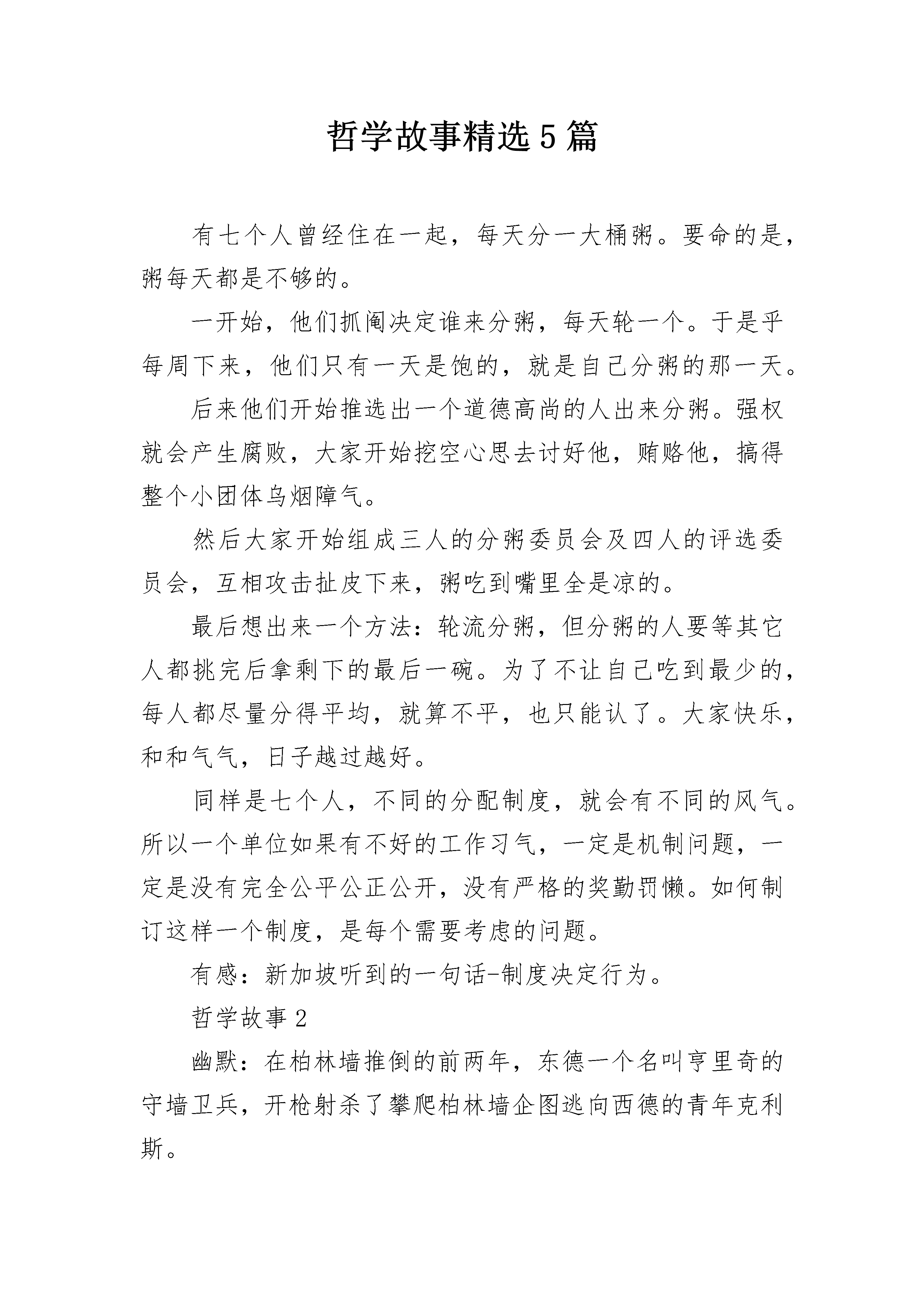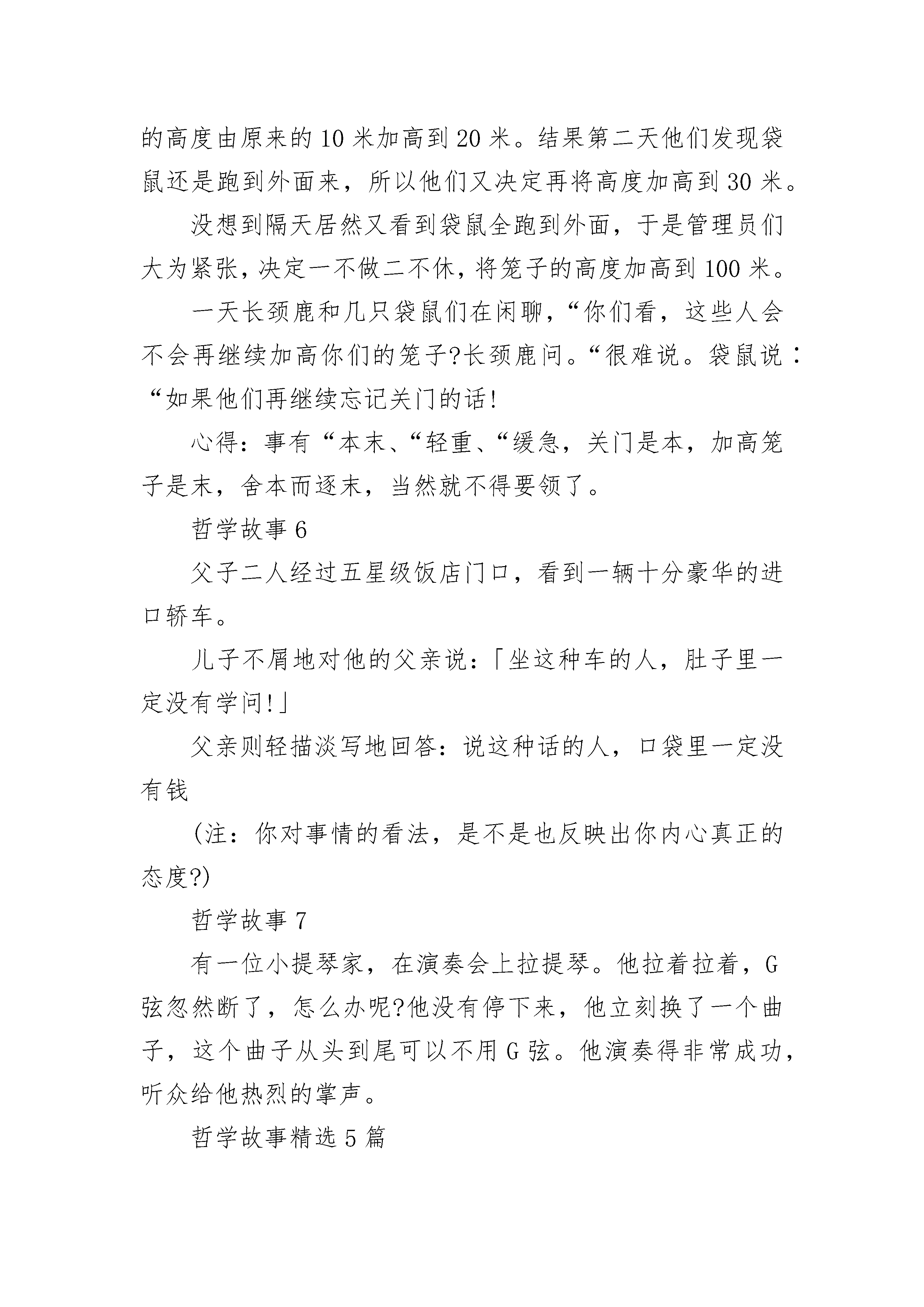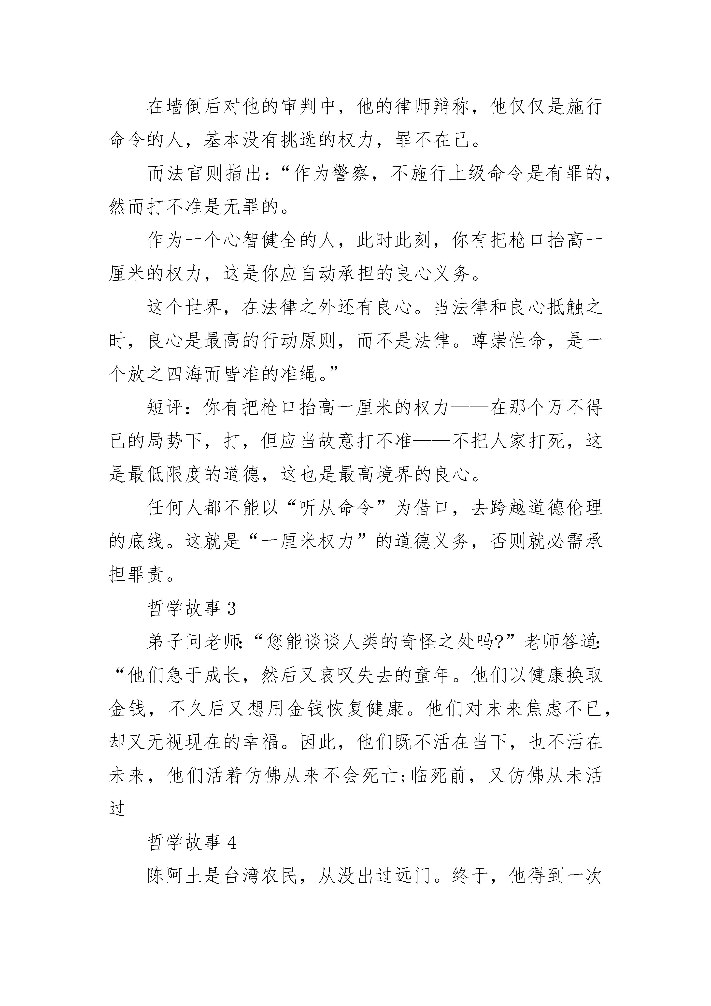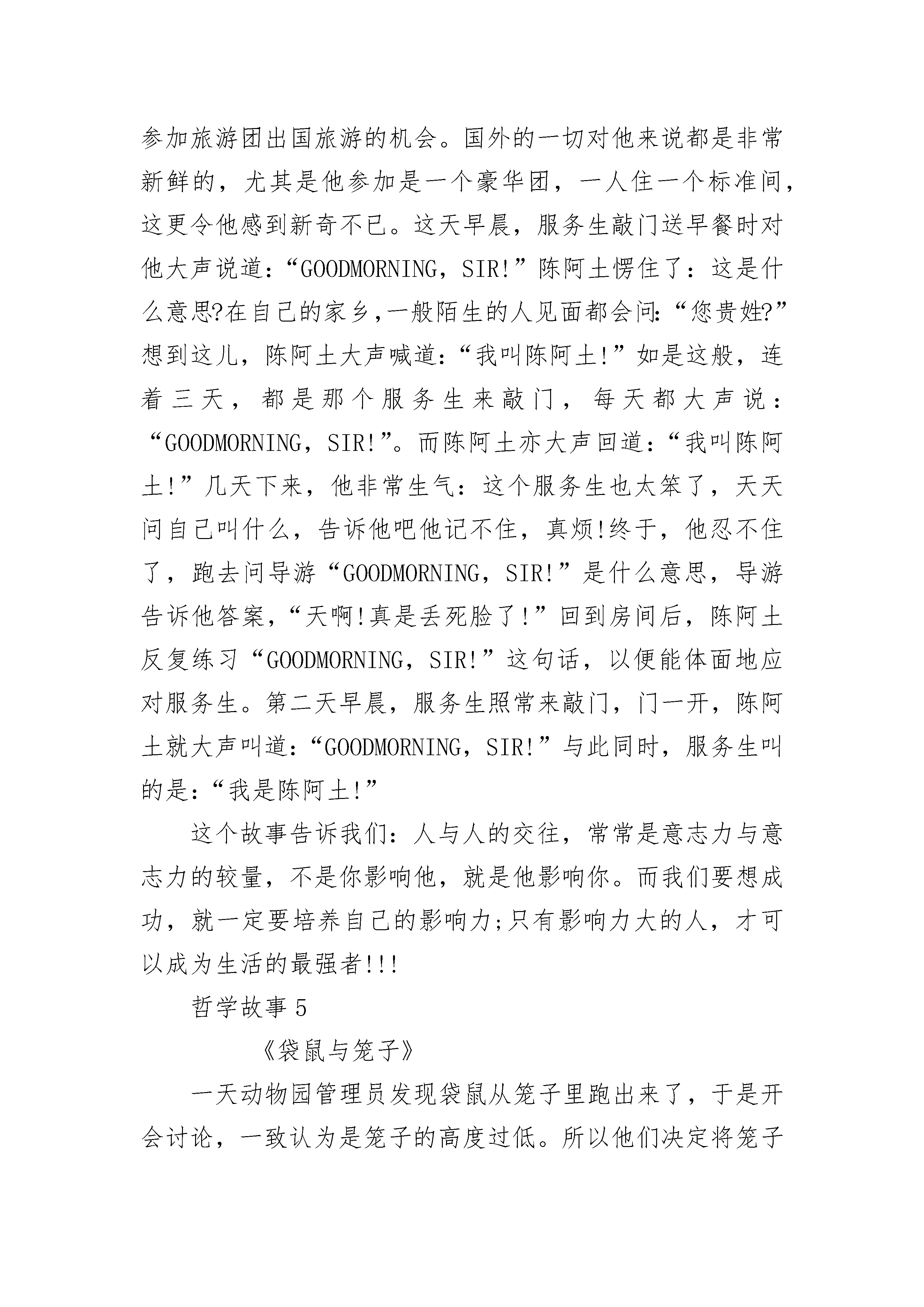 哲学故事精选5篇有七个人曾经住在一起,每天分一大桶粥。要命的是,粥每天都是不够的。一开始,他们抓阄决定谁来分粥,每天轮一个。于是乎每周下来,他们只有一天是饱的,就是自己分粥的那一天。后来他们开始推选出一个道德高尚的人出来分粥。强权就会产生腐败,大家开始挖空心思去讨好他,贿赂他,搞得整个小团体乌烟障气。然后大家开始组成三人的分粥委员会及四人的评选委员会,互相攻击扯皮下来,粥吃到嘴里全是凉的。最后想出来一个方法:轮流分粥,但分粥的人要等其它人都挑完后拿剩下的最后一碗。为了不让自己吃到最少的,每人都尽量分得平均,就算不平,也只能认了。大家快乐,和和气气,日子越过越好。同样是七个人,不同的分配制度,就会有不同的风气。所以一个单位如果有不好的工作习气,一定是机制问题,一定是没有完全公平公正公开,没有严格的奖勤罚懒。如何制订这样一个制度,是每个需要考虑的问题。有感:新加坡听到的一句话-制度决定行为。哲学故事2幽默:在柏林墙推倒的前两年,东德一个名叫亨里奇的守墙卫兵,开枪射杀了攀爬柏林墙企图逃向西德的青年克利斯。在墙倒后对他的审判中,他的律师辩称,他仅仅是施行命令的人,基本没有挑选的权力,罪不在己。而法官则指出:“作为警察,不施行上级命令是有罪的,然而打不准是无罪的。作为一个心智健全的人,此时此刻,你有把枪口抬高一厘米的权力,这是你应自动承担的良心义务。这个世界,在法律之外还有良心。当法律和良心抵触之时,良心是最高的行动原则,而不是法律。尊崇性命,是一个放之四海而皆准的准绳。”短评:你有把枪口抬高一厘米的权力——在那个万不得已的局势下,打,但应当故意打不准——不把人家打死,这是最低限度的道德,这也是最高境界的良心。任何人都不能以“听从命令”为借口,去跨越道德伦理的底线。这就是“一厘米权力”的道德义务,否则就必需承担罪责。哲学故事3弟子问老师:“您能谈谈人类的奇怪之处吗?”老师答道:“他们急于成长,然后又哀叹失去的童年。他们以健康换取金钱,不久后又想用金钱恢复健康。他们对未来焦虑不已,却又无视现在的幸福。因此,他们既不活在当下,也不活在未来,他们活着仿佛从来不会死亡;临死前,又仿佛从未活过哲学故事4陈阿土是台湾农民,从没出过远门。终于,他得到一次参加旅游团出国旅游的机会。国外的一切对他来说都是非常新鲜的,尤其是他参加是一个豪华团,一人住一个标准间,这更令他感到新奇不已。这天早晨,服务生敲门送早餐时对他大声说道:“GOODMORNING,SIR!”陈阿土愣住了:这是什么意思?在自己的家乡,一般陌生的人见面都会问:“您贵姓?”想到这儿,陈阿土大声喊道:“我叫陈阿土!”如是这般,连着三天,都是那个服务生来敲门,每天都大声说:“GOODMORNING,SIR!”。而陈阿土亦大声回道:“我叫陈阿土!”几天下来,他非常生气:这个服务生也太笨了,天天问自己叫什么,告诉他吧他记不住,真烦!终于,他忍不住了,跑去问导游“GOODMORNING,SIR!”是什么意思,导游告诉他答案,“天啊!真是丢死脸了!”回到房间后,陈阿土反复练习“GOODMORNING,SIR!”这句话,以便能体面地应对服务生。第二天早晨,服务生照常来敲门,门一开,陈阿土就大声叫道:“GOODMORNING,SIR!”与此同时,服务生叫的是:“我是陈阿土!”这个故事告诉我们:人与人的交往,常常是意志力与意志力的较量,不是你影响他,就是他影响你。而我们要想成功,就一定要培养自己的影响力;只有影响力大的人,才可以成为生活的最强者!!!哲学故事5《袋鼠与笼子》一天动物园管理员发现袋鼠从笼子里跑出来了,于是开会讨论,一致认为是笼子的高度过低。所以他们决定将笼子的高度由原来的10米加高到20米。结果第二天他们发现袋鼠还是跑到外面来,所以他们又决定再将高度加高到30米。没想到隔天居然又看到袋鼠全跑到外面,于是管理员们大为紧张,决定一不做二不休,将笼子的高度加高到100米。一天长颈鹿和几只袋鼠们在闲聊,“你们看,这些人会不会再继续加高你们的笼子?长颈鹿问。“很难说。袋鼠说∶“如果他们再继续忘记关门的话!心得:事有“本末、“轻重、“缓急,关门是本,加高笼子是末,舍本而逐末,当然就不得要领了。哲学故事6父子二人经过五星级饭店门口,看到一辆十分豪华的进口轿车。儿子不屑地对他的父亲说:「坐这种车的人,肚子里一定没有学问!」父亲则轻描淡写地回答:说这种话的人,口袋里一定没有钱(注:你对事情的看法,是不是也反映出你内心真正的态度?)哲学故事7有一位小提琴家,在演奏会上拉提琴。他拉着拉着,G弦忽然断了,怎么办呢?他没有停下来,他立刻换了一个曲子,这个曲子从头到尾可以不用G弦。他演奏得非常成功,听众给他热烈的掌声。哲学故事精选5篇