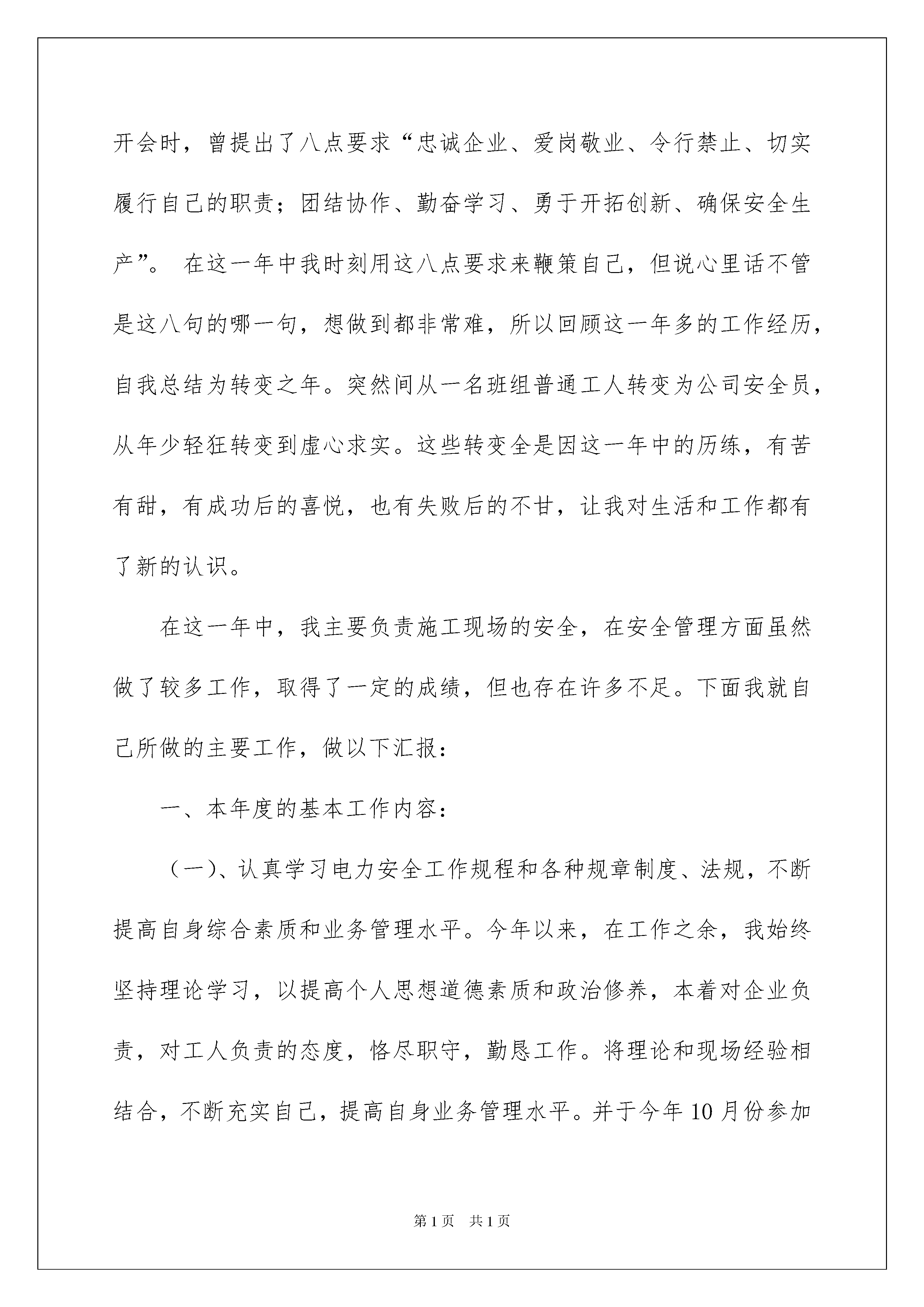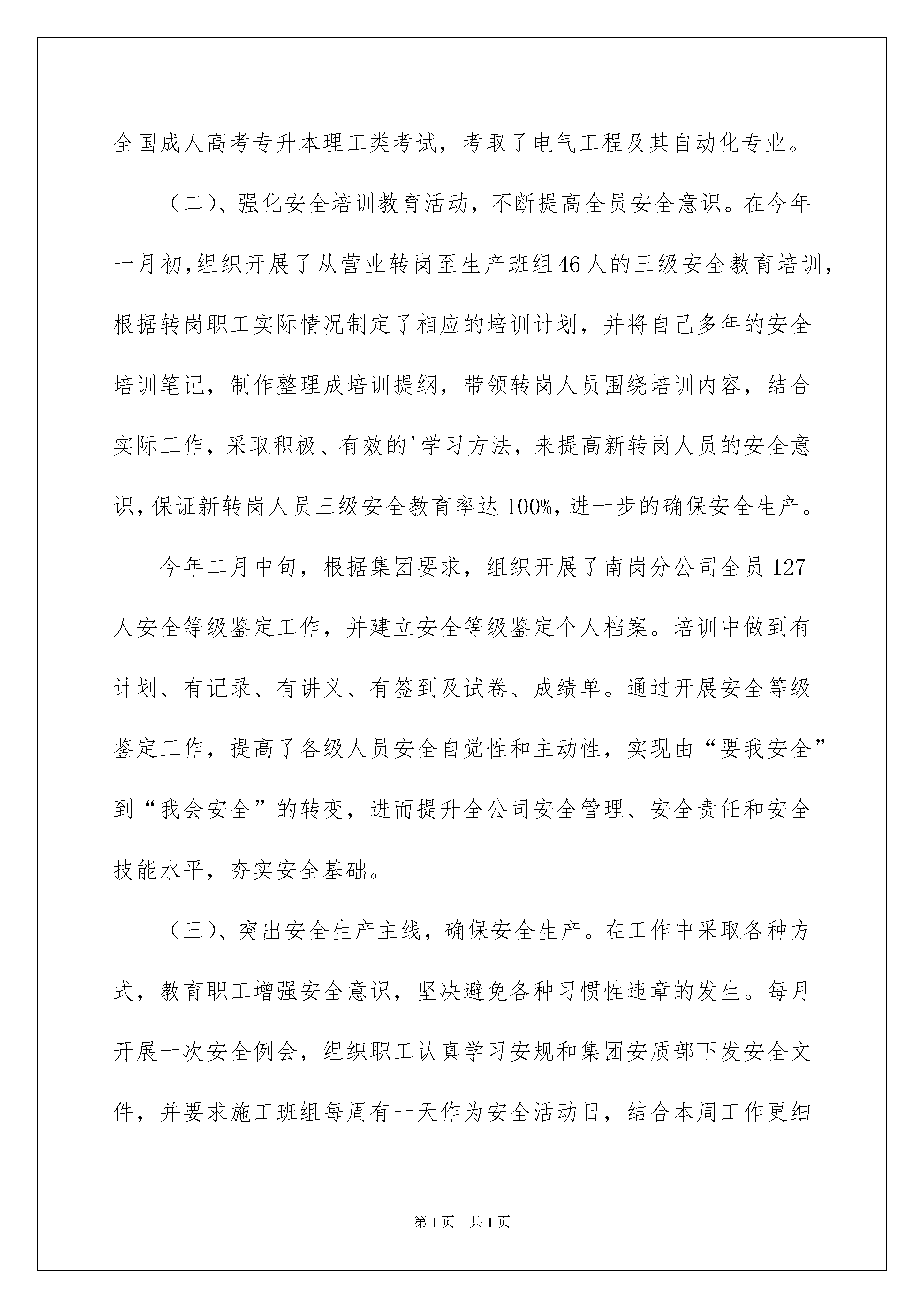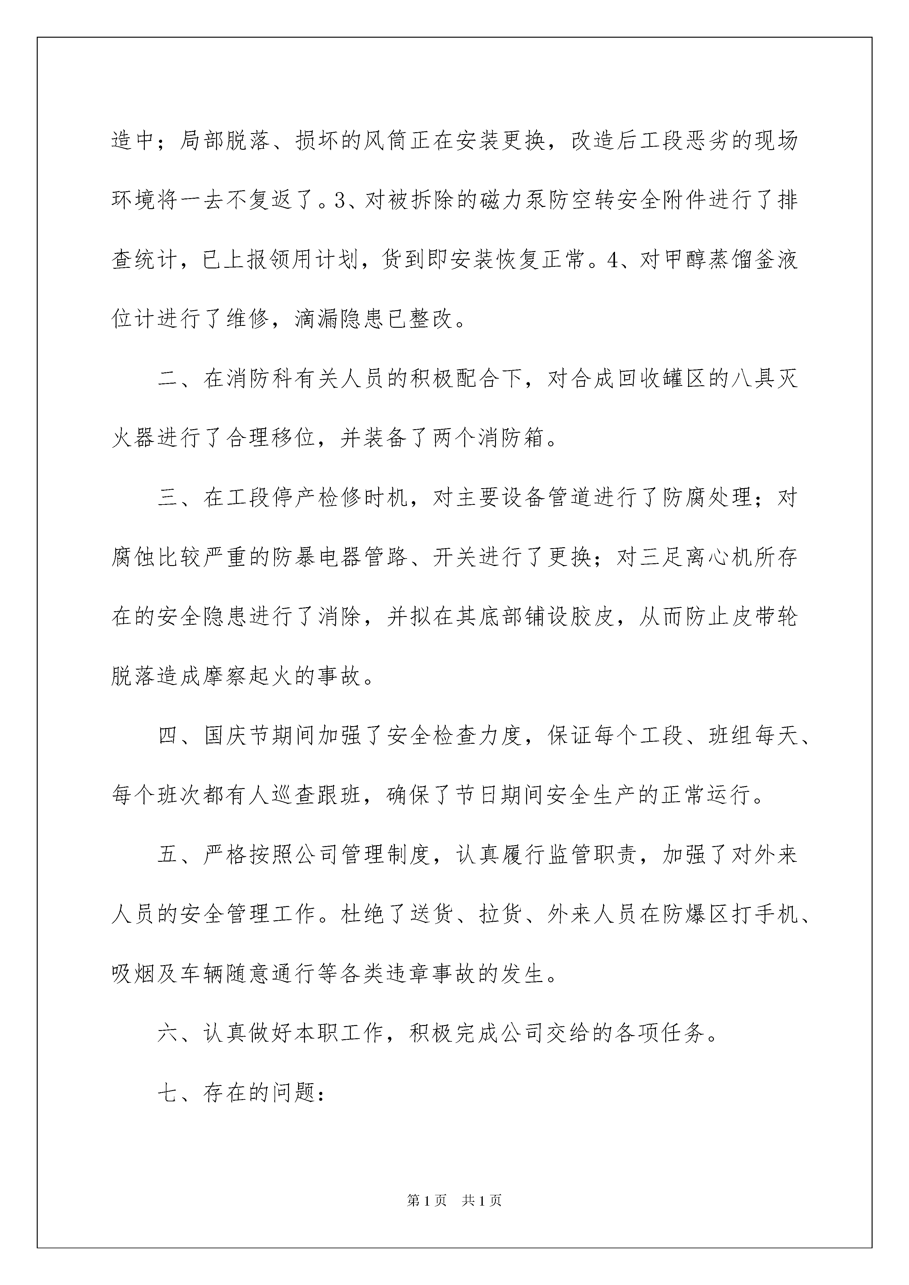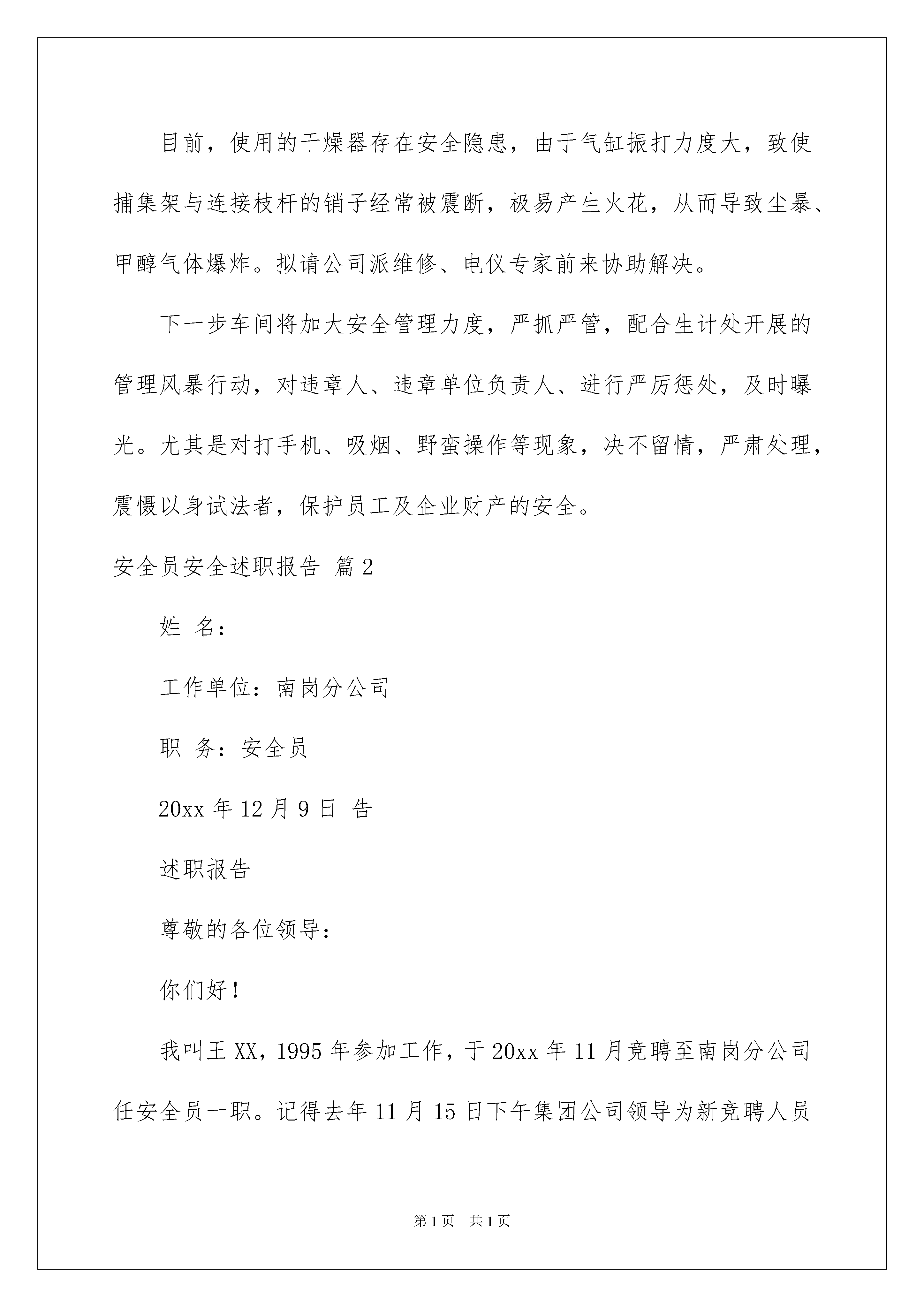 2022有关安全员安全述职报告四篇有关安全员安全述职报告四篇在经济飞速发展的今天,我们使用报告的情况越来越多,我们在写报告的时候要注意涵盖报告的基本要素。那么,报告到底怎么写才合适呢?以下是我精心整理的安全员安全述职报告4篇,欢迎阅读,希望大家能够喜欢。安全员安全述职报告篇1我是从事的车间安全员,车间各类安全事故在我的精心预防中发生为零,实现了安全生产与高效生产的有机结合。现就本月生产安全工作报告如下:一、认真贯彻落实安全消防、安全专业管理工作例会精神,利用车间调度会对本月生产安全工作了安排和布置,对生产管理中心组织的综合大所查处的问题进行了积极的整改和落实,主要有:1、对部分岗位使用的玻璃流量计护罩安全防护情况进行了排查,对缺失挡板和护罩的玻璃流量计进行了统计并整改。2、利用工段停产检修时机,对整个通风系统进行了维修和改造:目前,裂解罐独立通风系统正在改造中;局部脱落、损坏的风筒正在安装更换,改造后工段恶劣的现场环境将一去不复返了。3、对被拆除的磁力泵防空转安全附件进行了排查统计,已上报领用计划,货到即安装恢复正常。4、对甲醇蒸馏釜液位计进行了维修,滴漏隐患已整改。二、在消防科有关人员的积极配合下,对合成回收罐区的八具灭火器进行了合理移位,并装备了两个消防箱。三、在工段停产检修时机,对主要设备管道进行了防腐处理;对腐蚀比较严重的防暴电器管路、开关进行了更换;对三足离心机所存在的安全隐患进行了消除,并拟在其底部铺设胶皮,从而防止皮带轮脱落造成摩察起火的事故。四、国庆节期间加强了安全检查力度,保证每个工段、班组每天、每个班次都有人巡查跟班,确保了节日期间安全生产的正常运行。五、严格按照公司管理制度,认真履行监管职责,加强了对外来人员的安全管理工作。杜绝了送货、拉货、外来人员在防爆区打手机、吸烟及车辆随意通行等各类违章事故的发生。六、认真做好本职工作,积极完成公司交给的各项任务。七、存在的问题:目前,使用的干燥器存在安全隐患,由于气缸振打力度大,致使捕集架与连接枝杆的销子经常被震断,极易产生火花,从而导致尘暴、甲醇气体爆炸。拟请公司派维修、电仪专家前来协助解决。下一步车间将加大安全管理力度,严抓严管,配合生计处开展的管理风暴行动,对违章人、违章单位负责人、进行严厉惩处,及时曝光。尤其是对打手机、吸烟、野蛮操作等现象,决不留情,严肃处理,震慑以身试法者,保护员工及企业财产的安全。安全员安全述职报告篇2姓名:工作单位:南岗分公司职务:安全员20xx年12月9日告述职报告尊敬的各位领导:你们好!我叫王XX,1995年参加工作,于20xx年11月竞聘至南岗分公司任安全员一职。记得去年11月15日下午集团公司领导为新竞聘人员开会时,曾提出了八点要求“忠诚企业、爱岗敬业、令行禁止、切实履行自己的职责;团结协作、勤奋学习、勇于开拓创新、确保安全生产”。在这一年中我时刻用这八点要求来鞭策自己,但说心里话不管是这八句的哪一句,想做到都非常难,所以回顾这一年多的工作经历,自我总结为转变之年。突然间从一名班组普通工人转变为公司安全员,从年少轻狂转变到虚心求实。这些转变全是因这一年中的历练,有苦有甜,有成功后的喜悦,也有失败后的不甘,让我对生活和工作都有了新的认识。在这一年中,我主要负责施工现场的安全,在安全管理方面虽然做了较多工作,取得了一定的成绩,但也存在许多不足。下面我就自己所做的主要工作,做以下汇报:一、本年度的基本工作内容:(一)、认真学习电力安全工作规程和各种规章制度、法规,不断提高自身综合素质和业务管理水平。今年以来,在工作之余,我始终坚持理论学习,以提高个人思想道德素质和政治修养,本着对企业负责,对工人负责的态度,恪尽职守,勤恳工作。将理论和现场经验相结合,不断充实自己,提高自身业务管理水平。并于今年10月份参加全国成人高考专升本理工类考试,考取了电气工程及其自动化专业。(二)、强化安全培训教育活动,不断提高全员安全意识。在今年一月初,组织开展了从营业转岗至生产班组46人的三级安全教育培训,根据转岗职工实际情况制定了相应的培训计划,并将自己多年的安全培训笔记,制作整理成培训提纲,带领转岗人员围绕培训内容,结合实际工作,采取积极、有效的'学习方法,来提高新转岗人员的安全意识,保证新转岗人员三级安全教育率达100%,进一步的确保安全生产。今年二月中旬,根据集团要求,组织开展了南岗分公司全员127人安全等级鉴定工作,并建立安全等级鉴定个人档案。培训中做到有计划、有记录、有讲义、有签到及试卷、成绩单。通过开展安全等级鉴定工作,提高了各级人员安全自觉性和主动性,实现由“要我安全”到“我会安全”
