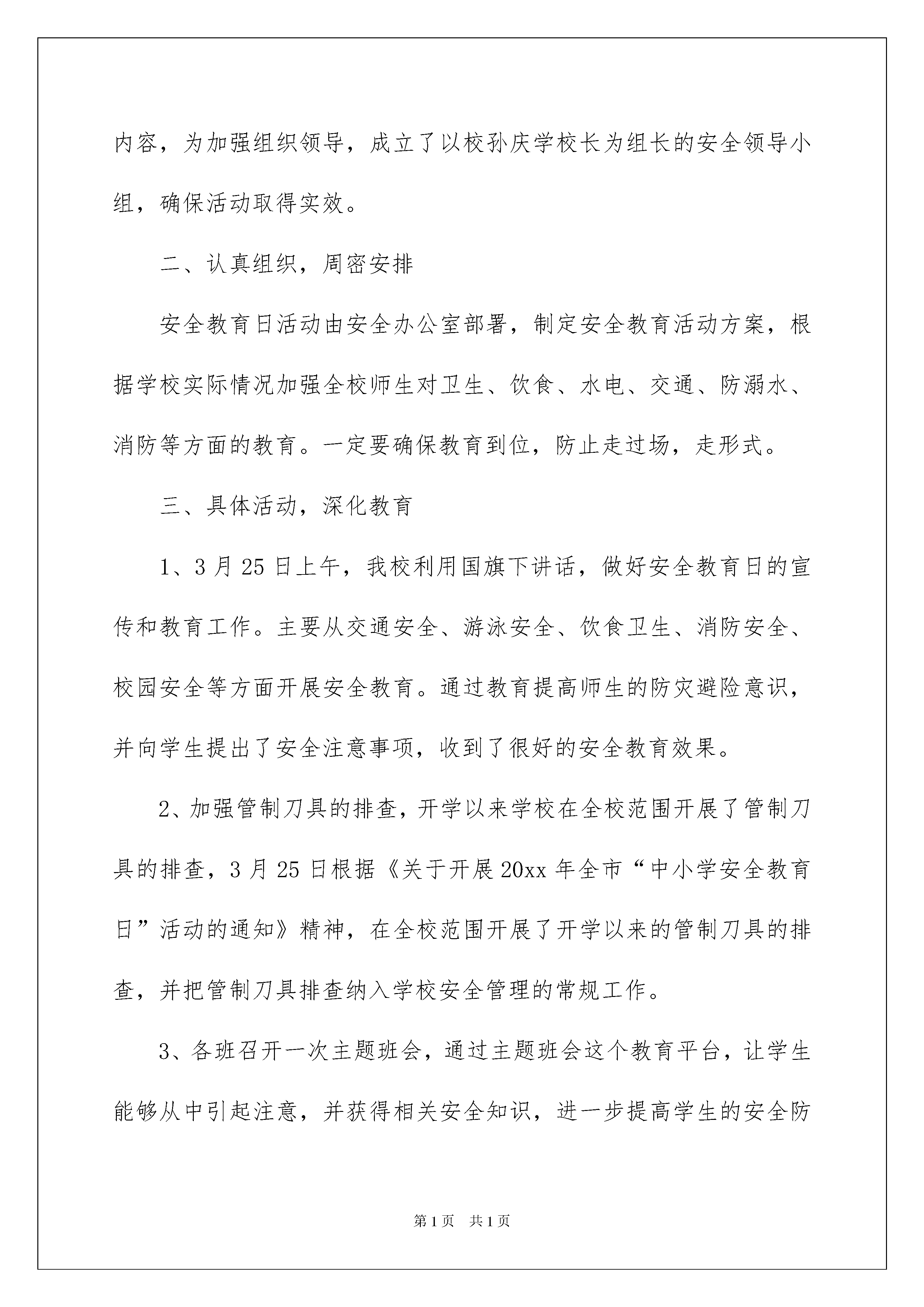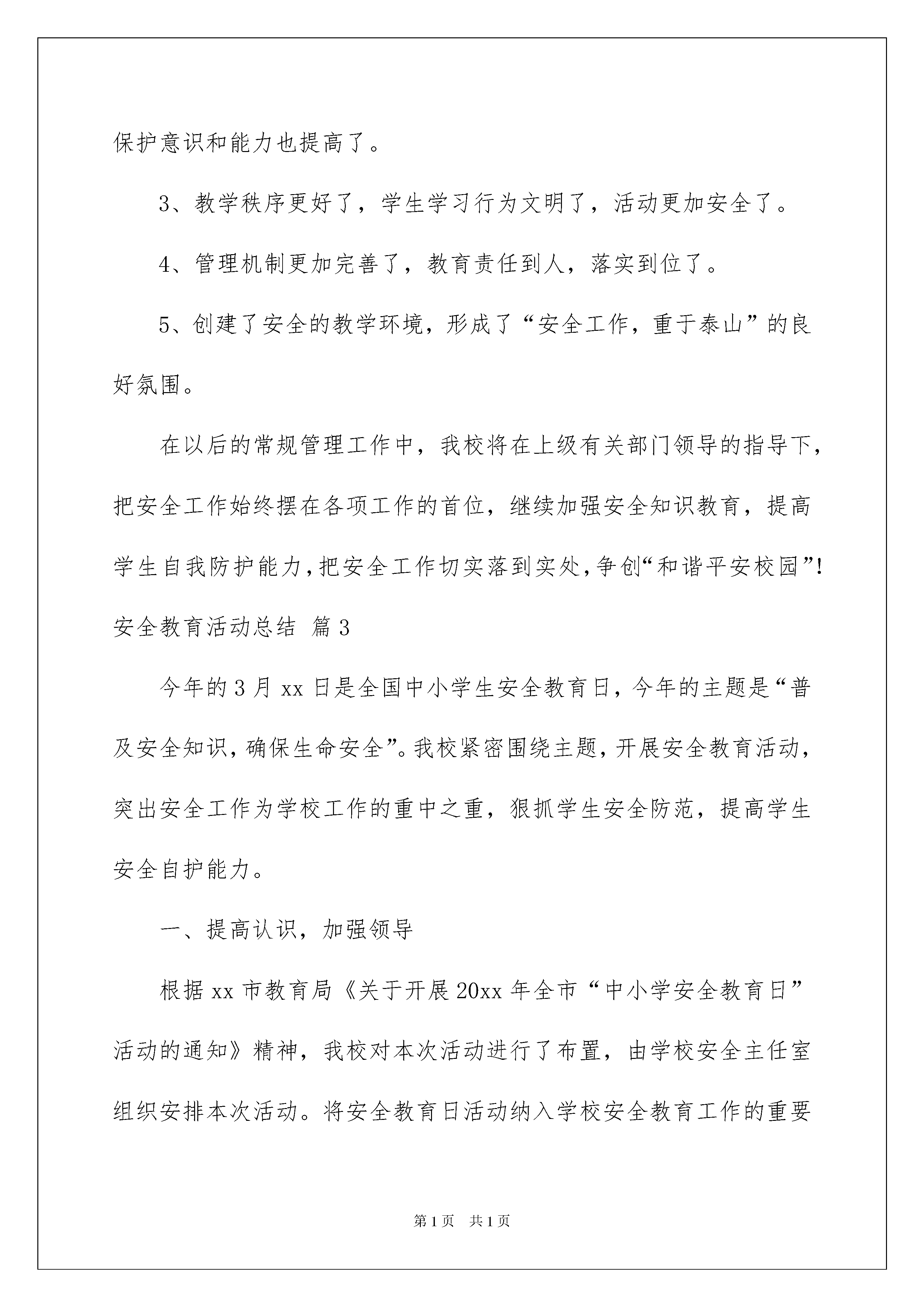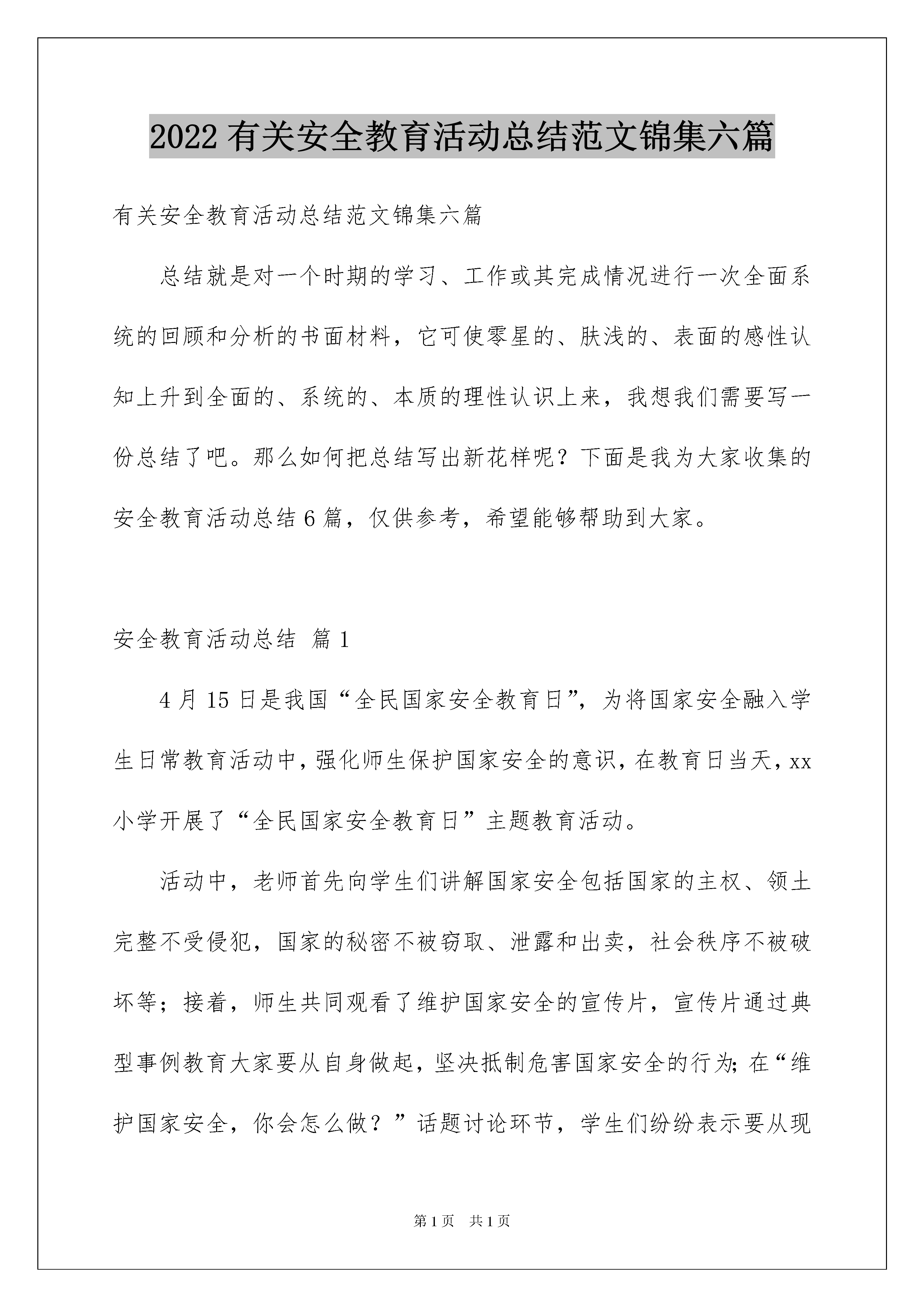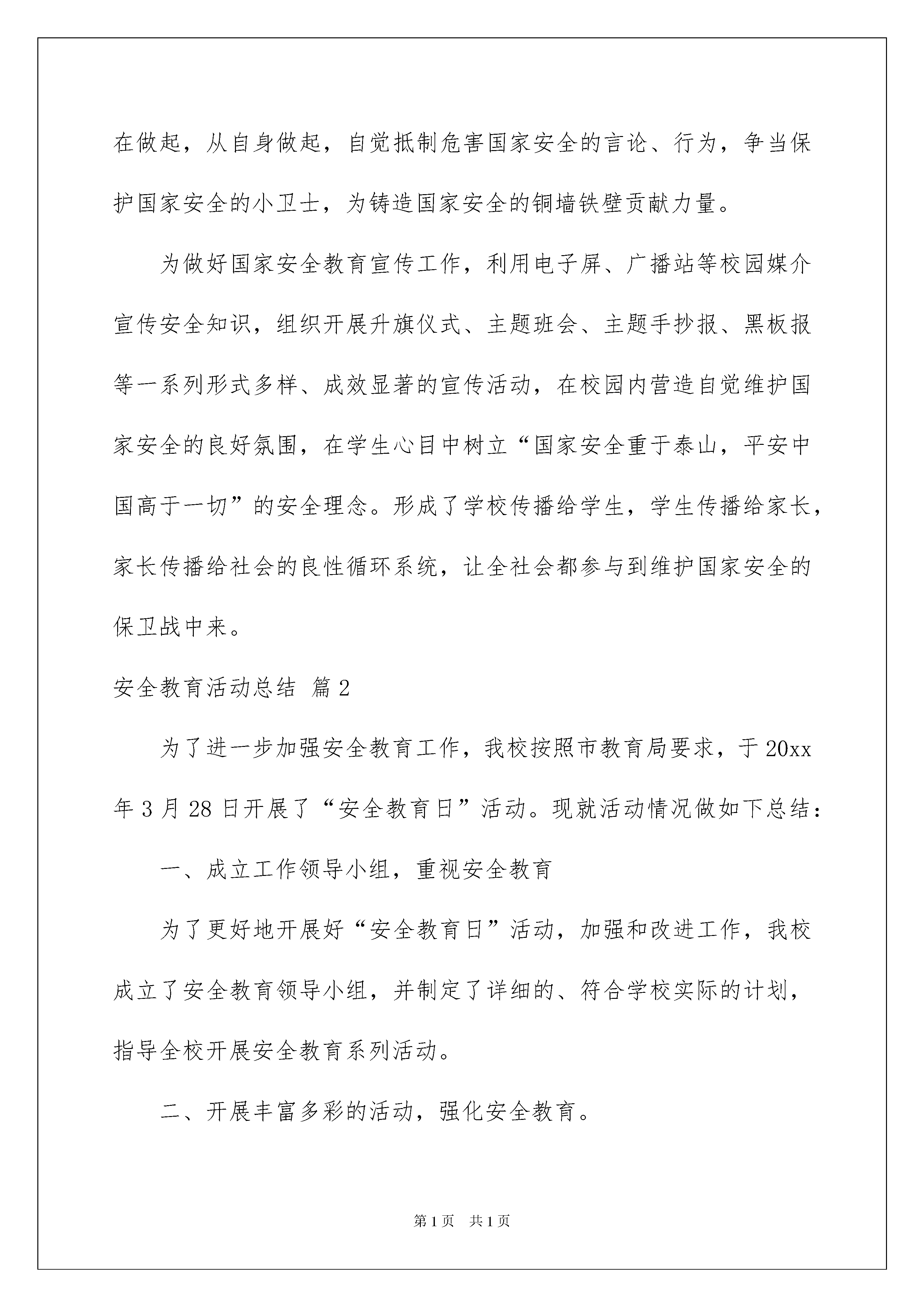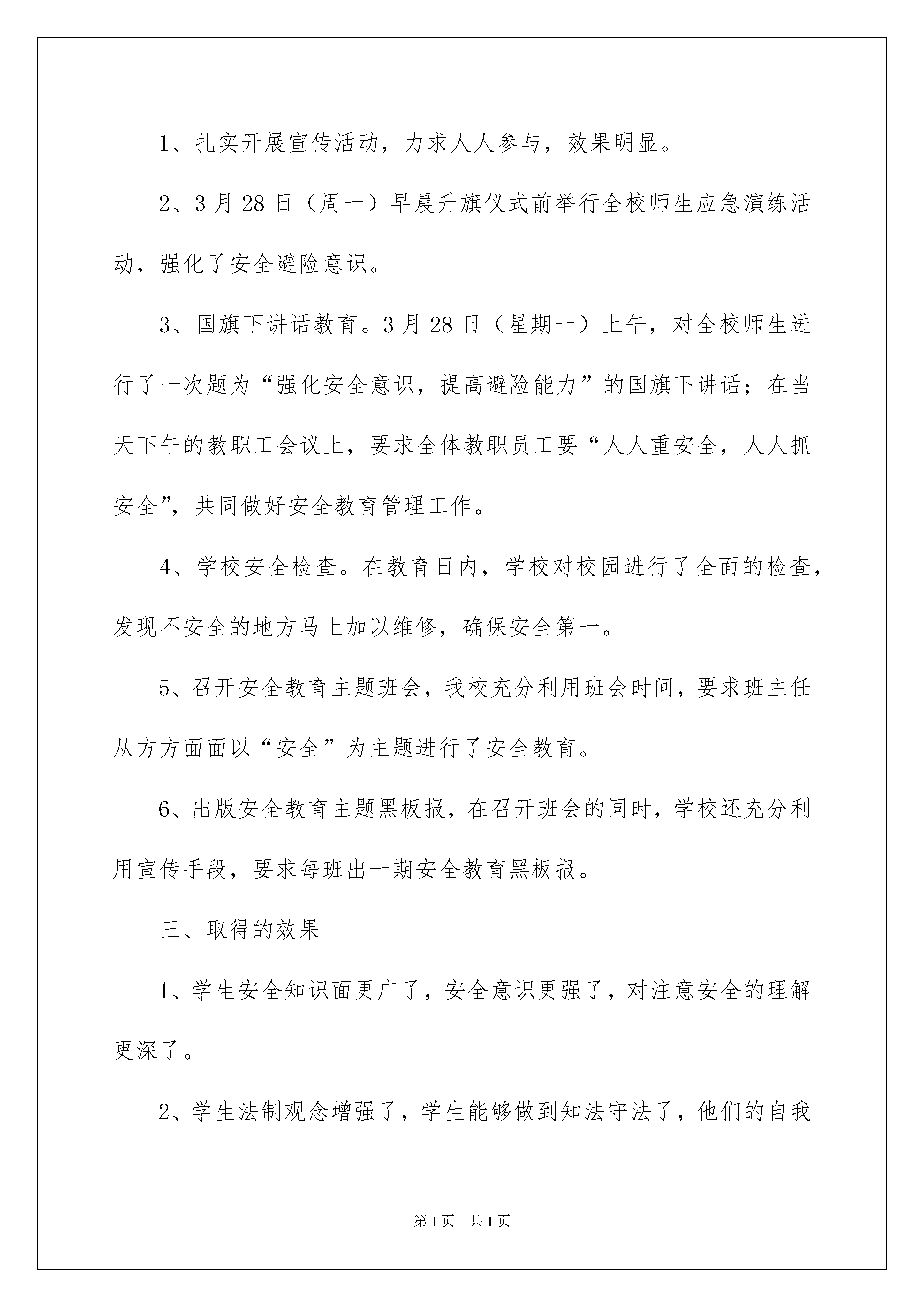 2022有关安全教育活动总结范文锦集六篇有关安全教育活动总结范文锦集六篇总结就是对一个时期的学习、工作或其完成情况进行一次全面系统的回顾和分析的书面材料,它可使零星的、肤浅的、表面的感性认知上升到全面的、系统的、本质的理性认识上来,我想我们需要写一份总结了吧。那么如何把总结写出新花样呢?下面是我为大家收集的安全教育活动总结6篇,仅供参考,希望能够帮助到大家。安全教育活动总结篇14月15日是我国“全民国家安全教育日”,为将国家安全融入学生日常教育活动中,强化师生保护国家安全的意识,在教育日当天,xx小学开展了“全民国家安全教育日”主题教育活动。活动中,老师首先向学生们讲解国家安全包括国家的主权、领土完整不受侵犯,国家的秘密不被窃取、泄露和出卖,社会秩序不被破坏等;接着,师生共同观看了维护国家安全的宣传片,宣传片通过典型事例教育大家要从自身做起,坚决抵制危害国家安全的行为;在“维护国家安全,你会怎么做?”话题讨论环节,学生们纷纷表示要从现在做起,从自身做起,自觉抵制危害国家安全的言论、行为,争当保护国家安全的小卫士,为铸造国家安全的铜墙铁壁贡献力量。为做好国家安全教育宣传工作,利用电子屏、广播站等校园媒介宣传安全知识,组织开展升旗仪式、主题班会、主题手抄报、黑板报等一系列形式多样、成效显著的宣传活动,在校园内营造自觉维护国家安全的良好氛围,在学生心目中树立“国家安全重于泰山,平安中国高于一切”的安全理念。形成了学校传播给学生,学生传播给家长,家长传播给社会的良性循环系统,让全社会都参与到维护国家安全的保卫战中来。安全教育活动总结篇2为了进一步加强安全教育工作,我校按照市教育局要求,于20xx年3月28日开展了“安全教育日”活动。现就活动情况做如下总结:一、成立工作领导小组,重视安全教育为了更好地开展好“安全教育日”活动,加强和改进工作,我校成立了安全教育领导小组,并制定了详细的、符合学校实际的计划,指导全校开展安全教育系列活动。二、开展丰富多彩的活动,强化安全教育。1、扎实开展宣传活动,力求人人参与,效果明显。2、3月28日(周一)早晨升旗仪式前举行全校师生应急演练活动,强化了安全避险意识。3、国旗下讲话教育。3月28日(星期一)上午,对全校师生进行了一次题为“强化安全意识,提高避险能力”的国旗下讲话;在当天下午的教职工会议上,要求全体教职员工要“人人重安全,人人抓安全”,共同做好安全教育管理工作。4、学校安全检查。在教育日内,学校对校园进行了全面的检查,发现不安全的地方马上加以维修,确保安全第一。5、召开安全教育主题班会,我校充分利用班会时间,要求班主任从方方面面以“安全”为主题进行了安全教育。6、出版安全教育主题黑板报,在召开班会的同时,学校还充分利用宣传手段,要求每班出一期安全教育黑板报。三、取得的效果1、学生安全知识面更广了,安全意识更强了,对注意安全的理解更深了。2、学生法制观念增强了,学生能够做到知法守法了,他们的自我保护意识和能力也提高了。3、教学秩序更好了,学生学习行为文明了,活动更加安全了。4、管理机制更加完善了,教育责任到人,落实到位了。5、创建了安全的教学环境,形成了“安全工作,重于泰山”的良好氛围。在以后的常规管理工作中,我校将在上级有关部门领导的指导下,把安全工作始终摆在各项工作的首位,继续加强安全知识教育,提高学生自我防护能力,把安全工作切实落到实处,争创“和谐平安校园”!安全教育活动总结篇3今年的3月xx日是全国中小学生安全教育日,今年的主题是“普及安全知识,确保生命安全”。我校紧密围绕主题,开展安全教育活动,突出安全工作为学校工作的重中之重,狠抓学生安全防范,提高学生安全自护能力。一、提高认识,加强领导根据xx市教育局《关于开展20xx年全市“中小学安全教育日”活动的通知》精神,我校对本次活动进行了布置,由学校安全主任室组织安排本次活动。将安全教育日活动纳入学校安全教育工作的重要内容,为加强组织领导,成立了以校孙庆学校长为组长的安全领导小组,确保活动取得实效。二、认真组织,周密安排安全教育日活动由安全办公室部署,制定安全教育活动方案,根据学校实际情况加强全校师生对卫生、饮食、水电、交通、防溺水、消防等方面的教育。一定要确保教育到位,防止走过场,走形式。三、具体活动,深化教育1、3月25日上午,我校利用国旗下讲话,做好安全教育日的宣传和教育工作。主要从交通安全、游泳安全、饮食卫生、消防安全、校园安全等方面开展安全教育。通过教育提高师生的防灾避险意识,并向学生提出了安全注意事项,收到了很好的安全教育效果。2、加强管制刀具的排查,开学以来学校在全校范