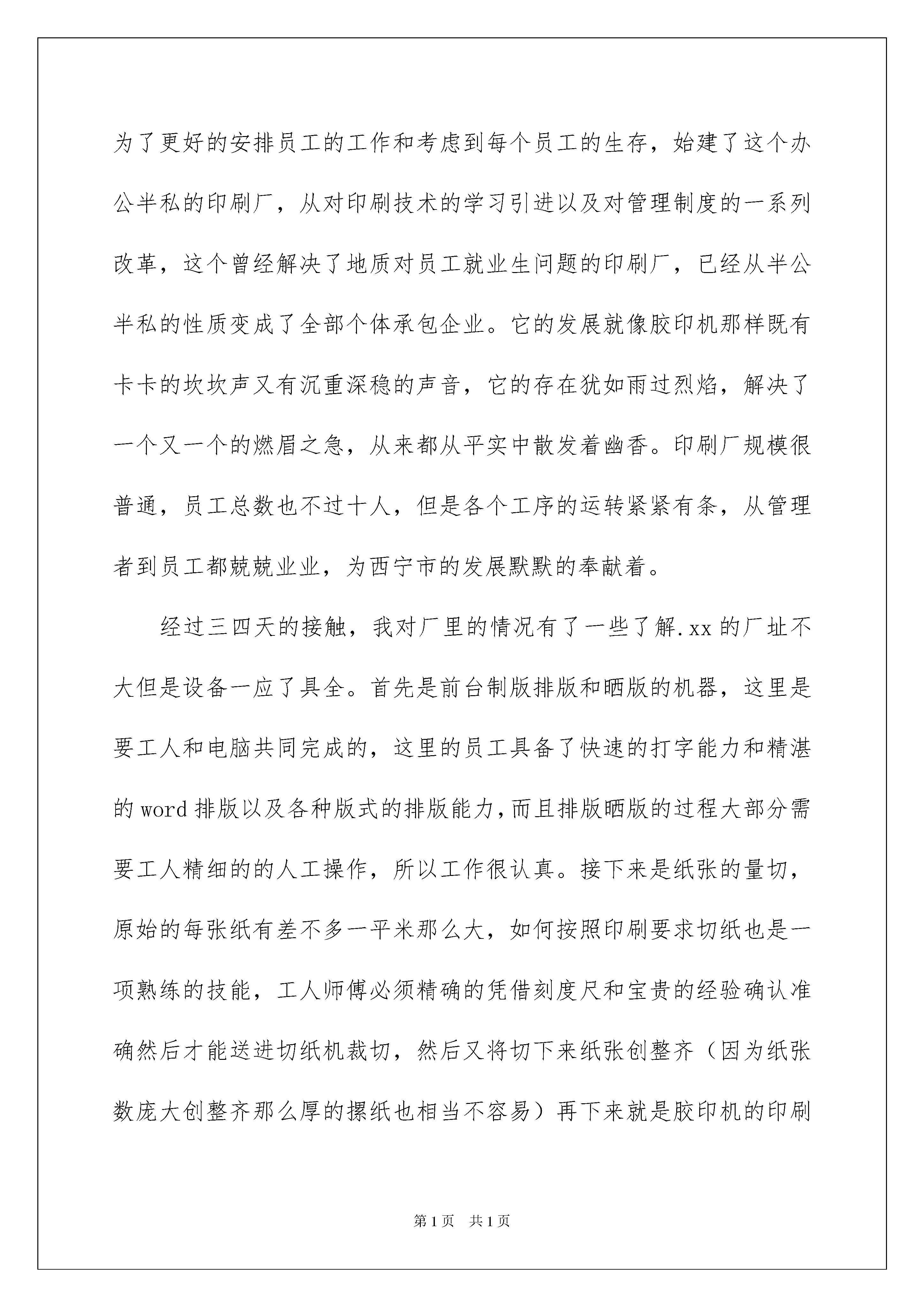 2022有关实践实习报告模板汇总9篇有关实践实习报告模板汇总9篇在经济发展迅速的今天,报告与我们的生活紧密相连,报告中涉及到专业性术语要解释清楚。我们应当如何写报告呢?下面是我帮大家整理的实践实习报告9篇,供大家参考借鉴,希望可以帮助到有需要的朋友。实践实习报告篇1xxxx年的冬天是我进入xx的的第二个寒假,在这个寒假,我走进了家乡的印刷企业,短暂的短工实践,我对家乡的发展和大学生就业增进了认识.感叹变迁只为这次的身临其境。初入实践2月10号我走进了xx市城西xx印刷厂。平日不问那一本本整齐的课本稿纸是何为,也不闻爽目的黑体方块字的来由。进入车间我才发现那些美观大体的知识的载体一次次新生的过程,产生于这个充满隆隆机械噪音和分不清是香是臭的油墨味的车间。xx印刷厂始出于青海煤田地质132对,当时正值经济改革时期,为了更好的安排员工的工作和考虑到每个员工的生存,始建了这个办公半私的印刷厂,从对印刷技术的学习引进以及对管理制度的一系列改革,这个曾经解决了地质对员工就业生问题的印刷厂,已经从半公半私的性质变成了全部个体承包企业。它的发展就像胶印机那样既有卡卡的坎坎声又有沉重深稳的声音,它的存在犹如雨过烈焰,解决了一个又一个的燃眉之急,从来都从平实中散发着幽香。印刷厂规模很普通,员工总数也不过十人,但是各个工序的运转紧紧有条,从管理者到员工都兢兢业业,为西宁市的发展默默的奉献着。经过三四天的接触,我对厂里的情况有了一些了解.xx的厂址不大但是设备一应了具全。首先是前台制版排版和晒版的机器,这里是要工人和电脑共同完成的,这里的员工具备了快速的打字能力和精湛的word排版以及各种版式的排版能力,而且排版晒版的过程大部分需要工人精细的的人工操作,所以工作很认真。接下来是纸张的量切,原始的每张纸有差不多一平米那么大,如何按照印刷要求切纸也是一项熟练的技能,工人师傅必须精确的凭借刻度尺和宝贵的经验确认准确然后才能送进切纸机裁切,然后又将切下来纸张创整齐(因为纸张数庞大创整齐那么厚的摞纸也相当不容易)再下来就是胶印机的印刷了,千万张白纸就这样在层层技术和汗水中沾上隽永的墨迹。然而这才是我们所见完整书册的雏形之作,还要经过装订工人们的装订审查方能出炉。装订工人大多数是女性,原因大概是此项工序须要更加的认真仔细,倘若装订上出现了问题那么真可谓是前功尽弃。随着一边边的胶印和一支支书针的穿梭,美观的成品书册便已然获得新生。在xx印刷厂的几天实践当中,由于我不曾掌握什么印刷技术,所以安排到装订车间,观摩实践。装订中有一项技术看起潇洒来轻松自若,但操作起来相当的难,那就是把印刷出来的纸张创整齐,真的要熟才能生巧啊。几天的实践中我搬纸,配叶然后学着创纸,感慨颇多。xx印刷厂,小小默默,曾经体现了我国经济改革变迁的过程,从来都承担着社会建设的重任。在这里有我从大学生到实践者的过程。熟练的技能才是良好就业的保障。实践转角实践调查的第五天我协同厂里的工作人员送货。说是要到位于西宁市生物园区的虎彩印刷公司送印刷资料。开始我有些不解,干嘛印刷厂要给印刷厂送印刷资料呢。经和我同去的厂里的工作人员介绍起,我了解到,虎彩印刷厂是中国虎彩集团下分的一个大型印刷公司,其规模是青海甚至西北地区同印刷行业中首屈一指的。他还谈到,青海虎彩印刷公司作为虎彩集团的全资子公司,是一家从事高档烟包,彩盒印刷的港资企业。公司起初注册资本3000万元人民币,占地面积3.5万平方米,座落在西宁蓬勃发展的生物产业园区,近年计划投资1亿元人民币,分二期投资。现一期工程投资5000万元,于20xx年5月已投产运营。投产后的销售总额达1亿元,实现利税20xx万元。青海虎彩印刷公司依托集团在印刷行业内的饿技术优势和先进管理制度及模式,秉承“以人为本,互惠互利,开拓创新”的经营理念,以刚柔并汲的“虎彩文化”和锲而不舍的“虎彩精神”为彻底改变青海“一等产品,二等价格,三等包装”的落后局面,提高知名优秀地方产品的附加值,将会起到举足轻重的作用,在未来几年里,在各级政府及社会各界的大力支持下在虎彩全体同仁的支持下,青海虎彩将成为青藏高原上一颗灿烂的明珠。了解到这些我感到很激动,因为这将是我的家乡青海经济腾飞的重要保证。到了虎彩印刷公司,我才发现它与我短工实践的xx印刷厂的区别。首先是管理的更为正规性。公司大门有4位保安轮班职守,严把进出公司的来访客的信息,确保安全,而且就工作态度而言,也更加正规,全部都是标准的普通话。进入办公楼,便有门迎小姐热情的欢迎,然后按照预约与否顺序安排休息茶几。期间我看到了很多来应聘的人,很多是大学刚毕业的,或者管理专业,或者机械专业的。