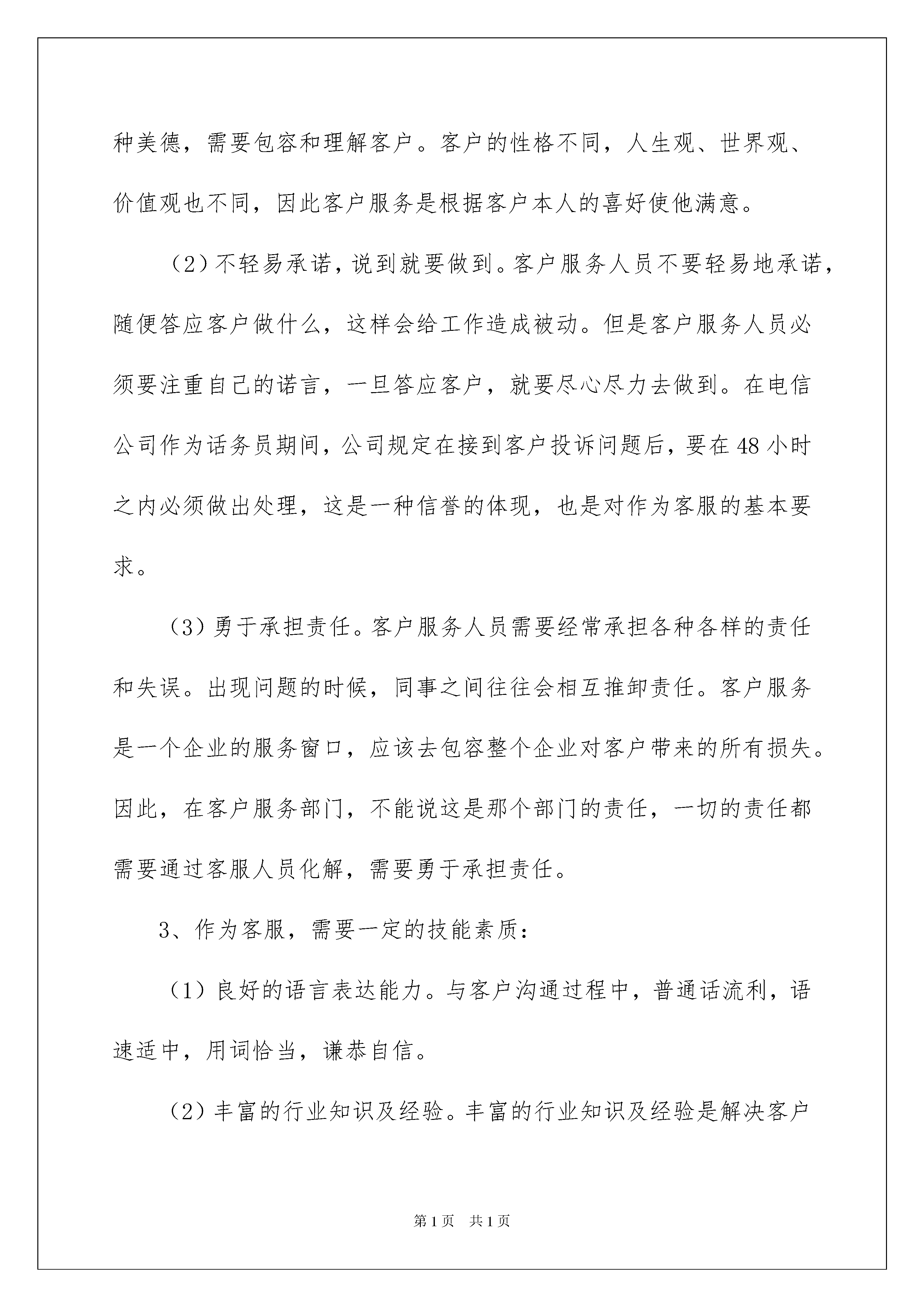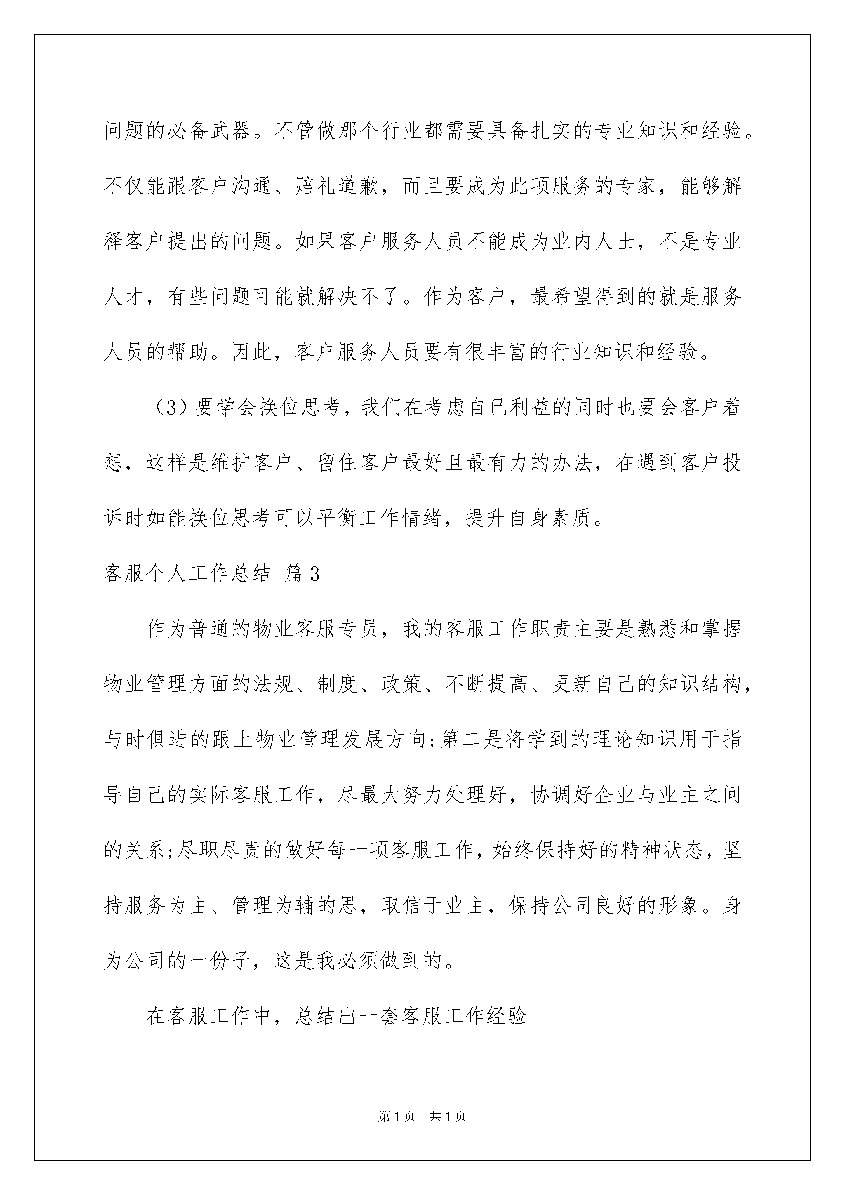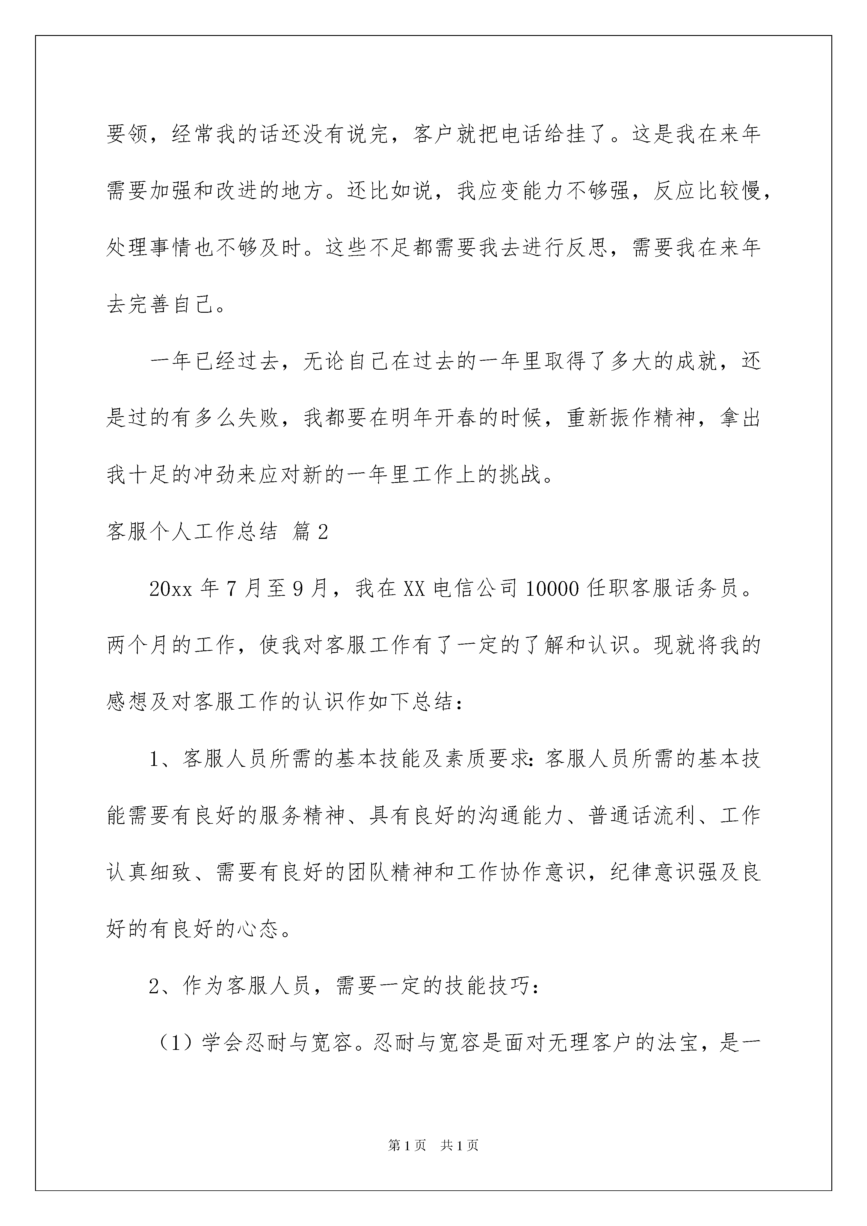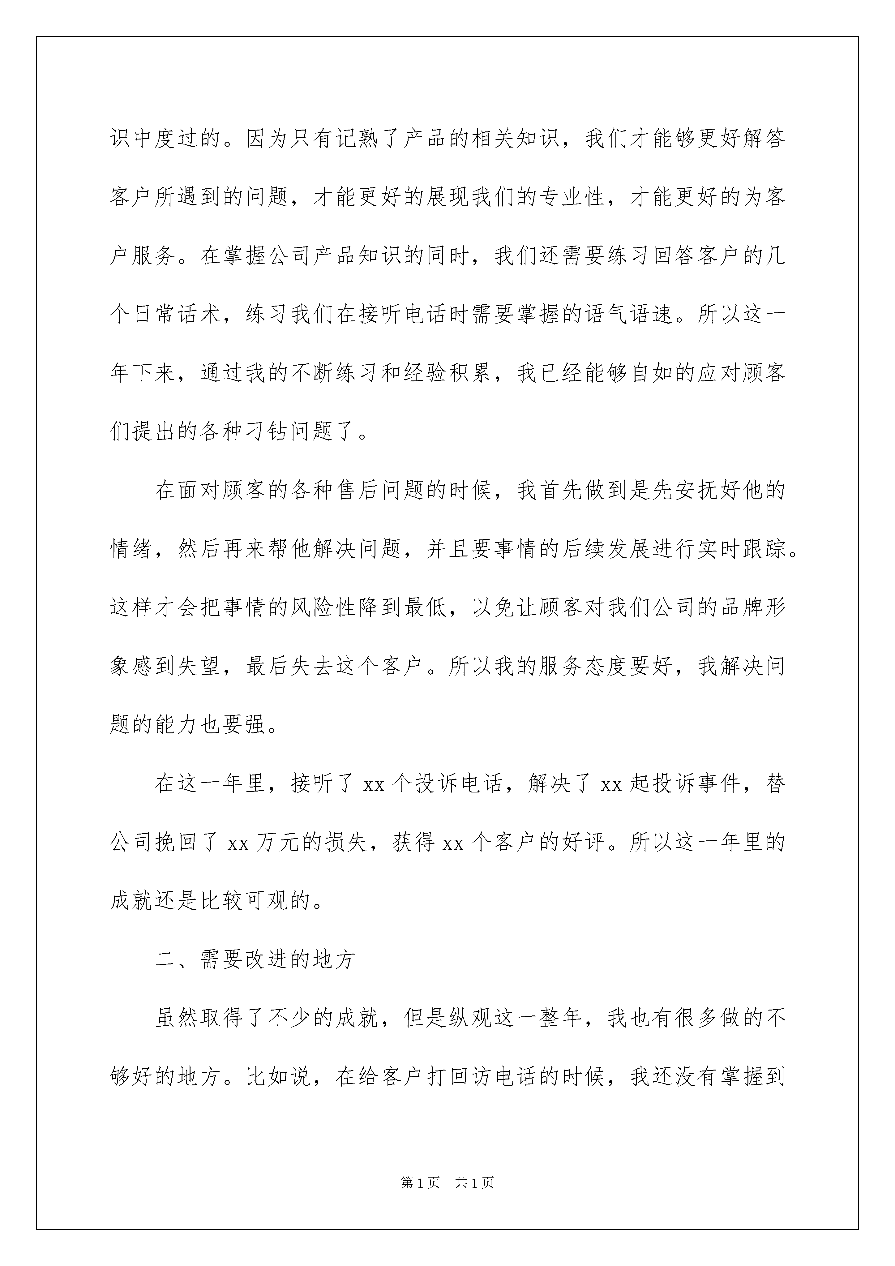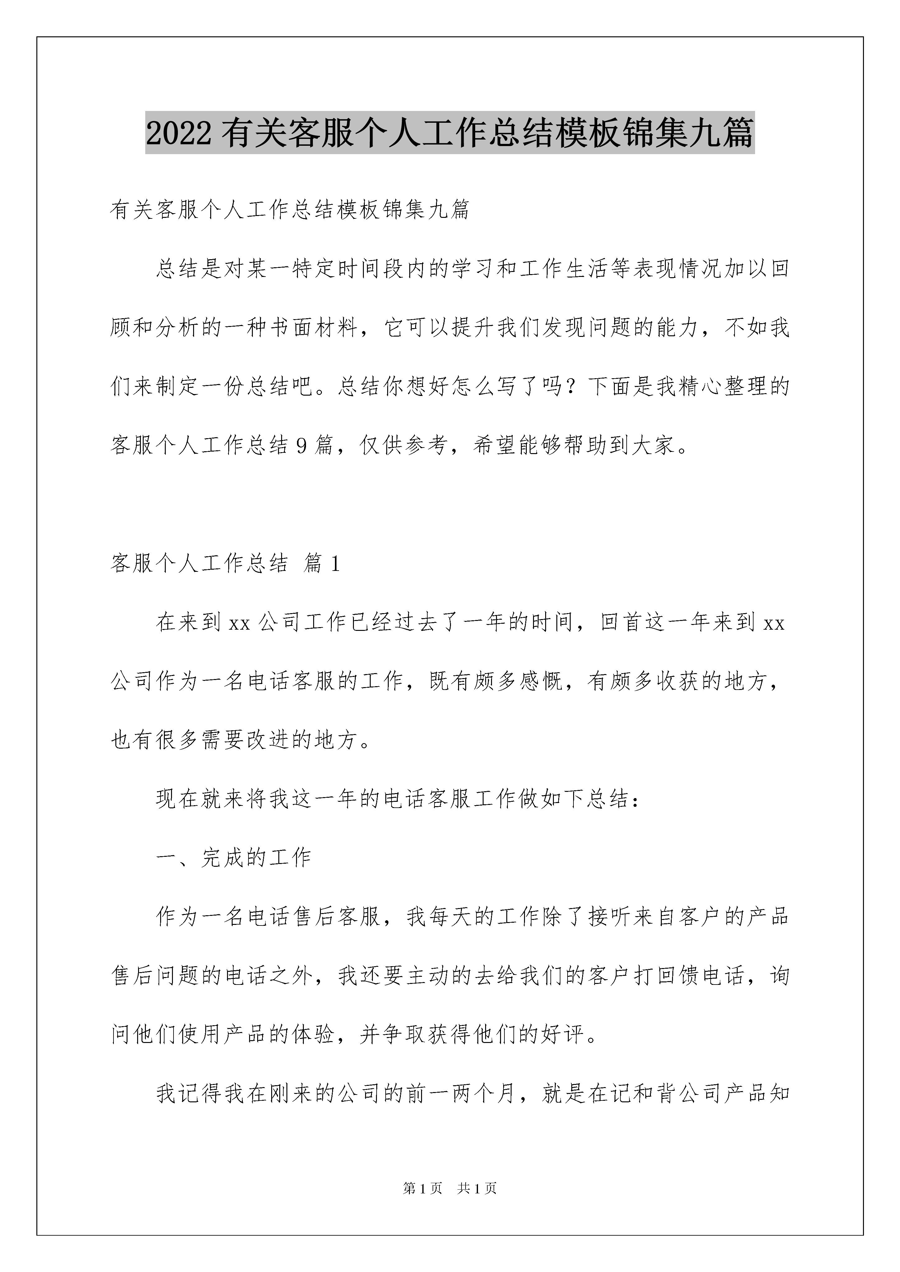2022有关客服个人工作总结模板锦集九篇有关客服个人工作总结模板锦集九篇总结是对某一特定时间段内的学习和工作生活等表现情况加以回顾和分析的一种书面材料,它可以提升我们发现问题的能力,不如我们来制定一份总结吧。总结你想好怎么写了吗?下面是我精心整理的客服个人工作总结9篇,仅供参考,希望能够帮助到大家。客服个人工作总结篇1在来到xx公司工作已经过去了一年的时间,回首这一年来到xx公司作为一名电话客服的工作,既有颇多感慨,有颇多收获的地方,也有很多需要改进的地方。现在就来将我这一年的电话客服工作做如下总结:一、完成的工作作为一名电话售后客服,我每天的工作除了接听来自客户的产品售后问题的电话之外,我还要主动的去给我们的客户打回馈电话,询问他们使用产品的体验,并争取获得他们的好评。我记得我在刚来的公司的前一两个月,就是在记和背公司产品知识中度过的。因为只有记熟了产品的相关知识,我们才能够更好解答客户所遇到的问题,才能更好的展现我们的专业性,才能更好的为客户服务。在掌握公司产品知识的同时,我们还需要练习回答客户的几个日常话术,练习我们在接听电话时需要掌握的语气语速。所以这一年下来,通过我的不断练习和经验积累,我已经能够自如的应对顾客们提出的各种刁钻问题了。在面对顾客的各种售后问题的时候,我首先做到是先安抚好他的情绪,然后再来帮他解决问题,并且要事情的后续发展进行实时跟踪。这样才会把事情的风险性降到最低,以免让顾客对我们公司的品牌形象感到失望,最后失去这个客户。所以我的服务态度要好,我解决问题的能力也要强。在这一年里,接听了xx个投诉电话,解决了xx起投诉事件,替公司挽回了xx万元的损失,获得xx个客户的好评。所以这一年里的成就还是比较可观的。二、需要改进的地方虽然取得了不少的成就,但是纵观这一整年,我也有很多做的不够好的地方。比如说,在给客户打回访电话的时候,我还没有掌握到要领,经常我的话还没有说完,客户就把电话给挂了。这是我在来年需要加强和改进的地方。还比如说,我应变能力不够强,反应比较慢,处理事情也不够及时。这些不足都需要我去进行反思,需要我在来年去完善自己。一年已经过去,无论自己在过去的一年里取得了多大的成就,还是过的有多么失败,我都要在明年开春的时候,重新振作精神,拿出我十足的冲劲来应对新的一年里工作上的挑战。客服个人工作总结篇220xx年7月至9月,我在XX电信公司10000任职客服话务员。两个月的工作,使我对客服工作有了一定的了解和认识。现就将我的感想及对客服工作的认识作如下总结:1、客服人员所需的基本技能及素质要求:客服人员所需的基本技能需要有良好的服务精神、具有良好的沟通能力、普通话流利、工作认真细致、需要有良好的团队精神和工作协作意识,纪律意识强及良好的有良好的心态。2、作为客服人员,需要一定的技能技巧:(1)学会忍耐与宽容。忍耐与宽容是面对无理客户的法宝,是一种美德,需要包容和理解客户。客户的性格不同,人生观、世界观、价值观也不同,因此客户服务是根据客户本人的喜好使他满意。(2)不轻易承诺,说到就要做到。客户服务人员不要轻易地承诺,随便答应客户做什么,这样会给工作造成被动。但是客户服务人员必须要注重自己的诺言,一旦答应客户,就要尽心尽力去做到。在电信公司作为话务员期间,公司规定在接到客户投诉问题后,要在48小时之内必须做出处理,这是一种信誉的体现,也是对作为客服的基本要求。(3)勇于承担责任。客户服务人员需要经常承担各种各样的责任和失误。出现问题的时候,同事之间往往会相互推卸责任。客户服务是一个企业的服务窗口,应该去包容整个企业对客户带来的所有损失。因此,在客户服务部门,不能说这是那个部门的责任,一切的责任都需要通过客服人员化解,需要勇于承担责任。3、作为客服,需要一定的技能素质:(1)良好的语言表达能力。与客户沟通过程中,普通话流利,语速适中,用词恰当,谦恭自信。(2)丰富的行业知识及经验。丰富的行业知识及经验是解决客户问题的必备武器。不管做那个行业都需要具备扎实的专业知识和经验。不仅能跟客户沟通、赔礼道歉,而且要成为此项服务的专家,能够解释客户提出的问题。如果客户服务人员不能成为业内人士,不是专业人才,有些问题可能就解决不了。作为客户,最希望得到的就是服务人员的帮助。因此,客户服务人员要有很丰富的行业知识和经验。(3)要学会换位思考,我们在考虑自已利益的同时也要会客户着想,这样是维护客户、留住客户最好且最有力的办法,在遇到客户投诉时如能换位思考可以平衡工作情绪,提升自身素质。客服个人工作总结篇3作为普通的物业客服专员,我的客服工作职责主要是熟悉和掌握物业管理方