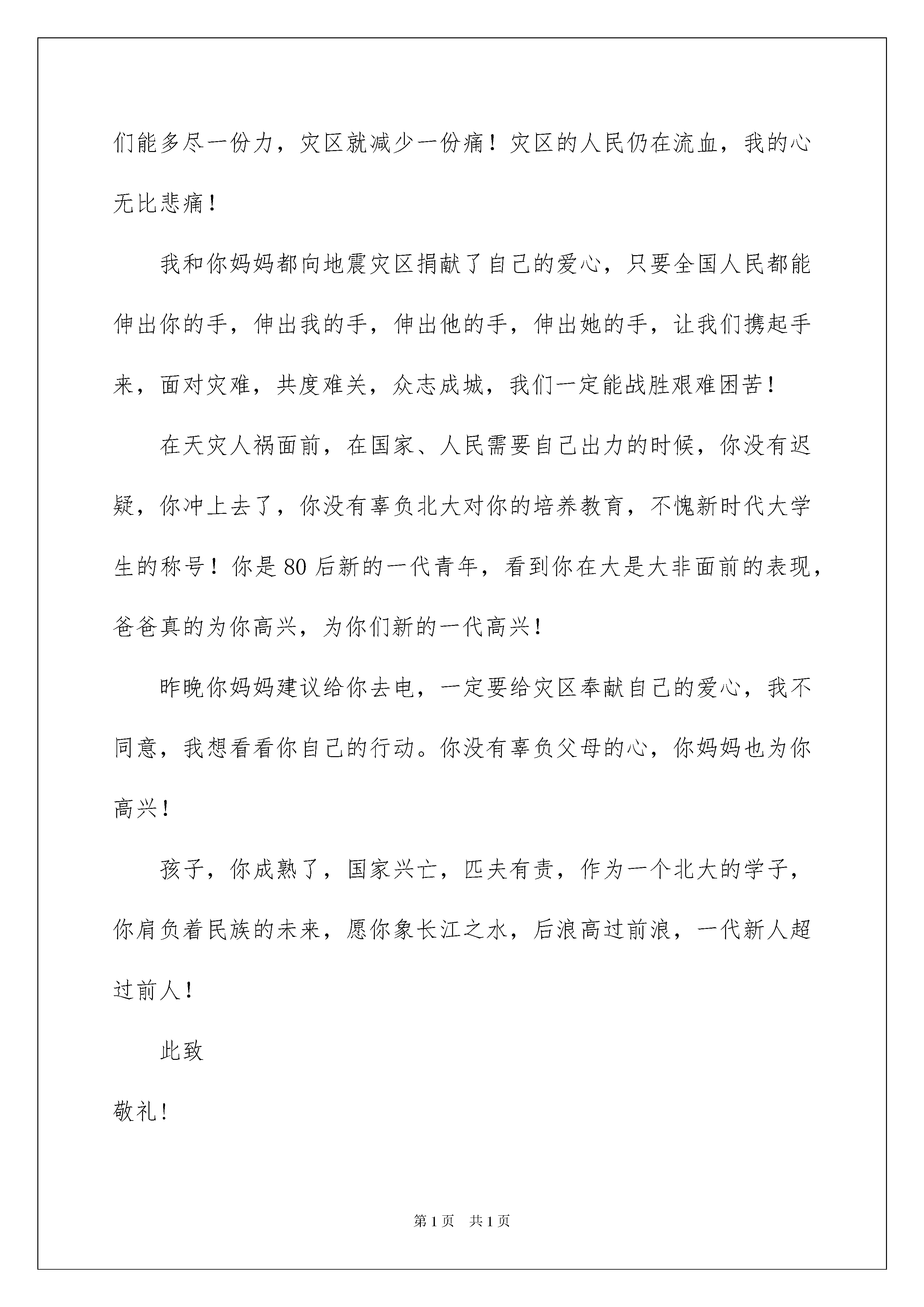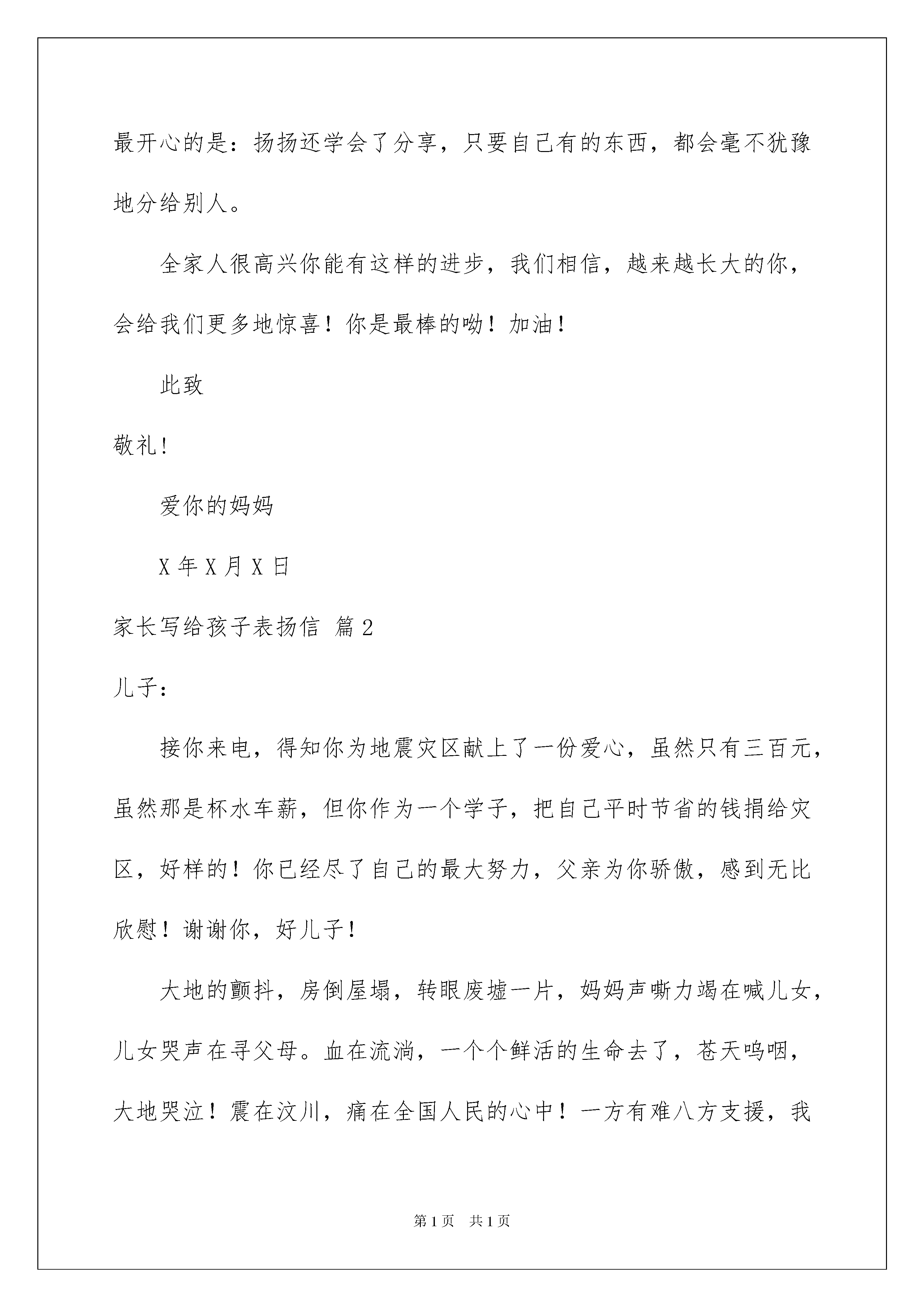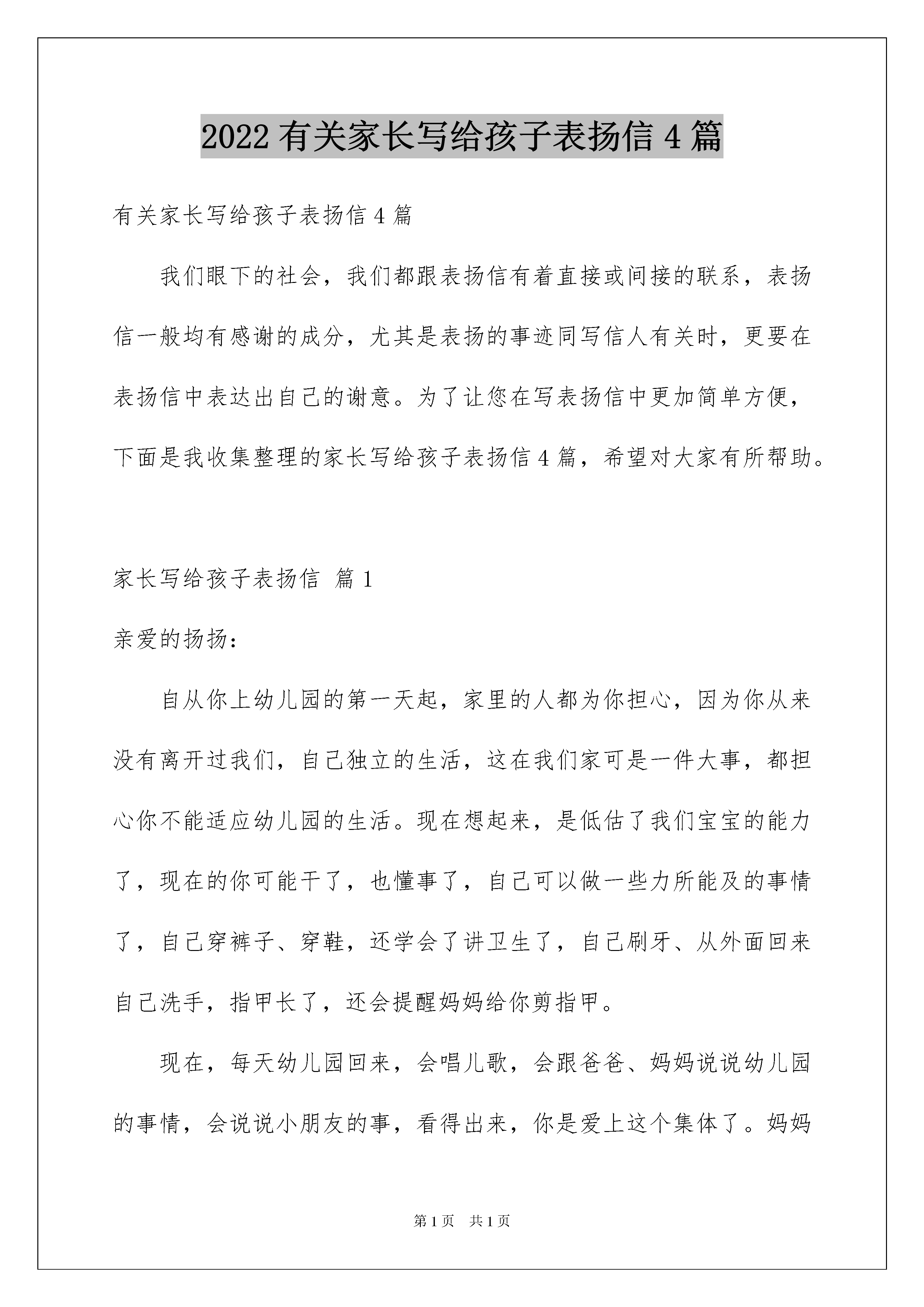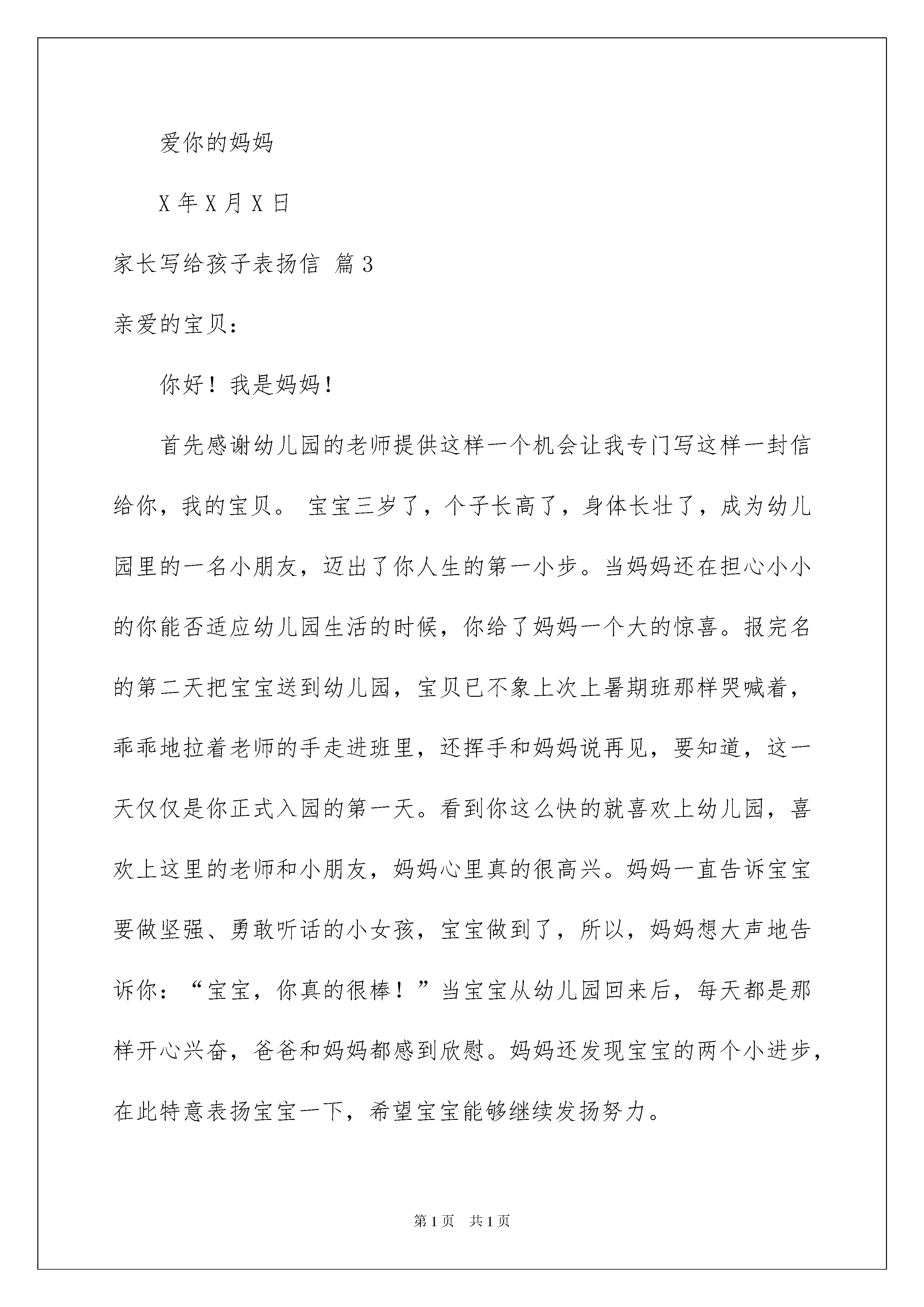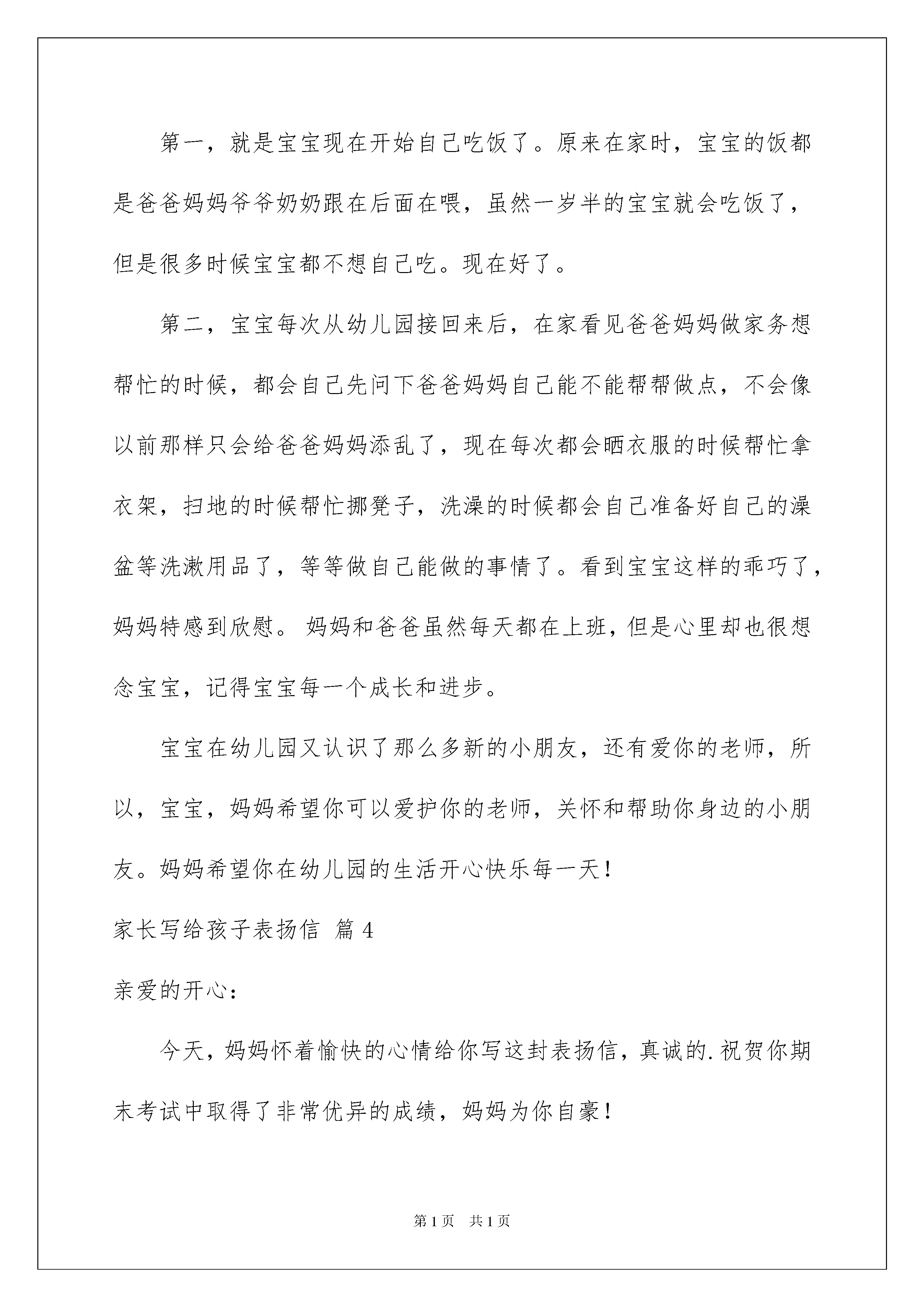 2022有关家长写给孩子表扬信4篇有关家长写给孩子表扬信4篇我们眼下的社会,我们都跟表扬信有着直接或间接的联系,表扬信一般均有感谢的成分,尤其是表扬的事迹同写信人有关时,更要在表扬信中表达出自己的谢意。为了让您在写表扬信中更加简单方便,下面是我收集整理的家长写给孩子表扬信4篇,希望对大家有所帮助。家长写给孩子表扬信篇1亲爱的扬扬:自从你上幼儿园的第一天起,家里的人都为你担心,因为你从来没有离开过我们,自己独立的生活,这在我们家可是一件大事,都担心你不能适应幼儿园的生活。现在想起来,是低估了我们宝宝的能力了,现在的你可能干了,也懂事了,自己可以做一些力所能及的事情了,自己穿裤子、穿鞋,还学会了讲卫生了,自己刷牙、从外面回来自己洗手,指甲长了,还会提醒妈妈给你剪指甲。现在,每天幼儿园回来,会唱儿歌,会跟爸爸、妈妈说说幼儿园的事情,会说说小朋友的事,看得出来,你是爱上这个集体了。妈妈最开心的是:扬扬还学会了分享,只要自己有的东西,都会毫不犹豫地分给别人。全家人很高兴你能有这样的进步,我们相信,越来越长大的你,会给我们更多地惊喜!你是最棒的呦!加油!此致敬礼!爱你的妈妈X年X月X日家长写给孩子表扬信篇2儿子:接你来电,得知你为地震灾区献上了一份爱心,虽然只有三百元,虽然那是杯水车薪,但你作为一个学子,把自己平时节省的钱捐给灾区,好样的!你已经尽了自己的最大努力,父亲为你骄傲,感到无比欣慰!谢谢你,好儿子!大地的颤抖,房倒屋塌,转眼废墟一片,妈妈声嘶力竭在喊儿女,儿女哭声在寻父母。血在流淌,一个个鲜活的生命去了,苍天呜咽,大地哭泣!震在汶川,痛在全国人民的心中!一方有难八方支援,我们能多尽一份力,灾区就减少一份痛!灾区的人民仍在流血,我的心无比悲痛!我和你妈妈都向地震灾区捐献了自己的爱心,只要全国人民都能伸出你的手,伸出我的手,伸出他的手,伸出她的手,让我们携起手来,面对灾难,共度难关,众志成城,我们一定能战胜艰难困苦!在天灾人祸面前,在国家、人民需要自己出力的时候,你没有迟疑,你冲上去了,你没有辜负北大对你的培养教育,不愧新时代大学生的称号!你是80后新的一代青年,看到你在大是大非面前的表现,爸爸真的为你高兴,为你们新的一代高兴!昨晚你妈妈建议给你去电,一定要给灾区奉献自己的爱心,我不同意,我想看看你自己的行动。你没有辜负父母的心,你妈妈也为你高兴!孩子,你成熟了,国家兴亡,匹夫有责,作为一个北大的学子,你肩负着民族的未来,愿你象长江之水,后浪高过前浪,一代新人超过前人!此致敬礼!爱你的妈妈X年X月X日家长写给孩子表扬信篇3亲爱的宝贝:你好!我是妈妈!首先感谢幼儿园的老师提供这样一个机会让我专门写这样一封信给你,我的宝贝。宝宝三岁了,个子长高了,身体长壮了,成为幼儿园里的一名小朋友,迈出了你人生的第一小步。当妈妈还在担心小小的你能否适应幼儿园生活的时候,你给了妈妈一个大的惊喜。报完名的第二天把宝宝送到幼儿园,宝贝已不象上次上暑期班那样哭喊着,乖乖地拉着老师的手走进班里,还挥手和妈妈说再见,要知道,这一天仅仅是你正式入园的第一天。看到你这么快的就喜欢上幼儿园,喜欢上这里的老师和小朋友,妈妈心里真的很高兴。妈妈一直告诉宝宝要做坚强、勇敢听话的小女孩,宝宝做到了,所以,妈妈想大声地告诉你:“宝宝,你真的很棒!”当宝宝从幼儿园回来后,每天都是那样开心兴奋,爸爸和妈妈都感到欣慰。妈妈还发现宝宝的两个小进步,在此特意表扬宝宝一下,希望宝宝能够继续发扬努力。第一,就是宝宝现在开始自己吃饭了。原来在家时,宝宝的饭都是爸爸妈妈爷爷奶奶跟在后面在喂,虽然一岁半的宝宝就会吃饭了,但是很多时候宝宝都不想自己吃。现在好了。第二,宝宝每次从幼儿园接回来后,在家看见爸爸妈妈做家务想帮忙的时候,都会自己先问下爸爸妈妈自己能不能帮帮做点,不会像以前那样只会给爸爸妈妈添乱了,现在每次都会晒衣服的时候帮忙拿衣架,扫地的时候帮忙挪凳子,洗澡的时候都会自己准备好自己的澡盆等洗漱用品了,等等做自己能做的事情了。看到宝宝这样的乖巧了,妈妈特感到欣慰。妈妈和爸爸虽然每天都在上班,但是心里却也很想念宝宝,记得宝宝每一个成长和进步。宝宝在幼儿园又认识了那么多新的小朋友,还有爱你的老师,所以,宝宝,妈妈希望你可以爱护你的老师,关怀和帮助你身边的小朋友。妈妈希望你在幼儿园的生活开心快乐每一天!家长写给孩子表扬信篇4亲爱的开心:今天,妈妈怀着愉快的心情给你写这封表扬信,真诚的.祝贺你期末考试中取得了非常优异的成绩,妈妈为你自豪!在这次期末考试中,你以优异的成绩给一年级的学习划上了一个圆满的句号。语文、数学取得了双100的好成绩,全班仅有