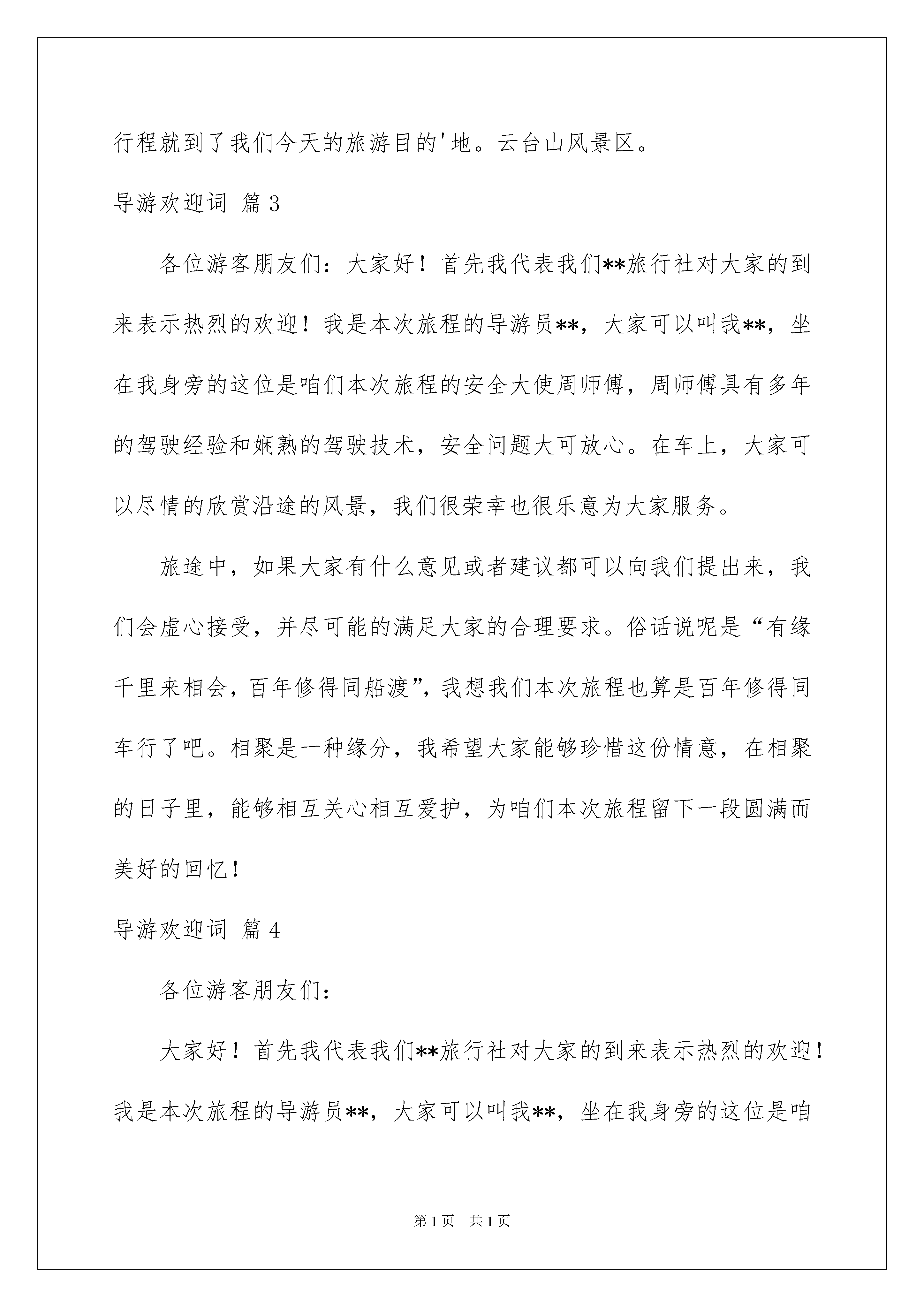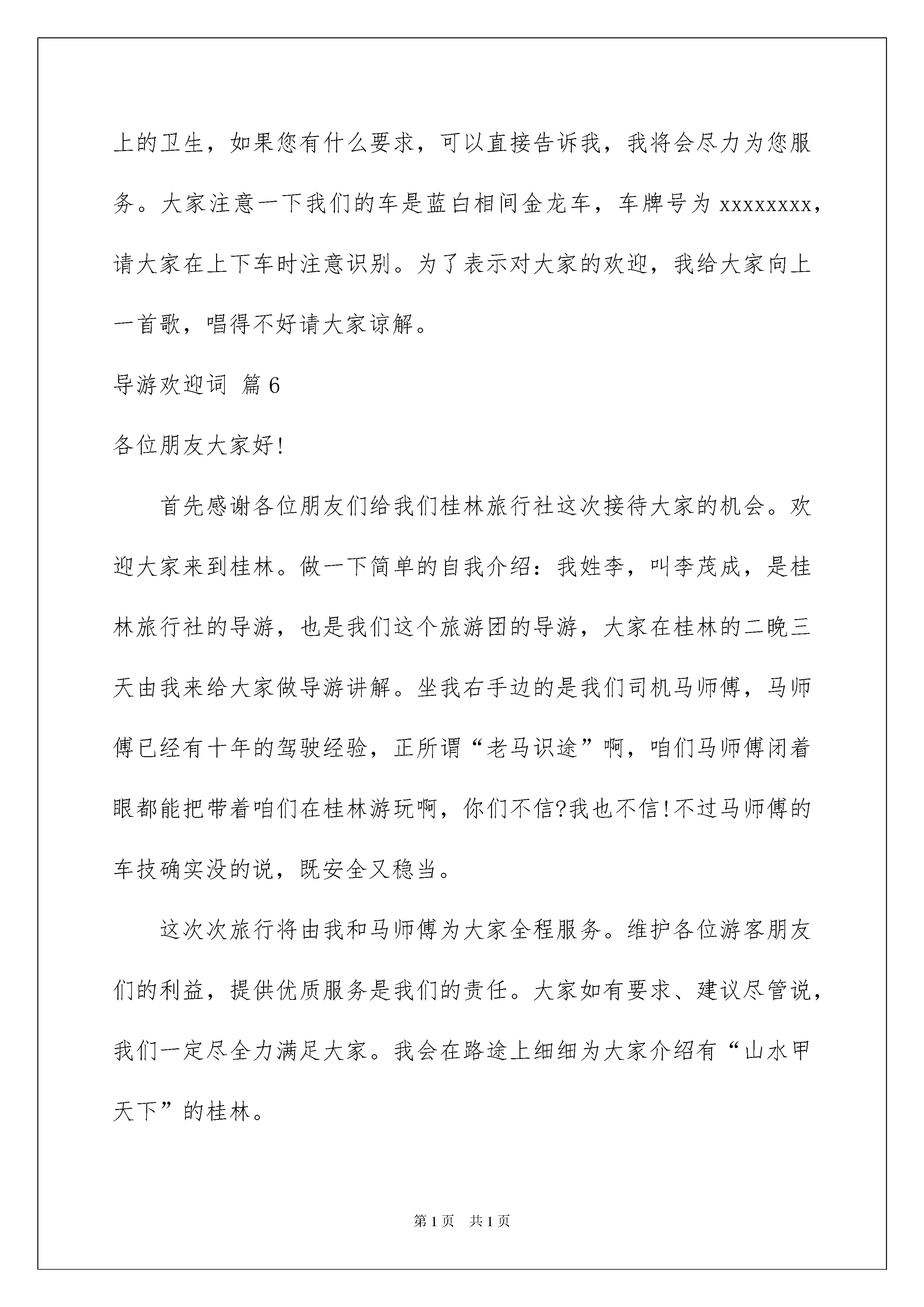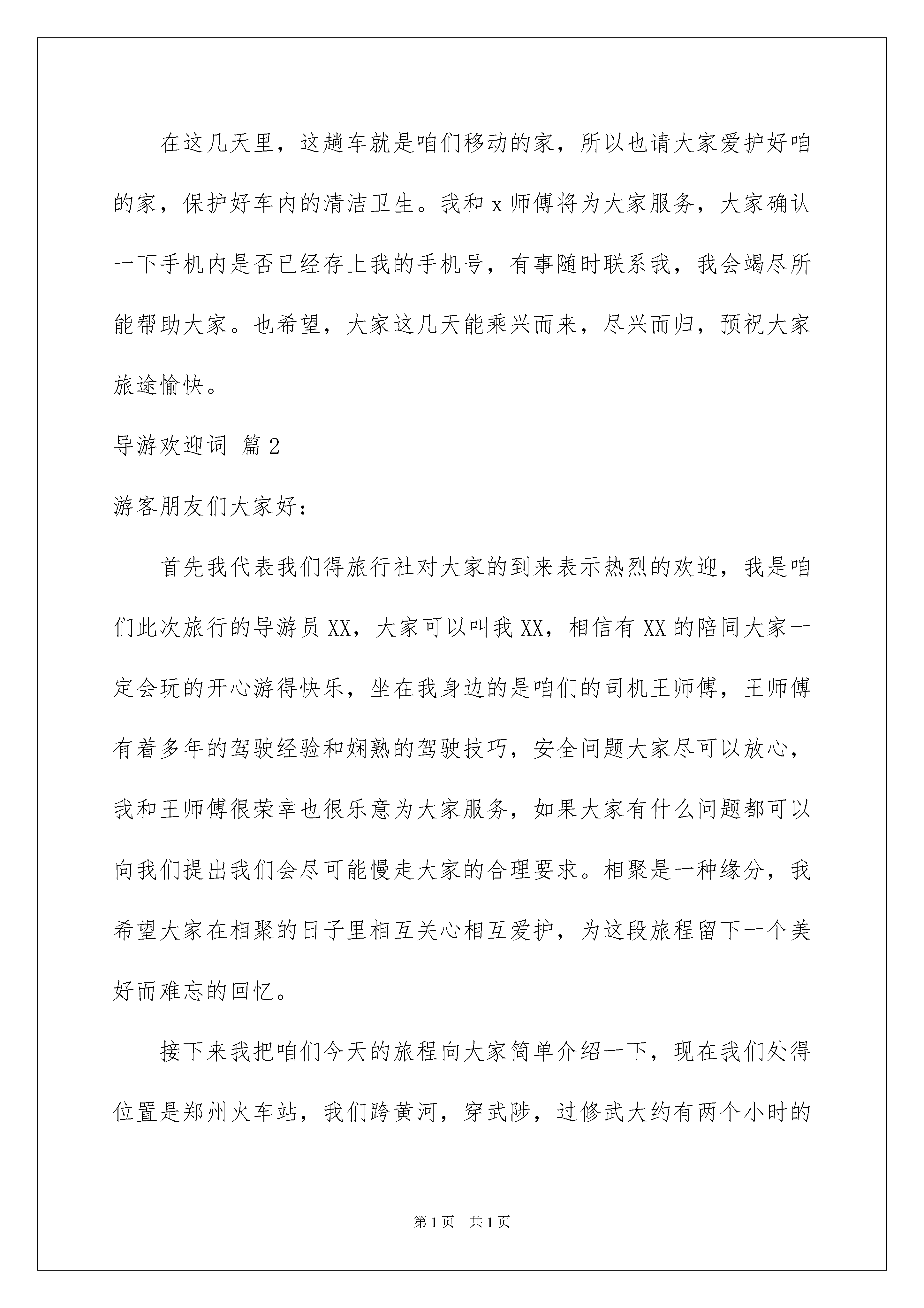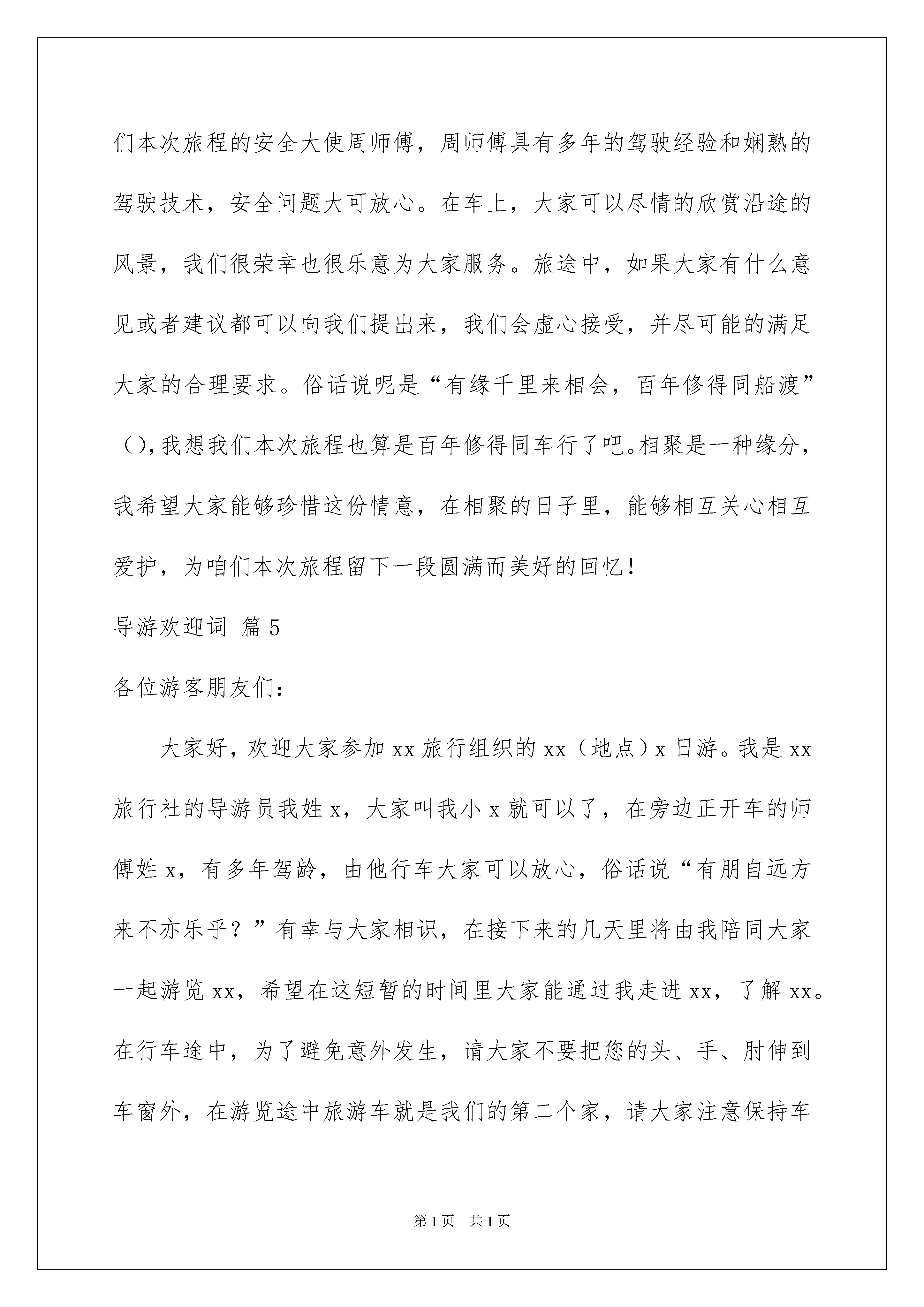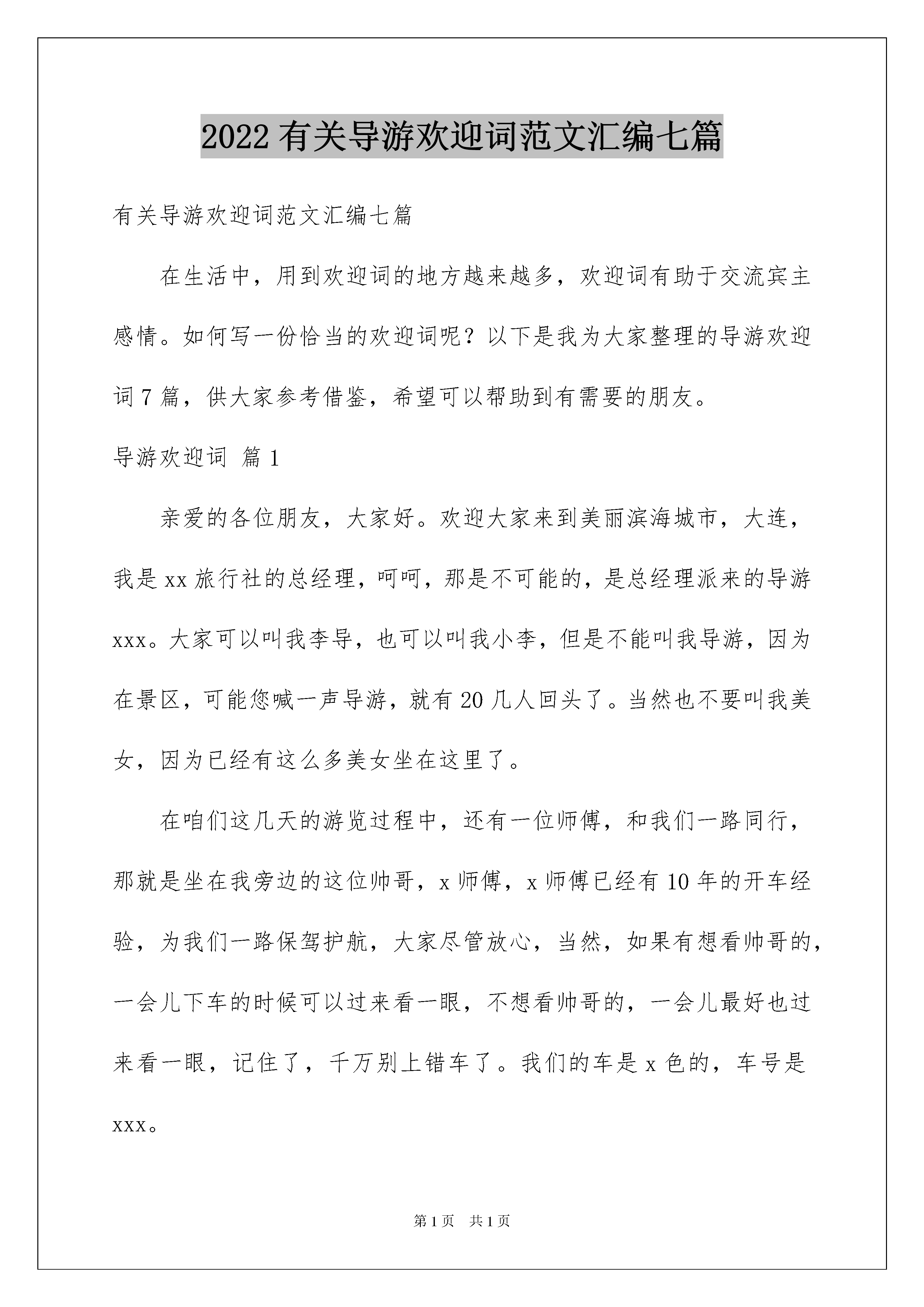 2022有关导游欢迎词范文汇编七篇有关导游欢迎词范文汇编七篇在生活中,用到欢迎词的地方越来越多,欢迎词有助于交流宾主感情。如何写一份恰当的欢迎词呢?以下是我为大家整理的导游欢迎词7篇,供大家参考借鉴,希望可以帮助到有需要的朋友。导游欢迎词篇1亲爱的各位朋友,大家好。欢迎大家来到美丽滨海城市,大连,我是xx旅行社的总经理,呵呵,那是不可能的,是总经理派来的导游xxx。大家可以叫我李导,也可以叫我小李,但是不能叫我导游,因为在景区,可能您喊一声导游,就有20几人回头了。当然也不要叫我美女,因为已经有这么多美女坐在这里了。在咱们这几天的游览过程中,还有一位师傅,和我们一路同行,那就是坐在我旁边的这位帅哥,x师傅,x师傅已经有10年的开车经验,为我们一路保驾护航,大家尽管放心,当然,如果有想看帅哥的,一会儿下车的时候可以过来看一眼,不想看帅哥的,一会儿最好也过来看一眼,记住了,千万别上错车了。我们的车是x色的,车号是xxx。在这几天里,这趟车就是咱们移动的家,所以也请大家爱护好咱的家,保护好车内的清洁卫生。我和x师傅将为大家服务,大家确认一下手机内是否已经存上我的手机号,有事随时联系我,我会竭尽所能帮助大家。也希望,大家这几天能乘兴而来,尽兴而归,预祝大家旅途愉快。导游欢迎词篇2游客朋友们大家好:首先我代表我们得旅行社对大家的到来表示热烈的欢迎,我是咱们此次旅行的导游员XX,大家可以叫我XX,相信有XX的陪同大家一定会玩的开心游得快乐,坐在我身边的是咱们的司机王师傅,王师傅有着多年的驾驶经验和娴熟的驾驶技巧,安全问题大家尽可以放心,我和王师傅很荣幸也很乐意为大家服务,如果大家有什么问题都可以向我们提出我们会尽可能慢走大家的合理要求。相聚是一种缘分,我希望大家在相聚的日子里相互关心相互爱护,为这段旅程留下一个美好而难忘的回忆。接下来我把咱们今天的旅程向大家简单介绍一下,现在我们处得位置是郑州火车站,我们跨黄河,穿武陟,过修武大约有两个小时的行程就到了我们今天的旅游目的'地。云台山风景区。导游欢迎词篇3各位游客朋友们:大家好!首先我代表我们**旅行社对大家的到来表示热烈的欢迎!我是本次旅程的导游员**,大家可以叫我**,坐在我身旁的这位是咱们本次旅程的安全大使周师傅,周师傅具有多年的驾驶经验和娴熟的驾驶技术,安全问题大可放心。在车上,大家可以尽情的欣赏沿途的风景,我们很荣幸也很乐意为大家服务。旅途中,如果大家有什么意见或者建议都可以向我们提出来,我们会虚心接受,并尽可能的满足大家的合理要求。俗话说呢是“有缘千里来相会,百年修得同船渡”,我想我们本次旅程也算是百年修得同车行了吧。相聚是一种缘分,我希望大家能够珍惜这份情意,在相聚的日子里,能够相互关心相互爱护,为咱们本次旅程留下一段圆满而美好的回忆!导游欢迎词篇4各位游客朋友们:大家好!首先我代表我们**旅行社对大家的到来表示热烈的欢迎!我是本次旅程的导游员**,大家可以叫我**,坐在我身旁的这位是咱们本次旅程的安全大使周师傅,周师傅具有多年的驾驶经验和娴熟的驾驶技术,安全问题大可放心。在车上,大家可以尽情的欣赏沿途的风景,我们很荣幸也很乐意为大家服务。旅途中,如果大家有什么意见或者建议都可以向我们提出来,我们会虚心接受,并尽可能的满足大家的合理要求。俗话说呢是“有缘千里来相会,百年修得同船渡”(),我想我们本次旅程也算是百年修得同车行了吧。相聚是一种缘分,我希望大家能够珍惜这份情意,在相聚的日子里,能够相互关心相互爱护,为咱们本次旅程留下一段圆满而美好的回忆!导游欢迎词篇5各位游客朋友们:大家好,欢迎大家参加xx旅行组织的xx(地点)x日游。我是xx旅行社的导游员我姓x,大家叫我小x就可以了,在旁边正开车的师傅姓x,有多年驾龄,由他行车大家可以放心,俗话说“有朋自远方来不亦乐乎?”有幸与大家相识,在接下来的几天里将由我陪同大家一起游览xx,希望在这短暂的时间里大家能通过我走进xx,了解xx。在行车途中,为了避免意外发生,请大家不要把您的头、手、肘伸到车窗外,在游览途中旅游车就是我们的第二个家,请大家注意保持车上的卫生,如果您有什么要求,可以直接告诉我,我将会尽力为您服务。大家注意一下我们的车是蓝白相间金龙车,车牌号为xxxxxxxx,请大家在上下车时注意识别。为了表示对大家的欢迎,我给大家向上一首歌,唱得不好请大家谅解。导游欢迎词篇6各位朋友大家好!首先感谢各位朋友们给我们桂林旅行社这次接待大家的机会。欢迎大家来到桂林。做一下简单的自我介绍:我姓李,叫李茂成,是桂林旅行社的导游,也是我们这个旅游团的导游,大家在桂林的二晚三天由我来给大