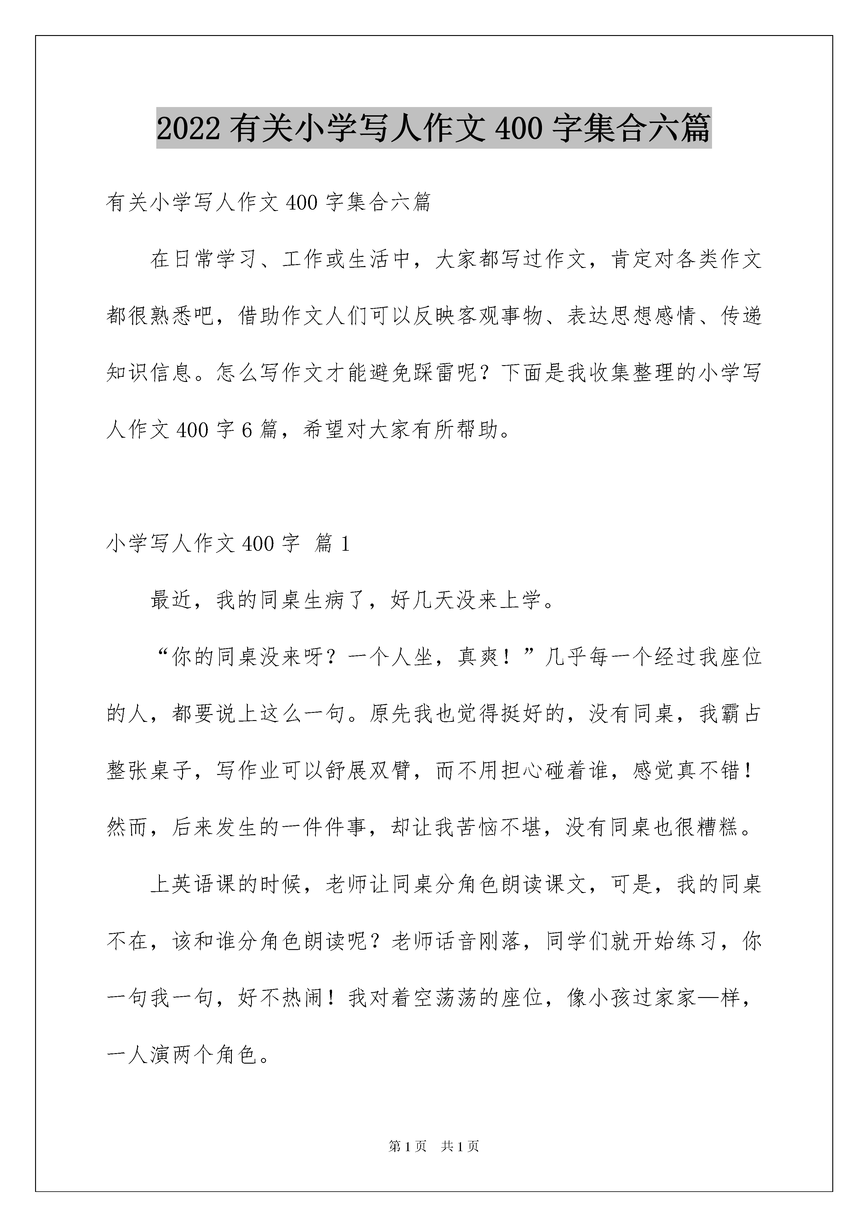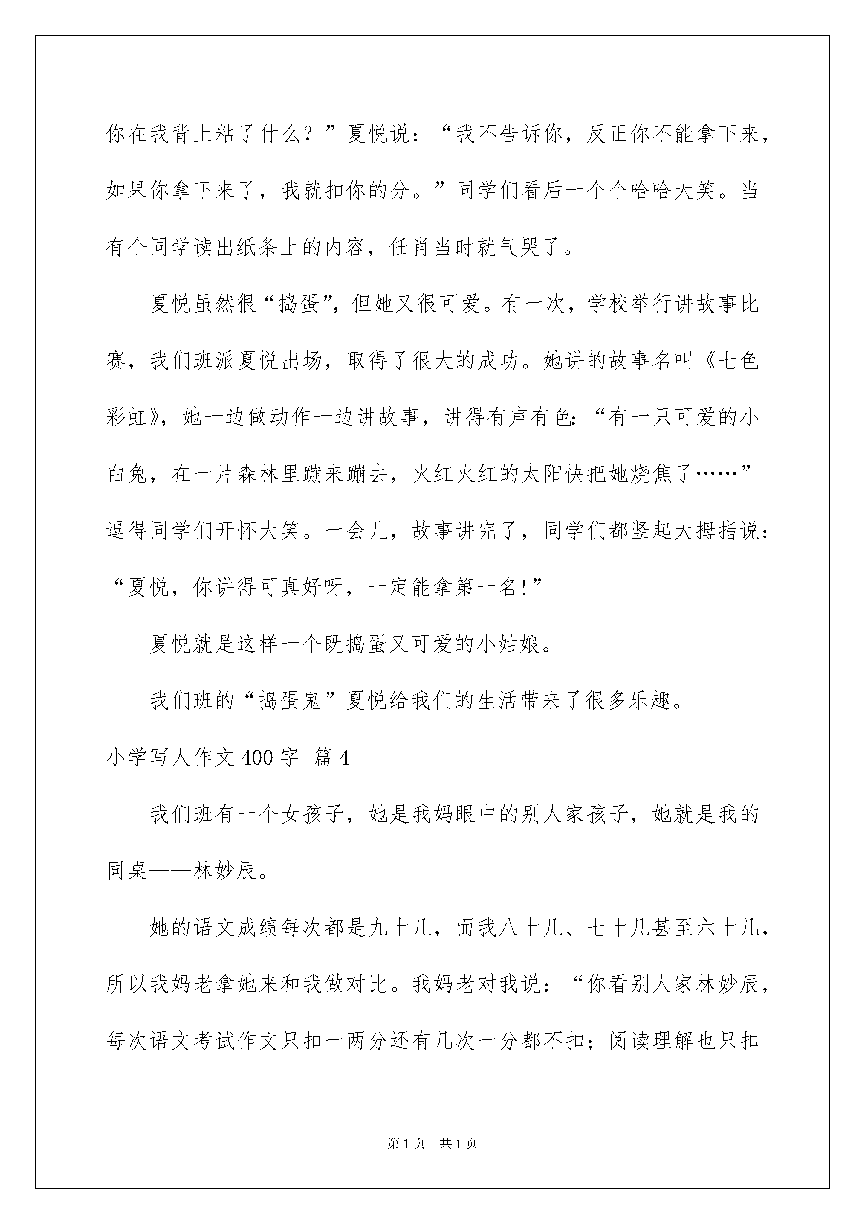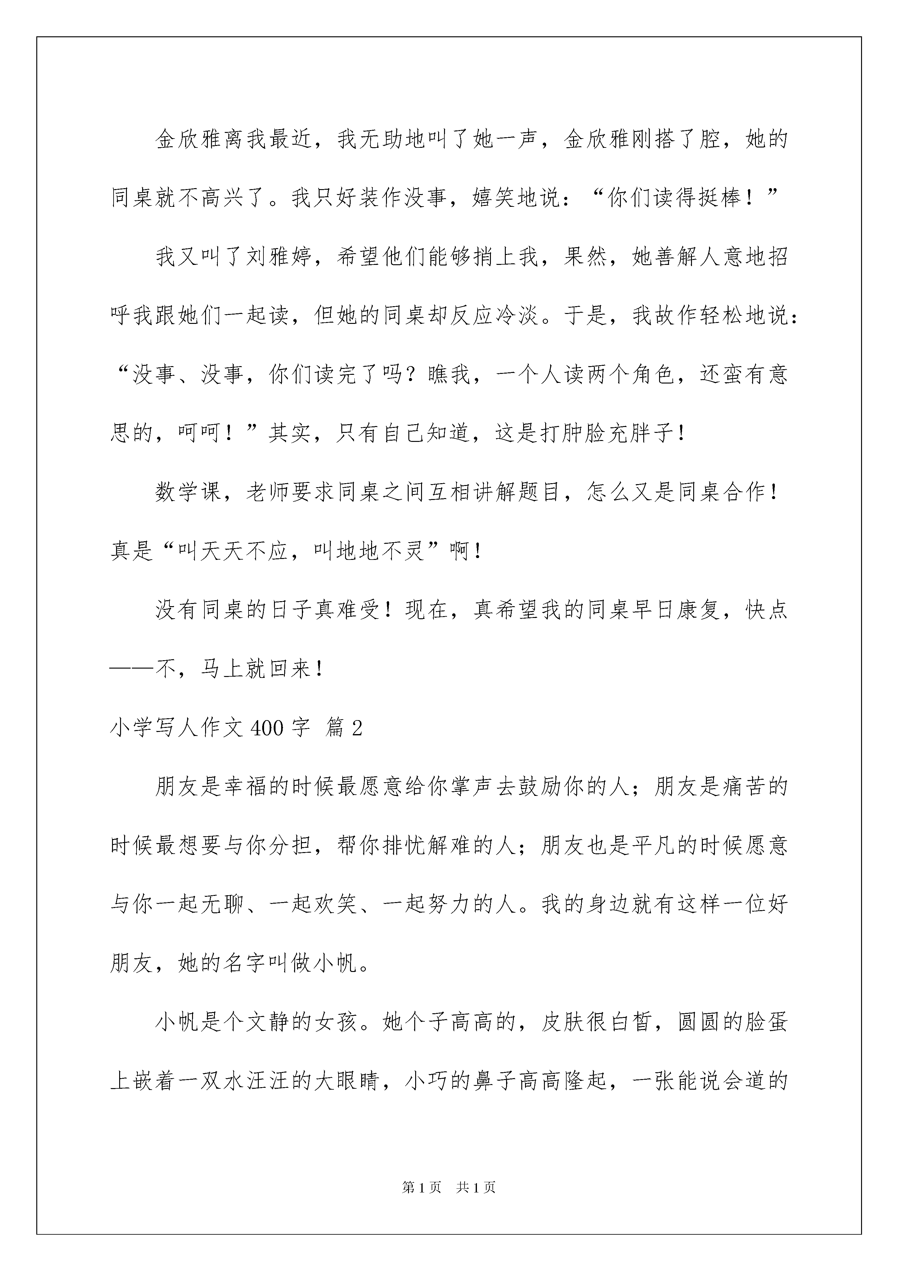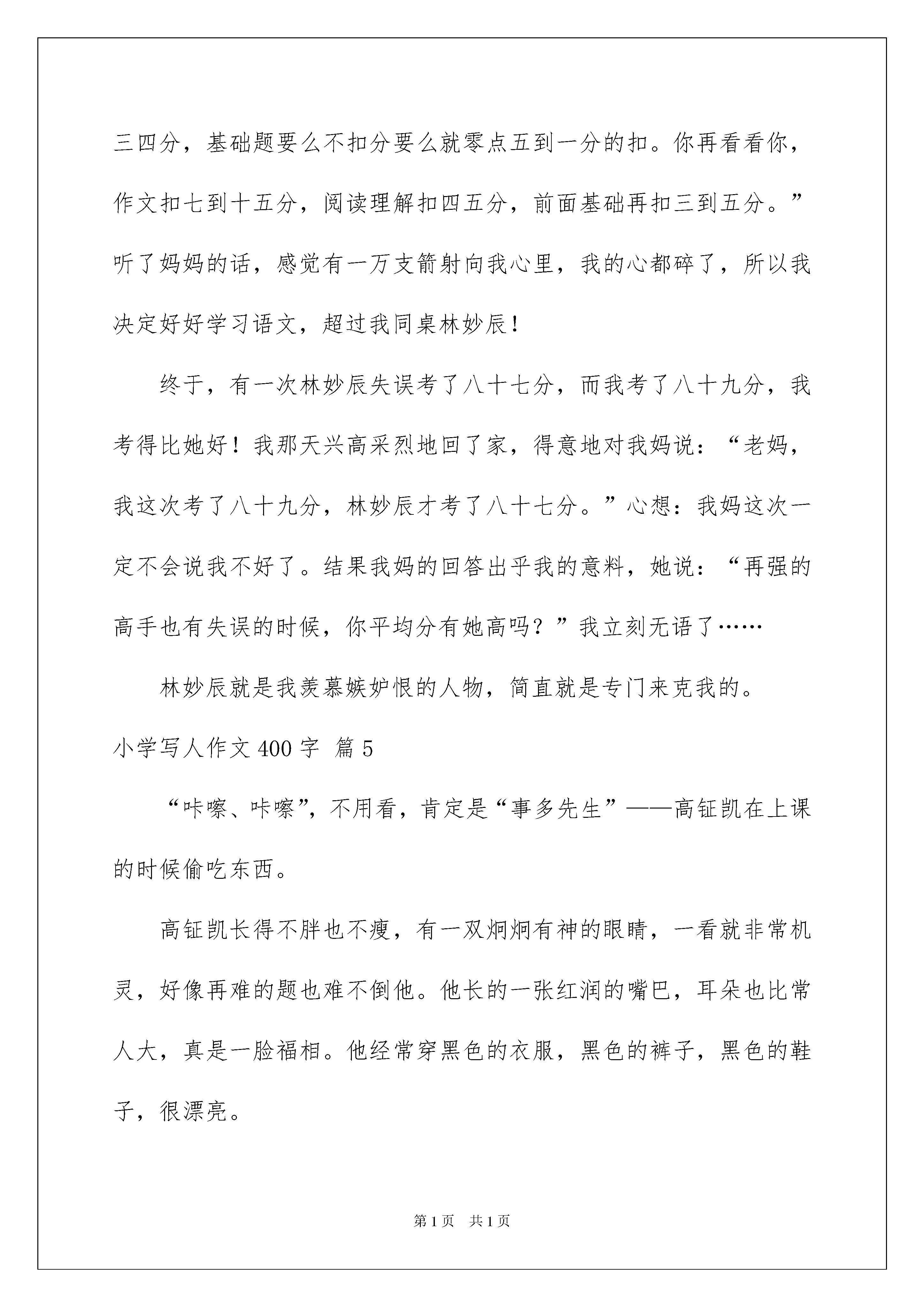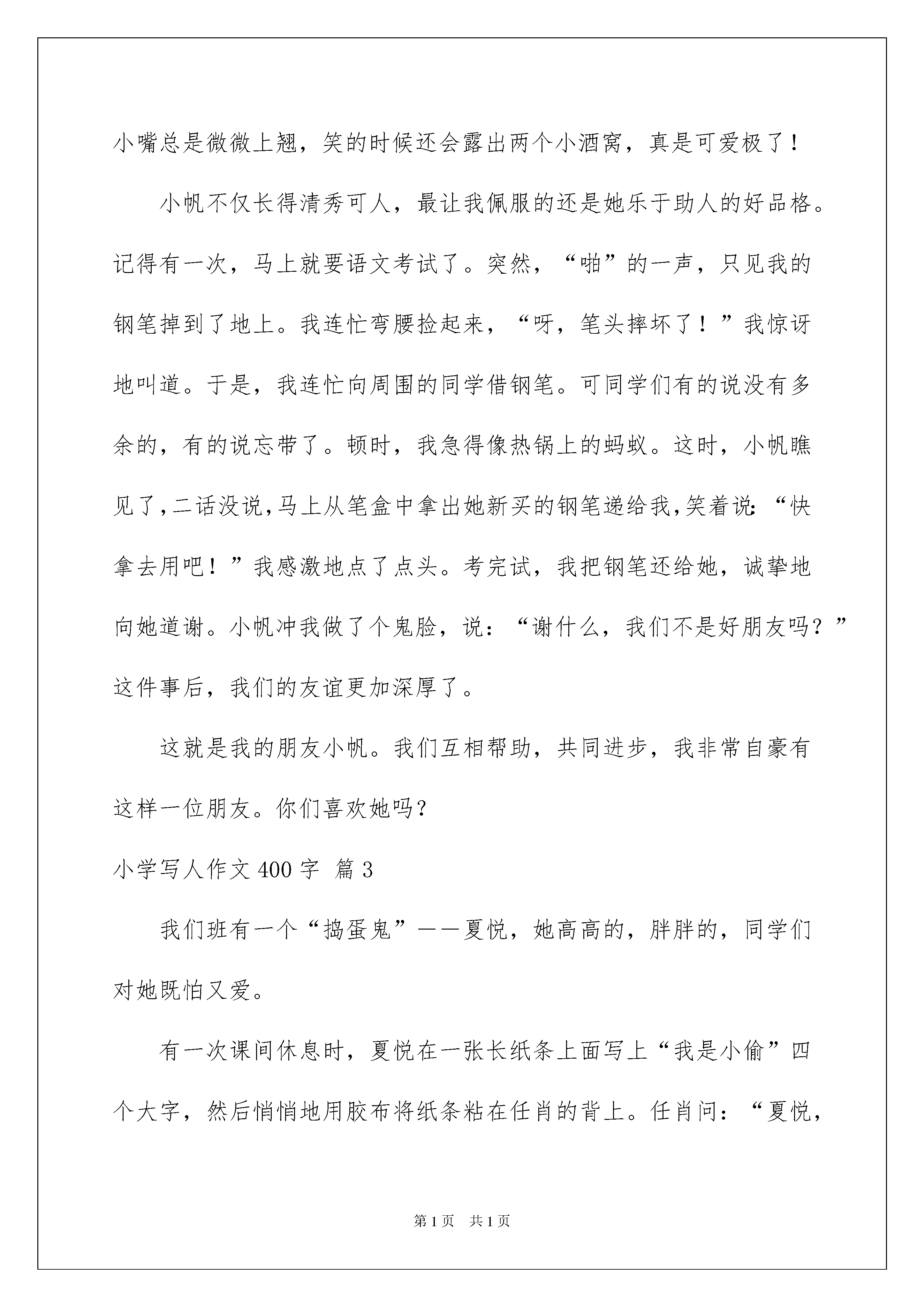 2022有关小学写人作文400字集合六篇有关小学写人作文400字集合六篇在日常学习、工作或生活中,大家都写过作文,肯定对各类作文都很熟悉吧,借助作文人们可以反映客观事物、表达思想感情、传递知识信息。怎么写作文才能避免踩雷呢?下面是我收集整理的小学写人作文400字6篇,希望对大家有所帮助。小学写人作文400字篇1最近,我的同桌生病了,好几天没来上学。“你的同桌没来呀?一个人坐,真爽!”几乎每一个经过我座位的人,都要说上这么一句。原先我也觉得挺好的,没有同桌,我霸占整张桌子,写作业可以舒展双臂,而不用担心碰着谁,感觉真不错!然而,后来发生的一件件事,却让我苦恼不堪,没有同桌也很糟糕。上英语课的时候,老师让同桌分角色朗读课文,可是,我的同桌不在,该和谁分角色朗读呢?老师话音刚落,同学们就开始练习,你一句我一句,好不热闹!我对着空荡荡的座位,像小孩过家家—样,一人演两个角色。金欣雅离我最近,我无助地叫了她一声,金欣雅刚搭了腔,她的同桌就不高兴了。我只好装作没事,嬉笑地说:“你们读得挺棒!”我又叫了刘雅婷,希望他们能够捎上我,果然,她善解人意地招呼我跟她们一起读,但她的同桌却反应冷淡。于是,我故作轻松地说:“没事、没事,你们读完了吗?瞧我,一个人读两个角色,还蛮有意思的,呵呵!”其实,只有自己知道,这是打肿脸充胖子!数学课,老师要求同桌之间互相讲解题目,怎么又是同桌合作!真是“叫天天不应,叫地地不灵”啊!没有同桌的日子真难受!现在,真希望我的同桌早日康复,快点——不,马上就回来!小学写人作文400字篇2朋友是幸福的时候最愿意给你掌声去鼓励你的人;朋友是痛苦的时候最想要与你分担,帮你排忧解难的人;朋友也是平凡的时候愿意与你一起无聊、一起欢笑、一起努力的人。我的身边就有这样一位好朋友,她的名字叫做小帆。小帆是个文静的女孩。她个子高高的,皮肤很白皙,圆圆的脸蛋上嵌着一双水汪汪的大眼睛,小巧的鼻子高高隆起,一张能说会道的小嘴总是微微上翘,笑的时候还会露出两个小酒窝,真是可爱极了!小帆不仅长得清秀可人,最让我佩服的还是她乐于助人的好品格。记得有一次,马上就要语文考试了。突然,“啪”的一声,只见我的钢笔掉到了地上。我连忙弯腰捡起来,“呀,笔头摔坏了!”我惊讶地叫道。于是,我连忙向周围的同学借钢笔。可同学们有的说没有多余的,有的说忘带了。顿时,我急得像热锅上的蚂蚁。这时,小帆瞧见了,二话没说,马上从笔盒中拿出她新买的钢笔递给我,笑着说:“快拿去用吧!”我感激地点了点头。考完试,我把钢笔还给她,诚挚地向她道谢。小帆冲我做了个鬼脸,说:“谢什么,我们不是好朋友吗?”这件事后,我们的友谊更加深厚了。这就是我的朋友小帆。我们互相帮助,共同进步,我非常自豪有这样一位朋友。你们喜欢她吗?小学写人作文400字篇3我们班有一个“捣蛋鬼”――夏悦,她高高的,胖胖的,同学们对她既怕又爱。有一次课间休息时,夏悦在一张长纸条上面写上“我是小偷”四个大字,然后悄悄地用胶布将纸条粘在任肖的背上。任肖问:“夏悦,你在我背上粘了什么?”夏悦说:“我不告诉你,反正你不能拿下来,如果你拿下来了,我就扣你的分。”同学们看后一个个哈哈大笑。当有个同学读出纸条上的内容,任肖当时就气哭了。夏悦虽然很“捣蛋”,但她又很可爱。有一次,学校举行讲故事比赛,我们班派夏悦出场,取得了很大的成功。她讲的故事名叫《七色彩虹》,她一边做动作一边讲故事,讲得有声有色:“有一只可爱的小白兔,在一片森林里蹦来蹦去,火红火红的太阳快把她烧焦了……”逗得同学们开怀大笑。一会儿,故事讲完了,同学们都竖起大拇指说:“夏悦,你讲得可真好呀,一定能拿第一名!”夏悦就是这样一个既捣蛋又可爱的小姑娘。我们班的“捣蛋鬼”夏悦给我们的生活带来了很多乐趣。小学写人作文400字篇4我们班有一个女孩子,她是我妈眼中的别人家孩子,她就是我的同桌——林妙辰。她的语文成绩每次都是九十几,而我八十几、七十几甚至六十几,所以我妈老拿她来和我做对比。我妈老对我说:“你看别人家林妙辰,每次语文考试作文只扣一两分还有几次一分都不扣;阅读理解也只扣三四分,基础题要么不扣分要么就零点五到一分的扣。你再看看你,作文扣七到十五分,阅读理解扣四五分,前面基础再扣三到五分。”听了妈妈的话,感觉有一万支箭射向我心里,我的心都碎了,所以我决定好好学习语文,超过我同桌林妙辰!终于,有一次林妙辰失误考了八十七分,而我考了八十九分,我考得比她好!我那天兴高采烈地回了家,得意地对我妈说:“老妈,我这次考了八十九分,林妙辰才考了八十七分。”心想:我妈这次一定不会说我不好了。结果我妈的回答出乎我的意料,她说:“再强的高手也有失误