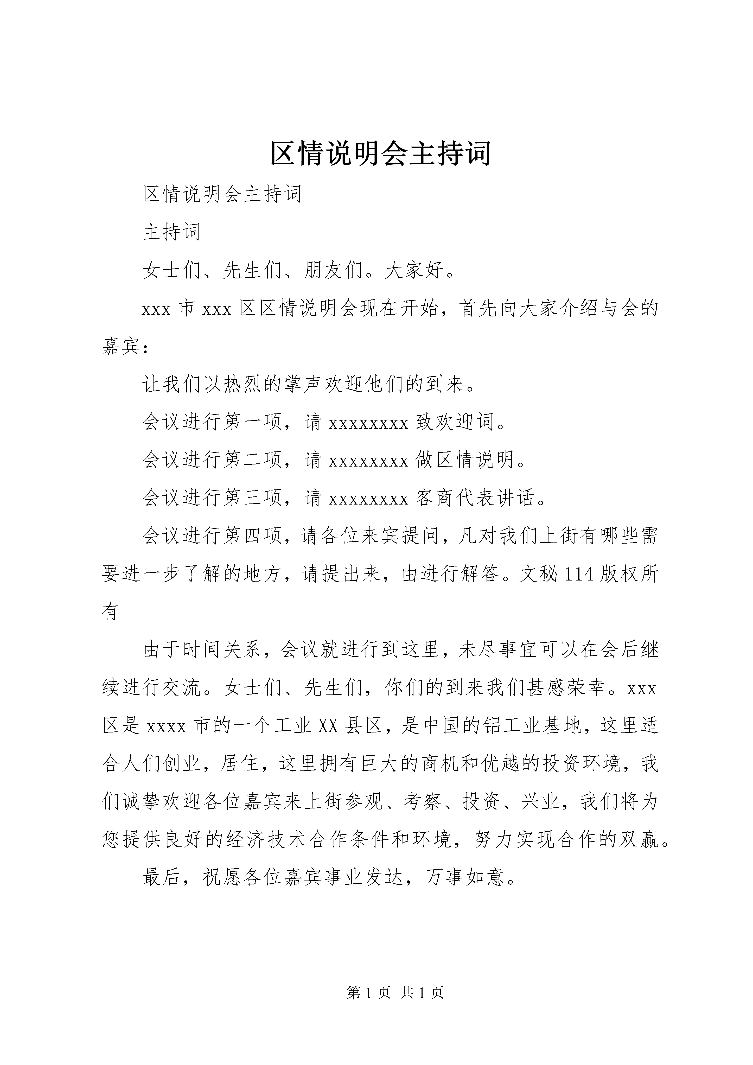 区情说明会主持词区情说明会主持词主持词女士们、先生们、朋友们。大家好。xxx市xxx区区情说明会现在开始,首先向大家介绍与会的嘉宾:让我们以热烈的掌声欢迎他们的到来。会议进行第一项,请xxxxxxxx致欢迎词。会议进行第二项,请xxxxxxxx做区情说明。会议进行第三项,请xxxxxxxx客商代表讲话。会议进行第四项,请各位来宾提问,凡对我们上街有哪些需要进一步了解的地方,请提出来,由进行解答。文秘114版权所有由于时间关系,会议就进行到这里,未尽事宜可以在会后继续进行交流。女士们、先生们,你们的到来我们甚感荣幸。xxx区是xxxx市的一个工业XX县区,是中国的铝工业基地,这里适合人们创业,居住,这里拥有巨大的商机和优越的投资环境,我们诚挚欢迎各位嘉宾来上街参观、考察、投资、兴业,我们将为您提供良好的经济技术合作条件和环境,努力实现合作的双赢。最后,祝愿各位嘉宾事业发达,万事如意。谢谢大家。