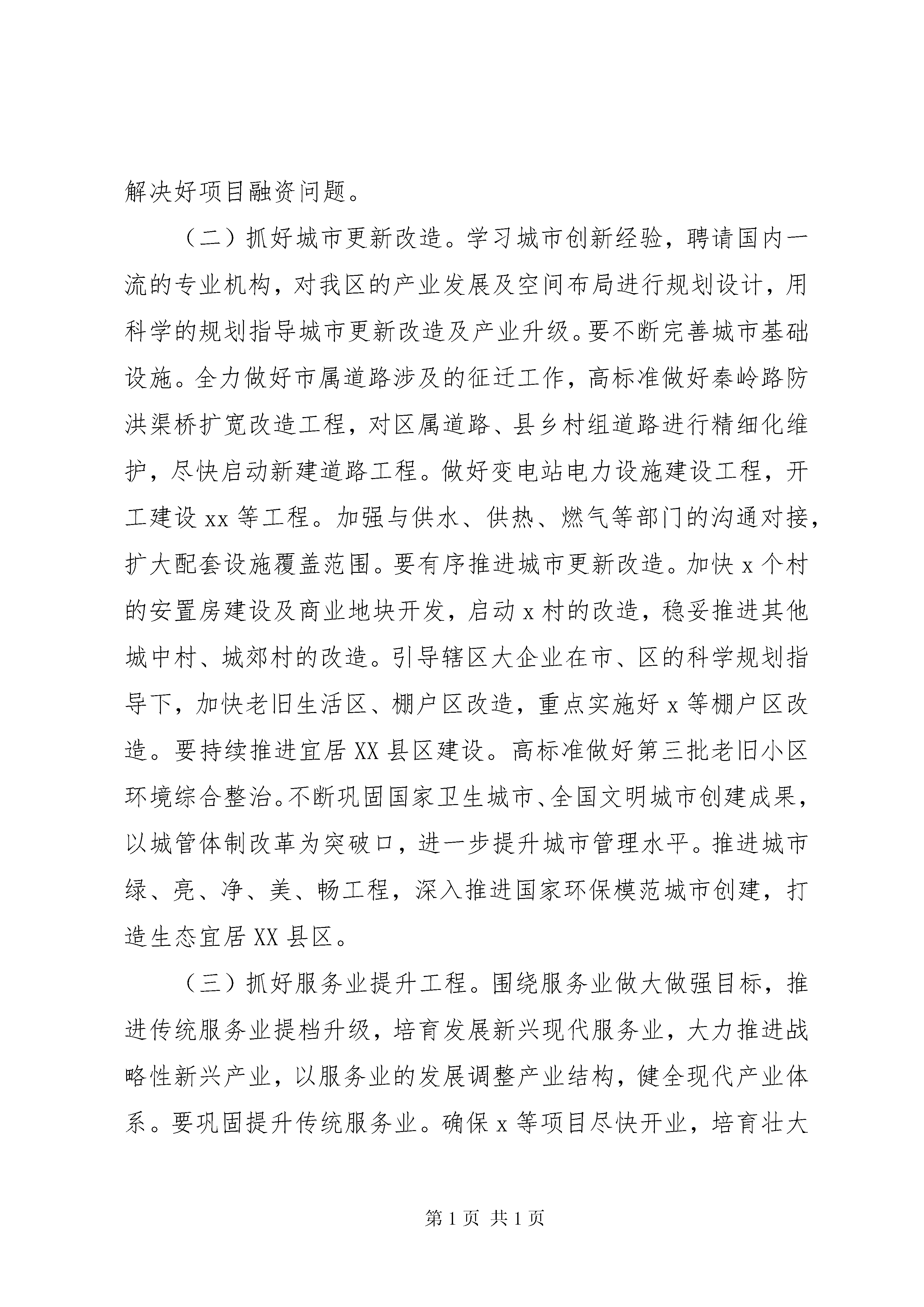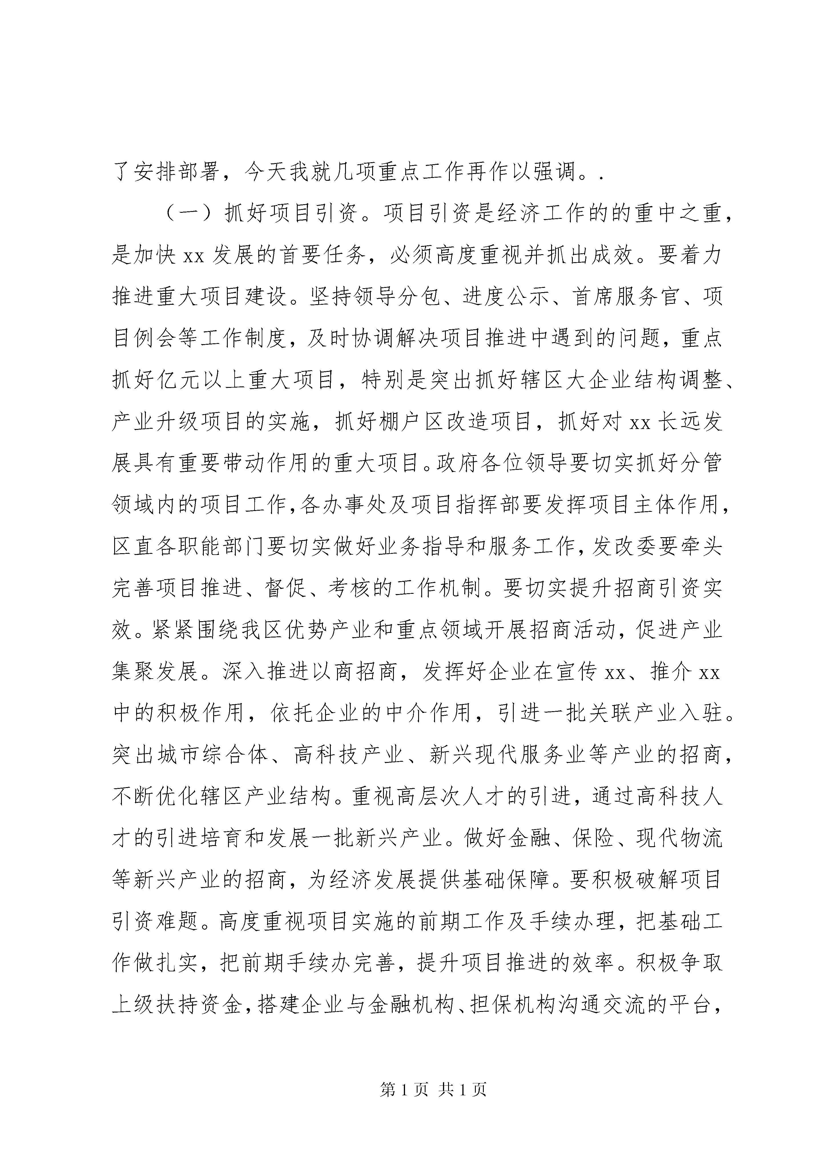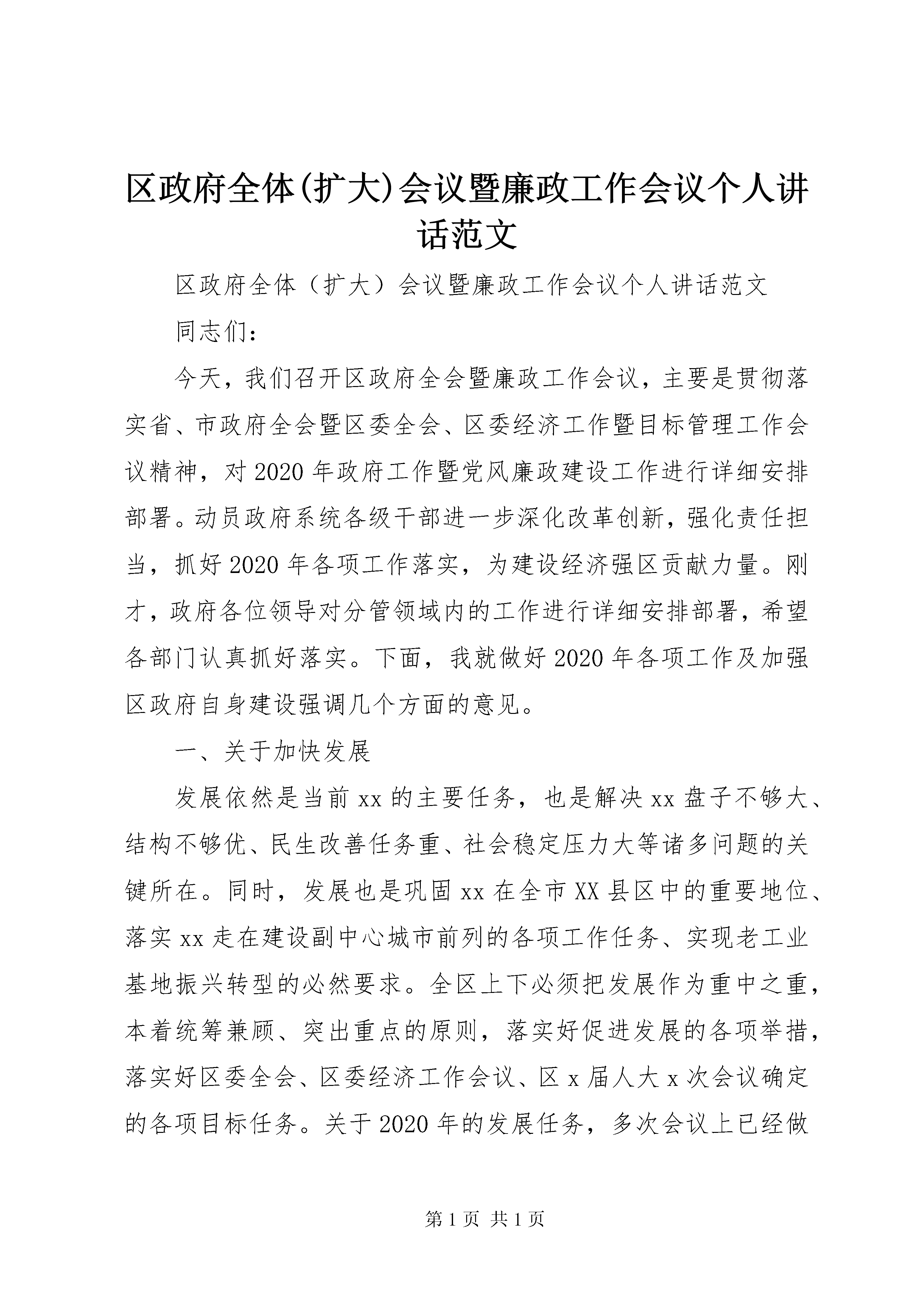 区政府全体(扩大)会议暨廉政工作会议个人讲话范文区政府全体(扩大)会议暨廉政工作会议个人讲话范文同志们:今天,我们召开区政府全会暨廉政工作会议,主要是贯彻落实省、市政府全会暨区委全会、区委经济工作暨目标管理工作会议精神,对2020年政府工作暨党风廉政建设工作进行详细安排部署。动员政府系统各级干部进一步深化改革创新,强化责任担当,抓好2020年各项工作落实,为建设经济强区贡献力量。刚才,政府各位领导对分管领域内的工作进行详细安排部署,希望各部门认真抓好落实。下面,我就做好2020年各项工作及加强区政府自身建设强调几个方面的意见。一、关于加快发展发展依然是当前xx的主要任务,也是解决xx盘子不够大、结构不够优、民生改善任务重、社会稳定压力大等诸多问题的关键所在。同时,发展也是巩固xx在全市XX县区中的重要地位、落实xx走在建设副中心城市前列的各项工作任务、实现老工业基地振兴转型的必然要求。全区上下必须把发展作为重中之重,本着统筹兼顾、突出重点的原则,落实好促进发展的各项举措,落实好区委全会、区委经济工作会议、区x届人大x次会议确定的各项目标任务。关于2020年的发展任务,多次会议上已经做了安排部署,今天我就几项重点工作再作以强调。.(一)抓好项目引资。项目引资是经济工作的的重中之重,是加快xx发展的首要任务,必须高度重视并抓出成效。要着力推进重大项目建设。坚持领导分包、进度公示、首席服务官、项目例会等工作制度,及时协调解决项目推进中遇到的问题,重点抓好亿元以上重大项目,特别是突出抓好辖区大企业结构调整、产业升级项目的实施,抓好棚户区改造项目,抓好对xx长远发展具有重要带动作用的重大项目。政府各位领导要切实抓好分管领域内的项目工作,各办事处及项目指挥部要发挥项目主体作用,区直各职能部门要切实做好业务指导和服务工作,发改委要牵头完善项目推进、督促、考核的工作机制。要切实提升招商引资实效。紧紧围绕我区优势产业和重点领域开展招商活动,促进产业集聚发展。深入推进以商招商,发挥好企业在宣传xx、推介xx中的积极作用,依托企业的中介作用,引进一批关联产业入驻。突出城市综合体、高科技产业、新兴现代服务业等产业的招商,不断优化辖区产业结构。重视高层次人才的引进,通过高科技人才的引进培育和发展一批新兴产业。做好金融、保险、现代物流等新兴产业的招商,为经济发展提供基础保障。要积极破解项目引资难题。高度重视项目实施的前期工作及手续办理,把基础工作做扎实,把前期手续办完善,提升项目推进的效率。积极争取上级扶持资金,搭建企业与金融机构、担保机构沟通交流的平台,解决好项目融资问题。(二)抓好城市更新改造。学习城市创新经验,聘请国内一流的专业机构,对我区的产业发展及空间布局进行规划设计,用科学的规划指导城市更新改造及产业升级。要不断完善城市基础设施。全力做好市属道路涉及的征迁工作,高标准做好秦岭路防洪渠桥扩宽改造工程,对区属道路、县乡村组道路进行精细化维护,尽快启动新建道路工程。做好变电站电力设施建设工程,开工建设xx等工程。加强与供水、供热、燃气等部门的沟通对接,扩大配套设施覆盖范围。要有序推进城市更新改造。加快x个村的安置房建设及商业地块开发,启动x村的改造,稳妥推进其他城中村、城郊村的改造。引导辖区大企业在市、区的科学规划指导下,加快老旧生活区、棚户区改造,重点实施好x等棚户区改造。要持续推进宜居XX县区建设。高标准做好第三批老旧小区环境综合整治。不断巩固国家卫生城市、全国文明城市创建成果,以城管体制改革为突破口,进一步提升城市管理水平。推进城市绿、亮、净、美、畅工程,深入推进国家环保模范城市创建,打造生态宜居XX县区。(三)抓好服务业提升工程。围绕服务业做大做强目标,推进传统服务业提档升级,培育发展新兴现代服务业,大力推进战略性新兴产业,以服务业的发展调整产业结构,健全现代产业体系。要巩固提升传统服务业。确保x等项目尽快开业,培育壮大x周边商业核心区。加快上百大楼改造升级,引进知名品牌和新型业态,重铸x商圈辉煌。在西部区域适当发展城市综合体,改变我区服务业发展东高西部现状。要大力发展新兴服务业。推进x等项目实施,做好x等项目,抓好x文化创意产业园、x主题公园等文化项目实施。培育发展楼宇经济,重点抓好总部型企业的引进。要积极培育战略性新兴产业。借助x科研院所、高等院校的科教资源优势,依托工业机器人重点企业,大力发展工业设计、智能制造等战略性新兴产业,打造国内有重要影响力的机器人及智能装备研发和生产基地。(四)抓好工业转型升级。发挥xx工业基础优势,适应产业升级趋势,加快工业转型,促进xx装备制造业基地向高端、高附加值转变。要服务好辖企大企业结构调整项目。充分发挥中科院自动化研究所、欧辰自动化智能技术等企业的作用,引导辖区大企业进行