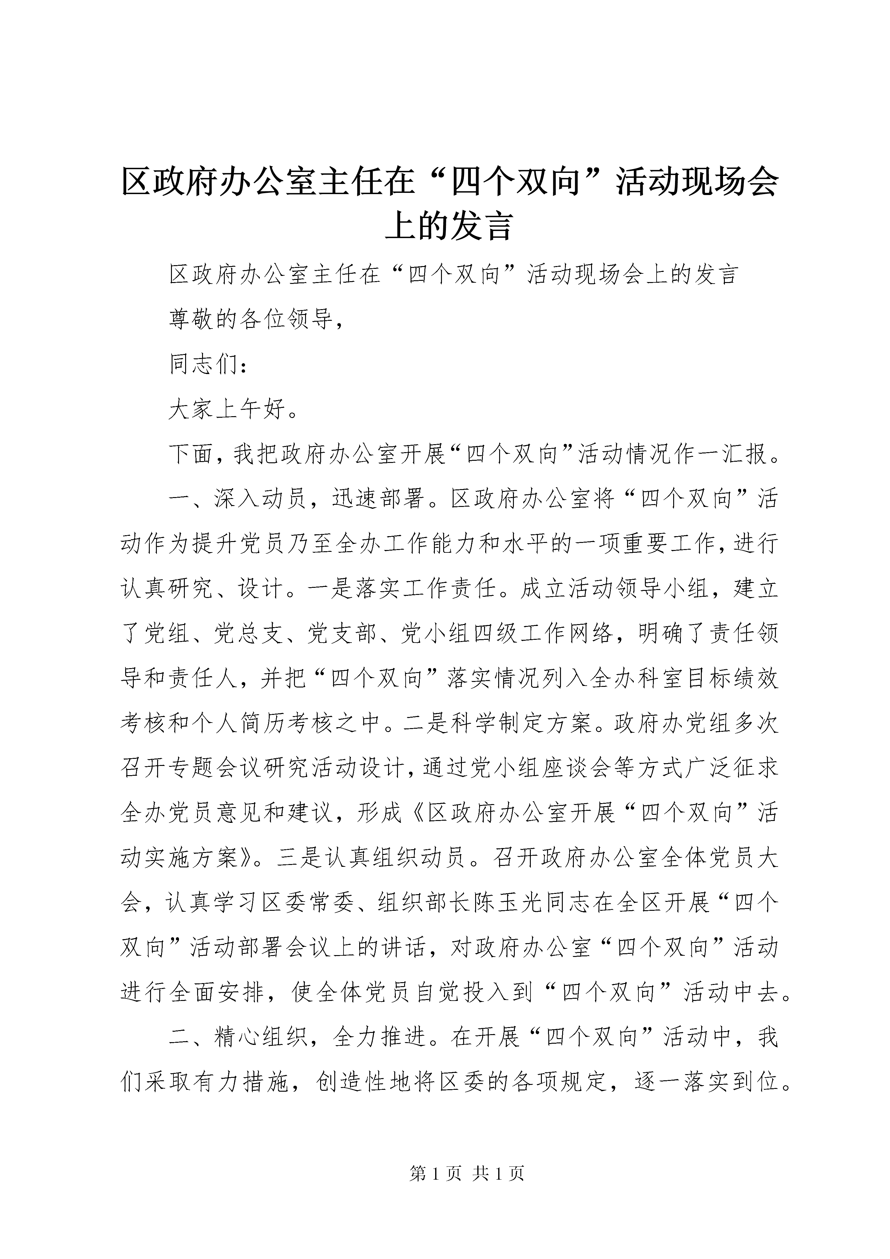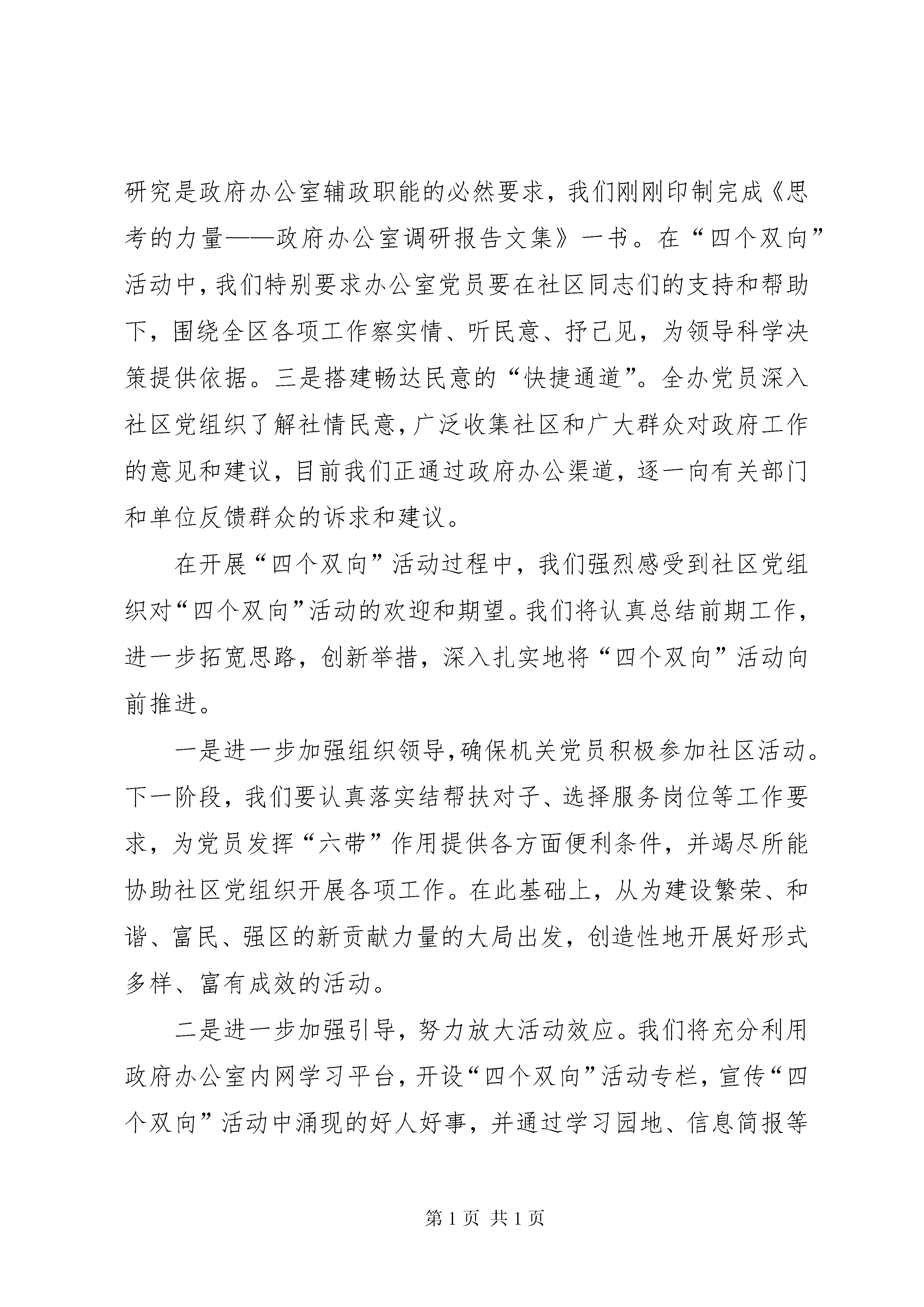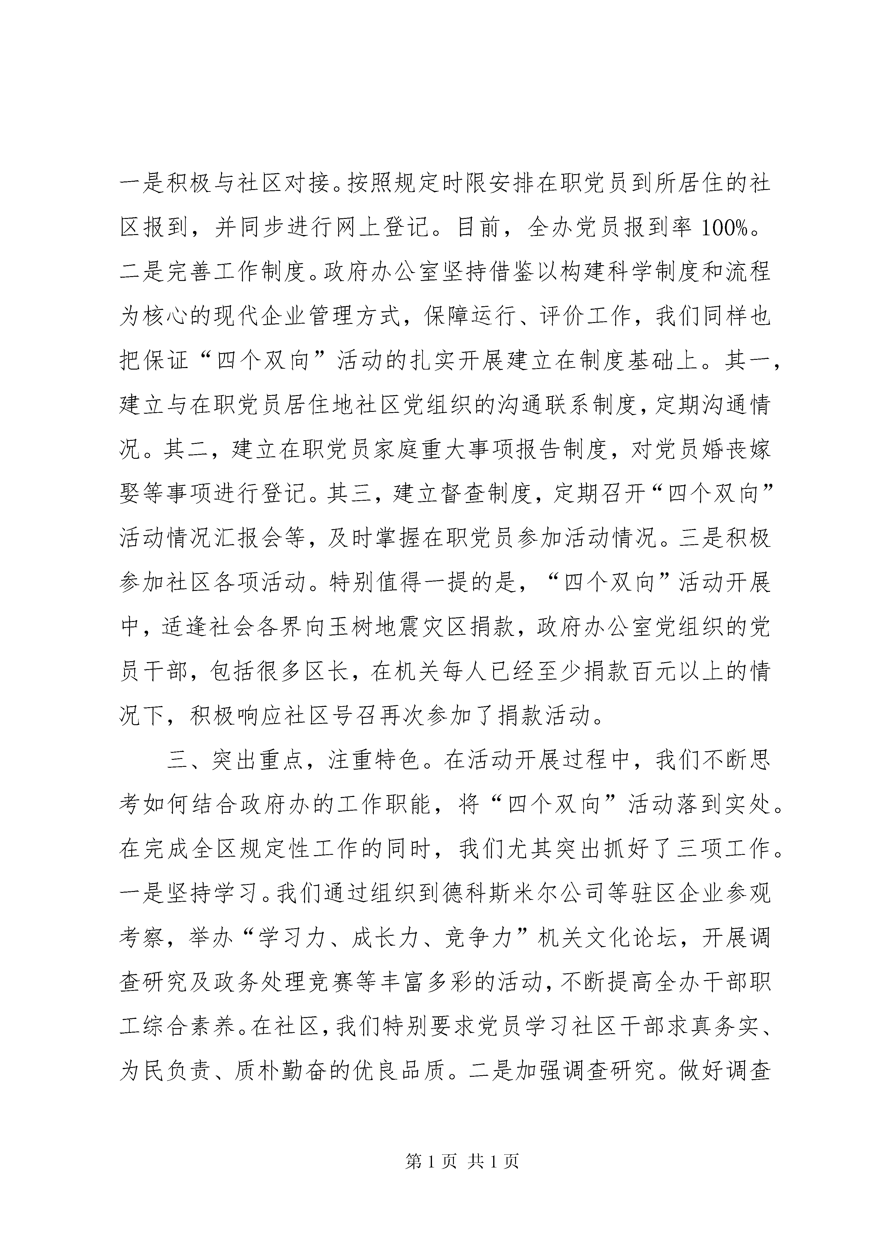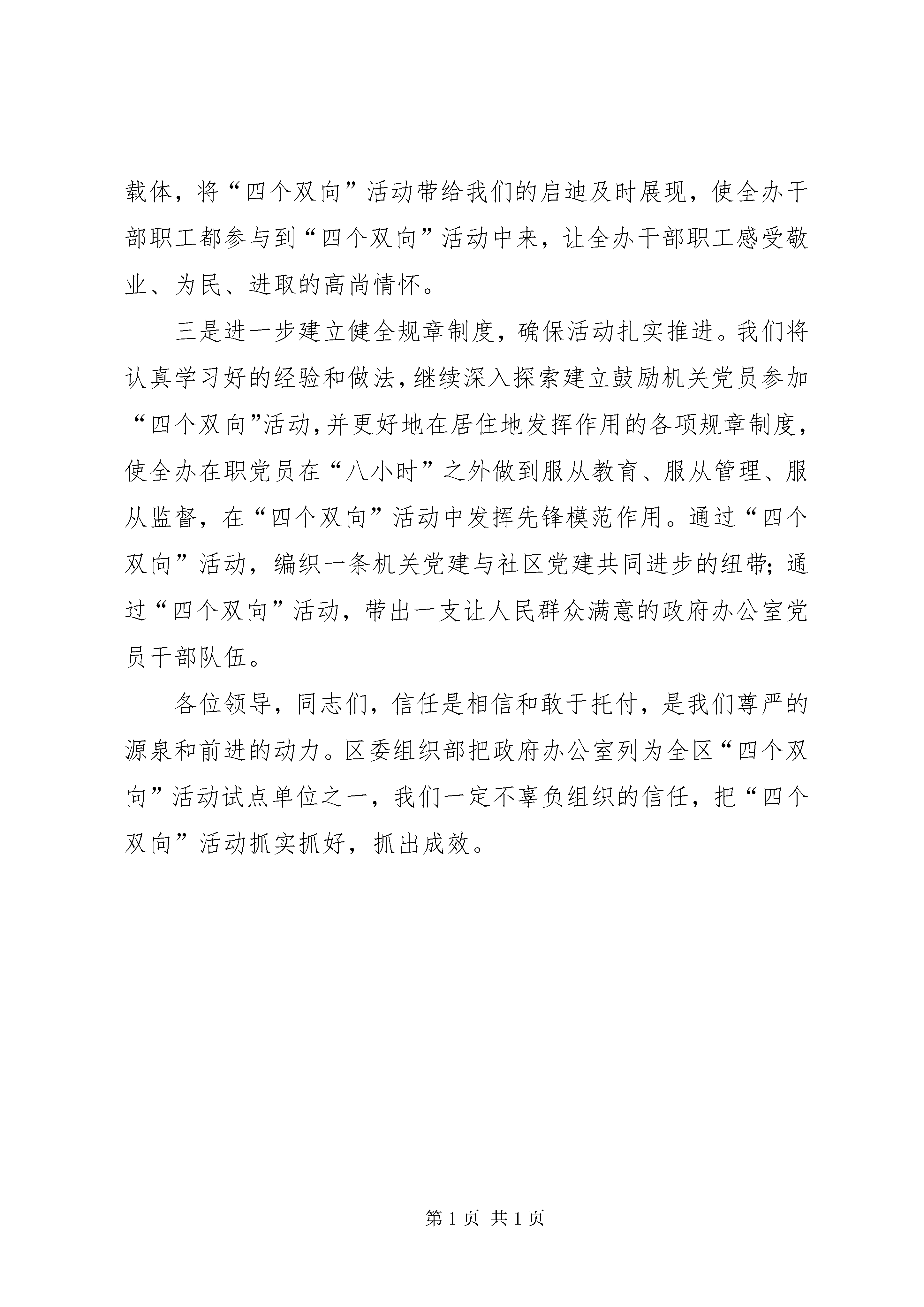 区政府办公室主任在“四个双向”活动现场会上的发言区政府办公室主任在“四个双向”活动现场会上的发言尊敬的各位领导,同志们:大家上午好。下面,我把政府办公室开展“四个双向”活动情况作一汇报。一、深入动员,迅速部署。区政府办公室将“四个双向”活动作为提升党员乃至全办工作能力和水平的一项重要工作,进行认真研究、设计。一是落实工作责任。成立活动领导小组,建立了党组、党总支、党支部、党小组四级工作网络,明确了责任领导和责任人,并把“四个双向”落实情况列入全办科室目标绩效考核和个人简历考核之中。二是科学制定方案。政府办党组多次召开专题会议研究活动设计,通过党小组座谈会等方式广泛征求全办党员意见和建议,形成《区政府办公室开展“四个双向”活动实施方案》。三是认真组织动员。召开政府办公室全体党员大会,认真学习区委常委、组织部长陈玉光同志在全区开展“四个双向”活动部署会议上的讲话,对政府办公室“四个双向”活动进行全面安排,使全体党员自觉投入到“四个双向”活动中去。二、精心组织,全力推进。在开展“四个双向”活动中,我们采取有力措施,创造性地将区委的各项规定,逐一落实到位。一是积极与社区对接。按照规定时限安排在职党员到所居住的社区报到,并同步进行网上登记。目前,全办党员报到率100%。二是完善工作制度。政府办公室坚持借鉴以构建科学制度和流程为核心的现代企业管理方式,保障运行、评价工作,我们同样也把保证“四个双向”活动的扎实开展建立在制度基础上。其一,建立与在职党员居住地社区党组织的沟通联系制度,定期沟通情况。其二,建立在职党员家庭重大事项报告制度,对党员婚丧嫁娶等事项进行登记。其三,建立督查制度,定期召开“四个双向”活动情况汇报会等,及时掌握在职党员参加活动情况。三是积极参加社区各项活动。特别值得一提的是,“四个双向”活动开展中,适逢社会各界向玉树地震灾区捐款,政府办公室党组织的党员干部,包括很多区长,在机关每人已经至少捐款百元以上的情况下,积极响应社区号召再次参加了捐款活动。三、突出重点,注重特色。在活动开展过程中,我们不断思考如何结合政府办的工作职能,将“四个双向”活动落到实处。在完成全区规定性工作的同时,我们尤其突出抓好了三项工作。一是坚持学习。我们通过组织到德科斯米尔公司等驻区企业参观考察,举办“学习力、成长力、竞争力”机关文化论坛,开展调查研究及政务处理竞赛等丰富多彩的活动,不断提高全办干部职工综合素养。在社区,我们特别要求党员学习社区干部求真务实、为民负责、质朴勤奋的优良品质。二是加强调查研究。做好调查研究是政府办公室辅政职能的必然要求,我们刚刚印制完成《思考的力量——政府办公室调研报告文集》一书。在“四个双向”活动中,我们特别要求办公室党员要在社区同志们的支持和帮助下,围绕全区各项工作察实情、听民意、抒己见,为领导科学决策提供依据。三是搭建畅达民意的“快捷通道”。全办党员深入社区党组织了解社情民意,广泛收集社区和广大群众对政府工作的意见和建议,目前我们正通过政府办公渠道,逐一向有关部门和单位反馈群众的诉求和建议。在开展“四个双向”活动过程中,我们强烈感受到社区党组织对“四个双向”活动的欢迎和期望。我们将认真总结前期工作,进一步拓宽思路,创新举措,深入扎实地将“四个双向”活动向前推进。一是进一步加强组织领导,确保机关党员积极参加社区活动。下一阶段,我们要认真落实结帮扶对子、选择服务岗位等工作要求,为党员发挥“六带”作用提供各方面便利条件,并竭尽所能协助社区党组织开展各项工作。在此基础上,从为建设繁荣、和谐、富民、强区的新贡献力量的大局出发,创造性地开展好形式多样、富有成效的活动。二是进一步加强引导,努力放大活动效应。我们将充分利用政府办公室内网学习平台,开设“四个双向”活动专栏,宣传“四个双向”活动中涌现的好人好事,并通过学习园地、信息简报等载体,将“四个双向”活动带给我们的启迪及时展现,使全办干部职工都参与到“四个双向”活动中来,让全办干部职工感受敬业、为民、进取的高尚情怀。三是进一步建立健全规章制度,确保活动扎实推进。我们将认真学习好的经验和做法,继续深入探索建立鼓励机关党员参加“四个双向”活动,并更好地在居住地发挥作用的各项规章制度,使全办在职党员在“八小时”之外做到服从教育、服从管理、服从监督,在“四个双向”活动中发挥先锋模范作用。通过“四个双向”活动,编织一条机关党建与社区党建共同进步的纽带;通过“四个双向”活动,带出一支让人民群众满意的政府办公室党员干部队伍。各位领导,同志们,信任是相信和敢于托付,是我们尊严的源泉和前进的动力。区委组织部把政府办公室列为全区“四个双向”活动试点单位之一,我们一定不辜负组织的信任,把“四个双向”活动抓实抓好,抓出成效。