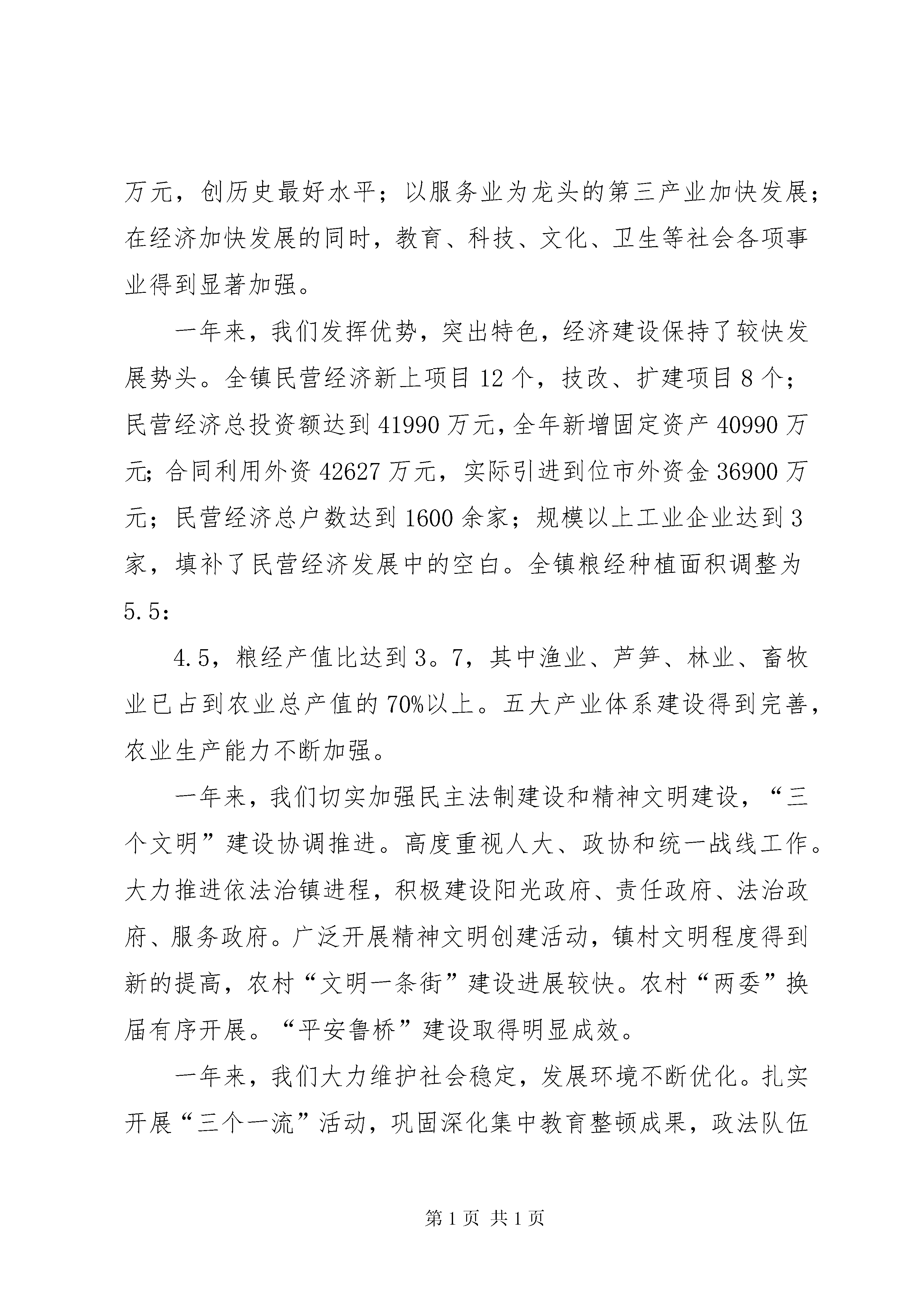 区政府领导重点企业迎春节茶话会上的讲话同志们:新年的钟声即将敲响,历史又将翻开新的一页。在这辞旧迎新之际,我们欢聚一堂,畅谈大好形势,展望光明未来,共叙友情,倍感亲切。在此,我代表镇党委、政府向辛勤工作一年的同志们,致以美好的祝愿和亲切的问候。刚刚过去的xx年,是我镇向全面建设小康社会宏伟目标阔步前进的一年。我们高举邓小平理论和“三个代表”重要思想伟大旗帜,牢固树立和认真落实科学发展观,一手抓改革促开放推动经济社会发展,一手抓班子带队伍加强党的建设,奋力拼博,扎实工作,跨越式发展迈出了新步伐,各方面工作取得了新成就,全镇呈现出一派欣欣向荣的喜人景象。一年来,我们认真贯彻上级调控政策,经济社会发展跃上新台阶。坚持以科学发展观为指导,积极在发展中搞好调控,在调控中促进发展,经济发展呈现总量跨越、效益提高、结构优化、活力增强的良好态势。xx年,全镇生产总值增长19.4%,在去年超过3.6亿元基础上突破4.3亿元大关,提前一年完成“十五”计划经济总量目标。全镇地税收入达到293万元,比xx年增加199%。三次产业实现新突破,在大灾之年实现粮食恢复性增产,农民人均收增加400余元,达到3192元,创历史最高纪录;工业经济实现速度、质量、效益相协调,规模以上工业增加值为2215万元,创历史最好水平;以服务业为龙头的第三产业加快发展;在经济加快发展的同时,教育、科技、文化、卫生等社会各项事业得到显著加强。一年来,我们发挥优势,突出特色,经济建设保持了较快发展势头。全镇民营经济新上项目12个,技改、扩建项目8个;民营经济总投资额达到41990万元,全年新增固定资产40990万元;合同利用外资42627万元,实际引进到位市外资金36900万元;民营经济总户数达到1600余家;规模以上工业企业达到3家,填补了民营经济发展中的空白。全镇粮经种植面积调整为5.5:4.5,粮经产值比达到3。7,其中渔业、芦笋、林业、畜牧业已占到农业总产值的70%以上。五大产业体系建设得到完善,农业生产能力不断加强。一年来,我们切实加强民主法制建设和精神文明建设,“三个文明”建设协调推进。高度重视人大、政协和统一战线工作。大力推进依法治镇进程,积极建设阳光政府、责任政府、法治政府、服务政府。广泛开展精神文明创建活动,镇村文明程度得到新的提高,农村“文明一条街”建设进展较快。农村“两委”换届有序开展。“平安鲁桥”建设取得明显成效。一年来,我们大力维护社会稳定,发展环境不断优化。扎实开展“三个一流”活动,巩固深化集中教育整顿成果,政法队伍建设全面加强,群防群控体系不断完善。高度重视预防和处置群体性事件工作,在全镇集中开展不稳定因素大排查调处,全力维护安定团结的政治局面。一年来,我们认真做好关心群众生产生活的工作,人民群众得到更多实惠。坚持执政为民,关注民生、善解民忧、谋求民利,实实在在为群众解决具体问题。全面落实粮食直补和农业税减免政策,对符合条件的群众实行最低生活保障制度。加大扶贫工作力度,重点帮助部分渔业村的贫困人口解决温饱问题。切实做好沿湖各村的抗灾救灾、灾后安置和恢复重建工作,确保受灾群众生活有着落、生产有保障。一年来,我们狠抓领导班子和干部队伍建设,党的建设全面加强。按照“举旗帜、抓班子、带队伍、促发展”的思路,把领导班子建设作为干部工作的重中之重,突出抓好主要部门负责人的选配和培养。大张旗鼓表彰了一批优秀单位负责人、村支部书记,并把表彰和使用有机结合起来,形成鲜明的用人导向。坚持把开好民主生活会作为加强领导班子建设的重要抓手,在领导班子内严肃认真地开展批评与自我批评。认真抓好了作风转变工作,镇机关工作人员的生活、工作作风明显改善,工作积极性空前高涨,有效地推动了各项工作的顺利进展。回首往昔,我深感创业的艰辛,成功的不易。它包含着同志们的团结拼博,无私奉献;包含着社会各界的鼎力相助。为此,我深表敬意和衷心感谢。面对成绩,我们清醒地懂得,这只能说明过去;清楚地知道,与上级和人民的要求还有很大的差距。不娇不躁,再接再劢,是我们遵循的准则;我们只能是:“雄关漫道真如铁,而今迈步从头越”。展望未来,我们信心百倍。虽任重道远,但我们充满必胜和信心。xx年是“十五”计划的最后一年,也是实现我镇全面建设小康社会第一步目标的关键一年,我们要抓住机遇,乘势而上,努力把鲁桥发展大业不断推向前进。在新的一年里,我们一定要用科学发展观统领经济社会发展全局,深化改革、扩大开放,加快经济结构调整、转变经济增长方式,努力实现我镇经济社会更快更好地发展。在新的一年里,我们一定要以执政能力建设为重点,全面加强党的思想、组织、作风和制度建设,突出抓好领导班子和干部队伍建设,不断提高各级党组织的创造力、凝聚力和战斗力,为推进我镇各项工作提供坚强的组织保证。在新的一年里,我们一