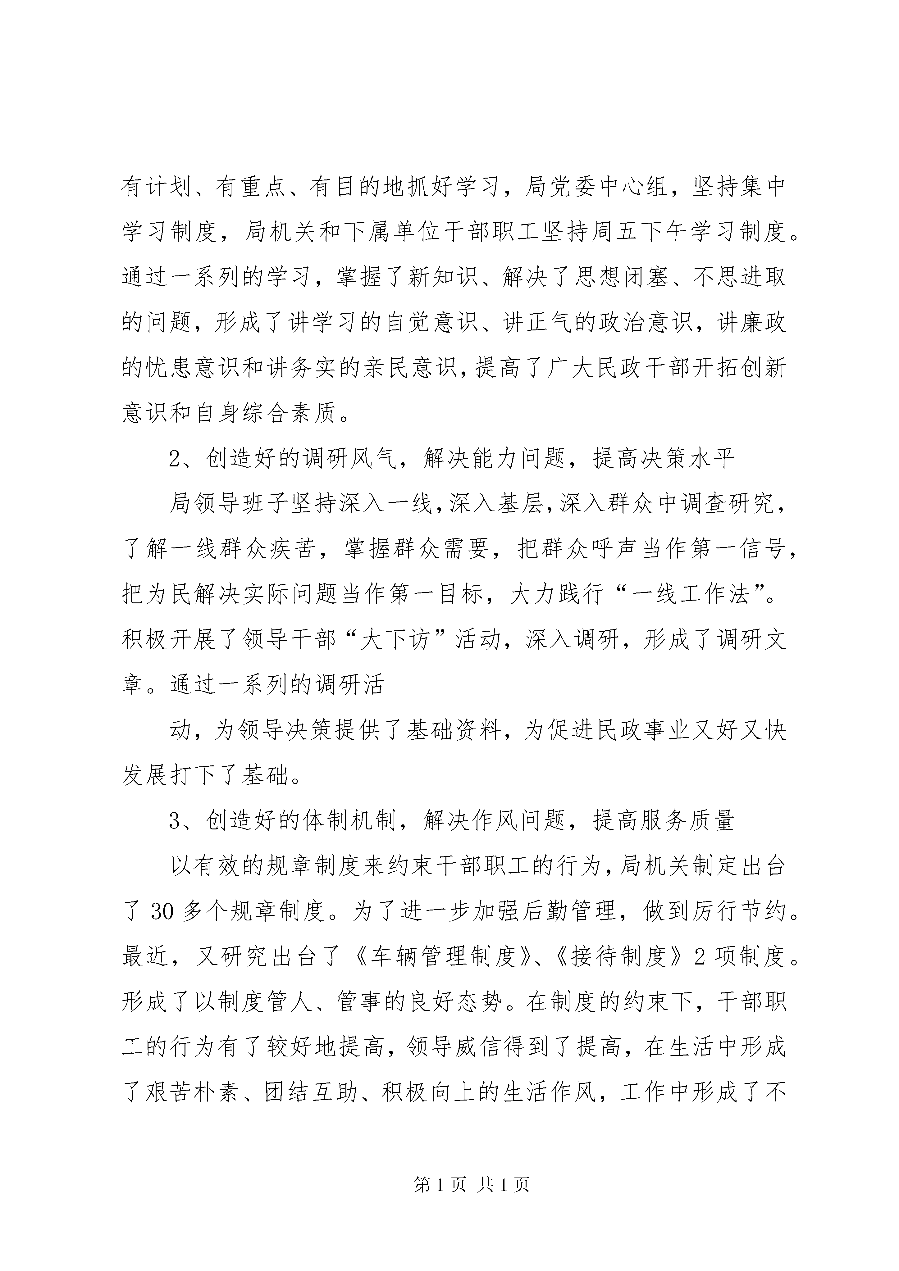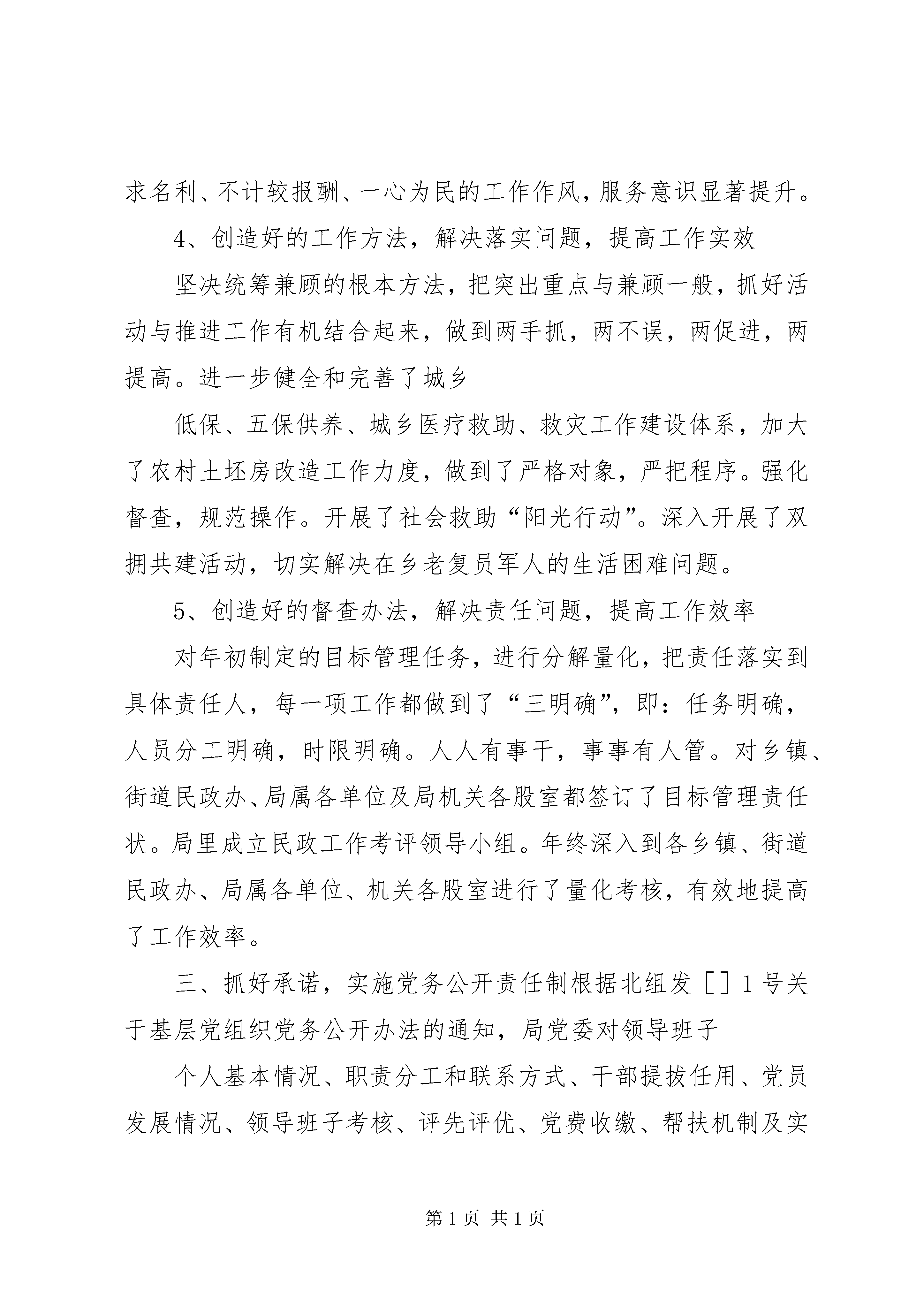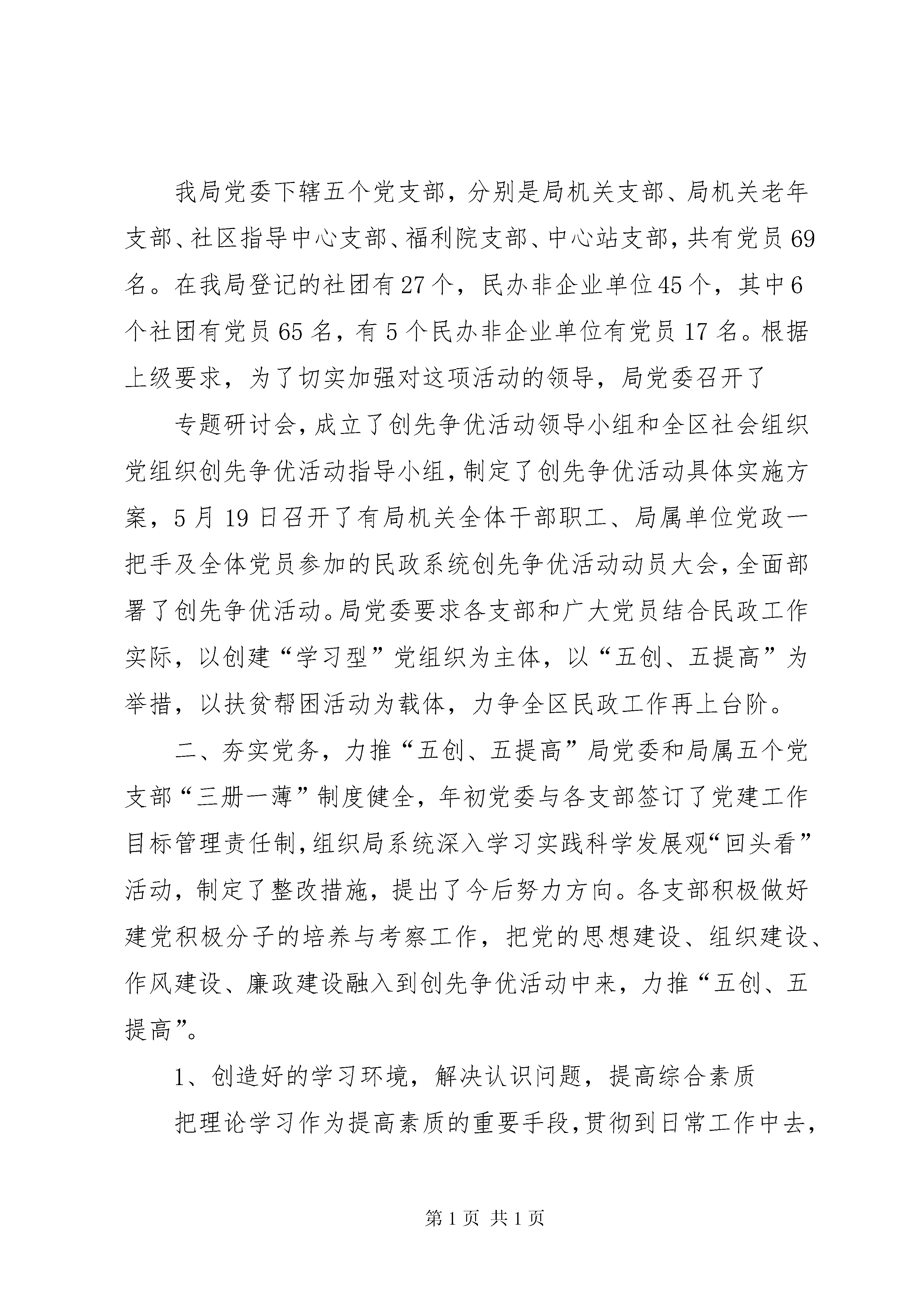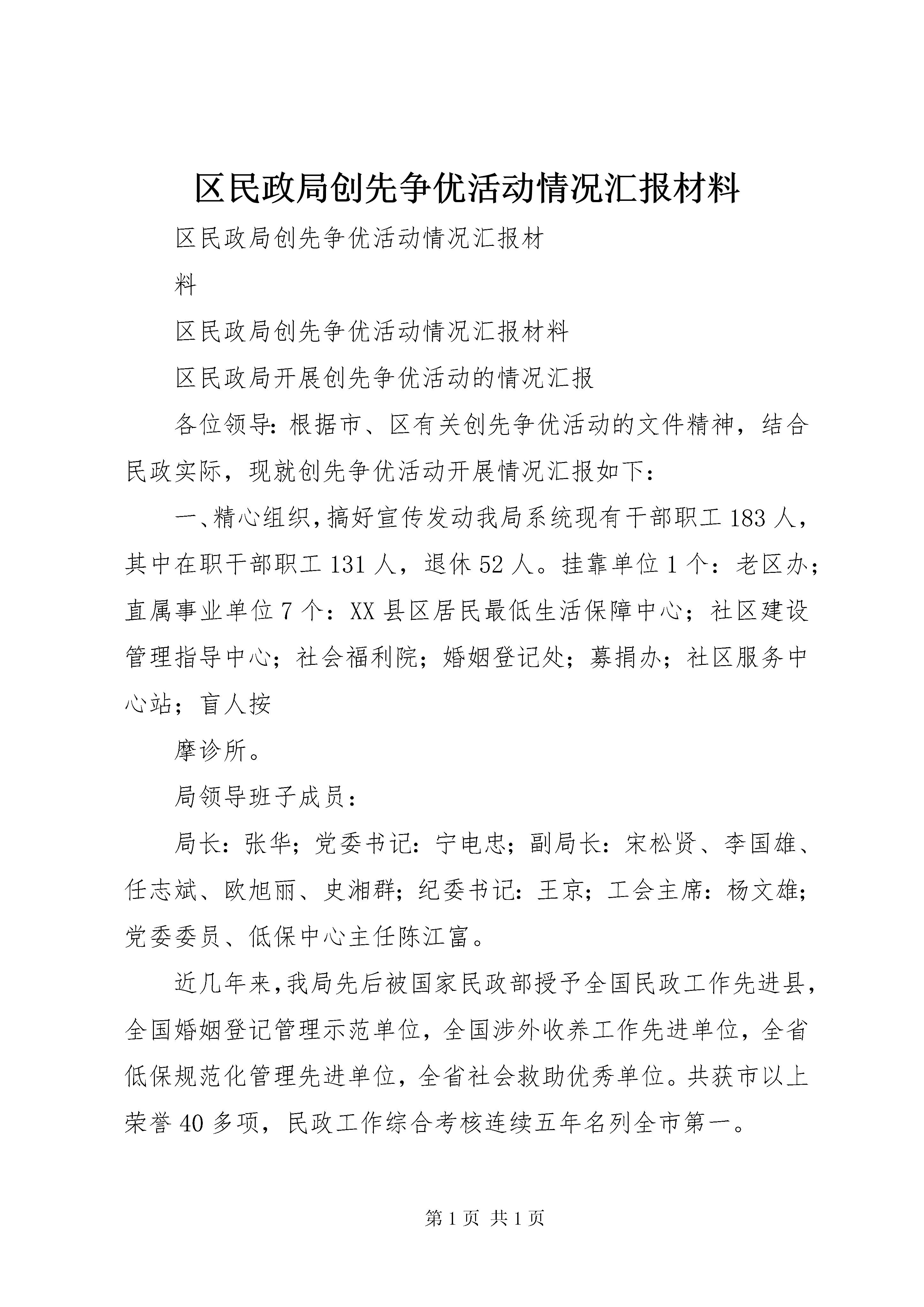 区民政局创先争优活动情况汇报材料区民政局创先争优活动情况汇报材料区民政局创先争优活动情况汇报材料区民政局开展创先争优活动的情况汇报各位领导:根据市、区有关创先争优活动的文件精神,结合民政实际,现就创先争优活动开展情况汇报如下:一、精心组织,搞好宣传发动我局系统现有干部职工183人,其中在职干部职工131人,退休52人。挂靠单位1个:老区办;直属事业单位7个:XX县区居民最低生活保障中心;社区建设管理指导中心;社会福利院;婚姻登记处;募捐办;社区服务中心站;盲人按摩诊所。局领导班子成员:局长:张华;党委书记:宁电忠;副局长:宋松贤、李国雄、任志斌、欧旭丽、史湘群;纪委书记:王京;工会主席:杨文雄;党委委员、低保中心主任陈江富。近几年来,我局先后被国家民政部授予全国民政工作先进县,全国婚姻登记管理示范单位,全国涉外收养工作先进单位,全省低保规范化管理先进单位,全省社会救助优秀单位。共获市以上荣誉40多项,民政工作综合考核连续五年名列全市第一。我局党委下辖五个党支部,分别是局机关支部、局机关老年支部、社区指导中心支部、福利院支部、中心站支部,共有党员69名。在我局登记的社团有27个,民办非企业单位45个,其中6个社团有党员65名,有5个民办非企业单位有党员17名。根据上级要求,为了切实加强对这项活动的领导,局党委召开了专题研讨会,成立了创先争优活动领导小组和全区社会组织党组织创先争优活动指导小组,制定了创先争优活动具体实施方案,5月19日召开了有局机关全体干部职工、局属单位党政一把手及全体党员参加的民政系统创先争优活动动员大会,全面部署了创先争优活动。局党委要求各支部和广大党员结合民政工作实际,以创建“学习型”党组织为主体,以“五创、五提高”为举措,以扶贫帮困活动为载体,力争全区民政工作再上台阶。二、夯实党务,力推“五创、五提高”局党委和局属五个党支部“三册一薄”制度健全,年初党委与各支部签订了党建工作目标管理责任制,组织局系统深入学习实践科学发展观“回头看”活动,制定了整改措施,提出了今后努力方向。各支部积极做好建党积极分子的培养与考察工作,把党的思想建设、组织建设、作风建设、廉政建设融入到创先争优活动中来,力推“五创、五提高”。1、创造好的学习环境,解决认识问题,提高综合素质把理论学习作为提高素质的重要手段,贯彻到日常工作中去,有计划、有重点、有目的地抓好学习,局党委中心组,坚持集中学习制度,局机关和下属单位干部职工坚持周五下午学习制度。通过一系列的学习,掌握了新知识、解决了思想闭塞、不思进取的问题,形成了讲学习的自觉意识、讲正气的政治意识,讲廉政的忧患意识和讲务实的亲民意识,提高了广大民政干部开拓创新意识和自身综合素质。2、创造好的调研风气,解决能力问题,提高决策水平局领导班子坚持深入一线,深入基层,深入群众中调查研究,了解一线群众疾苦,掌握群众需要,把群众呼声当作第一信号,把为民解决实际问题当作第一目标,大力践行“一线工作法”。积极开展了领导干部“大下访”活动,深入调研,形成了调研文章。通过一系列的调研活动,为领导决策提供了基础资料,为促进民政事业又好又快发展打下了基础。3、创造好的体制机制,解决作风问题,提高服务质量以有效的规章制度来约束干部职工的行为,局机关制定出台了30多个规章制度。为了进一步加强后勤管理,做到厉行节约。最近,又研究出台了《车辆管理制度》、《接待制度》2项制度。形成了以制度管人、管事的良好态势。在制度的约束下,干部职工的行为有了较好地提高,领导威信得到了提高,在生活中形成了艰苦朴素、团结互助、积极向上的生活作风,工作中形成了不求名利、不计较报酬、一心为民的工作作风,服务意识显著提升。4、创造好的工作方法,解决落实问题,提高工作实效坚决统筹兼顾的根本方法,把突出重点与兼顾一般,抓好活动与推进工作有机结合起来,做到两手抓,两不误,两促进,两提高。进一步健全和完善了城乡低保、五保供养、城乡医疗救助、救灾工作建设体系,加大了农村土坯房改造工作力度,做到了严格对象,严把程序。强化督查,规范操作。开展了社会救助“阳光行动”。深入开展了双拥共建活动,切实解决在乡老复员军人的生活困难问题。5、创造好的督查办法,解决责任问题,提高工作效率对年初制定的目标管理任务,进行分解量化,把责任落实到具体责任人,每一项工作都做到了“三明确”,即:任务明确,人员分工明确,时限明确。人人有事干,事事有人管。对乡镇、街道民政办、局属各单位及局机关各股室都签订了目标管理责任状。局里成立民政工作考评领导小组。年终深入到各乡镇、街道民政办、局属各单位、机关各股室进行了量化考核,有效地提高了工作效率。三、抓好承诺,实施党务公开责任制根据北组发[]1号关于基层党组织党务公开办法的通知,局党委对领导班子个人基本情况、职责分工