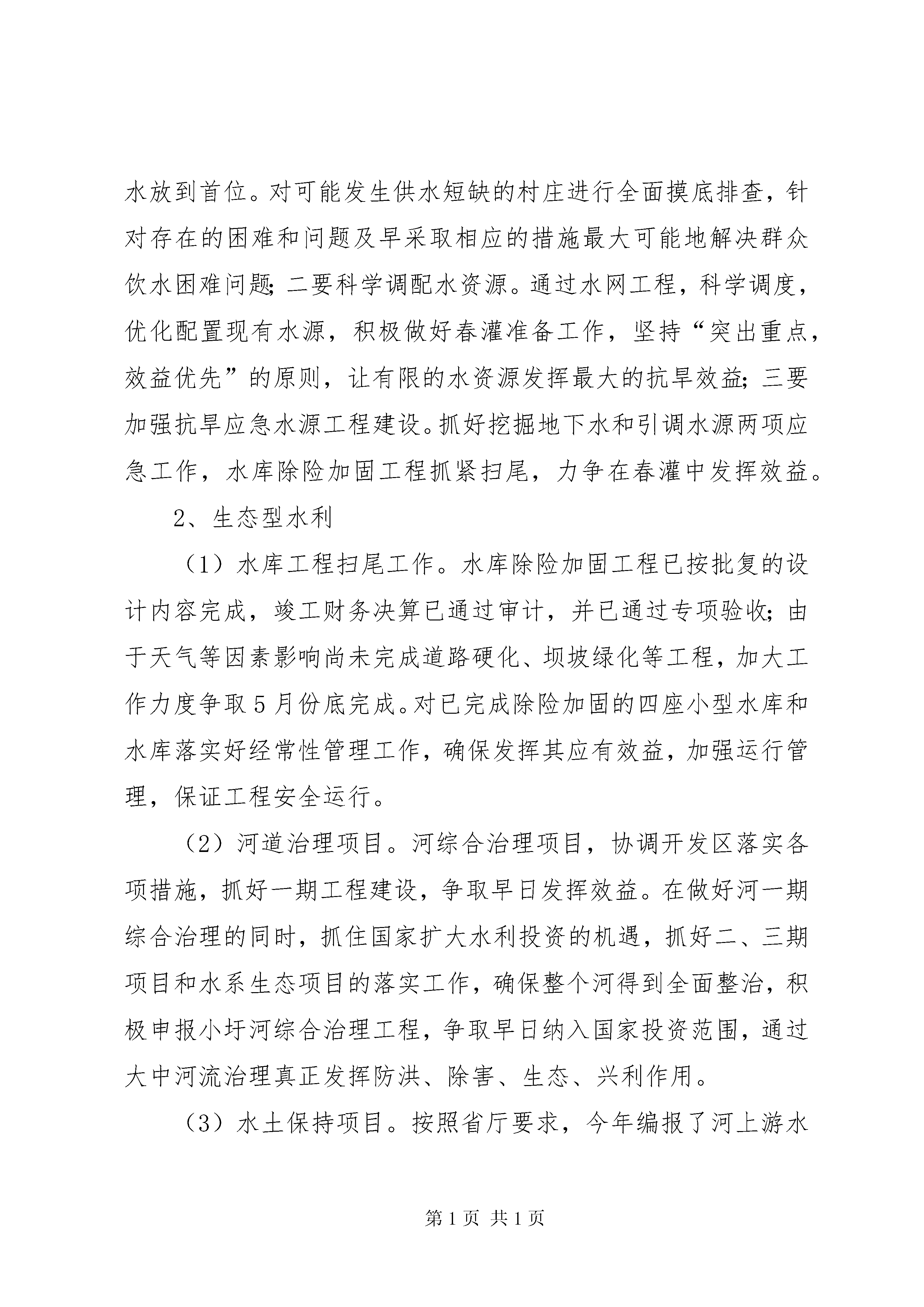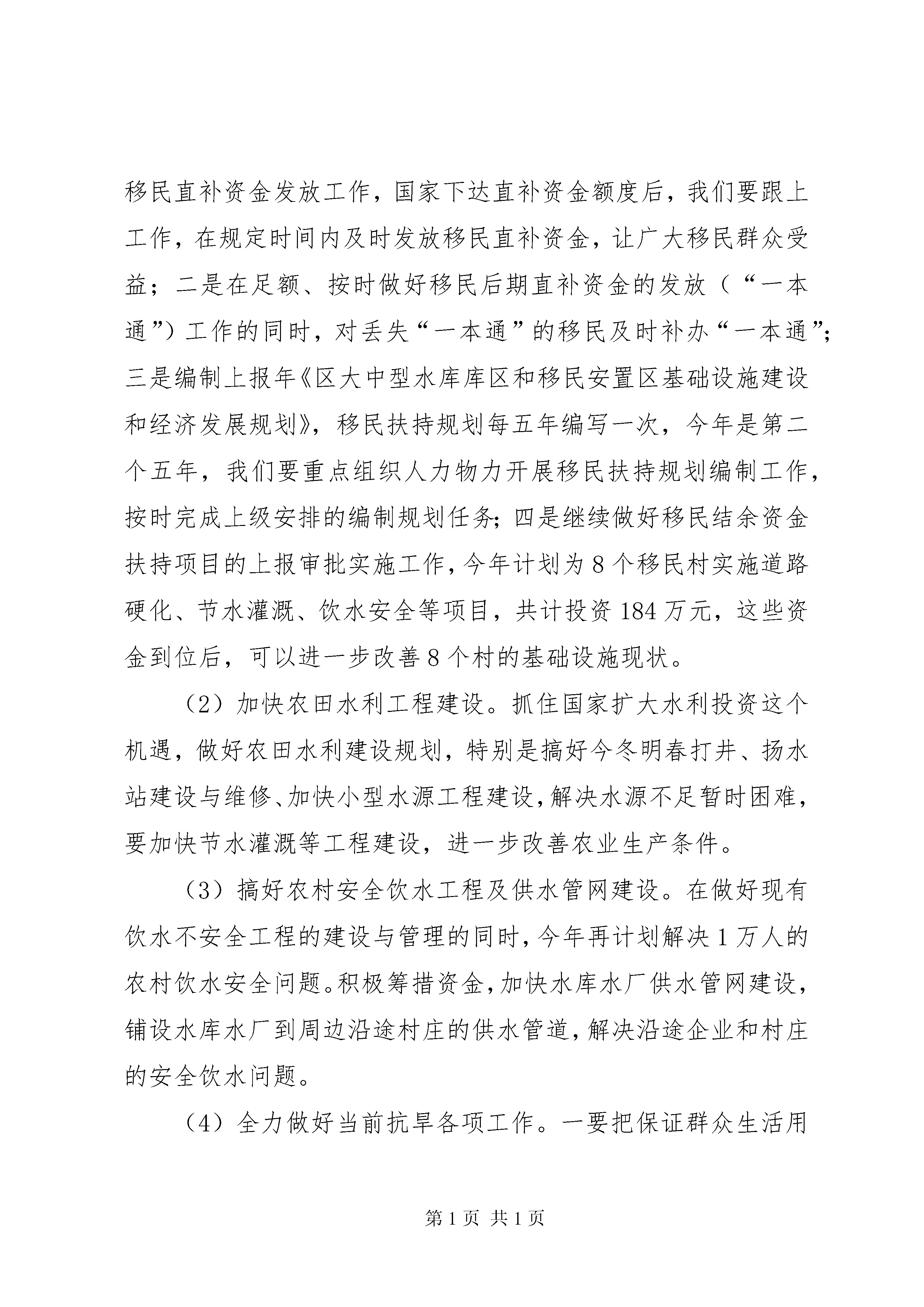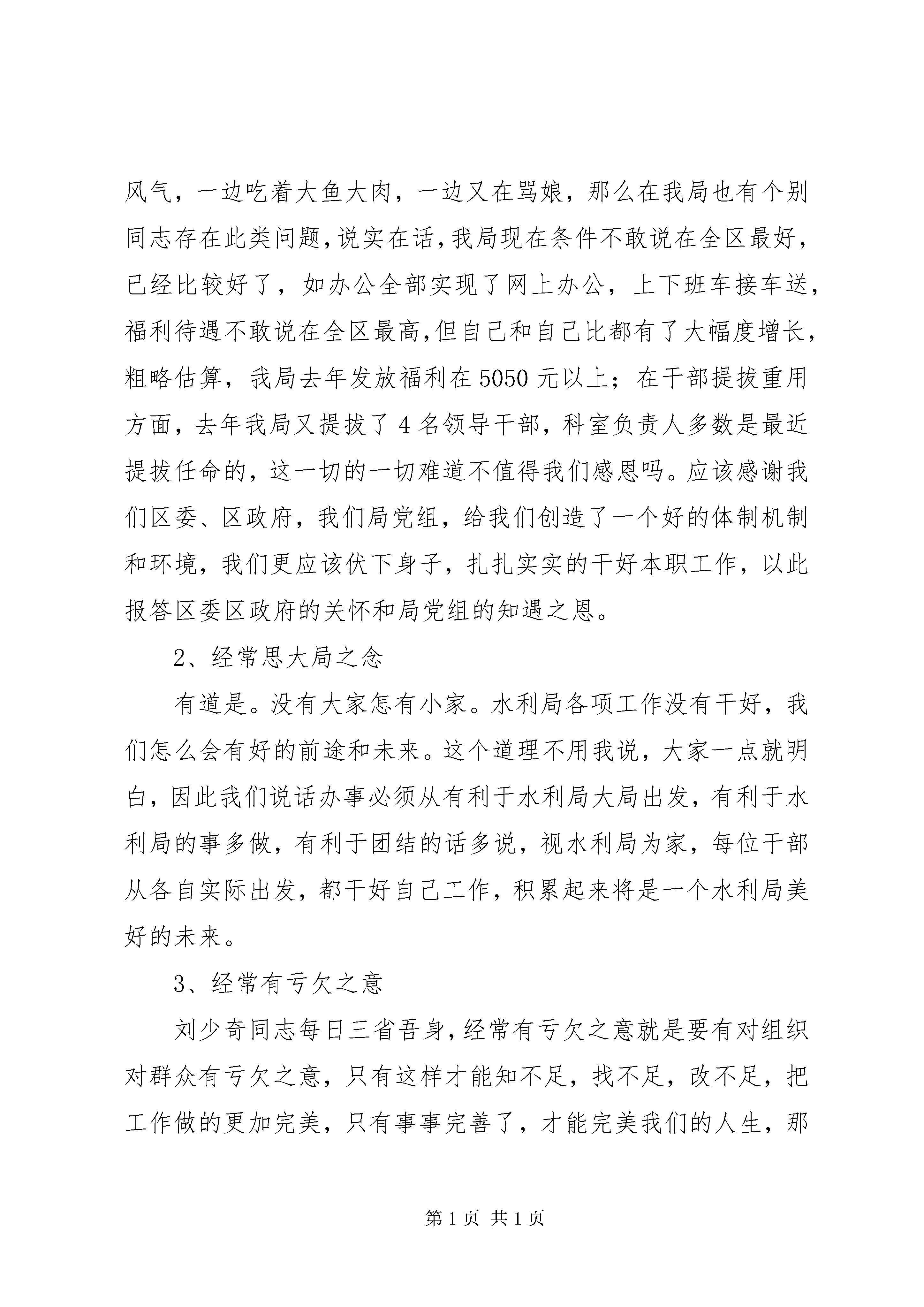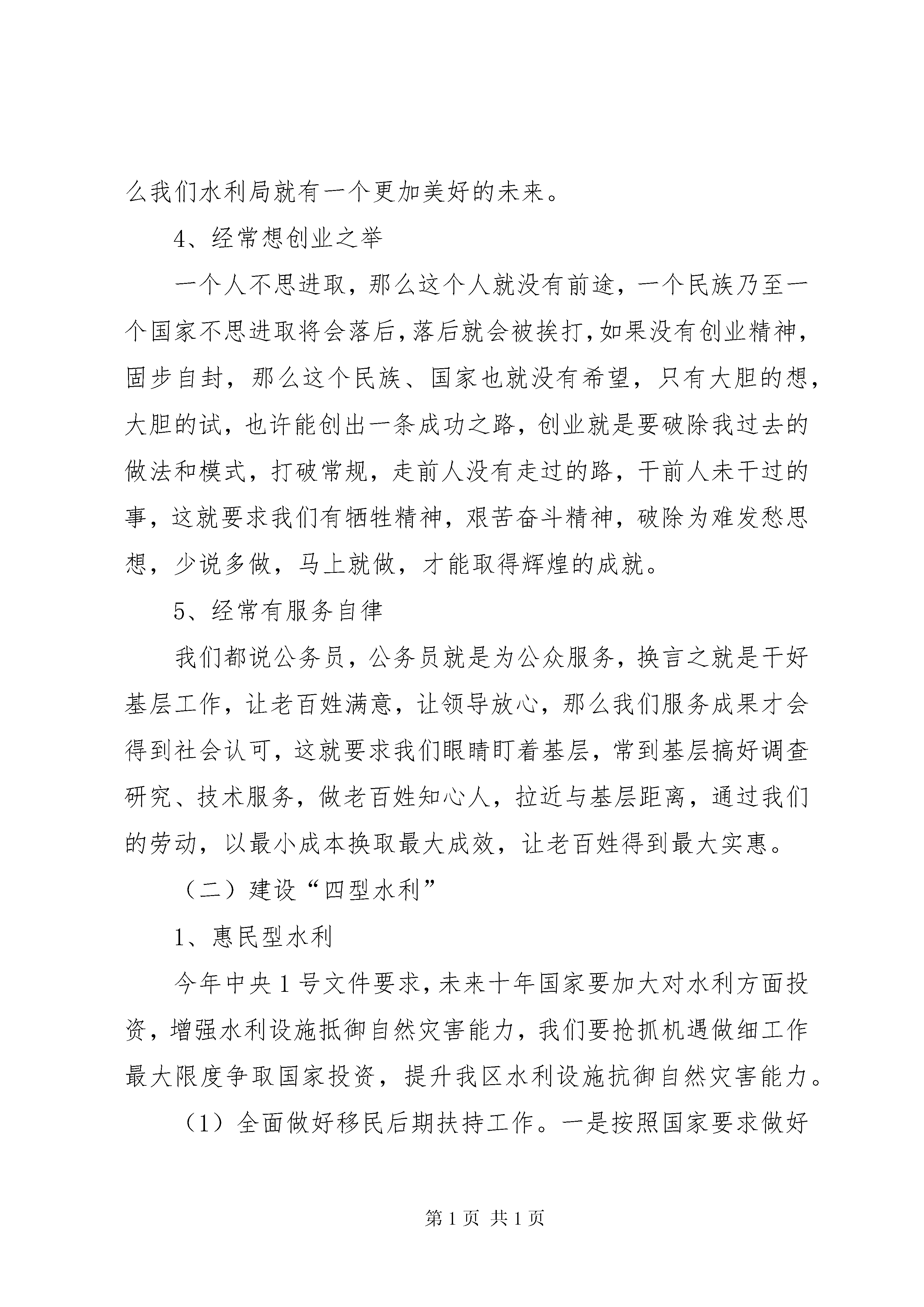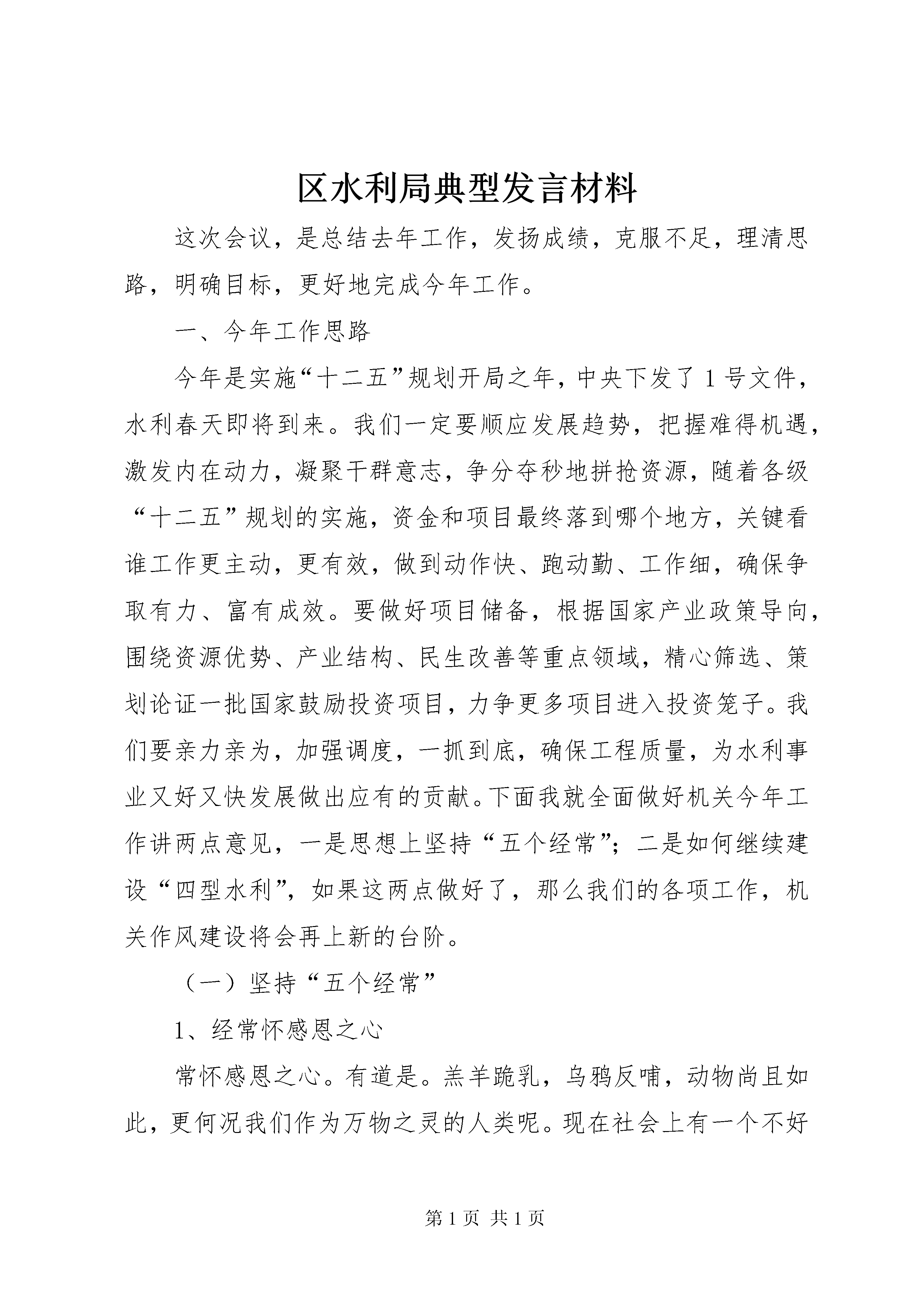 区水利局典型发言材料这次会议,是总结去年工作,发扬成绩,克服不足,理清思路,明确目标,更好地完成今年工作。一、今年工作思路今年是实施“十二五”规划开局之年,中央下发了1号文件,水利春天即将到来。我们一定要顺应发展趋势,把握难得机遇,激发内在动力,凝聚干群意志,争分夺秒地拼抢资源,随着各级“十二五”规划的实施,资金和项目最终落到哪个地方,关键看谁工作更主动,更有效,做到动作快、跑动勤、工作细,确保争取有力、富有成效。要做好项目储备,根据国家产业政策导向,围绕资源优势、产业结构、民生改善等重点领域,精心筛选、策划论证一批国家鼓励投资项目,力争更多项目进入投资笼子。我们要亲力亲为,加强调度,一抓到底,确保工程质量,为水利事业又好又快发展做出应有的贡献。下面我就全面做好机关今年工作讲两点意见,一是思想上坚持“五个经常”;二是如何继续建设“四型水利”,如果这两点做好了,那么我们的各项工作,机关作风建设将会再上新的台阶。(一)坚持“五个经常”1、经常怀感恩之心常怀感恩之心。有道是。羔羊跪乳,乌鸦反哺,动物尚且如此,更何况我们作为万物之灵的人类呢。现在社会上有一个不好风气,一边吃着大鱼大肉,一边又在骂娘,那么在我局也有个别同志存在此类问题,说实在话,我局现在条件不敢说在全区最好,已经比较好了,如办公全部实现了网上办公,上下班车接车送,福利待遇不敢说在全区最高,但自己和自己比都有了大幅度增长,粗略估算,我局去年发放福利在5050元以上;在干部提拔重用方面,去年我局又提拔了4名领导干部,科室负责人多数是最近提拔任命的,这一切的一切难道不值得我们感恩吗。应该感谢我们区委、区政府,我们局党组,给我们创造了一个好的体制机制和环境,我们更应该伏下身子,扎扎实实的干好本职工作,以此报答区委区政府的关怀和局党组的知遇之恩。2、经常思大局之念有道是。没有大家怎有小家。水利局各项工作没有干好,我们怎么会有好的前途和未来。这个道理不用我说,大家一点就明白,因此我们说话办事必须从有利于水利局大局出发,有利于水利局的事多做,有利于团结的话多说,视水利局为家,每位干部从各自实际出发,都干好自己工作,积累起来将是一个水利局美好的未来。3、经常有亏欠之意刘少奇同志每日三省吾身,经常有亏欠之意就是要有对组织对群众有亏欠之意,只有这样才能知不足,找不足,改不足,把工作做的更加完美,只有事事完善了,才能完美我们的人生,那么我们水利局就有一个更加美好的未来。4、经常想创业之举一个人不思进取,那么这个人就没有前途,一个民族乃至一个国家不思进取将会落后,落后就会被挨打,如果没有创业精神,固步自封,那么这个民族、国家也就没有希望,只有大胆的想,大胆的试,也许能创出一条成功之路,创业就是要破除我过去的做法和模式,打破常规,走前人没有走过的路,干前人未干过的事,这就要求我们有牺牲精神,艰苦奋斗精神,破除为难发愁思想,少说多做,马上就做,才能取得辉煌的成就。5、经常有服务自律我们都说公务员,公务员就是为公众服务,换言之就是干好基层工作,让老百姓满意,让领导放心,那么我们服务成果才会得到社会认可,这就要求我们眼睛盯着基层,常到基层搞好调查研究、技术服务,做老百姓知心人,拉近与基层距离,通过我们的劳动,以最小成本换取最大成效,让老百姓得到最大实惠。(二)建设“四型水利”1、惠民型水利今年中央1号文件要求,未来十年国家要加大对水利方面投资,增强水利设施抵御自然灾害能力,我们要抢抓机遇做细工作最大限度争取国家投资,提升我区水利设施抗御自然灾害能力。(1)全面做好移民后期扶持工作。一是按照国家要求做好移民直补资金发放工作,国家下达直补资金额度后,我们要跟上工作,在规定时间内及时发放移民直补资金,让广大移民群众受益;二是在足额、按时做好移民后期直补资金的发放(“一本通”)工作的同时,对丢失“一本通”的移民及时补办“一本通”;三是编制上报年《区大中型水库库区和移民安置区基础设施建设和经济发展规划》,移民扶持规划每五年编写一次,今年是第二个五年,我们要重点组织人力物力开展移民扶持规划编制工作,按时完成上级安排的编制规划任务;四是继续做好移民结余资金扶持项目的上报审批实施工作,今年计划为8个移民村实施道路硬化、节水灌溉、饮水安全等项目,共计投资184万元,这些资金到位后,可以进一步改善8个村的基础设施现状。(2)加快农田水利工程建设。抓住国家扩大水利投资这个机遇,做好农田水利建设规划,特别是搞好今冬明春打井、扬水站建设与维修、加快小型水源工程建设,解决水源不足暂时困难,要加快节水灌溉等工程建设,进一步改善农业生产条件。(3)搞好农村安全饮水工程及供水管网建设。在做好现有饮水不安全工程的建设与管理的同时,今年再计划解决1万人的农村饮水安全问题。积极筹措资金,加快水库水厂供水管网建设,铺