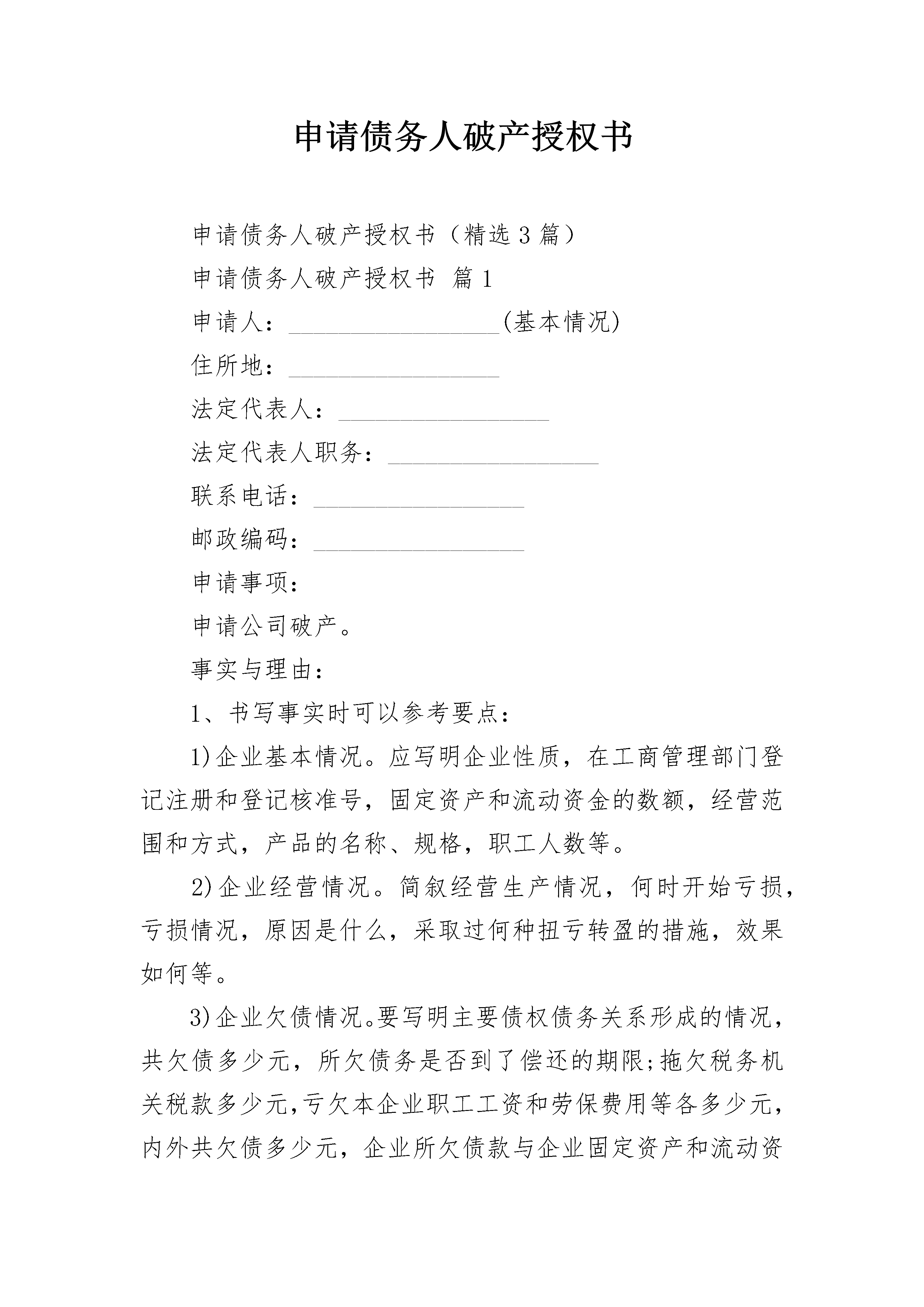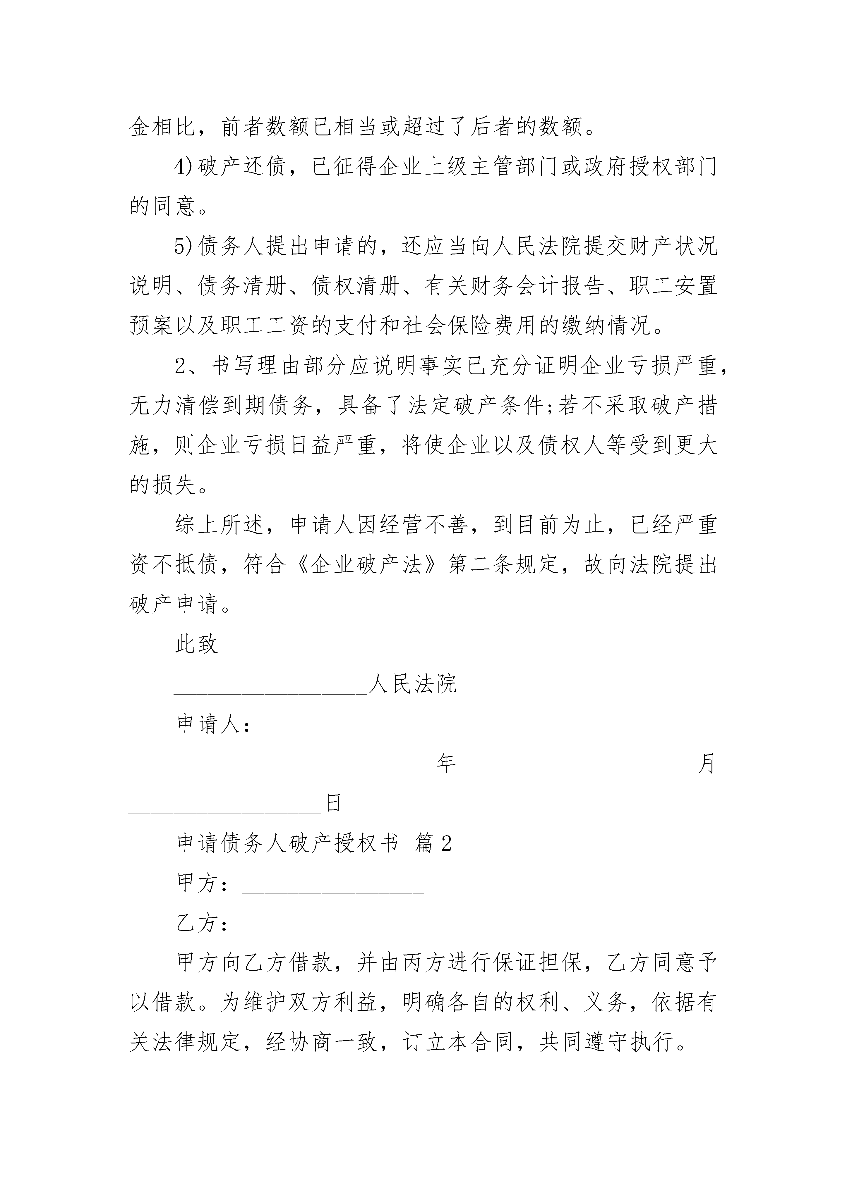 申请债务人破产授权书申请债务人破产授权书(精选3篇)申请债务人破产授权书篇1申请人:_________________(基本情况)住所地:_________________法定代表人:_________________法定代表人职务:_________________联系电话:_________________邮政编码:_________________申请事项:申请公司破产。事实与理由:1、书写事实时可以参考要点:1)企业基本情况。应写明企业性质,在工商管理部门登记注册和登记核准号,固定资产和流动资金的数额,经营范围和方式,产品的名称、规格,职工人数等。2)企业经营情况。简叙经营生产情况,何时开始亏损,亏损情况,原因是什么,采取过何种扭亏转盈的措施,效果如何等。3)企业欠债情况。要写明主要债权债务关系形成的情况,共欠债多少元,所欠债务是否到了偿还的期限;拖欠税务机关税款多少元,亏欠本企业职工工资和劳保费用等各多少元,内外共欠债多少元,企业所欠债款与企业固定资产和流动资金相比,前者数额已相当或超过了后者的数额。4)破产还债,已征得企业上级主管部门或政府授权部门的同意。5)债务人提出申请的,还应当向人民法院提交财产状况说明、债务清册、债权清册、有关财务会计报告、职工安置预案以及职工工资的支付和社会保险费用的缴纳情况。2、书写理由部分应说明事实已充分证明企业亏损严重,无力清偿到期债务,具备了法定破产条件;若不采取破产措施,则企业亏损日益严重,将使企业以及债权人等受到更大的损失。综上所述,申请人因经营不善,到目前为止,已经严重资不抵债,符合《企业破产法》第二条规定,故向法院提出破产申请。此致_________________人民法院申请人:__________________________________年_________________月_________________日申请债务人破产授权书篇2甲方:________________乙方:________________甲方向乙方借款,并由丙方进行保证担保,乙方同意予以借款。为维护双方利益,明确各自的权利、义务,依据有关法律规定,经协商一致,订立本合同,共同遵守执行。第一条借款金额本合同项下借款金额为:人民币(大写)_______________,(小写)_______________。第二条借款期限借款期限为____个月,自乙方实际放款日起算。第三条借款用途本合同项下的借款用途为:___________________________________________________。未经乙方书面同意,甲方不得改变借款用途,包括但不限于甲方不得用于国家禁止生产、经营的领域,不得用于任何违法、犯罪行为,不得用于任何国家法律、法规、及国家政策禁止准入的项目或未经依法批准的项目。第四条利率与计结息1、借款利率固定利率,借款利率为月利率百分之______(小写:____%);借款期限内合同利率不变。2、利息计算利息从甲方实际借款日起算,按实际借款额和用款天数计算;利息计算公式:利息=本金×实际天数×日利率;日利率计算基数为一个月30天,换算公式:日利率=月利率/30。3、结息方式(1)按借款月结息和付息,以实际放款日的对应日为结息日付息日,当月没有对应日的,则当月最后一日为结息日付息日。(2)按自然月结息和付息,每月的最后一天为结息日和付息日。若出借款本金的最后一期清偿日不在付息日,则该出借款本金的最后一期清偿日为付息日,甲方应付清全部应付利息。4、罚息(1)若甲方未按约定期限还款,就逾期部分,从逾期之日起按照逾期归还借款罚息利率计收利息,直至清偿本息为止。逾期借款罚息利率为本合同约定的借款利率水平上加收30%。(2)若甲方未按约定用途使用出借款,就挪用部分,从挪用之日起按照挪用出借款罚息利率计收利息,直至清偿本息为止;挪用借款罚息利率为本合同约定的借款利率水平上加收50%。(3)对同一笔借款既逾期又挪用的借款,按照挪用借款罚息利率计收利息;(4)对甲方不能按期支付的利息以及罚息,以本条第3款约定的结息方式,按本款约定的罚息利率计收复利。(5)按罚息利率计收利息的,计息公式为:利息=(本金+应付未付利息)×实际天数×日罚息利率。第五条借款条件甲方向乙方请求本合同项下借款,须按照如下要求提供资料,自然人个人借款提供1——5、13约定的资料;企业借款提供1、5—13约定的资料:1、向乙方提交个人/企业信用借款申请表;2、甲方最新的身份证明、婚姻状况和收入证明;3、有信用卡的,出具最近六个月来的信用卡账单、还款记录;4、拟将借款转入的甲方个人账户信息;5、借款用途证明材料,如购买商品的发票,购销合同、协议或甲方保证并说明其合法用途的声明等;6、借款人已按出借人要求提供担保,担保合同已生