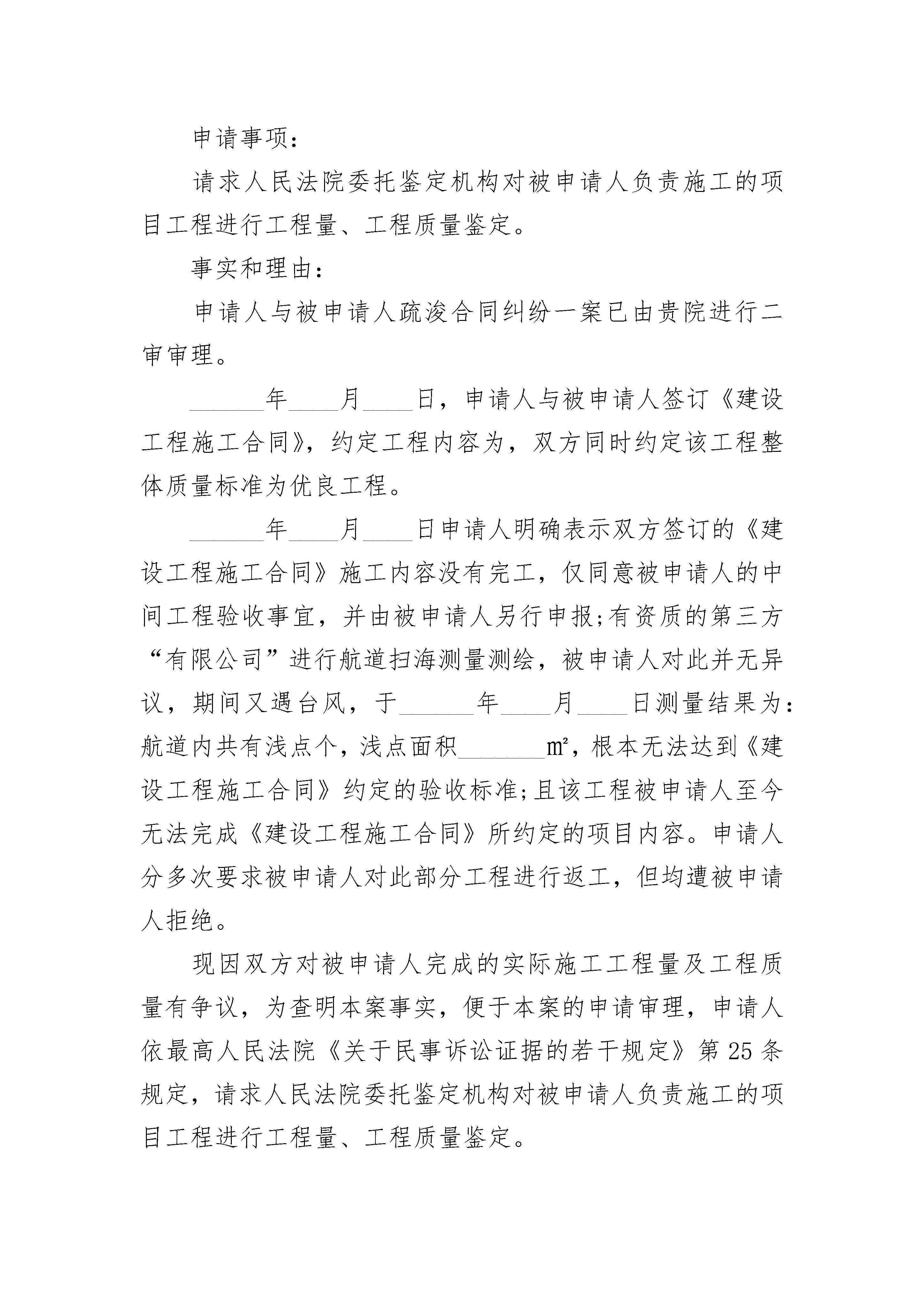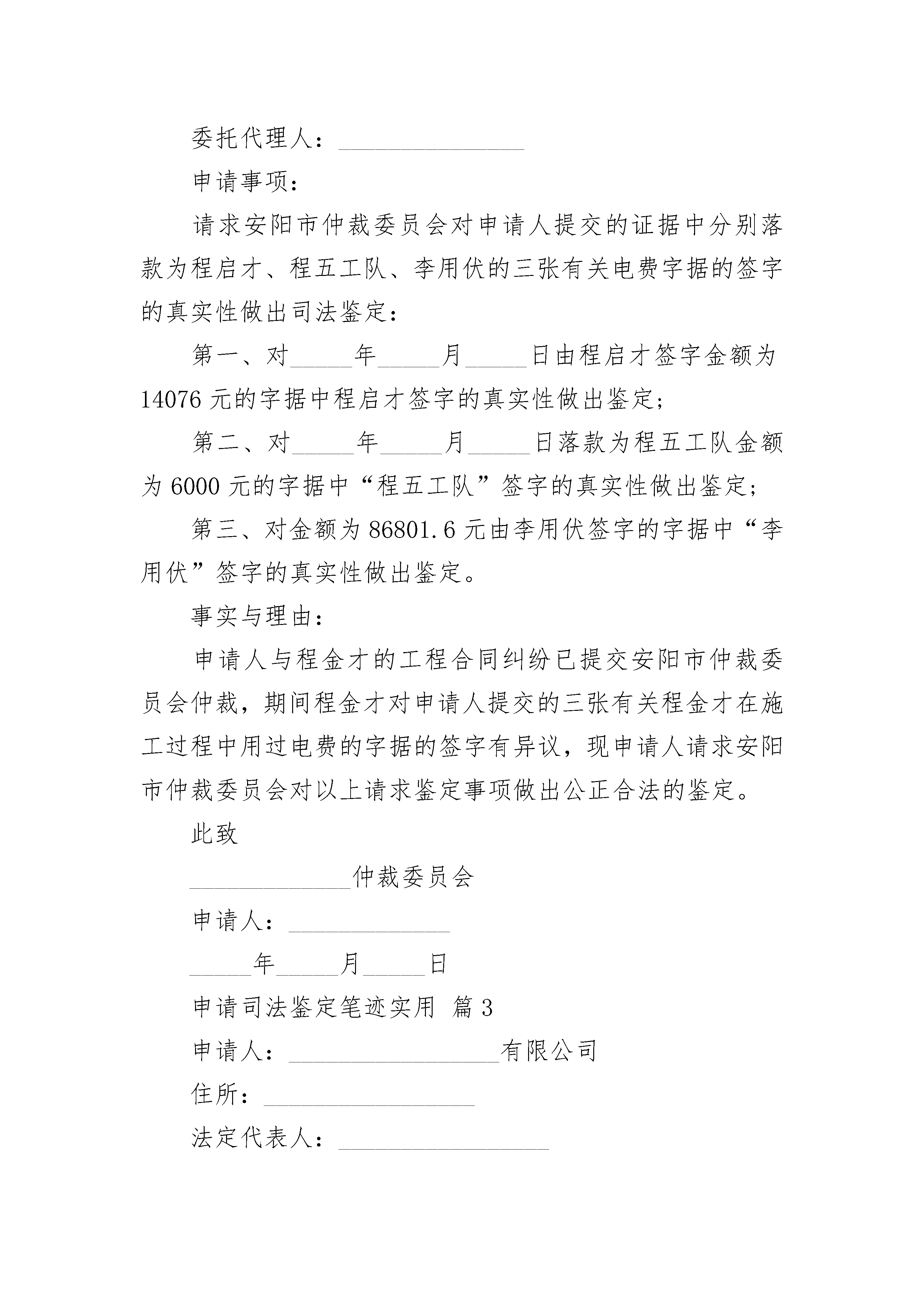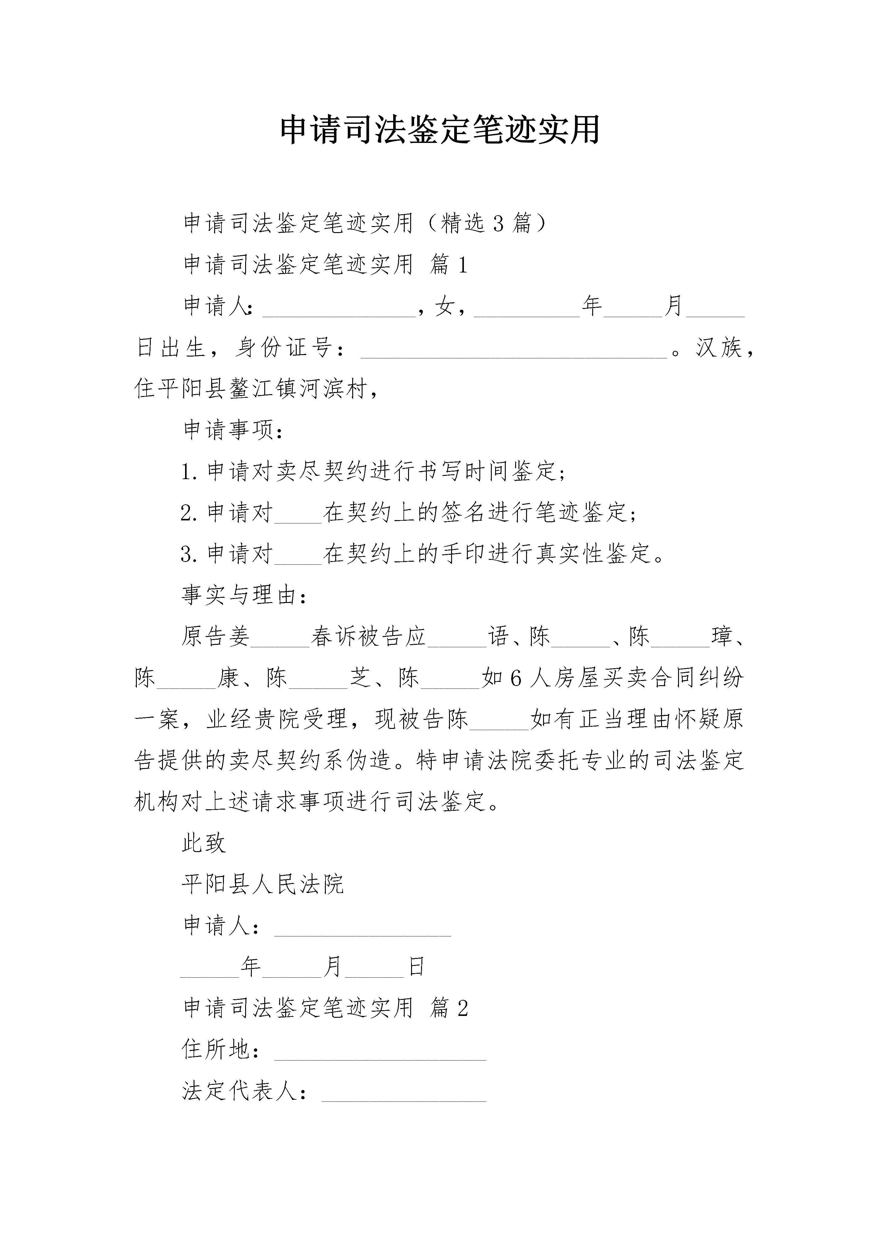 申请司法鉴定笔迹实用申请司法鉴定笔迹实用(精选3篇)申请司法鉴定笔迹实用篇1申请人:_____________,女,_________年_____月_____日出生,身份证号:__________________________。汉族,住平阳县鳌江镇河滨村,申请事项:1.申请对卖尽契约进行书写时间鉴定;2.申请对____在契约上的签名进行笔迹鉴定;3.申请对____在契约上的手印进行真实性鉴定。事实与理由:原告姜_____春诉被告应_____语、陈_____、陈_____璋、陈_____康、陈_____芝、陈_____如6人房屋买卖合同纠纷一案,业经贵院受理,现被告陈_____如有正当理由怀疑原告提供的卖尽契约系伪造。特申请法院委托专业的司法鉴定机构对上述请求事项进行司法鉴定。此致平阳县人民法院申请人:____________________年_____月_____日申请司法鉴定笔迹实用篇2住所地:__________________法定代表人:______________委托代理人:_______________申请事项:请求安阳市仲裁委员会对申请人提交的证据中分别落款为程启才、程五工队、李用伏的三张有关电费字据的签字的真实性做出司法鉴定:第一、对_____年_____月_____日由程启才签字金额为14076元的字据中程启才签字的真实性做出鉴定;第二、对_____年_____月_____日落款为程五工队金额为6000元的字据中“程五工队”签字的真实性做出鉴定;第三、对金额为86801.6元由李用伏签字的字据中“李用伏”签字的真实性做出鉴定。事实与理由:申请人与程金才的工程合同纠纷已提交安阳市仲裁委员会仲裁,期间程金才对申请人提交的三张有关程金才在施工过程中用过电费的字据的签字有异议,现申请人请求安阳市仲裁委员会对以上请求鉴定事项做出公正合法的鉴定。此致_____________仲裁委员会申请人:__________________年_____月_____日申请司法鉴定笔迹实用篇3申请人:_________________有限公司住所:_________________法定代表人:_________________申请事项:请求人民法院委托鉴定机构对被申请人负责施工的项目工程进行工程量、工程质量鉴定。事实和理由:申请人与被申请人疏浚合同纠纷一案已由贵院进行二审审理。______年____月____日,申请人与被申请人签订《建设工程施工合同》,约定工程内容为,双方同时约定该工程整体质量标准为优良工程。______年____月____日申请人明确表示双方签订的《建设工程施工合同》施工内容没有完工,仅同意被申请人的中间工程验收事宜,并由被申请人另行申报;有资质的第三方“有限公司”进行航道扫海测量测绘,被申请人对此并无异议,期间又遇台风,于______年____月____日测量结果为:航道内共有浅点个,浅点面积_______㎡,根本无法达到《建设工程施工合同》约定的验收标准;且该工程被申请人至今无法完成《建设工程施工合同》所约定的项目内容。申请人分多次要求被申请人对此部分工程进行返工,但均遭被申请人拒绝。现因双方对被申请人完成的实际施工工程量及工程质量有争议,为查明本案事实,便于本案的申请审理,申请人依最高人民法院《关于民事诉讼证据的若干规定》第25条规定,请求人民法院委托鉴定机构对被申请人负责施工的项目工程进行工程量、工程质量鉴定。此致__________高级人民法院申请人:_________________有限公司日期:_________________