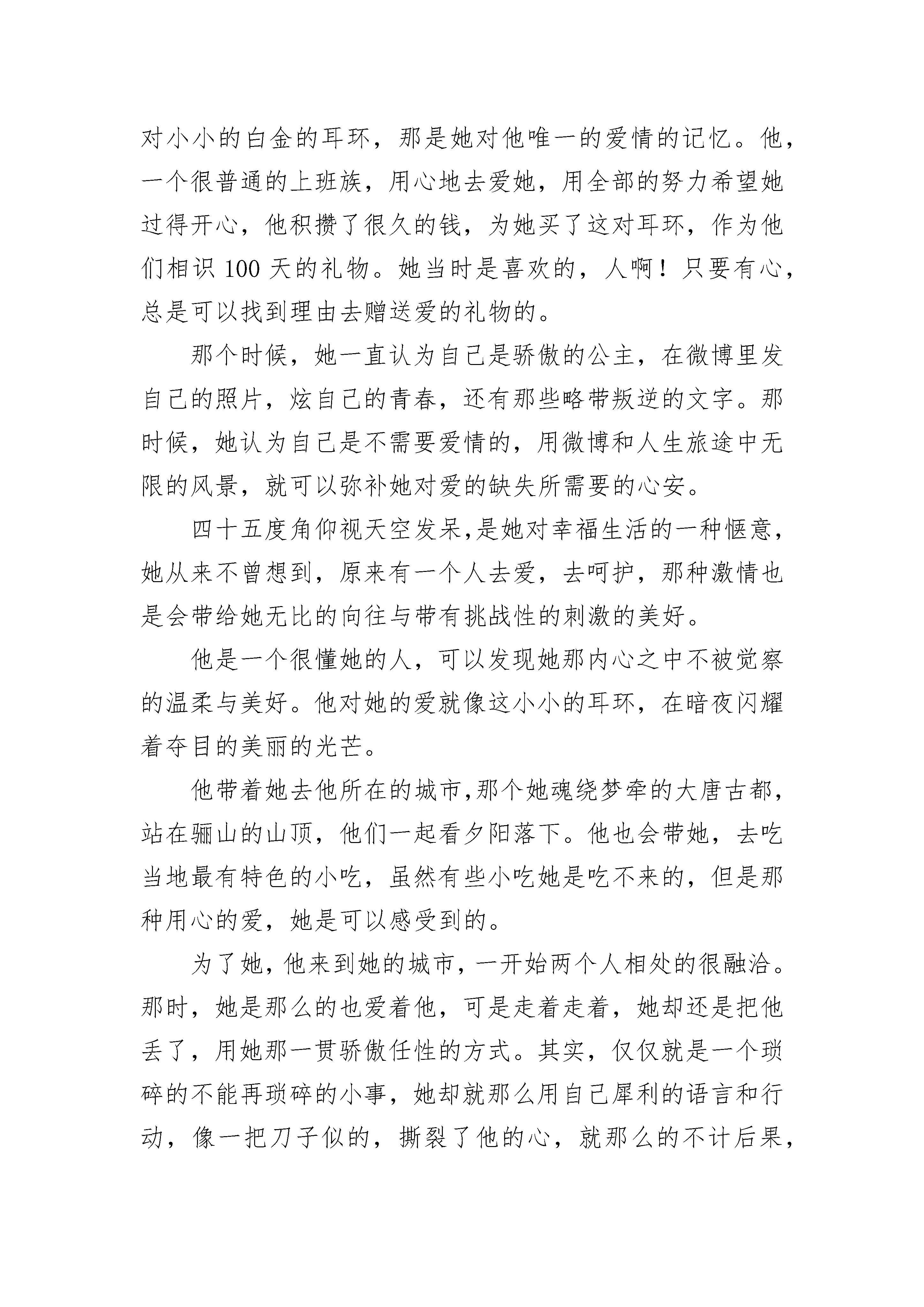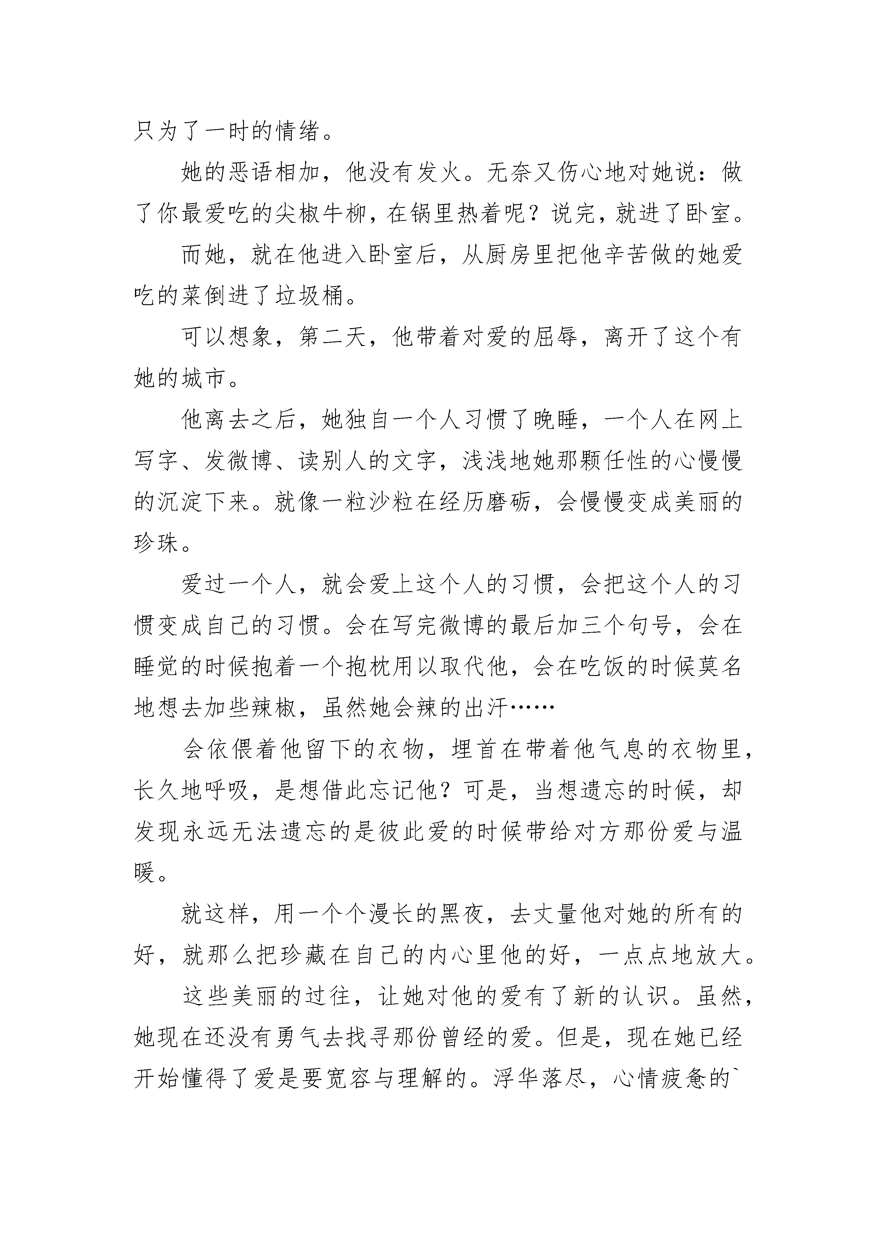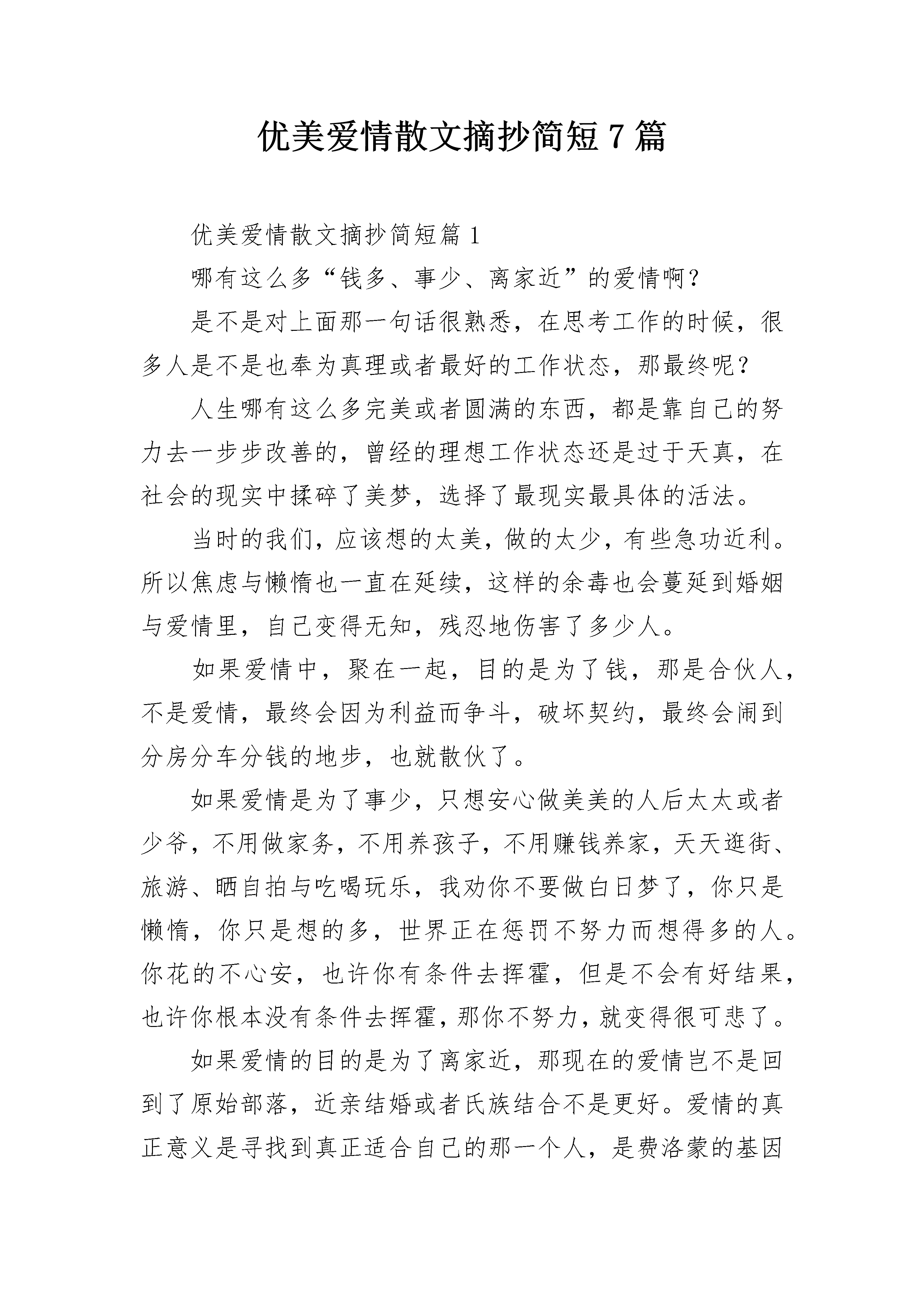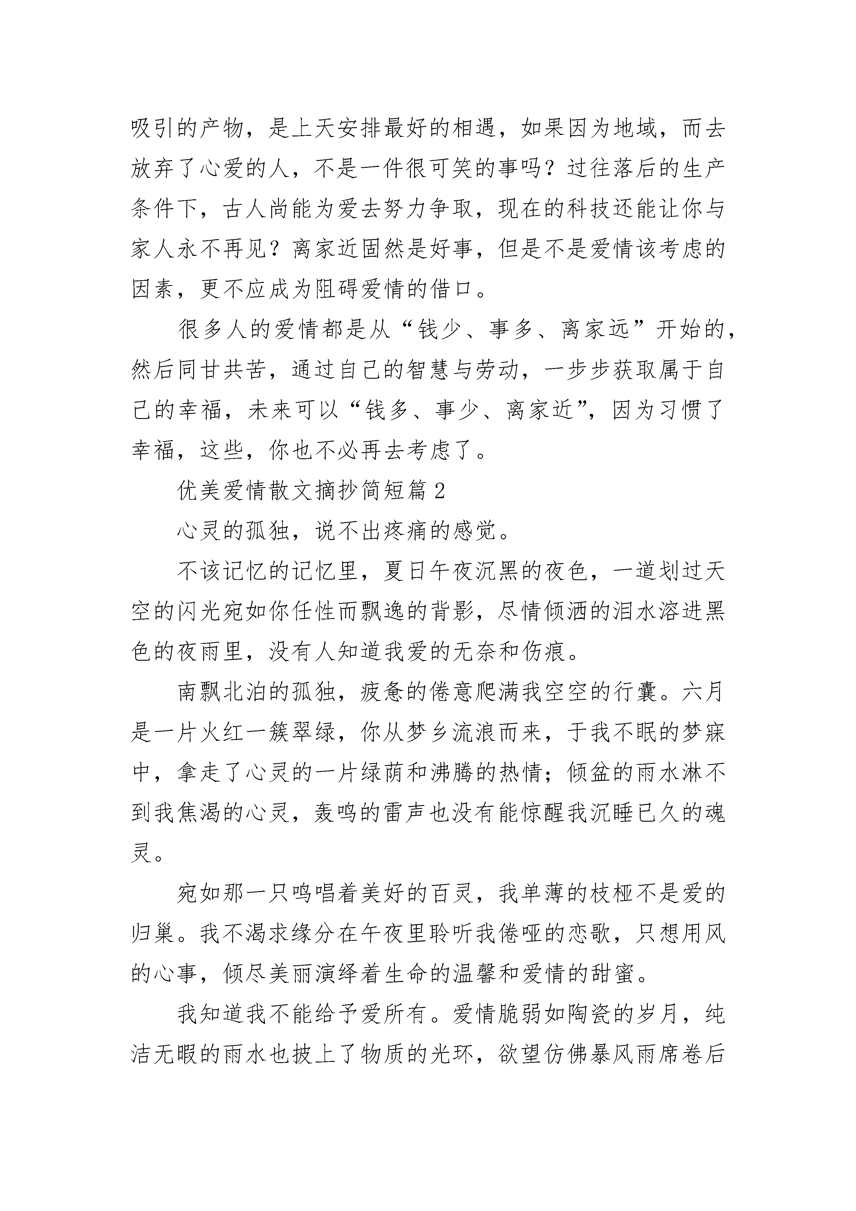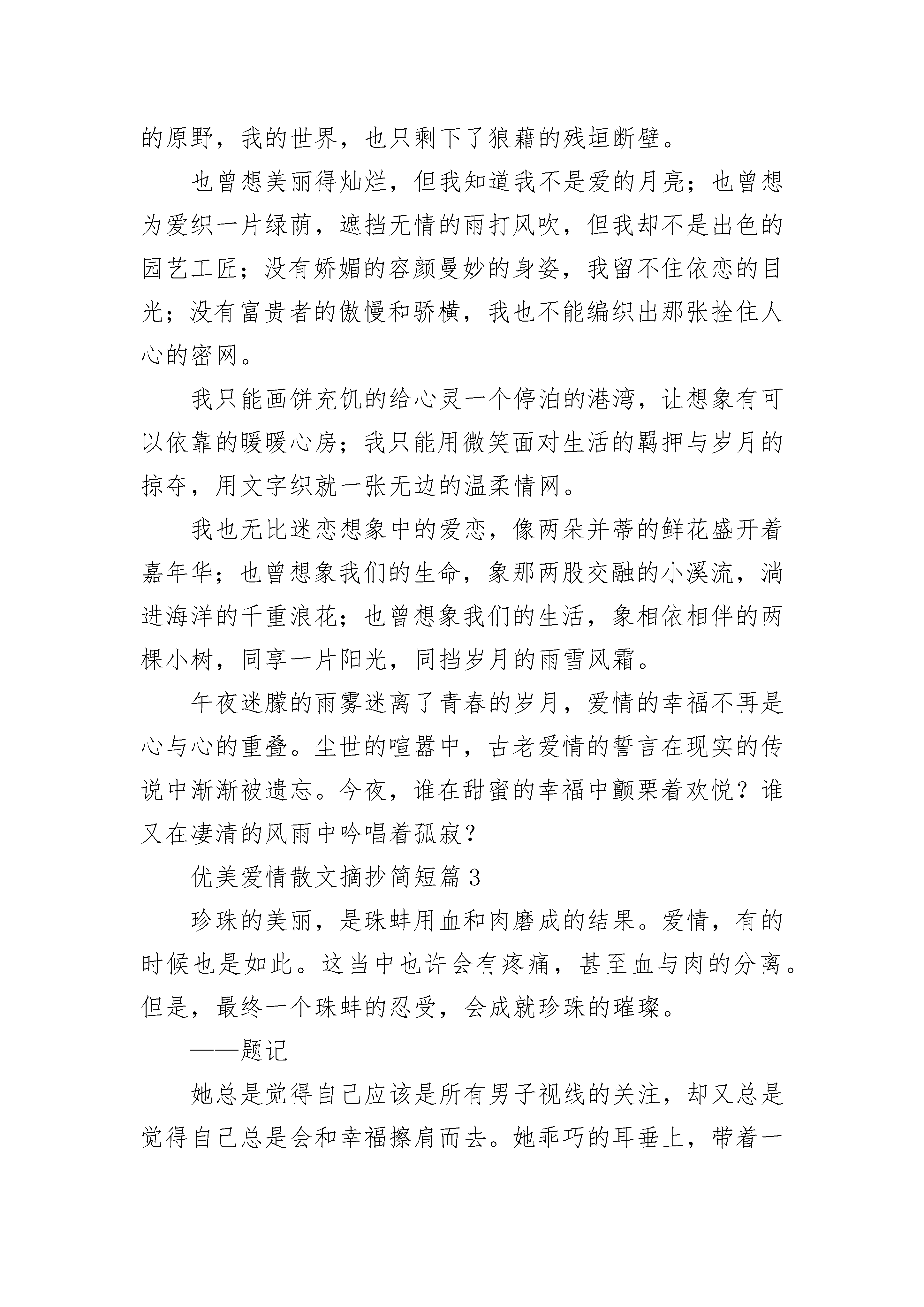 优美爱情散文摘抄简短7篇优美爱情散文摘抄简短篇1哪有这么多“钱多、事少、离家近”的爱情啊?是不是对上面那一句话很熟悉,在思考工作的时候,很多人是不是也奉为真理或者最好的工作状态,那最终呢?人生哪有这么多完美或者圆满的东西,都是靠自己的努力去一步步改善的,曾经的理想工作状态还是过于天真,在社会的现实中揉碎了美梦,选择了最现实最具体的活法。当时的我们,应该想的太美,做的太少,有些急功近利。所以焦虑与懒惰也一直在延续,这样的余毒也会蔓延到婚姻与爱情里,自己变得无知,残忍地伤害了多少人。如果爱情中,聚在一起,目的是为了钱,那是合伙人,不是爱情,最终会因为利益而争斗,破坏契约,最终会闹到分房分车分钱的地步,也就散伙了。如果爱情是为了事少,只想安心做美美的人后太太或者少爷,不用做家务,不用养孩子,不用赚钱养家,天天逛街、旅游、晒自拍与吃喝玩乐,我劝你不要做白日梦了,你只是懒惰,你只是想的多,世界正在惩罚不努力而想得多的人。你花的不心安,也许你有条件去挥霍,但是不会有好结果,也许你根本没有条件去挥霍,那你不努力,就变得很可悲了。如果爱情的目的是为了离家近,那现在的爱情岂不是回到了原始部落,近亲结婚或者氏族结合不是更好。爱情的真正意义是寻找到真正适合自己的那一个人,是费洛蒙的基因吸引的产物,是上天安排最好的相遇,如果因为地域,而去放弃了心爱的人,不是一件很可笑的事吗?过往落后的生产条件下,古人尚能为爱去努力争取,现在的科技还能让你与家人永不再见?离家近固然是好事,但是不是爱情该考虑的因素,更不应成为阻碍爱情的借口。很多人的爱情都是从“钱少、事多、离家远”开始的,然后同甘共苦,通过自己的智慧与劳动,一步步获取属于自己的幸福,未来可以“钱多、事少、离家近”,因为习惯了幸福,这些,你也不必再去考虑了。优美爱情散文摘抄简短篇2心灵的孤独,说不出疼痛的感觉。不该记忆的记忆里,夏日午夜沉黑的夜色,一道划过天空的闪光宛如你任性而飘逸的背影,尽情倾洒的泪水溶进黑色的夜雨里,没有人知道我爱的无奈和伤痕。南飘北泊的孤独,疲惫的倦意爬满我空空的行囊。六月是一片火红一簇翠绿,你从梦乡流浪而来,于我不眠的梦寐中,拿走了心灵的一片绿荫和沸腾的热情;倾盆的雨水淋不到我焦渴的心灵,轰鸣的雷声也没有能惊醒我沉睡已久的魂灵。宛如那一只鸣唱着美好的百灵,我单薄的枝桠不是爱的归巢。我不渴求缘分在午夜里聆听我倦哑的恋歌,只想用风的心事,倾尽美丽演绎着生命的温馨和爱情的甜蜜。我知道我不能给予爱所有。爱情脆弱如陶瓷的岁月,纯洁无暇的雨水也披上了物质的光环,欲望仿佛暴风雨席卷后的原野,我的世界,也只剩下了狼藉的残垣断壁。也曾想美丽得灿烂,但我知道我不是爱的月亮;也曾想为爱织一片绿荫,遮挡无情的雨打风吹,但我却不是出色的园艺工匠;没有娇媚的容颜曼妙的身姿,我留不住依恋的目光;没有富贵者的傲慢和骄横,我也不能编织出那张拴住人心的密网。我只能画饼充饥的给心灵一个停泊的港湾,让想象有可以依靠的暖暖心房;我只能用微笑面对生活的羁押与岁月的掠夺,用文字织就一张无边的温柔情网。我也无比迷恋想象中的爱恋,像两朵并蒂的鲜花盛开着嘉年华;也曾想象我们的生命,象那两股交融的小溪流,淌进海洋的千重浪花;也曾想象我们的生活,象相依相伴的两棵小树,同享一片阳光,同挡岁月的雨雪风霜。午夜迷朦的雨雾迷离了青春的岁月,爱情的幸福不再是心与心的重叠。尘世的喧嚣中,古老爱情的誓言在现实的传说中渐渐被遗忘。今夜,谁在甜蜜的幸福中颤栗着欢悦?谁又在凄清的风雨中吟唱着孤寂?优美爱情散文摘抄简短篇3珍珠的美丽,是珠蚌用血和肉磨成的结果。爱情,有的时候也是如此。这当中也许会有疼痛,甚至血与肉的分离。但是,最终一个珠蚌的忍受,会成就珍珠的璀璨。——题记她总是觉得自己应该是所有男子视线的关注,却又总是觉得自己总是会和幸福擦肩而去。她乖巧的耳垂上,带着一对小小的白金的耳环,那是她对他唯一的爱情的记忆。他,一个很普通的上班族,用心地去爱她,用全部的努力希望她过得开心,他积攒了很久的钱,为她买了这对耳环,作为他们相识100天的礼物。她当时是喜欢的,人啊!只要有心,总是可以找到理由去赠送爱的礼物的。那个时候,她一直认为自己是骄傲的公主,在微博里发自己的照片,炫自己的青春,还有那些略带叛逆的文字。那时候,她认为自己是不需要爱情的,用微博和人生旅途中无限的风景,就可以弥补她对爱的缺失所需要的心安。四十五度角仰视天空发呆,是她对幸福生活的一种惬意,她从来不曾想到,原来有一个人去爱,去呵护,那种激情也是会带给她无比的向往与带有挑战性的刺激的美好。他是一个很懂她的人,可以发现她那内心之中不被觉察的温柔与美好。他对她的爱就像这小小的耳环,在暗夜闪耀着夺目的美丽的光芒。他带着她去他所在的城市,那个她魂绕梦牵的大唐古都,站在骊山的山顶,他们一起看夕阳落下。他也
