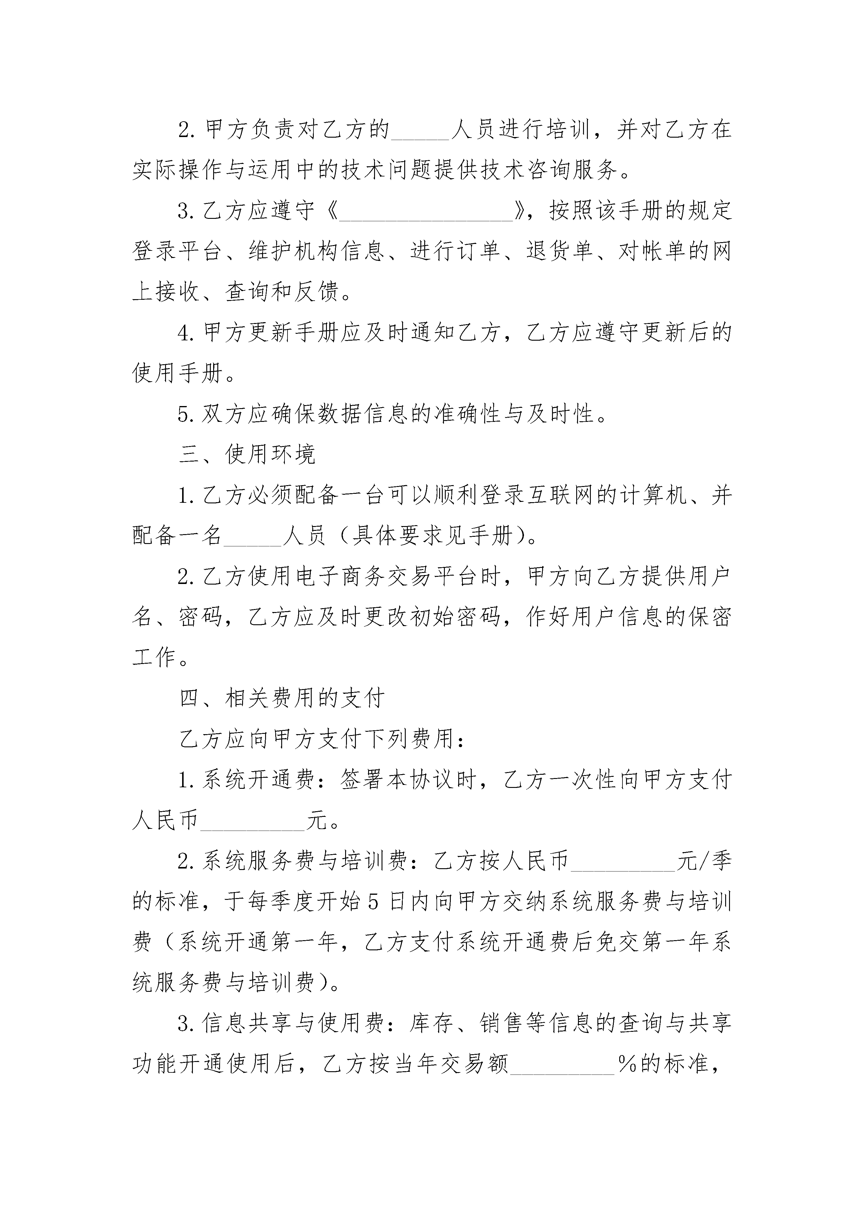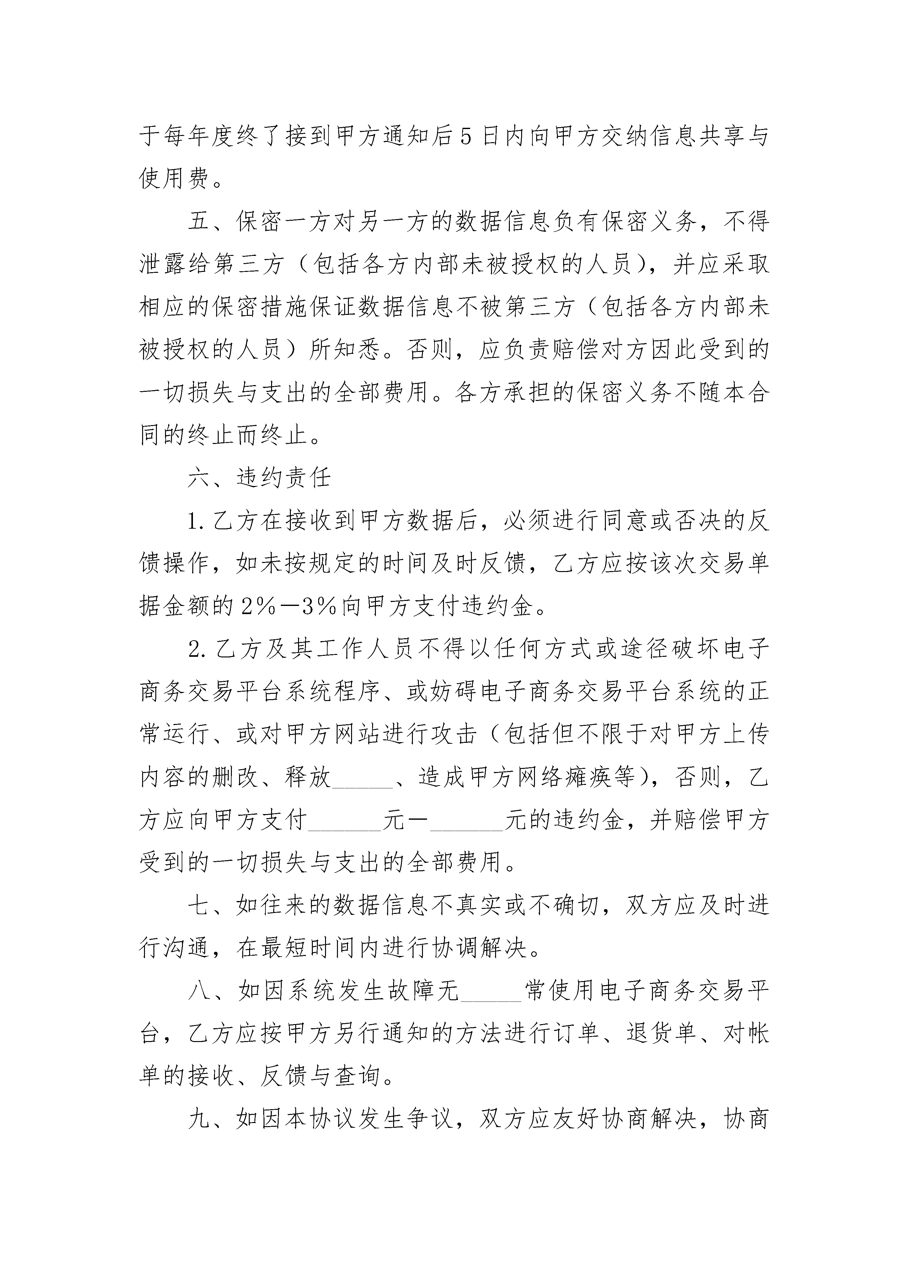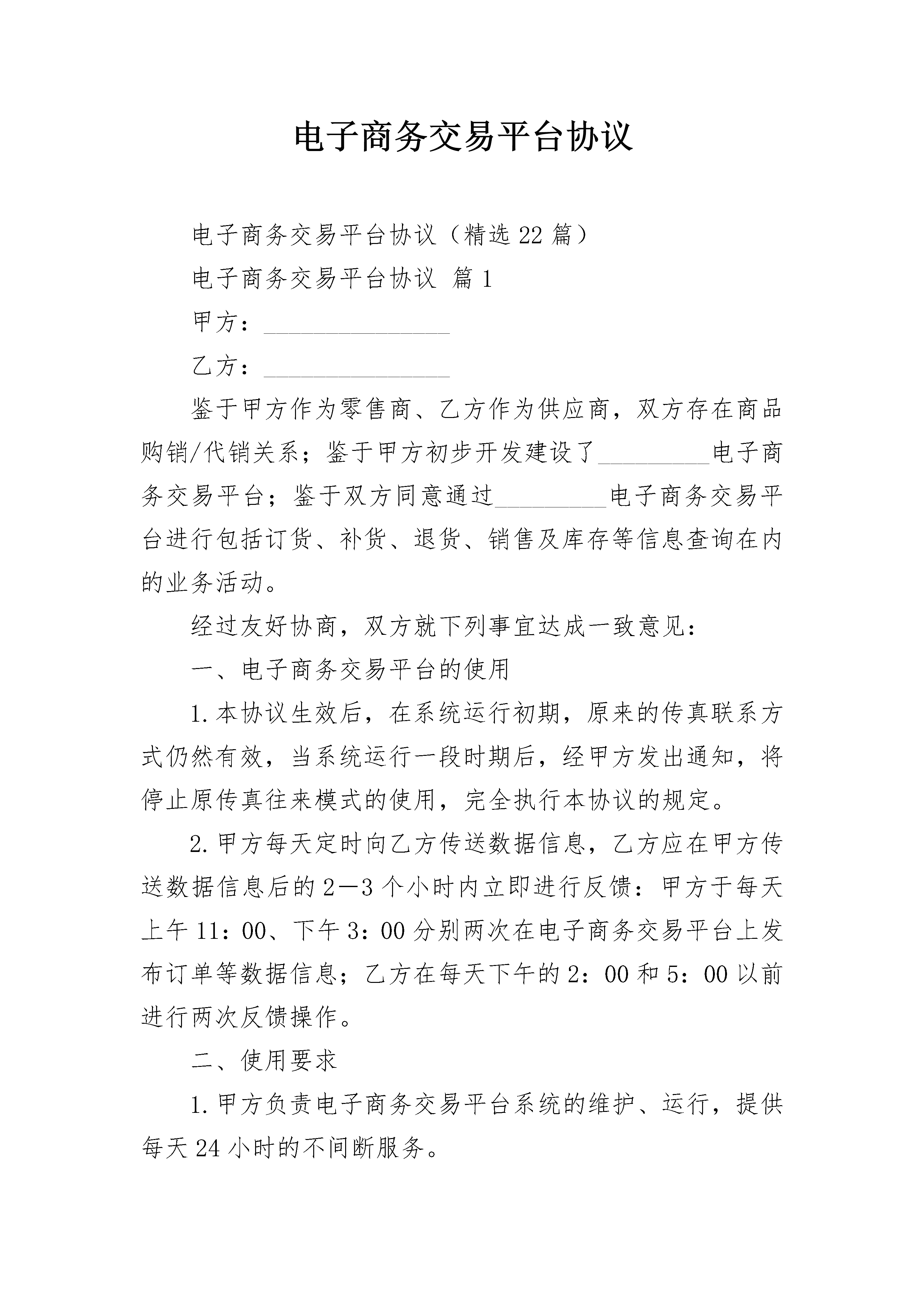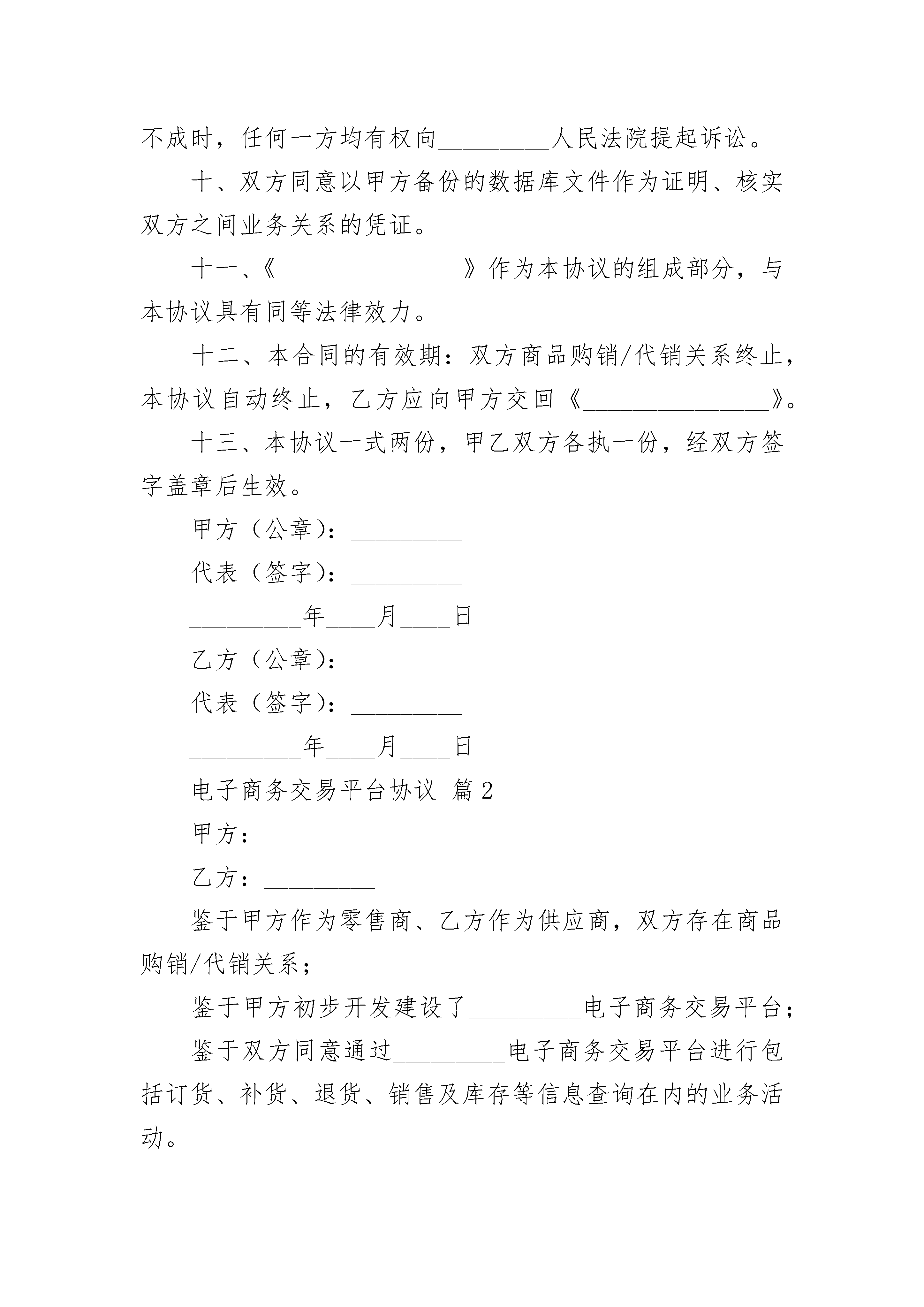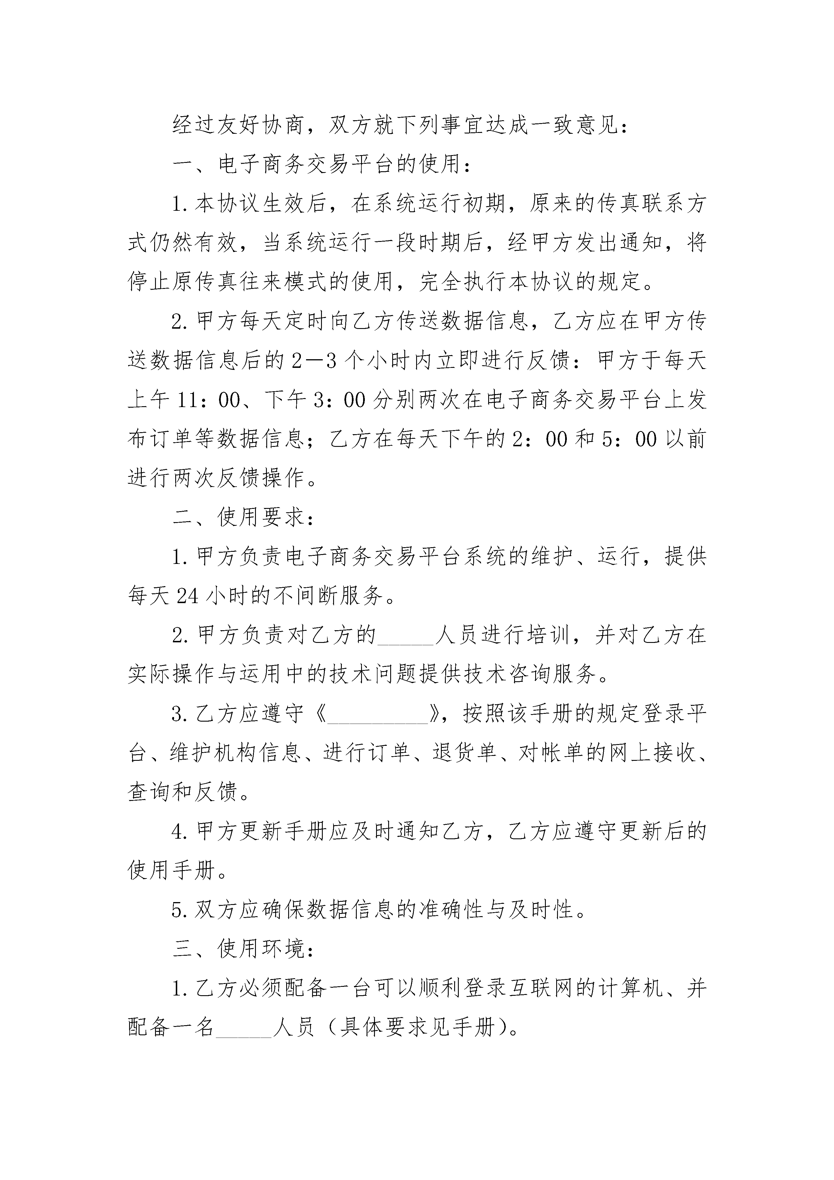 电子商务交易平台协议电子商务交易平台协议(精选22篇)电子商务交易平台协议篇1甲方:_______________乙方:_______________鉴于甲方作为零售商、乙方作为供应商,双方存在商品购销/代销关系;鉴于甲方初步开发建设了_________电子商务交易平台;鉴于双方同意通过_________电子商务交易平台进行包括订货、补货、退货、销售及库存等信息查询在内的业务活动。经过友好协商,双方就下列事宜达成一致意见:一、电子商务交易平台的使用1.本协议生效后,在系统运行初期,原来的传真联系方式仍然有效,当系统运行一段时期后,经甲方发出通知,将停止原传真往来模式的使用,完全执行本协议的规定。2.甲方每天定时向乙方传送数据信息,乙方应在甲方传送数据信息后的2-3个小时内立即进行反馈:甲方于每天上午11:00、下午3:00分别两次在电子商务交易平台上发布订单等数据信息;乙方在每天下午的2:00和5:00以前进行两次反馈操作。二、使用要求1.甲方负责电子商务交易平台系统的维护、运行,提供每天24小时的不间断服务。2.甲方负责对乙方的_____人员进行培训,并对乙方在实际操作与运用中的技术问题提供技术咨询服务。3.乙方应遵守《_______________》,按照该手册的规定登录平台、维护机构信息、进行订单、退货单、对帐单的网上接收、查询和反馈。4.甲方更新手册应及时通知乙方,乙方应遵守更新后的使用手册。5.双方应确保数据信息的准确性与及时性。三、使用环境1.乙方必须配备一台可以顺利登录互联网的计算机、并配备一名_____人员(具体要求见手册)。2.乙方使用电子商务交易平台时,甲方向乙方提供用户名、密码,乙方应及时更改初始密码,作好用户信息的保密工作。四、相关费用的支付乙方应向甲方支付下列费用:1.系统开通费:签署本协议时,乙方一次性向甲方支付人民币_________元。2.系统服务费与培训费:乙方按人民币_________元/季的标准,于每季度开始5日内向甲方交纳系统服务费与培训费(系统开通第一年,乙方支付系统开通费后免交第一年系统服务费与培训费)。3.信息共享与使用费:库存、销售等信息的查询与共享功能开通使用后,乙方按当年交易额_________%的标准,于每年度终了接到甲方通知后5日内向甲方交纳信息共享与使用费。五、保密一方对另一方的数据信息负有保密义务,不得泄露给第三方(包括各方内部未被授权的人员),并应采取相应的保密措施保证数据信息不被第三方(包括各方内部未被授权的人员)所知悉。否则,应负责赔偿对方因此受到的一切损失与支出的全部费用。各方承担的保密义务不随本合同的终止而终止。六、违约责任1.乙方在接收到甲方数据后,必须进行同意或否决的反馈操作,如未按规定的时间及时反馈,乙方应按该次交易单据金额的2%-3%向甲方支付违约金。2.乙方及其工作人员不得以任何方式或途径破坏电子商务交易平台系统程序、或妨碍电子商务交易平台系统的正常运行、或对甲方网站进行攻击(包括但不限于对甲方上传内容的删改、释放_____、造成甲方网络瘫痪等),否则,乙方应向甲方支付______元-______元的违约金,并赔偿甲方受到的一切损失与支出的全部费用。七、如往来的数据信息不真实或不确切,双方应及时进行沟通,在最短时间内进行协调解决。八、如因系统发生故障无_____常使用电子商务交易平台,乙方应按甲方另行通知的方法进行订单、退货单、对帐单的接收、反馈与查询。九、如因本协议发生争议,双方应友好协商解决,协商不成时,任何一方均有权向_________人民法院提起诉讼。十、双方同意以甲方备份的数据库文件作为证明、核实双方之间业务关系的凭证。十一、《_______________》作为本协议的组成部分,与本协议具有同等法律效力。十二、本合同的有效期:双方商品购销/代销关系终止,本协议自动终止,乙方应向甲方交回《_______________》。十三、本协议一式两份,甲乙双方各执一份,经双方签字盖章后生效。甲方(公章):_________代表(签字):__________________年____月____日乙方(公章):_________代表(签字):__________________年____月____日电子商务交易平台协议篇2甲方:_________乙方:_________鉴于甲方作为零售商、乙方作为供应商,双方存在商品购销/代销关系;鉴于甲方初步开发建设了_________电子商务交易平台;鉴于双方同意通过_________电子商务交易平台进行包括订货、补货、退货、销售及库存等信息查询在内的业务活动。经过友好协商,双方就下列事宜达成一致意见:一、电子商务交易平台的使用:1.本协议生效后,在系统运行初期,原来的传真联系方式仍然有效,当系统运行一段时期