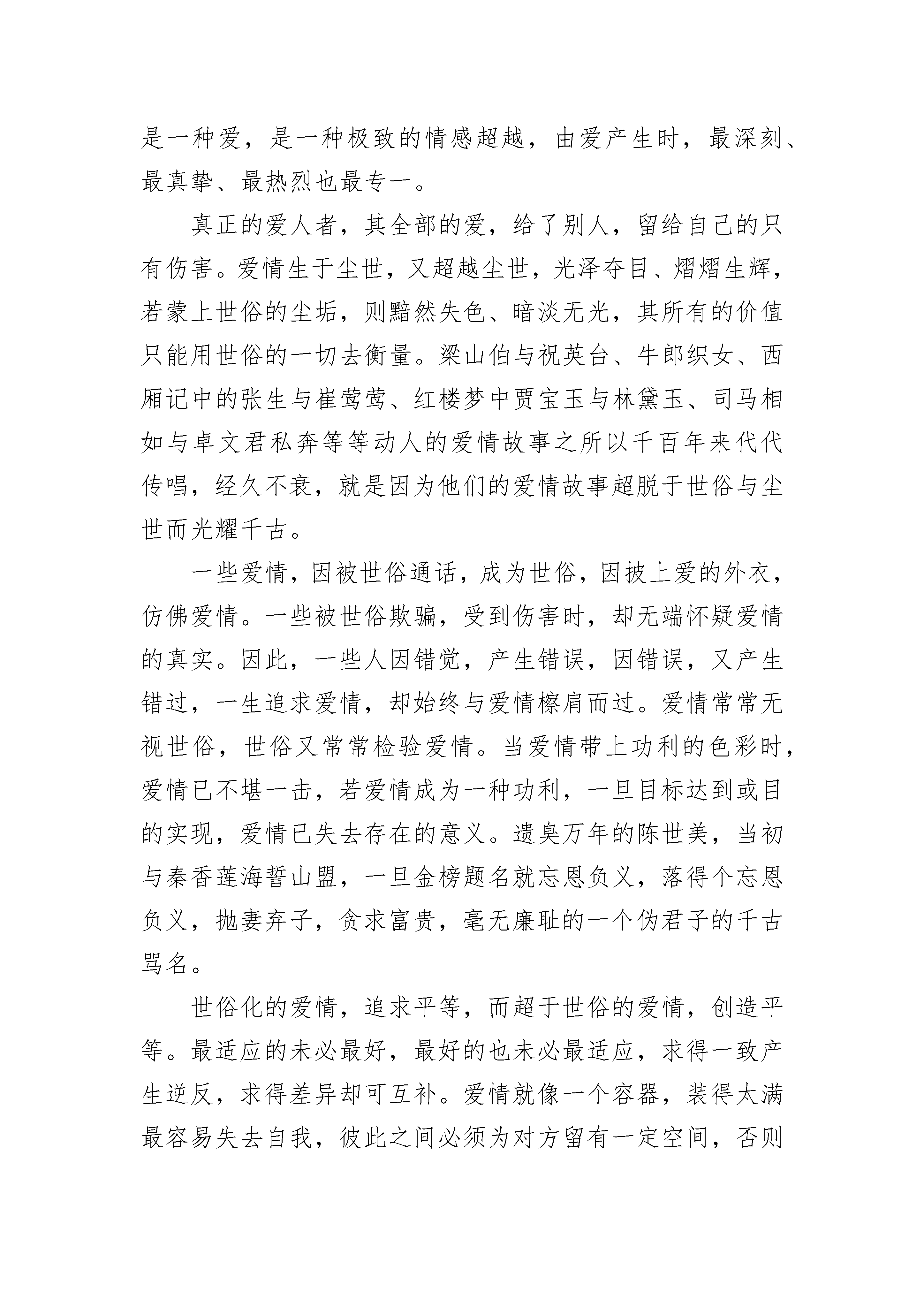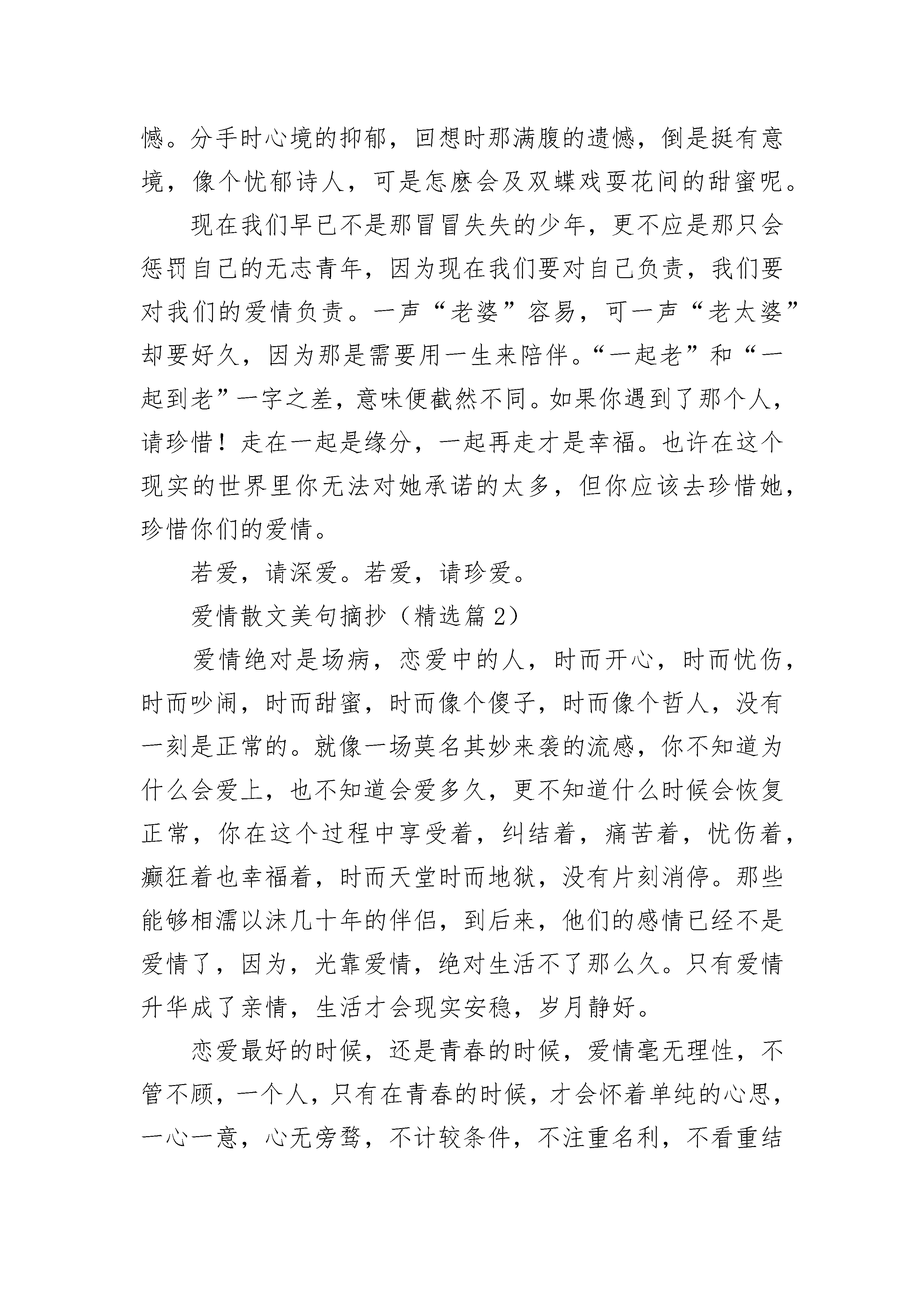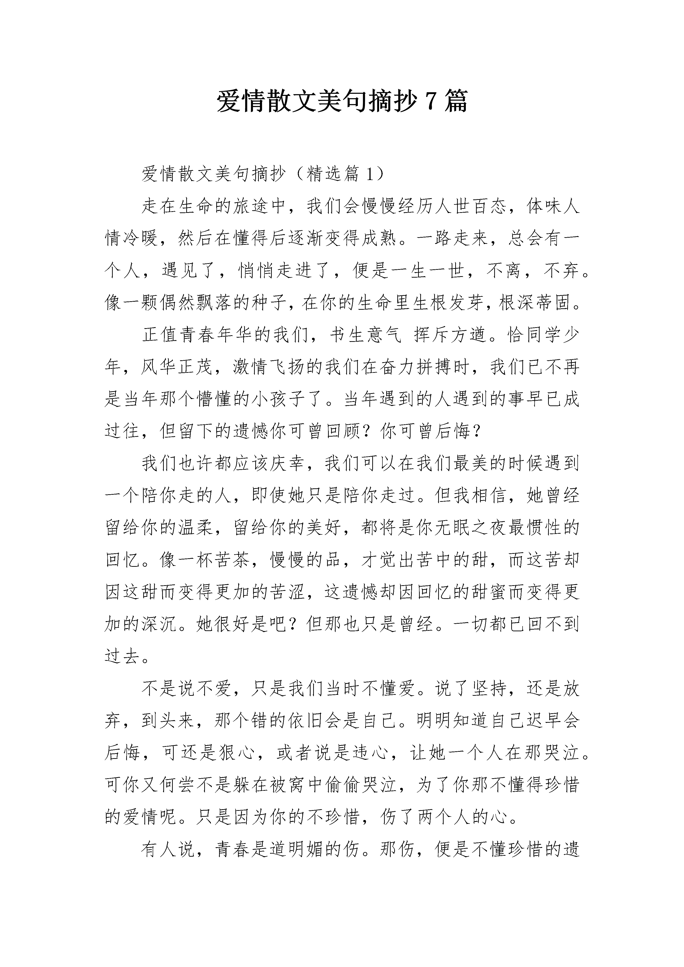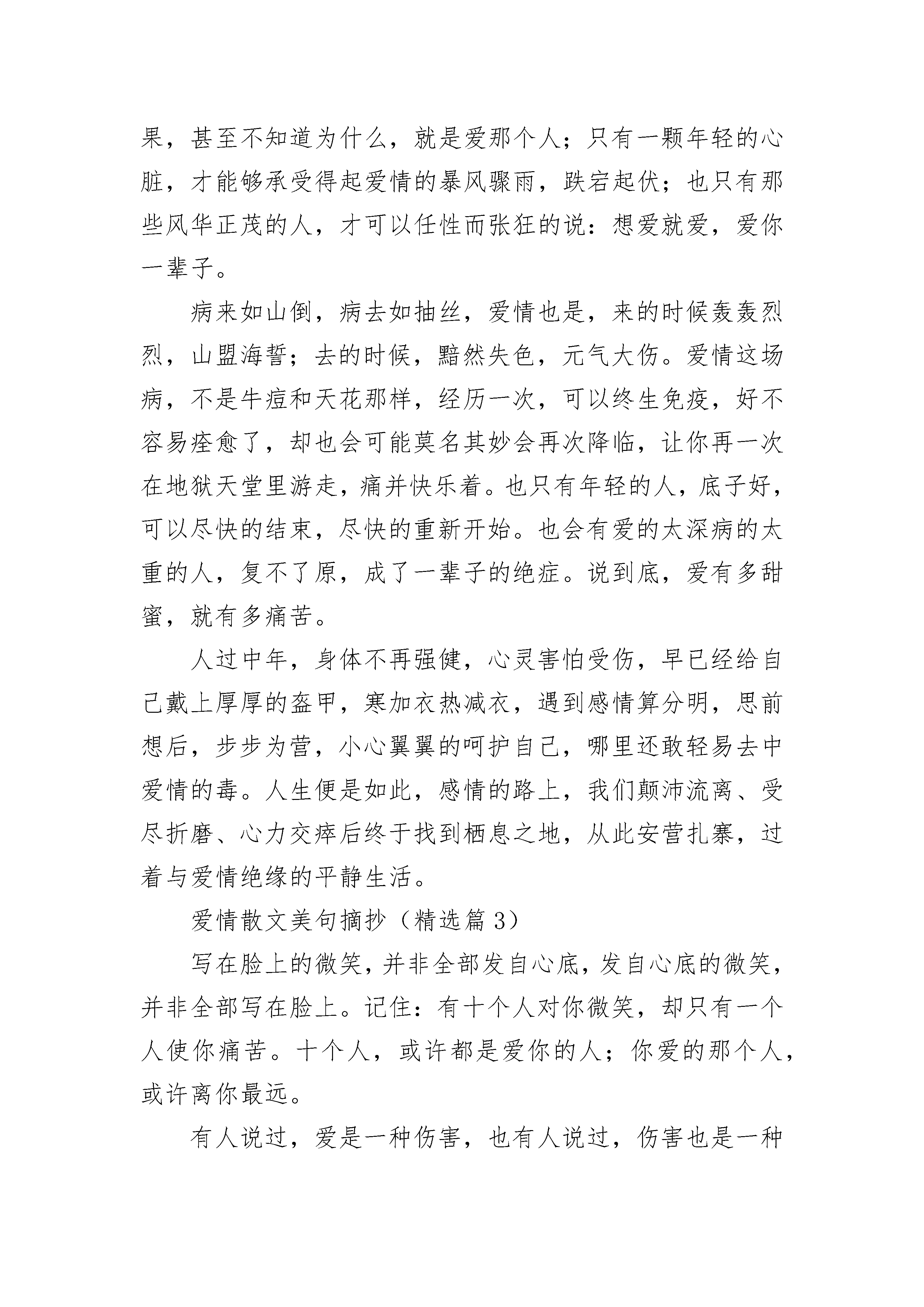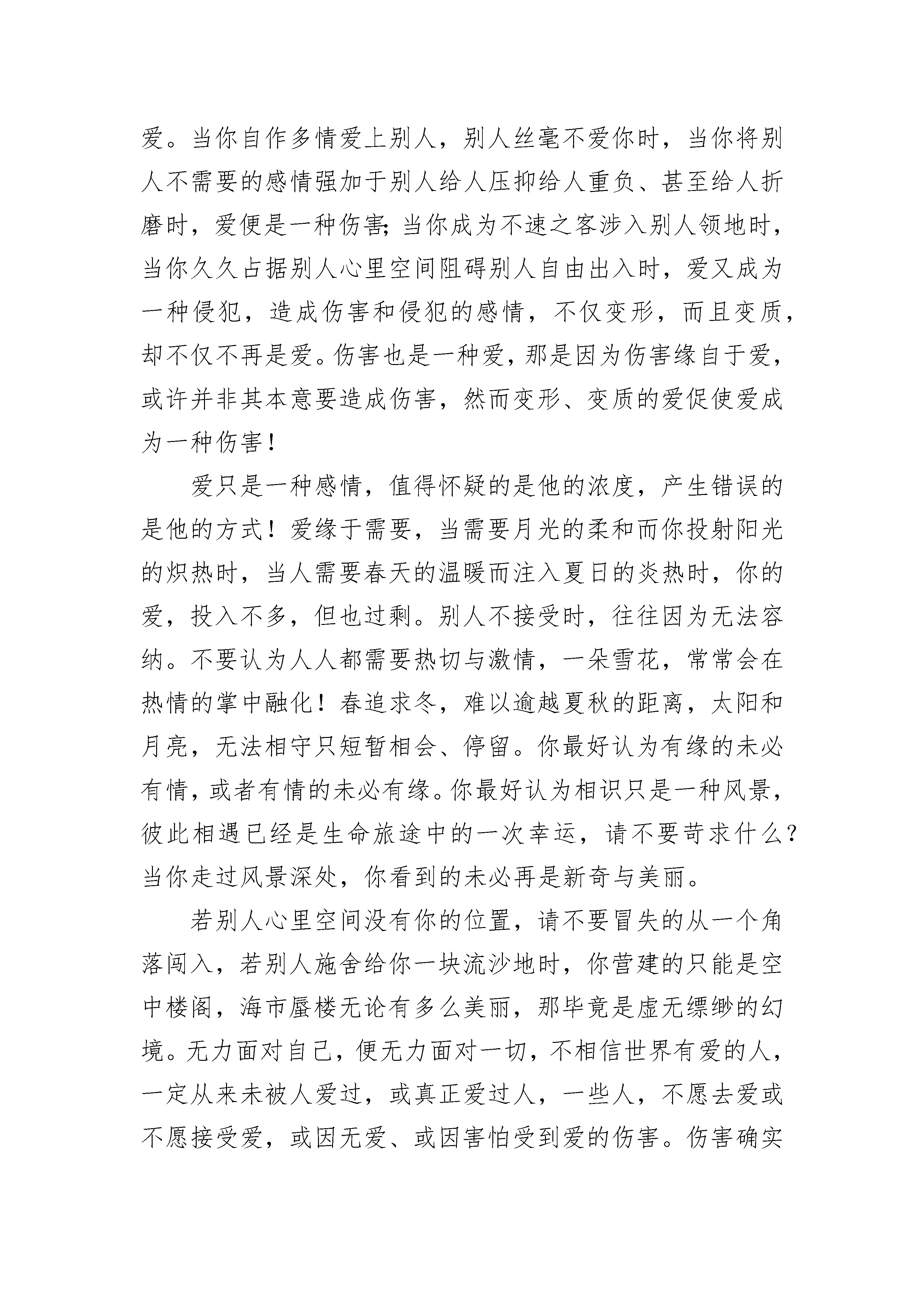 爱情散文美句摘抄7篇爱情散文美句摘抄(精选篇1)走在生命的旅途中,我们会慢慢经历人世百态,体味人情冷暖,然后在懂得后逐渐变得成熟。一路走来,总会有一个人,遇见了,悄悄走进了,便是一生一世,不离,不弃。像一颗偶然飘落的种子,在你的生命里生根发芽,根深蒂固。正值青春年华的我们,书生意气挥斥方遒。恰同学少年,风华正茂,激情飞扬的我们在奋力拼搏时,我们已不再是当年那个懵懂的小孩子了。当年遇到的人遇到的事早已成过往,但留下的遗憾你可曾回顾?你可曾后悔?我们也许都应该庆幸,我们可以在我们最美的时候遇到一个陪你走的人,即使她只是陪你走过。但我相信,她曾经留给你的温柔,留给你的美好,都将是你无眠之夜最惯性的回忆。像一杯苦茶,慢慢的品,才觉出苦中的甜,而这苦却因这甜而变得更加的苦涩,这遗憾却因回忆的甜蜜而变得更加的深沉。她很好是吧?但那也只是曾经。一切都已回不到过去。不是说不爱,只是我们当时不懂爱。说了坚持,还是放弃,到头来,那个错的依旧会是自己。明明知道自己迟早会后悔,可还是狠心,或者说是违心,让她一个人在那哭泣。可你又何尝不是躲在被窝中偷偷哭泣,为了你那不懂得珍惜的爱情呢。只是因为你的不珍惜,伤了两个人的心。有人说,青春是道明媚的伤。那伤,便是不懂珍惜的遗憾。分手时心境的抑郁,回想时那满腹的遗憾,倒是挺有意境,像个忧郁诗人,可是怎麽会及双蝶戏耍花间的甜蜜呢。现在我们早已不是那冒冒失失的少年,更不应是那只会惩罚自己的无志青年,因为现在我们要对自己负责,我们要对我们的爱情负责。一声“老婆”容易,可一声“老太婆”却要好久,因为那是需要用一生来陪伴。“一起老”和“一起到老”一字之差,意味便截然不同。如果你遇到了那个人,请珍惜!走在一起是缘分,一起再走才是幸福。也许在这个现实的世界里你无法对她承诺的太多,但你应该去珍惜她,珍惜你们的爱情。若爱,请深爱。若爱,请珍爱。爱情散文美句摘抄(精选篇2)爱情绝对是场病,恋爱中的人,时而开心,时而忧伤,时而吵闹,时而甜蜜,时而像个傻子,时而像个哲人,没有一刻是正常的。就像一场莫名其妙来袭的流感,你不知道为什么会爱上,也不知道会爱多久,更不知道什么时候会恢复正常,你在这个过程中享受着,纠结着,痛苦着,忧伤着,癫狂着也幸福着,时而天堂时而地狱,没有片刻消停。那些能够相濡以沫几十年的伴侣,到后来,他们的感情已经不是爱情了,因为,光靠爱情,绝对生活不了那么久。只有爱情升华成了亲情,生活才会现实安稳,岁月静好。恋爱最好的时候,还是青春的时候,爱情毫无理性,不管不顾,一个人,只有在青春的时候,才会怀着单纯的心思,一心一意,心无旁骛,不计较条件,不注重名利,不看重结果,甚至不知道为什么,就是爱那个人;只有一颗年轻的心脏,才能够承受得起爱情的暴风骤雨,跌宕起伏;也只有那些风华正茂的人,才可以任性而张狂的说:想爱就爱,爱你一辈子。病来如山倒,病去如抽丝,爱情也是,来的时候轰轰烈烈,山盟海誓;去的时候,黯然失色,元气大伤。爱情这场病,不是牛痘和天花那样,经历一次,可以终生免疫,好不容易痊愈了,却也会可能莫名其妙会再次降临,让你再一次在地狱天堂里游走,痛并快乐着。也只有年轻的人,底子好,可以尽快的结束,尽快的重新开始。也会有爱的太深病的太重的人,复不了原,成了一辈子的绝症。说到底,爱有多甜蜜,就有多痛苦。人过中年,身体不再强健,心灵害怕受伤,早已经给自己戴上厚厚的盔甲,寒加衣热减衣,遇到感情算分明,思前想后,步步为营,小心翼翼的呵护自己,哪里还敢轻易去中爱情的毒。人生便是如此,感情的路上,我们颠沛流离、受尽折磨、心力交瘁后终于找到栖息之地,从此安营扎寨,过着与爱情绝缘的平静生活。爱情散文美句摘抄(精选篇3)写在脸上的微笑,并非全部发自心底,发自心底的微笑,并非全部写在脸上。记住:有十个人对你微笑,却只有一个人使你痛苦。十个人,或许都是爱你的人;你爱的那个人,或许离你最远。有人说过,爱是一种伤害,也有人说过,伤害也是一种爱。当你自作多情爱上别人,别人丝毫不爱你时,当你将别人不需要的感情强加于别人给人压抑给人重负、甚至给人折磨时,爱便是一种伤害;当你成为不速之客涉入别人领地时,当你久久占据别人心里空间阻碍别人自由出入时,爱又成为一种侵犯,造成伤害和侵犯的感情,不仅变形,而且变质,却不仅不再是爱。伤害也是一种爱,那是因为伤害缘自于爱,或许并非其本意要造成伤害,然而变形、变质的爱促使爱成为一种伤害!爱只是一种感情,值得怀疑的是他的浓度,产生错误的是他的方式!爱缘于需要,当需要月光的柔和而你投射阳光的炽热时,当人需要春天的温暖而注入夏日的炎热时,你的爱,投入不多,但也过剩。别人不接受时,往往因为无法容纳。不要认为人人都需要热切与激情,一朵雪花,常常会在热情的掌中融化!春追求冬,难以逾越夏秋的距离,太阳和月亮,无法相守只短暂相会、停留。你最好
