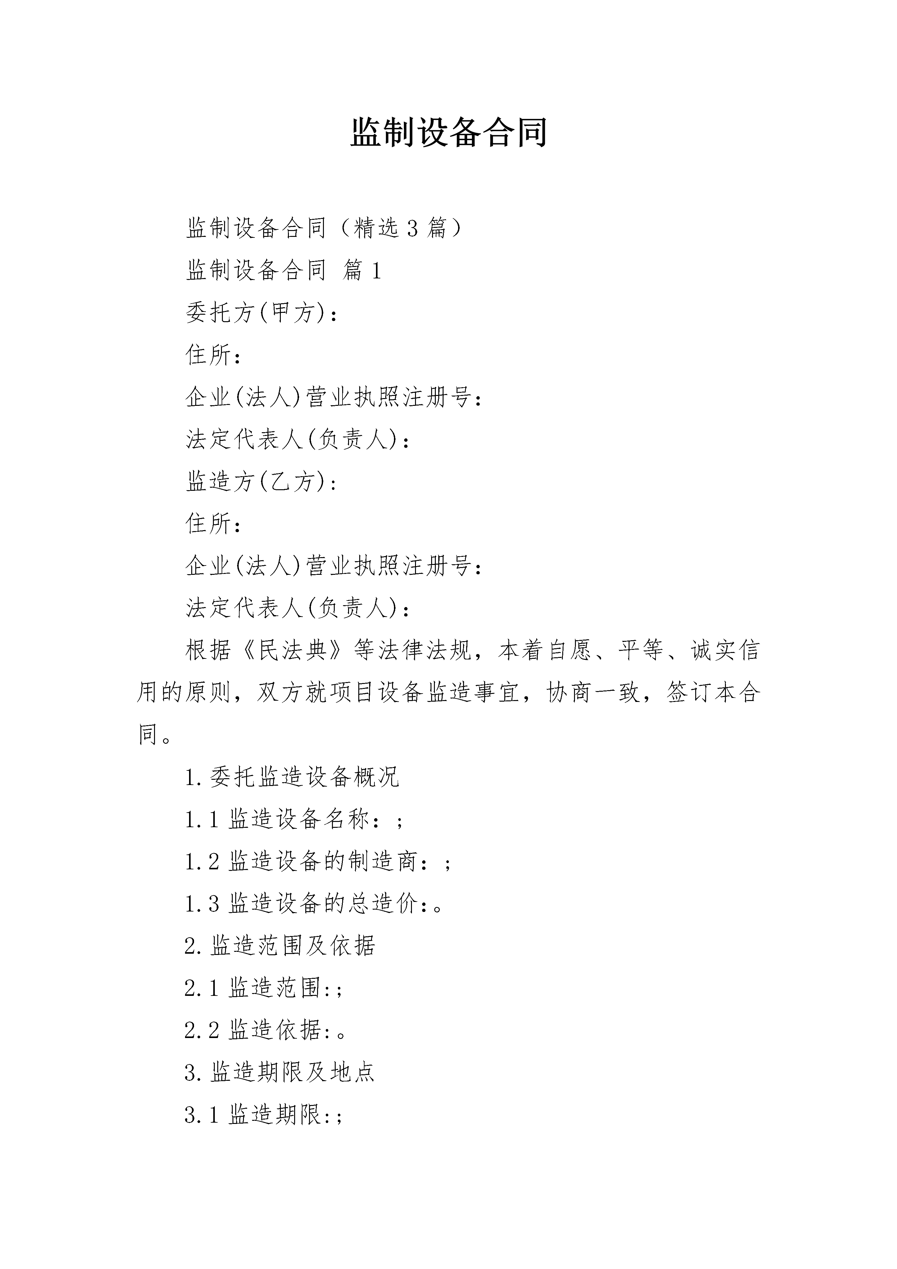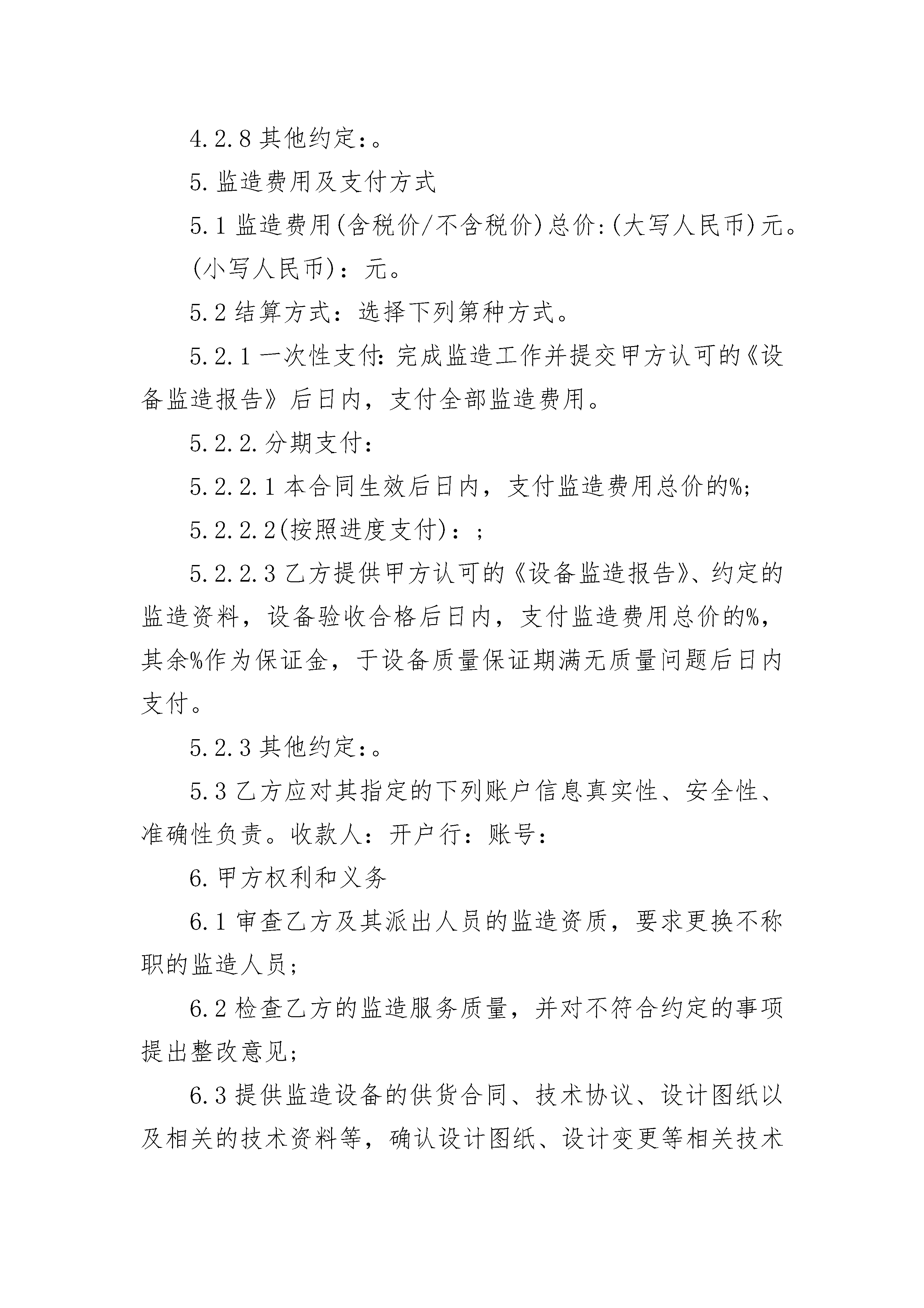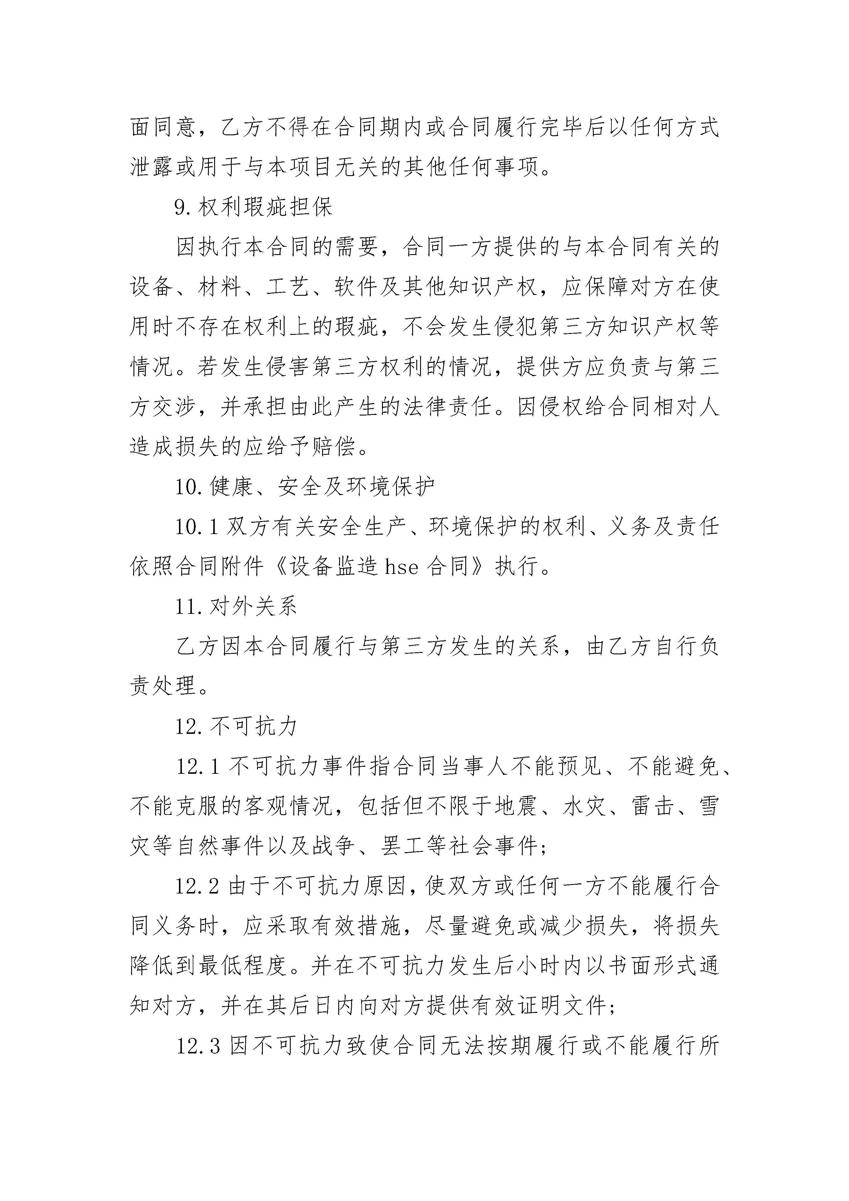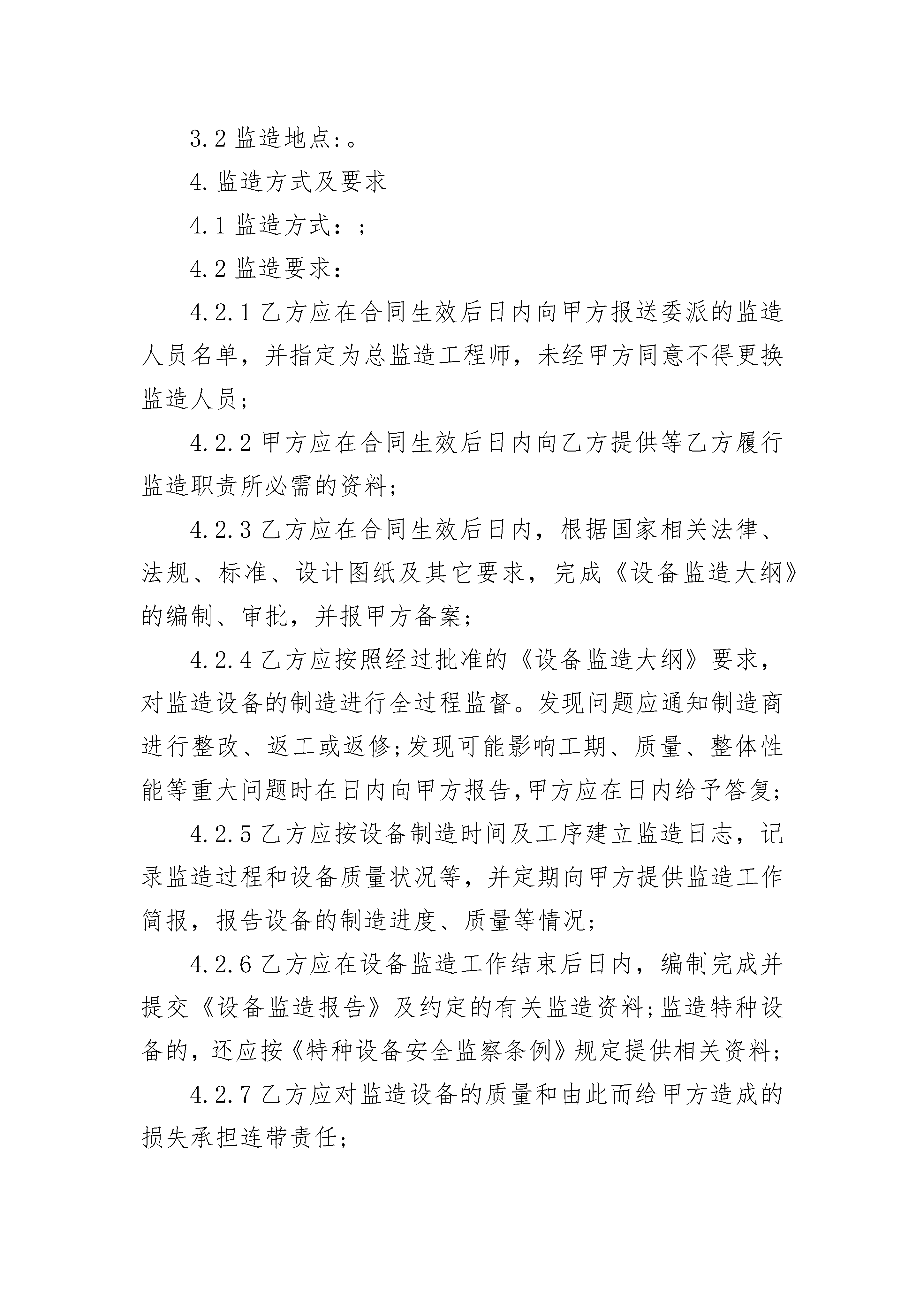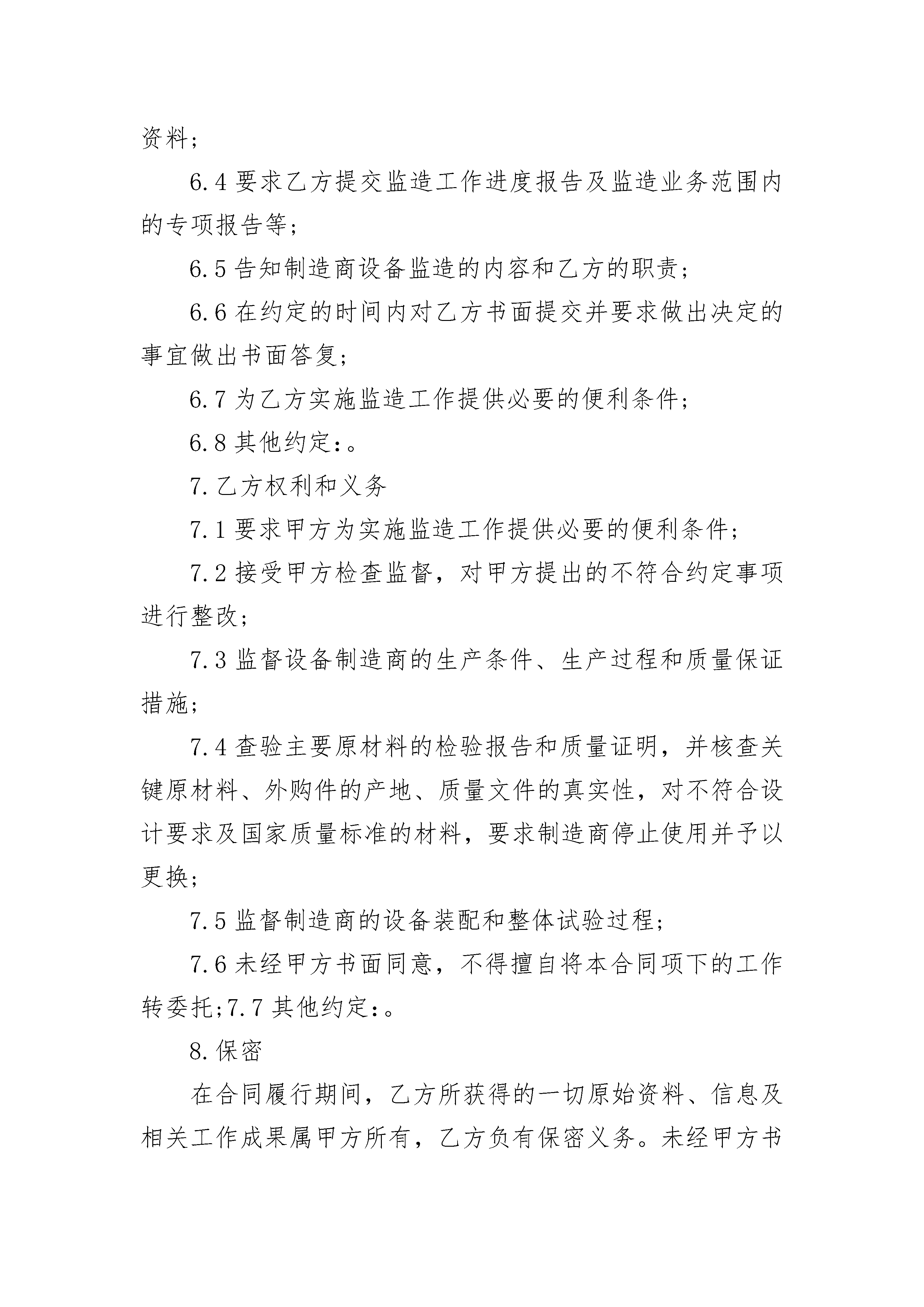 监制设备合同监制设备合同(精选3篇)监制设备合同篇1委托方(甲方):住所:企业(法人)营业执照注册号:法定代表人(负责人):监造方(乙方):住所:企业(法人)营业执照注册号:法定代表人(负责人):根据《民法典》等法律法规,本着自愿、平等、诚实信用的原则,双方就项目设备监造事宜,协商一致,签订本合同。1.委托监造设备概况1.1监造设备名称:;1.2监造设备的制造商:;1.3监造设备的总造价:。2.监造范围及依据2.1监造范围:;2.2监造依据:。3.监造期限及地点3.1监造期限:;3.2监造地点:。4.监造方式及要求4.1监造方式:;4.2监造要求:4.2.1乙方应在合同生效后日内向甲方报送委派的监造人员名单,并指定为总监造工程师,未经甲方同意不得更换监造人员;4.2.2甲方应在合同生效后日内向乙方提供等乙方履行监造职责所必需的资料;4.2.3乙方应在合同生效后日内,根据国家相关法律、法规、标准、设计图纸及其它要求,完成《设备监造大纲》的编制、审批,并报甲方备案;4.2.4乙方应按照经过批准的《设备监造大纲》要求,对监造设备的制造进行全过程监督。发现问题应通知制造商进行整改、返工或返修;发现可能影响工期、质量、整体性能等重大问题时在日内向甲方报告,甲方应在日内给予答复;4.2.5乙方应按设备制造时间及工序建立监造日志,记录监造过程和设备质量状况等,并定期向甲方提供监造工作简报,报告设备的制造进度、质量等情况;4.2.6乙方应在设备监造工作结束后日内,编制完成并提交《设备监造报告》及约定的有关监造资料;监造特种设备的,还应按《特种设备安全监察条例》规定提供相关资料;4.2.7乙方应对监造设备的质量和由此而给甲方造成的损失承担连带责任;4.2.8其他约定:。5.监造费用及支付方式5.1监造费用(含税价/不含税价)总价:(大写人民币)元。(小写人民币):元。5.2结算方式:选择下列第种方式。5.2.1一次性支付:完成监造工作并提交甲方认可的《设备监造报告》后日内,支付全部监造费用。5.2.2.分期支付:5.2.2.1本合同生效后日内,支付监造费用总价的%;5.2.2.2(按照进度支付):;5.2.2.3乙方提供甲方认可的《设备监造报告》、约定的监造资料,设备验收合格后日内,支付监造费用总价的%,其余%作为保证金,于设备质量保证期满无质量问题后日内支付。5.2.3其他约定:。5.3乙方应对其指定的下列账户信息真实性、安全性、准确性负责。收款人:开户行:账号:6.甲方权利和义务6.1审查乙方及其派出人员的监造资质,要求更换不称职的监造人员;6.2检查乙方的监造服务质量,并对不符合约定的事项提出整改意见;6.3提供监造设备的供货合同、技术协议、设计图纸以及相关的技术资料等,确认设计图纸、设计变更等相关技术资料;6.4要求乙方提交监造工作进度报告及监造业务范围内的专项报告等;6.5告知制造商设备监造的内容和乙方的职责;6.6在约定的时间内对乙方书面提交并要求做出决定的事宜做出书面答复;6.7为乙方实施监造工作提供必要的便利条件;6.8其他约定:。7.乙方权利和义务7.1要求甲方为实施监造工作提供必要的便利条件;7.2接受甲方检查监督,对甲方提出的不符合约定事项进行整改;7.3监督设备制造商的生产条件、生产过程和质量保证措施;7.4查验主要原材料的检验报告和质量证明,并核查关键原材料、外购件的产地、质量文件的真实性,对不符合设计要求及国家质量标准的材料,要求制造商停止使用并予以更换;7.5监督制造商的设备装配和整体试验过程;7.6未经甲方书面同意,不得擅自将本合同项下的工作转委托;7.7其他约定:。8.保密在合同履行期间,乙方所获得的一切原始资料、信息及相关工作成果属甲方所有,乙方负有保密义务。未经甲方书面同意,乙方不得在合同期内或合同履行完毕后以任何方式泄露或用于与本项目无关的其他任何事项。9.权利瑕疵担保因执行本合同的需要,合同一方提供的与本合同有关的设备、材料、工艺、软件及其他知识产权,应保障对方在使用时不存在权利上的瑕疵,不会发生侵犯第三方知识产权等情况。若发生侵害第三方权利的情况,提供方应负责与第三方交涉,并承担由此产生的法律责任。因侵权给合同相对人造成损失的应给予赔偿。10.健康、安全及环境保护10.1双方有关安全生产、环境保护的权利、义务及责任依照合同附件《设备监造hse合同》执行。11.对外关系乙方因本合同履行与第三方发生的关系,由乙方自行负责处理。12.不可抗力12.1不可抗力事件指合同当事人不能预见、不能避免、不能克服的客观情况,包括但不限于地震、水灾、雷击、雪灾等自然事件以及战争、罢工等社会事件;12.2由于不可抗力原因,使双方或任何一方不能履行合同义务时,应采取有效措施,尽量避免或减少损失,将损失降低到最低程度。并在