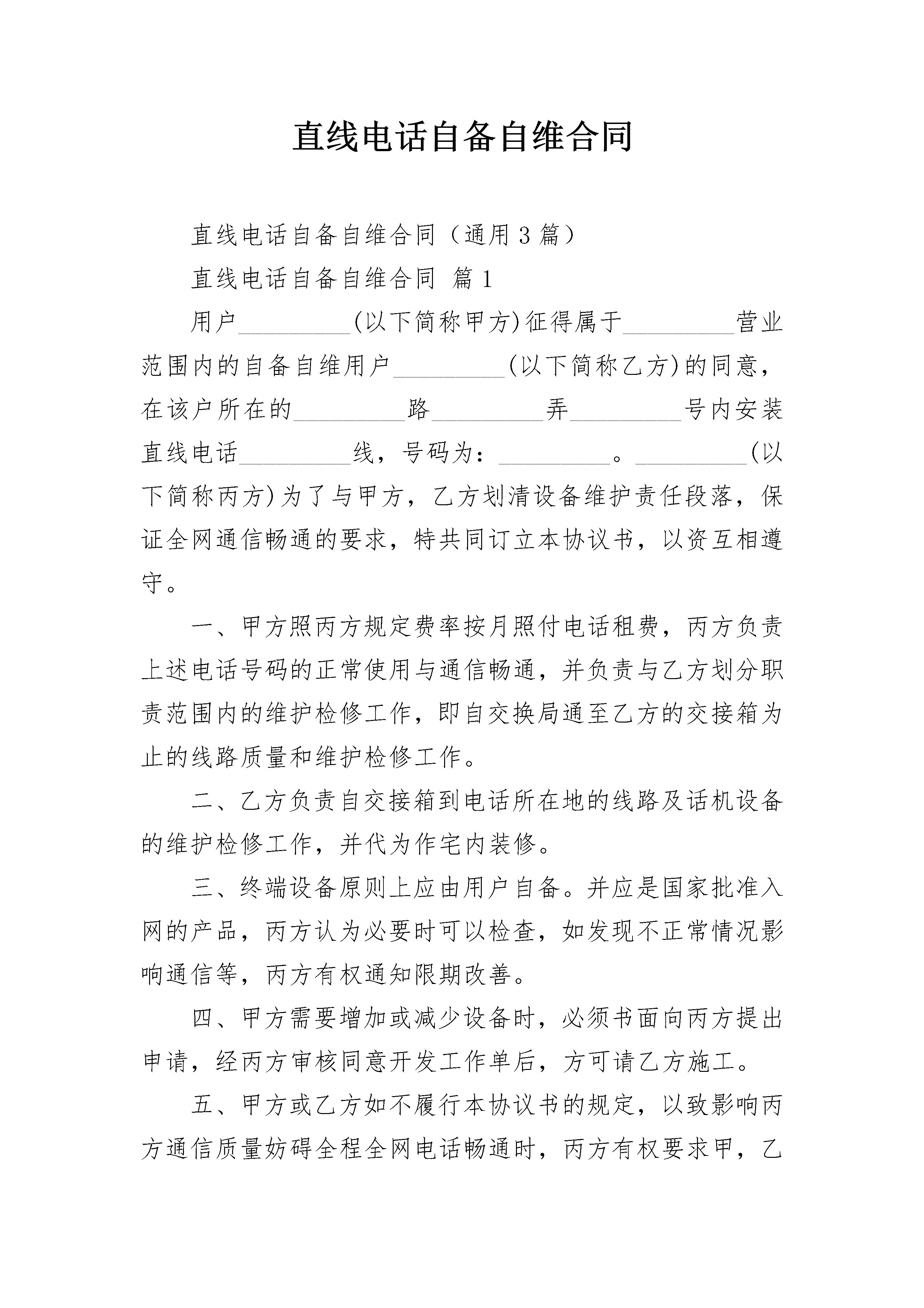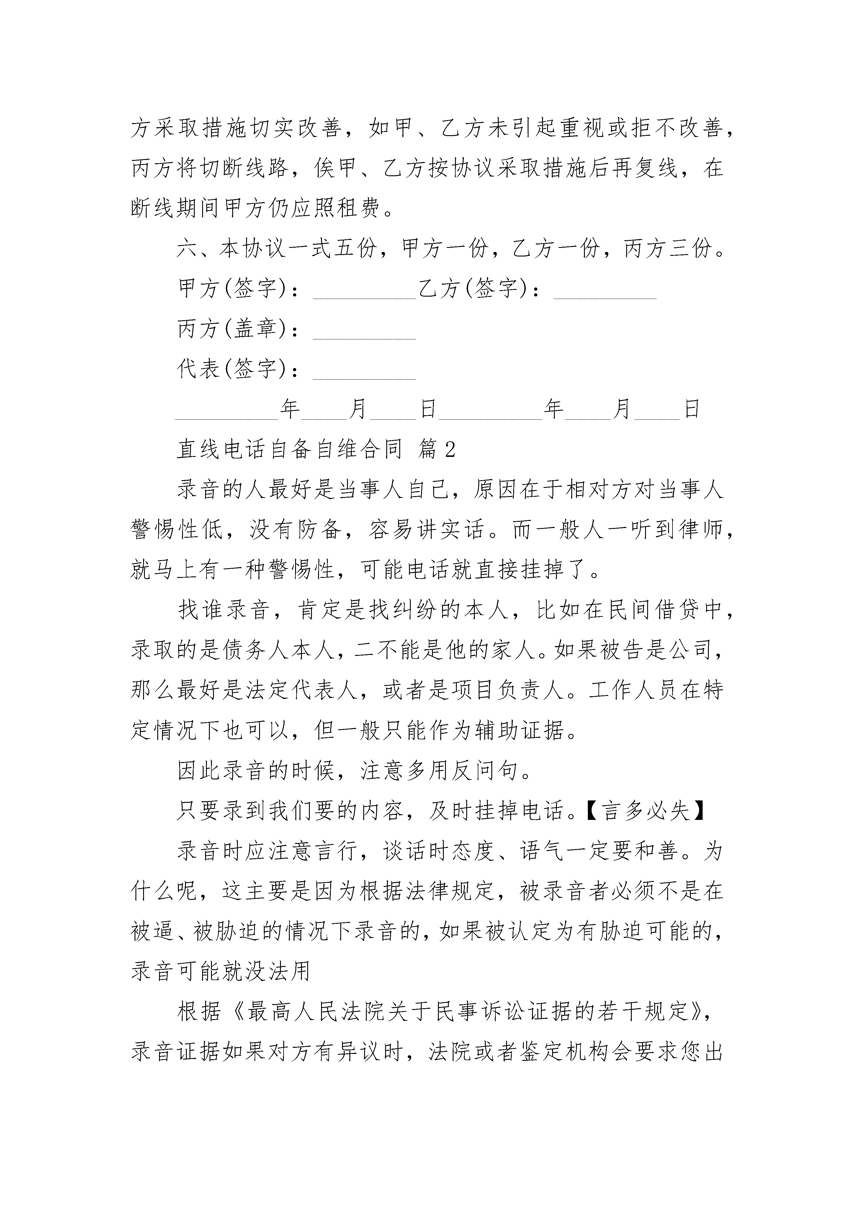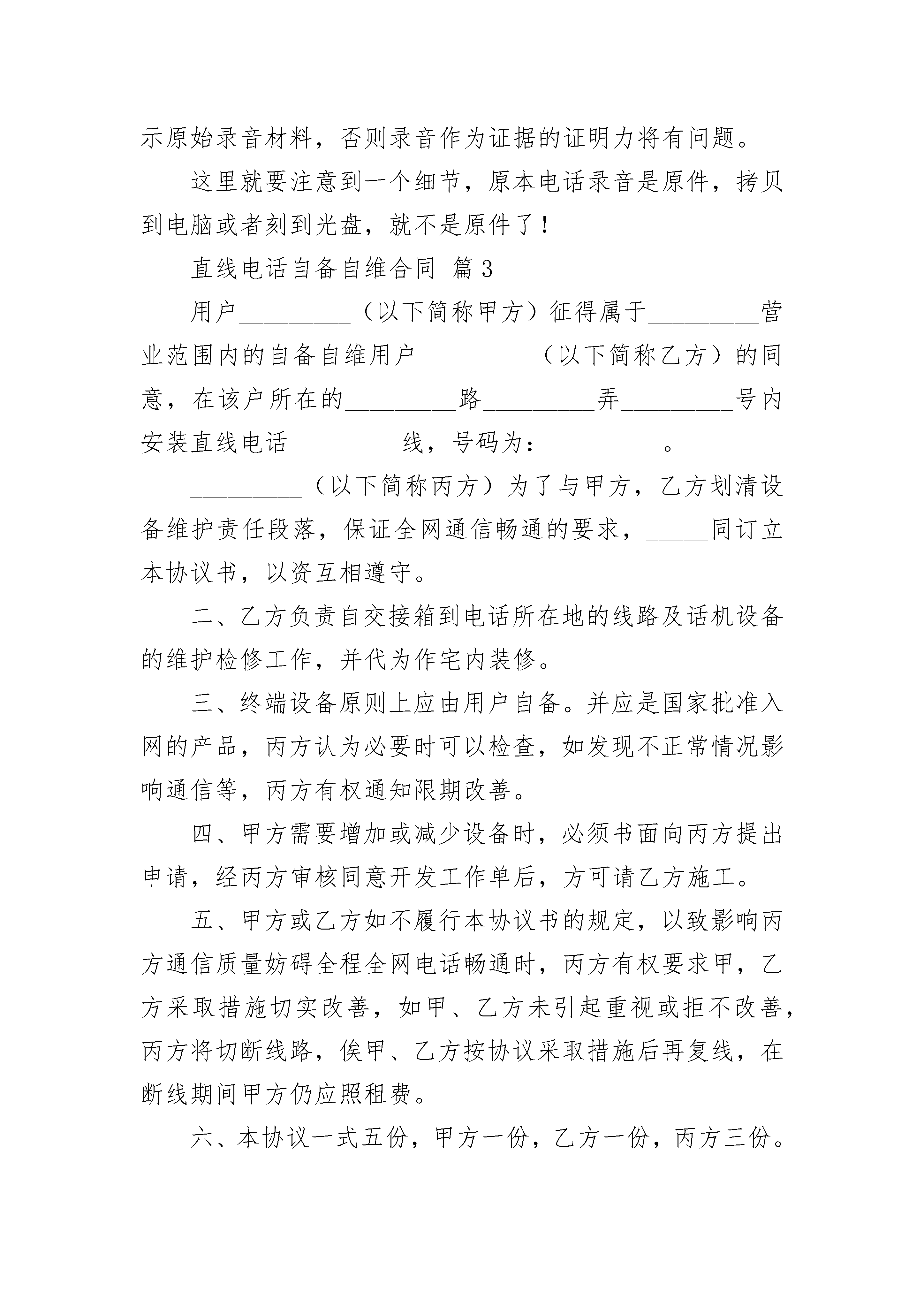 直线电话自备自维合同直线电话自备自维合同(通用3篇)直线电话自备自维合同篇1用户_________(以下简称甲方)征得属于_________营业范围内的自备自维用户_________(以下简称乙方)的同意,在该户所在的_________路_________弄_________号内安装直线电话_________线,号码为:_________。_________(以下简称丙方)为了与甲方,乙方划清设备维护责任段落,保证全网通信畅通的要求,特共同订立本协议书,以资互相遵守。一、甲方照丙方规定费率按月照付电话租费,丙方负责上述电话号码的正常使用与通信畅通,并负责与乙方划分职责范围内的维护检修工作,即自交换局通至乙方的交接箱为止的线路质量和维护检修工作。二、乙方负责自交接箱到电话所在地的线路及话机设备的维护检修工作,并代为作宅内装修。三、终端设备原则上应由用户自备。并应是国家批准入网的产品,丙方认为必要时可以检查,如发现不正常情况影响通信等,丙方有权通知限期改善。四、甲方需要增加或减少设备时,必须书面向丙方提出申请,经丙方审核同意开发工作单后,方可请乙方施工。五、甲方或乙方如不履行本协议书的规定,以致影响丙方通信质量妨碍全程全网电话畅通时,丙方有权要求甲,乙方采取措施切实改善,如甲、乙方未引起重视或拒不改善,丙方将切断线路,俟甲、乙方按协议采取措施后再复线,在断线期间甲方仍应照租费。六、本协议一式五份,甲方一份,乙方一份,丙方三份。甲方(签字):_________乙方(签字):_________丙方(盖章):_________代表(签字):__________________年____月____日_________年____月____日直线电话自备自维合同篇2录音的人最好是当事人自己,原因在于相对方对当事人警惕性低,没有防备,容易讲实话。而一般人一听到律师,就马上有一种警惕性,可能电话就直接挂掉了。找谁录音,肯定是找纠纷的本人,比如在民间借贷中,录取的是债务人本人,二不能是他的家人。如果被告是公司,那么最好是法定代表人,或者是项目负责人。工作人员在特定情况下也可以,但一般只能作为辅助证据。因此录音的时候,注意多用反问句。只要录到我们要的内容,及时挂掉电话。【言多必失】录音时应注意言行,谈话时态度、语气一定要和善。为什么呢,这主要是因为根据法律规定,被录音者必须不是在被逼、被胁迫的情况下录音的,如果被认定为有胁迫可能的,录音可能就没法用根据《最高人民法院关于民事诉讼证据的若干规定》,录音证据如果对方有异议时,法院或者鉴定机构会要求您出示原始录音材料,否则录音作为证据的证明力将有问题。这里就要注意到一个细节,原本电话录音是原件,拷贝到电脑或者刻到光盘,就不是原件了!直线电话自备自维合同篇3用户_________(以下简称甲方)征得属于_________营业范围内的自备自维用户_________(以下简称乙方)的同意,在该户所在的_________路_________弄_________号内安装直线电话_________线,号码为:_________。_________(以下简称丙方)为了与甲方,乙方划清设备维护责任段落,保证全网通信畅通的要求,_____同订立本协议书,以资互相遵守。二、乙方负责自交接箱到电话所在地的线路及话机设备的维护检修工作,并代为作宅内装修。三、终端设备原则上应由用户自备。并应是国家批准入网的产品,丙方认为必要时可以检查,如发现不正常情况影响通信等,丙方有权通知限期改善。四、甲方需要增加或减少设备时,必须书面向丙方提出申请,经丙方审核同意开发工作单后,方可请乙方施工。五、甲方或乙方如不履行本协议书的规定,以致影响丙方通信质量妨碍全程全网电话畅通时,丙方有权要求甲,乙方采取措施切实改善,如甲、乙方未引起重视或拒不改善,丙方将切断线路,俟甲、乙方按协议采取措施后再复线,在断线期间甲方仍应照租费。六、本协议一式五份,甲方一份,乙方一份,丙方三份。甲方(签字):_________乙方(签字):_________丙方(盖章):_________?代表(签字):__________________年____月____日_________年____月____日