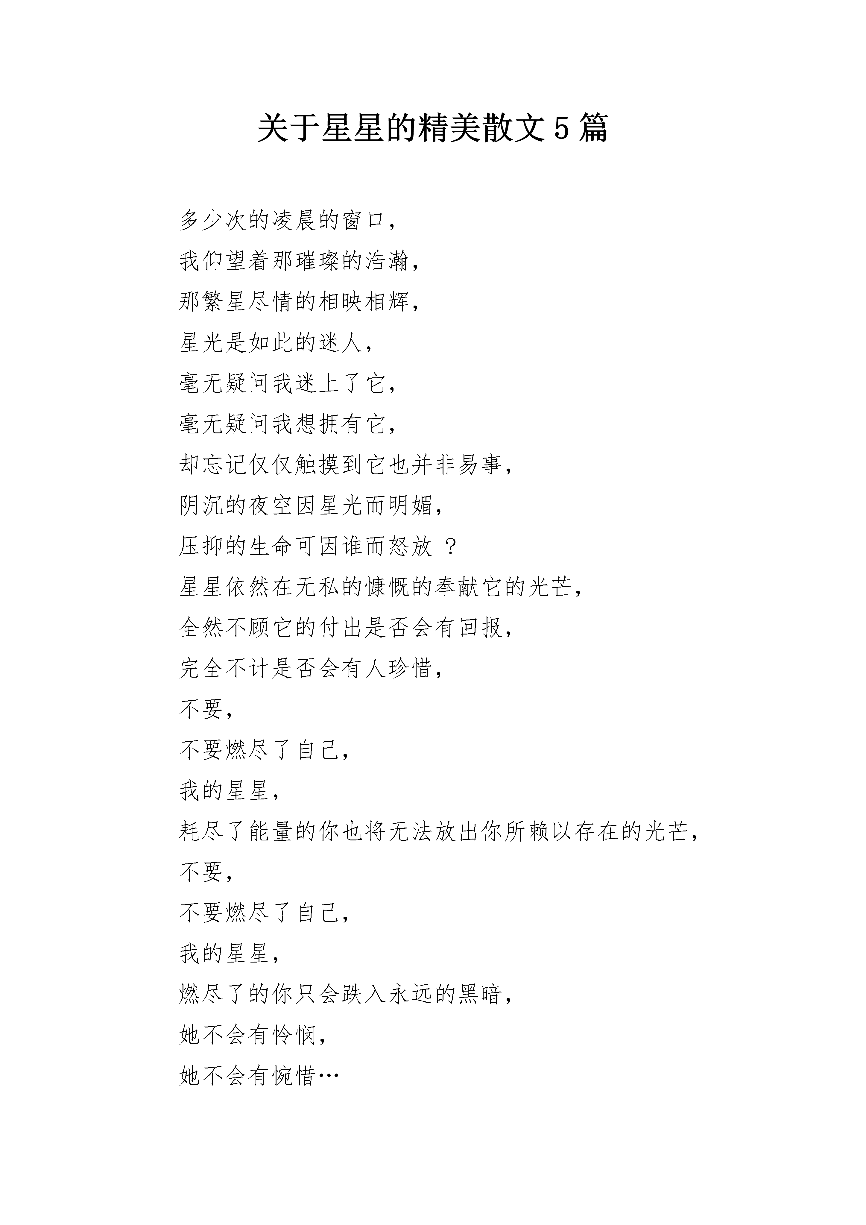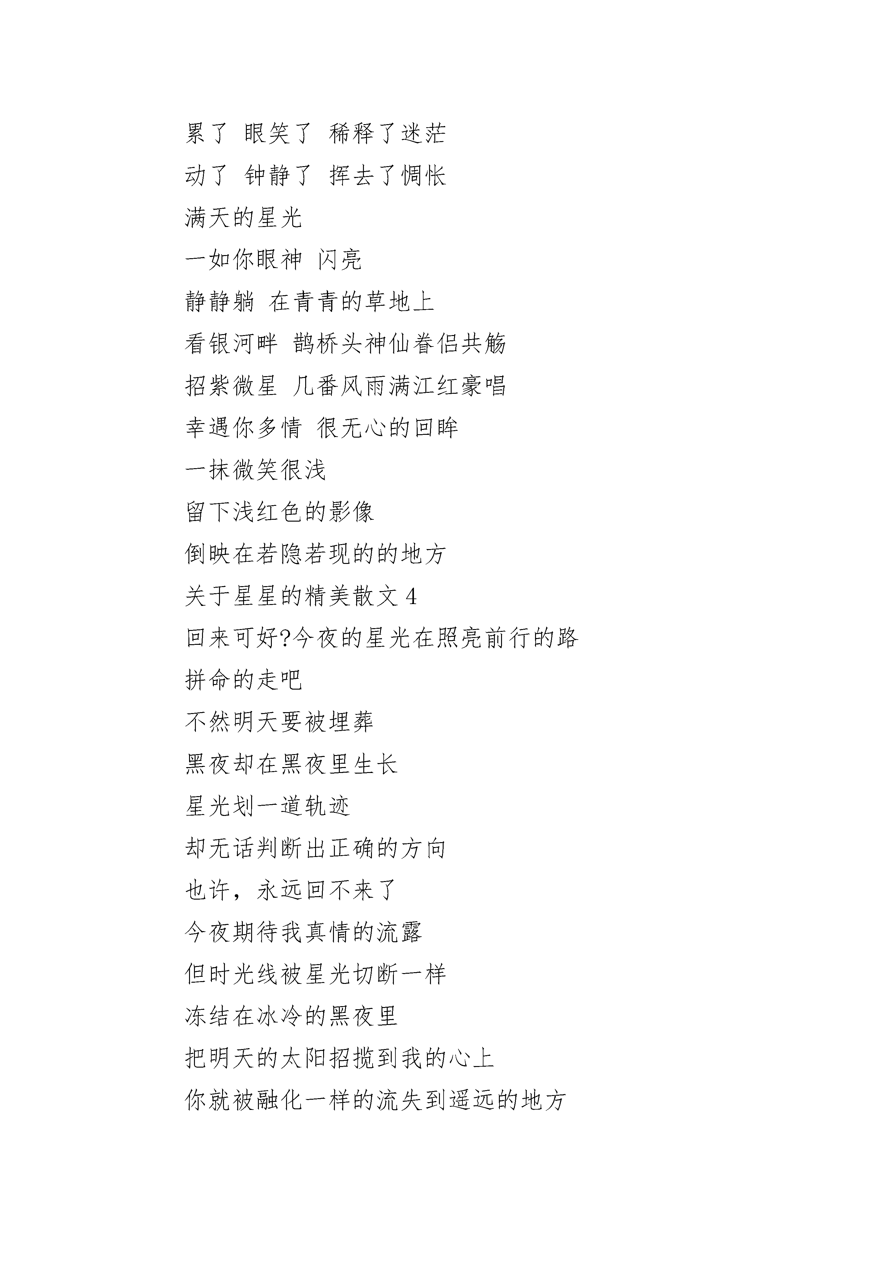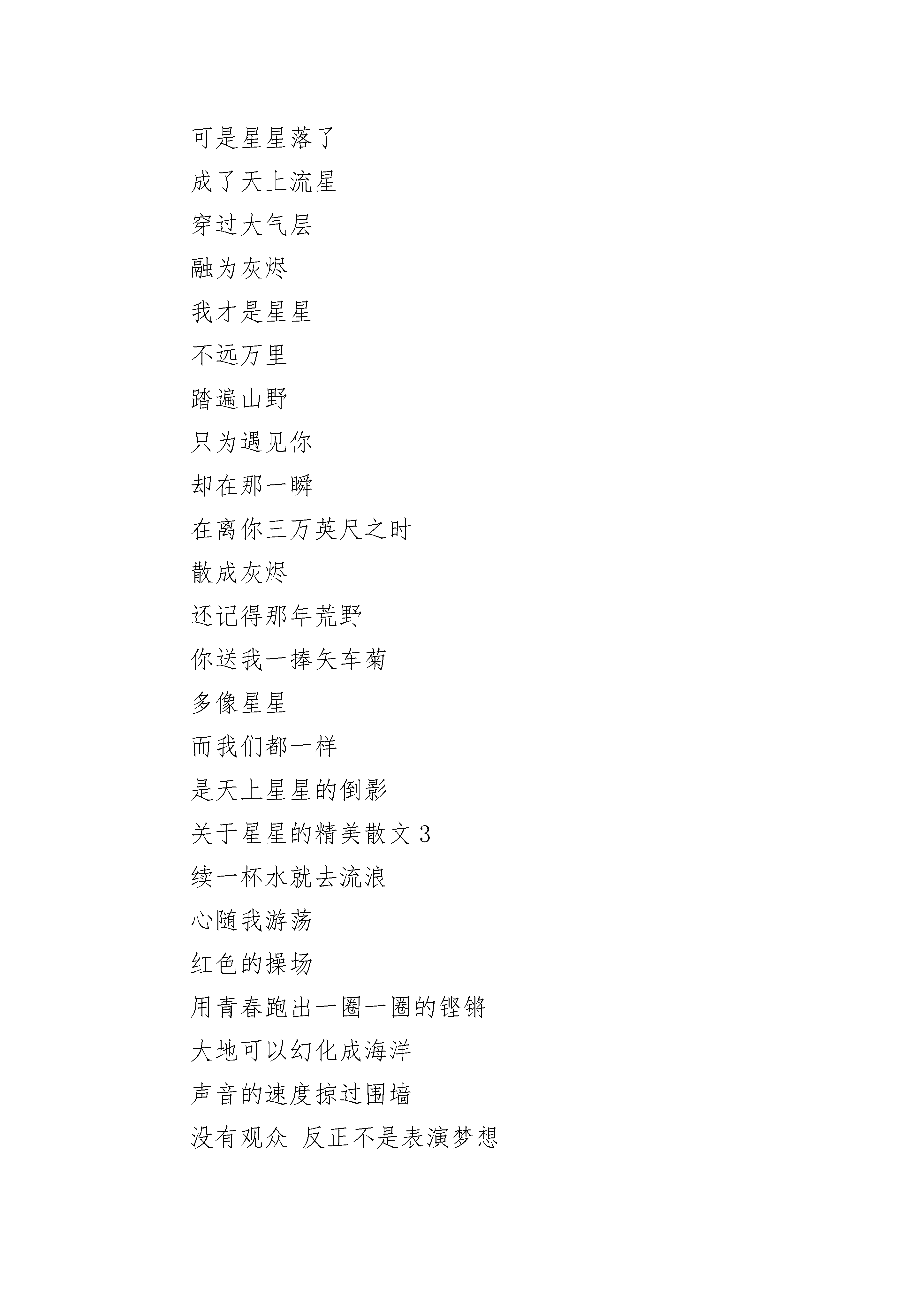 关于星星的精美散文5篇多少次的凌晨的窗口,我仰望着那璀璨的浩瀚,那繁星尽情的相映相辉,星光是如此的迷人,毫无疑问我迷上了它,毫无疑问我想拥有它,却忘记仅仅触摸到它也并非易事,阴沉的夜空因星光而明媚,压抑的生命可因谁而怒放?星星依然在无私的慷慨的奉献它的光芒,全然不顾它的付出是否会有回报,完全不计是否会有人珍惜,不要,不要燃尽了自己,我的星星,耗尽了能量的你也将无法放出你所赖以存在的光芒,不要,不要燃尽了自己,我的星星,燃尽了的你只会跌入永远的黑暗,她不会有怜悯,她不会有惋惜…夜深了,星光也逐渐黯淡了,夜空也重归阴沉了,不要,不要熄灭,我的星星,请让我触摸到你,不要熄灭,在这之前,不要,不要熄灭,我的星星,请一直灿烂下去,不要熄灭,在这之后……关于星星的精美散文2我曾登上云海摘过两三颗星星编成了项链说要送给你却在十月的一天融进了落叶里你没有生气我也会坠入深海和那群游鱼嬉戏你告诉我那鱼不漂亮可是你知道吗在黑夜里它们像星星在遇见你的那片树林里也有星星我追逐那光遇见了你星星停在你身上你在黑夜里我当成了星星还记得那只松鼠在夏夜里偷走我们的坚果如今还待在你坐过的山丘我爬到榕树上看它和那只刺猬游戏刺猬满身扎着苹果多像那夜你浑身扎满星星可是星星落了成了天上流星穿过大气层融为灰烬我才是星星不远万里踏遍山野只为遇见你却在那一瞬在离你三万英尺之时散成灰烬还记得那年荒野你送我一捧矢车菊多像星星而我们都一样是天上星星的倒影关于星星的精美散文3续一杯水就去流浪心随我游荡红色的操场用青春跑出一圈一圈的铿锵大地可以幻化成海洋声音的速度掠过围墙没有观众反正不是表演梦想累了眼笑了稀释了迷茫动了钟静了挥去了惆怅满天的星光一如你眼神闪亮静静躺在青青的草地上看银河畔鹊桥头神仙眷侣共觞招紫微星几番风雨满江红豪唱幸遇你多情很无心的回眸一抹微笑很浅留下浅红色的影像倒映在若隐若现的的地方关于星星的精美散文4回来可好?今夜的星光在照亮前行的路拼命的走吧不然明天要被埋葬黑夜却在黑夜里生长星光划一道轨迹却无话判断出正确的方向也许,永远回不来了今夜期待我真情的流露但时光线被星光切断一样冻结在冰冷的黑夜里把明天的太阳招揽到我的心上你就被融化一样的流失到遥远的地方流失,就不要再去找寻了那转角的梦也许要人赞许那迷失的人也需要希望穿过过去和现在的两个夜晚谁知道星光能照到谁的心上?不要迷路就好是哪颗星星不重要关于星星的精美散文5仰望天空的人,总以为星星就是宝石,晶莹剔透没瑕疵,飞上星星的人知道,那里有灰尘石渣,和地球上一样复杂。