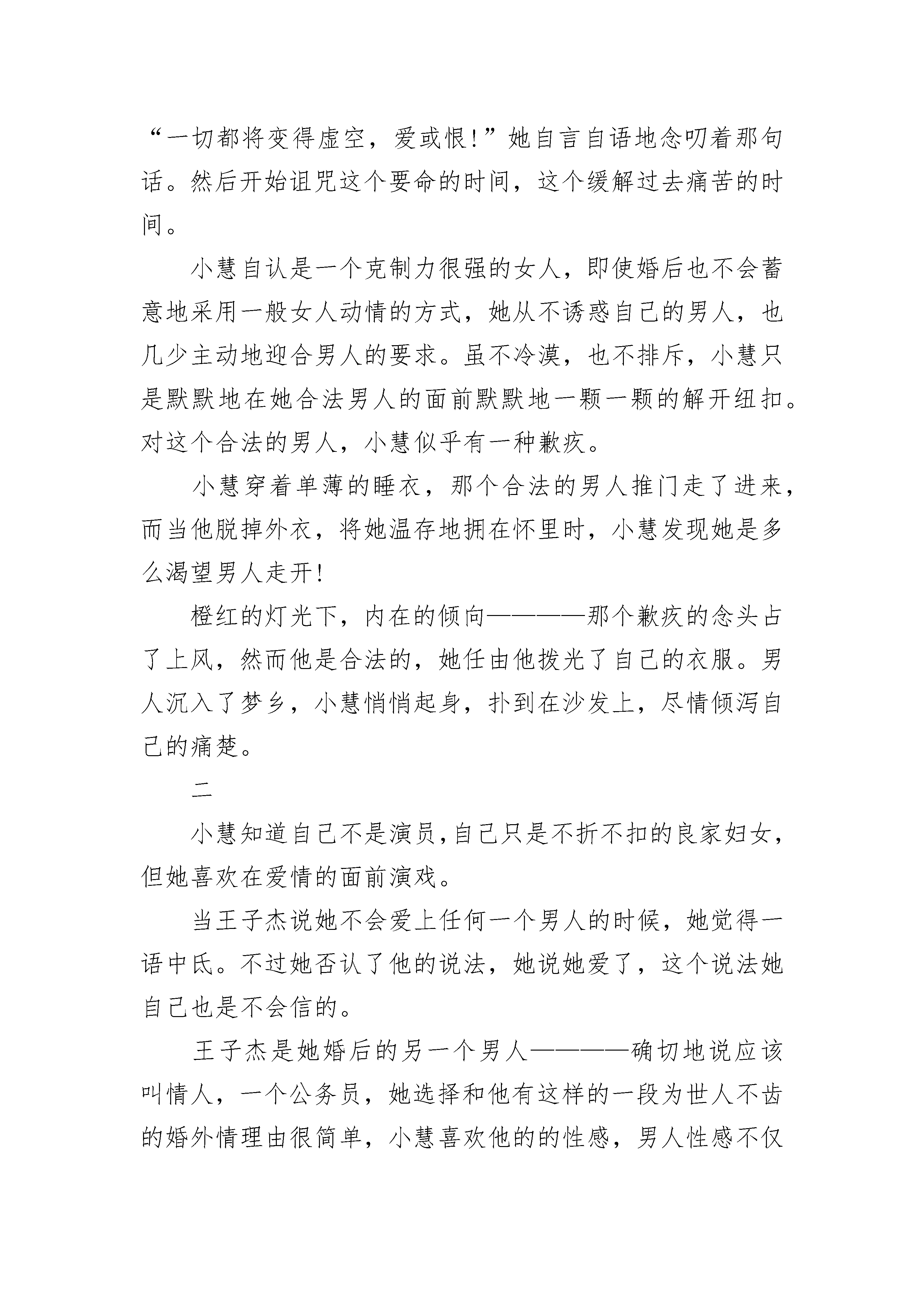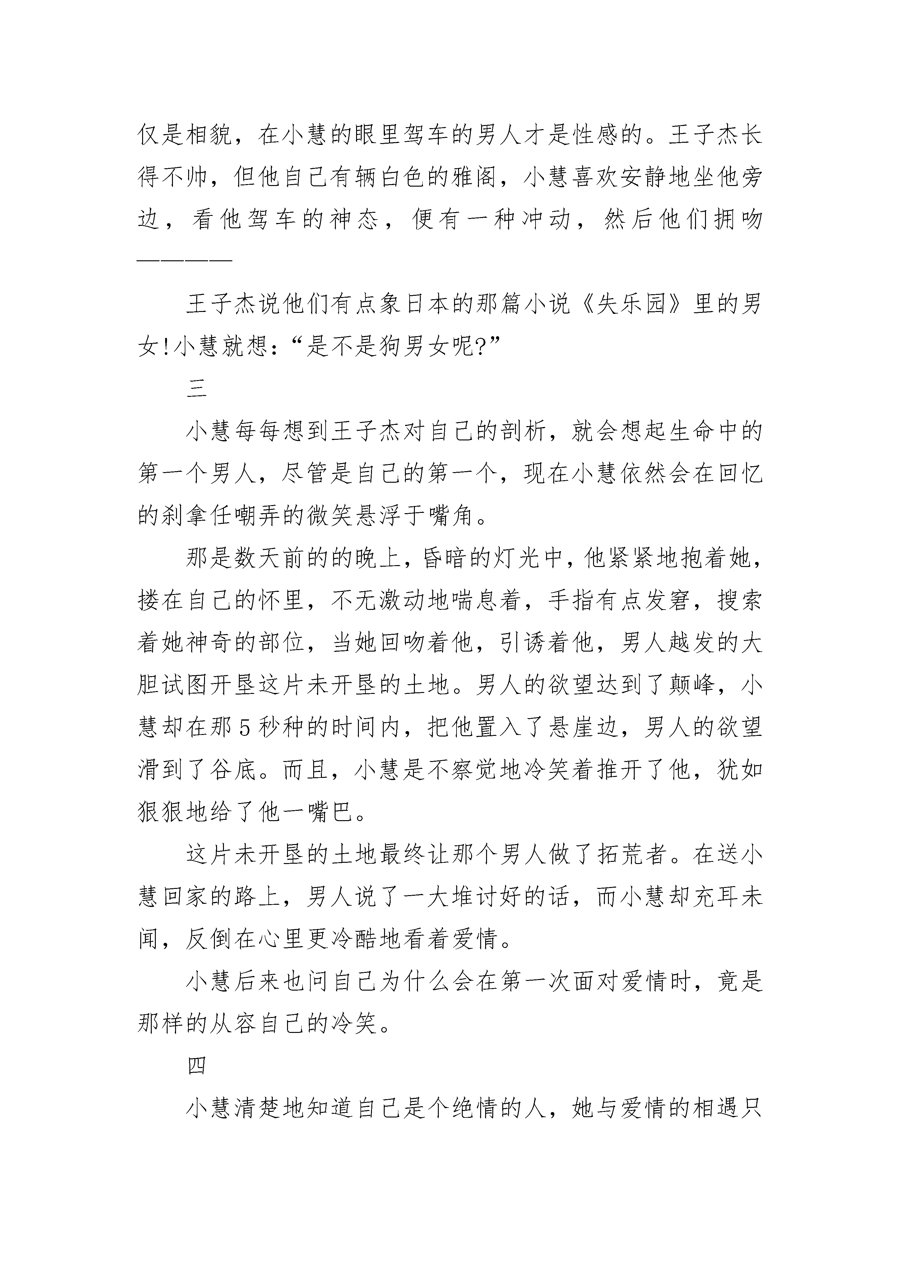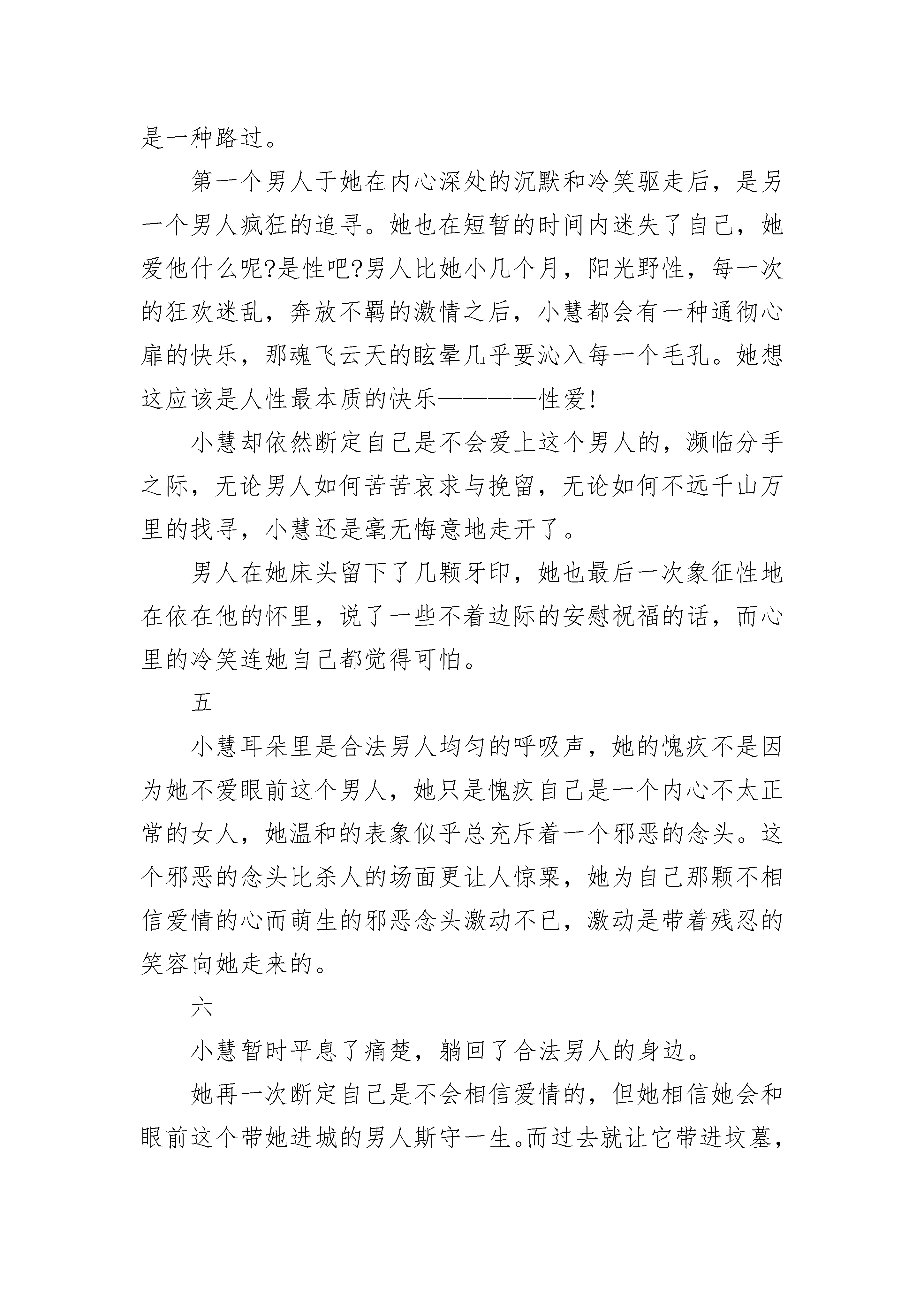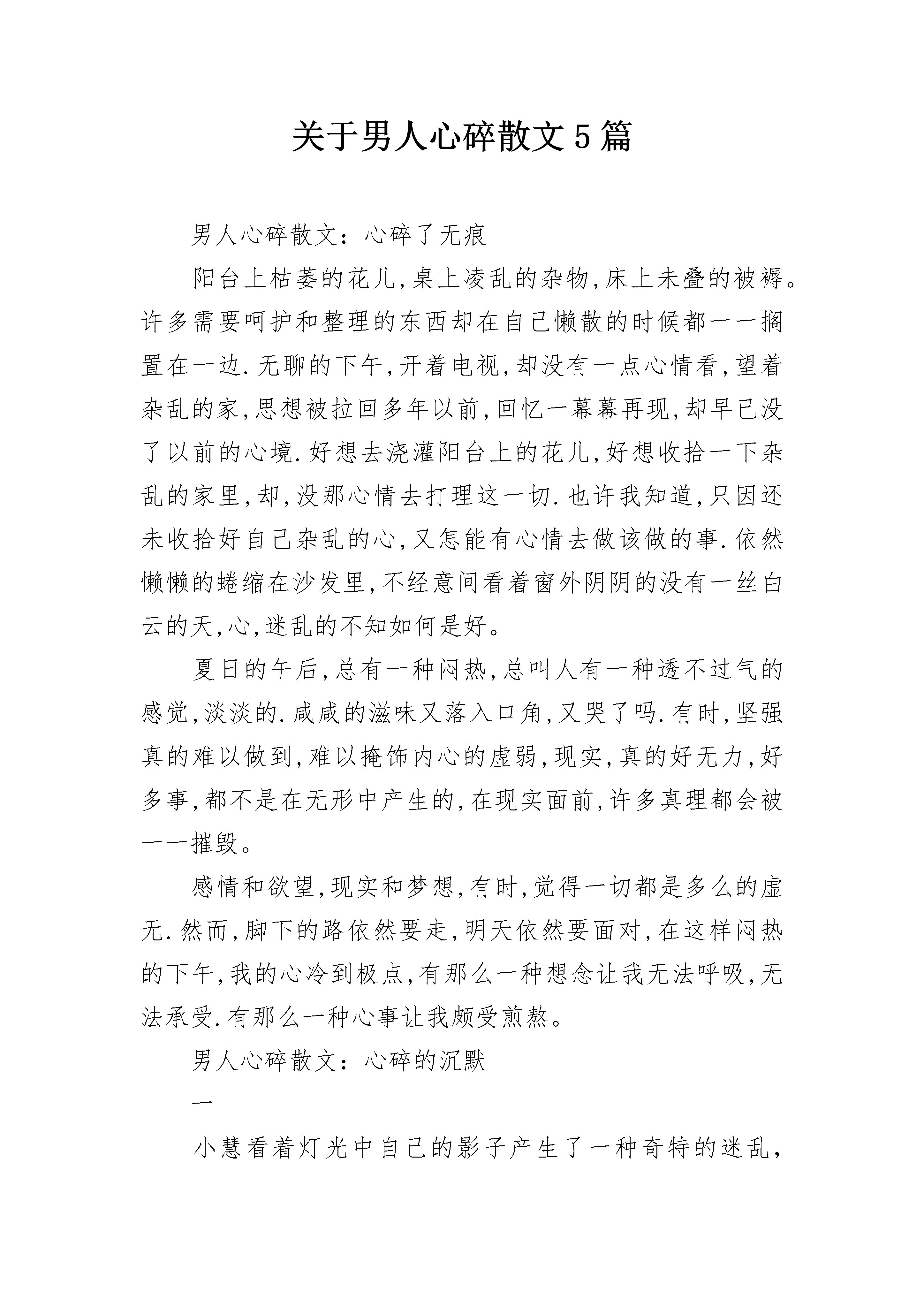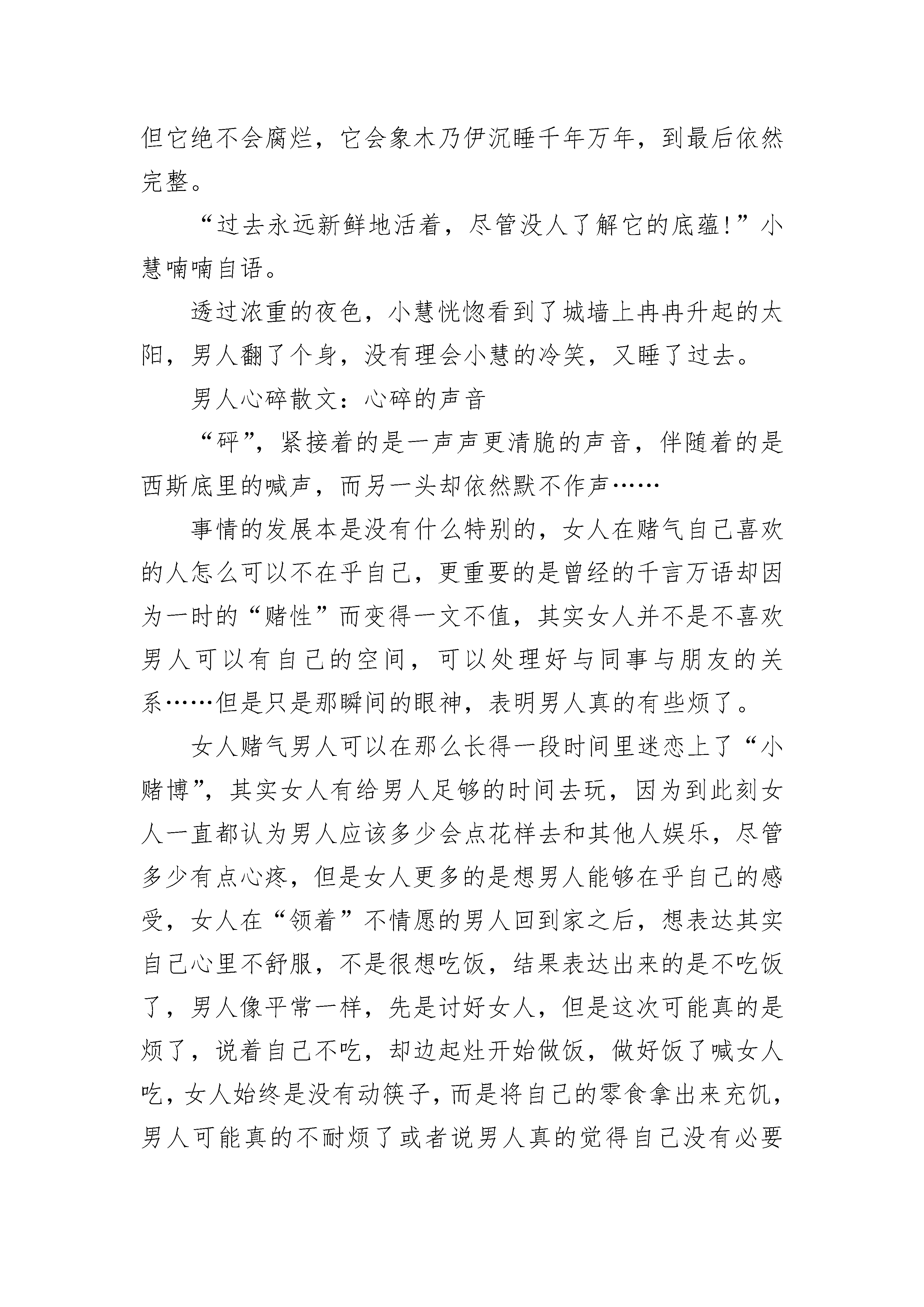 关于男人心碎散文5篇男人心碎散文:心碎了无痕阳台上枯萎的花儿,桌上凌乱的杂物,床上未叠的被褥。许多需要呵护和整理的东西却在自己懒散的时候都一一搁置在一边.无聊的下午,开着电视,却没有一点心情看,望着杂乱的家,思想被拉回多年以前,回忆一幕幕再现,却早已没了以前的心境.好想去浇灌阳台上的花儿,好想收拾一下杂乱的家里,却,没那心情去打理这一切.也许我知道,只因还未收拾好自己杂乱的心,又怎能有心情去做该做的事.依然懒懒的蜷缩在沙发里,不经意间看着窗外阴阴的没有一丝白云的天,心,迷乱的不知如何是好。夏日的午后,总有一种闷热,总叫人有一种透不过气的感觉,淡淡的.咸咸的滋味又落入口角,又哭了吗.有时,坚强真的难以做到,难以掩饰内心的虚弱,现实,真的好无力,好多事,都不是在无形中产生的,在现实面前,许多真理都会被一一摧毁。感情和欲望,现实和梦想,有时,觉得一切都是多么的虚无.然而,脚下的路依然要走,明天依然要面对,在这样闷热的下午,我的心冷到极点,有那么一种想念让我无法呼吸,无法承受.有那么一种心事让我颇受煎熬。男人心碎散文:心碎的沉默一小慧看着灯光中自己的影子产生了一种奇特的迷乱,“一切都将变得虚空,爱或恨!”她自言自语地念叨着那句话。然后开始诅咒这个要命的时间,这个缓解过去痛苦的时间。小慧自认是一个克制力很强的女人,即使婚后也不会蓄意地采用一般女人动情的方式,她从不诱惑自己的男人,也几少主动地迎合男人的要求。虽不冷漠,也不排斥,小慧只是默默地在她合法男人的面前默默地一颗一颗的解开纽扣。对这个合法的男人,小慧似乎有一种歉疚。小慧穿着单薄的睡衣,那个合法的男人推门走了进来,而当他脱掉外衣,将她温存地拥在怀里时,小慧发现她是多么渴望男人走开!橙红的灯光下,内在的倾向————那个歉疚的念头占了上风,然而他是合法的,她任由他拨光了自己的衣服。男人沉入了梦乡,小慧悄悄起身,扑到在沙发上,尽情倾泻自己的痛楚。二小慧知道自己不是演员,自己只是不折不扣的良家妇女,但她喜欢在爱情的面前演戏。当王子杰说她不会爱上任何一个男人的时候,她觉得一语中氐。不过她否认了他的说法,她说她爱了,这个说法她自己也是不会信的。王子杰是她婚后的另一个男人————确切地说应该叫情人,一个公务员,她选择和他有这样的一段为世人不齿的婚外情理由很简单,小慧喜欢他的的性感,男人性感不仅仅是相貌,在小慧的眼里驾车的男人才是性感的。王子杰长得不帅,但他自己有辆白色的雅阁,小慧喜欢安静地坐他旁边,看他驾车的神态,便有一种冲动,然后他们拥吻————王子杰说他们有点象日本的那篇小说《失乐园》里的男女!小慧就想:“是不是狗男女呢?”三小慧每每想到王子杰对自己的剖析,就会想起生命中的第一个男人,尽管是自己的第一个,现在小慧依然会在回忆的刹拿任嘲弄的微笑悬浮于嘴角。那是数天前的的晚上,昏暗的灯光中,他紧紧地抱着她,搂在自己的怀里,不无激动地喘息着,手指有点发窘,搜索着她神奇的部位,当她回吻着他,引诱着他,男人越发的大胆试图开垦这片未开垦的土地。男人的欲望达到了颠峰,小慧却在那5秒种的时间内,把他置入了悬崖边,男人的欲望滑到了谷底。而且,小慧是不察觉地冷笑着推开了他,犹如狠狠地给了他一嘴巴。这片未开垦的土地最终让那个男人做了拓荒者。在送小慧回家的路上,男人说了一大堆讨好的话,而小慧却充耳未闻,反倒在心里更冷酷地看着爱情。小慧后来也问自己为什么会在第一次面对爱情时,竟是那样的从容自己的冷笑。四小慧清楚地知道自己是个绝情的人,她与爱情的相遇只是一种路过。第一个男人于她在内心深处的沉默和冷笑驱走后,是另一个男人疯狂的追寻。她也在短暂的时间内迷失了自己,她爱他什么呢?是性吧?男人比她小几个月,阳光野性,每一次的狂欢迷乱,奔放不羁的激情之后,小慧都会有一种通彻心扉的快乐,那魂飞云天的眩晕几乎要沁入每一个毛孔。她想这应该是人性最本质的快乐————性爱!小慧却依然断定自己是不会爱上这个男人的,濒临分手之际,无论男人如何苦苦哀求与挽留,无论如何不远千山万里的找寻,小慧还是毫无悔意地走开了。男人在她床头留下了几颗牙印,她也最后一次象征性地在依在他的怀里,说了一些不着边际的安慰祝福的话,而心里的冷笑连她自己都觉得可怕。五小慧耳朵里是合法男人均匀的呼吸声,她的愧疚不是因为她不爱眼前这个男人,她只是愧疚自己是一个内心不太正常的女人,她温和的表象似乎总充斥着一个邪恶的念头。这个邪恶的念头比杀人的场面更让人惊粟,她为自己那颗不相信爱情的心而萌生的邪恶念头激动不已,激动是带着残忍的笑容向她走来的。六小慧暂时平息了痛楚,躺回了合法男人的身边。她再一次断定自己是不会相信爱情的,但她相信她会和眼前这个带她进城的男人斯守一生。而过去就让它带进坟墓,但它绝不会腐烂,它会象木乃伊沉睡千年万年,到最后依然完整。“过去永远新鲜地活着,尽管没人了解它