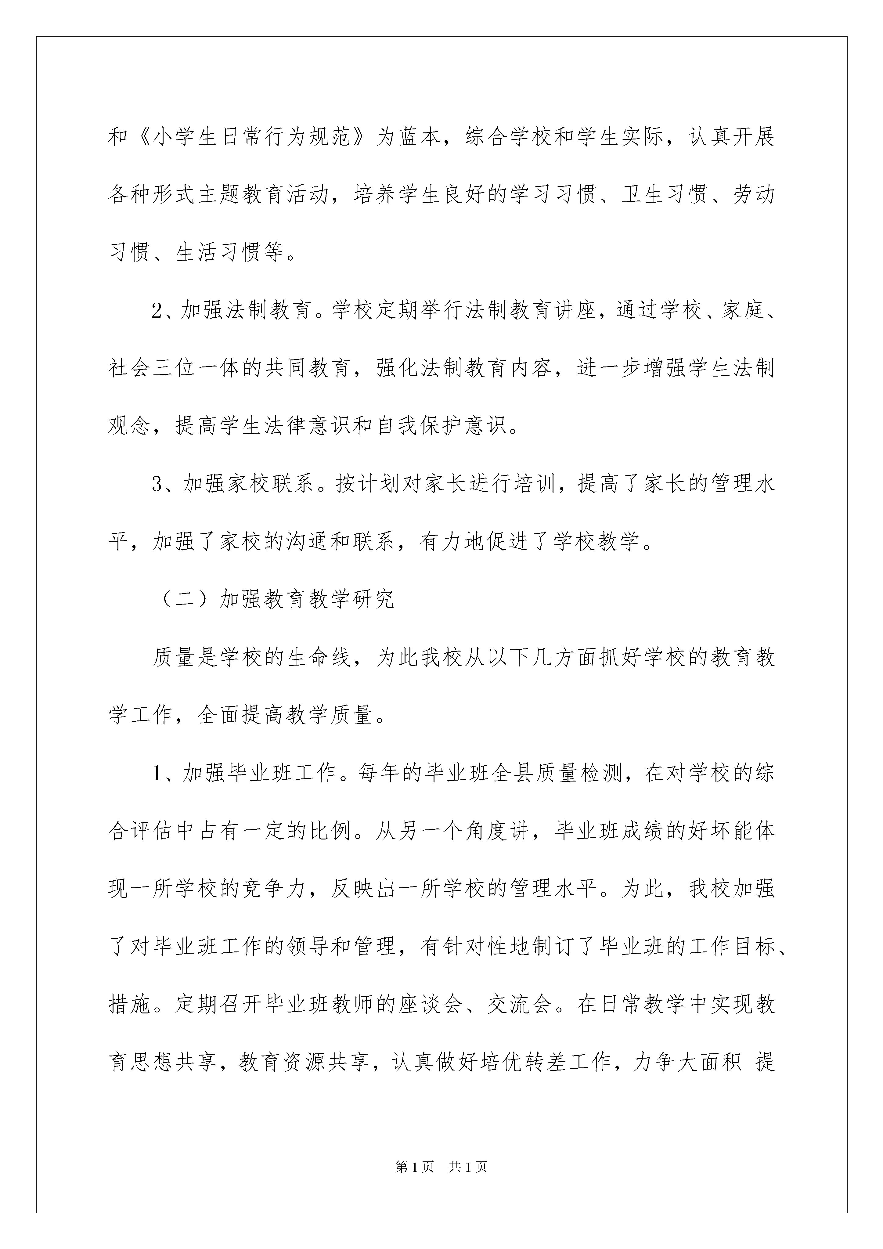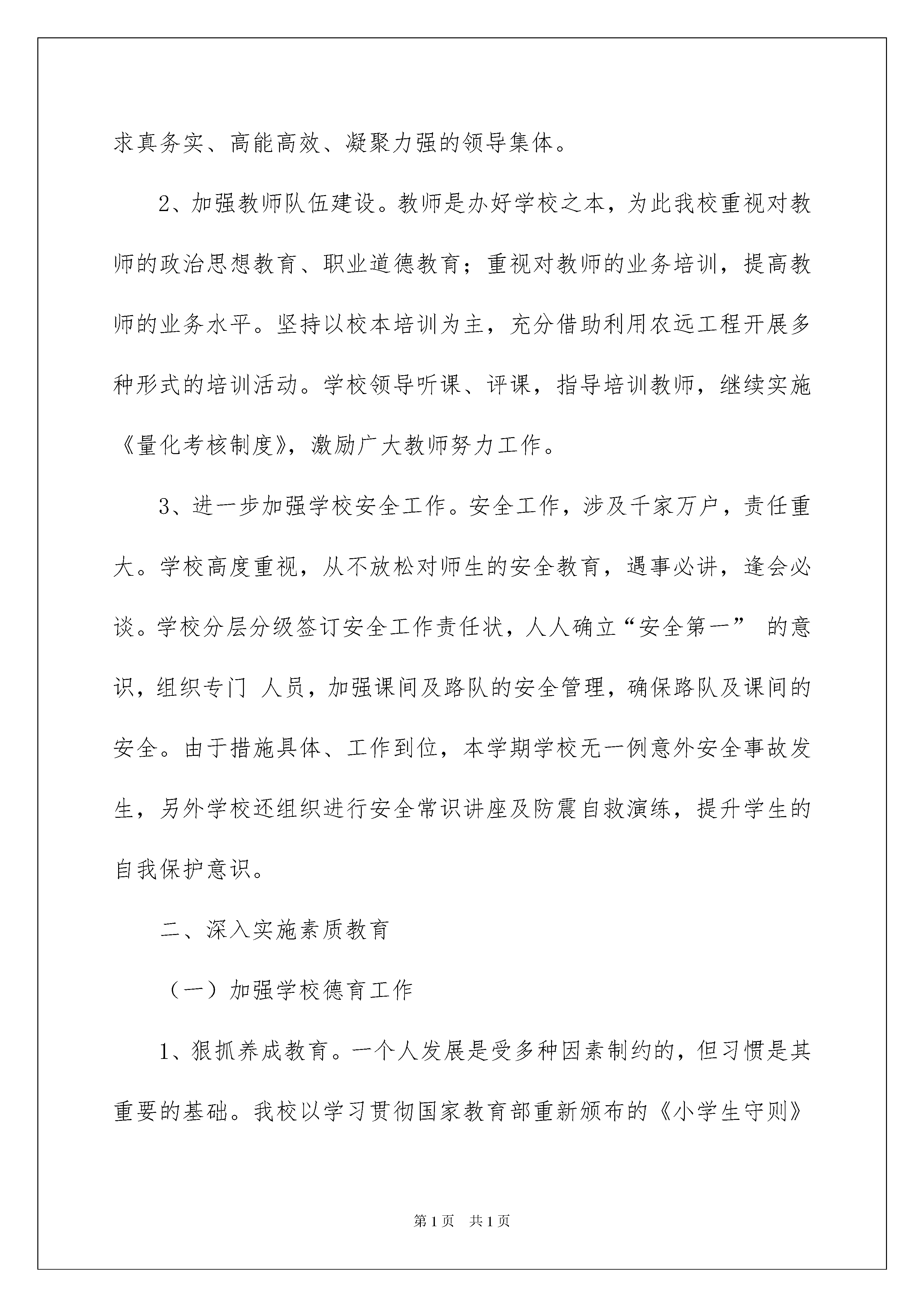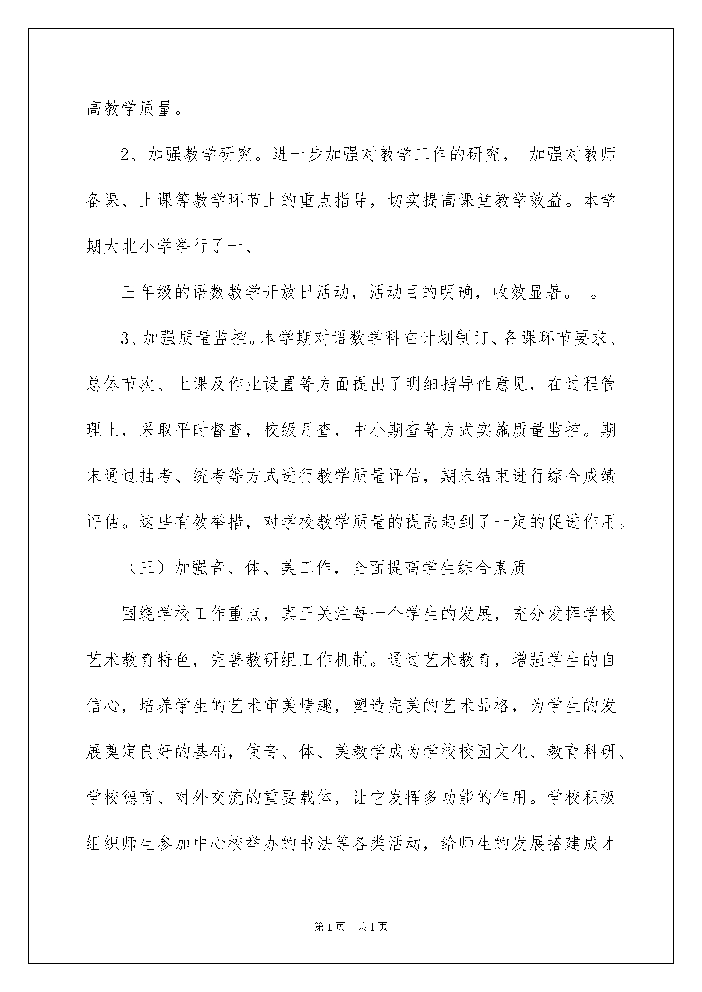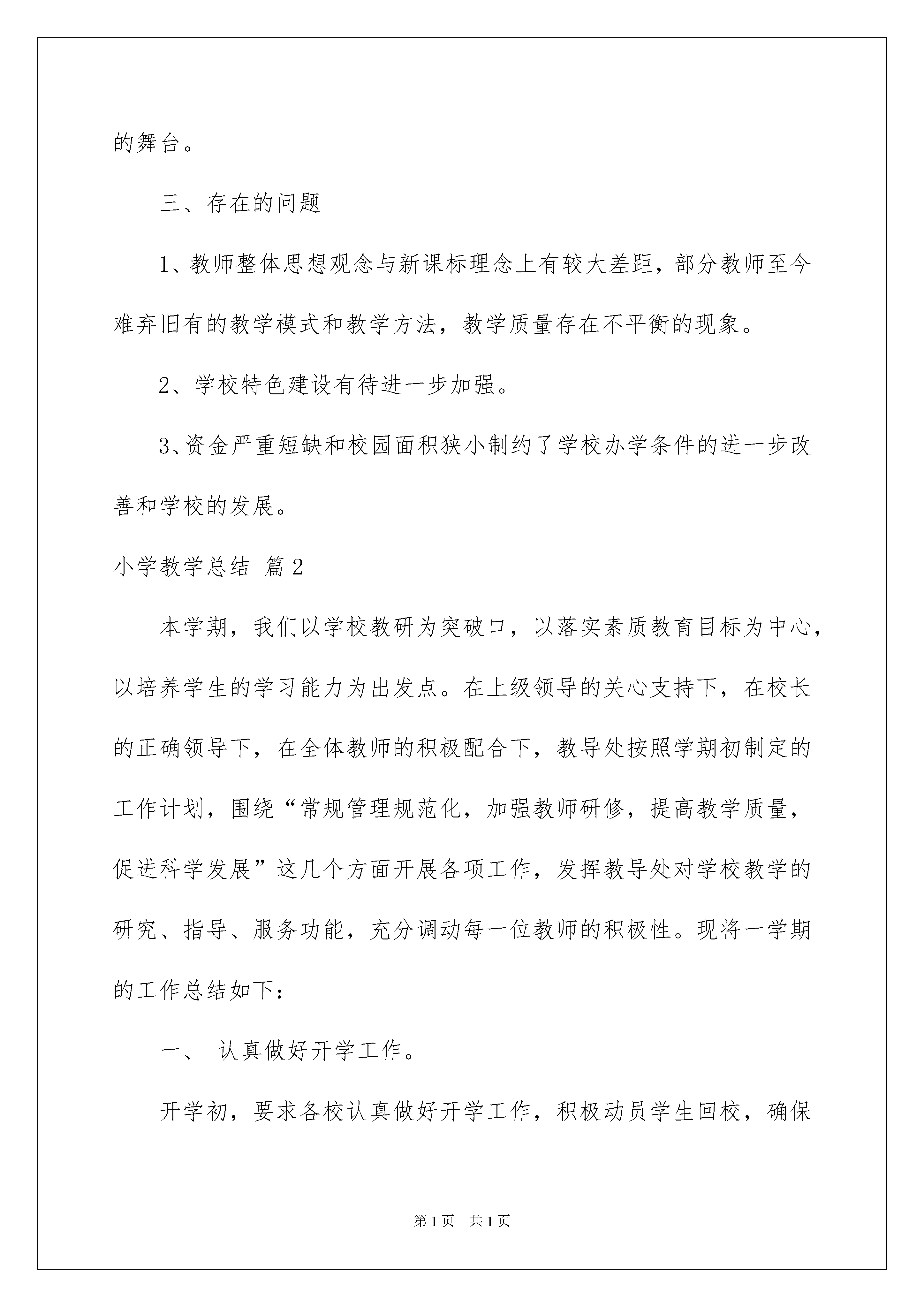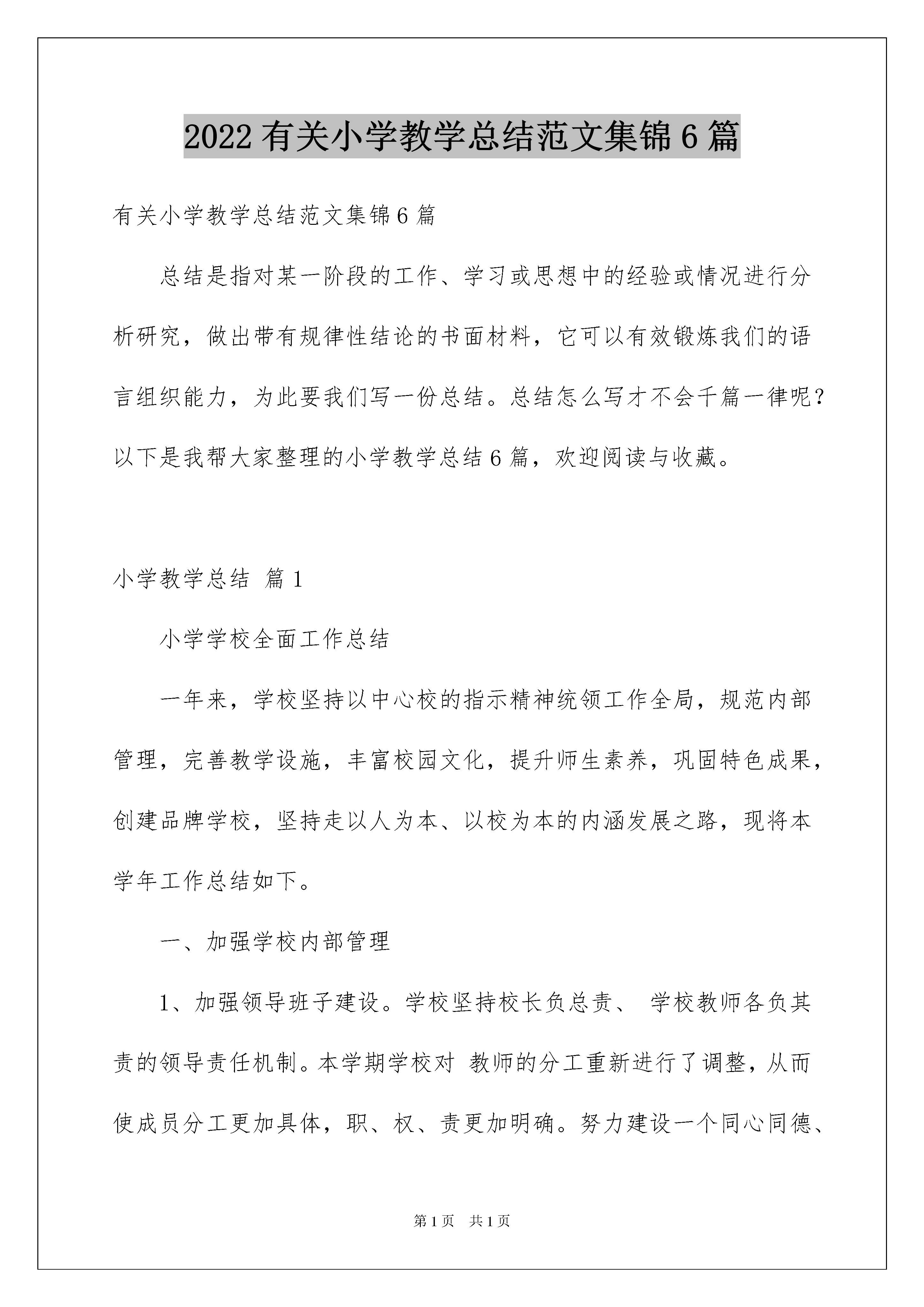 2022有关小学教学总结范文集锦6篇有关小学教学总结范文集锦6篇总结是指对某一阶段的工作、学习或思想中的经验或情况进行分析研究,做出带有规律性结论的书面材料,它可以有效锻炼我们的语言组织能力,为此要我们写一份总结。总结怎么写才不会千篇一律呢?以下是我帮大家整理的小学教学总结6篇,欢迎阅读与收藏。小学教学总结篇1小学学校全面工作总结一年来,学校坚持以中心校的指示精神统领工作全局,规范内部管理,完善教学设施,丰富校园文化,提升师生素养,巩固特色成果,创建品牌学校,坚持走以人为本、以校为本的内涵发展之路,现将本学年工作总结如下。一、加强学校内部管理1、加强领导班子建设。学校坚持校长负总责、学校教师各负其责的领导责任机制。本学期学校对教师的分工重新进行了调整,从而使成员分工更加具体,职、权、责更加明确。努力建设一个同心同德、求真务实、高能高效、凝聚力强的领导集体。2、加强教师队伍建设。教师是办好学校之本,为此我校重视对教师的政治思想教育、职业道德教育;重视对教师的业务培训,提高教师的业务水平。坚持以校本培训为主,充分借助利用农远工程开展多种形式的培训活动。学校领导听课、评课,指导培训教师,继续实施《量化考核制度》,激励广大教师努力工作。3、进一步加强学校安全工作。安全工作,涉及千家万户,责任重大。学校高度重视,从不放松对师生的安全教育,遇事必讲,逢会必谈。学校分层分级签订安全工作责任状,人人确立“安全第一”的意识,组织专门人员,加强课间及路队的安全管理,确保路队及课间的安全。由于措施具体、工作到位,本学期学校无一例意外安全事故发生,另外学校还组织进行安全常识讲座及防震自救演练,提升学生的自我保护意识。二、深入实施素质教育(一)加强学校德育工作1、狠抓养成教育。一个人发展是受多种因素制约的,但习惯是其重要的基础。我校以学习贯彻国家教育部重新颁布的《小学生守则》和《小学生日常行为规范》为蓝本,综合学校和学生实际,认真开展各种形式主题教育活动,培养学生良好的学习习惯、卫生习惯、劳动习惯、生活习惯等。2、加强法制教育。学校定期举行法制教育讲座,通过学校、家庭、社会三位一体的共同教育,强化法制教育内容,进一步增强学生法制观念,提高学生法律意识和自我保护意识。3、加强家校联系。按计划对家长进行培训,提高了家长的管理水平,加强了家校的沟通和联系,有力地促进了学校教学。(二)加强教育教学研究质量是学校的生命线,为此我校从以下几方面抓好学校的教育教学工作,全面提高教学质量。1、加强毕业班工作。每年的毕业班全县质量检测,在对学校的综合评估中占有一定的比例。从另一个角度讲,毕业班成绩的好坏能体现一所学校的竞争力,反映出一所学校的管理水平。为此,我校加强了对毕业班工作的领导和管理,有针对性地制订了毕业班的工作目标、措施。定期召开毕业班教师的座谈会、交流会。在日常教学中实现教育思想共享,教育资源共享,认真做好培优转差工作,力争大面积提高教学质量。2、加强教学研究。进一步加强对教学工作的研究,加强对教师备课、上课等教学环节上的重点指导,切实提高课堂教学效益。本学期大北小学举行了一、三年级的语数教学开放日活动,活动目的明确,收效显著。。3、加强质量监控。本学期对语数学科在计划制订、备课环节要求、总体节次、上课及作业设置等方面提出了明细指导性意见,在过程管理上,采取平时督查,校级月查,中小期查等方式实施质量监控。期末通过抽考、统考等方式进行教学质量评估,期末结束进行综合成绩评估。这些有效举措,对学校教学质量的提高起到了一定的促进作用。(三)加强音、体、美工作,全面提高学生综合素质围绕学校工作重点,真正关注每一个学生的发展,充分发挥学校艺术教育特色,完善教研组工作机制。通过艺术教育,增强学生的自信心,培养学生的艺术审美情趣,塑造完美的艺术品格,为学生的发展奠定良好的基础,使音、体、美教学成为学校校园文化、教育科研、学校德育、对外交流的重要载体,让它发挥多功能的作用。学校积极组织师生参加中心校举办的书法等各类活动,给师生的发展搭建成才的舞台。三、存在的问题1、教师整体思想观念与新课标理念上有较大差距,部分教师至今难弃旧有的教学模式和教学方法,教学质量存在不平衡的现象。2、学校特色建设有待进一步加强。3、资金严重短缺和校园面积狭小制约了学校办学条件的进一步改善和学校的发展。小学教学总结篇2本学期,我们以学校教研为突破口,以落实素质教育目标为中心,以培养学生的学习能力为出发点。在上级领导的关心支持下,在校长的正确领导下,在全体教师的积极配合下,教导处按照学期初制定的工作计划,围绕“常规管理规范化,加强教师研修,提高教学